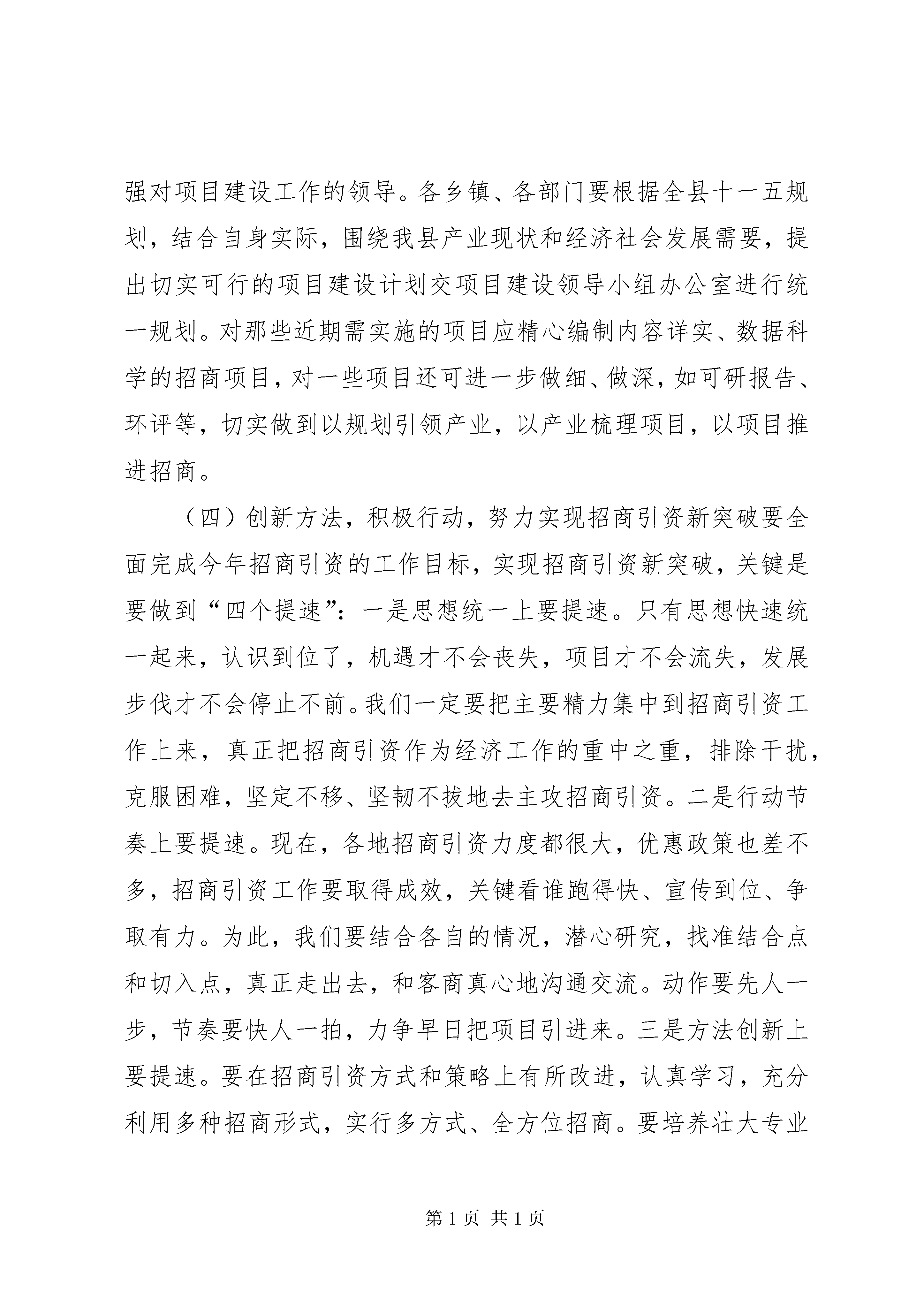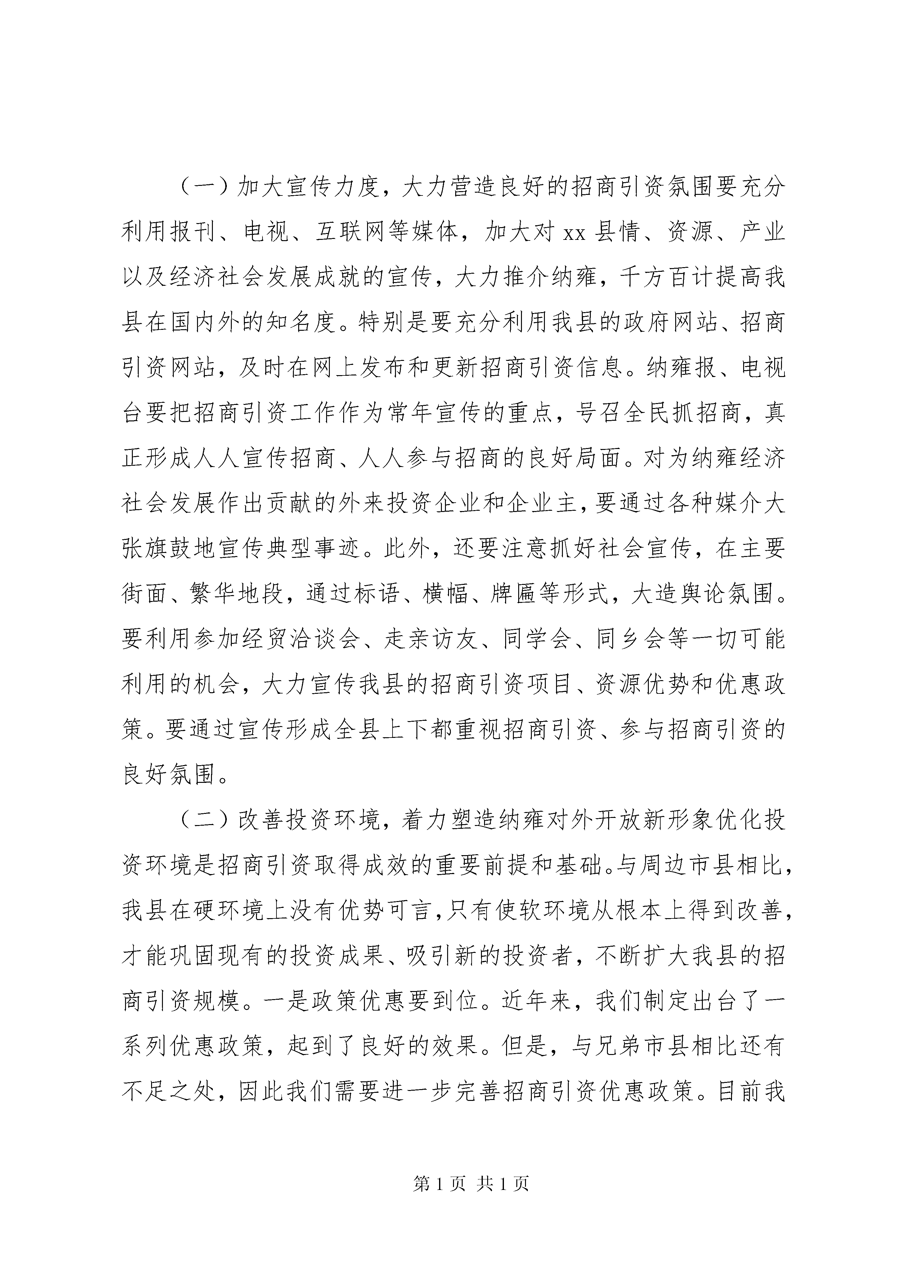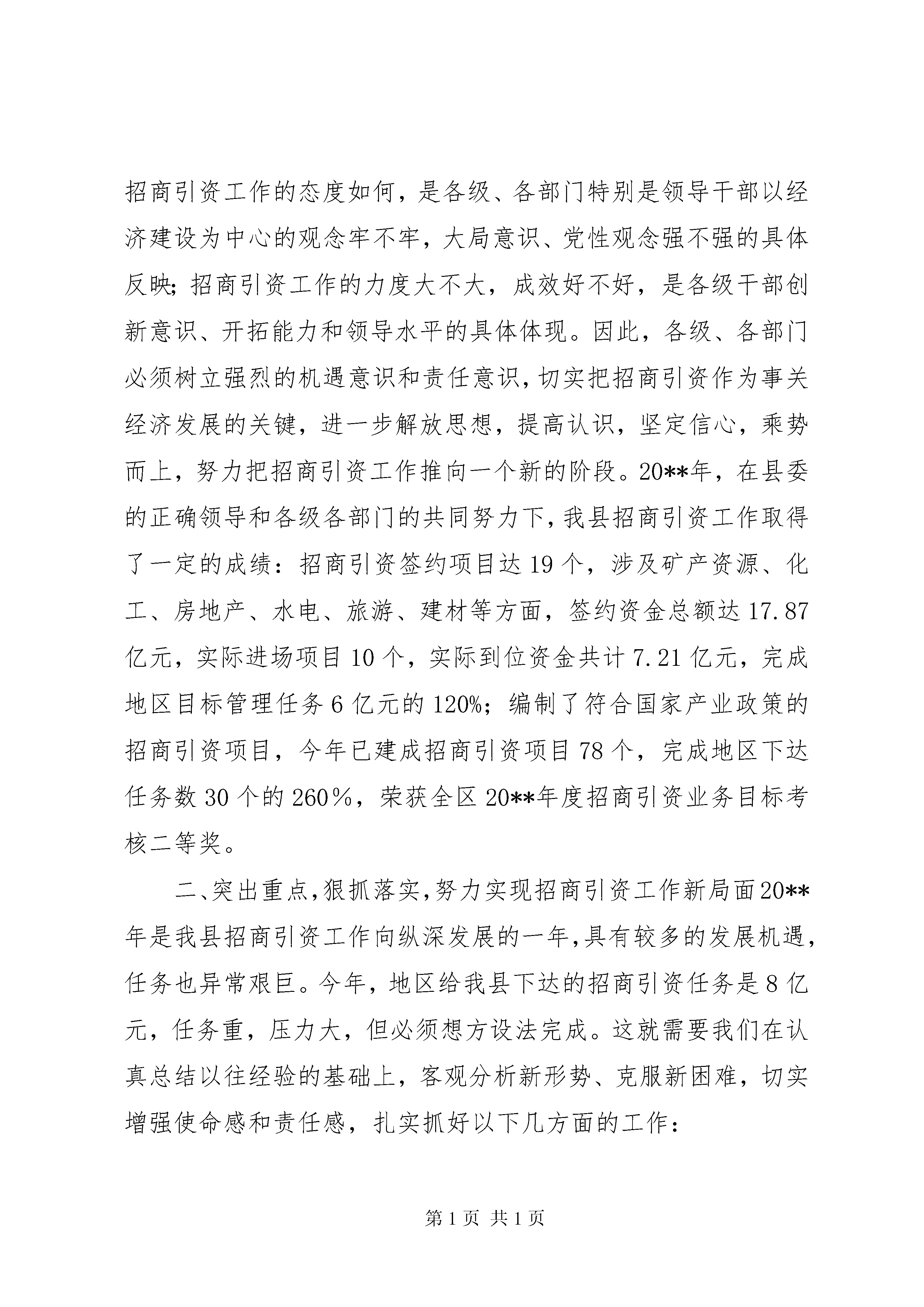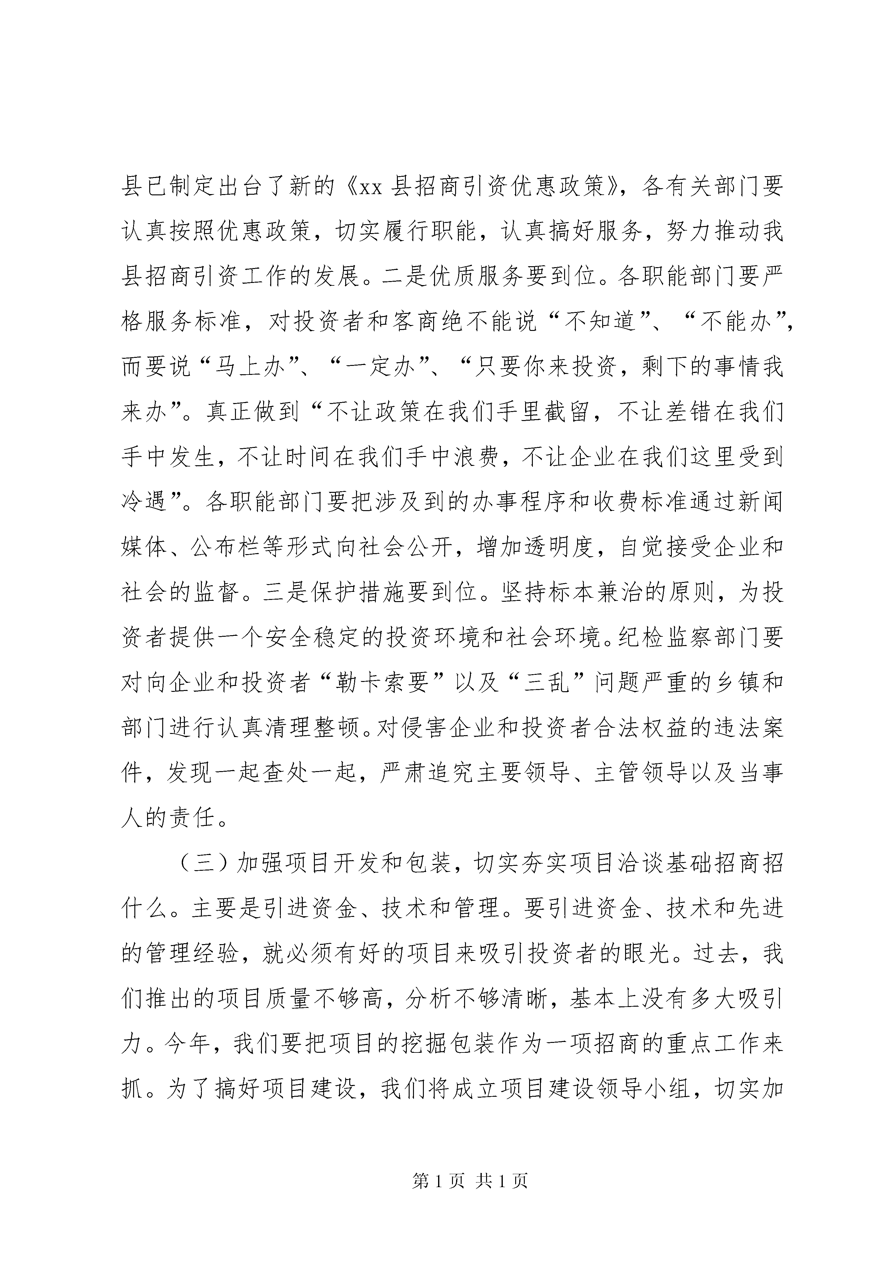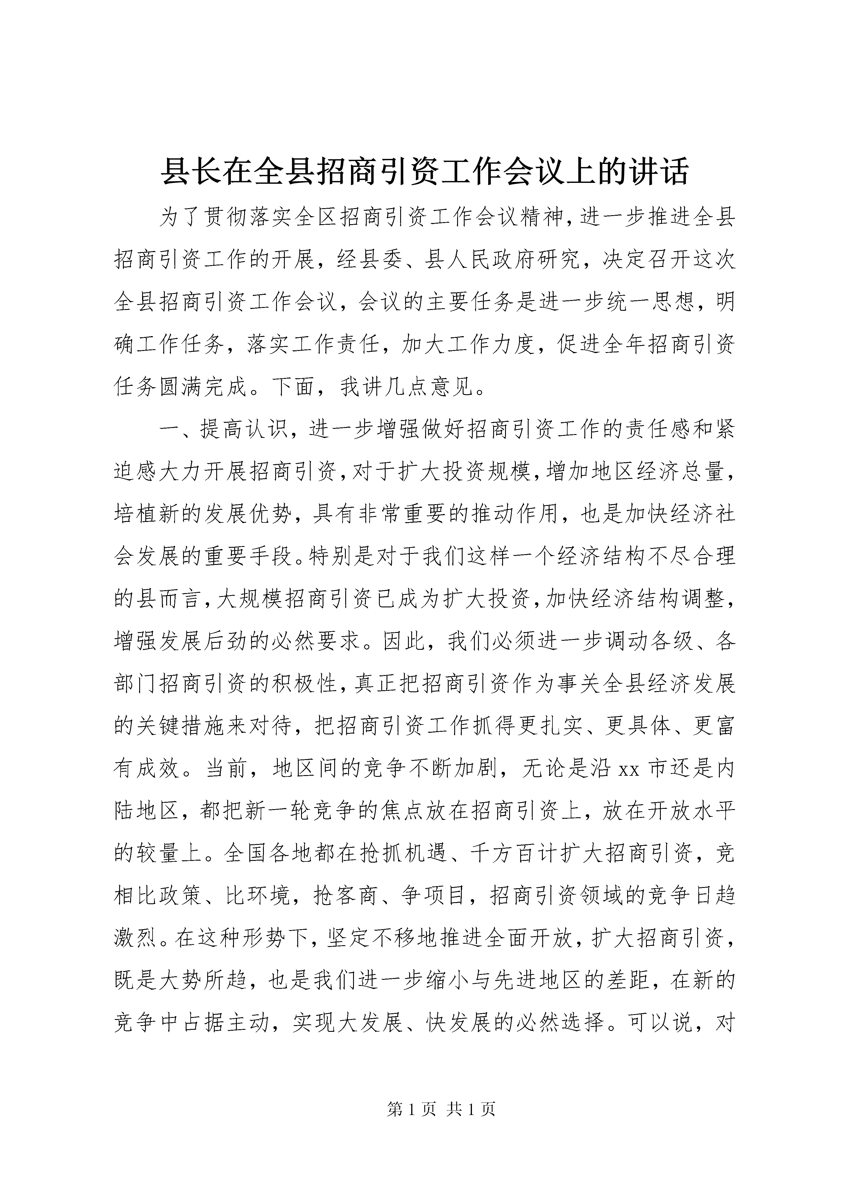 县长在全县招商引资工作会议上的讲话为了贯彻落实全区招商引资工作会议精神,进一步推进全县招商引资工作的开展,经县委、县人民政府研究,决定召开这次全县招商引资工作会议,会议的主要任务是进一步统一思想,明确工作任务,落实工作责任,加大工作力度,促进全年招商引资任务圆满完成。下面,我讲几点意见。一、提高认识,进一步增强做好招商引资工作的责任感和紧迫感大力开展招商引资,对于扩大投资规模,增加地区经济总量,培植新的发展优势,具有非常重要的推动作用,也是加快经济社会发展的重要手段。特别是对于我们这样一个经济结构不尽合理的县而言,大规模招商引资已成为扩大投资,加快经济结构调整,增强发展后劲的必然要求。因此,我们必须进一步调动各级、各部门招商引资的积极性,真正把招商引资作为事关全县经济发展的关键措施来对待,把招商引资工作抓得更扎实、更具体、更富有成效。当前,地区间的竞争不断加剧,无论是沿xx市还是内陆地区,都把新一轮竞争的焦点放在招商引资上,放在开放水平的较量上。全国各地都在抢抓机遇、千方百计扩大招商引资,竞相比政策、比环境,抢客商、争项目,招商引资领域的竞争日趋激烈。在这种形势下,坚定不移地推进全面开放,扩大招商引资,既是大势所趋,也是我们进一步缩小与先进地区的差距,在新的竞争中占据主动,实现大发展、快发展的必然选择。可以说,对招商引资工作的态度如何,是各级、各部门特别是领导干部以经济建设为中心的观念牢不牢,大局意识、党性观念强不强的具体反映;招商引资工作的力度大不大,成效好不好,是各级干部创新意识、开拓能力和领导水平的具体体现。因此,各级、各部门必须树立强烈的机遇意识和责任意识,切实把招商引资作为事关经济发展的关键,进一步解放思想,提高认识,坚定信心,乘势而上,努力把招商引资工作推向一个新的阶段。20**年,在县委的正确领导和各级各部门的共同努力下,我县招商引资工作取得了一定的成绩:招商引资签约项目达19个,涉及矿产资源、化工、房地产、水电、旅游、建材等方面,签约资金总额达17.87亿元,实际进场项目10个,实际到位资金共计7.21亿元,完成地区目标管理任务6亿元的120%;编制了符合国家产业政策的招商引资项目,今年已建成招商引资项目78个,完成地区下达任务数30个的260%,荣获全区20**年度招商引资业务目标考核二等奖。二、突出重点,狠抓落实,努力实现招商引资工作新局面20**年是我县招商引资工作向纵深发展的一年,具有较多的发展机遇,任务也异常艰巨。今年,地区给我县下达的招商引资任务是8亿元,任务重,压力大,但必须想方设法完成。这就需要我们在认真总结以往经验的基础上,客观分析新形势、克服新困难,切实增强使命感和责任感,扎实抓好以下几方面的工作:(一)加大宣传力度,大力营造良好的招商引资氛围要充分利用报刊、电视、互联网等媒体,加大对xx县情、资源、产业以及经济社会发展成就的宣传,大力推介纳雍,千方百计提高我县在国内外的知名度。特别是要充分利用我县的政府网站、招商引资网站,及时在网上发布和更新招商引资信息。纳雍报、电视台要把招商引资工作作为常年宣传的重点,号召全民抓招商,真正形成人人宣传招商、人人参与招商的良好局面。对为纳雍经济社会发展作出贡献的外来投资企业和企业主,要通过各种媒介大张旗鼓地宣传典型事迹。此外,还要注意抓好社会宣传,在主要街面、繁华地段,通过标语、横幅、牌匾等形式,大造舆论氛围。要利用参加经贸洽谈会、走亲访友、同学会、同乡会等一切可能利用的机会,大力宣传我县的招商引资项目、资源优势和优惠政策。要通过宣传形成全县上下都重视招商引资、参与招商引资的良好氛围。(二)改善投资环境,着力塑造纳雍对外开放新形象优化投资环境是招商引资取得成效的重要前提和基础。与周边市县相比,我县在硬环境上没有优势可言,只有使软环境从根本上得到改善,才能巩固现有的投资成果、吸引新的投资者,不断扩大我县的招商引资规模。一是政策优惠要到位。近年来,我们制定出台了一系列优惠政策,起到了良好的效果。但是,与兄弟市县相比还有不足之处,因此我们需要进一步完善招商引资优惠政策。目前我县已制定出台了新的《xx县招商引资优惠政策》,各有关部门要认真按照优惠政策,切实履行职能,认真搞好服务,努力推动我县招商引资工作的发展。二是优质服务要到位。各职能部门要严格服务标准,对投资者和客商绝不能说“不知道”、“不能办”,而要说“马上办”、“一定办”、“只要你来投资,剩下的事情我来办”。真正做到“不让政策在我们手里截留,不让差错在我们手中发生,不让时间在我们手中浪费,不让企业在我们这里受到冷遇”。各职能部门要把涉及到的办事程序和收费标准通过新闻媒体、公布栏等形式向社会公开,增加透明度,自觉接受企业和社会的监督。三是保护措施要到位。坚持标本兼治的原则,为投资者提