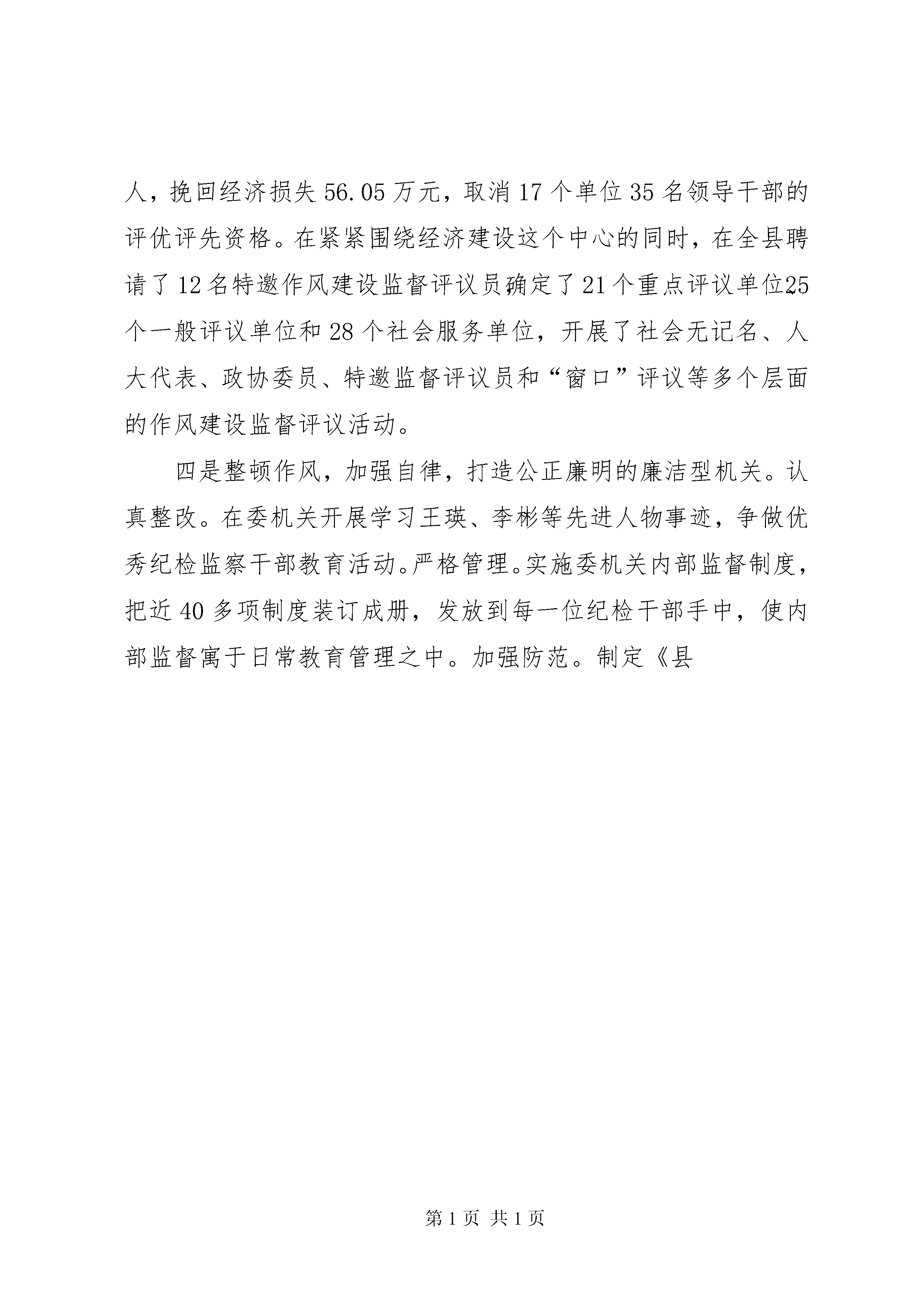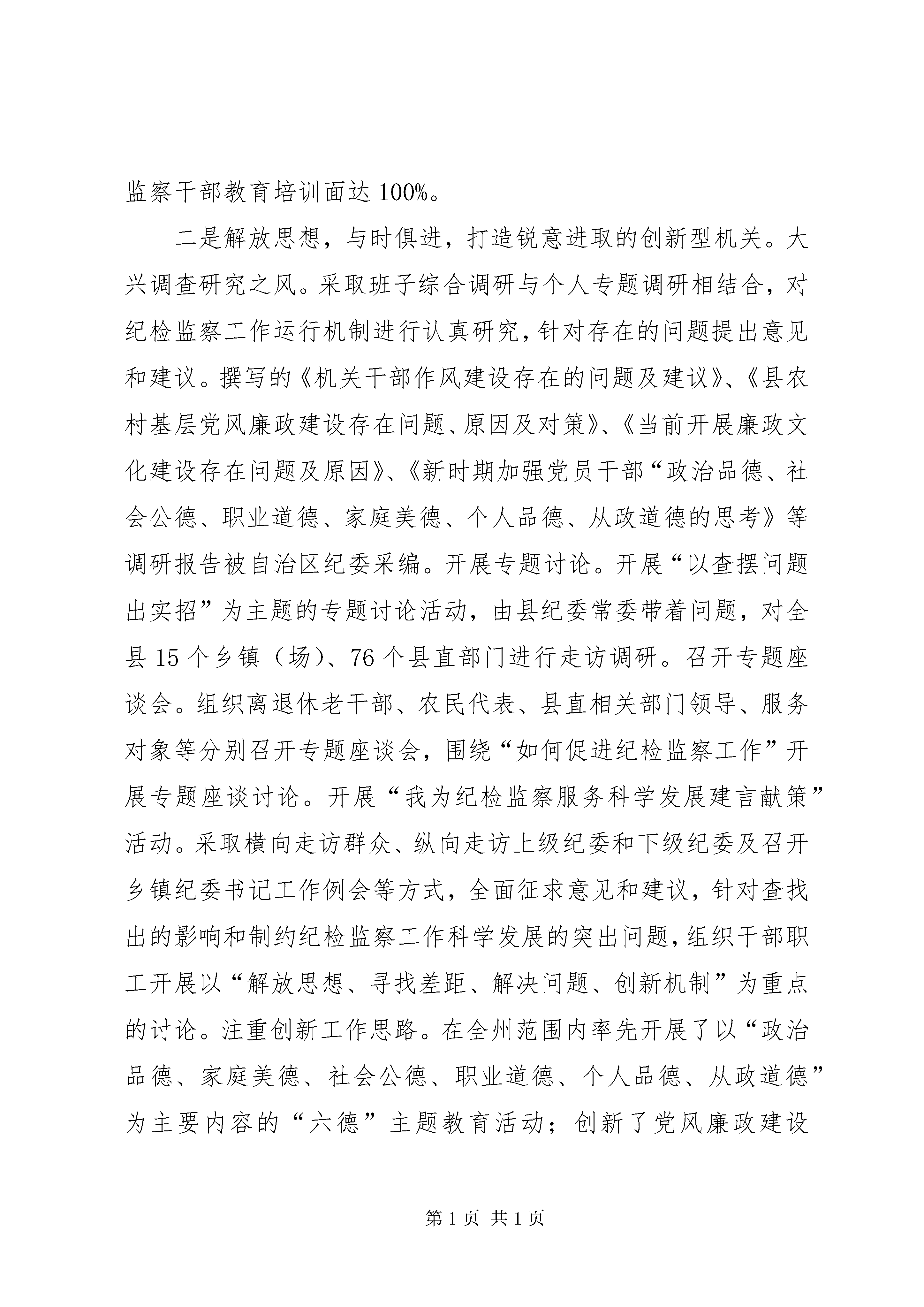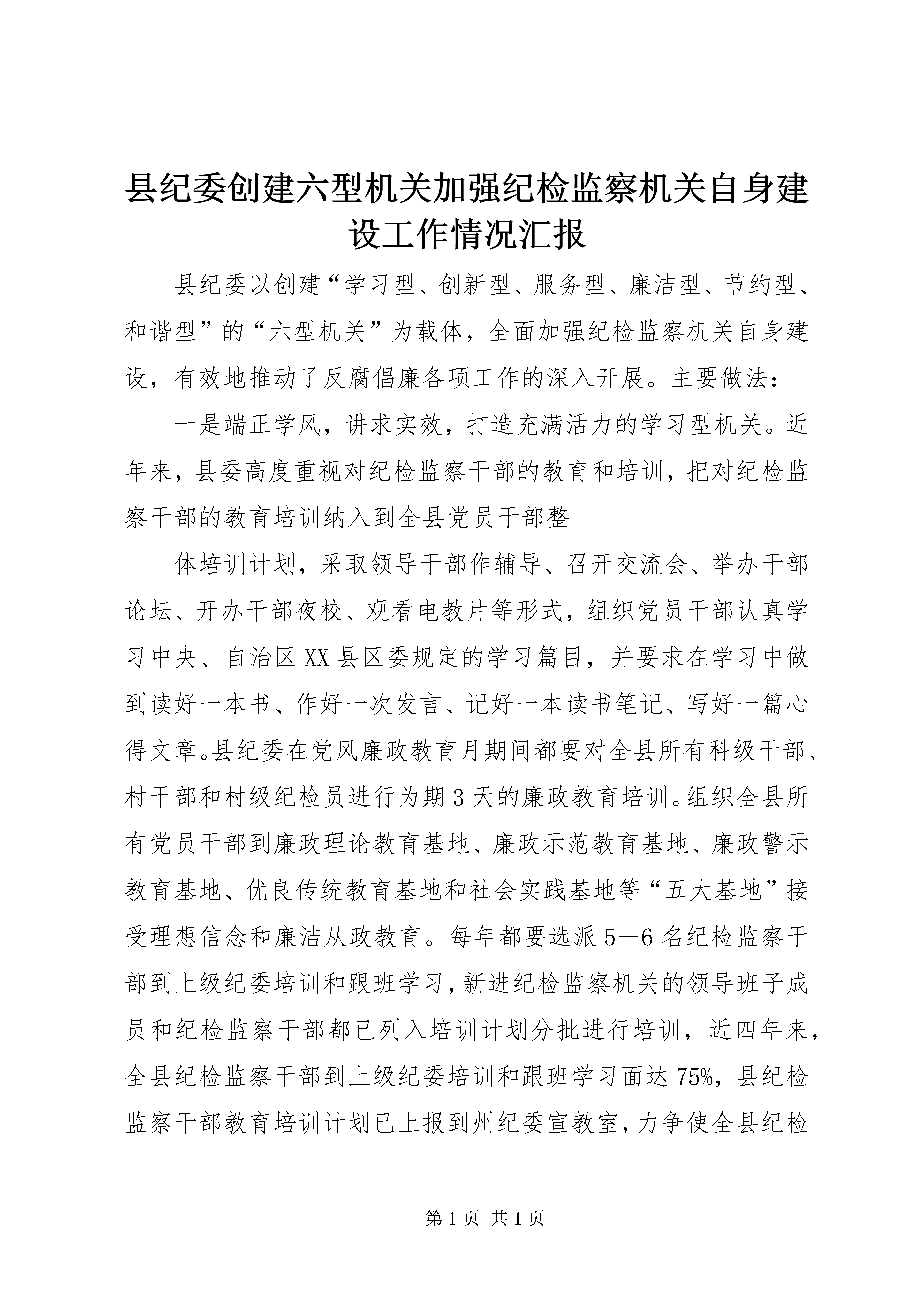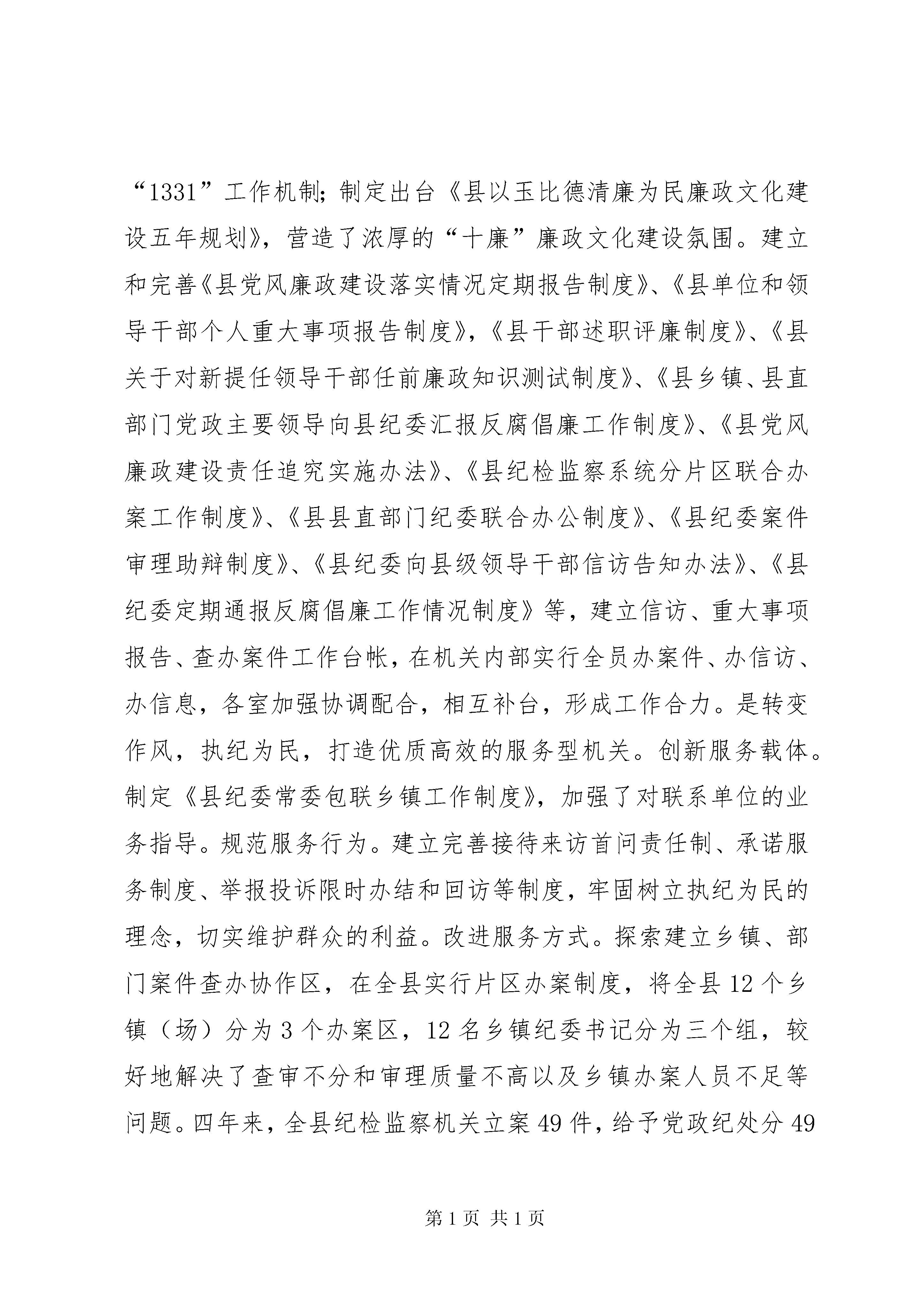 县纪委创建六型机关加强纪检监察机关自身建设工作情况汇报县纪委以创建“学习型、创新型、服务型、廉洁型、节约型、和谐型”的“六型机关”为载体,全面加强纪检监察机关自身建设,有效地推动了反腐倡廉各项工作的深入开展。主要做法:一是端正学风,讲求实效,打造充满活力的学习型机关。近年来,县委高度重视对纪检监察干部的教育和培训,把对纪检监察干部的教育培训纳入到全县党员干部整体培训计划,采取领导干部作辅导、召开交流会、举办干部论坛、开办干部夜校、观看电教片等形式,组织党员干部认真学习中央、自治区XX县区委规定的学习篇目,并要求在学习中做到读好一本书、作好一次发言、记好一本读书笔记、写好一篇心得文章。县纪委在党风廉政教育月期间都要对全县所有科级干部、村干部和村级纪检员进行为期3天的廉政教育培训。组织全县所有党员干部到廉政理论教育基地、廉政示范教育基地、廉政警示教育基地、优良传统教育基地和社会实践基地等“五大基地”接受理想信念和廉洁从政教育。每年都要选派5-6名纪检监察干部到上级纪委培训和跟班学习,新进纪检监察机关的领导班子成员和纪检监察干部都已列入培训计划分批进行培训,近四年来,全县纪检监察干部到上级纪委培训和跟班学习面达75%,县纪检监察干部教育培训计划已上报到州纪委宣教室,力争使全县纪检监察干部教育培训面达100%。二是解放思想,与时俱进,打造锐意进取的创新型机关。大兴调查研究之风。采取班子综合调研与个人专题调研相结合,对纪检监察工作运行机制进行认真研究,针对存在的问题提出意见和建议。撰写的《机关干部作风建设存在的问题及建议》、《县农村基层党风廉政建设存在问题、原因及对策》、《当前开展廉政文化建设存在问题及原因》、《新时期加强党员干部“政治品德、社会公德、职业道德、家庭美德、个人品德、从政道德的思考》等调研报告被自治区纪委采编。开展专题讨论。开展“以查摆问题出实招”为主题的专题讨论活动,由县纪委常委带着问题,对全县15个乡镇(场)、76个县直部门进行走访调研。召开专题座谈会。组织离退休老干部、农民代表、县直相关部门领导、服务对象等分别召开专题座谈会,围绕“如何促进纪检监察工作”开展专题座谈讨论。开展“我为纪检监察服务科学发展建言献策”活动。采取横向走访群众、纵向走访上级纪委和下级纪委及召开乡镇纪委书记工作例会等方式,全面征求意见和建议,针对查找出的影响和制约纪检监察工作科学发展的突出问题,组织干部职工开展以“解放思想、寻找差距、解决问题、创新机制”为重点的讨论。注重创新工作思路。在全州范围内率先开展了以“政治品德、家庭美德、社会公德、职业道德、个人品德、从政道德”为主要内容的“六德”主题教育活动;创新了党风廉政建设“1331”工作机制;制定出台《县以玉比德清廉为民廉政文化建设五年规划》,营造了浓厚的“十廉”廉政文化建设氛围。建立和完善《县党风廉政建设落实情况定期报告制度》、《县单位和领导干部个人重大事项报告制度》,《县干部述职评廉制度》、《县关于对新提任领导干部任前廉政知识测试制度》、《县乡镇、县直部门党政主要领导向县纪委汇报反腐倡廉工作制度》、《县党风廉政建设责任追究实施办法》、《县纪检监察系统分片区联合办案工作制度》、《县县直部门纪委联合办公制度》、《县纪委案件审理助辩制度》、《县纪委向县级领导干部信访告知办法》、《县纪委定期通报反腐倡廉工作情况制度》等,建立信访、重大事项报告、查办案件工作台帐,在机关内部实行全员办案件、办信访、办信息,各室加强协调配合,相互补台,形成工作合力。是转变作风,执纪为民,打造优质高效的服务型机关。创新服务载体。制定《县纪委常委包联乡镇工作制度》,加强了对联系单位的业务指导。规范服务行为。建立完善接待来访首问责任制、承诺服务制度、举报投诉限时办结和回访等制度,牢固树立执纪为民的理念,切实维护群众的利益。改进服务方式。探索建立乡镇、部门案件查办协作区,在全县实行片区办案制度,将全县12个乡镇(场)分为3个办案区,12名乡镇纪委书记分为三个组,较好地解决了查审不分和审理质量不高以及乡镇办案人员不足等问题。四年来,全县纪检监察机关立案49件,给予党政纪处分49人,挽回经济损失56.05万元,取消17个单位35名领导干部的评优评先资格。在紧紧围绕经济建设这个中心的同时,在全县聘请了12名特邀作风建设监督评议员,确定了21个重点评议单位、25个一般评议单位和28个社会服务单位,开展了社会无记名、人大代表、政协委员、特邀监督评议员和“窗口”评议等多个层面的作风建设监督评议活动。四是整顿作风,加强自律,打造公正廉明的廉洁型机关。认真整改。在委机关开展学习王瑛、李彬等先进人物事迹,争做优秀纪检监察干部教育活动。严格管理。实施委机关内部监督制度,把近40多项制度装订成册,发放到每一位纪检干部手中,使内