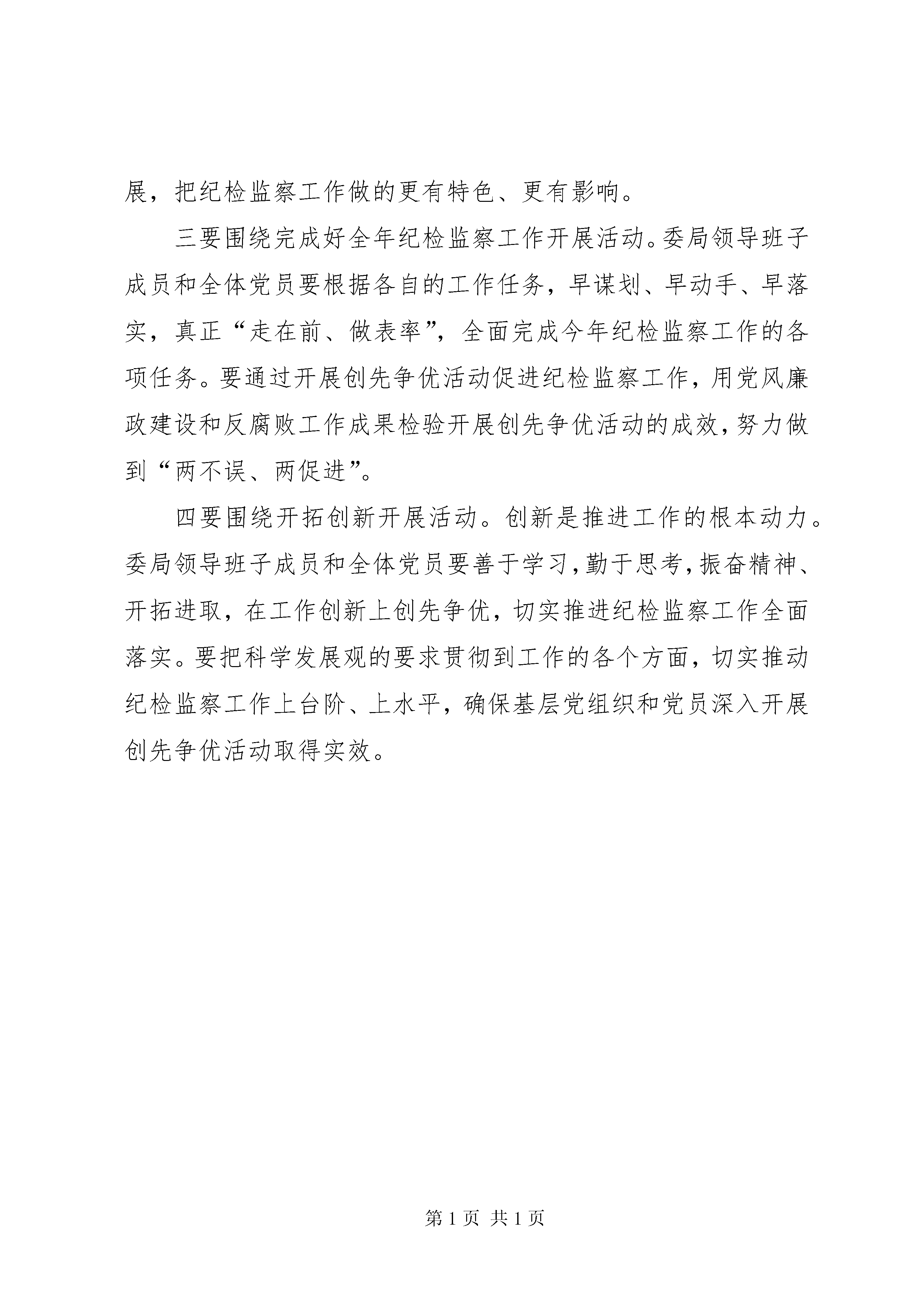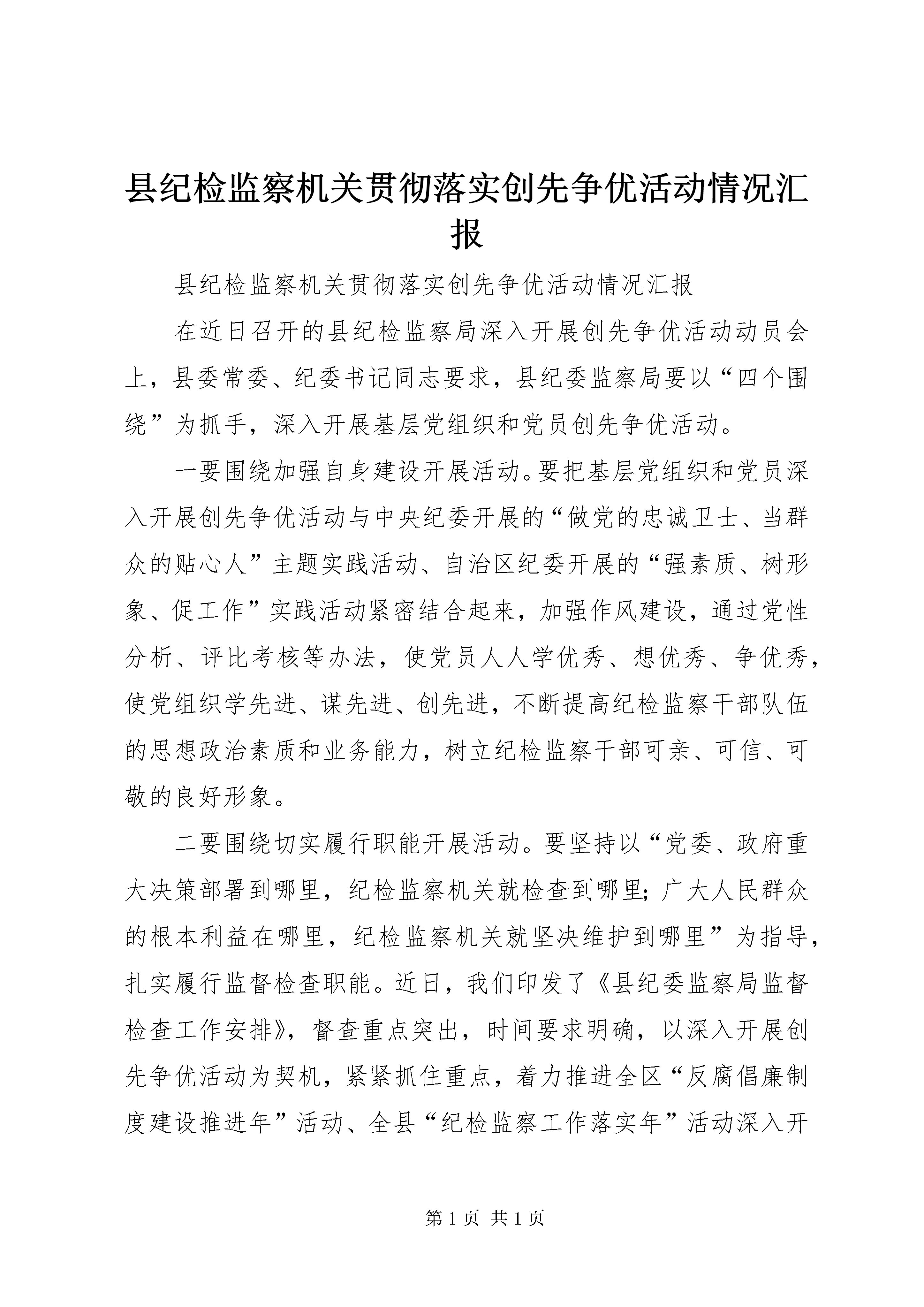 县纪检监察机关贯彻落实创先争优活动情况汇报县纪检监察机关贯彻落实创先争优活动情况汇报在近日召开的县纪检监察局深入开展创先争优活动动员会上,县委常委、纪委书记同志要求,县纪委监察局要以“四个围绕”为抓手,深入开展基层党组织和党员创先争优活动。一要围绕加强自身建设开展活动。要把基层党组织和党员深入开展创先争优活动与中央纪委开展的“做党的忠诚卫士、当群众的贴心人”主题实践活动、自治区纪委开展的“强素质、树形象、促工作”实践活动紧密结合起来,加强作风建设,通过党性分析、评比考核等办法,使党员人人学优秀、想优秀、争优秀,使党组织学先进、谋先进、创先进,不断提高纪检监察干部队伍的思想政治素质和业务能力,树立纪检监察干部可亲、可信、可敬的良好形象。二要围绕切实履行职能开展活动。要坚持以“党委、政府重大决策部署到哪里,纪检监察机关就检查到哪里;广大人民群众的根本利益在哪里,纪检监察机关就坚决维护到哪里”为指导,扎实履行监督检查职能。近日,我们印发了《县纪委监察局监督检查工作安排》,督查重点突出,时间要求明确,以深入开展创先争优活动为契机,紧紧抓住重点,着力推进全区“反腐倡廉制度建设推进年”活动、全县“纪检监察工作落实年”活动深入开展,把纪检监察工作做的更有特色、更有影响。三要围绕完成好全年纪检监察工作开展活动。委局领导班子成员和全体党员要根据各自的工作任务,早谋划、早动手、早落实,真正“走在前、做表率”,全面完成今年纪检监察工作的各项任务。要通过开展创先争优活动促进纪检监察工作,用党风廉政建设和反腐败工作成果检验开展创先争优活动的成效,努力做到“两不误、两促进”。四要围绕开拓创新开展活动。创新是推进工作的根本动力。委局领导班子成员和全体党员要善于学习,勤于思考,振奋精神、开拓进取,在工作创新上创先争优,切实推进纪检监察工作全面落实。要把科学发展观的要求贯彻到工作的各个方面,切实推动纪检监察工作上台阶、上水平,确保基层党组织和党员深入开展创先争优活动取得实效。
