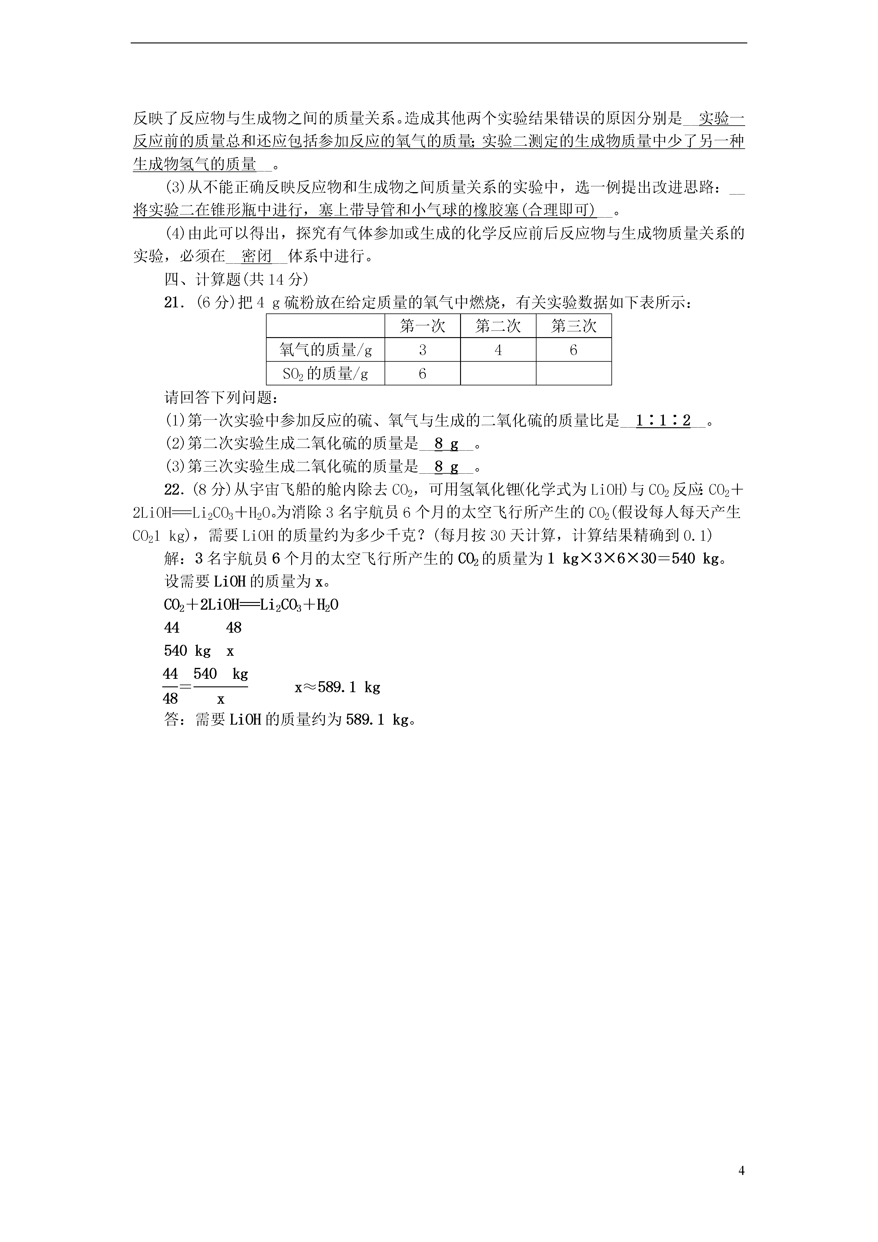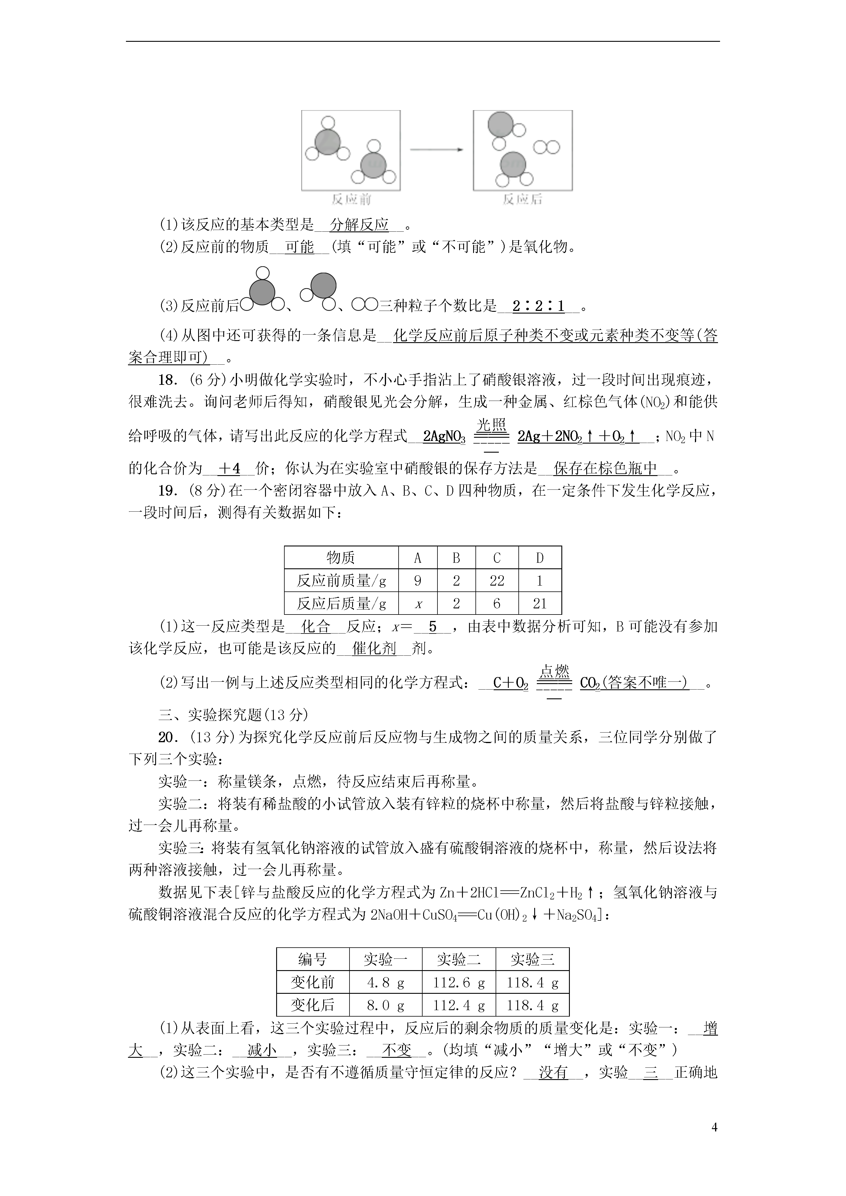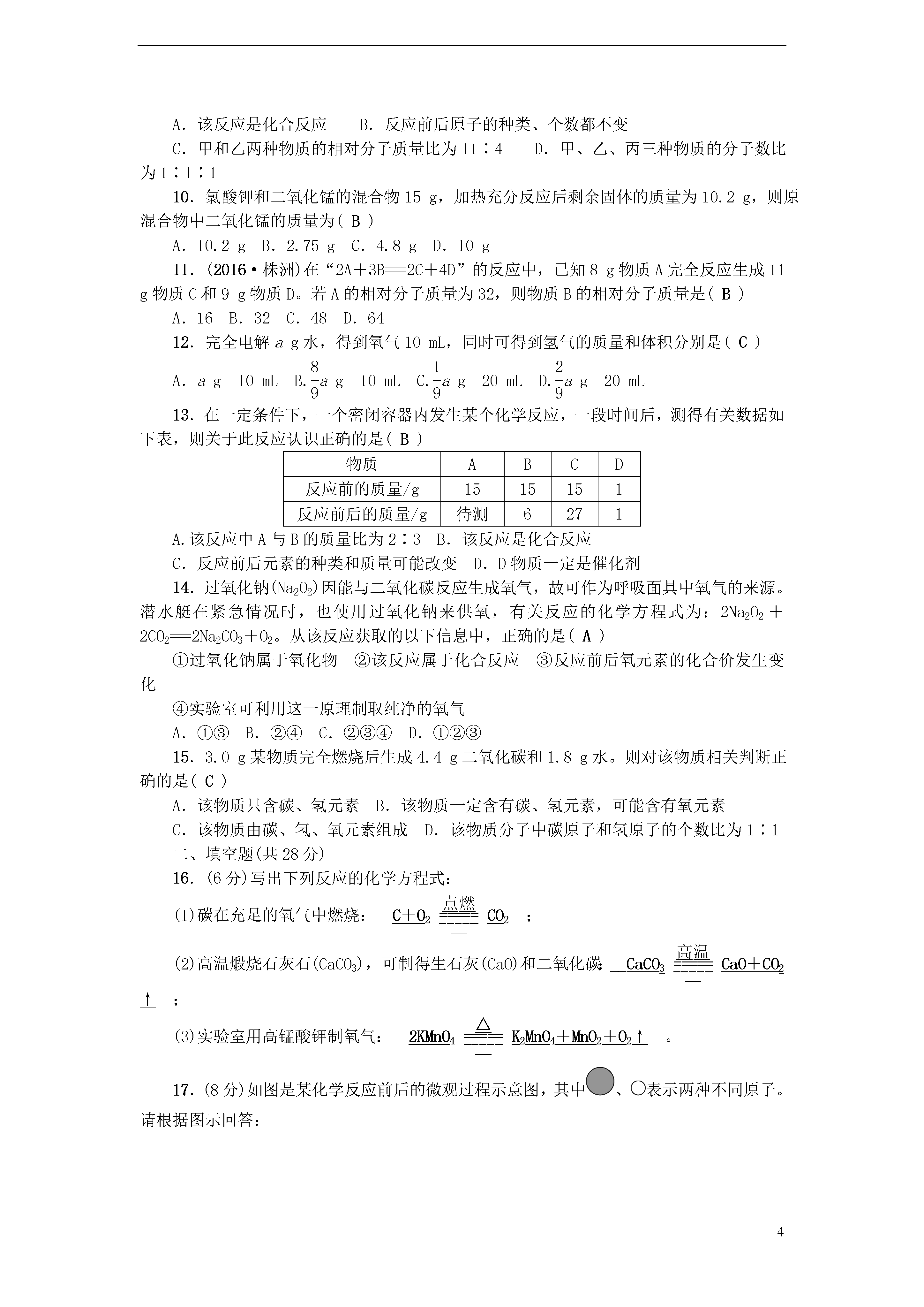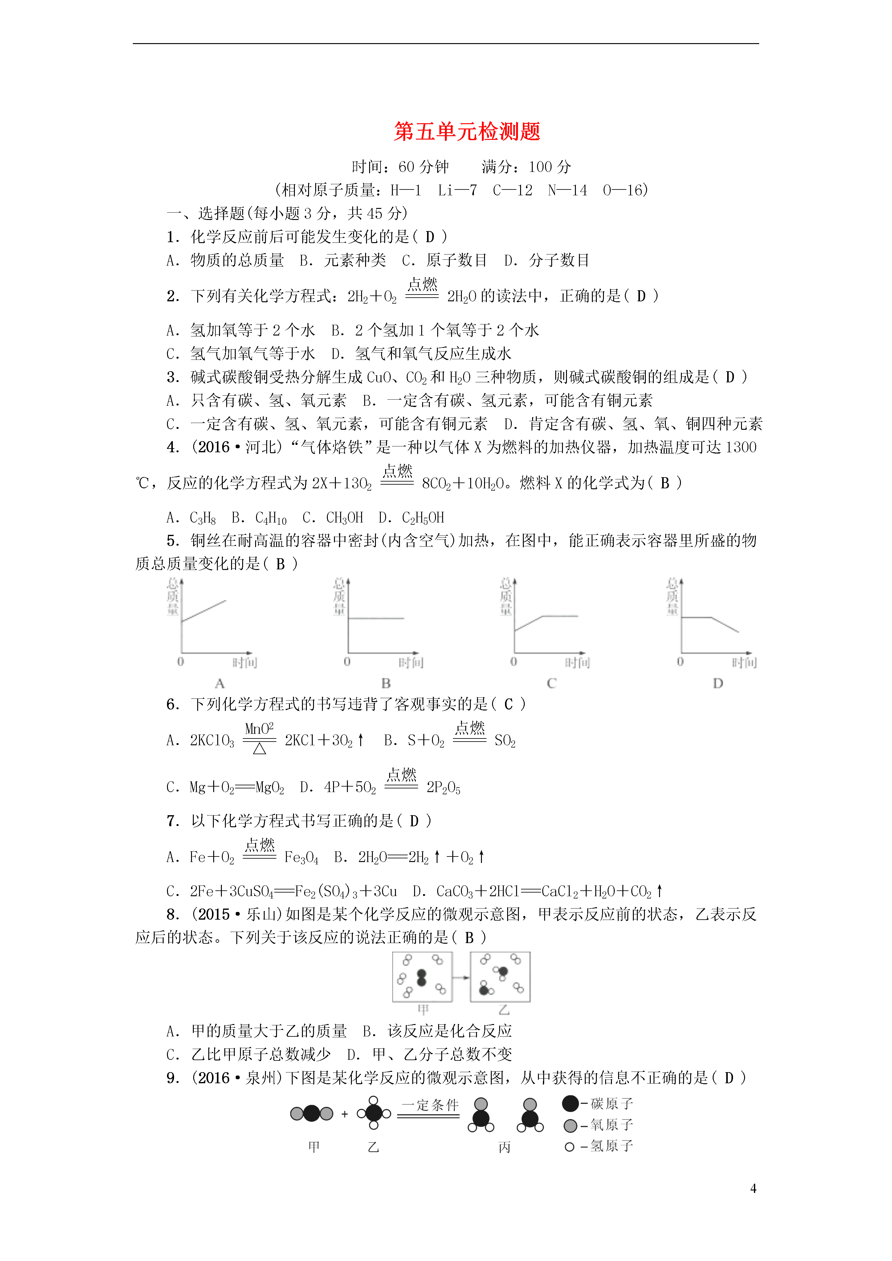 4第五单元检测题时间:60分钟满分:100分(相对原子质量:H—1Li—7C—12N—14O—16)一、选择题(每小题3分,共45分)1.化学反应前后可能发生变化的是(D)A.物质的总质量B.元素种类C.原子数目D.分子数目2.下列有关化学方程式:2H2+O2eq\o(=====,\s\up7(点燃))2H2O的读法中,正确的是(D)A.氢加氧等于2个水B.2个氢加1个氧等于2个水C.氢气加氧气等于水D.氢气和氧气反应生成水3.碱式碳酸铜受热分解生成CuO、CO2和H2O三种物质,则碱式碳酸铜的组成是(D)A.只含有碳、氢、氧元素B.一定含有碳、氢元素,可能含有铜元素C.一定含有碳、氢、氧元素,可能含有铜元素D.肯定含有碳、氢、氧、铜四种元素4.(2016·河北)“气体烙铁”是一种以气体X为燃料的加热仪器,加热温度可达1300℃,反应的化学方程式为2X+13O2eq\o(=====,\s\up7(点燃))8CO2+10H2O。燃料X的化学式为(B)A.C3H8B.C4H10C.CH3OHD.C2H5OH5.铜丝在耐高温的容器中密封(内含空气)加热,在图中,能正确表示容器里所盛的物质总质量变化的是(B)6.下列化学方程式的书写违背了客观事实的是(C)A.2KClO3eq\o(=====,\s\up7(MnO2),\s\do5(△))2KCl+3O2↑B.S+O2eq\o(=====,\s\up7(点燃))SO2C.Mg+O2===MgO2D.4P+5O2eq\o(=====,\s\up7(点燃))2P2O57.以下化学方程式书写正确的是(D)A.Fe+O2eq\o(=====,\s\up7(点燃))Fe3O4B.2H2O===2H2↑+O2↑C.2Fe+3CuSO4===Fe2(SO4)3+3CuD.CaCO3+2HCl===CaCl2+H2O+CO2↑8.(2015·乐山)如图是某个化学反应的微观示意图,甲表示反应前的状态,乙表示反应后的状态。下列关于该反应的说法正确的是(B)A.甲的质量大于乙的质量B.该反应是化合反应C.乙比甲原子总数减少D.甲、乙分子总数不变9.(2016·泉州)下图是某化学反应的微观示意图,从中获得的信息不正确的是(D)A.该反应是化合反应B.反应前后原子的种类、个数都不变C.甲和乙两种物质的相对分子质量比为11∶4D.甲、乙、丙三种物质的分子数比为1∶1∶110.氯酸钾和二氧化锰的混合物15g,加热充分反应后剩余固体的质量为10.2g,则原混合物中二氧化锰的质量为(B)A.10.2gB.2.75gC.4.8gD.10g11.(2016·株洲)在“2A+3B===2C+4D”的反应中,已知8g物质A完全反应生成11g物质C和9g物质D。若A的相对分子质量为32,则物质B的相对分子质量是(B)A.16B.32C.48D.6412.完全电解ag水,得到氧气10mL,同时可得到氢气的质量和体积分别是(C)A.ag10mLB.eq\f(8,9)ag10mLC.eq\f(1,9)ag20mLD.eq\f(2,9)ag20mL13.在一定条件下,一个密闭容器内发生某个化学反应,一段时间后,测得有关数据如下表,则关于此反应认识正确的是(B)物质ABCD反应前的质量/g1515151反应前后的质量/g待测6271A.该反应中A与B的质量比为2∶3B.该反应是化合反应C.反应前后元素的种类和质量可能改变D.D物质一定是催化剂14.过氧化钠(Na2O2)因能与二氧化碳反应生成氧气,故可作为呼吸面具中氧气的来源。潜水艇在紧急情况时,也使用过氧化钠来供氧,有关反应的化学方程式为:2Na2O2+2CO2===2Na2CO3+O2。从该反应获取的以下信息中,正确的是(A)①过氧化钠属于氧化物②该反应属于化合反应③反应前后氧元素的化合价发生变化④实验室可利用这一原理制取纯净的氧气A.①③B.②④C.②③④D.①②③15.3.0g某物质完全燃烧后生成4.4g二氧化碳和1.8g水。则对该物质相关判断正确的是(C)A.该物质只含碳、氢元素B.该物质一定含有碳、氢元素,可能含有氧元素C.该物质由碳、氢、氧元素组成D.该物质分子中碳原子和氢原子的个数比为1∶1二、填空题(共28分)16.(6分)写出下列反应的化学方程式:(1)碳在充足的氧气中燃烧:__C+O2eq\o(=====,\s\up7(点燃))CO2__;(2)高温煅烧石灰石(CaCO3),可制得生石灰(CaO)和二氧化碳:__CaCO3eq\o(=====,\s\up7(高温))CaO+CO2↑__;(