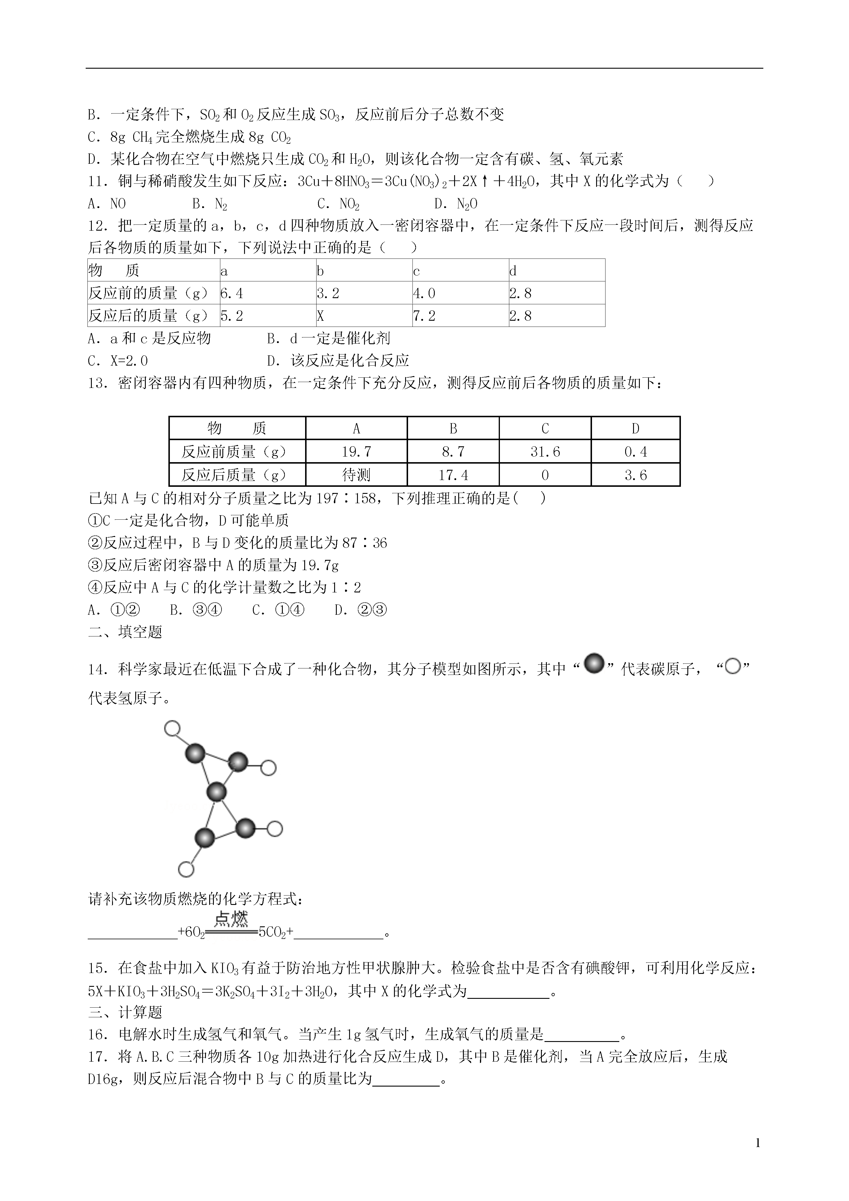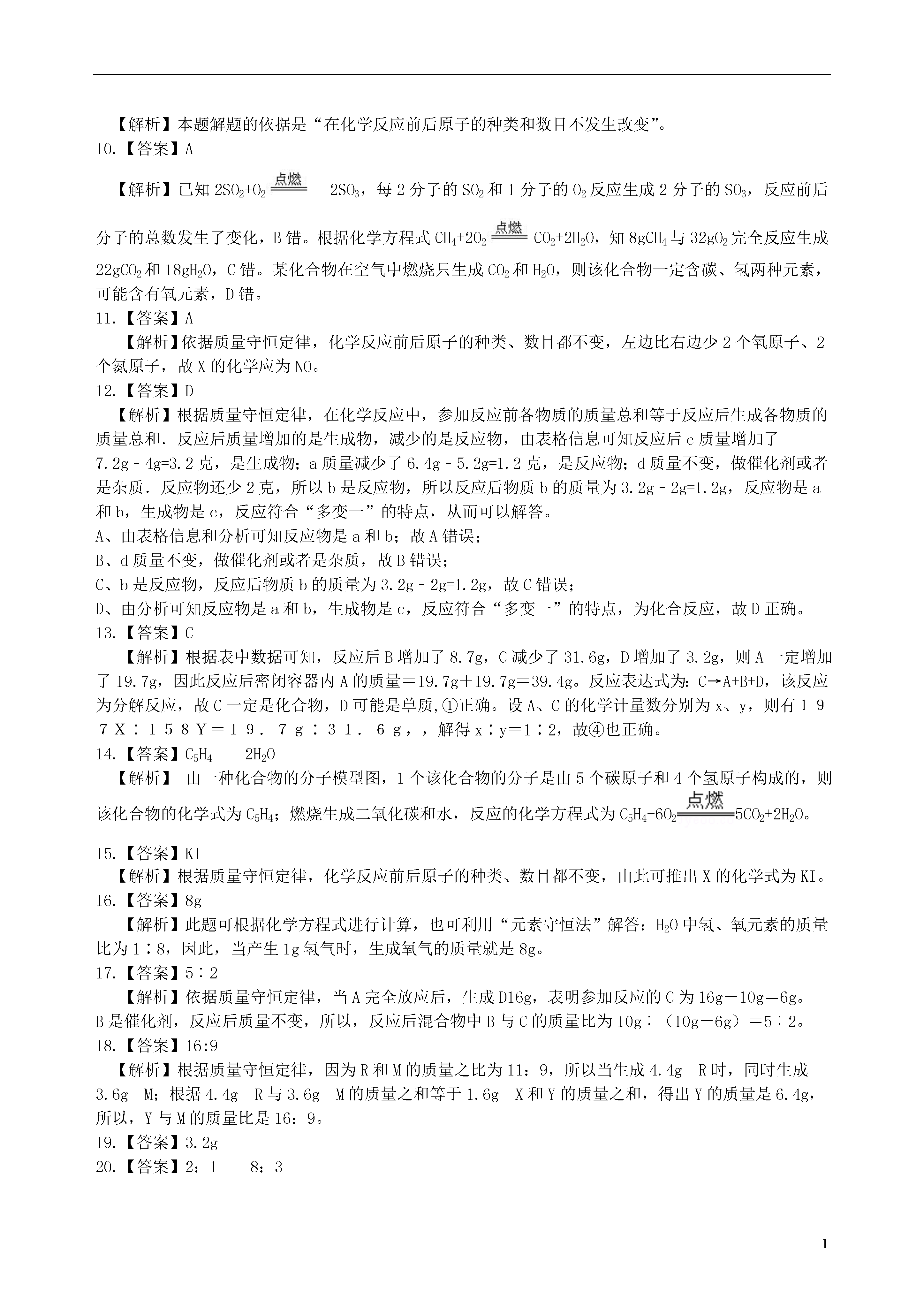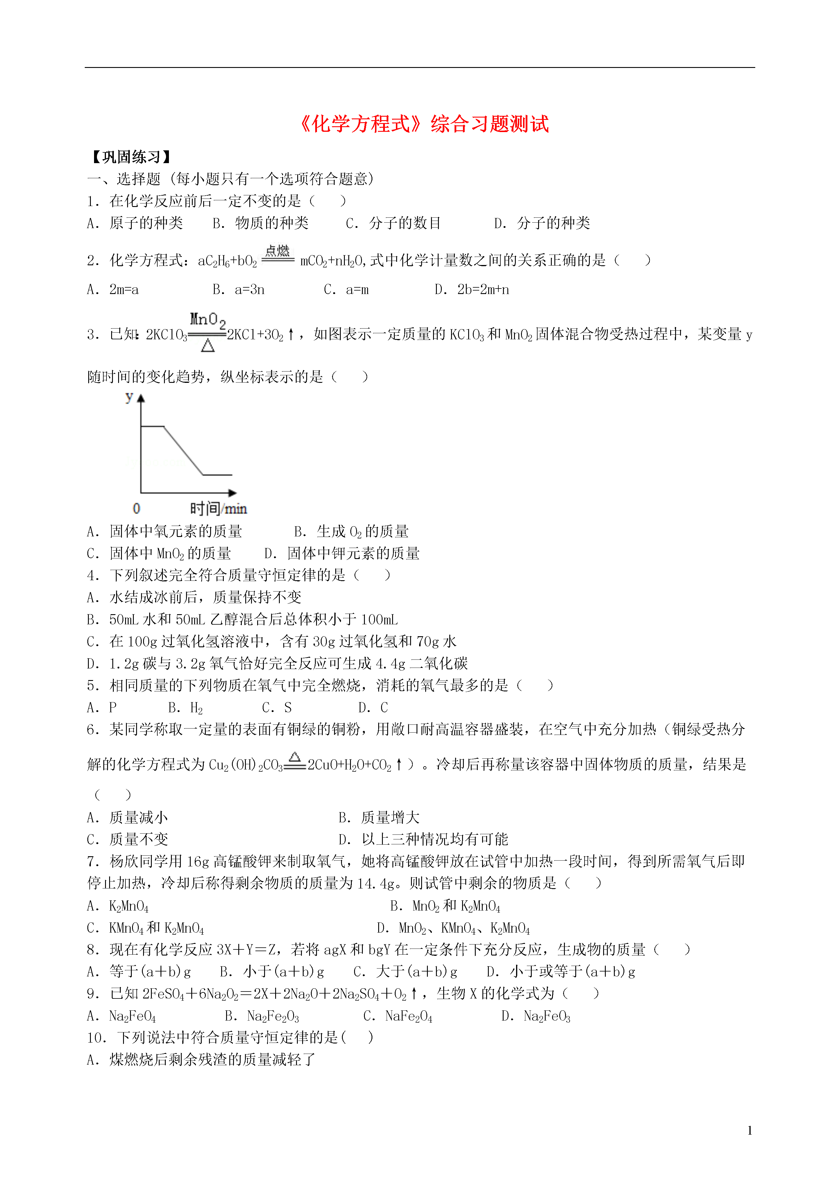 1《化学方程式》综合习题测试【巩固练习】选择题(每小题只有一个选项符合题意)1.在化学反应前后一定不变的是()A.原子的种类B.物质的种类C.分子的数目D.分子的种类2.化学方程式:aC2H6+bO2mCO2+nH2O,式中化学计量数之间的关系正确的是()A.2m=aB.a=3nC.a=mD.2b=2m+n3.已知:2KClO32KCl+3O2↑,如图表示一定质量的KClO3和MnO2固体混合物受热过程中,某变量y随时间的变化趋势,纵坐标表示的是()A.固体中氧元素的质量B.生成O2的质量C.固体中MnO2的质量D.固体中钾元素的质量4.下列叙述完全符合质量守恒定律的是()A.水结成冰前后,质量保持不变B.50mL水和50mL乙醇混合后总体积小于100mLC.在100g过氧化氢溶液中,含有30g过氧化氢和70g水D.1.2g碳与3.2g氧气恰好完全反应可生成4.4g二氧化碳5.相同质量的下列物质在氧气中完全燃烧,消耗的氧气最多的是()A.PB.H2C.SD.C6.某同学称取一定量的表面有铜绿的铜粉,用敞口耐高温容器盛装,在空气中充分加热(铜绿受热分解的化学方程式为Cu2(OH)2CO32CuO+H2O+CO2↑)。冷却后再称量该容器中固体物质的质量,结果是()A.质量减小B.质量增大C.质量不变D.以上三种情况均有可能7.杨欣同学用16g高锰酸钾来制取氧气,她将高锰酸钾放在试管中加热一段时间,得到所需氧气后即停止加热,冷却后称得剩余物质的质量为14.4g。则试管中剩余的物质是()A.K2MnO4B.MnO2和K2MnO4C.KMnO4和K2MnO4D.MnO2、KMnO4、K2MnO48.现在有化学反应3X+Y=Z,若将agX和bgY在一定条件下充分反应,生成物的质量()A.等于(a+b)gB.小于(a+b)gC.大于(a+b)gD.小于或等于(a+b)g9.已知2FeSO4+6Na2O2=2X+2Na2O+2Na2SO4+O2↑,生物X的化学式为()A.Na2FeO4B.Na2Fe2O3C.NaFe2O4D.Na2FeO310.下列说法中符合质量守恒定律的是()A.煤燃烧后剩余残渣的质量减轻了B.一定条件下,SO2和O2反应生成SO3,反应前后分子总数不变C.8gCH4完全燃烧生成8gCO2D.某化合物在空气中燃烧只生成CO2和H2O,则该化合物一定含有碳、氢、氧元素11.铜与稀硝酸发生如下反应:3Cu+8HNO3=3Cu(NO3)2+2X↑+4H2O,其中X的化学式为()A.NOB.N2C.NO2D.N2O12.把一定质量的a,b,c,d四种物质放入一密闭容器中,在一定条件下反应一段时间后,测得反应后各物质的质量如下,下列说法中正确的是()物质abcd反应前的质量(g)6.43.24.02.8反应后的质量(g)5.2X7.22.8A.a和c是反应物B.d一定是催化剂C.X=2.0D.该反应是化合反应13.密闭容器内有四种物质,在一定条件下充分反应,测得反应前后各物质的质量如下:物质ABCD反应前质量(g)19.78.731.60.4反应后质量(g)待测17.403.6已知A与C的相对分子质量之比为197∶158,下列推理正确的是()①C一定是化合物,D可能单质②反应过程中,B与D变化的质量比为87∶36③反应后密闭容器中A的质量为19.7g④反应中A与C的化学计量数之比为1∶2A.①②B.③④C.①④D.②③二、填空题14.科学家最近在低温下合成了一种化合物,其分子模型如图所示,其中“”代表碳原子,“”代表氢原子。请补充该物质燃烧的化学方程式:+6O25CO2+。15.在食盐中加入KIO3有益于防治地方性甲状腺肿大。检验食盐中是否含有碘酸钾,可利用化学反应:5X+KIO3+3H2SO4=3K2SO4+3I2+3H2O,其中X的化学式为。三、计算题16.电解水时生成氢气和氧气。当产生1g氢气时,生成氧气的质量是。17.将A.B.C三种物质各10g加热进行化合反应生成D,其中B是催化剂,当A完全放应后,生成D16g,则反应后混合物中B与C的质量比为。18.在反应X+2Y=R+2M中,当1.6gX与Y完全反应生成4.4gR,且反应生成的R和M的质量之比为11:9,则在此反应中Y和M的质量之比是。19.在氢气还原氧化铜的实验中,若4gCuO充分反应,那么在理论上应获得单质铜的质量为。20.将氧化铜和氧化镁分别放入足量的稀硫酸中,当生成等质量的水时,需要消耗氧化铜和氧化镁的质量比为,这些参加反应的氧化物中,铜、镁元素的质量比是。【答案与解析】1.【答案】A【解析】化学反应前后六个不变:宏观上①