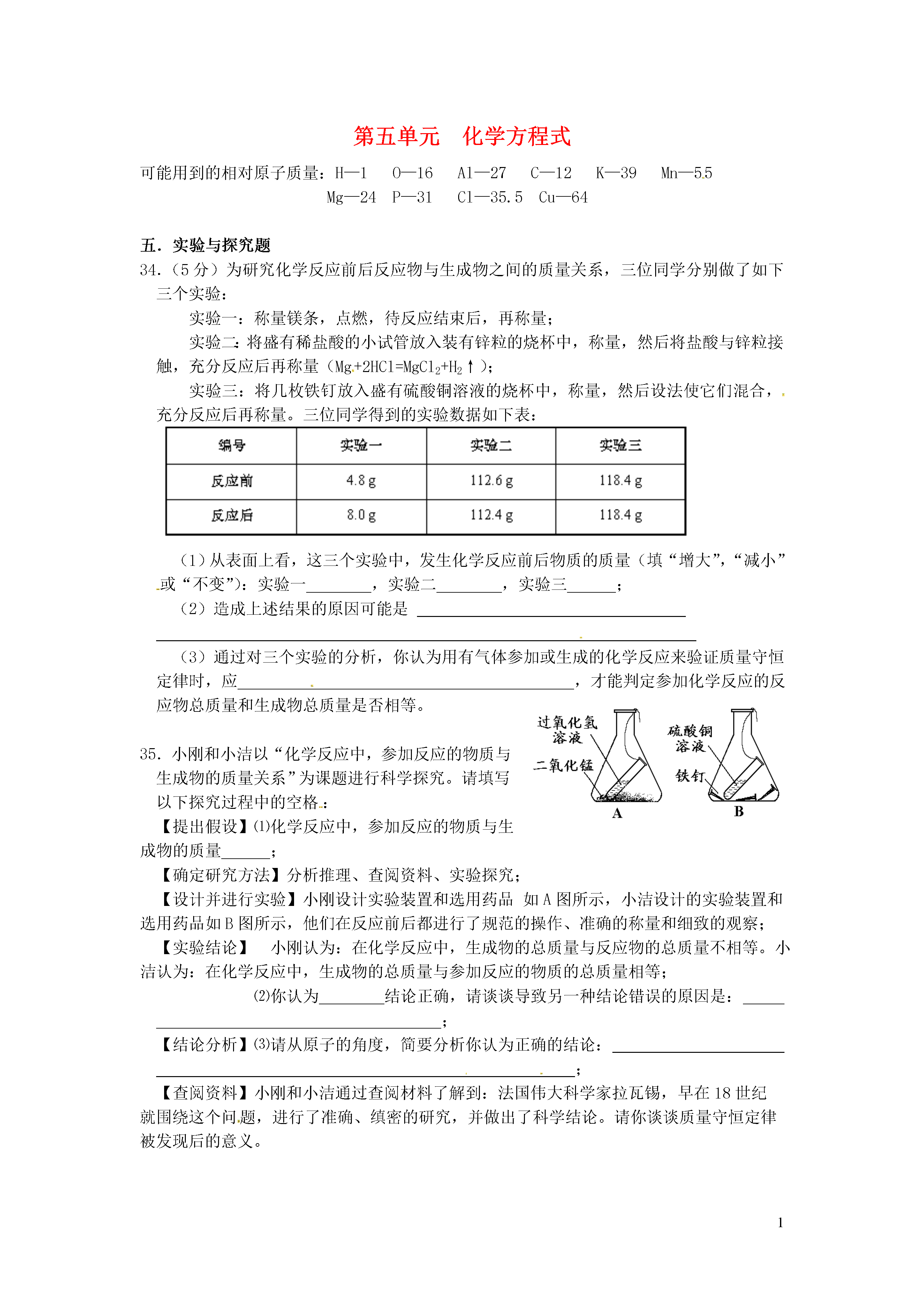 1第五单元化学方程式可能用到的相对原子质量:H—1O—16Al—27C—12K—39Mn—55Mg—24P—31Cl—35.5Cu—64五.实验与探究题34.(5分)为研究化学反应前后反应物与生成物之间的质量关系,三位同学分别做了如下三个实验:实验一:称量镁条,点燃,待反应结束后,再称量;实验二:将盛有稀盐酸的小试管放入装有锌粒的烧杯中,称量,然后将盐酸与锌粒接触,充分反应后再称量(Mg+2HCl=MgCl2+H2↑);实验三:将几枚铁钉放入盛有硫酸铜溶液的烧杯中,称量,然后设法使它们混合,充分反应后再称量。三位同学得到的实验数据如下表:(1)从表面上看,这三个实验中,发生化学反应前后物质的质量(填“增大”,“减小”或“不变”):实验一,实验二,实验三;(2)造成上述结果的原因可能是(3)通过对三个实验的分析,你认为用有气体参加或生成的化学反应来验证质量守恒定律时,应,才能判定参加化学反应的反应物总质量和生成物总质量是否相等。35.小刚和小洁以“化学反应中,参加反应的物质与生成物的质量关系”为课题进行科学探究。请填写以下探究过程中的空格:【提出假设】⑴化学反应中,参加反应的物质与生成物的质量;【确定研究方法】分析推理、查阅资料、实验探究;【设计并进行实验】小刚设计实验装置和选用药品如A图所示,小洁设计的实验装置和选用药品如B图所示,他们在反应前后都进行了规范的操作、准确的称量和细致的观察;【实验结论】小刚认为:在化学反应中,生成物的总质量与反应物的总质量不相等。小洁认为:在化学反应中,生成物的总质量与参加反应的物质的总质量相等;⑵你认为结论正确,请谈谈导致另一种结论错误的原因是:;【结论分析】⑶请从原子的角度,简要分析你认为正确的结论:;【查阅资料】小刚和小洁通过查阅材料了解到:法国伟大科学家拉瓦锡,早在18世纪就围绕这个问题,进行了准确、缜密的研究,并做出了科学结论。请你谈谈质量守恒定律被发现后的意义。【结论应用】⑷环保部门用I2O5测定空气受CO污染的程度,发生反应的化学方程式为:I2O5+5CO=I2+5X,根据生成X的多少,可以判断CO的含量,X的化学式为:____。