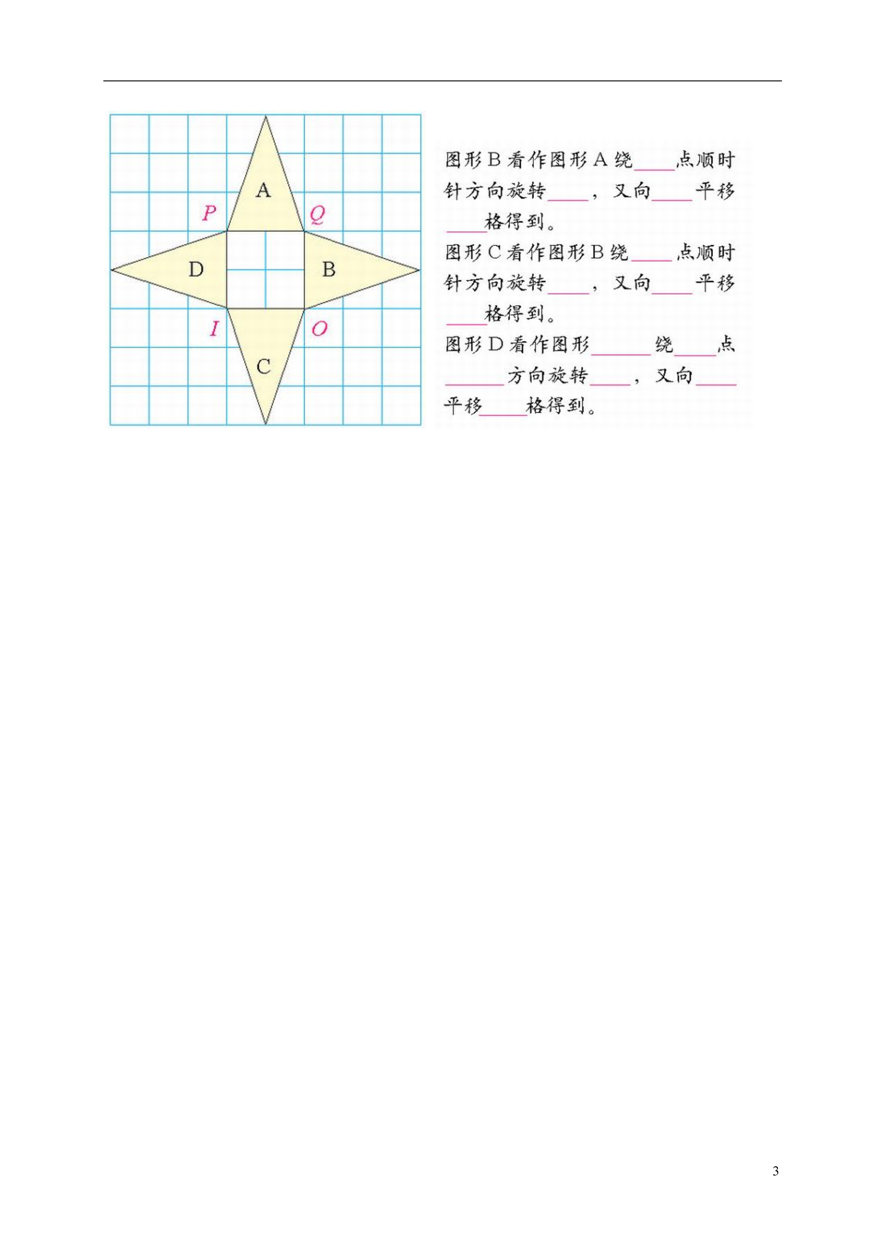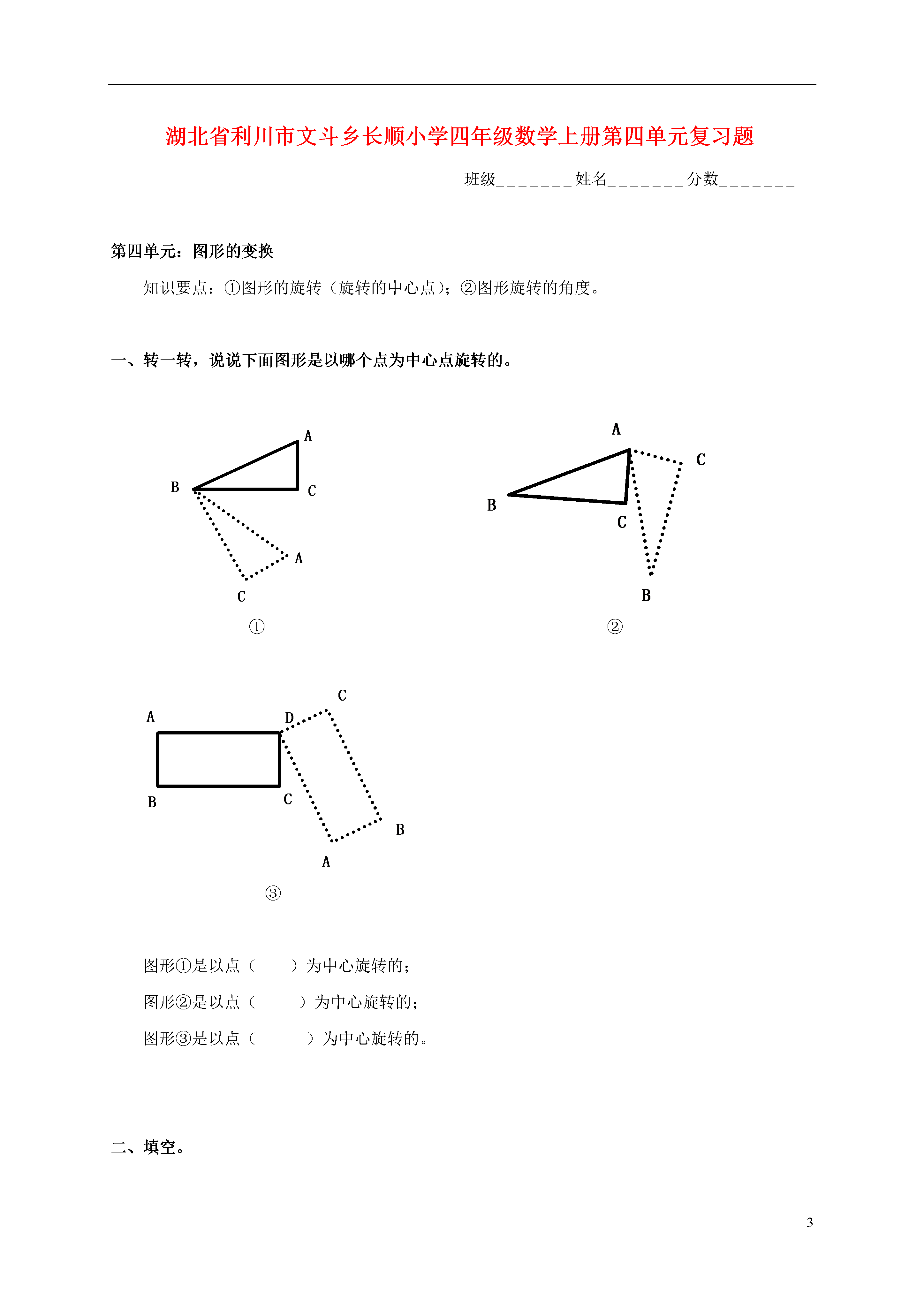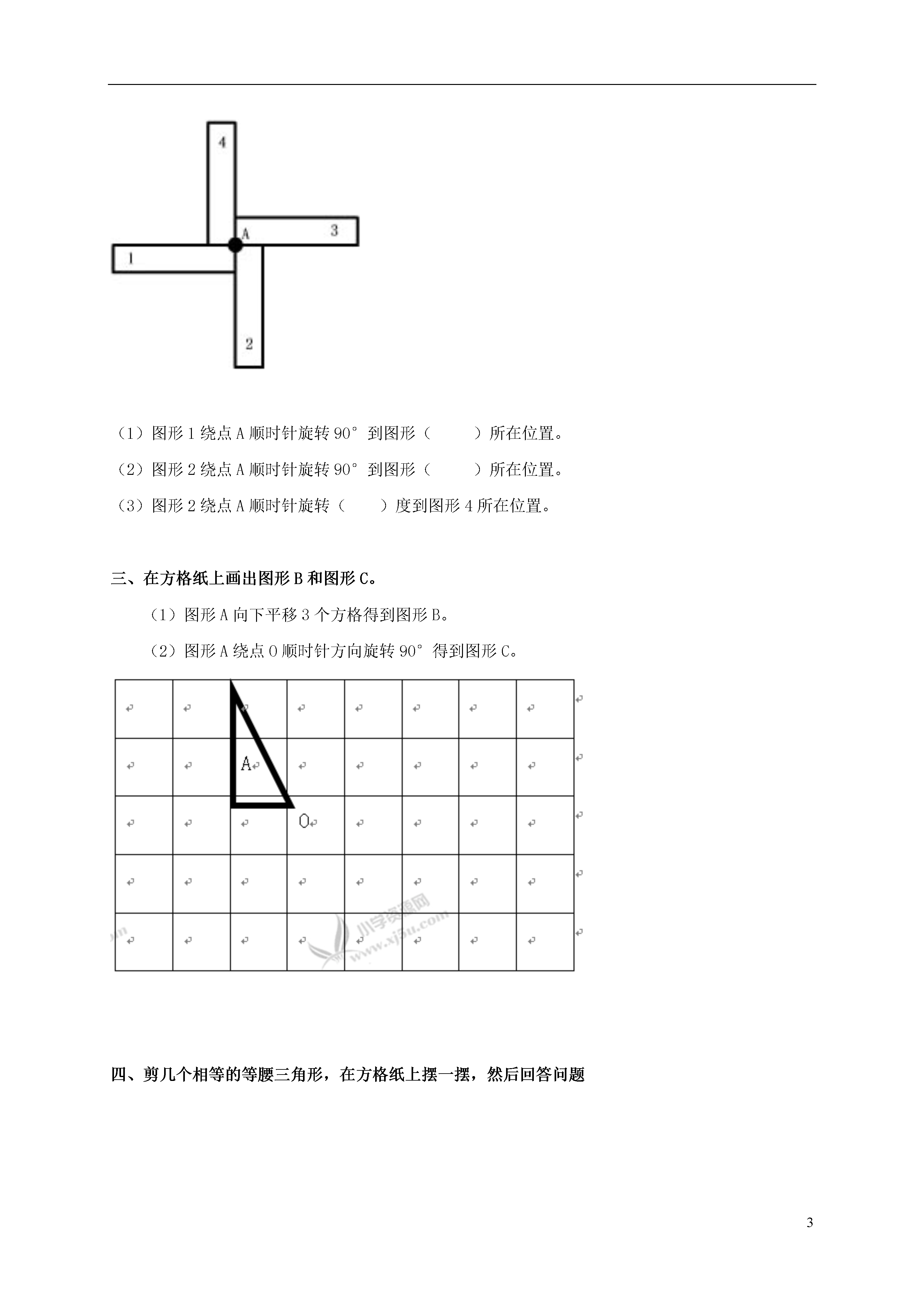 3湖北省利川市文斗乡长顺小学四年级数学上册第四单元复习题班级_______姓名_______分数_______第四单元:图形的变换知识要点:①图形的旋转(旋转的中心点);②图形旋转的角度。一、转一转,说说下面图形是以哪个点为中心点旋转的。①②③图形①是以点()为中心旋转的;图形②是以点()为中心旋转的;图形③是以点()为中心旋转的。二、填空。(1)图形1绕点A顺时针旋转90°到图形()所在位置。(2)图形2绕点A顺时针旋转90°到图形()所在位置。(3)图形2绕点A顺时针旋转()度到图形4所在位置。三、在方格纸上画出图形B和图形C。(1)图形A向下平移3个方格得到图形B。(2)图形A绕点O顺时针方向旋转90°得到图形C。四、剪几个相等的等腰三角形,在方格纸上摆一摆,然后回答问题