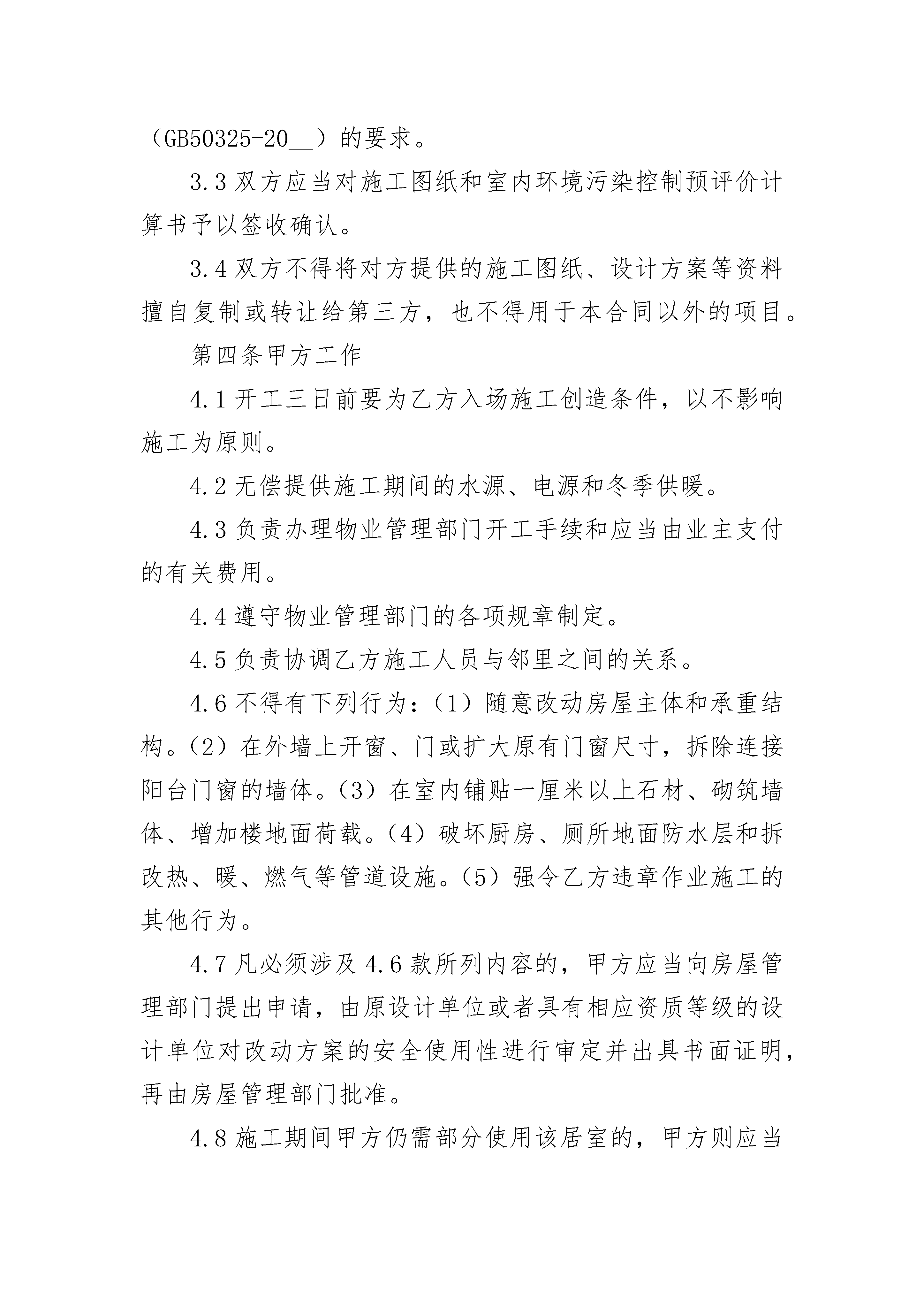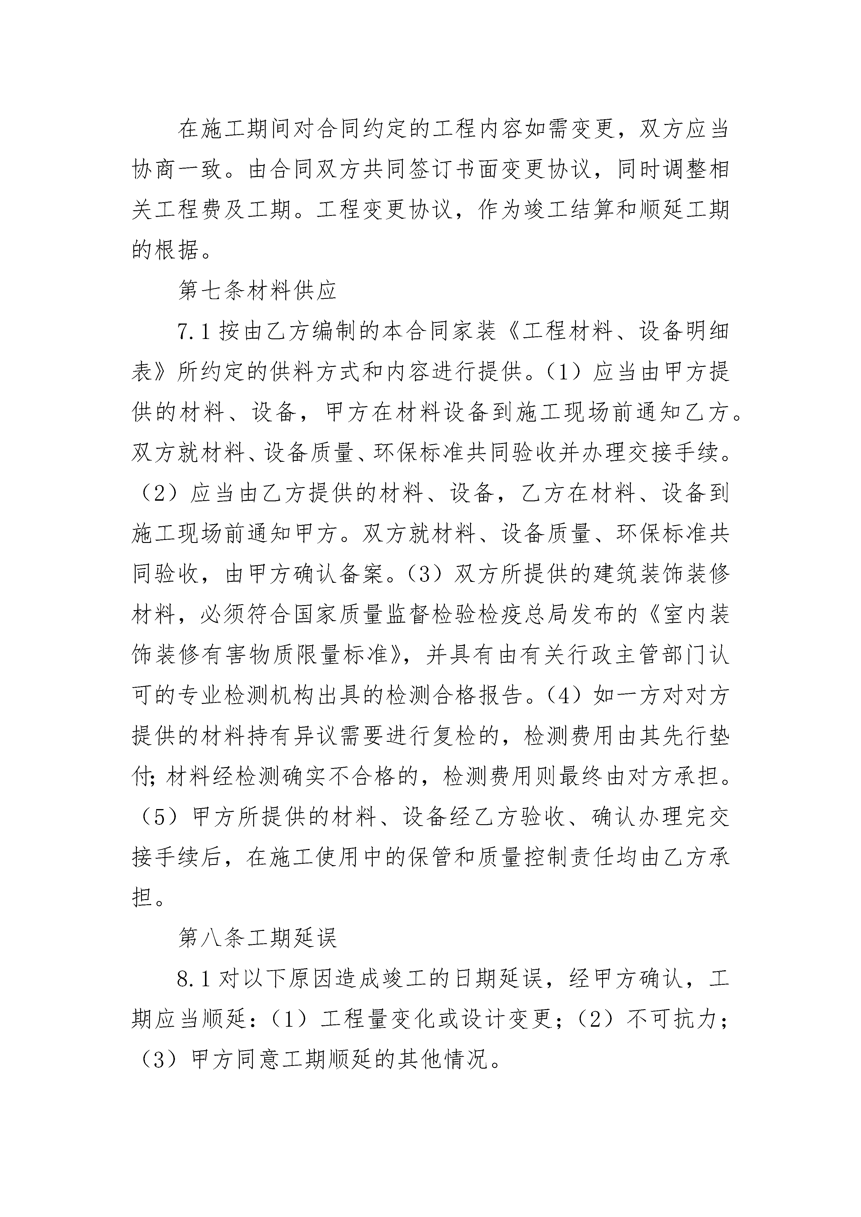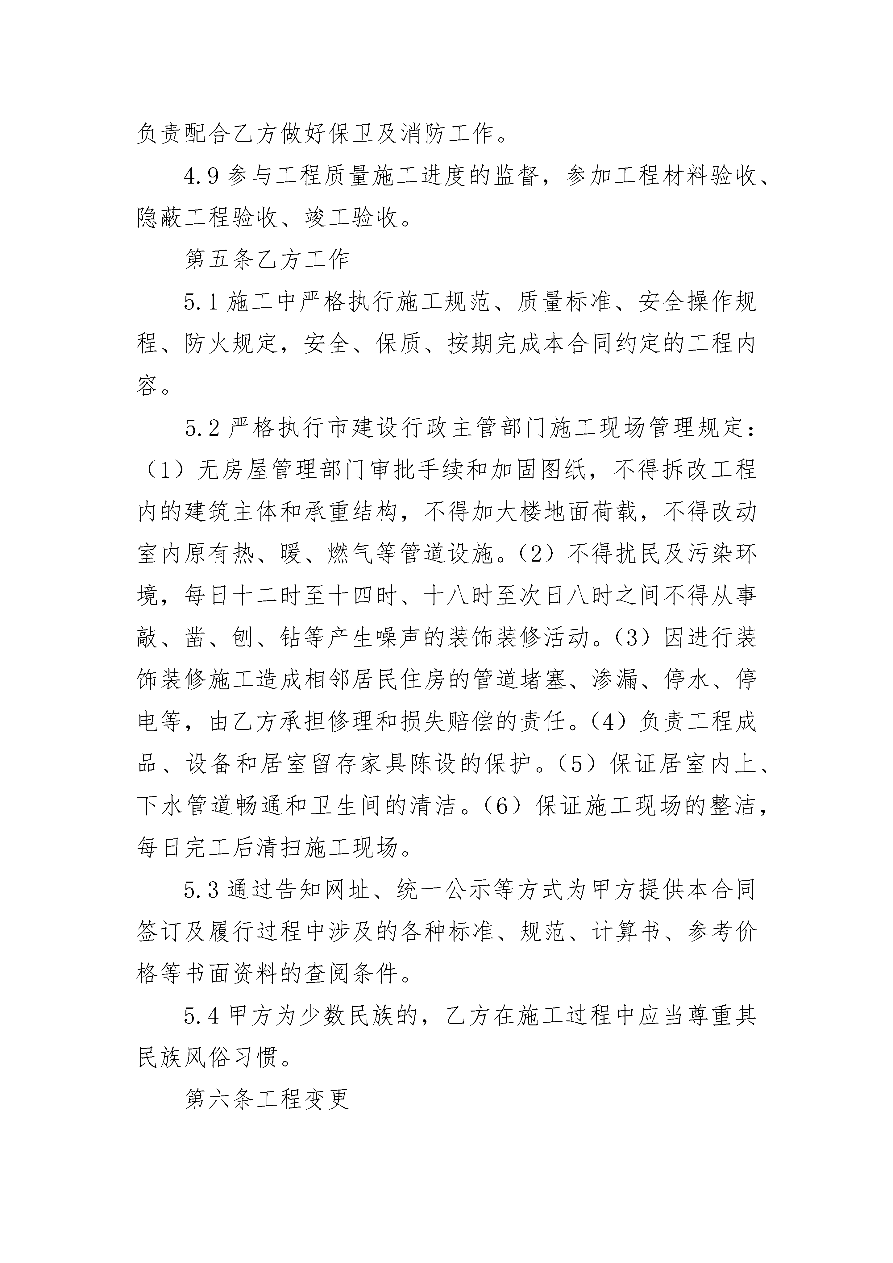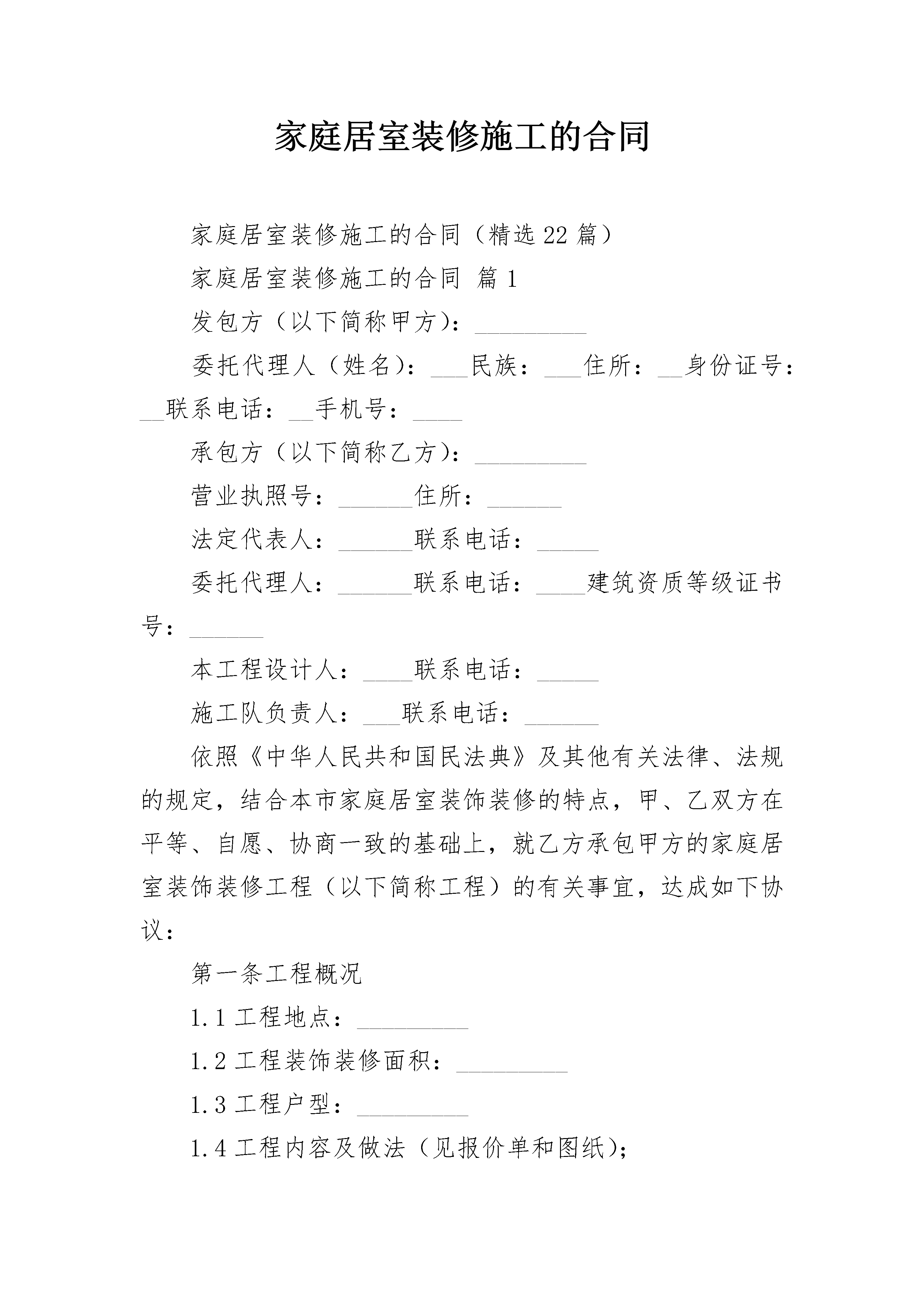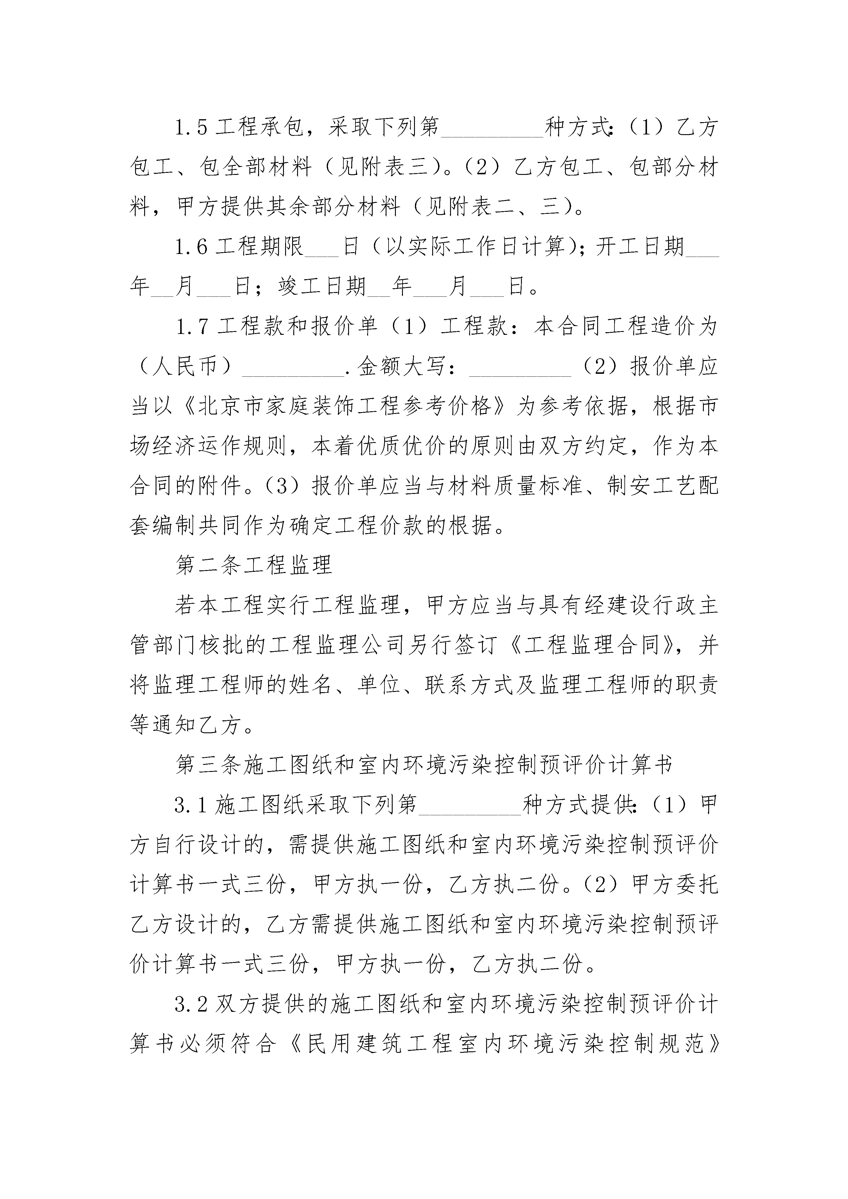 家庭居室装修施工的合同家庭居室装修施工的合同(精选22篇)家庭居室装修施工的合同篇1发包方(以下简称甲方):_________委托代理人(姓名):___民族:___住所:__身份证号:__联系电话:__手机号:____承包方(以下简称乙方):_________营业执照号:______住所:______法定代表人:______联系电话:_____委托代理人:______联系电话:____建筑资质等级证书号:______本工程设计人:____联系电话:_____施工队负责人:___联系电话:______依照《中华人民共和国民法典》及其他有关法律、法规的规定,结合本市家庭居室装饰装修的特点,甲、乙双方在平等、自愿、协商一致的基础上,就乙方承包甲方的家庭居室装饰装修工程(以下简称工程)的有关事宜,达成如下协议:第一条工程概况1.1工程地点:_________1.2工程装饰装修面积:_________1.3工程户型:_________1.4工程内容及做法(见报价单和图纸);1.5工程承包,采取下列第_________种方式:(1)乙方包工、包全部材料(见附表三)。(2)乙方包工、包部分材料,甲方提供其余部分材料(见附表二、三)。1.6工程期限___日(以实际工作日计算);开工日期___年__月___日;竣工日期__年___月___日。1.7工程款和报价单(1)工程款:本合同工程造价为(人民币)_________.金额大写:_________(2)报价单应当以《北京市家庭装饰工程参考价格》为参考依据,根据市场经济运作规则,本着优质优价的原则由双方约定,作为本合同的附件。(3)报价单应当与材料质量标准、制安工艺配套编制共同作为确定工程价款的根据。第二条工程监理若本工程实行工程监理,甲方应当与具有经建设行政主管部门核批的工程监理公司另行签订《工程监理合同》,并将监理工程师的姓名、单位、联系方式及监理工程师的职责等通知乙方。第三条施工图纸和室内环境污染控制预评价计算书3.1施工图纸采取下列第_________种方式提供:(1)甲方自行设计的,需提供施工图纸和室内环境污染控制预评价计算书一式三份,甲方执一份,乙方执二份。(2)甲方委托乙方设计的,乙方需提供施工图纸和室内环境污染控制预评价计算书一式三份,甲方执一份,乙方执二份。3.2双方提供的施工图纸和室内环境污染控制预评价计算书必须符合《民用建筑工程室内环境污染控制规范》(GB50325-20__)的要求。3.3双方应当对施工图纸和室内环境污染控制预评价计算书予以签收确认。3.4双方不得将对方提供的施工图纸、设计方案等资料擅自复制或转让给第三方,也不得用于本合同以外的项目。第四条甲方工作4.1开工三日前要为乙方入场施工创造条件,以不影响施工为原则。4.2无偿提供施工期间的水源、电源和冬季供暖。4.3负责办理物业管理部门开工手续和应当由业主支付的有关费用。4.4遵守物业管理部门的各项规章制定。4.5负责协调乙方施工人员与邻里之间的关系。4.6不得有下列行为:(1)随意改动房屋主体和承重结构。(2)在外墙上开窗、门或扩大原有门窗尺寸,拆除连接阳台门窗的墙体。(3)在室内铺贴一厘米以上石材、砌筑墙体、增加楼地面荷载。(4)破坏厨房、厕所地面防水层和拆改热、暖、燃气等管道设施。(5)强令乙方违章作业施工的其他行为。4.7凡必须涉及4.6款所列内容的,甲方应当向房屋管理部门提出申请,由原设计单位或者具有相应资质等级的设计单位对改动方案的安全使用性进行审定并出具书面证明,再由房屋管理部门批准。4.8施工期间甲方仍需部分使用该居室的,甲方则应当负责配合乙方做好保卫及消防工作。4.9参与工程质量施工进度的监督,参加工程材料验收、隐蔽工程验收、竣工验收。第五条乙方工作5.1施工中严格执行施工规范、质量标准、安全操作规程、防火规定,安全、保质、按期完成本合同约定的工程内容。5.2严格执行市建设行政主管部门施工现场管理规定:(1)无房屋管理部门审批手续和加固图纸,不得拆改工程内的建筑主体和承重结构,不得加大楼地面荷载,不得改动室内原有热、暖、燃气等管道设施。(2)不得扰民及污染环境,每日十二时至十四时、十八时至次日八时之间不得从事敲、凿、刨、钻等产生噪声的装饰装修活动。(3)因进行装饰装修施工造成相邻居民住房的管道堵塞、渗漏、停水、停电等,由乙方承担修理和损失赔偿的责任。(4)负责工程成品、设备和居室留存家具陈设的保护。(5)保证居室内上、下水管道畅通和卫生间的清洁。(6)保证施工现场的整洁,每日完工后清扫施工现场。5.3通过告知网址、统一公示等方式为甲方提供本合同签订及履行过程中涉及的各种标准、规范、计算书、参考价格等书面资料的查阅条件。5.4甲方为少数民族的,乙方在施工过程中应当尊重其民族风俗习惯。第六条工程