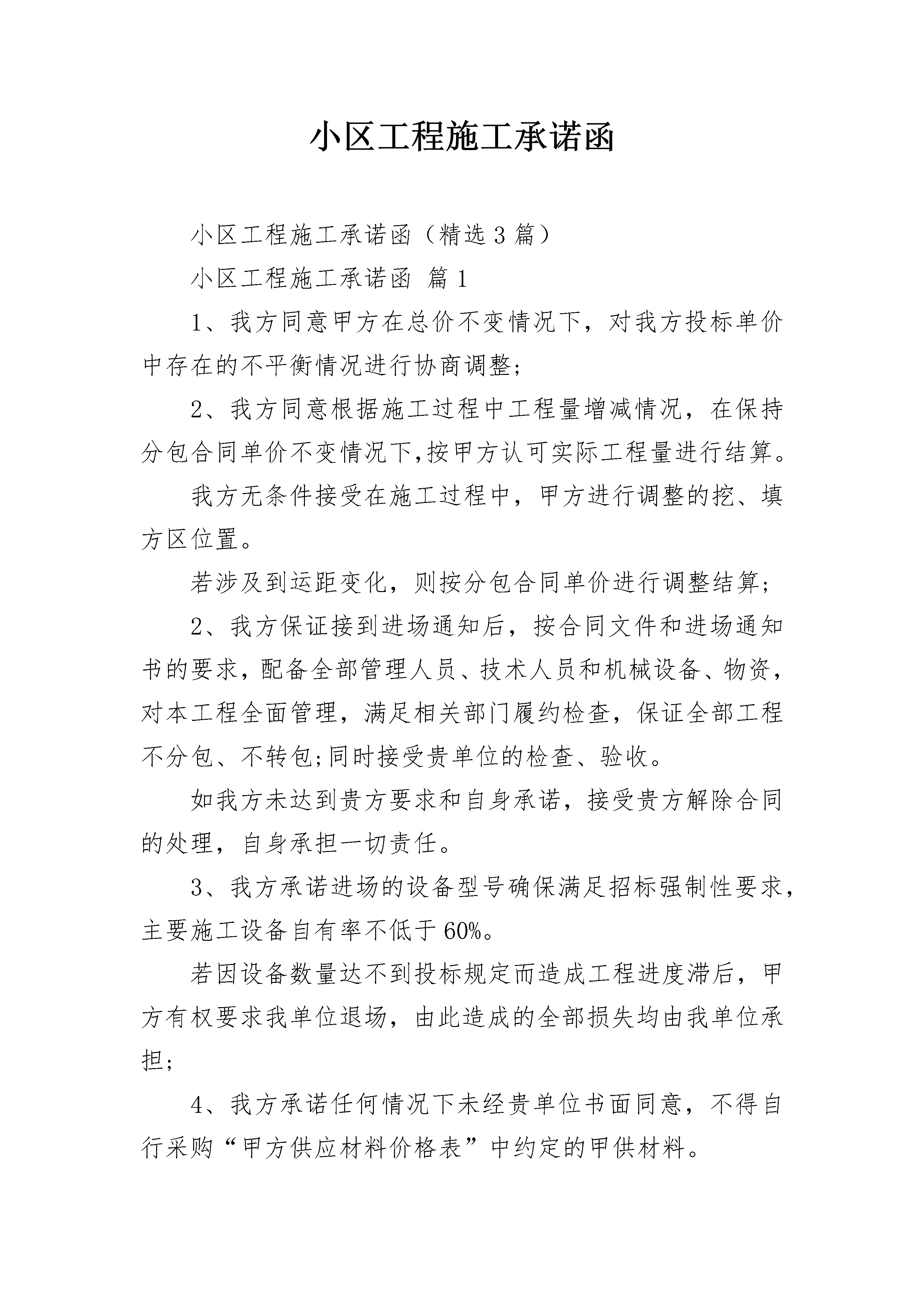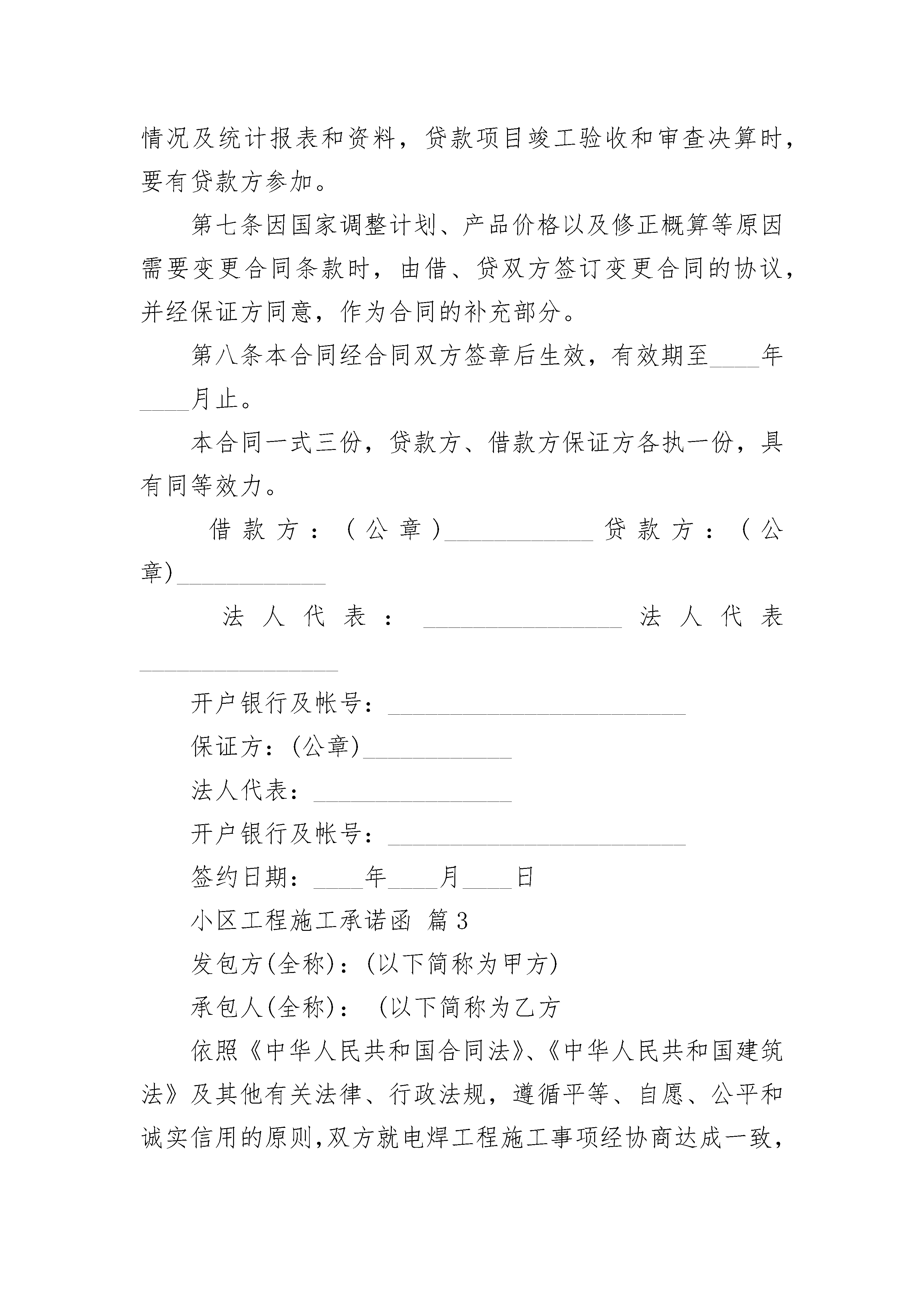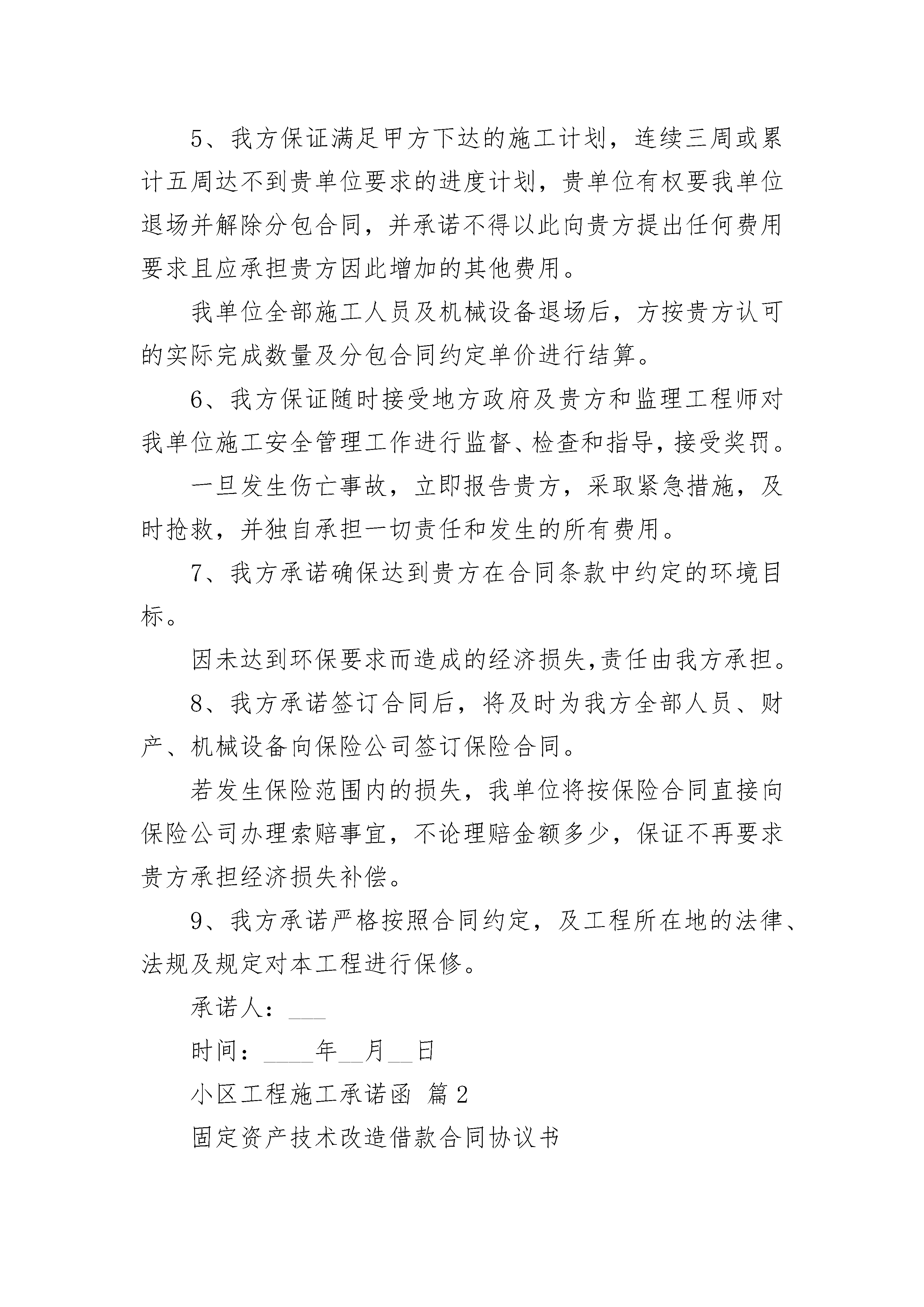 小区工程施工承诺函小区工程施工承诺函(精选3篇)小区工程施工承诺函篇11、我方同意甲方在总价不变情况下,对我方投标单价中存在的不平衡情况进行协商调整;2、我方同意根据施工过程中工程量增减情况,在保持分包合同单价不变情况下,按甲方认可实际工程量进行结算。我方无条件接受在施工过程中,甲方进行调整的挖、填方区位置。若涉及到运距变化,则按分包合同单价进行调整结算;2、我方保证接到进场通知后,按合同文件和进场通知书的要求,配备全部管理人员、技术人员和机械设备、物资,对本工程全面管理,满足相关部门履约检查,保证全部工程不分包、不转包;同时接受贵单位的检查、验收。如我方未达到贵方要求和自身承诺,接受贵方解除合同的处理,自身承担一切责任。3、我方承诺进场的设备型号确保满足招标强制性要求,主要施工设备自有率不低于60%。若因设备数量达不到投标规定而造成工程进度滞后,甲方有权要求我单位退场,由此造成的全部损失均由我单位承担;4、我方承诺任何情况下未经贵单位书面同意,不得自行采购“甲方供应材料价格表”中约定的甲供材料。5、我方保证满足甲方下达的施工计划,连续三周或累计五周达不到贵单位要求的进度计划,贵单位有权要我单位退场并解除分包合同,并承诺不得以此向贵方提出任何费用要求且应承担贵方因此增加的其他费用。我单位全部施工人员及机械设备退场后,方按贵方认可的实际完成数量及分包合同约定单价进行结算。6、我方保证随时接受地方政府及贵方和监理工程师对我单位施工安全管理工作进行监督、检查和指导,接受奖罚。一旦发生伤亡事故,立即报告贵方,采取紧急措施,及时抢救,并独自承担一切责任和发生的所有费用。7、我方承诺确保达到贵方在合同条款中约定的环境目标。因未达到环保要求而造成的经济损失,责任由我方承担。8、我方承诺签订合同后,将及时为我方全部人员、财产、机械设备向保险公司签订保险合同。若发生保险范围内的损失,我单位将按保险合同直接向保险公司办理索赔事宜,不论理赔金额多少,保证不再要求贵方承担经济损失补偿。9、我方承诺严格按照合同约定,及工程所在地的法律、法规及规定对本工程进行保修。承诺人:___时间:____年__月__日小区工程施工承诺函篇2固定资产技术改造借款合同协议书贷款方:_________地址:____________邮码:____________电话:________法定代表人:_______职务:____________借款方:_______担保方:____________邮码:________电话:____________法定代表人:______职务:____________根据中华人民共和国民法典之规定,经贷款方、借款方、担保方充分协商,达成如下协议,共同信守。第一条借款方向贷款方申请借款人民币(大写)____万元,用于____项目。借款实际发放额,在本合同规定期限内以借据为凭,并作为本合同附件。第二条贷款方根据借款方按工程进度报送的工程用款计划和用款借据,在____天内审查发放贷款,以保证借款方工程进度的资金需要。如因贷款方责任未按时供应资金,要根据违约数额和延期天数付给借款方违约金。借款方违反规定,擅自改变用款计划,挪用贷款或物资,贷款方有权停止发放贷款,被挪用的贷款要加收____%的罚息并如数追回。第三条借款期限定为____年____月,从发放出贷款之日起至全部收回本息,具体用款和还款的方式和时间,以借据为凭并作为本合同附件。利率月息为____‰,按季收息。贷款逾期未还除限期追收外,按规定从逾期之日起加收利息____%.第四条借款方保证按期偿还全部借款本息。贷款逾期未还的部分,贷款方有权限期追收贷款,必要时,贷款方可从借款方账户中扣收,借款单位在其他银行还有存款账户的,贷款方可商请该行代为扣款清偿。第五条借款方按照银行抵押贷款办法规定,愿以自己拥有的财产或贷款新增的固定资产作抵押,抵押品另附明细清单,作为本合同的附件。借款方不履行合同时,贷款方对抵押品享有处理权和优先受偿权。借款方请____作为借款的保证人,经贷款方审查,证实保证人具有足够代偿的财产。保证人有权检查和督促借款方履行合同。当借款方不履行合同时,由保证方负连带偿还本息的责任,必要时,由贷款方从保证人的存款账户内扣收。第六条贷款方有权检查、监督贷款使用情况,了解借款方的经营管理、计划执行、财务活动、物资库存等情况,借款方应提供工作便利。借款方必须按时向贷款方报送有关工程进展、贷款使用情况及统计报表和资料,贷款项目竣工验收和审查决算时,要有贷款方参加。第七条因国家调整计划、产品价格以及修正概算等原因需要变更合同条款时,由借、贷双方签订变更合同的协议,并经保证方同意,作为合同的补充部分。第八条本合同经合同双方签章后生效,有效期至____年____月止。本合同一式三份,贷款方、借款方保证