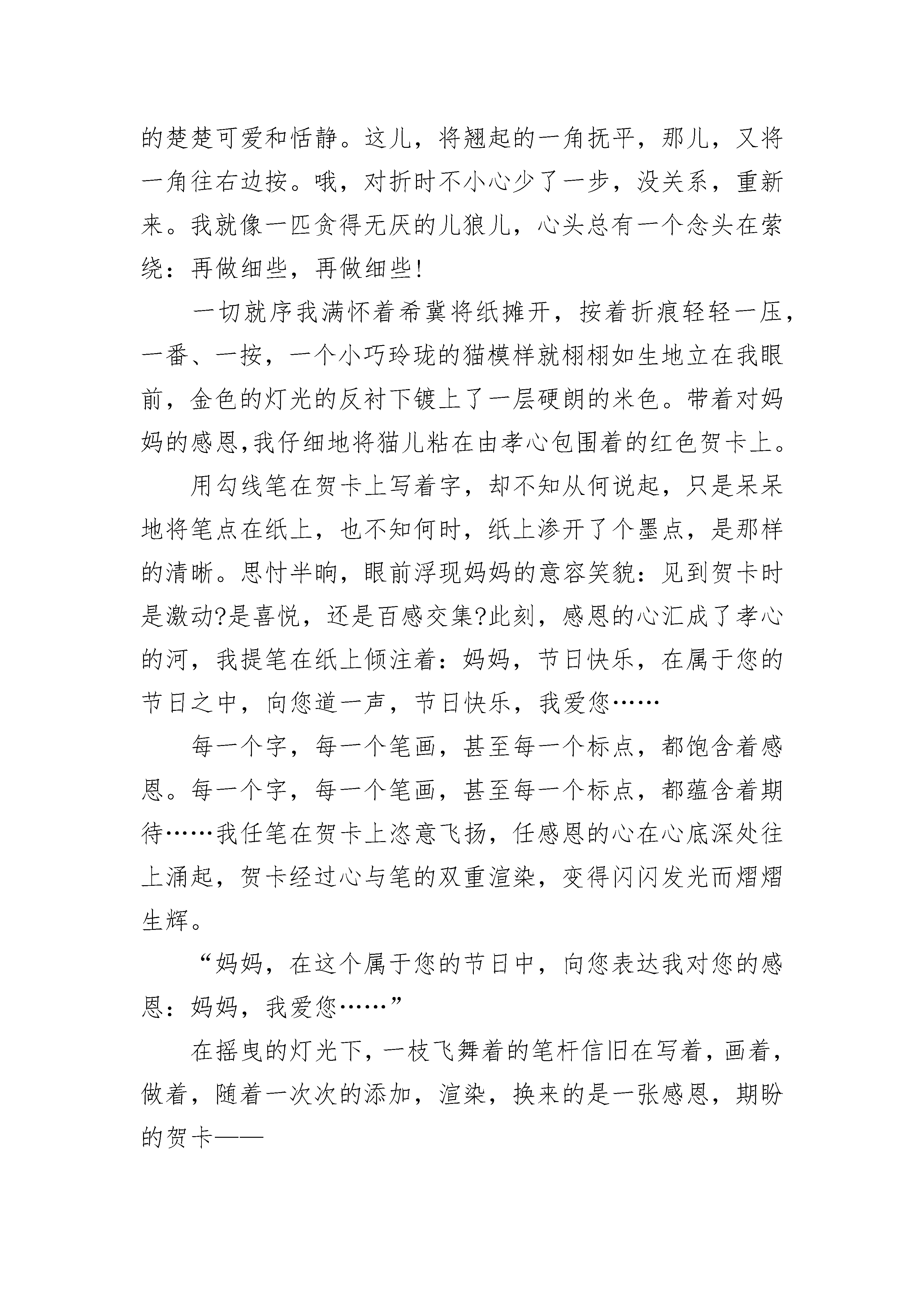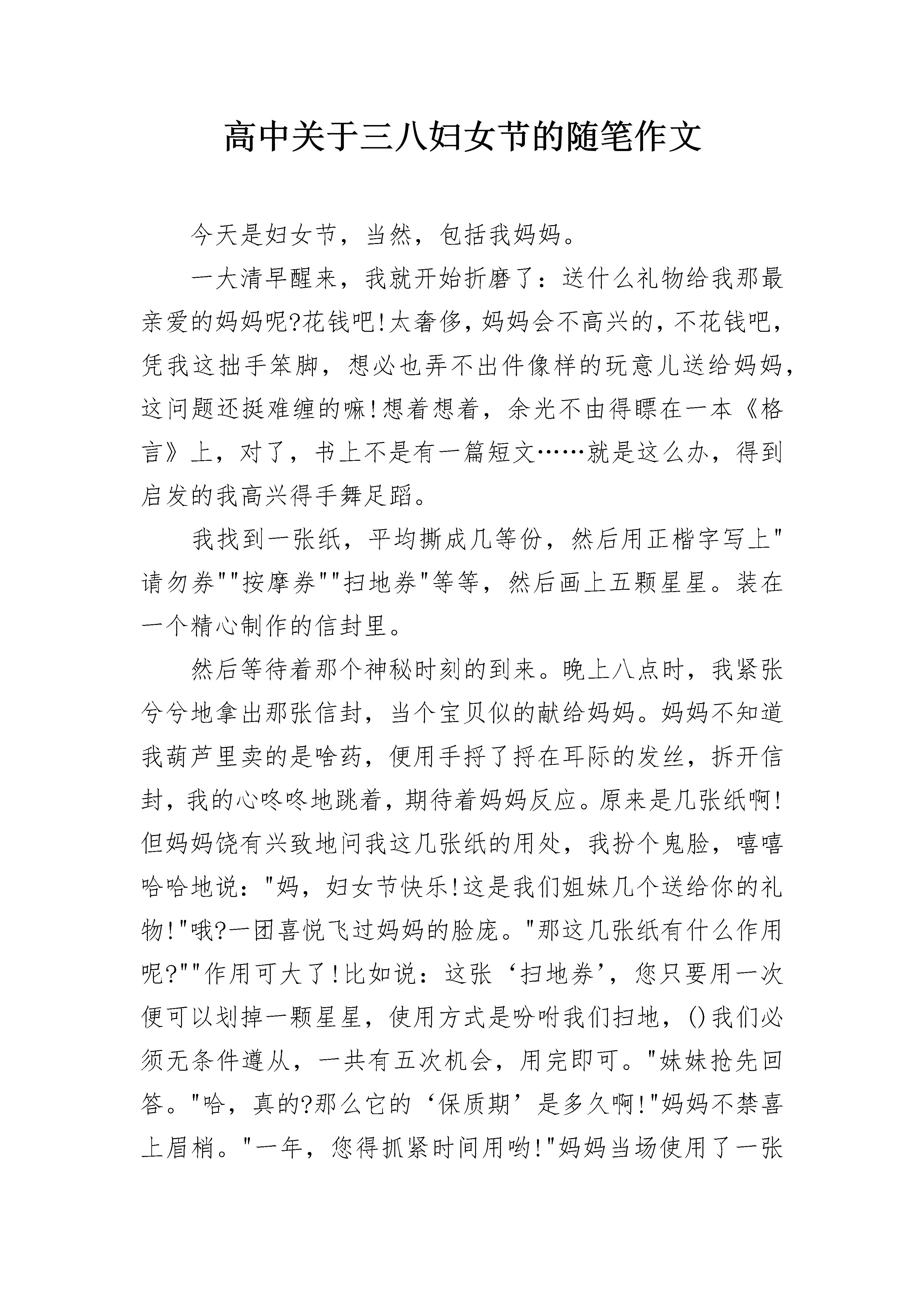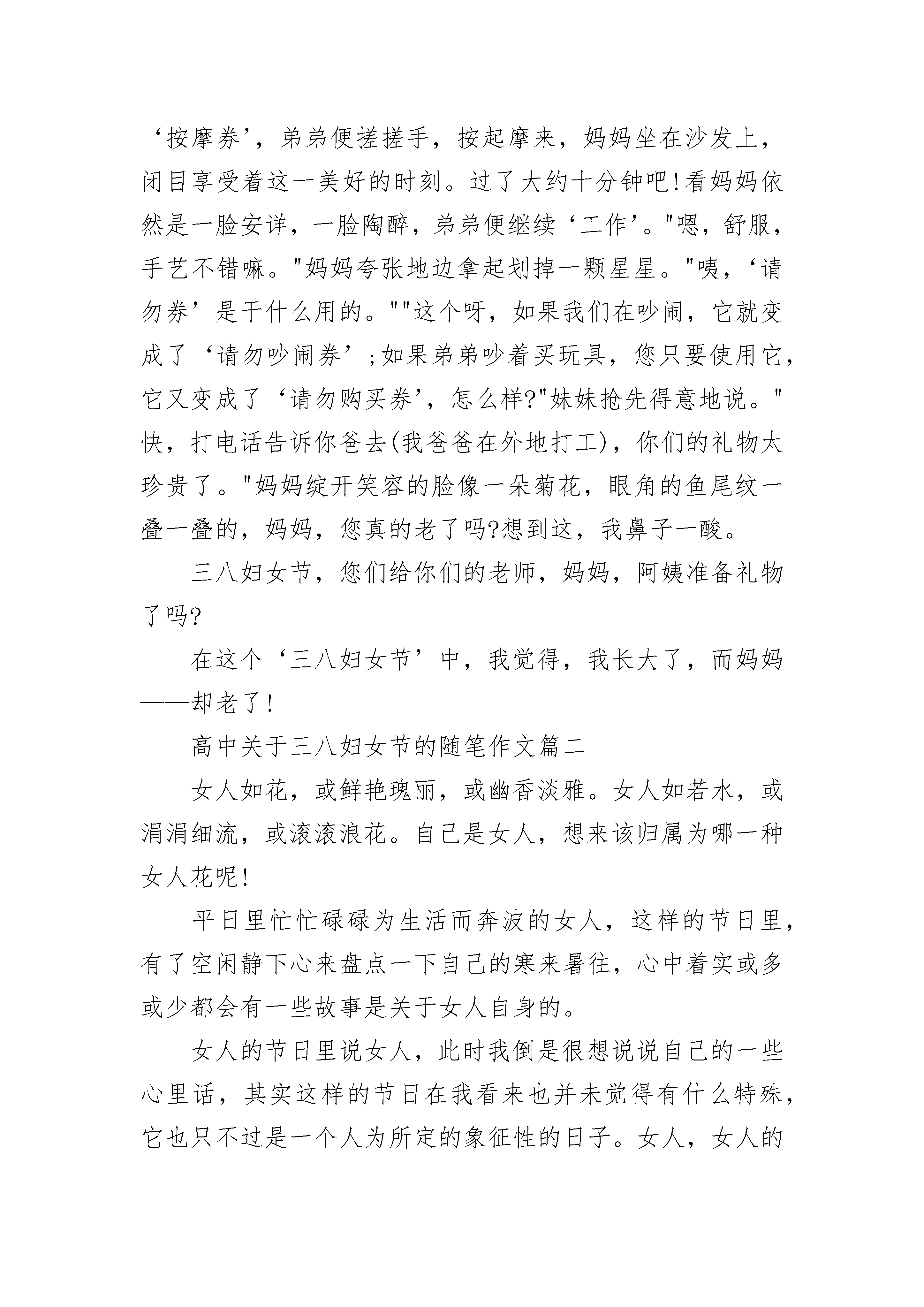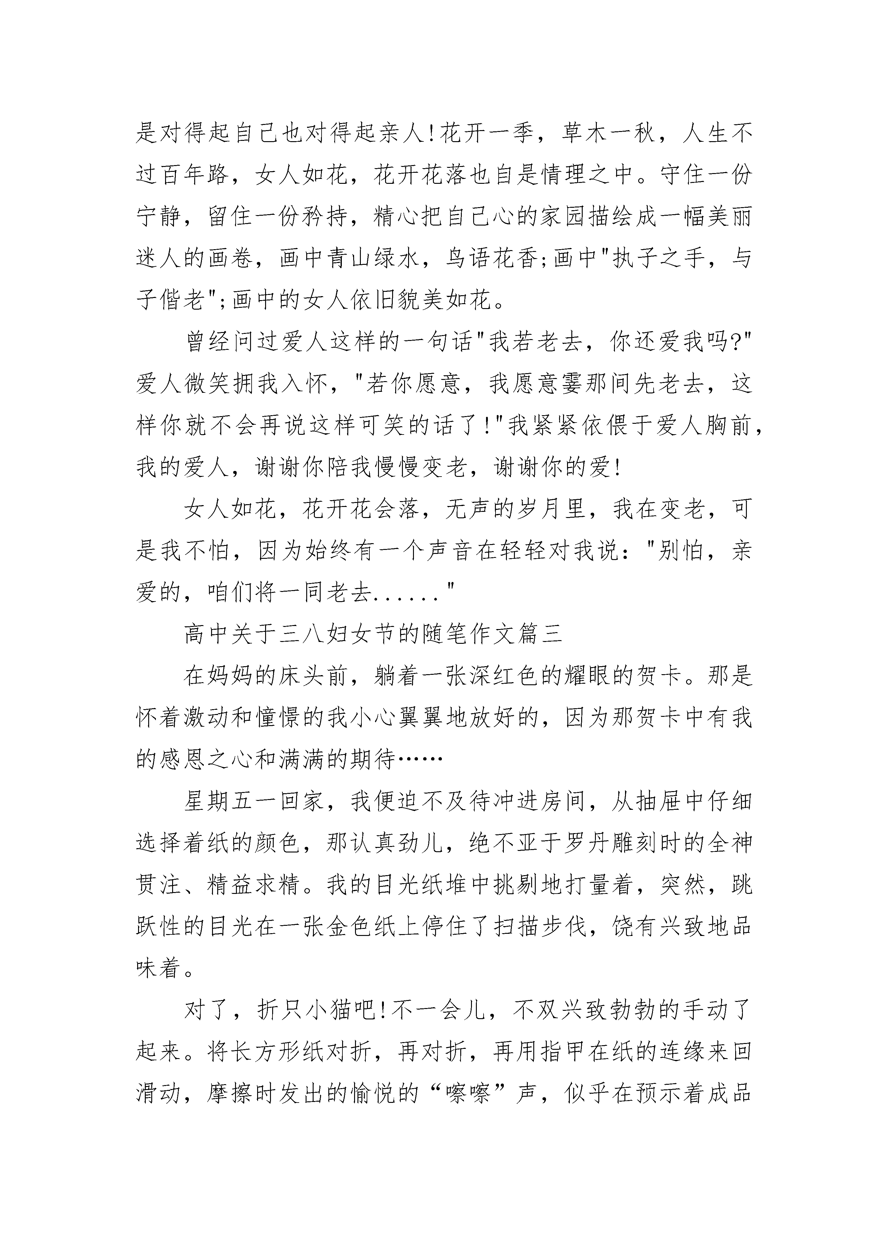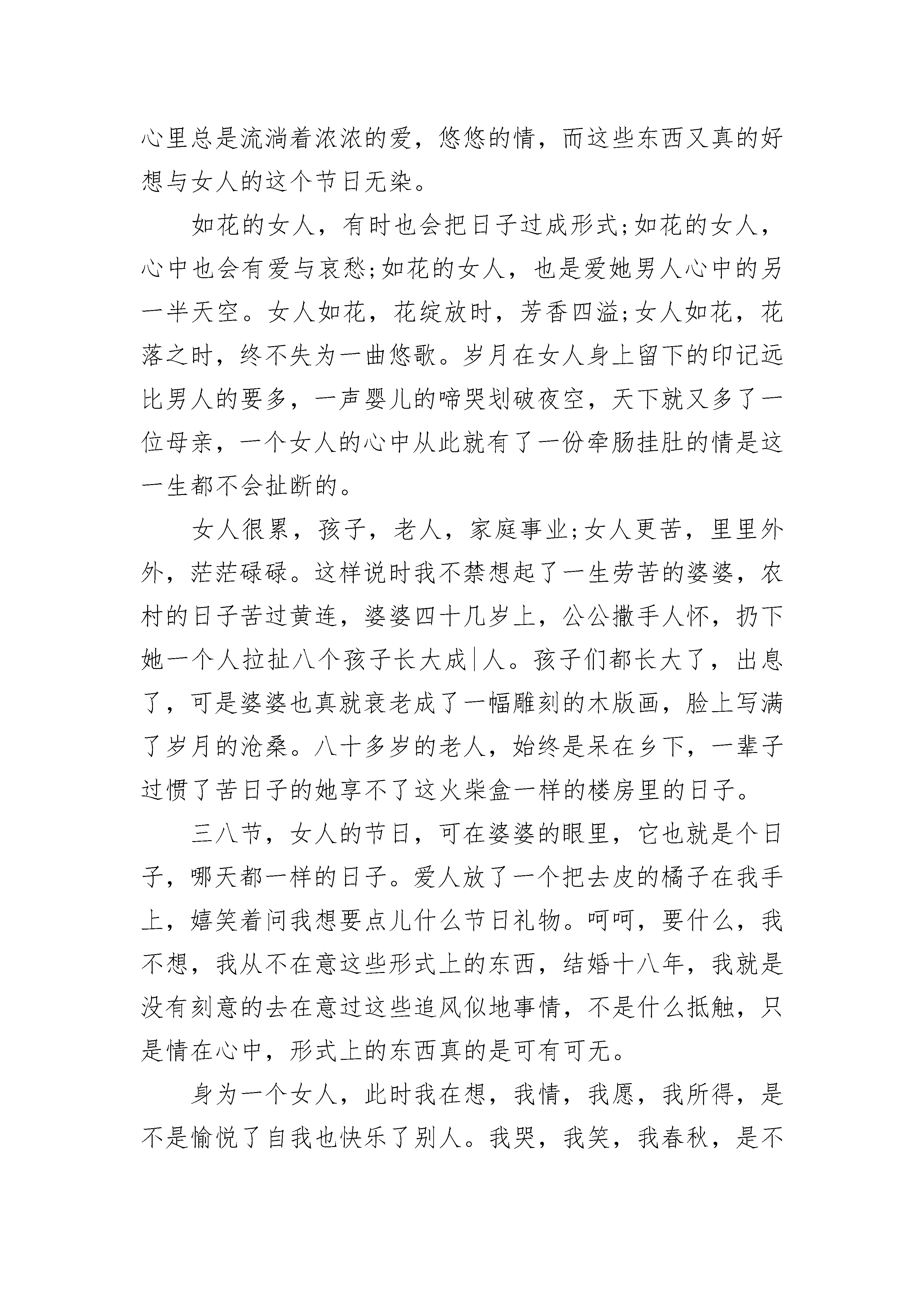 高中关于三八妇女节的随笔作文今天是妇女节,当然,包括我妈妈。一大清早醒来,我就开始折磨了:送什么礼物给我那最亲爱的妈妈呢?花钱吧!太奢侈,妈妈会不高兴的,不花钱吧,凭我这拙手笨脚,想必也弄不出件像样的玩意儿送给妈妈,这问题还挺难缠的嘛!想着想着,余光不由得瞟在一本《格言》上,对了,书上不是有一篇短文……就是这么办,得到启发的我高兴得手舞足蹈。我找到一张纸,平均撕成几等份,然后用正楷字写上"请勿券""按摩券""扫地券"等等,然后画上五颗星星。装在一个精心制作的信封里。然后等待着那个神秘时刻的到来。晚上八点时,我紧张兮兮地拿出那张信封,当个宝贝似的献给妈妈。妈妈不知道我葫芦里卖的是啥药,便用手捋了捋在耳际的发丝,拆开信封,我的心咚咚地跳着,期待着妈妈反应。原来是几张纸啊!但妈妈饶有兴致地问我这几张纸的用处,我扮个鬼脸,嘻嘻哈哈地说:"妈,妇女节快乐!这是我们姐妹几个送给你的礼物!"哦?一团喜悦飞过妈妈的脸庞。"那这几张纸有什么作用呢?""作用可大了!比如说:这张‘扫地券’,您只要用一次便可以划掉一颗星星,使用方式是吩咐我们扫地,()我们必须无条件遵从,一共有五次机会,用完即可。"妹妹抢先回答。"哈,真的?那么它的‘保质期’是多久啊!"妈妈不禁喜上眉梢。"一年,您得抓紧时间用哟!"妈妈当场使用了一张‘按摩券’,弟弟便搓搓手,按起摩来,妈妈坐在沙发上,闭目享受着这一美好的时刻。过了大约十分钟吧!看妈妈依然是一脸安详,一脸陶醉,弟弟便继续‘工作’。"嗯,舒服,手艺不错嘛。"妈妈夸张地边拿起划掉一颗星星。"咦,‘请勿券’是干什么用的。""这个呀,如果我们在吵闹,它就变成了‘请勿吵闹券’;如果弟弟吵着买玩具,您只要使用它,它又变成了‘请勿购买券’,怎么样?"妹妹抢先得意地说。"快,打电话告诉你爸去(我爸爸在外地打工),你们的礼物太珍贵了。"妈妈绽开笑容的脸像一朵菊花,眼角的鱼尾纹一叠一叠的,妈妈,您真的老了吗?想到这,我鼻子一酸。三八妇女节,您们给你们的老师,妈妈,阿姨准备礼物了吗?在这个‘三八妇女节’中,我觉得,我长大了,而妈妈——却老了!高中关于三八妇女节的随笔作文篇二女人如花,或鲜艳瑰丽,或幽香淡雅。女人如若水,或涓涓细流,或滚滚浪花。自己是女人,想来该归属为哪一种女人花呢!平日里忙忙碌碌为生活而奔波的女人,这样的节日里,有了空闲静下心来盘点一下自己的寒来暑往,心中着实或多或少都会有一些故事是关于女人自身的。女人的节日里说女人,此时我倒是很想说说自己的一些心里话,其实这样的节日在我看来也并未觉得有什么特殊,它也只不过是一个人为所定的象征性的日子。女人,女人的心里总是流淌着浓浓的爱,悠悠的情,而这些东西又真的好想与女人的这个节日无染。如花的女人,有时也会把日子过成形式;如花的女人,心中也会有爱与哀愁;如花的女人,也是爱她男人心中的另一半天空。女人如花,花绽放时,芳香四溢;女人如花,花落之时,终不失为一曲悠歌。岁月在女人身上留下的印记远比男人的要多,一声婴儿的啼哭划破夜空,天下就又多了一位母亲,一个女人的心中从此就有了一份牵肠挂肚的情是这一生都不会扯断的。女人很累,孩子,老人,家庭事业;女人更苦,里里外外,茫茫碌碌。这样说时我不禁想起了一生劳苦的婆婆,农村的日子苦过黄连,婆婆四十几岁上,公公撒手人怀,扔下她一个人拉扯八个孩子长大成|人。孩子们都长大了,出息了,可是婆婆也真就衰老成了一幅雕刻的木版画,脸上写满了岁月的沧桑。八十多岁的老人,始终是呆在乡下,一辈子过惯了苦日子的她享不了这火柴盒一样的楼房里的日子。三八节,女人的节日,可在婆婆的眼里,它也就是个日子,哪天都一样的日子。爱人放了一个把去皮的橘子在我手上,嬉笑着问我想要点儿什么节日礼物。呵呵,要什么,我不想,我从不在意这些形式上的东西,结婚十八年,我就是没有刻意的去在意过这些追风似地事情,不是什么抵触,只是情在心中,形式上的东西真的是可有可无。身为一个女人,此时我在想,我情,我愿,我所得,是不是愉悦了自我也快乐了别人。我哭,我笑,我春秋,是不是对得起自己也对得起亲人!花开一季,草木一秋,人生不过百年路,女人如花,花开花落也自是情理之中。守住一份宁静,留住一份矜持,精心把自己心的家园描绘成一幅美丽迷人的画卷,画中青山绿水,鸟语花香;画中"执子之手,与子偕老";画中的女人依旧貌美如花。曾经问过爱人这样的一句话"我若老去,你还爱我吗?"爱人微笑拥我入怀,"若你愿意,我愿意霎那间先老去,这样你就不会再说这样可笑的话了!"我紧紧依偎于爱人胸前,我的爱人,谢谢你陪我慢慢变老,谢谢你的爱!女人如花,花开花会落,无声的岁月里,我在变老,可是我不怕,因为始终有一个声音在轻轻对我说:"别怕,亲爱的,咱们将一同老去......"高中关于三八妇女节的随笔作文篇三在妈妈的床头前,躺着一张深红色的耀眼的贺卡。
