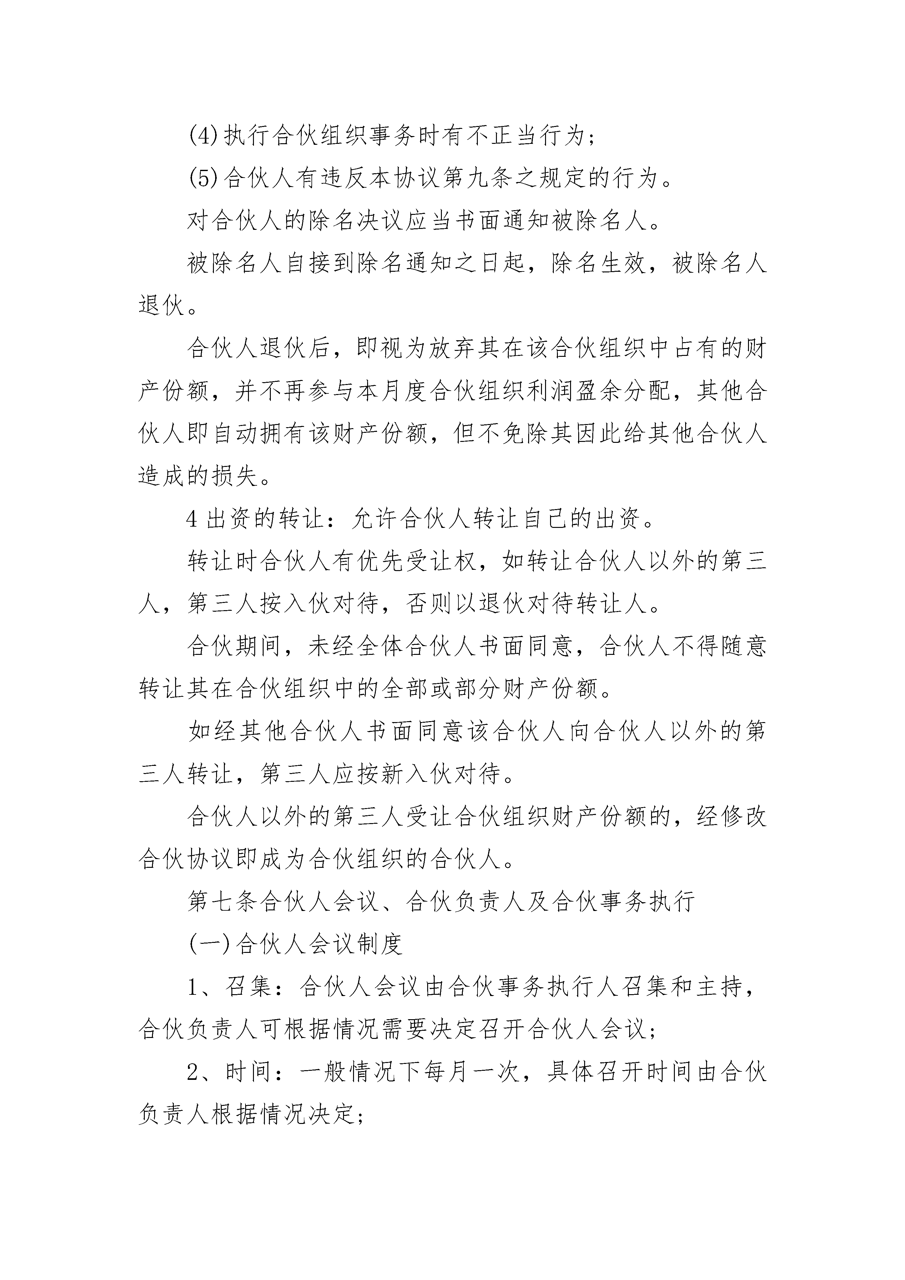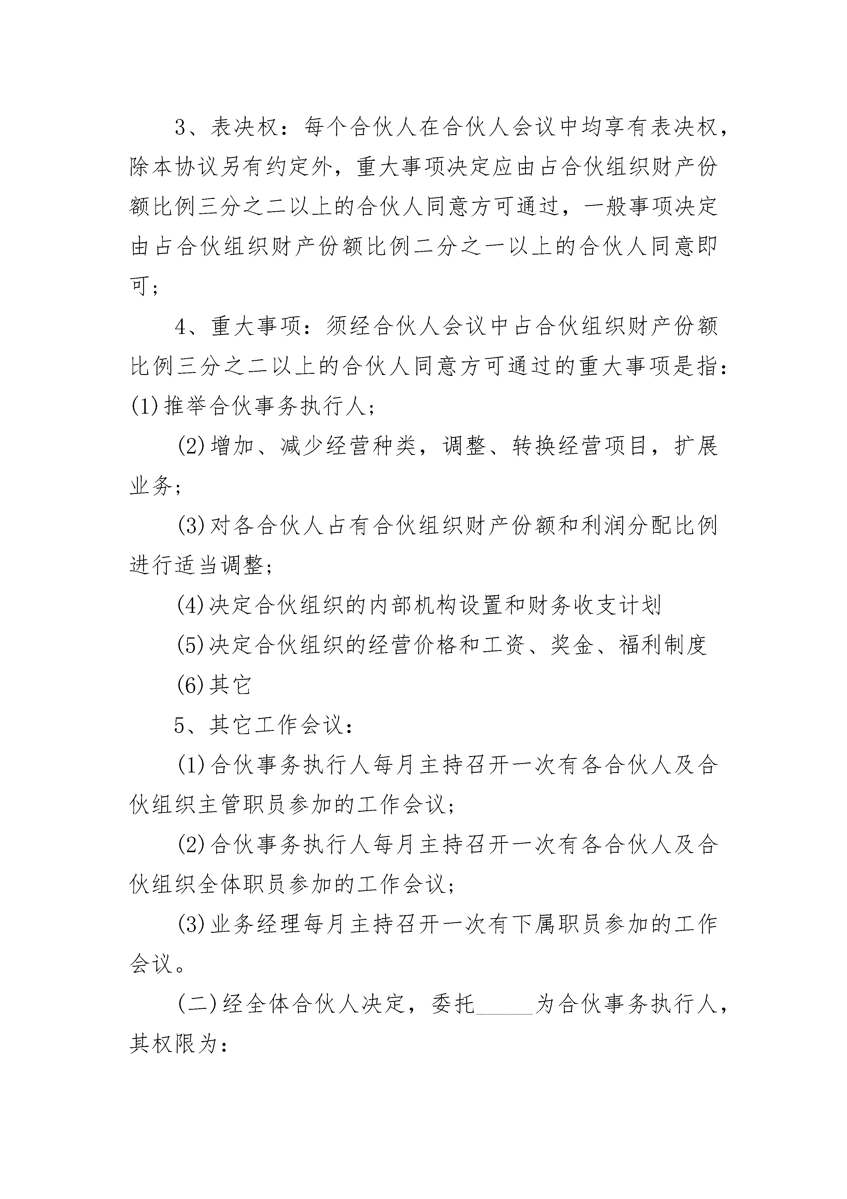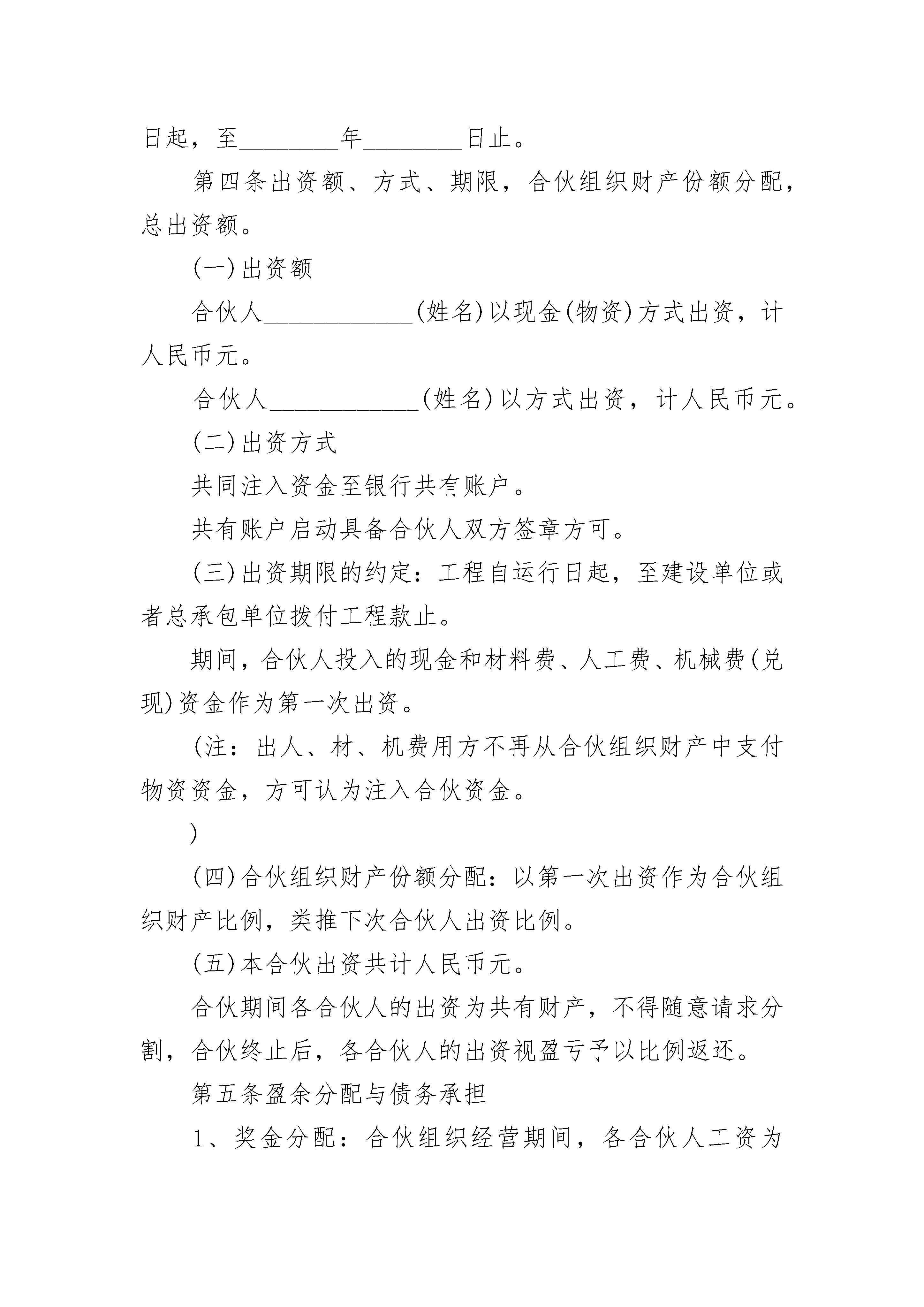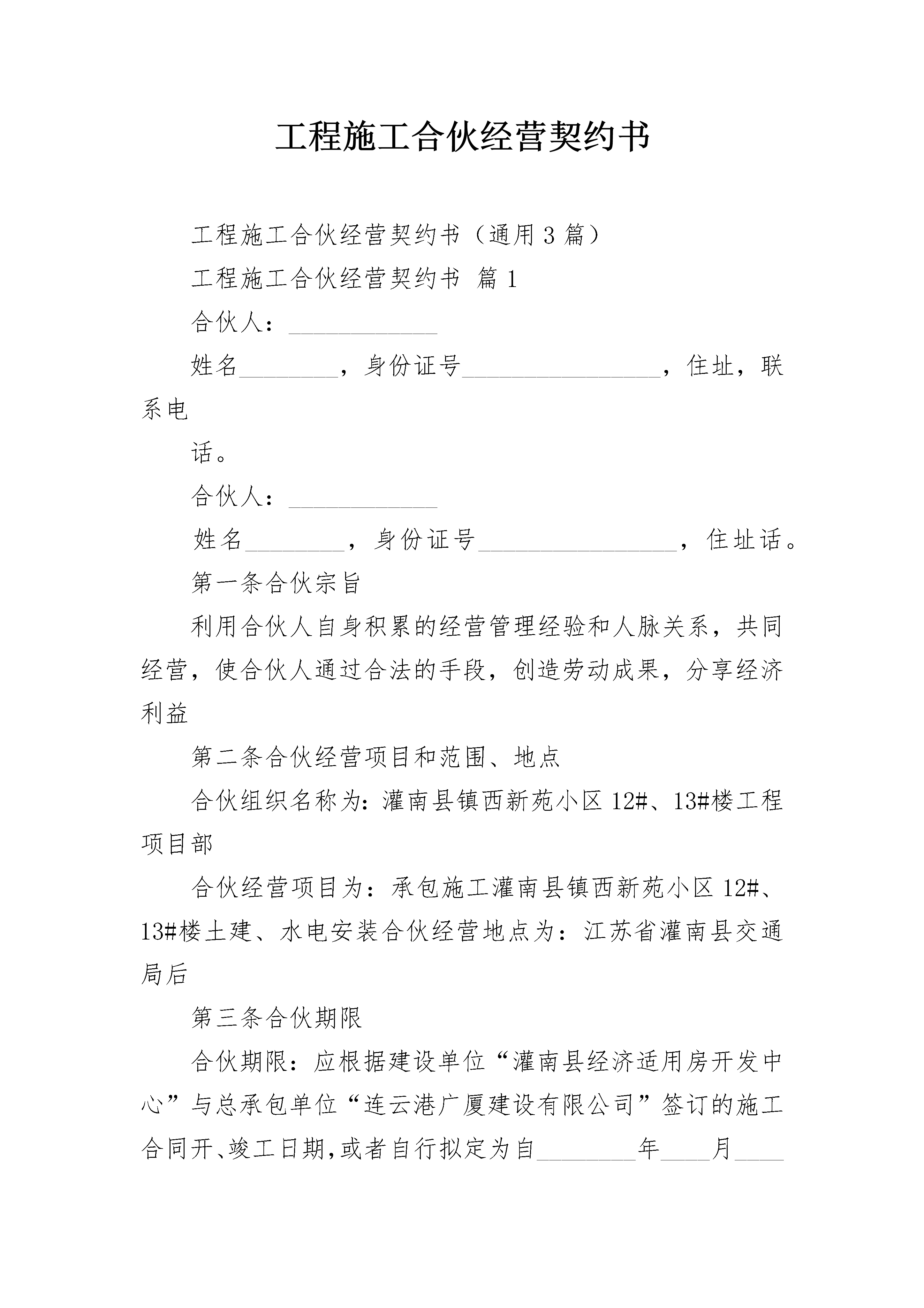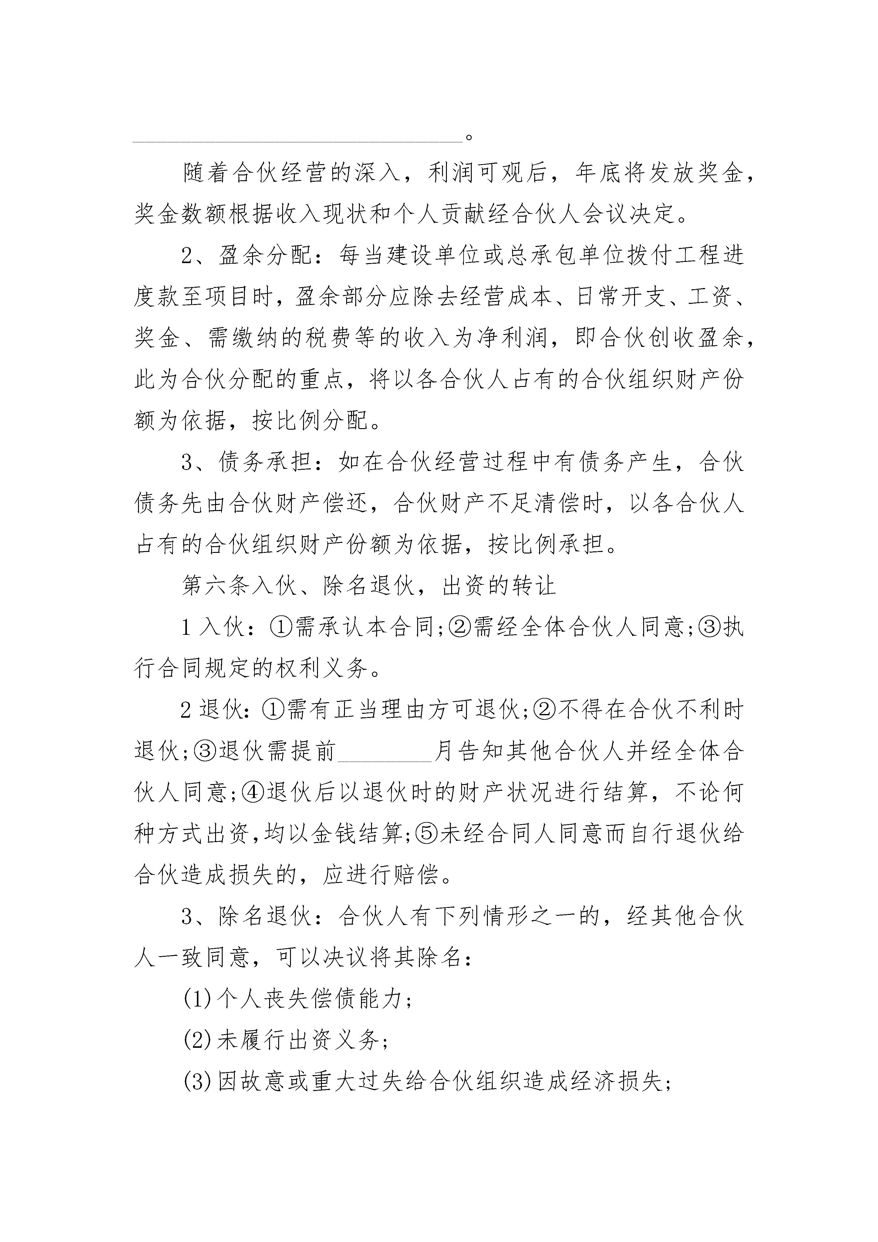 工程施工合伙经营契约书工程施工合伙经营契约书(通用3篇)工程施工合伙经营契约书篇1合伙人:____________姓名________,身份证号________________,住址,联系电话。合伙人:____________姓名________,身份证号________________,住址话。第一条合伙宗旨利用合伙人自身积累的经营管理经验和人脉关系,共同经营,使合伙人通过合法的手段,创造劳动成果,分享经济利益第二条合伙经营项目和范围、地点合伙组织名称为:灌南县镇西新苑小区12#、13#楼工程项目部合伙经营项目为:承包施工灌南县镇西新苑小区12#、13#楼土建、水电安装合伙经营地点为:江苏省灌南县交通局后第三条合伙期限合伙期限:应根据建设单位“灌南县经济适用房开发中心”与总承包单位“连云港广厦建设有限公司”签订的施工合同开、竣工日期,或者自行拟定为自________年____月____日起,至________年________日止。第四条出资额、方式、期限,合伙组织财产份额分配,总出资额。(一)出资额合伙人____________(姓名)以现金(物资)方式出资,计人民币元。合伙人____________(姓名)以方式出资,计人民币元。(二)出资方式共同注入资金至银行共有账户。共有账户启动具备合伙人双方签章方可。(三)出资期限的约定:工程自运行日起,至建设单位或者总承包单位拨付工程款止。期间,合伙人投入的现金和材料费、人工费、机械费(兑现)资金作为第一次出资。(注:出人、材、机费用方不再从合伙组织财产中支付物资资金,方可认为注入合伙资金。)(四)合伙组织财产份额分配:以第一次出资作为合伙组织财产比例,类推下次合伙人出资比例。(五)本合伙出资共计人民币元。合伙期间各合伙人的出资为共有财产,不得随意请求分割,合伙终止后,各合伙人的出资视盈亏予以比例返还。第五条盈余分配与债务承担1、奖金分配:合伙组织经营期间,各合伙人工资为____________________________。随着合伙经营的深入,利润可观后,年底将发放奖金,奖金数额根据收入现状和个人贡献经合伙人会议决定。2、盈余分配:每当建设单位或总承包单位拨付工程进度款至项目时,盈余部分应除去经营成本、日常开支、工资、奖金、需缴纳的税费等的收入为净利润,即合伙创收盈余,此为合伙分配的重点,将以各合伙人占有的合伙组织财产份额为依据,按比例分配。3、债务承担:如在合伙经营过程中有债务产生,合伙债务先由合伙财产偿还,合伙财产不足清偿时,以各合伙人占有的合伙组织财产份额为依据,按比例承担。第六条入伙、除名退伙,出资的转让1入伙:①需承认本合同;②需经全体合伙人同意;③执行合同规定的权利义务。2退伙:①需有正当理由方可退伙;②不得在合伙不利时退伙;③退伙需提前________月告知其他合伙人并经全体合伙人同意;④退伙后以退伙时的财产状况进行结算,不论何种方式出资,均以金钱结算;⑤未经合同人同意而自行退伙给合伙造成损失的,应进行赔偿。3、除名退伙:合伙人有下列情形之一的,经其他合伙人一致同意,可以决议将其除名:(1)个人丧失偿债能力;(2)未履行出资义务;(3)因故意或重大过失给合伙组织造成经济损失;(4)执行合伙组织事务时有不正当行为;(5)合伙人有违反本协议第九条之规定的行为。对合伙人的除名决议应当书面通知被除名人。被除名人自接到除名通知之日起,除名生效,被除名人退伙。合伙人退伙后,即视为放弃其在该合伙组织中占有的财产份额,并不再参与本月度合伙组织利润盈余分配,其他合伙人即自动拥有该财产份额,但不免除其因此给其他合伙人造成的损失。4出资的转让:允许合伙人转让自己的出资。转让时合伙人有优先受让权,如转让合伙人以外的第三人,第三人按入伙对待,否则以退伙对待转让人。合伙期间,未经全体合伙人书面同意,合伙人不得随意转让其在合伙组织中的全部或部分财产份额。如经其他合伙人书面同意该合伙人向合伙人以外的第三人转让,第三人应按新入伙对待。合伙人以外的第三人受让合伙组织财产份额的,经修改合伙协议即成为合伙组织的合伙人。第七条合伙人会议、合伙负责人及合伙事务执行(一)合伙人会议制度1、召集:合伙人会议由合伙事务执行人召集和主持,合伙负责人可根据情况需要决定召开合伙人会议;2、时间:一般情况下每月一次,具体召开时间由合伙负责人根据情况决定;3、表决权:每个合伙人在合伙人会议中均享有表决权,除本协议另有约定外,重大事项决定应由占合伙组织财产份额比例三分之二以上的合伙人同意方可通过,一般事项决定由占合伙组织财产份额比例二分之一以上的合伙人同意即可;4、重大事项:须经合伙人会议中占合伙组织财产份额比例三分之二以上的合伙人同意方可通过的重大事项是指:(1)推举合伙事务执行人;(2)增加、减少经营种类,调整、转