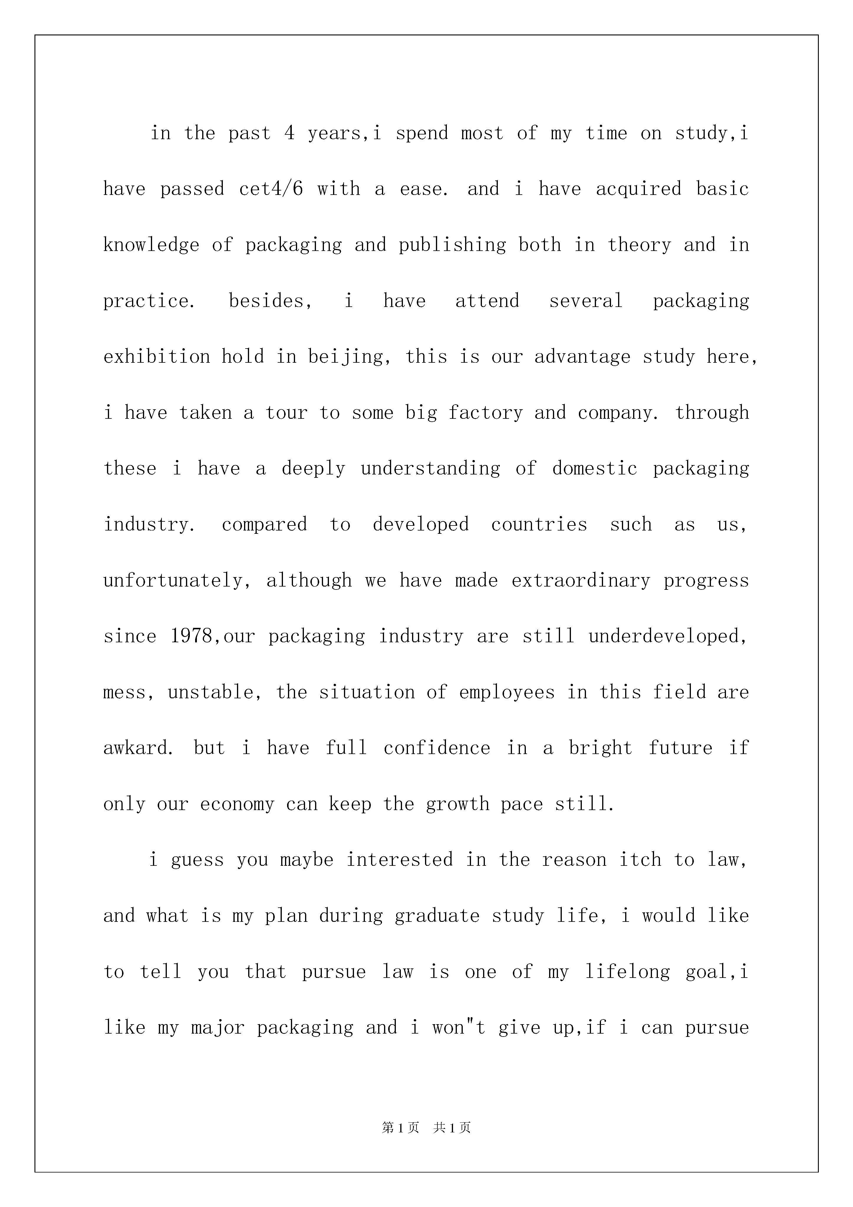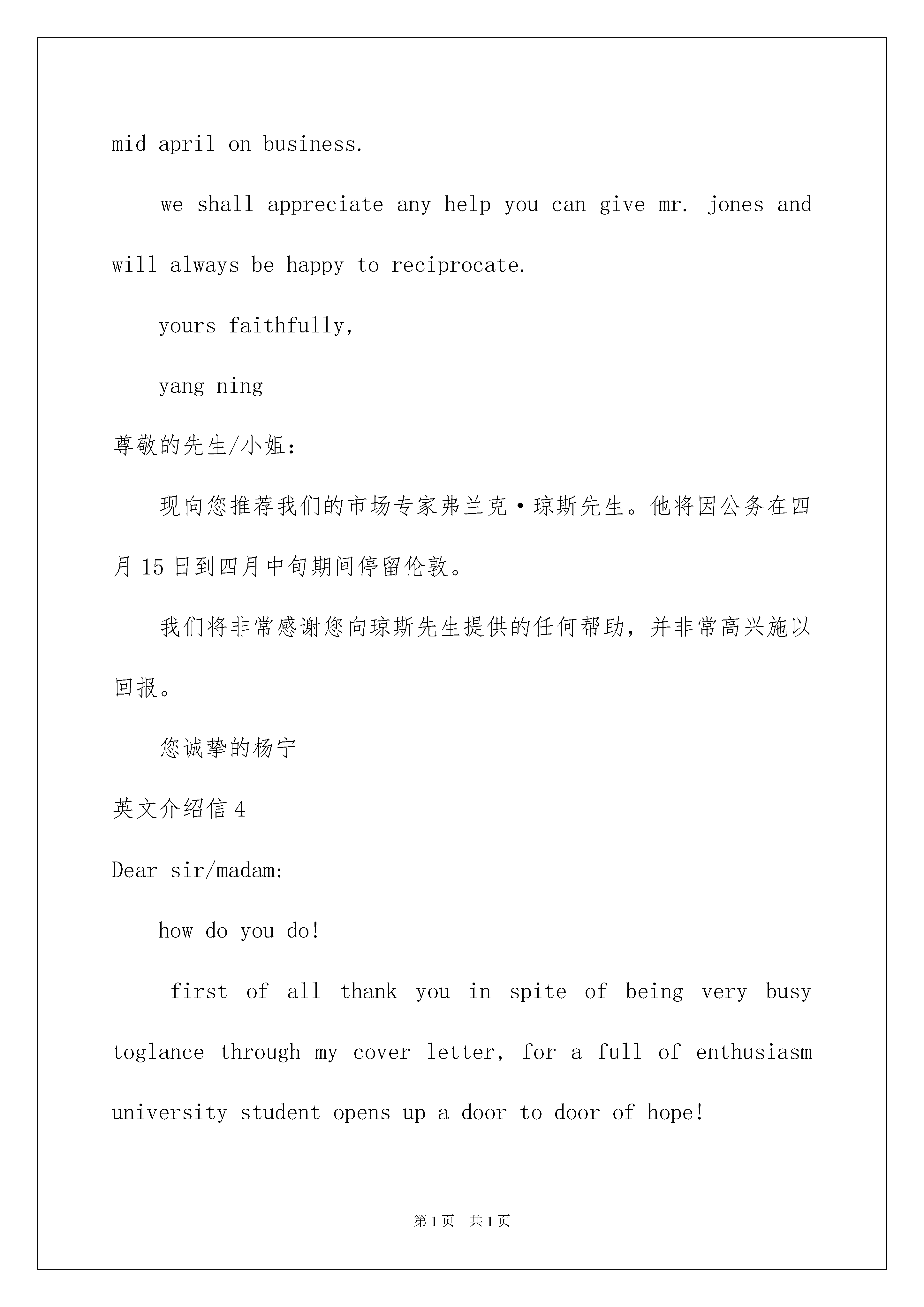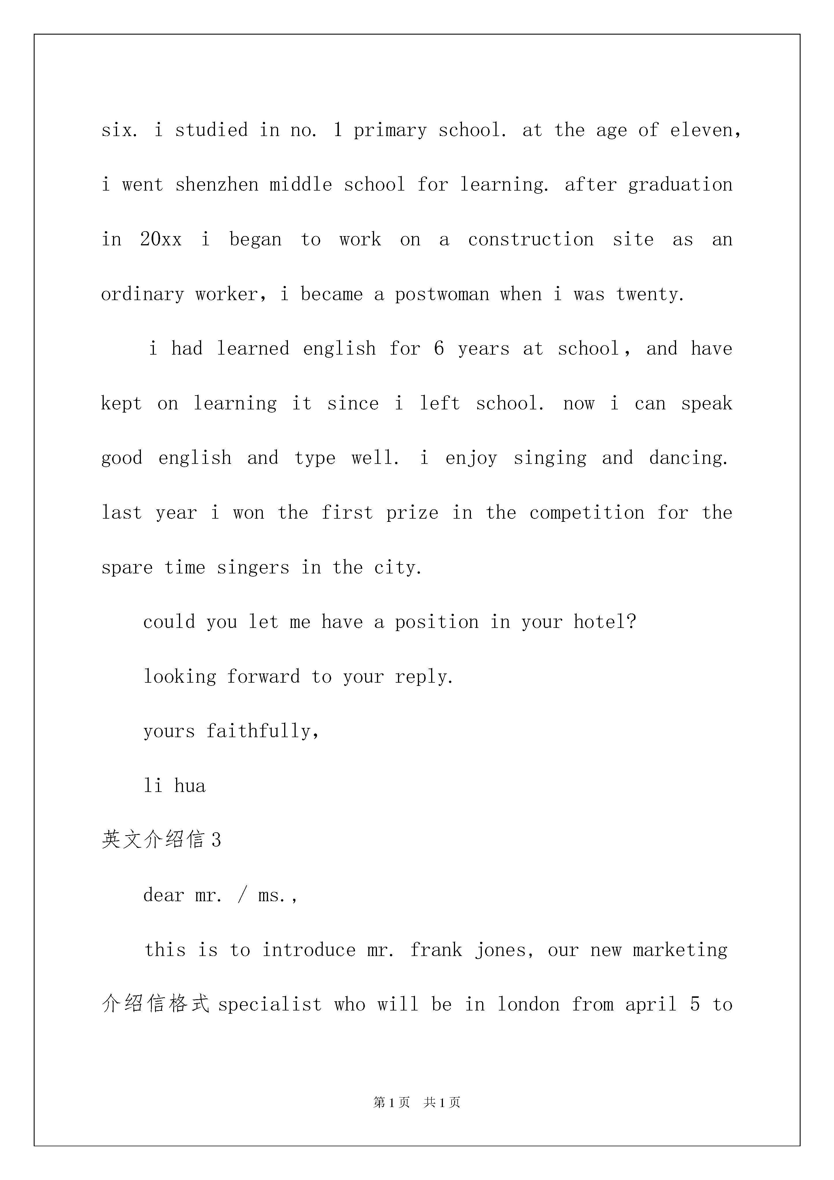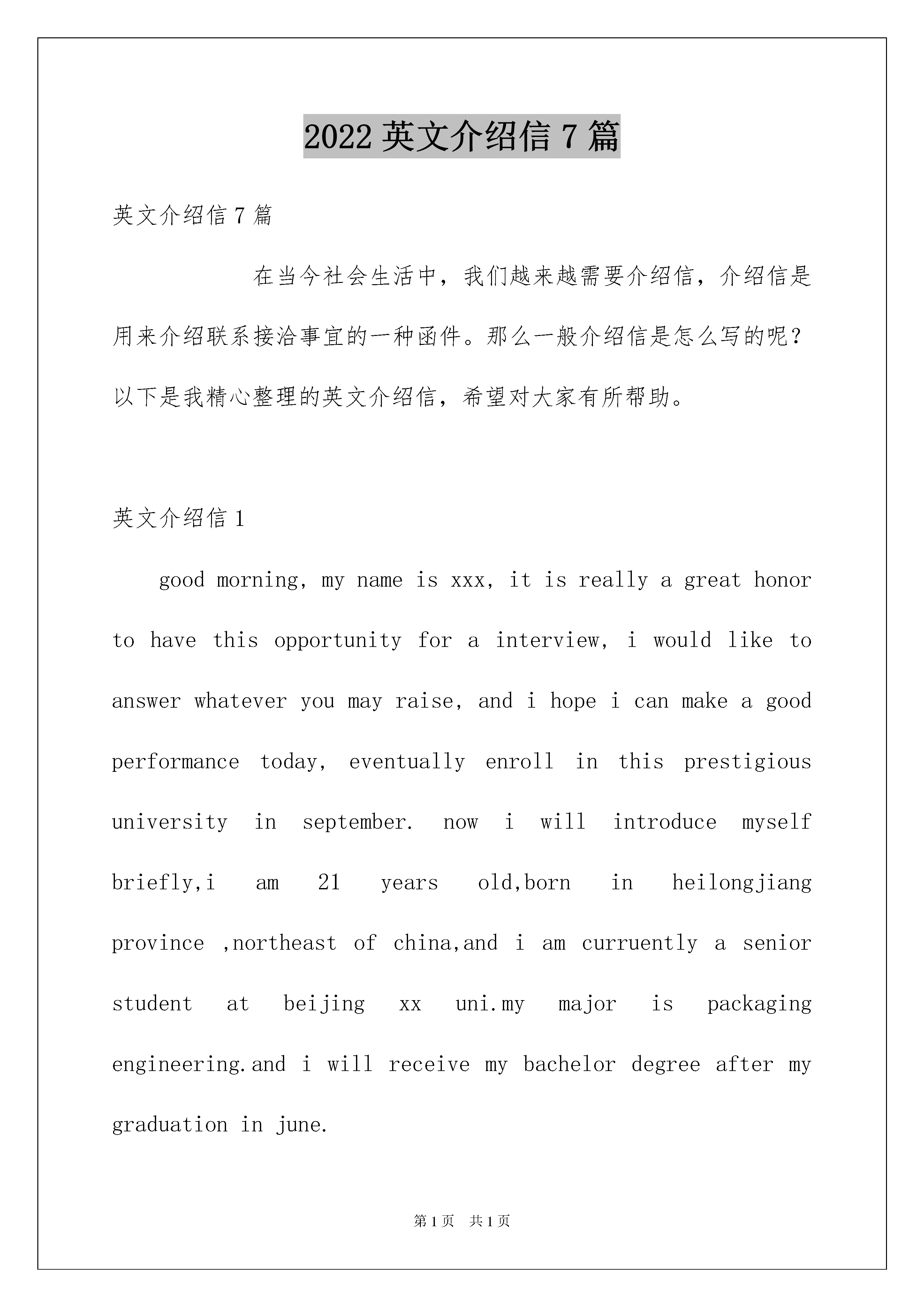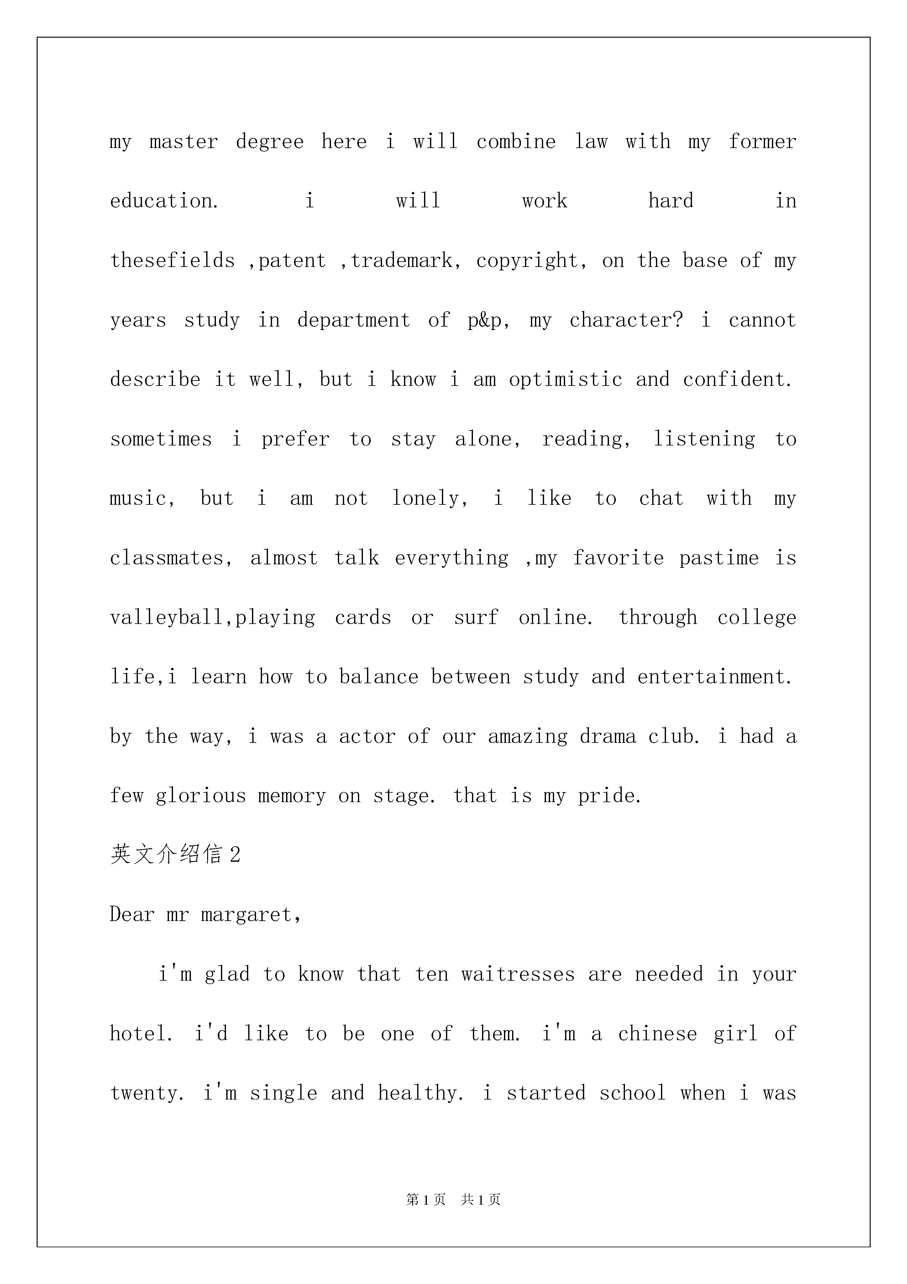 2022英文介绍信7篇英文介绍信7篇在当今社会生活中,我们越来越需要介绍信,介绍信是用来介绍联系接洽事宜的一种函件。那么一般介绍信是怎么写的呢?以下是我精心整理的英文介绍信,希望对大家有所帮助。英文介绍信1goodmorning,mynameisxxx,itisreallyagreathonortohavethisopportunityforainterview,iwouldliketoanswerwhateveryoumayraise,andihopeicanmakeagoodperformancetoday,eventuallyenrollinthisprestigiousuniversityinseptember.nowiwillintroducemyselfbriefly,iam21yearsold,borninheilongjiangprovince,northeastofchina,andiamcurruentlyaseniorstudentatbeijingxxuni.mymajorispackagingengineering.andiwillreceivemybachelordegreeaftermygraduationinjune.inthepast4years,ispendmostofmytimeonstudy,ihavepassedcet4/6withaease.andihaveacquiredbasicknowledgeofpackagingandpublishingbothintheoryandinpractice.besides,ihaveattendseveralpackagingexhibitionholdinbeijing,thisisouradvantagestudyhere,ihavetakenatourtosomebigfactoryandcompany.throughtheseihaveadeeplyunderstandingofdomesticpackagingindustry.comparedtodevelopedcountriessuchasus,unfortunately,althoughwehavemadeextraordinaryprogresssince1978,ourpackagingindustryarestillunderdeveloped,mess,unstable,thesituationofemployeesinthisfieldareawkard.butihavefullconfidenceinabrightfutureifonlyoureconomycankeepthegrowthpacestill.iguessyoumaybeinterestedinthereasonitchtolaw,andwhatismyplanduringgraduatestudylife,iwouldliketotellyouthatpursuelawisoneofmylifelonggoal,ilikemymajorpackagingandiwon"tgiveup,ificanpursuemymasterdegreehereiwillcombinelawwithmyformereducation.iwillworkhardinthesefields,patent,trademark,copyright,onthebaseofmyyearsstudyindepartmentofp&p,mycharacter?icannotdescribeitwell,butiknowiamoptimisticandconfident.sometimesiprefertostayalone,reading,listeningtomusic,butiamnotlonely,iliketochatwithmyclassmates,almosttalkeverything,myfavoritepastimeisvalleyball,playingcardsorsurfonline.throughcollegelife,ilearnhowtobalancebetweenstudyandentertainment.bytheway,iwasaactorofouramazingdramaclub.ihadafewgloriousmemoryonstage.thatismypride.英文介绍信2Dearmrmargaret,i'mgladtoknowth