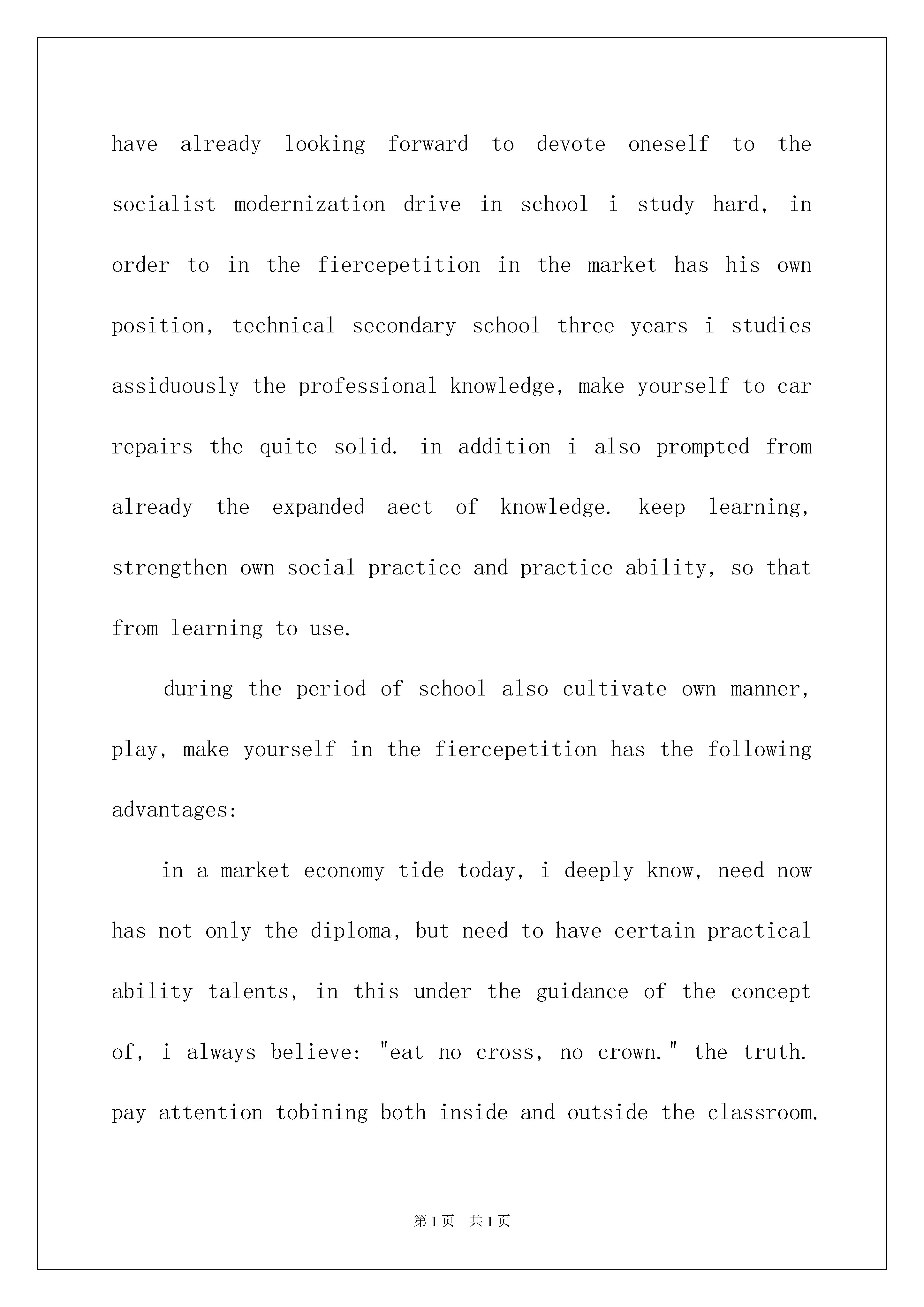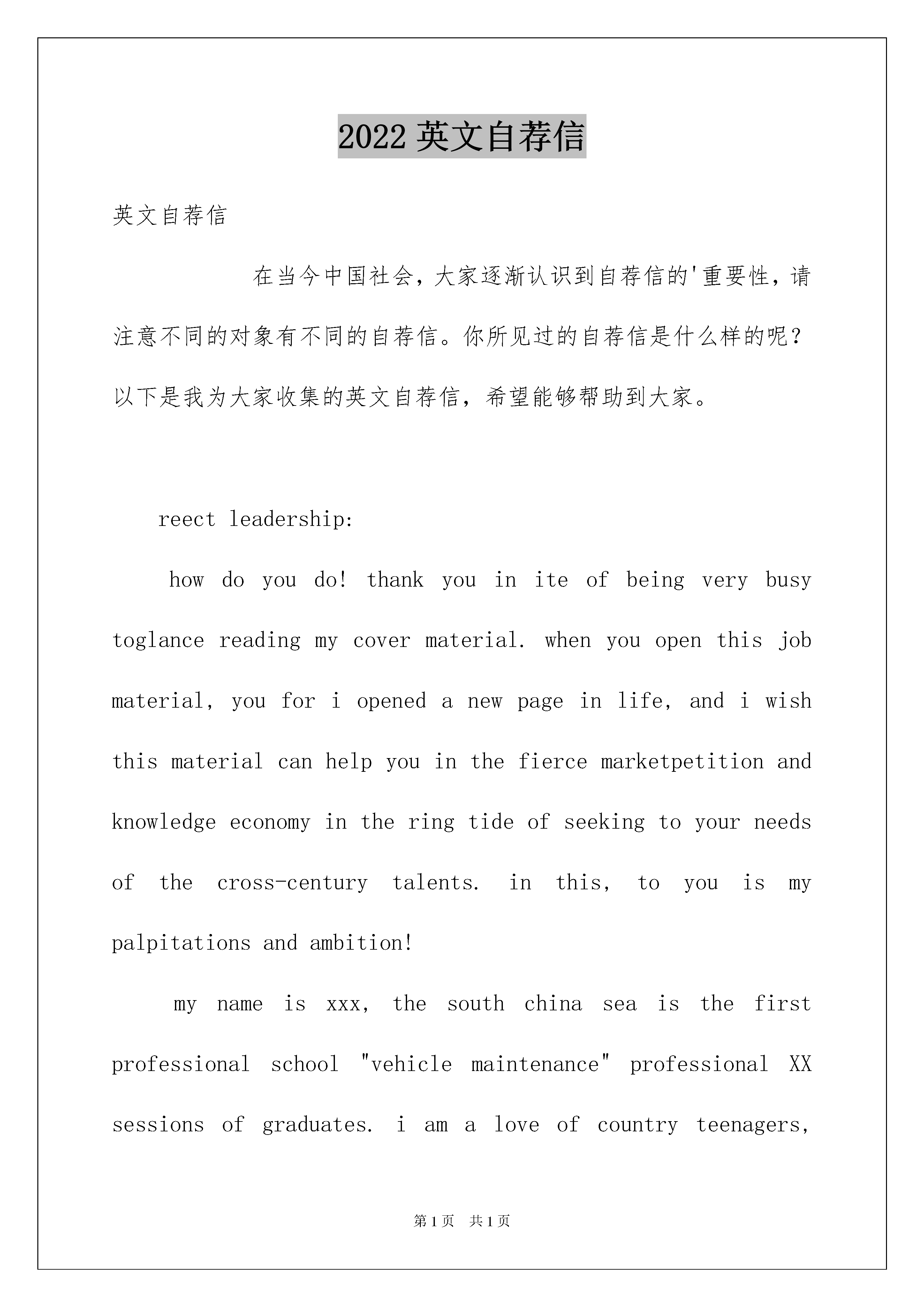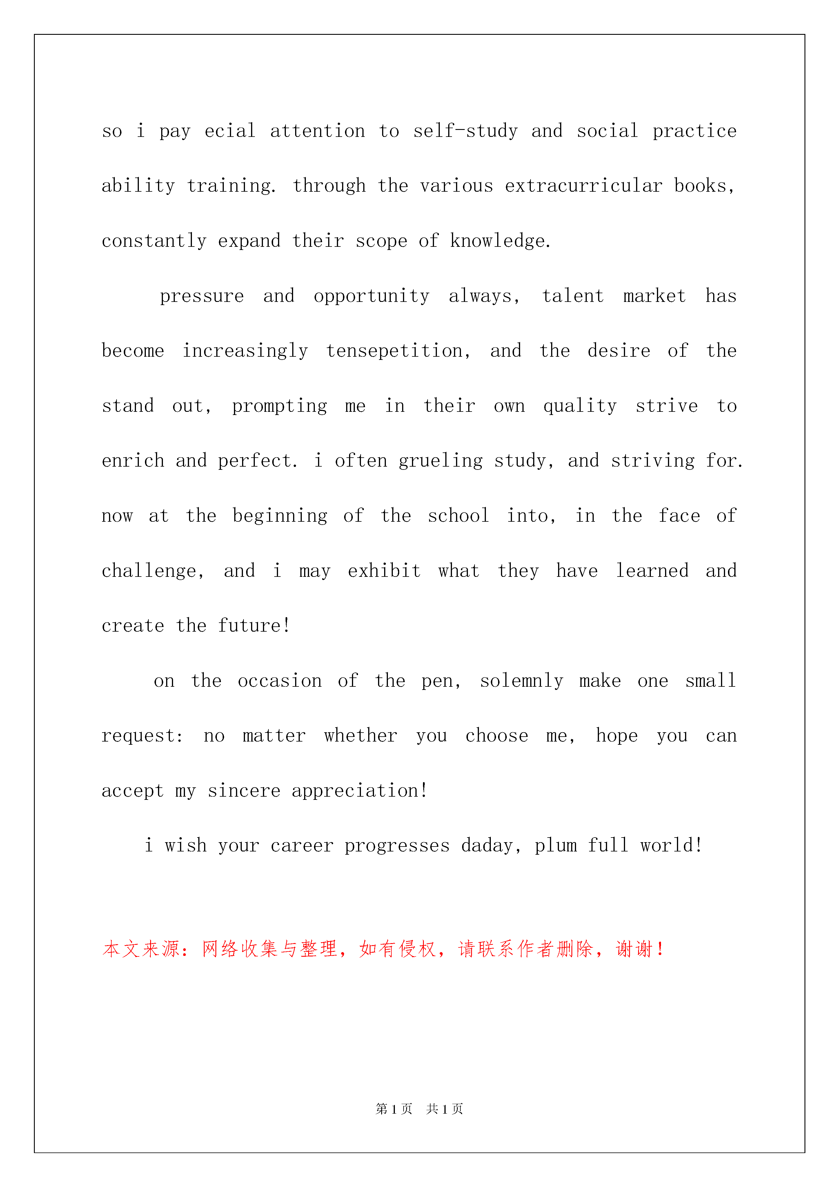 2022英文自荐信英文自荐信在当今中国社会,大家逐渐认识到自荐信的'重要性,请注意不同的对象有不同的自荐信。你所见过的自荐信是什么样的呢?以下是我为大家收集的英文自荐信,希望能够帮助到大家。reectleadership:howdoyoudo!thankyouiniteofbeingverybusytoglancereadingmycovermaterial.whenyouopenthisjobmaterial,youforiopenedanewpageinlife,andiwishthismaterialcanhelpyouinthefiercemarketpetitionandknowledgeeconomyintheringtideofseekingtoyourneedsofthecross-centurytalents.inthis,toyouismypalpitationsandambition!mynameisxxx,thesouthchinaseaisthefirstprofessionalschool"vehiclemaintenance"professionalXXsessionsofgraduates.iamaloveofcountryteenagers,havealreadylookingforwardtodevoteoneselftothesocialistmodernizationdriveinschoolistudyhard,inordertointhefiercepetitioninthemarkethashisownposition,technicalsecondaryschoolthreeyearsistudiesassiduouslytheprofessionalknowledge,makeyourselftocarrepairsthequitesolid.inadditionialsopromptedfromalreadytheexpandedaectofknowledge.keeplearning,strengthenownsocialpracticeandpracticeability,sothatfromlearningtouse.duringtheperiodofschoolalsocultivateownmanner,play,makeyourselfinthefiercepetitionhasthefollowingadvantages:inamarketeconomytidetoday,ideeplyknow,neednowhasnotonlythediploma,butneedtohavecertainpracticalabilitytalents,inthisundertheguidanceoftheconceptof,ialwaysbelieve:"eatnocross,nocrown."thetruth.payattentiontobiningbothinsideandoutsidetheclassroom.soipayecialattentiontoself-studyandsocialpracticeabilitytraining.throughthevariousextracurricularbooks,constantlyexpandtheirscopeofknowledge.pressureandopportunityalways,talentmarkethasbecomeincreasinglytensepetition,andthedesireofthestandout,promptingmeintheirownqualitystrivetoenrichandperfect.ioftengruelingstudy,andstrivingfor.nowatthebeginningoftheschoolinto,inthefaceofchallenge,andimayexhibitwhattheyhavelearnedandcreatethefuture!ontheoccasionofthepen,solemnlymakeonesmallrequest:nomatterwhetheryouchooseme,hopeyoucanacceptmysincereappreciation!iwishyourcareerprogressesdaday,plumfullworld!本文来源:网络收集与整理,如有侵
