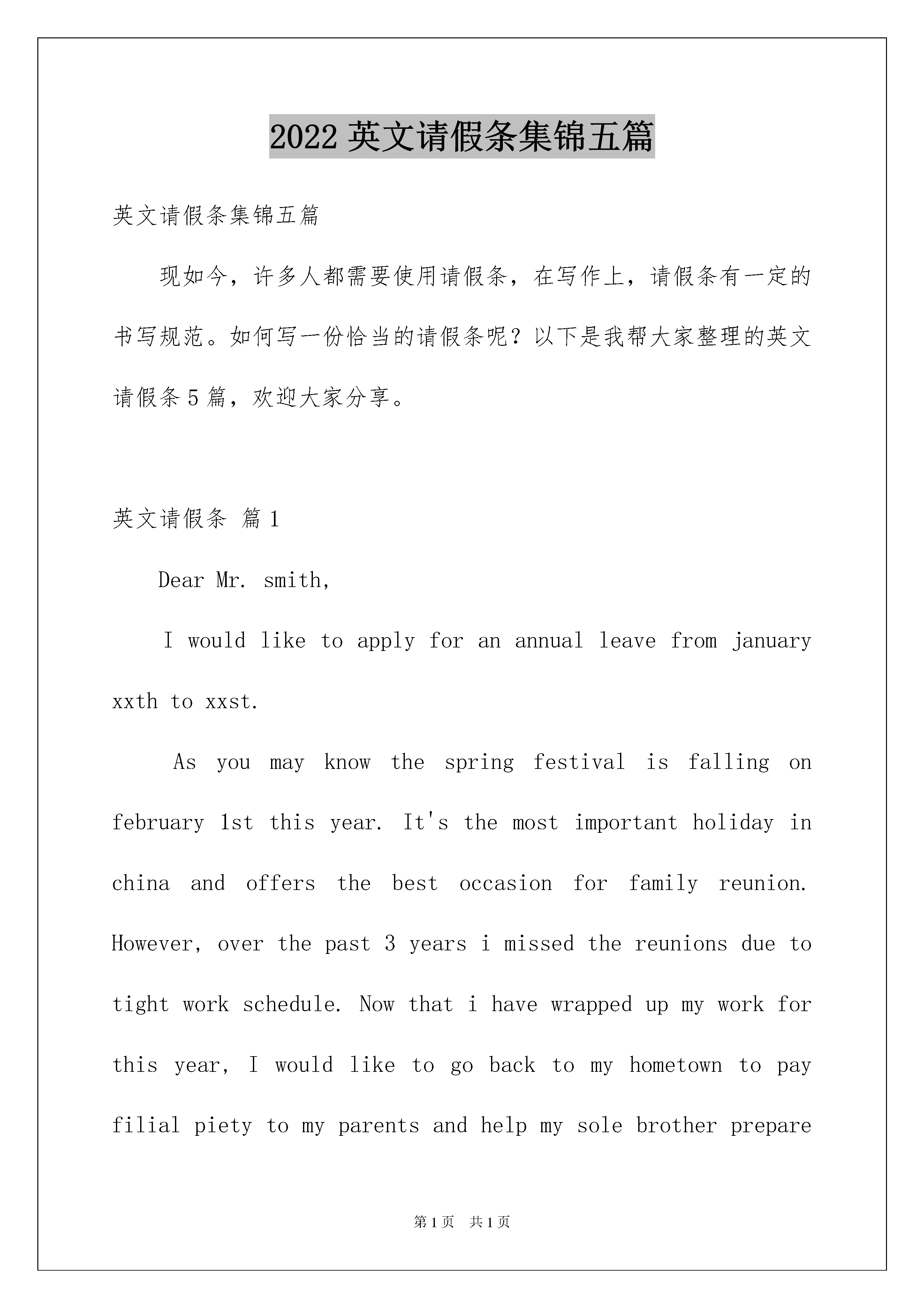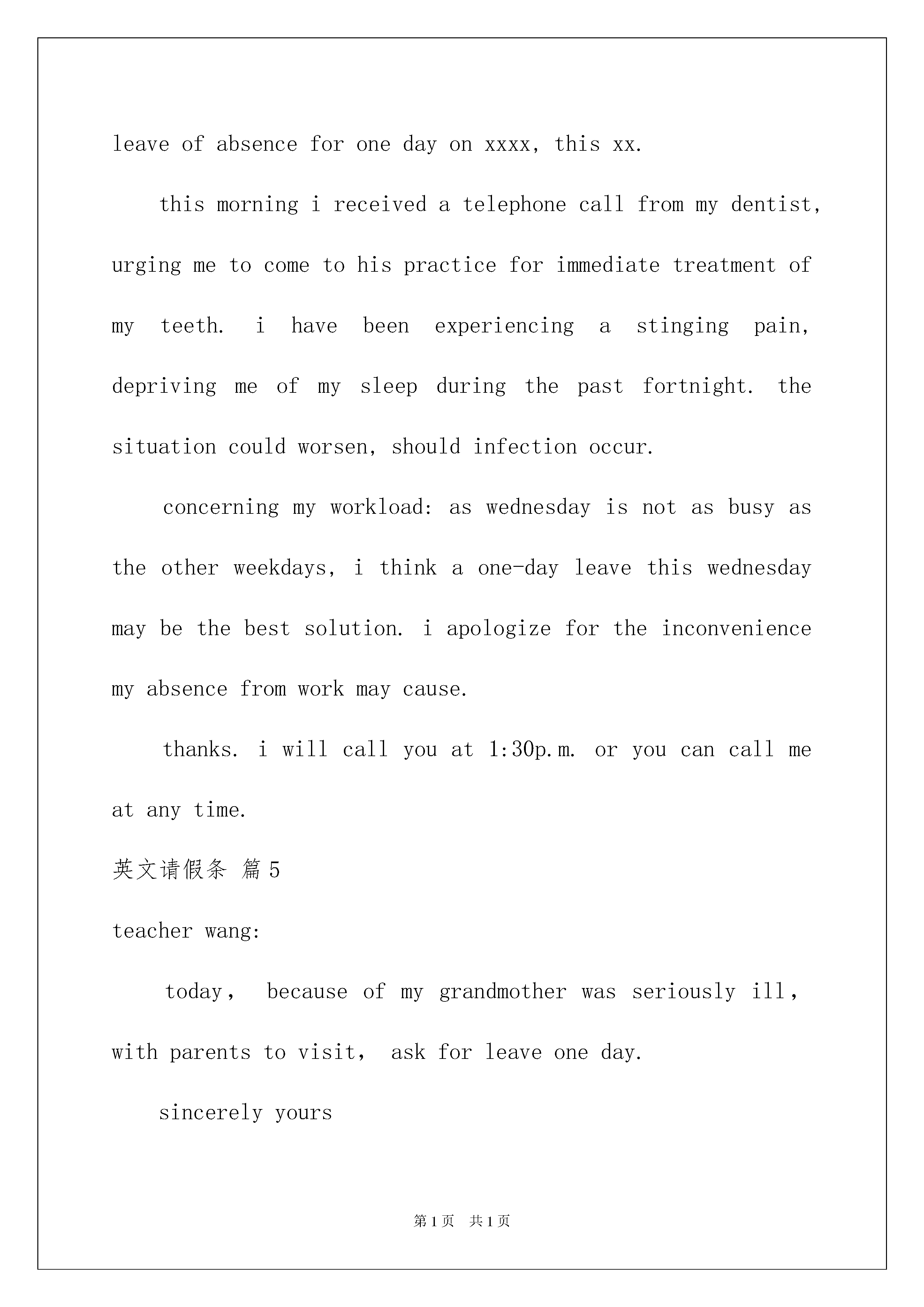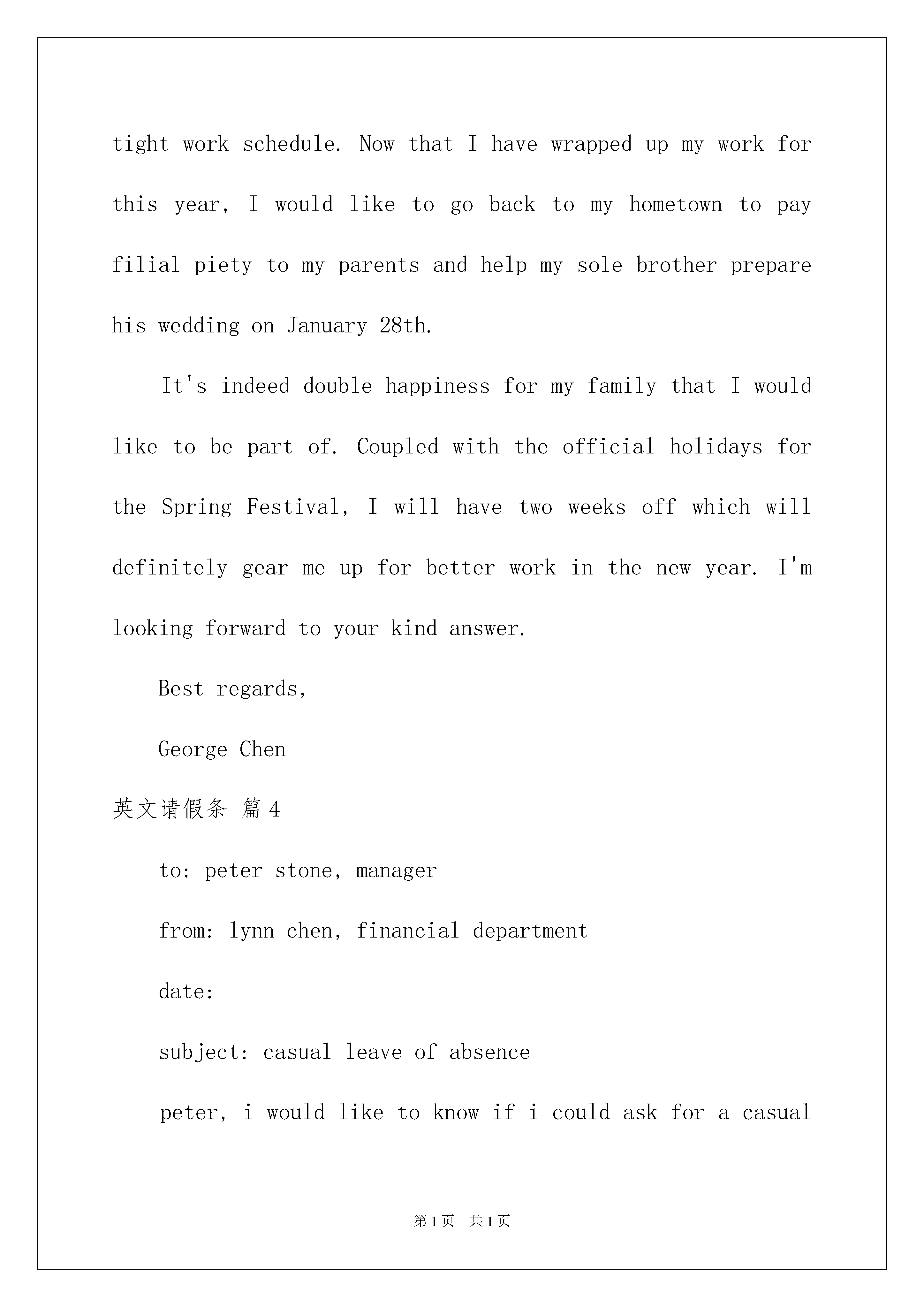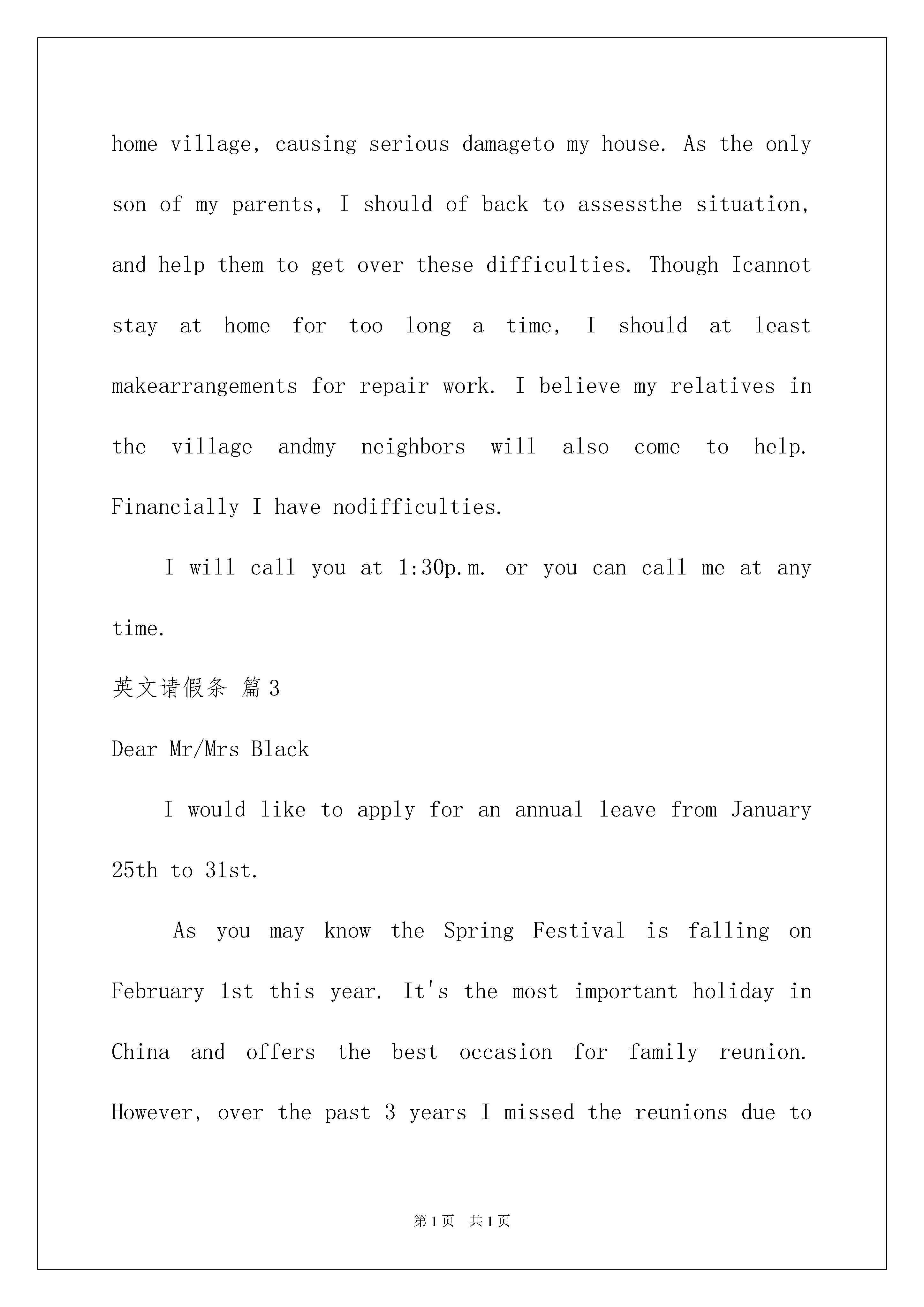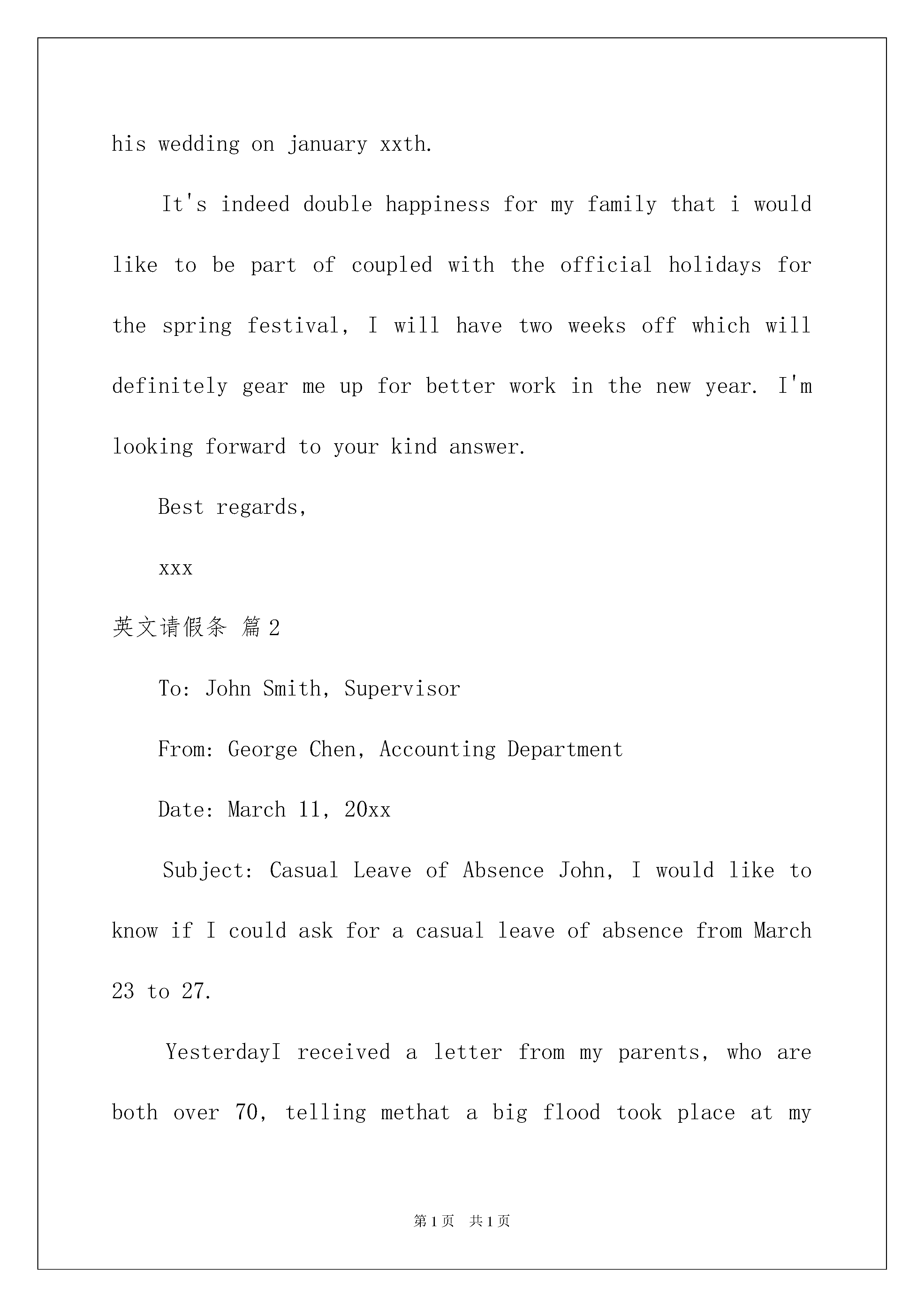 2022英文请假条集锦五篇英文请假条集锦五篇现如今,许多人都需要使用请假条,在写作上,请假条有一定的书写规范。如何写一份恰当的请假条呢?以下是我帮大家整理的英文请假条5篇,欢迎大家分享。英文请假条篇1DearMr.smith,Iwouldliketoapplyforanannualleavefromjanuaryxxthtoxxst.Asyoumayknowthespringfestivalisfallingonfebruary1stthisyear.It'sthemostimportantholidayinchinaandoffersthebestoccasionforfamilyreunion.However,overthepast3yearsimissedthereunionsduetotightworkschedule.Nowthatihavewrappedupmyworkforthisyear,Iwouldliketogobacktomyhometowntopayfilialpietytomyparentsandhelpmysolebrotherpreparehisweddingonjanuaryxxth.It'sindeeddoublehappinessformyfamilythatiwouldliketobepartofcoupledwiththeofficialholidaysforthespringfestival,Iwillhavetwoweeksoffwhichwilldefinitelygearmeupforbetterworkinthenewyear.I'mlookingforwardtoyourkindanswer.Bestregards,xxx英文请假条篇2To:JohnSmith,SupervisorFrom:GeorgeChen,AccountingDepartmentDate:March11,20xxSubject:CasualLeaveofAbsenceJohn,IwouldliketoknowifIcouldaskforacasualleaveofabsencefromMarch23to27.YesterdayIreceivedaletterfrommyparents,whoarebothover70,tellingmethatabigfloodtookplaceatmyhomevillage,causingseriousdamagetomyhouse.Astheonlysonofmyparents,Ishouldofbacktoassessthesituation,andhelpthemtogetoverthesedifficulties.ThoughIcannotstayathomefortoolongatime,Ishouldatleastmakearrangementsforrepairwork.Ibelievemyrelativesinthevillageandmyneighborswillalsocometohelp.FinanciallyIhavenodifficulties.Iwillcallyouat1:30p.m.oryoucancallmeatanytime.英文请假条篇3DearMr/MrsBlackIwouldliketoapplyforanannualleavefromJanuary25thto31st.AsyoumayknowtheSpringFestivalisfallingonFebruary1stthisyear.It'sthemostimportantholidayinChinaandoffersthebestoccasionforfamilyreunion.However,overthepast3yearsImissedthereunionsduetotightworkschedule.NowthatIhavewrappedupmyworkforthisyear,IwouldliketogobacktomyhometowntopayfilialpietytomyparentsandhelpmysolebrotherpreparehisweddingonJanuary28th.It'sindeeddoublehappinessformyfamilythatIwouldliketobepartof.CoupledwiththeofficialholidaysfortheSpringFestival