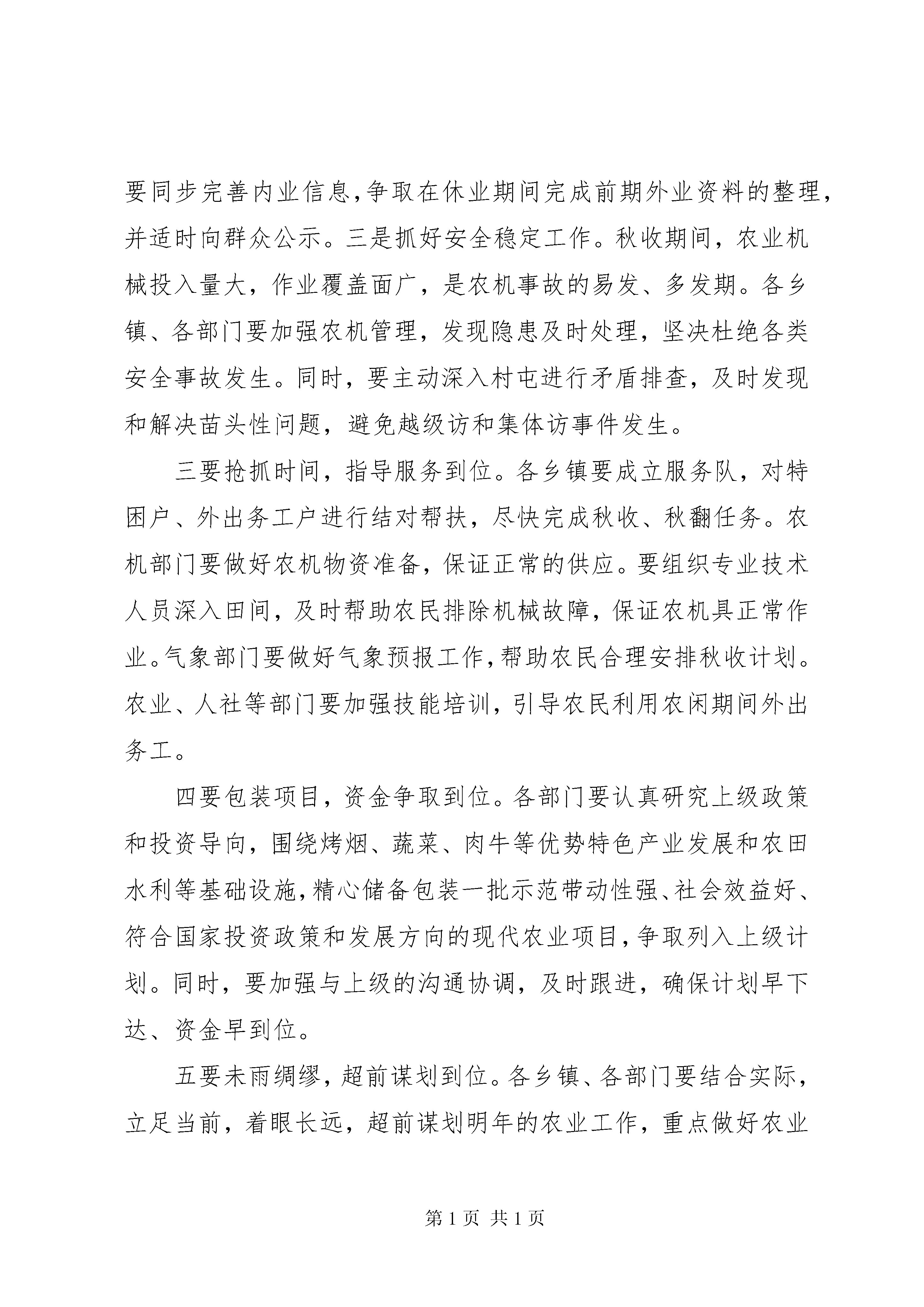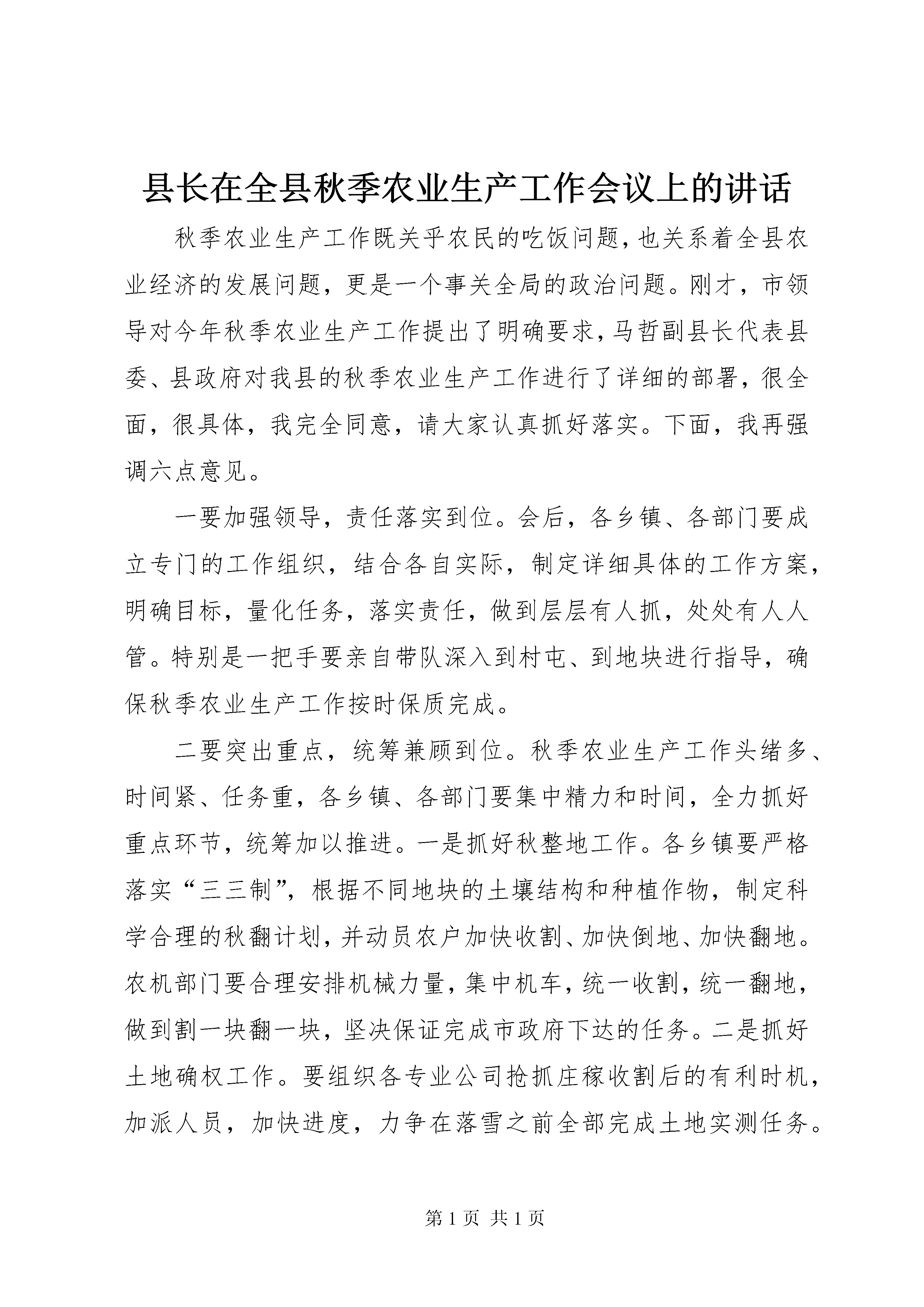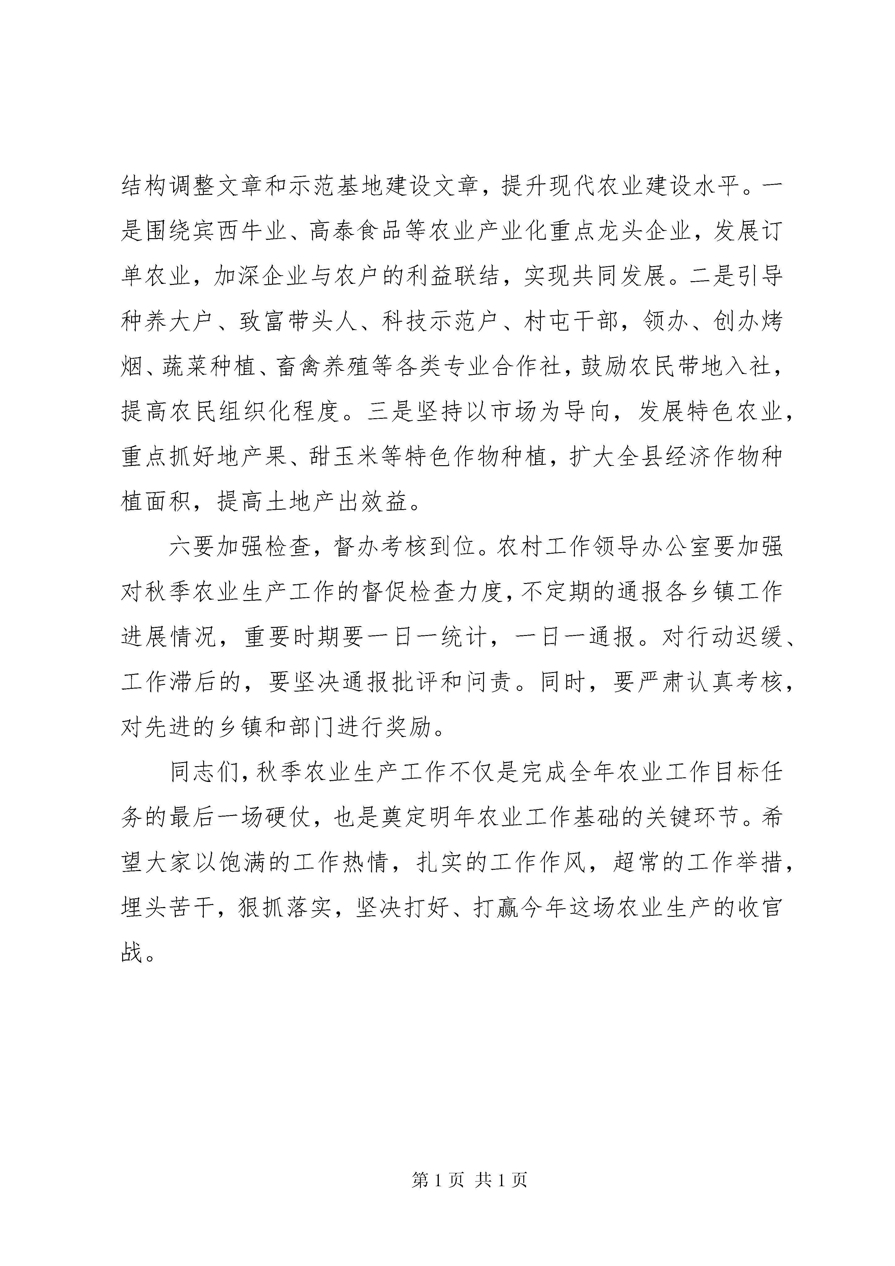 县长在全县秋季农业生产工作会议上的讲话秋季农业生产工作既关乎农民的吃饭问题,也关系着全县农业经济的发展问题,更是一个事关全局的政治问题。刚才,市领导对今年秋季农业生产工作提出了明确要求,马哲副县长代表县委、县政府对我县的秋季农业生产工作进行了详细的部署,很全面,很具体,我完全同意,请大家认真抓好落实。下面,我再强调六点意见。一要加强领导,责任落实到位。会后,各乡镇、各部门要成立专门的工作组织,结合各自实际,制定详细具体的工作方案,明确目标,量化任务,落实责任,做到层层有人抓,处处有人人管。特别是一把手要亲自带队深入到村屯、到地块进行指导,确保秋季农业生产工作按时保质完成。二要突出重点,统筹兼顾到位。秋季农业生产工作头绪多、时间紧、任务重,各乡镇、各部门要集中精力和时间,全力抓好重点环节,统筹加以推进。一是抓好秋整地工作。各乡镇要严格落实“三三制”,根据不同地块的土壤结构和种植作物,制定科学合理的秋翻计划,并动员农户加快收割、加快倒地、加快翻地。农机部门要合理安排机械力量,集中机车,统一收割,统一翻地,做到割一块翻一块,坚决保证完成市政府下达的任务。二是抓好土地确权工作。要组织各专业公司抢抓庄稼收割后的有利时机,加派人员,加快进度,力争在落雪之前全部完成土地实测任务。要同步完善内业信息,争取在休业期间完成前期外业资料的整理,并适时向群众公示。三是抓好安全稳定工作。秋收期间,农业机械投入量大,作业覆盖面广,是农机事故的易发、多发期。各乡镇、各部门要加强农机管理,发现隐患及时处理,坚决杜绝各类安全事故发生。同时,要主动深入村屯进行矛盾排查,及时发现和解决苗头性问题,避免越级访和集体访事件发生。三要抢抓时间,指导服务到位。各乡镇要成立服务队,对特困户、外出务工户进行结对帮扶,尽快完成秋收、秋翻任务。农机部门要做好农机物资准备,保证正常的供应。要组织专业技术人员深入田间,及时帮助农民排除机械故障,保证农机具正常作业。气象部门要做好气象预报工作,帮助农民合理安排秋收计划。农业、人社等部门要加强技能培训,引导农民利用农闲期间外出务工。四要包装项目,资金争取到位。各部门要认真研究上级政策和投资导向,围绕烤烟、蔬菜、肉牛等优势特色产业发展和农田水利等基础设施,精心储备包装一批示范带动性强、社会效益好、符合国家投资政策和发展方向的现代农业项目,争取列入上级计划。同时,要加强与上级的沟通协调,及时跟进,确保计划早下达、资金早到位。五要未雨绸缪,超前谋划到位。各乡镇、各部门要结合实际,立足当前,着眼长远,超前谋划明年的农业工作,重点做好农业结构调整文章和示范基地建设文章,提升现代农业建设水平。一是围绕宾西牛业、高泰食品等农业产业化重点龙头企业,发展订单农业,加深企业与农户的利益联结,实现共同发展。二是引导种养大户、致富带头人、科技示范户、村屯干部,领办、创办烤烟、蔬菜种植、畜禽养殖等各类专业合作社,鼓励农民带地入社,提高农民组织化程度。三是坚持以市场为导向,发展特色农业,重点抓好地产果、甜玉米等特色作物种植,扩大全县经济作物种植面积,提高土地产出效益。六要加强检查,督办考核到位。农村工作领导办公室要加强对秋季农业生产工作的督促检查力度,不定期的通报各乡镇工作进展情况,重要时期要一日一统计,一日一通报。对行动迟缓、工作滞后的,要坚决通报批评和问责。同时,要严肃认真考核,对先进的乡镇和部门进行奖励。同志们,秋季农业生产工作不仅是完成全年农业工作目标任务的最后一场硬仗,也是奠定明年农业工作基础的关键环节。希望大家以饱满的工作热情,扎实的工作作风,超常的工作举措,埋头苦干,狠抓落实,坚决打好、打赢今年这场农业生产的收官战。