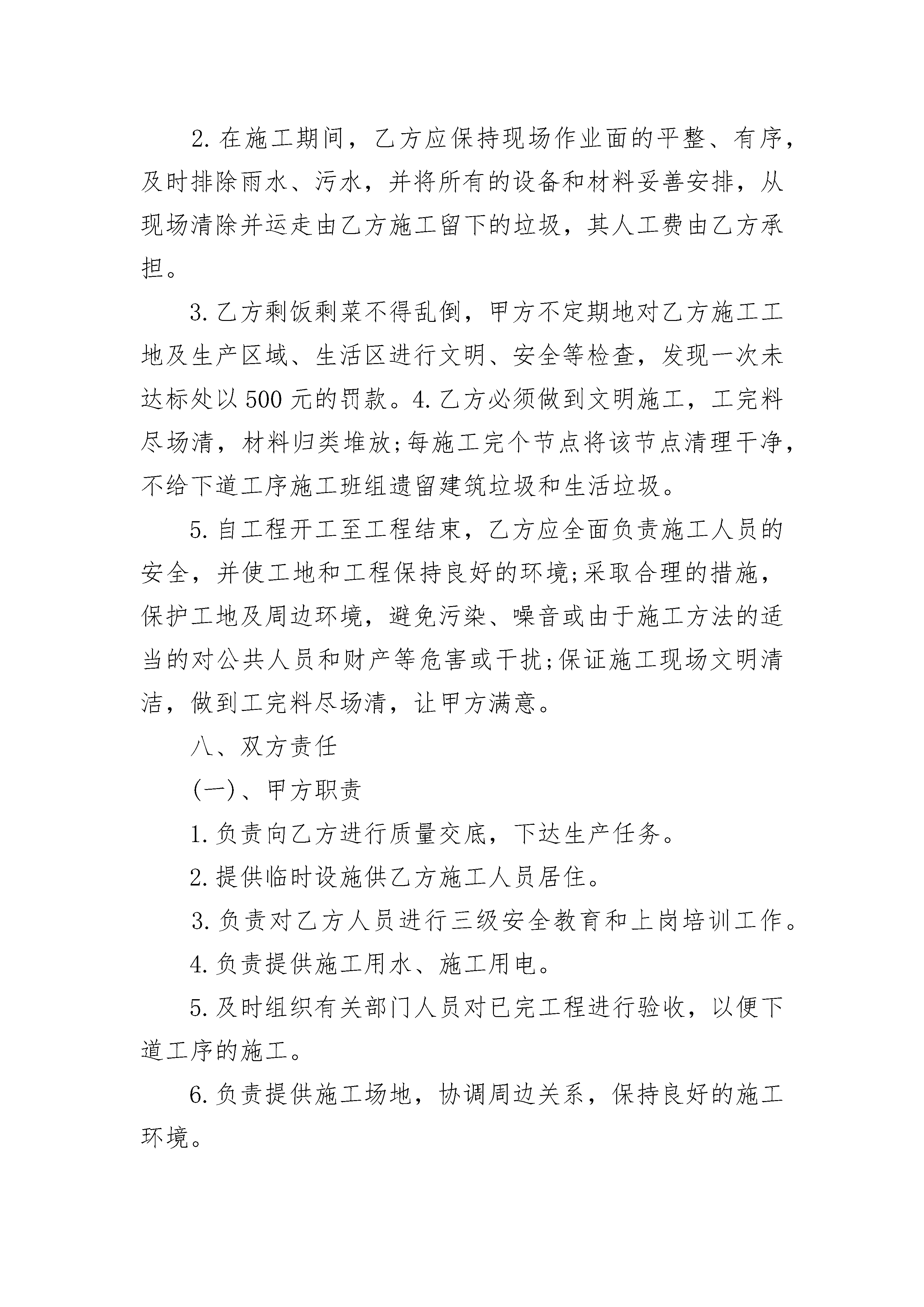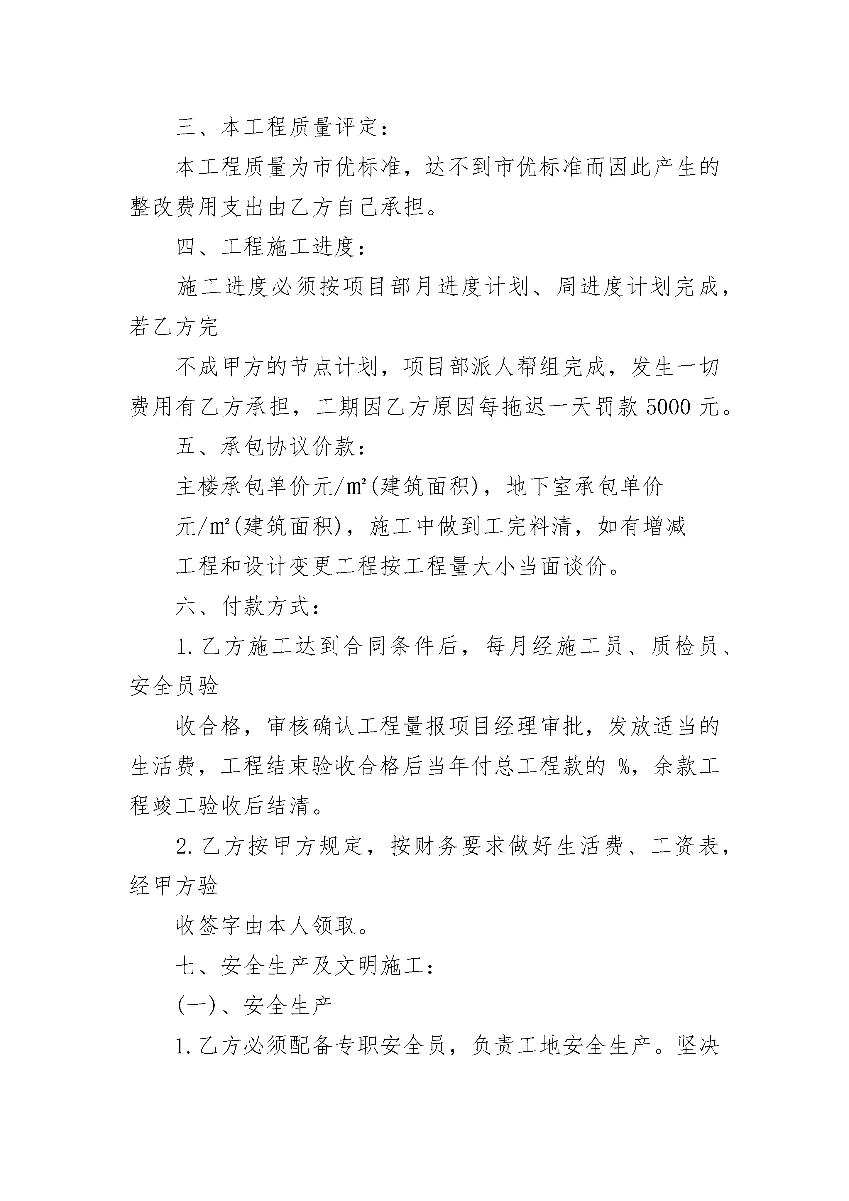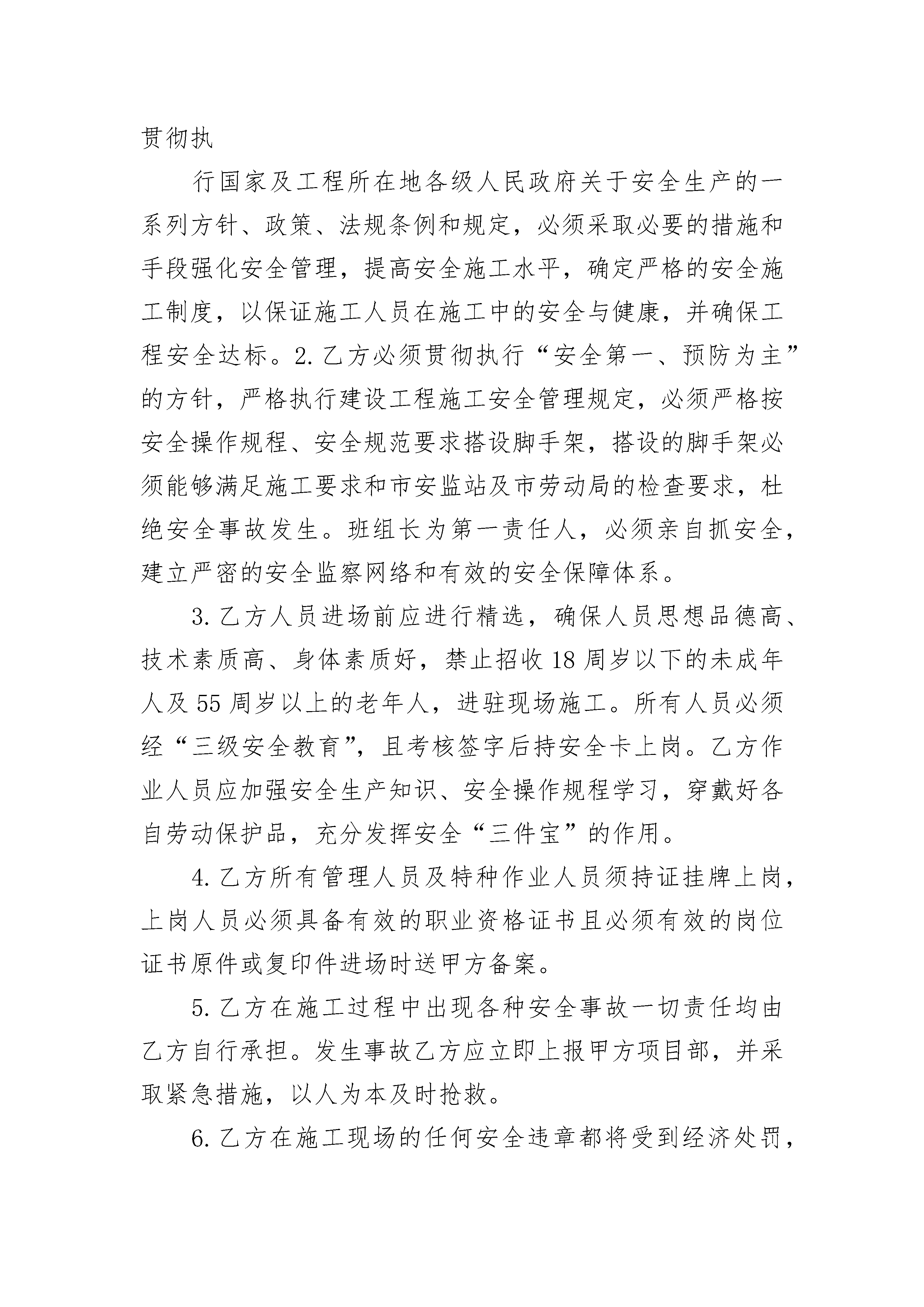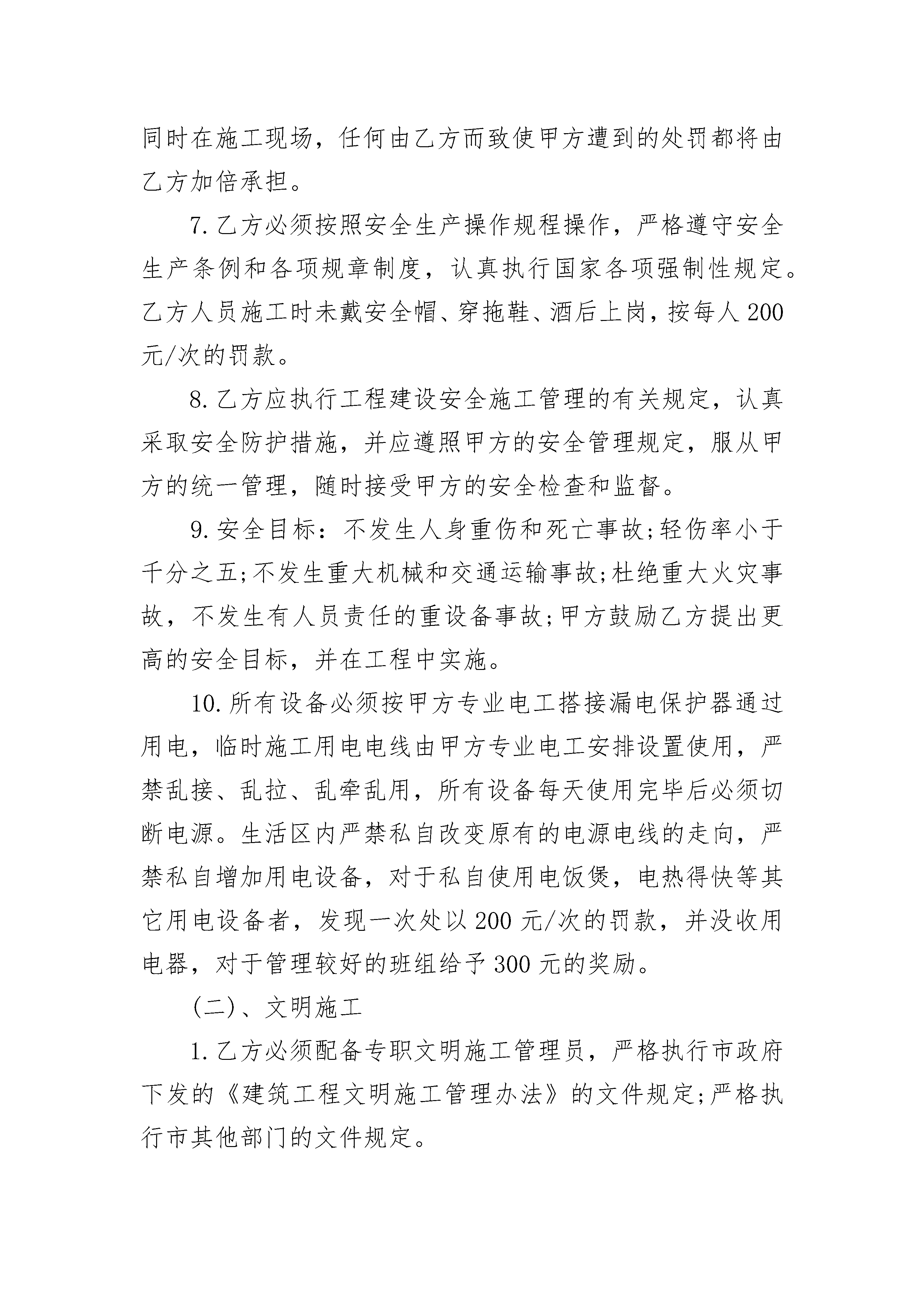 工程施工承包安全协议工程施工承包安全协议(通用19篇)工程施工承包安全协议篇1目部(简称甲方)承包单位:(简称乙方)为了确保双方工作内容以及权利,满足工程进度、质量、安全、文明施工的要求,确保工程顺利进行,经甲乙双方协商,遵循自愿、平等、公平诚实的原则达成以下条款。一、工程概况:1.工程名称:2.工程地点:3.承包方式:包工包料(甲方只提供塔吊、工人宿舍;乙方负责人工及钢管、扣件、小型机械机具等材料)。4.工期:按项目部进度计划。二、承包工程范围:本工程图纸内所有的内、外架、施工操作架、施工操作平台、现浇砼运输道、安全平网与立网的张挂、装饰架、所有楼层临边洞口、电梯井口、顶板预留洞口、屋面女儿墙周边安全防护及临时工棚搭设等全部架子工内容(木工所有内排架钢管、扣件等材料有乙方负责提供)。三、本工程质量评定:本工程质量为市优标准,达不到市优标准而因此产生的整改费用支出由乙方自己承担。四、工程施工进度:施工进度必须按项目部月进度计划、周进度计划完成,若乙方完不成甲方的节点计划,项目部派人帮组完成,发生一切费用有乙方承担,工期因乙方原因每拖迟一天罚款5000元。五、承包协议价款:主楼承包单价元/㎡(建筑面积),地下室承包单价元/㎡(建筑面积),施工中做到工完料清,如有增减工程和设计变更工程按工程量大小当面谈价。六、付款方式:1.乙方施工达到合同条件后,每月经施工员、质检员、安全员验收合格,审核确认工程量报项目经理审批,发放适当的生活费,工程结束验收合格后当年付总工程款的%,余款工程竣工验收后结清。2.乙方按甲方规定,按财务要求做好生活费、工资表,经甲方验收签字由本人领取。七、安全生产及文明施工:(一)、安全生产1.乙方必须配备专职安全员,负责工地安全生产。坚决贯彻执行国家及工程所在地各级人民政府关于安全生产的一系列方针、政策、法规条例和规定,必须采取必要的措施和手段强化安全管理,提高安全施工水平,确定严格的安全施工制度,以保证施工人员在施工中的安全与健康,并确保工程安全达标。2.乙方必须贯彻执行“安全第一、预防为主”的方针,严格执行建设工程施工安全管理规定,必须严格按安全操作规程、安全规范要求搭设脚手架,搭设的脚手架必须能够满足施工要求和市安监站及市劳动局的检查要求,杜绝安全事故发生。班组长为第一责任人,必须亲自抓安全,建立严密的安全监察网络和有效的安全保障体系。3.乙方人员进场前应进行精选,确保人员思想品德高、技术素质高、身体素质好,禁止招收18周岁以下的未成年人及55周岁以上的老年人,进驻现场施工。所有人员必须经“三级安全教育”,且考核签字后持安全卡上岗。乙方作业人员应加强安全生产知识、安全操作规程学习,穿戴好各自劳动保护品,充分发挥安全“三件宝”的作用。4.乙方所有管理人员及特种作业人员须持证挂牌上岗,上岗人员必须具备有效的职业资格证书且必须有效的岗位证书原件或复印件进场时送甲方备案。5.乙方在施工过程中出现各种安全事故一切责任均由乙方自行承担。发生事故乙方应立即上报甲方项目部,并采取紧急措施,以人为本及时抢救。6.乙方在施工现场的任何安全违章都将受到经济处罚,同时在施工现场,任何由乙方而致使甲方遭到的处罚都将由乙方加倍承担。7.乙方必须按照安全生产操作规程操作,严格遵守安全生产条例和各项规章制度,认真执行国家各项强制性规定。乙方人员施工时未戴安全帽、穿拖鞋、酒后上岗,按每人200元/次的罚款。8.乙方应执行工程建设安全施工管理的有关规定,认真采取安全防护措施,并应遵照甲方的安全管理规定,服从甲方的统一管理,随时接受甲方的安全检查和监督。9.安全目标:不发生人身重伤和死亡事故;轻伤率小于千分之五;不发生重大机械和交通运输事故;杜绝重大火灾事故,不发生有人员责任的重设备事故;甲方鼓励乙方提出更高的安全目标,并在工程中实施。10.所有设备必须按甲方专业电工搭接漏电保护器通过用电,临时施工用电电线由甲方专业电工安排设置使用,严禁乱接、乱拉、乱牵乱用,所有设备每天使用完毕后必须切断电源。生活区内严禁私自改变原有的电源电线的走向,严禁私自增加用电设备,对于私自使用电饭煲,电热得快等其它用电设备者,发现一次处以200元/次的罚款,并没收用电器,对于管理较好的班组给予300元的奖励。(二)、文明施工1.乙方必须配备专职文明施工管理员,严格执行市政府下发的《建筑工程文明施工管理办法》的文件规定;严格执行市其他部门的文件规定。2.在施工期间,乙方应保持现场作业面的平整、有序,及时排除雨水、污水,并将所有的设备和材料妥善安排,从现场清除并运走由乙方施工留下的垃圾,其人工费由乙方承担。3.乙方剩饭剩菜不得乱倒,甲方不定期地对乙方施工工地及生产区域、生活区进行文明、安全等检查,发现一次未达标处以500元的罚款。4.乙方必须做到文明施工,工完料尽场清