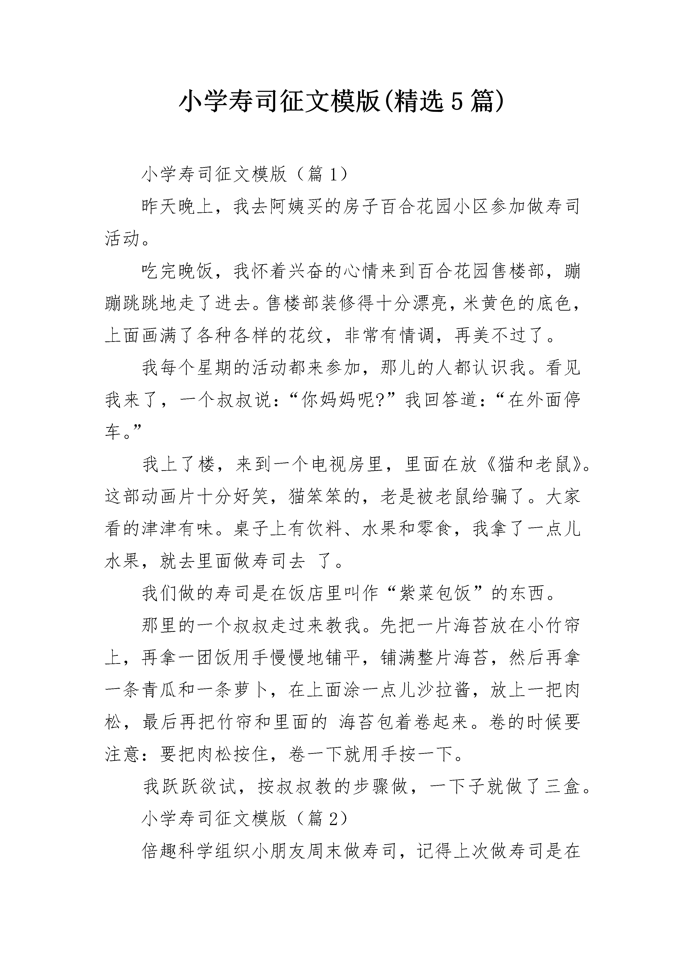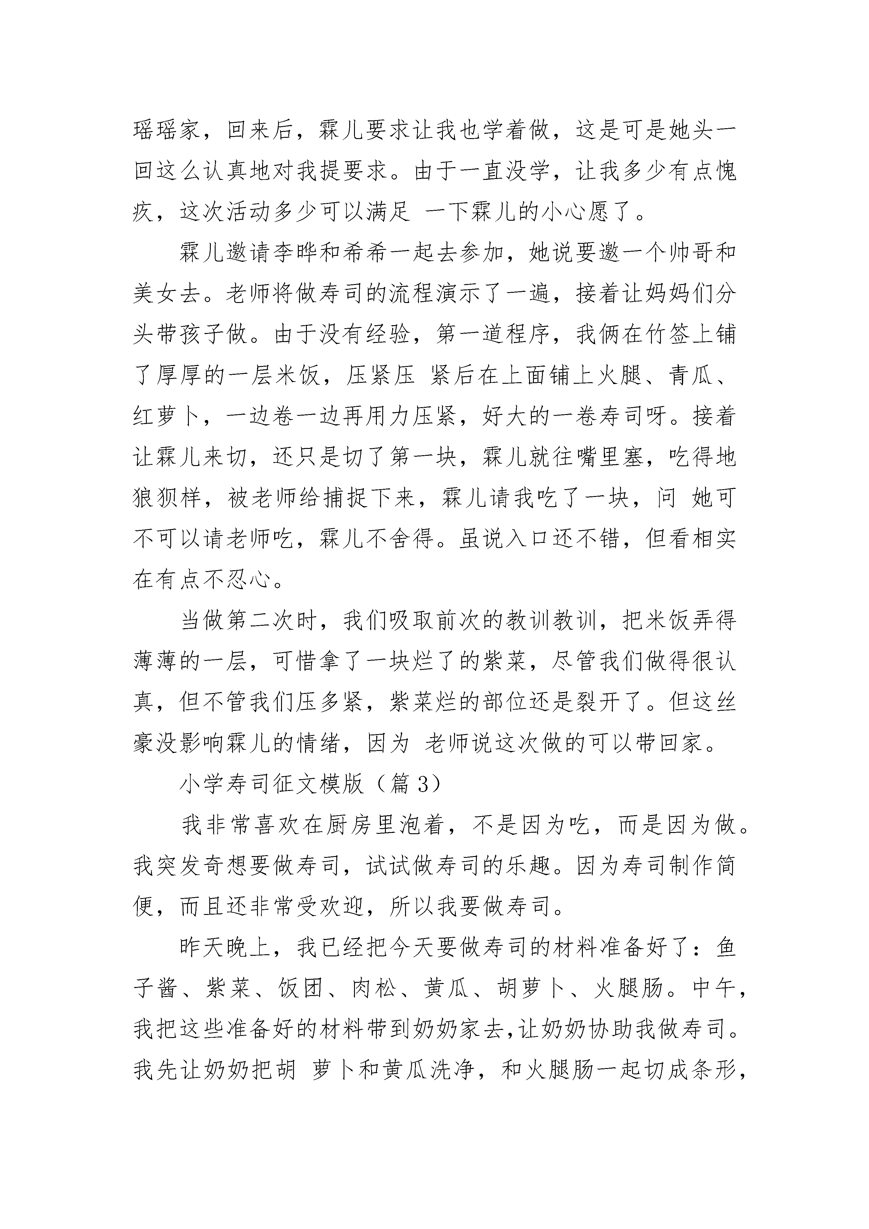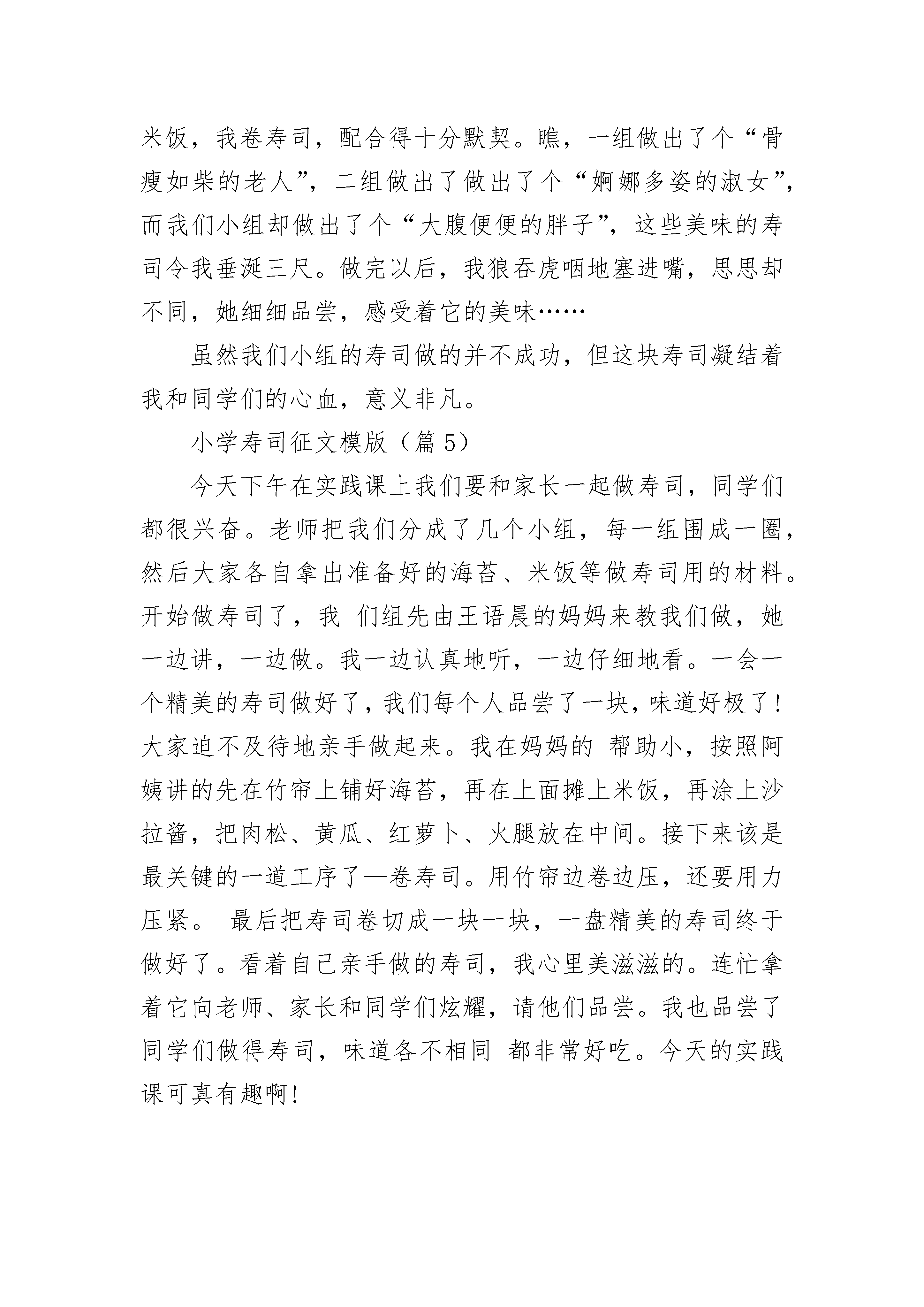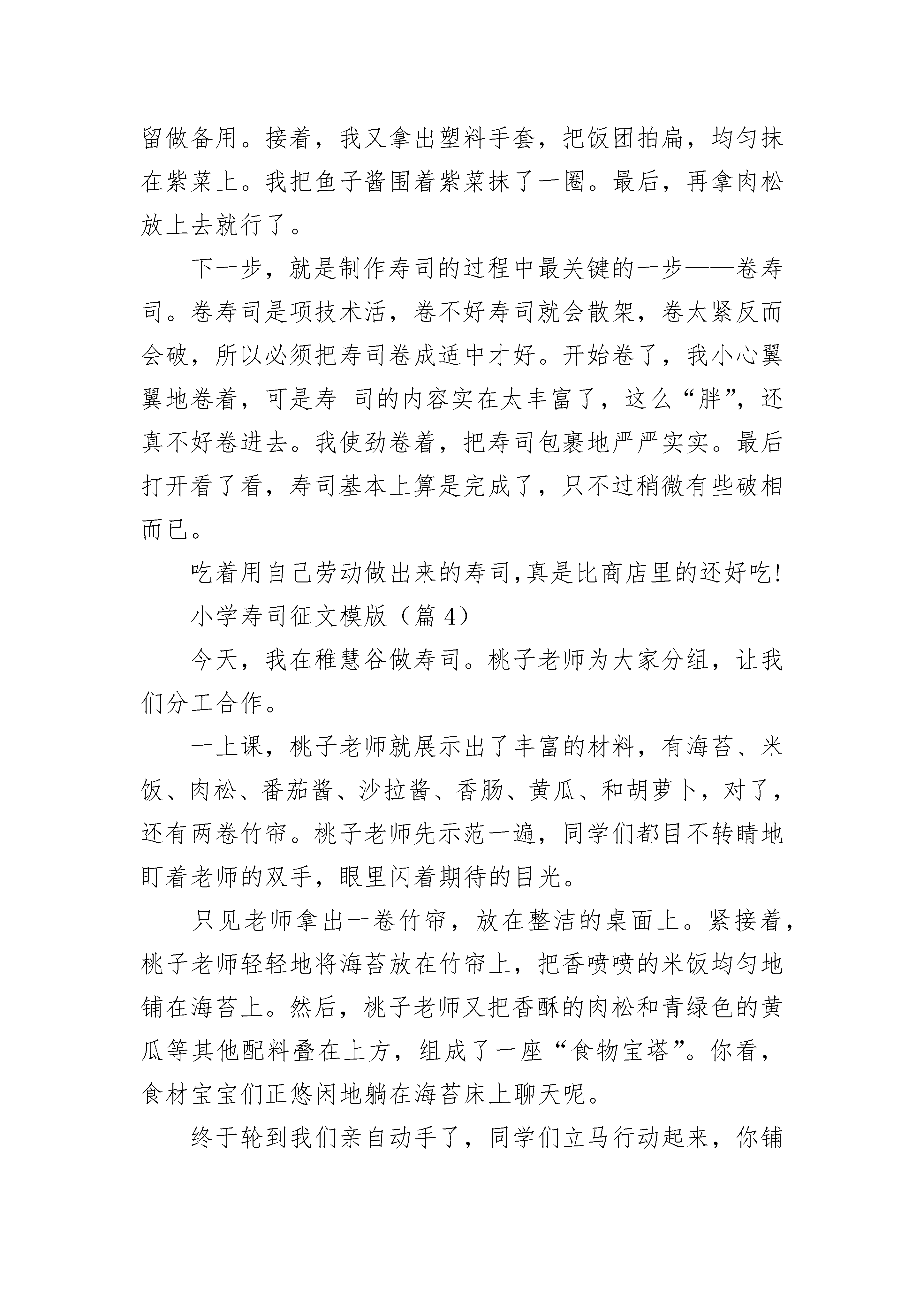 小学寿司征文模版(精选5篇)小学寿司征文模版(篇1)昨天晚上,我去阿姨买的房子百合花园小区参加做寿司活动。吃完晚饭,我怀着兴奋的心情来到百合花园售楼部,蹦蹦跳跳地走了进去。售楼部装修得十分漂亮,米黄色的底色,上面画满了各种各样的花纹,非常有情调,再美不过了。我每个星期的活动都来参加,那儿的人都认识我。看见我来了,一个叔叔说:“你妈妈呢?”我回答道:“在外面停车。”我上了楼,来到一个电视房里,里面在放《猫和老鼠》。这部动画片十分好笑,猫笨笨的,老是被老鼠给骗了。大家看的津津有味。桌子上有饮料、水果和零食,我拿了一点儿水果,就去里面做寿司去了。我们做的寿司是在饭店里叫作“紫菜包饭”的东西。那里的一个叔叔走过来教我。先把一片海苔放在小竹帘上,再拿一团饭用手慢慢地铺平,铺满整片海苔,然后再拿一条青瓜和一条萝卜,在上面涂一点儿沙拉酱,放上一把肉松,最后再把竹帘和里面的海苔包着卷起来。卷的时候要注意:要把肉松按住,卷一下就用手按一下。我跃跃欲试,按叔叔教的步骤做,一下子就做了三盒。小学寿司征文模版(篇2)倍趣科学组织小朋友周末做寿司,记得上次做寿司是在瑶瑶家,回来后,霖儿要求让我也学着做,这是可是她头一回这么认真地对我提要求。由于一直没学,让我多少有点愧疚,这次活动多少可以满足一下霖儿的小心愿了。霖儿邀请李晔和希希一起去参加,她说要邀一个帅哥和美女去。老师将做寿司的流程演示了一遍,接着让妈妈们分头带孩子做。由于没有经验,第一道程序,我俩在竹签上铺了厚厚的一层米饭,压紧压紧后在上面铺上火腿、青瓜、红萝卜,一边卷一边再用力压紧,好大的一卷寿司呀。接着让霖儿来切,还只是切了第一块,霖儿就往嘴里塞,吃得地狼狈样,被老师给捕捉下来,霖儿请我吃了一块,问她可不可以请老师吃,霖儿不舍得。虽说入口还不错,但看相实在有点不忍心。当做第二次时,我们吸取前次的教训教训,把米饭弄得薄薄的一层,可惜拿了一块烂了的紫菜,尽管我们做得很认真,但不管我们压多紧,紫菜烂的部位还是裂开了。但这丝豪没影响霖儿的情绪,因为老师说这次做的可以带回家。小学寿司征文模版(篇3)我非常喜欢在厨房里泡着,不是因为吃,而是因为做。我突发奇想要做寿司,试试做寿司的乐趣。因为寿司制作简便,而且还非常受欢迎,所以我要做寿司。昨天晚上,我已经把今天要做寿司的材料准备好了:鱼子酱、紫菜、饭团、肉松、黄瓜、胡萝卜、火腿肠。中午,我把这些准备好的材料带到奶奶家去,让奶奶协助我做寿司。我先让奶奶把胡萝卜和黄瓜洗净,和火腿肠一起切成条形,留做备用。接着,我又拿出塑料手套,把饭团拍扁,均匀抹在紫菜上。我把鱼子酱围着紫菜抹了一圈。最后,再拿肉松放上去就行了。下一步,就是制作寿司的过程中最关键的一步——卷寿司。卷寿司是项技术活,卷不好寿司就会散架,卷太紧反而会破,所以必须把寿司卷成适中才好。开始卷了,我小心翼翼地卷着,可是寿司的内容实在太丰富了,这么“胖”,还真不好卷进去。我使劲卷着,把寿司包裹地严严实实。最后打开看了看,寿司基本上算是完成了,只不过稍微有些破相而已。吃着用自己劳动做出来的寿司,真是比商店里的还好吃!小学寿司征文模版(篇4)今天,我在稚慧谷做寿司。桃子老师为大家分组,让我们分工合作。一上课,桃子老师就展示出了丰富的材料,有海苔、米饭、肉松、番茄酱、沙拉酱、香肠、黄瓜、和胡萝卜,对了,还有两卷竹帘。桃子老师先示范一遍,同学们都目不转睛地盯着老师的双手,眼里闪着期待的目光。只见老师拿出一卷竹帘,放在整洁的桌面上。紧接着,桃子老师轻轻地将海苔放在竹帘上,把香喷喷的米饭均匀地铺在海苔上。然后,桃子老师又把香酥的肉松和青绿色的黄瓜等其他配料叠在上方,组成了一座“食物宝塔”。你看,食材宝宝们正悠闲地躺在海苔床上聊天呢。终于轮到我们亲自动手了,同学们立马行动起来,你铺米饭,我卷寿司,配合得十分默契。瞧,一组做出了个“骨瘦如柴的老人”,二组做出了做出了个“婀娜多姿的淑女”,而我们小组却做出了个“大腹便便的胖子”,这些美味的寿司令我垂涎三尺。做完以后,我狼吞虎咽地塞进嘴,思思却不同,她细细品尝,感受着它的美味……虽然我们小组的寿司做的并不成功,但这块寿司凝结着我和同学们的心血,意义非凡。小学寿司征文模版(篇5)今天下午在实践课上我们要和家长一起做寿司,同学们都很兴奋。老师把我们分成了几个小组,每一组围成一圈,然后大家各自拿出准备好的海苔、米饭等做寿司用的材料。开始做寿司了,我们组先由王语晨的妈妈来教我们做,她一边讲,一边做。我一边认真地听,一边仔细地看。一会一个精美的寿司做好了,我们每个人品尝了一块,味道好极了!大家迫不及待地亲手做起来。我在妈妈的帮助小,按照阿姨讲的先在竹帘上铺好海苔,再在上面摊上米饭,再涂上沙拉酱,把肉松、黄瓜、红萝卜、火腿放在中间。接下来该是最关键的一道工序了—卷寿司。用竹帘边卷边压,还要