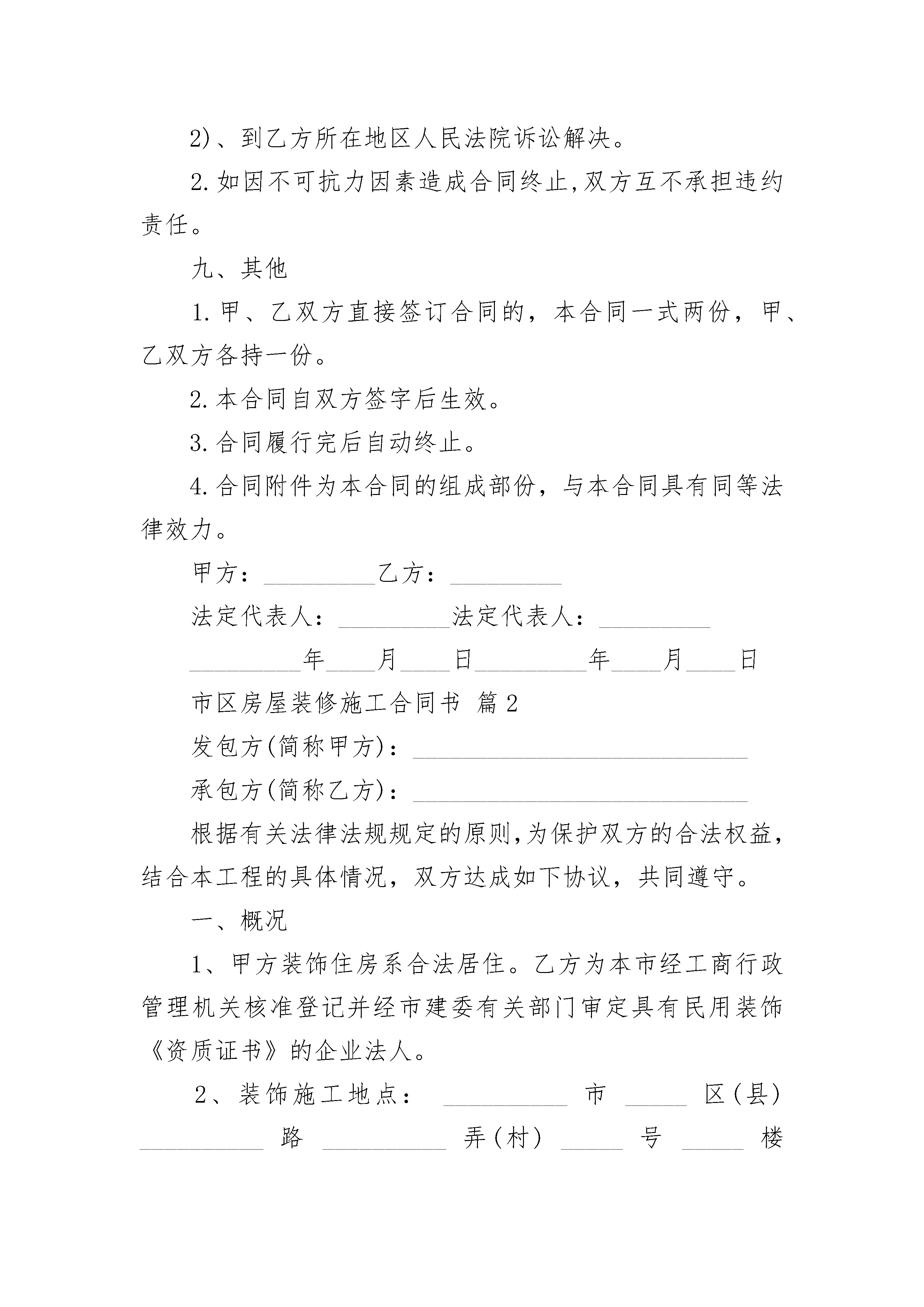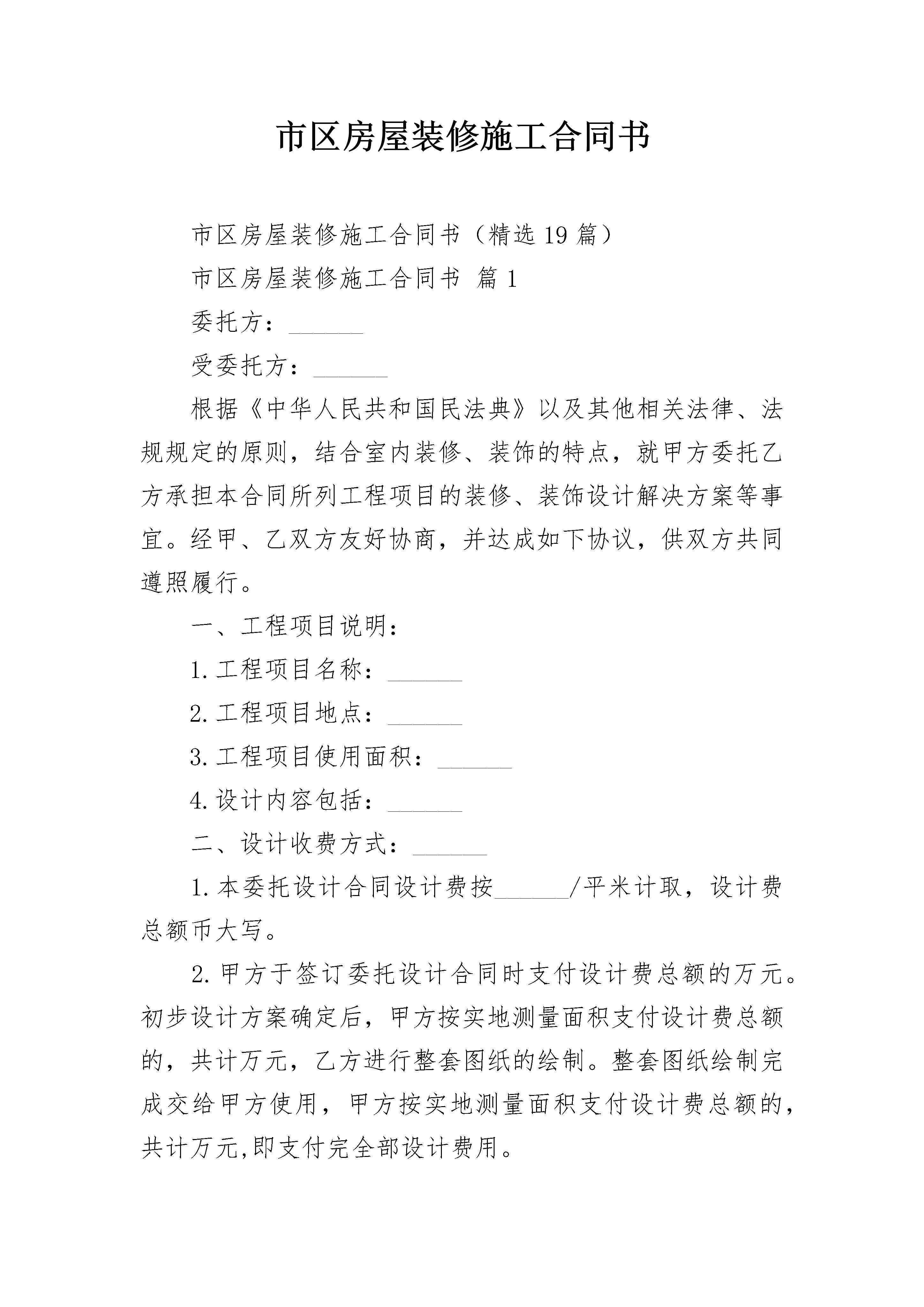 市区房屋装修施工合同书市区房屋装修施工合同书(精选19篇)市区房屋装修施工合同书篇1委托方:______受委托方:______根据《中华人民共和国民法典》以及其他相关法律、法规规定的原则,结合室内装修、装饰的特点,就甲方委托乙方承担本合同所列工程项目的装修、装饰设计解决方案等事宜。经甲、乙双方友好协商,并达成如下协议,供双方共同遵照履行。一、工程项目说明:1.工程项目名称:______2.工程项目地点:______3.工程项目使用面积:______4.设计内容包括:______二、设计收费方式:______1.本委托设计合同设计费按______/平米计取,设计费总额币大写。2.甲方于签订委托设计合同时支付设计费总额的万元。初步设计方案确定后,甲方按实地测量面积支付设计费总额的,共计万元,乙方进行整套图纸的绘制。整套图纸绘制完成交给甲方使用,甲方按实地测量面积支付设计费总额的,共计万元,即支付完全部设计费用。三、设计时间周期:1.乙方签订委托设计合同后进行实地测量,并在天内完成初步设计方案。2.甲方确定初步设计方案后,乙方应在天内完成整套图纸的绘制。四、甲方权利及义务:1.本合同签订时,甲方应提供给乙方进行设计所需的原建筑有关图纸资料。2.甲方在接到乙方初步设计方案已完成的通知后,有义务在内对方案设计文件进行签字确认。如甲方认为该设计方案需要修改,应提出书面修改意见。双方根据修改内容确定修改文件的提交日期。乙方负责在约定日期内对原方案进行修改,如期提交。3.甲方在接到乙方整套图纸绘制已完成的通知后,有义务在天内对方案设计文件进行签字确认。如甲方认为该设计方案需要修改,应提出书面修改意见。双方根据修改内容确定修改文件的提交日期。乙方负责在约定日期内对原方案进行修改,如期提交。五、乙方权利及义务:1.乙方在约定的期限内完成实地测量及初步设计方案的设计,并知道甲方进行沟通确定。2.乙方在甲方签字确认初步设计方案后,应在约定的设计时间内完成整套图纸的绘制,并知道甲方进行沟通确定。3.在施工过程中,乙方有义务负责处理有关图纸内容存在的技术性问题,并配合甲方参加现场技术指导及阶段验收工作。六、设计方案修改及版权:1.乙方对甲方已签字确认的方案不再有修改的义务,若甲方有修改需求,可与乙方协商,并交纳相关的方案变更费用。方案变更及变更费用,以附件方式由双方签字生效。2.本项目的设计版权为乙方所有,甲方有责任对此进行保护,不得将本项目的设计造型、设计文件、相关技术参数提供给第三方或其他项目使用。如甲方将上述图纸另作其它用途或公开发表,须事先征得乙方书面同意。3.为保证甲方利益,乙方须对甲方身份背景,项目的各项内容进行保密。七、违约责任:1.因乙方原因造成本合同约定的设计完成日期延误的,每延一天乙方须支付甲方设计费总额的作为违约赔偿金。2.因乙方原因造成中途停止设计的,乙方须书面通知甲方,按照设计费总额支付给甲方作为违约赔偿金,并将甲方已付的设计费返还甲方。3.如因甲方原因造成本委托终止时,甲方应以已付费用作为违约赔偿金,乙方有权不予退还。八、纠纷解决方法:1.双方出现不能自行协商解决的'问题,双方同意按以下方法解决。1)、到乙方所在地区行业管理仲裁机构解决。2)、到乙方所在地区人民法院诉讼解决。2.如因不可抗力因素造成合同终止,双方互不承担违约责任。九、其他1.甲、乙双方直接签订合同的,本合同一式两份,甲、乙双方各持一份。2.本合同自双方签字后生效。3.合同履行完后自动终止。4.合同附件为本合同的组成部份,与本合同具有同等法律效力。甲方:_________乙方:_________法定代表人:_________法定代表人:__________________年____月____日_________年____月____日市区房屋装修施工合同书篇2发包方(简称甲方):___________________________承包方(简称乙方):___________________________根据有关法律法规规定的原则,为保护双方的合法权益,结合本工程的具体情况,双方达成如下协议,共同遵守。一、概况1、甲方装饰住房系合法居住。乙方为本市经工商行政管理机关核准登记并经市建委有关部门审定具有民用装饰《资质证书》的企业法人。2、装饰施工地点:__________市_____区(县)__________路__________弄(村)_____号_____楼_____室。3、住房结构:__________房型_____房_____厅_____套,施工面积__________平方米。4、装饰施工内容:详见附件一《装饰施工内容表》。5、承包方式:___________________________(包工包料、清包工、部分承包)。6、总价款:¥_________