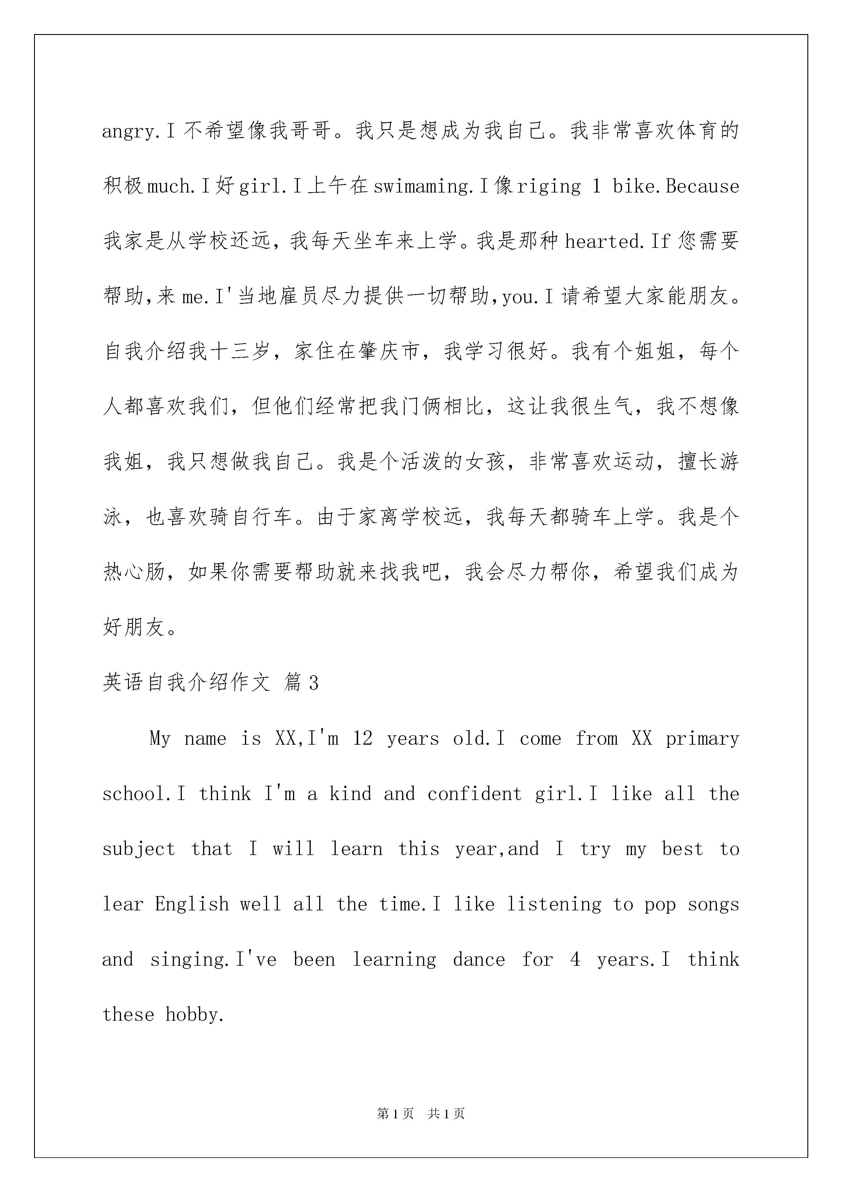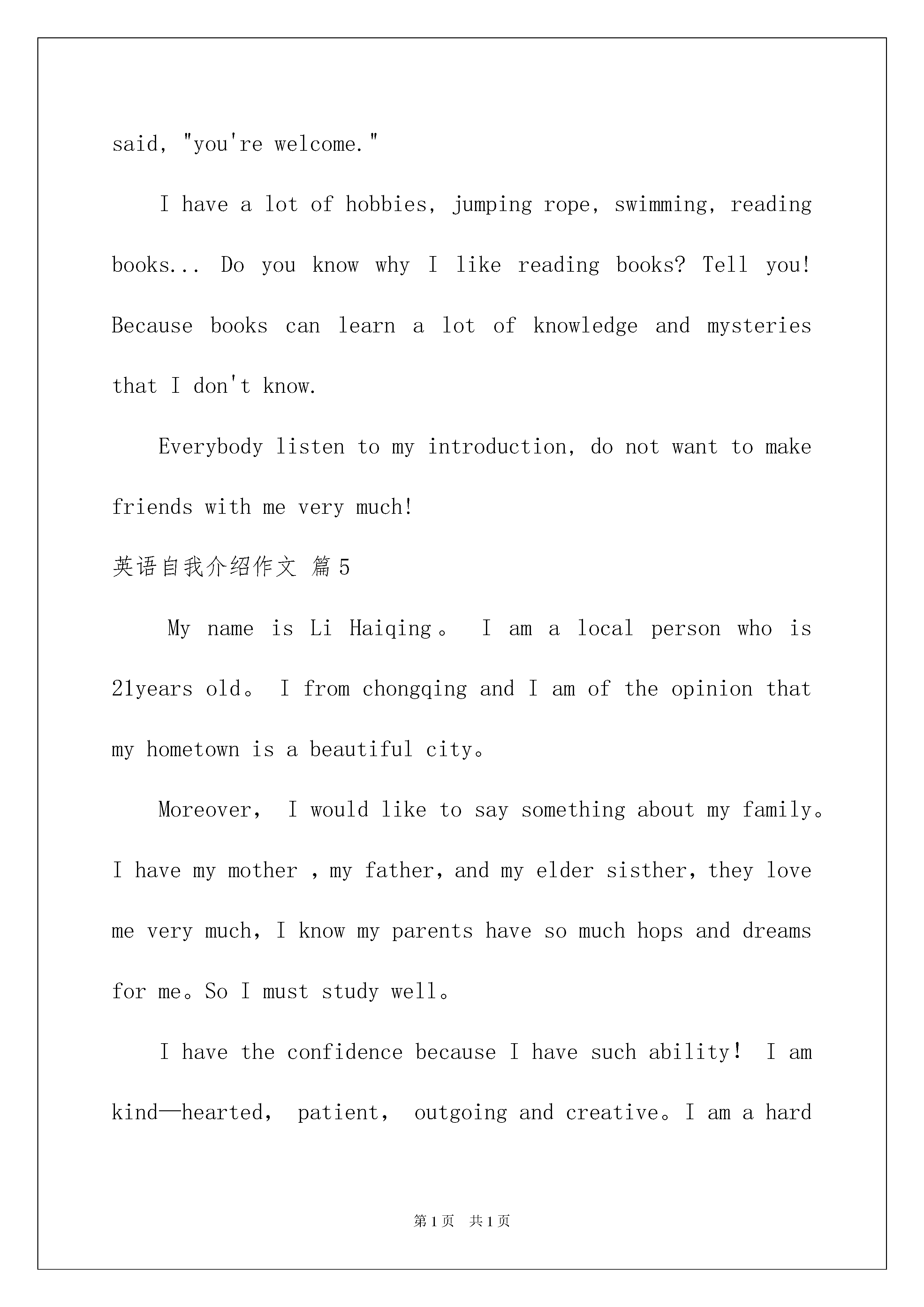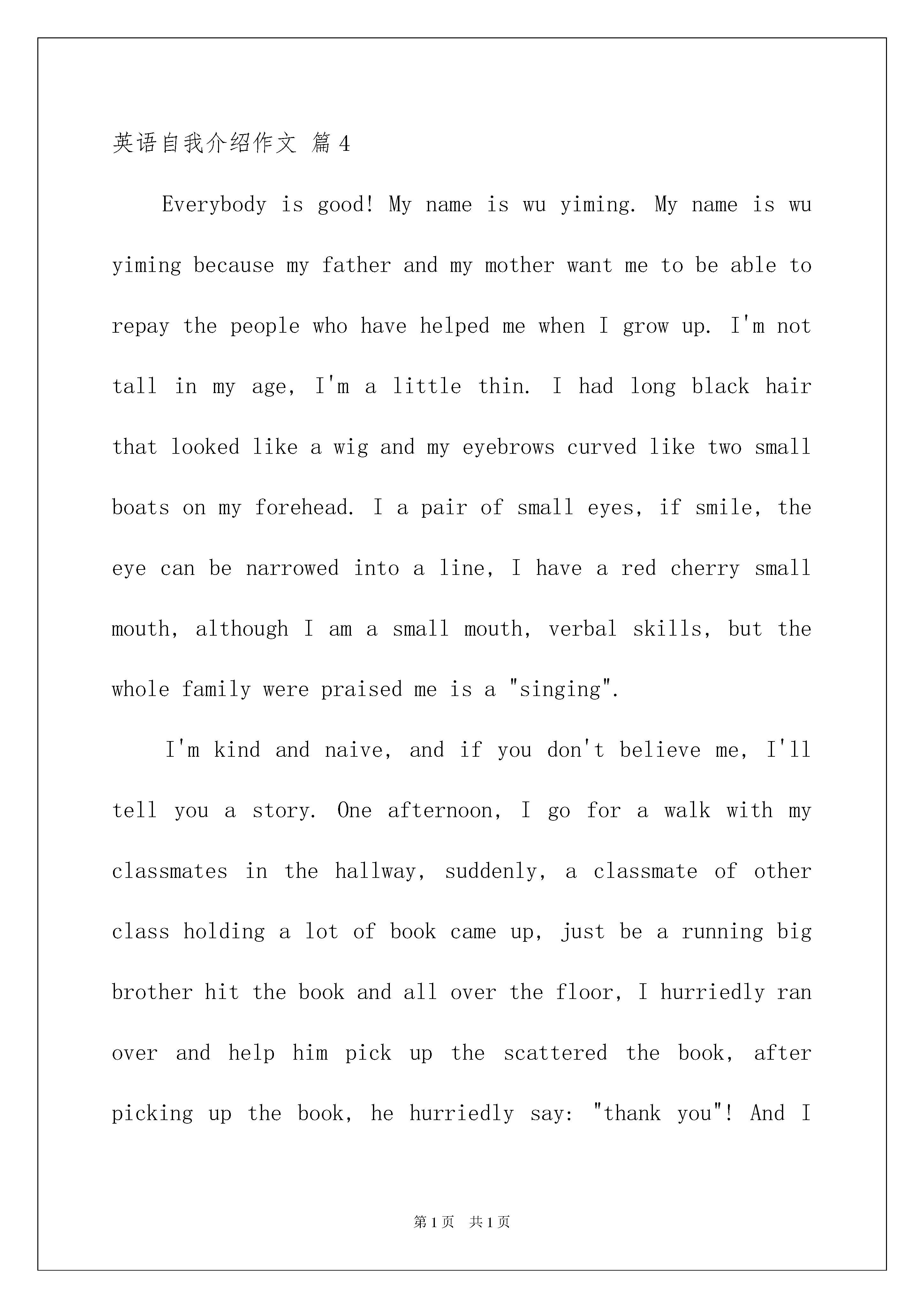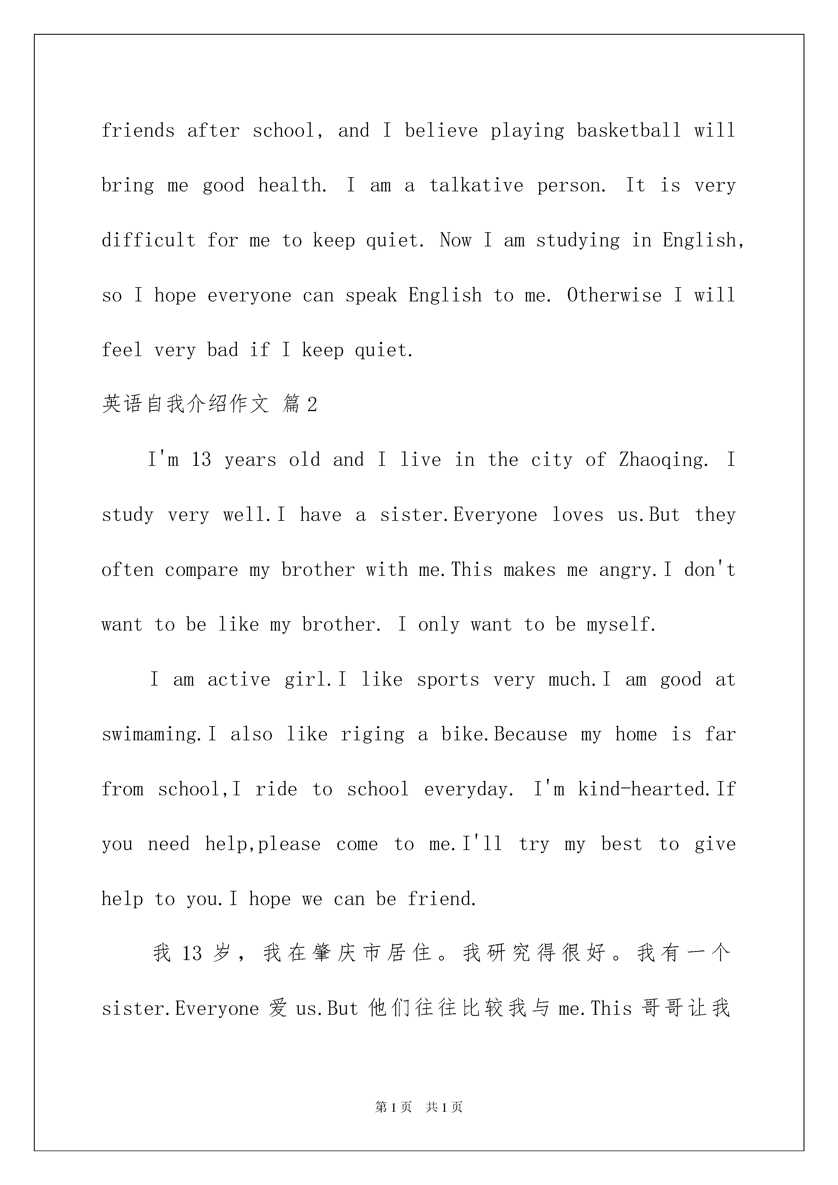 2022英语自我介绍作文锦集九篇英语自我介绍作文锦集九篇在学习、工作或生活中,大家都尝试过写作文吧,作文是人们以书面形式表情达意的言语活动。那么你知道一篇好的作文该怎么写吗?下面是我帮大家整理的英语自我介绍作文9篇,欢迎阅读与收藏。英语自我介绍作文篇1Chapterone:self-introductionTips:名字和年龄:Mynameispeter,Iamsixyearsold.兴趣:Myhobbyisplayingbasketball.个性:Iamatalkativeperson.Mynameispeter.Iamsixyearsold.IamfromTaiwan.ManypeopleaskmeaboutmyChinesenamebecausetheythinkthemeaningofitisveryinteresting.ButIhopemyfriendscanremembermyEnglishnameratherthanmyChineseone.Myhobbyisplayingbasketball.Iusuallyplayitwithmyfriendsafterschool,andIbelieveplayingbasketballwillbringmegoodhealth.Iamatalkativeperson.Itisverydifficultformetokeepquiet.NowIamstudyinginEnglish,soIhopeeveryonecanspeakEnglishtome.OtherwiseIwillfeelverybadifIkeepquiet.英语自我介绍作文篇2I'm13yearsoldandIliveinthecityofZhaoqing.Istudyverywell.Ihaveasister.Everyonelovesus.Buttheyoftencomparemybrotherwithme.Thismakesmeangry.Idon'twanttobelikemybrother.Ionlywanttobemyself.Iamactivegirl.Ilikesportsverymuch.Iamgoodatswimaming.Ialsolikerigingabike.Becausemyhomeisfarfromschool,Iridetoschooleveryday.I'mkind-hearted.Ifyouneedhelp,pleasecometome.I'lltrymybesttogivehelptoyou.Ihopewecanbefriend.我13岁,我在肇庆市居住。我研究得很好。我有一个sister.Everyone爱us.But他们往往比较我与me.This哥哥让我angry.I不希望像我哥哥。我只是想成为我自己。我非常喜欢体育的积极much.I好girl.I上午在swimaming.I像riging1bike.Because我家是从学校还远,我每天坐车来上学。我是那种hearted.If您需要帮助,来me.I'当地雇员尽力提供一切帮助,you.I请希望大家能朋友。自我介绍我十三岁,家住在肇庆市,我学习很好。我有个姐姐,每个人都喜欢我们,但他们经常把我门俩相比,这让我很生气,我不想像我姐,我只想做我自己。我是个活泼的女孩,非常喜欢运动,擅长游泳,也喜欢骑自行车。由于家离学校远,我每天都骑车上学。我是个热心肠,如果你需要帮助就来找我吧,我会尽力帮你,希望我们成为好朋友。英语自我介绍作文篇3MynameisXX,I'm12yearsold.IcomefromXXprimaryschool.IthinkI'makindandconfidentgirl.IlikeallthesubjectthatIwilllearnthisyear,andItrymybesttolearEnglishwellallthetime.Ilikelisteningtopopsongsandsinging.I'vebeenlearningdancefor4years.Ithinkthesehobby.英语自我介绍作文篇4Everybodyisgood!Mynameiswuyiming.MynameiswuyimingbecausemyfatherandmymotherwantmetobeabletorepaythepeoplewhohavehelpedmewhenIgrowup.I'mnottallinmyage,I'malittlethin.Iha