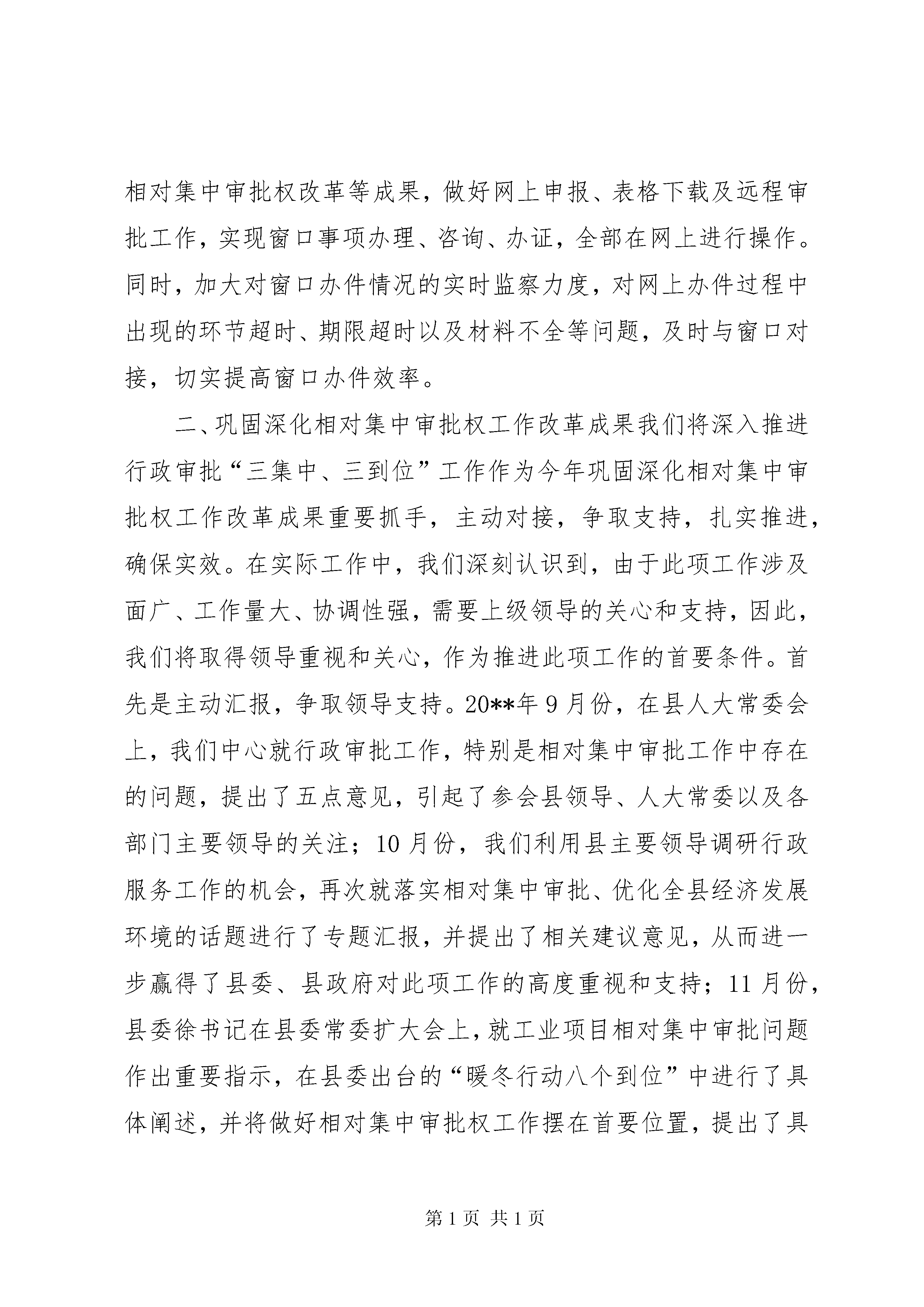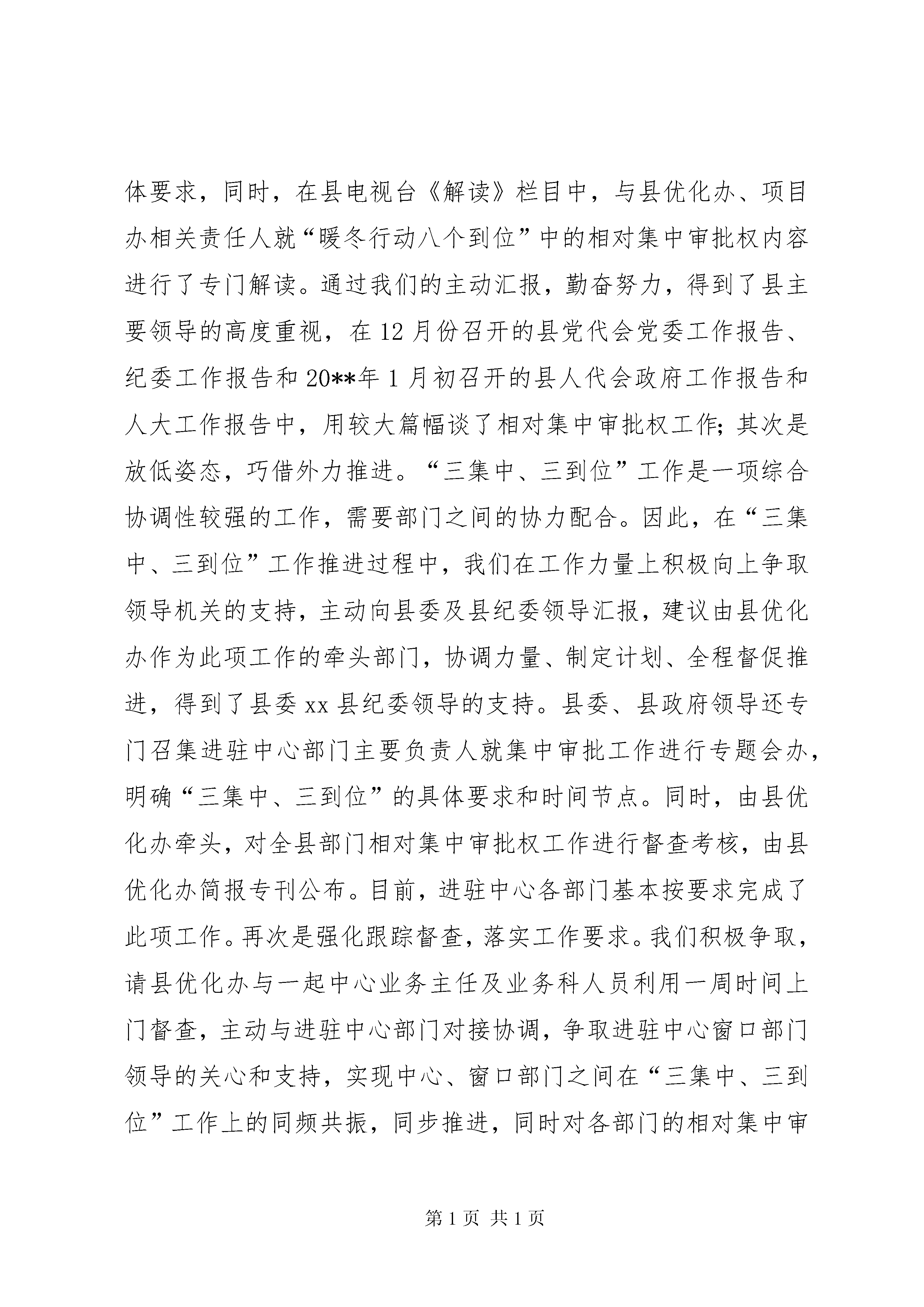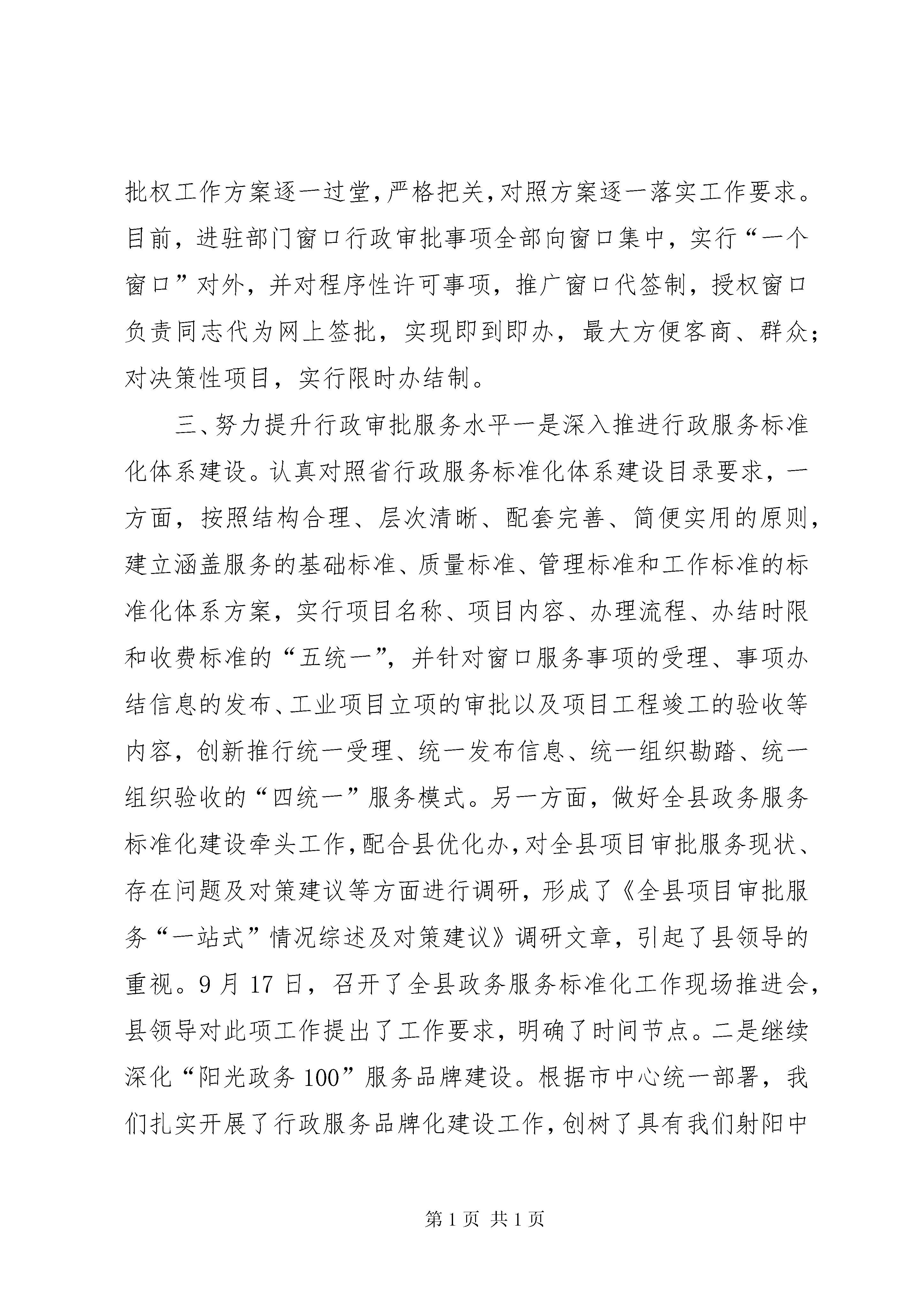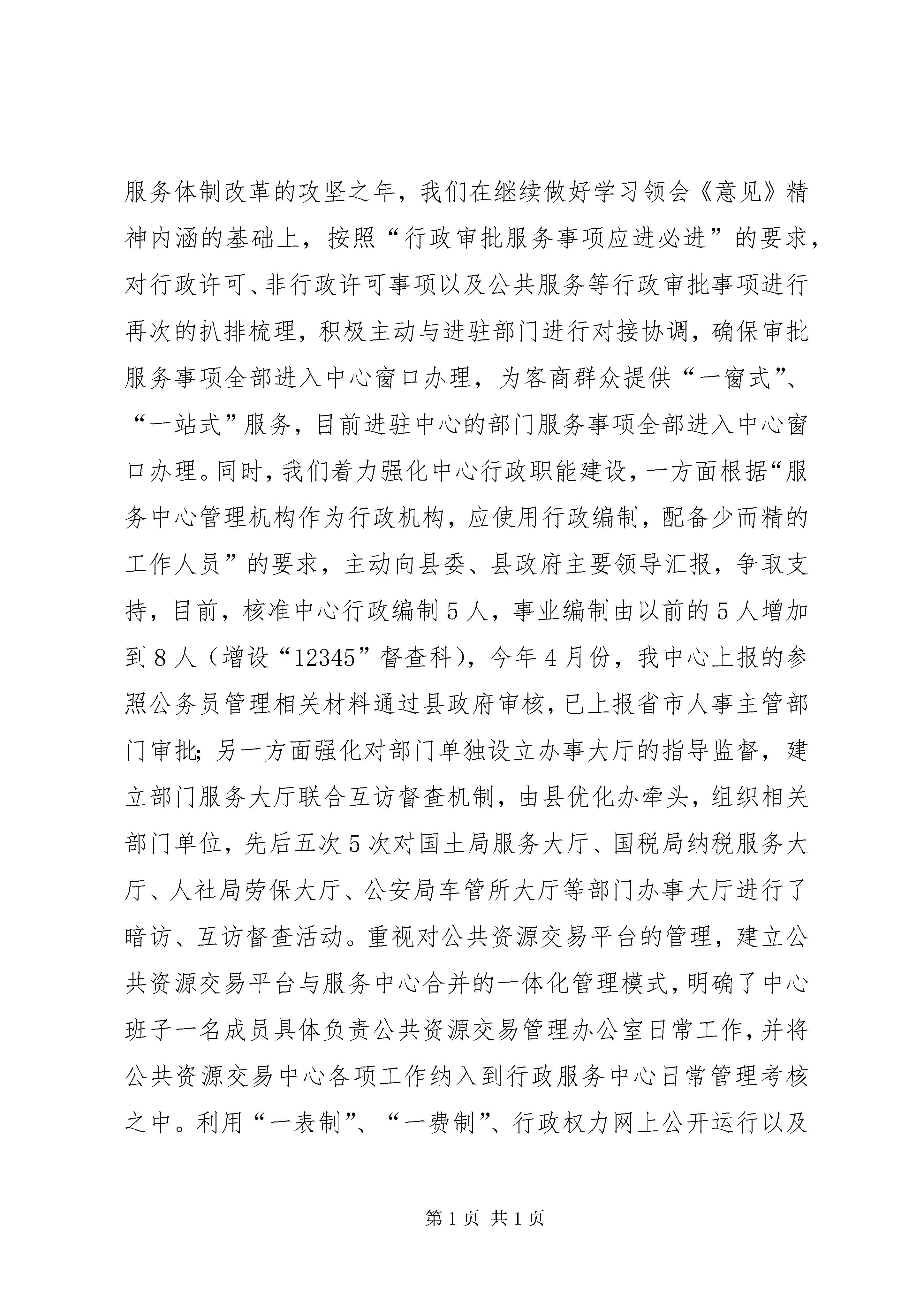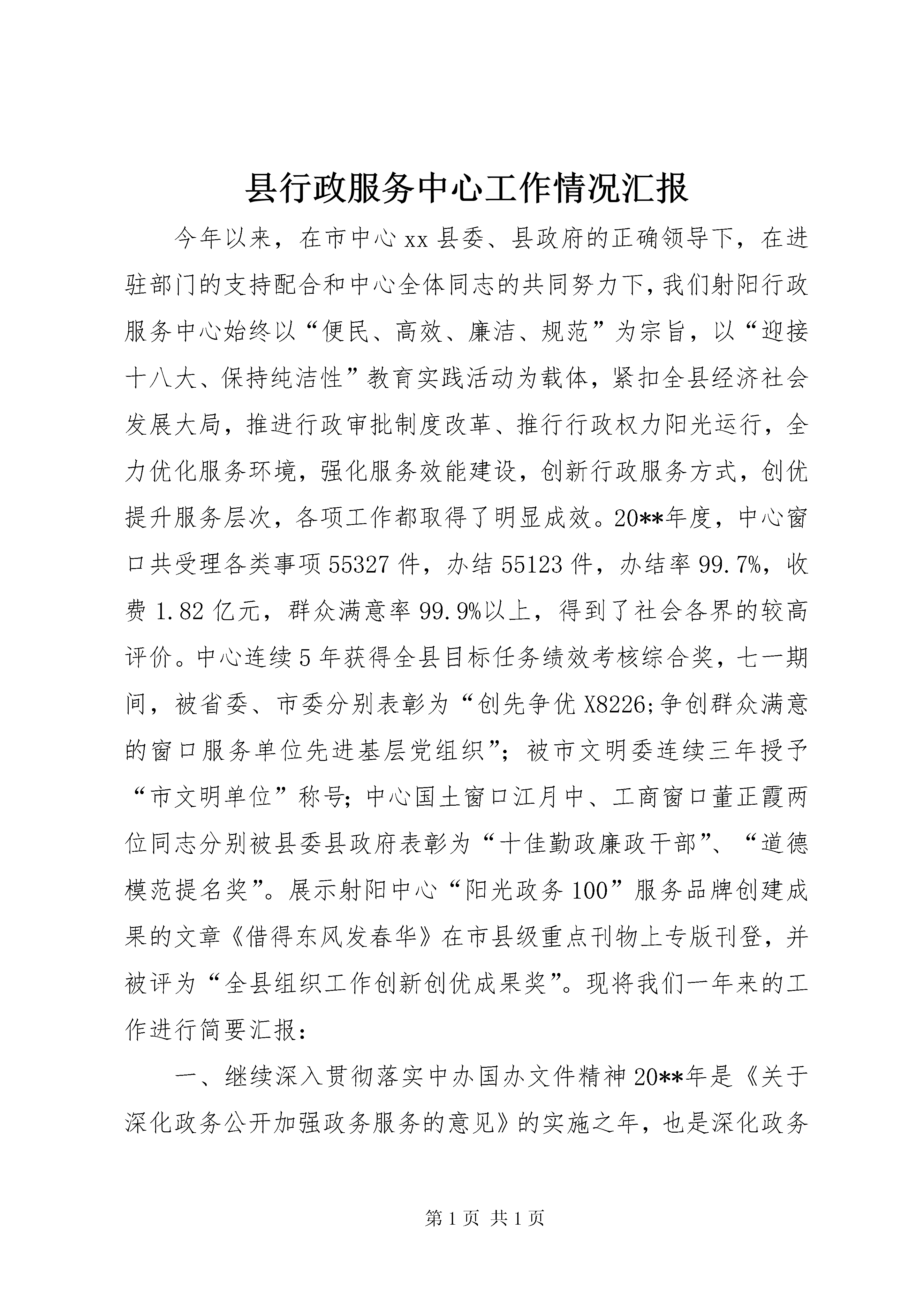 县行政服务中心工作情况汇报今年以来,在市中心xx县委、县政府的正确领导下,在进驻部门的支持配合和中心全体同志的共同努力下,我们射阳行政服务中心始终以“便民、高效、廉洁、规范”为宗旨,以“迎接十八大、保持纯洁性”教育实践活动为载体,紧扣全县经济社会发展大局,推进行政审批制度改革、推行行政权力阳光运行,全力优化服务环境,强化服务效能建设,创新行政服务方式,创优提升服务层次,各项工作都取得了明显成效。20**年度,中心窗口共受理各类事项55327件,办结55123件,办结率99.7%,收费1.82亿元,群众满意率99.9%以上,得到了社会各界的较高评价。中心连续5年获得全县目标任务绩效考核综合奖,七一期间,被省委、市委分别表彰为“创先争优X8226;争创群众满意的窗口服务单位先进基层党组织”;被市文明委连续三年授予“市文明单位”称号;中心国土窗口江月中、工商窗口董正霞两位同志分别被县委县政府表彰为“十佳勤政廉政干部”、“道德模范提名奖”。展示射阳中心“阳光政务100”服务品牌创建成果的文章《借得东风发春华》在市县级重点刊物上专版刊登,并被评为“全县组织工作创新创优成果奖”。现将我们一年来的工作进行简要汇报:一、继续深入贯彻落实中办国办文件精神20**年是《关于深化政务公开加强政务服务的意见》的实施之年,也是深化政务服务体制改革的攻坚之年,我们在继续做好学习领会《意见》精神内涵的基础上,按照“行政审批服务事项应进必进”的要求,对行政许可、非行政许可事项以及公共服务等行政审批事项进行再次的扒排梳理,积极主动与进驻部门进行对接协调,确保审批服务事项全部进入中心窗口办理,为客商群众提供“一窗式”、“一站式”服务,目前进驻中心的部门服务事项全部进入中心窗口办理。同时,我们着力强化中心行政职能建设,一方面根据“服务中心管理机构作为行政机构,应使用行政编制,配备少而精的工作人员”的要求,主动向县委、县政府主要领导汇报,争取支持,目前,核准中心行政编制5人,事业编制由以前的5人增加到8人(增设“12345”督查科),今年4月份,我中心上报的参照公务员管理相关材料通过县政府审核,已上报省市人事主管部门审批;另一方面强化对部门单独设立办事大厅的指导监督,建立部门服务大厅联合互访督查机制,由县优化办牵头,组织相关部门单位,先后五次5次对国土局服务大厅、国税局纳税服务大厅、人社局劳保大厅、公安局车管所大厅等部门办事大厅进行了暗访、互访督查活动。重视对公共资源交易平台的管理,建立公共资源交易平台与服务中心合并的一体化管理模式,明确了中心班子一名成员具体负责公共资源交易管理办公室日常工作,并将公共资源交易中心各项工作纳入到行政服务中心日常管理考核之中。利用“一表制”、“一费制”、行政权力网上公开运行以及相对集中审批权改革等成果,做好网上申报、表格下载及远程审批工作,实现窗口事项办理、咨询、办证,全部在网上进行操作。同时,加大对窗口办件情况的实时监察力度,对网上办件过程中出现的环节超时、期限超时以及材料不全等问题,及时与窗口对接,切实提高窗口办件效率。二、巩固深化相对集中审批权工作改革成果我们将深入推进行政审批“三集中、三到位”工作作为今年巩固深化相对集中审批权工作改革成果重要抓手,主动对接,争取支持,扎实推进,确保实效。在实际工作中,我们深刻认识到,由于此项工作涉及面广、工作量大、协调性强,需要上级领导的关心和支持,因此,我们将取得领导重视和关心,作为推进此项工作的首要条件。首先是主动汇报,争取领导支持。20**年9月份,在县人大常委会上,我们中心就行政审批工作,特别是相对集中审批工作中存在的问题,提出了五点意见,引起了参会县领导、人大常委以及各部门主要领导的关注;10月份,我们利用县主要领导调研行政服务工作的机会,再次就落实相对集中审批、优化全县经济发展环境的话题进行了专题汇报,并提出了相关建议意见,从而进一步赢得了县委、县政府对此项工作的高度重视和支持;11月份,县委徐书记在县委常委扩大会上,就工业项目相对集中审批问题作出重要指示,在县委出台的“暖冬行动八个到位”中进行了具体阐述,并将做好相对集中审批权工作摆在首要位置,提出了具体要求,同时,在县电视台《解读》栏目中,与县优化办、项目办相关责任人就“暖冬行动八个到位”中的相对集中审批权内容进行了专门解读。通过我们的主动汇报,勤奋努力,得到了县主要领导的高度重视,在12月份召开的县党代会党委工作报告、纪委工作报告和20**年1月初召开的县人代会政府工作报告和人大工作报告中,用较大篇幅谈了相对集中审批权工作;其次是放低姿态,巧借外力推进。“三集中、三到位”工作是一项综合协调性较强的工作,需要部门之间的协力配合。因此,在“三集中、三到位”工作推进过程中,我们在工作力量上积极向上争取领导机