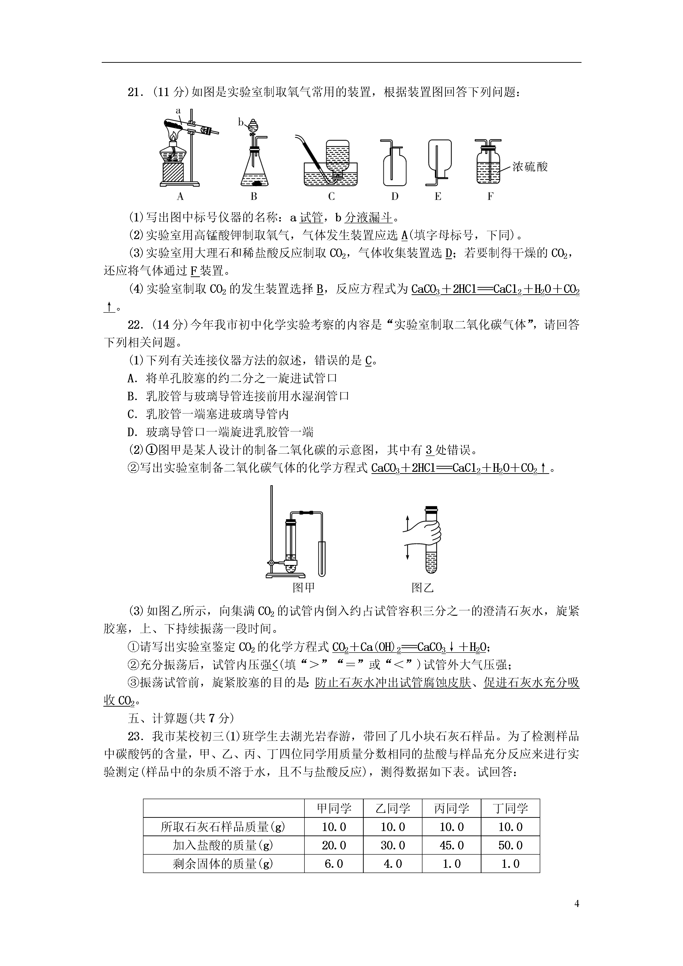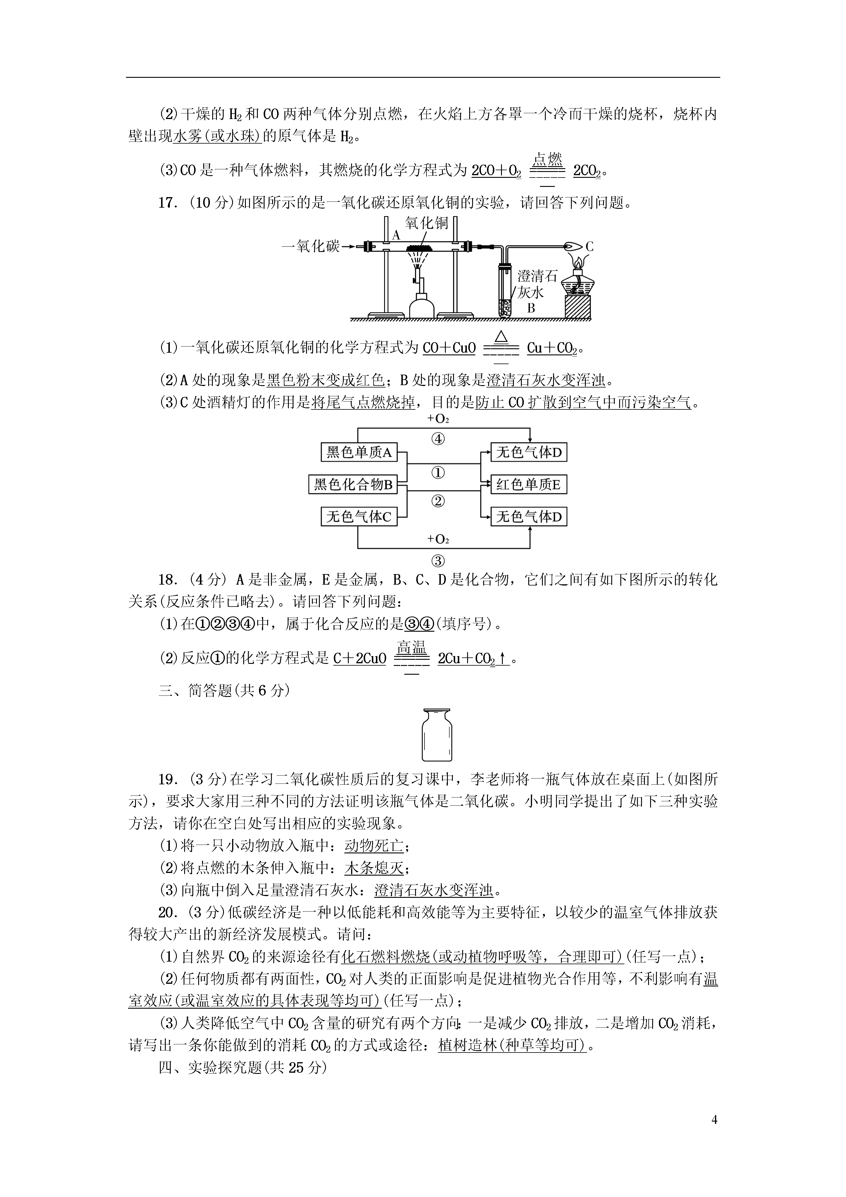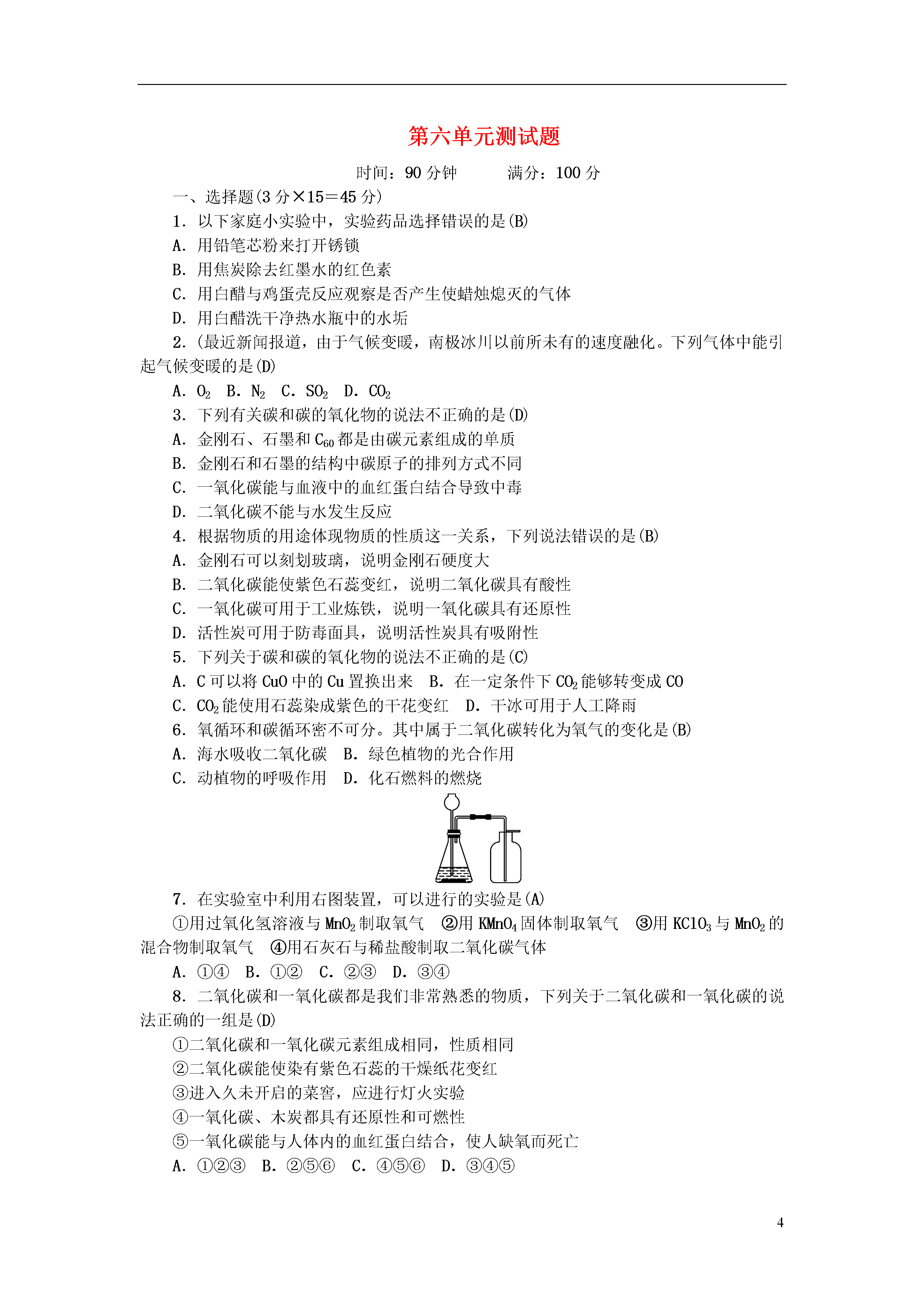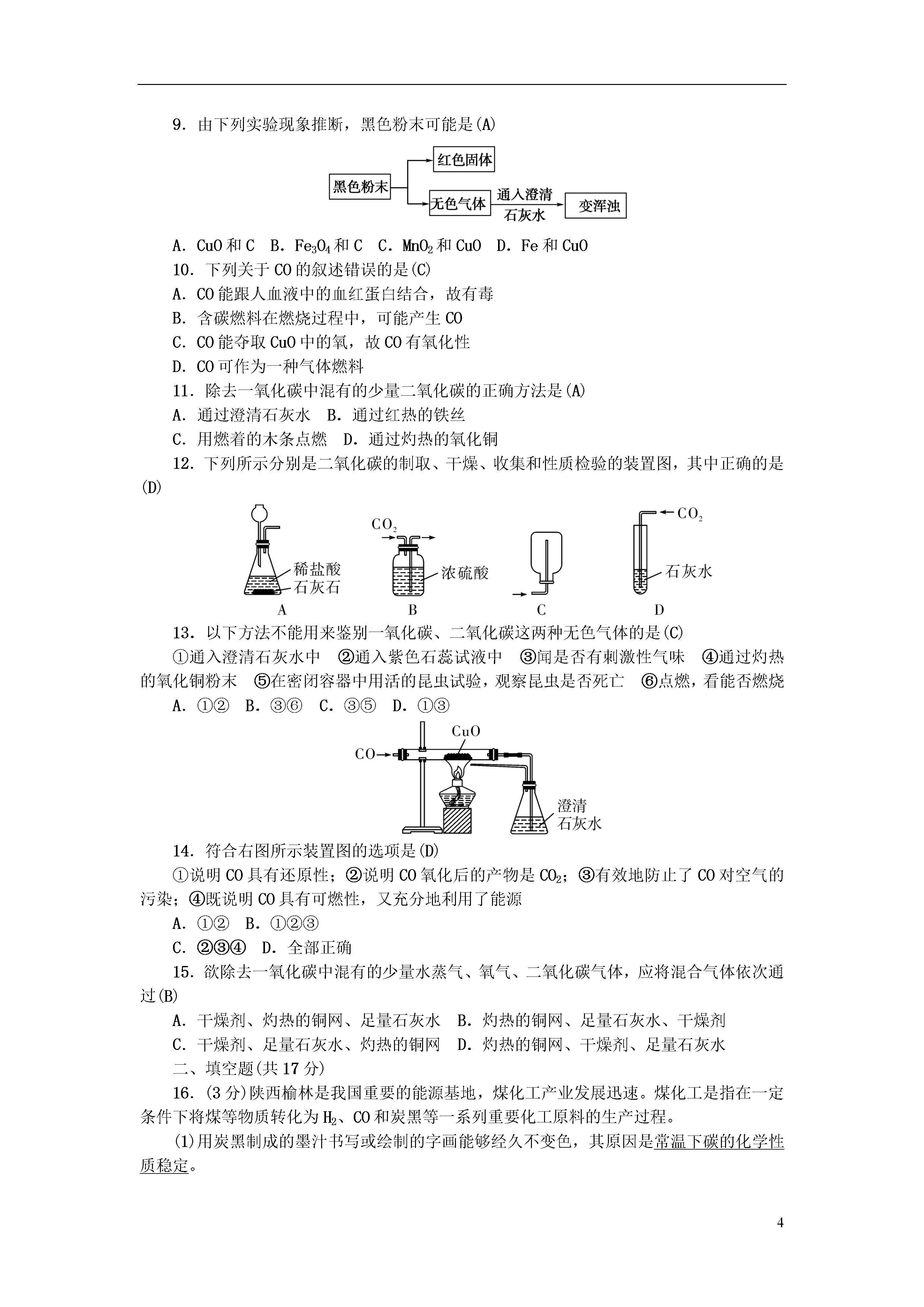 4第六单元测试题时间:90分钟满分:100分一、选择题(3分×15=45分)1.以下家庭小实验中,实验药品选择错误的是(B)A.用铅笔芯粉来打开锈锁B.用焦炭除去红墨水的红色素C.用白醋与鸡蛋壳反应观察是否产生使蜡烛熄灭的气体D.用白醋洗干净热水瓶中的水垢2.(最近新闻报道,由于气候变暖,南极冰川以前所未有的速度融化。下列气体中能引起气候变暖的是(D)A.O2B.N2C.SO2D.CO23.下列有关碳和碳的氧化物的说法不正确的是(D)A.金刚石、石墨和C60都是由碳元素组成的单质B.金刚石和石墨的结构中碳原子的排列方式不同C.一氧化碳能与血液中的血红蛋白结合导致中毒D.二氧化碳不能与水发生反应4.根据物质的用途体现物质的性质这一关系,下列说法错误的是(B)A.金刚石可以刻划玻璃,说明金刚石硬度大B.二氧化碳能使紫色石蕊变红,说明二氧化碳具有酸性C.一氧化碳可用于工业炼铁,说明一氧化碳具有还原性D.活性炭可用于防毒面具,说明活性炭具有吸附性5.下列关于碳和碳的氧化物的说法不正确的是(C)A.C可以将CuO中的Cu置换出来B.在一定条件下CO2能够转变成COC.CO2能使用石蕊染成紫色的干花变红D.干冰可用于人工降雨6.氧循环和碳循环密不可分。其中属于二氧化碳转化为氧气的变化是(B)A.海水吸收二氧化碳B.绿色植物的光合作用C.动植物的呼吸作用D.化石燃料的燃烧7.在实验室中利用右图装置,可以进行的实验是(A)①用过氧化氢溶液与MnO2制取氧气②用KMnO4固体制取氧气③用KClO3与MnO2的混合物制取氧气④用石灰石与稀盐酸制取二氧化碳气体A.①④B.①②C.②③D.③④8.二氧化碳和一氧化碳都是我们非常熟悉的物质,下列关于二氧化碳和一氧化碳的说法正确的一组是(D)①二氧化碳和一氧化碳元素组成相同,性质相同②二氧化碳能使染有紫色石蕊的干燥纸花变红③进入久未开启的菜窖,应进行灯火实验④一氧化碳、木炭都具有还原性和可燃性⑤一氧化碳能与人体内的血红蛋白结合,使人缺氧而死亡A.①②③B.②⑤⑥C.④⑤⑥D.③④⑤9.由下列实验现象推断,黑色粉末可能是(A)A.CuO和CB.Fe3O4和CC.MnO2和CuOD.Fe和CuO10.下列关于CO的叙述错误的是(C)A.CO能跟人血液中的血红蛋白结合,故有毒B.含碳燃料在燃烧过程中,可能产生COC.CO能夺取CuO中的氧,故CO有氧化性D.CO可作为一种气体燃料11.除去一氧化碳中混有的少量二氧化碳的正确方法是(A)A.通过澄清石灰水B.通过红热的铁丝C.用燃着的木条点燃D.通过灼热的氧化铜12.下列所示分别是二氧化碳的制取、干燥、收集和性质检验的装置图,其中正确的是(D)13.以下方法不能用来鉴别一氧化碳、二氧化碳这两种无色气体的是(C)①通入澄清石灰水中②通入紫色石蕊试液中③闻是否有刺激性气味④通过灼热的氧化铜粉末⑤在密闭容器中用活的昆虫试验,观察昆虫是否死亡⑥点燃,看能否燃烧A.①②B.③⑥C.③⑤D.①③14.符合右图所示装置图的选项是(D)①说明CO具有还原性;②说明CO氧化后的产物是CO2;③有效地防止了CO对空气的污染;④既说明CO具有可燃性,又充分地利用了能源A.①②B.①②③C.②③④D.全部正确15.欲除去一氧化碳中混有的少量水蒸气、氧气、二氧化碳气体,应将混合气体依次通过(B)A.干燥剂、灼热的铜网、足量石灰水B.灼热的铜网、足量石灰水、干燥剂C.干燥剂、足量石灰水、灼热的铜网D.灼热的铜网、干燥剂、足量石灰水二、填空题(共17分)16.(3分)陕西榆林是我国重要的能源基地,煤化工产业发展迅速。煤化工是指在一定条件下将煤等物质转化为H2、CO和炭黑等一系列重要化工原料的生产过程。(1)用炭黑制成的墨汁书写或绘制的字画能够经久不变色,其原因是常温下碳的化学性质稳定。(2)干燥的H2和CO两种气体分别点燃,在火焰上方各罩一个冷而干燥的烧杯,烧杯内壁出现水雾(或水珠)的原气体是H2。(3)CO是一种气体燃料,其燃烧的化学方程式为2CO+O2eq\o(=====,\s\up7(点燃))2CO2。17.(10分)如图所示的是一氧化碳还原氧化铜的实验,请回答下列问题。(1)一氧化碳还原氧化铜的化学方程式为CO+CuOeq\o(=====,\s\up7(△))Cu+CO2。(2)A处的现象是黑色粉末变成红色;B处的现象是澄清石灰水变浑浊。(3)C处酒精灯的作用是将尾气点燃烧掉,目的是防止CO扩散到空气中而污染空气。18.(4分)A是非金属,E是金属,B、C、D是化合物,它们之间有如下图所示的转化关系(反应条件已略去)