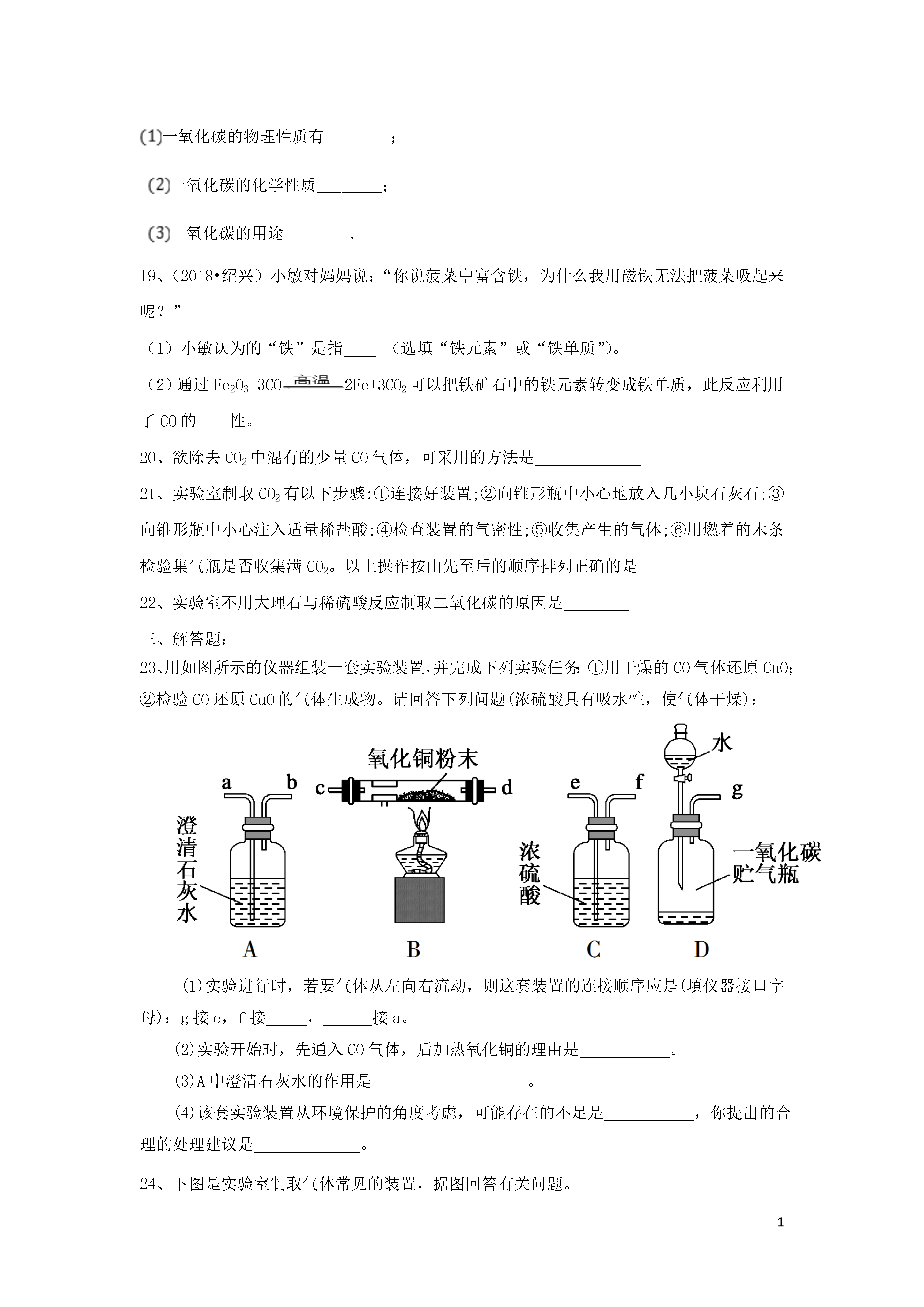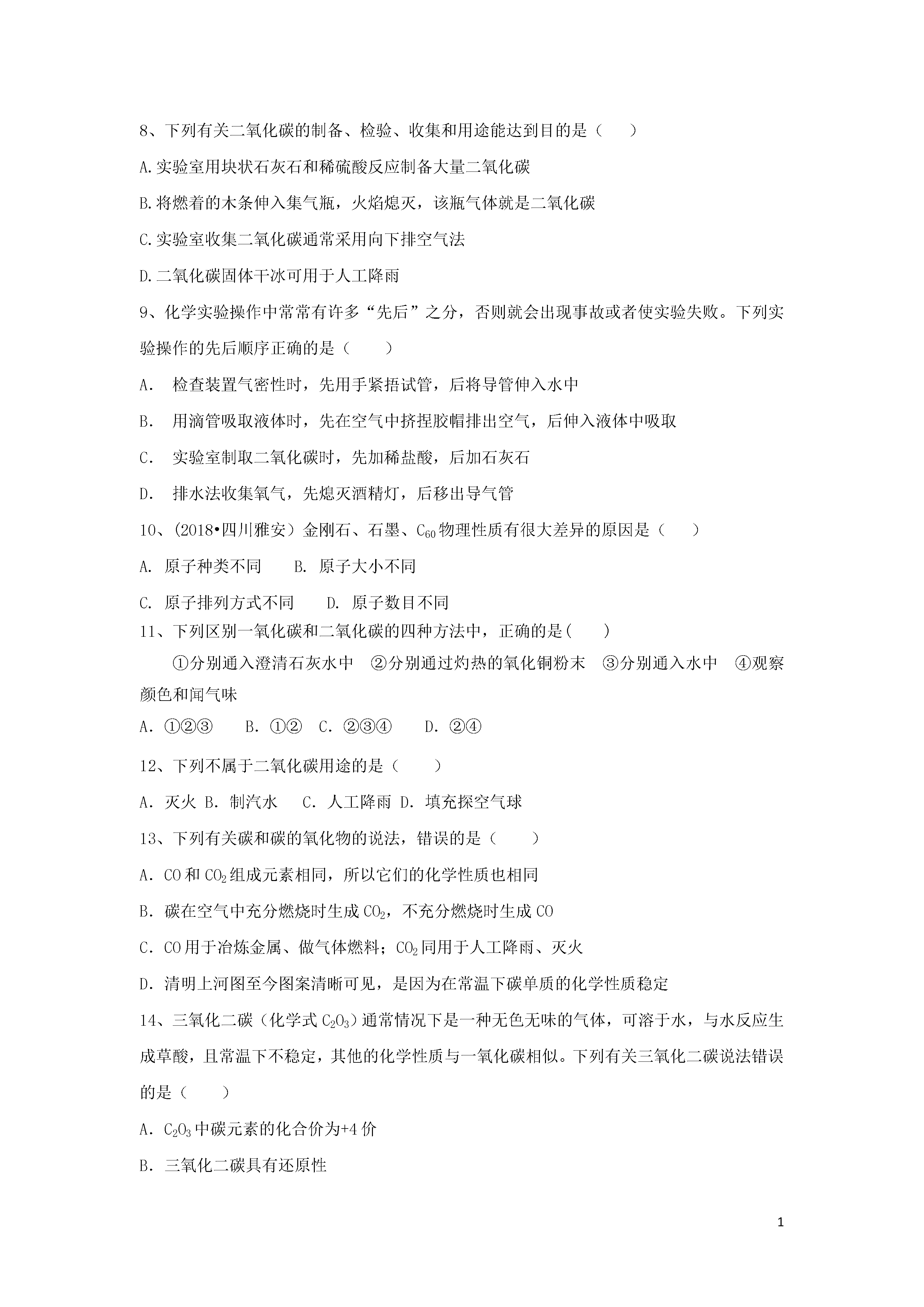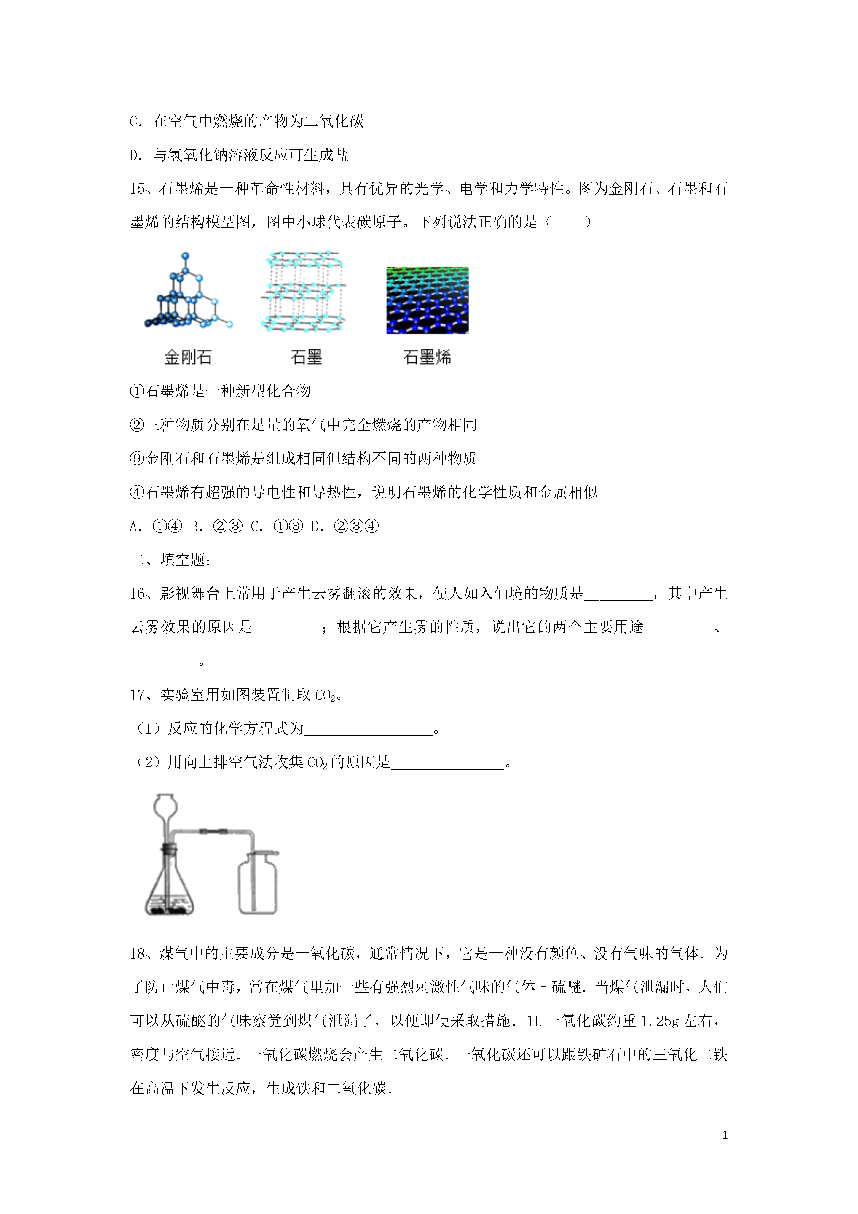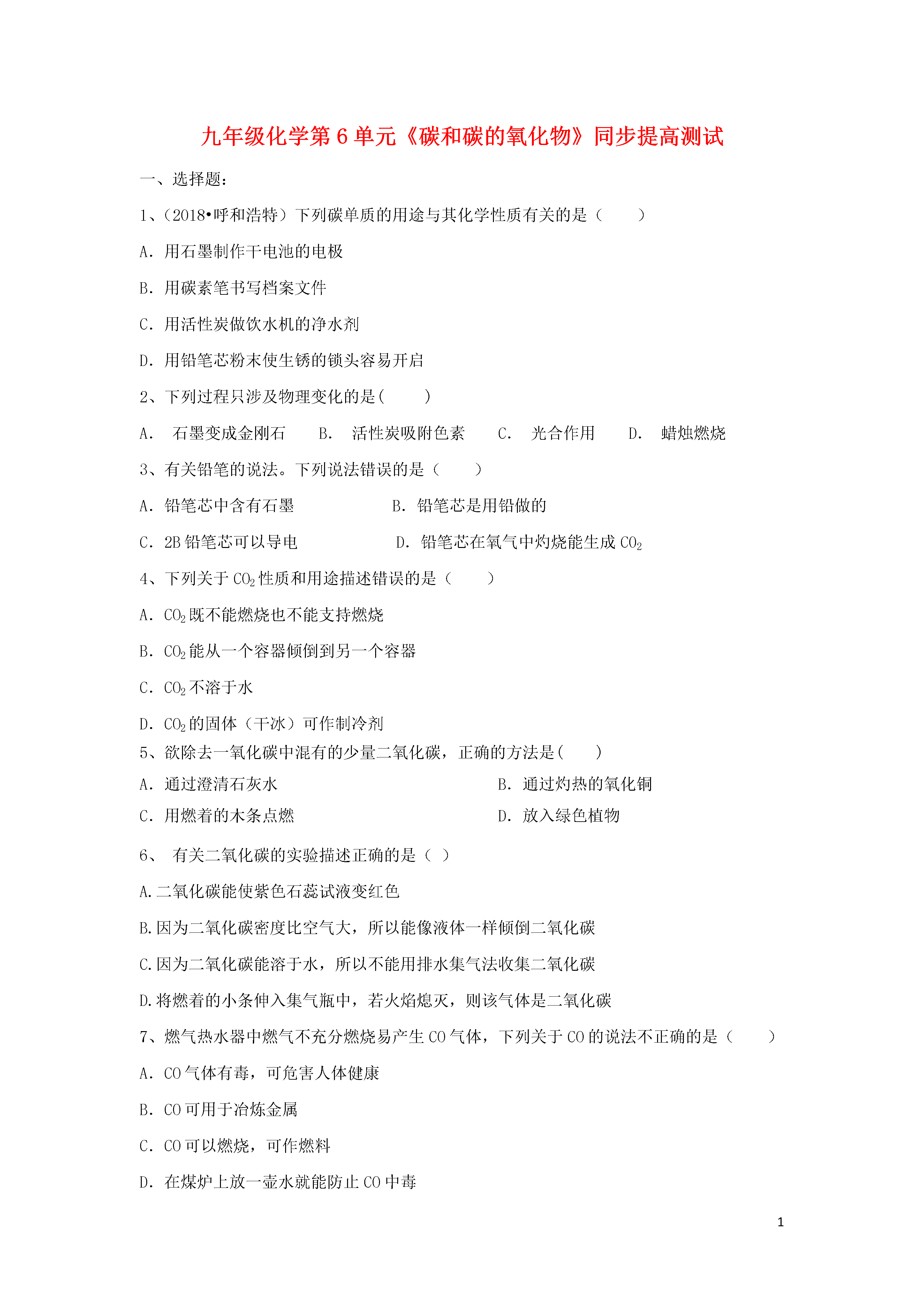 1九年级化学第6单元《碳和碳的氧化物》同步提高测试一、选择题:1、(2018•呼和浩特)下列碳单质的用途与其化学性质有关的是()A.用石墨制作干电池的电极B.用碳素笔书写档案文件C.用活性炭做饮水机的净水剂D.用铅笔芯粉末使生锈的锁头容易开启2、下列过程只涉及物理变化的是()A.石墨变成金刚石B.活性炭吸附色素C.光合作用D.蜡烛燃烧3、有关铅笔的说法。下列说法错误的是()A.铅笔芯中含有石墨B.铅笔芯是用铅做的C.2B铅笔芯可以导电D.铅笔芯在氧气中灼烧能生成C024、下列关于CO2性质和用途描述错误的是()A.CO2既不能燃烧也不能支持燃烧B.CO2能从一个容器倾倒到另一个容器C.CO2不溶于水D.CO2的固体(干冰)可作制冷剂5、欲除去一氧化碳中混有的少量二氧化碳,正确的方法是()A.通过澄清石灰水B.通过灼热的氧化铜C.用燃着的木条点燃D.放入绿色植物6、有关二氧化碳的实验描述正确的是()A.二氧化碳能使紫色石蕊试液变红色B.因为二氧化碳密度比空气大,所以能像液体一样倾倒二氧化碳C.因为二氧化碳能溶于水,所以不能用排水集气法收集二氧化碳D.将燃着的小条伸入集气瓶中,若火焰熄灭,则该气体是二氧化碳7、燃气热水器中燃气不充分燃烧易产生CO气体,下列关于CO的说法不正确的是()A.CO气体有毒,可危害人体健康B.CO可用于冶炼金属C.CO可以燃烧,可作燃料D.在煤炉上放一壶水就能防止CO中毒8、下列有关二氧化碳的制备、检验、收集和用途能达到目的是()A.实验室用块状石灰石和稀硫酸反应制备大量二氧化碳B.将燃着的木条伸入集气瓶,火焰熄灭,该瓶气体就是二氧化碳C.实验室收集二氧化碳通常采用向下排空气法D.二氧化碳固体干冰可用于人工降雨9、化学实验操作中常常有许多“先后”之分,否则就会出现事故或者使实验失败。下列实验操作的先后顺序正确的是()A.检查装置气密性时,先用手紧捂试管,后将导管伸入水中B.用滴管吸取液体时,先在空气中挤捏胶帽排出空气,后伸入液体中吸取C.实验室制取二氧化碳时,先加稀盐酸,后加石灰石D.排水法收集氧气,先熄灭酒精灯,后移出导气管10、(2018•四川雅安)金刚石、石墨、C60物理性质有很大差异的原因是()A.原子种类不同B.原子大小不同C.原子排列方式不同D.原子数目不同11、下列区别一氧化碳和二氧化碳的四种方法中,正确的是()①分别通入澄清石灰水中②分别通过灼热的氧化铜粉末③分别通入水中④观察颜色和闻气味A.①②③B.①②C.②③④D.②④12、下列不属于二氧化碳用途的是()A.灭火B.制汽水C.人工降雨D.填充探空气球13、下列有关碳和碳的氧化物的说法,错误的是()A.CO和CO2组成元素相同,所以它们的化学性质也相同B.碳在空气中充分燃烧时生成CO2,不充分燃烧时生成COC.CO用于冶炼金属、做气体燃料;CO2同用于人工降雨、灭火D.清明上河图至今图案清晰可见,是因为在常温下碳单质的化学性质稳定14、三氧化二碳(化学式C2O3)通常情况下是一种无色无味的气体,可溶于水,与水反应生成草酸,且常温下不稳定,其他的化学性质与一氧化碳相似。下列有关三氧化二碳说法错误的是()A.C2O3中碳元素的化合价为+4价B.三氧化二碳具有还原性C.在空气中燃烧的产物为二氧化碳D.与氢氧化钠溶液反应可生成盐15、石墨烯是一种革命性材料,具有优异的光学、电学和力学特性。图为金刚石、石墨和石墨烯的结构模型图,图中小球代表碳原子。下列说法正确的是()①石墨烯是一种新型化合物②三种物质分别在足量的氧气中完全燃烧的产物相同⑨金刚石和石墨烯是组成相同但结构不同的两种物质④石墨烯有超强的导电性和导热性,说明石墨烯的化学性质和金属相似A.①④B.②③C.①③D.②③④二、填空题:16、影视舞台上常用于产生云雾翻滚的效果,使人如入仙境的物质是_________,其中产生云雾效果的原因是_________;根据它产生雾的性质,说出它的两个主要用途_________、_________。17、实验室用如图装置制取CO2。(1)反应的化学方程式为。(2)用向上排空气法收集CO2的原因是。18、煤气中的主要成分是一氧化碳,通常情况下,它是一种没有颜色、没有气味的气体.为了防止煤气中毒,常在煤气里加一些有强烈刺激性气味的气体–硫醚.当煤气泄漏时,人们可以从硫醚的气味察觉到煤气泄漏了,以便即使采取措施.1L一氧化碳约重1.25g左右,密度与空气接近.一氧化碳燃烧会产生二氧化碳.一氧化碳还可以跟铁矿石中的三氧化二铁在高温下发生反应,生成铁和二氧化碳.一氧化碳的物理性质有________;一氧化碳的化学性