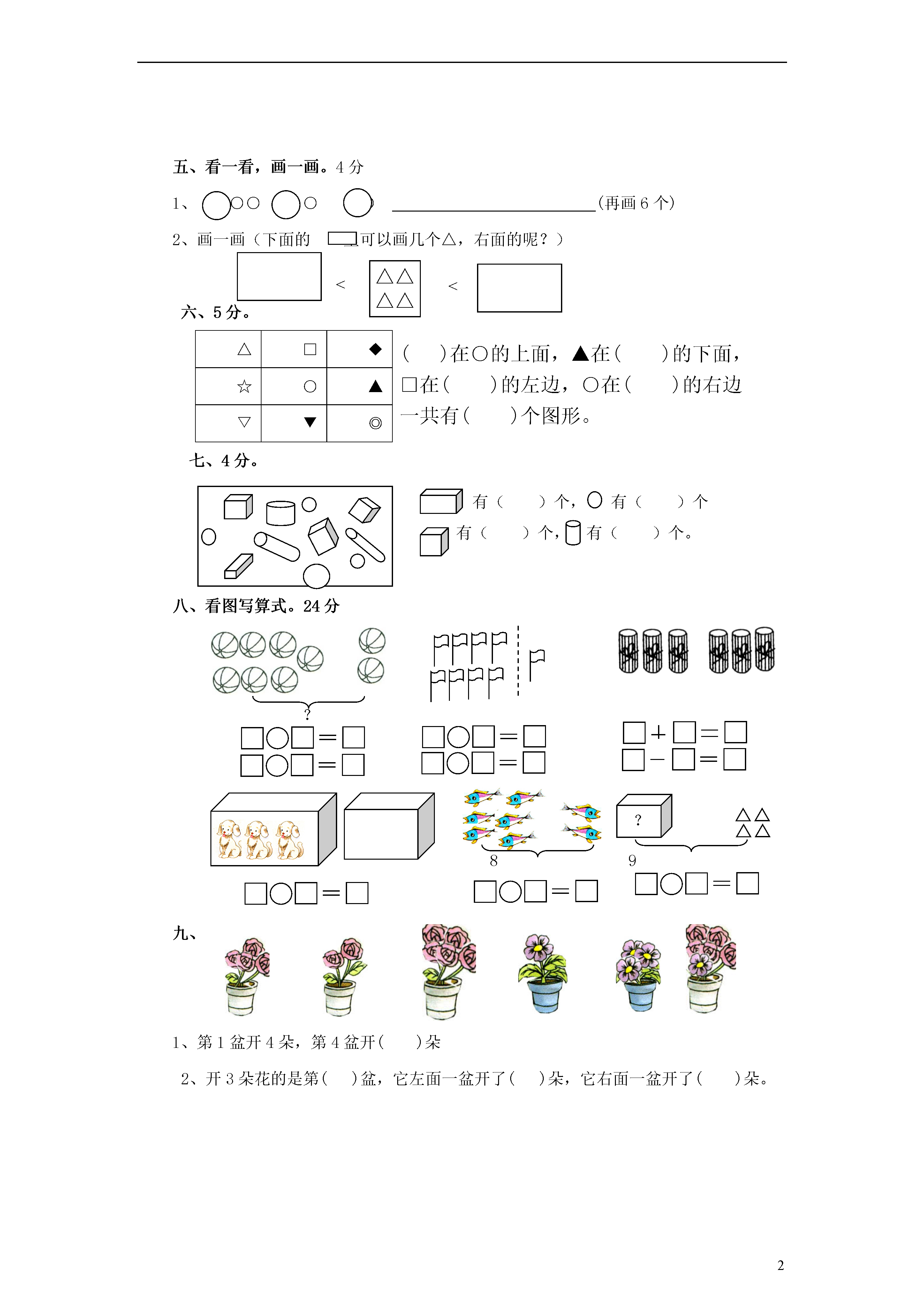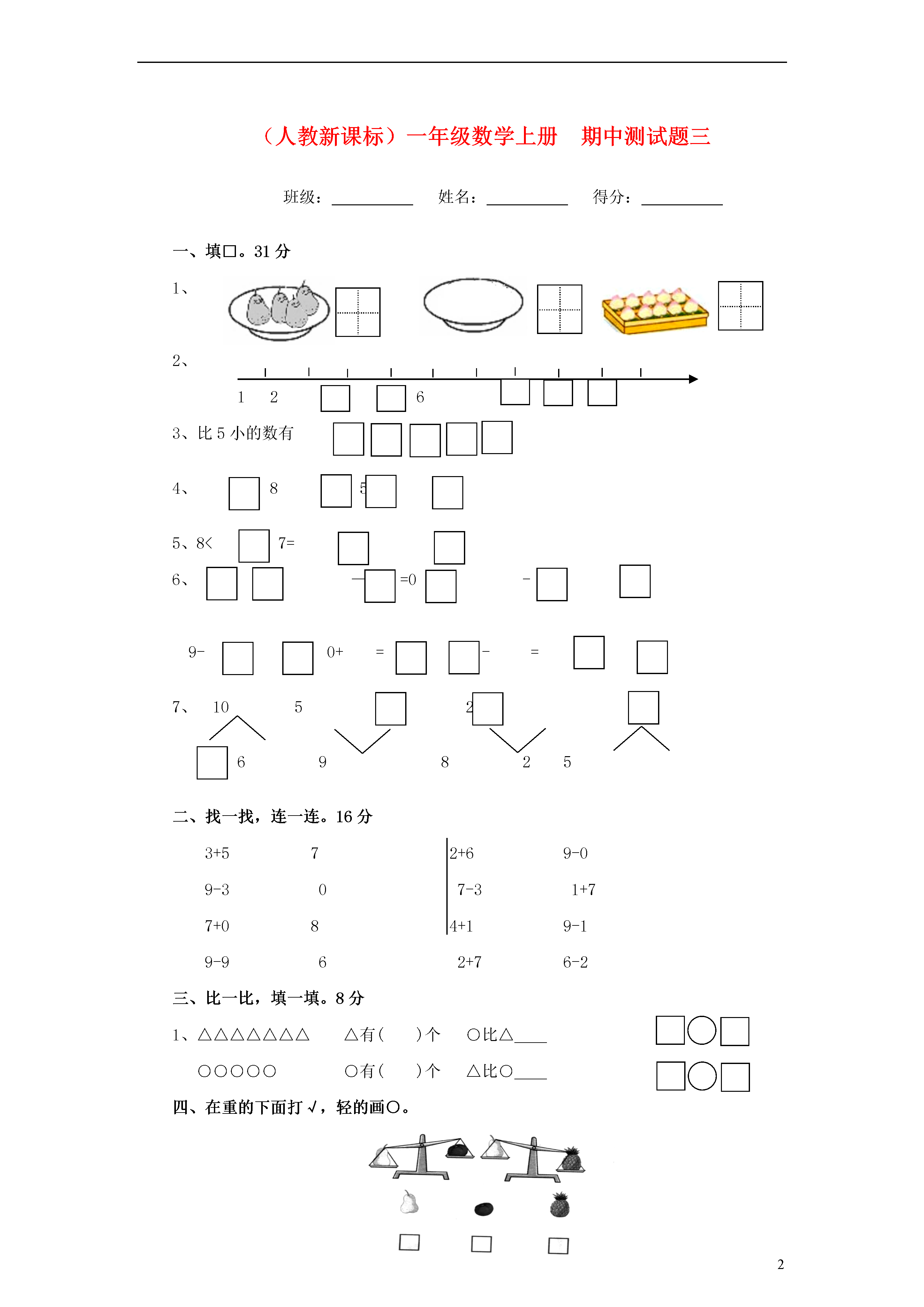 2(人教新课标)一年级数学上册期中测试题三班级:姓名:得分:一、填□。31分1、2、1256103、比5小的数有。4、9855、8<7=6<6、+=6—=0-0=9-=0+=8-=7、105269825二、找一找,连一连。16分3+572+69-09-307-31+77+084+19-19-962+76-2三、比一比,填一填。8分1、△△△△△△△△有()个○比△○○○○○○有()个△比○四、在重的下面打√,轻的画○。五、看一看,画一画。4分1、○○○○○○(再画6个)2、画一画(下面的里可以画几个△,右面的呢?)<<△△△△六、5分。△□()在○的上面,▲在()的下面,□在()的左边,○在()的右边一共有()个图形。◆☆○▲▽▼◎七、4分。有()个,有()个有()个,有()个。八、看图写算式。24分??89九、1、第1盆开4朵,第4盆开()朵2、开3朵花的是第()盆,它左面一盆开了()朵,它右面一盆开了()朵。
