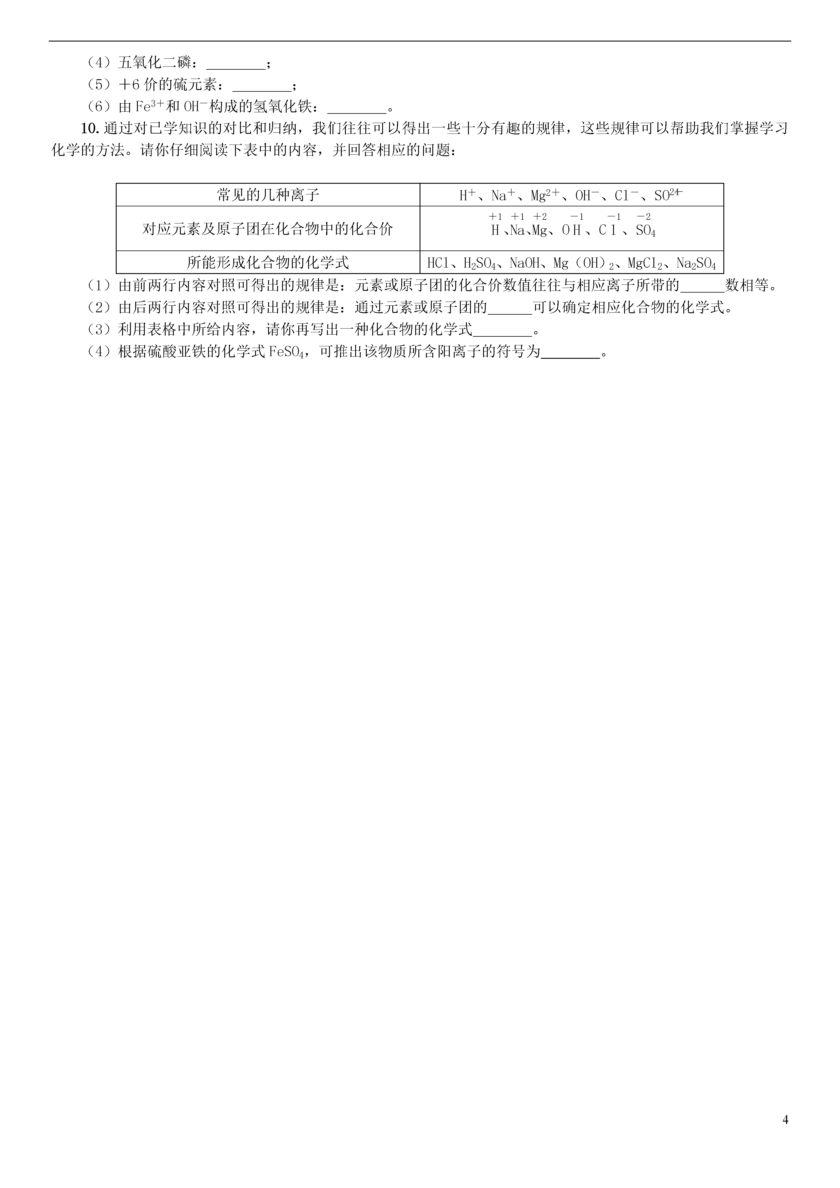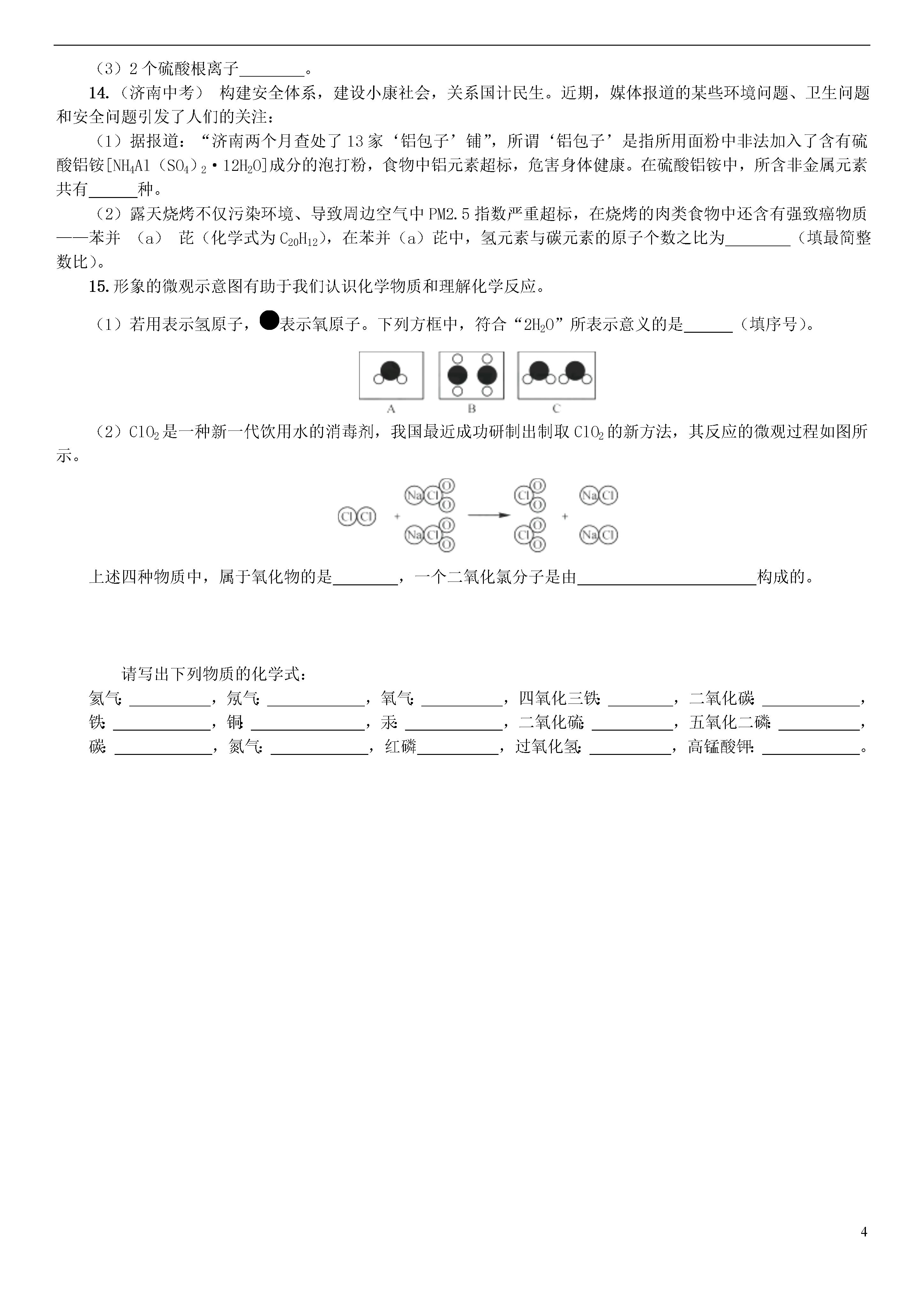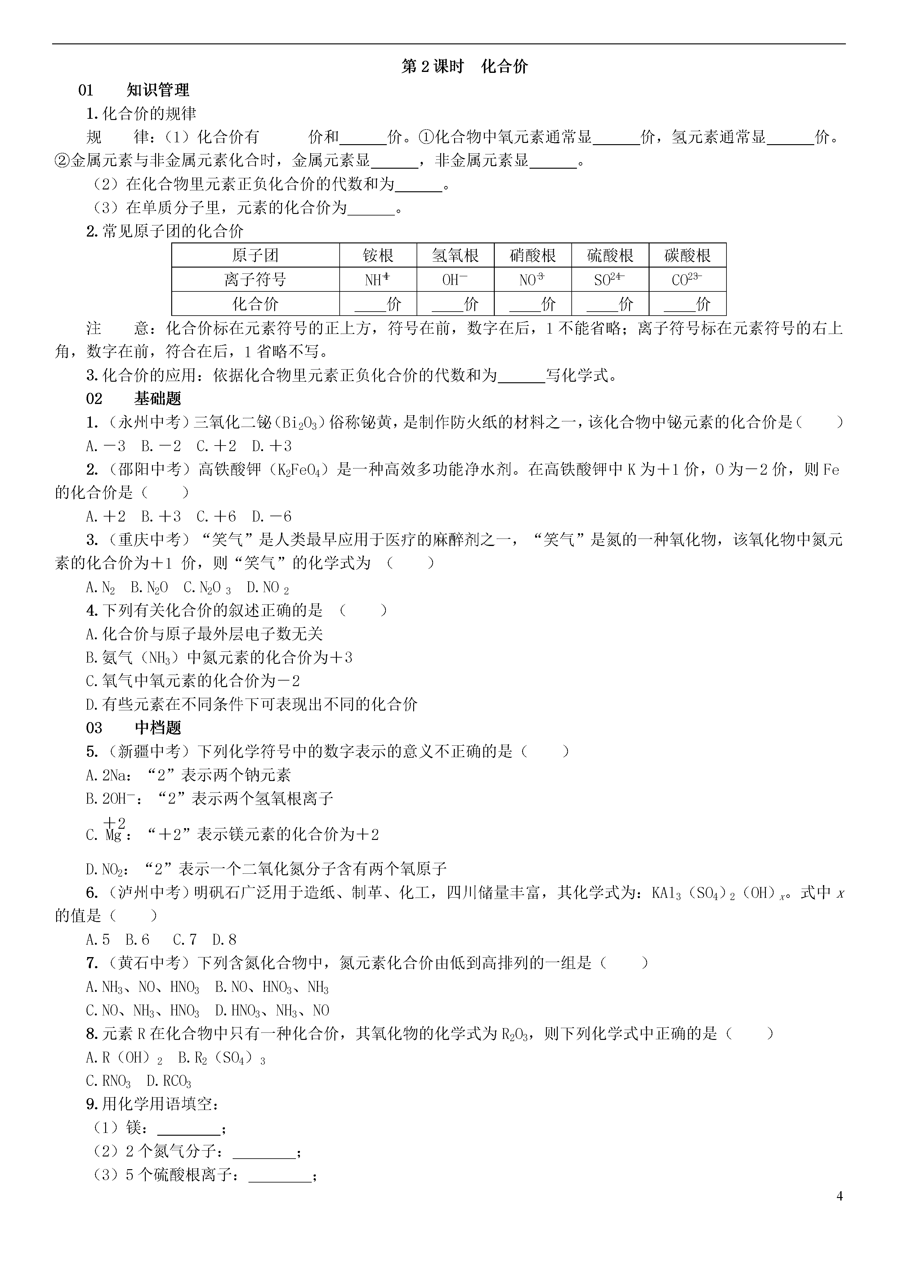 4课题4化学式与化合价第1课时化学式与化合价01知识管理1.化学式的概念概念:用和的组合表示物质组成的式子。2.化学式的意义(以H2O为例)宏观:(1)表示;(2)表示水由元素组成。微观:(1)表示;(2)表示1个水分子由和构成。3.化学式的书写单质:(1)稀有气体:用元素符号表示,如氦写为,氖写为;(2)金属和固态非金属:习惯上用元素符号表示,如铁写为,碳写为;(3)气态非金属:在元素符号右下角写上表示分子中所含原子数的数字,如氧气写为。化合物:(1)氧化物:把氧元素符号写在,另一种元素的元素符号写在。(2)由金属元素与非金属元素组成的化合物:把金属元素的元素符号写在,非金属元素的元素符号写在。4.化学式的读法读法:(1)气体单质一般读作“某气”,如O2读作,He读作,固体单质直接读元素的名称,如铁的化学式为Fe,读作铁等。(2)由两种元素组成的化合物的名称,一般读作“某化某”,如NaCl读作;有时需读出化学式中原子的个数,如P2O5读作。注意:各种物质的化学式都是通过实验方法测定物质的组成后得出来的,所以化学式中元素符号右下角的数字不能改动。02基础题1.化学式“CO2”中数字2表示()A.2个二氧化碳分子B.二氧化碳中有2个氧元素C.1个二氧化碳分子中有2个氧离子D.1个二氧化碳分子中有2个氧原子2.(十堰中考)化学式“H2O”表示意义错误的是()A.水这种物质B.一个水分子C.水是由氢、氧两种元素组成D.水是由两个氢原子和一个氧原子组成3.(济宁改编)下列符号中既能表示物质的元素组成,又能表示该物质的一个分子,正确的选项是()①Cu②N③H2O2④NaCl⑤NH3A.①②B.③④C.③⑤D.②④4.(衡阳中考)符合以下四位同学所描述的化学式可能是()A.H2OB.O3C.MgOD.HClO5.苯(C6H6)是一种无色、有甜味的透明液体,并具有强烈的芳香气味,可燃,有毒。下列有关苯的说法正确的是()A.苯是由6个碳原子和6个氢原子构成B.苯属于氧化物C.苯分子由2种元素组成D.苯中碳、氢元素的原子个数比为1∶16.(怀化中考)下列化学用语与含义相符的是()A.3O—3个氧元素B.H—1个氢分子C.N2—2个氮原子D.Na+—1个钠离子7.(玉林中考)用化学符号填空。(1)两个氢原子;(2)铝离子;(3)硫元素;(4)二氧化氯。8.葡萄糖在人体组织中缓慢氧化放出热量,这是人类生命活动所需能量的重要来源之一。葡萄糖的化学式为C6H12O6,从葡萄糖的化学式你能总结出哪些信息?(请写出两条)(1)________________________________________________________________________;(2)________________________________________________________________________。03中档题9.某物质的分子模型如下图所示,下列说法错误的是()A.该物质属于化合物B.该物质的化学式为CH4C.该物质的1个分子含2个氢分子D.该物质的1个分子中碳、氢原子个数比为1∶410.(重庆A卷)中国科学家屠呦呦利用乙醚从黄花蒿汁液中提取出抗疟特效药青蒿素,从而获得了2015年诺贝尔医学奖。已知青蒿素的化学式为C15H22O5,其分子中含有与H2O2类似的结构,下列叙述正确的是()A.青蒿素属于氧化物B.1个青蒿素分子中含有11个氢分子C.青蒿素难溶于乙醚D.提取青蒿素过程中应尽量避免高温11.(福州中考)下列化学用语与含义相符的是()A.Fe3O4——氧化铁B.2N——2个氮元素C.H+——1个氢离子D.Cl2——2个氯原子12.写出下列符号中数字“2”的含义:(1)2H2O:,;(2)2S:;(3)Ba2+:________________________________________________________________________;(4)H2:________________________________________________________________________。13.(娄底中考)化学用语是最简明、信息丰富、国际通用的语言。请用化学用语填空:(1)2个二氧化氮分子;(2)n个氢原子;(3)2个硫酸根离子。14.(济南中考)构建安全体系,建设小康社会,关系国计民生。近期,媒体报道的某些环境问题、卫生问题和安全问题引发了人们的关注:(1)据报道:“济南两个月查处了13家‘铝包子’铺”,所谓‘铝包子’是指所用面粉中非法加入了含