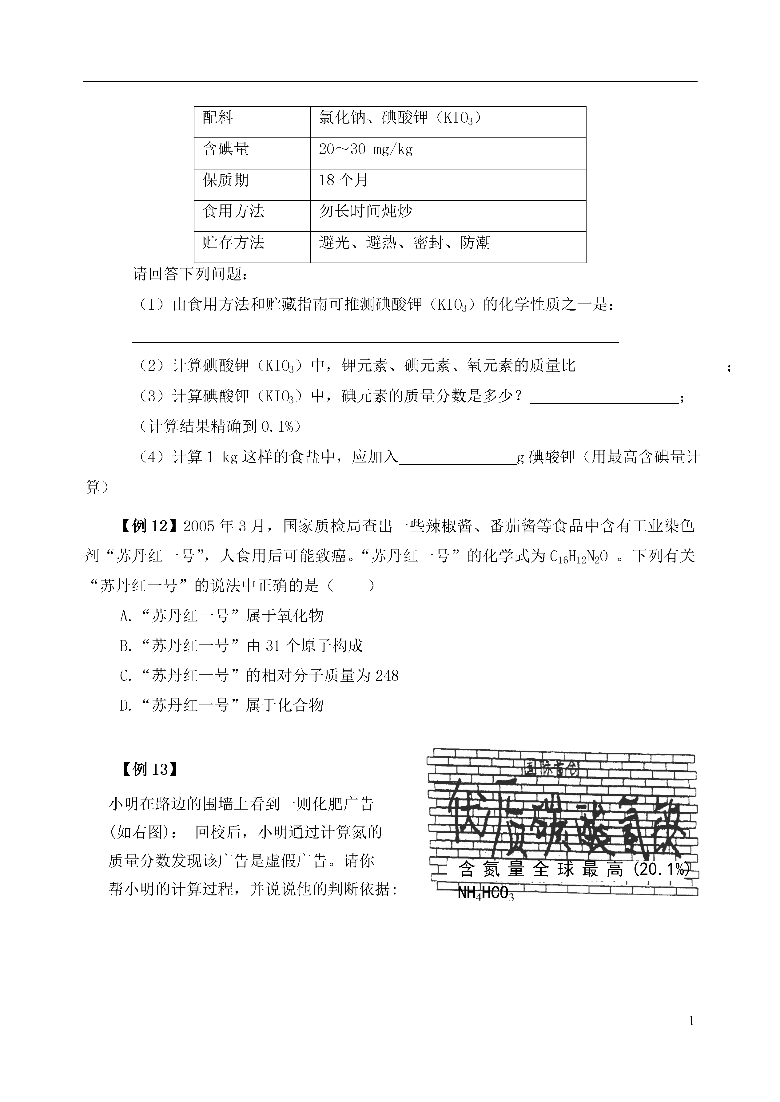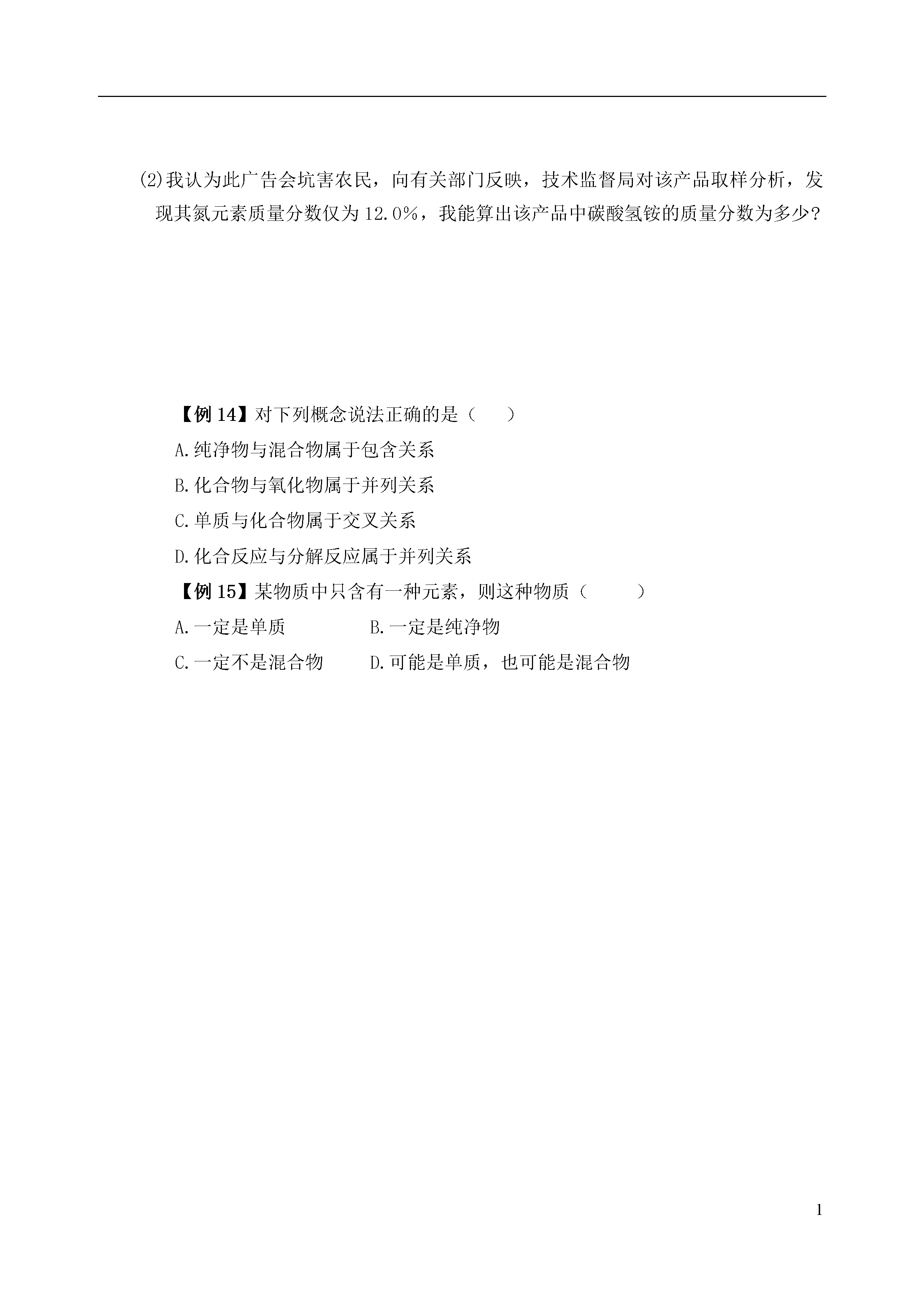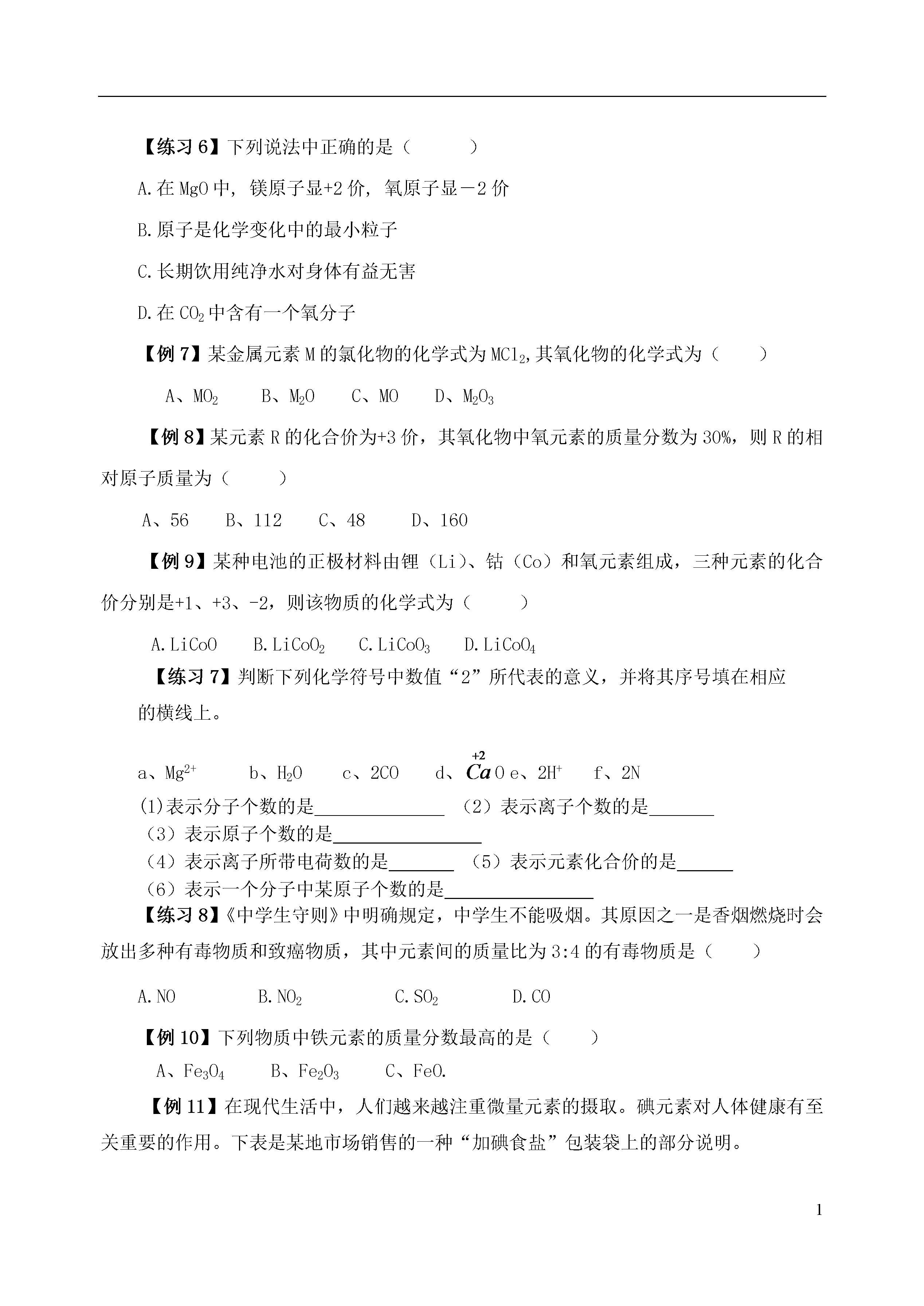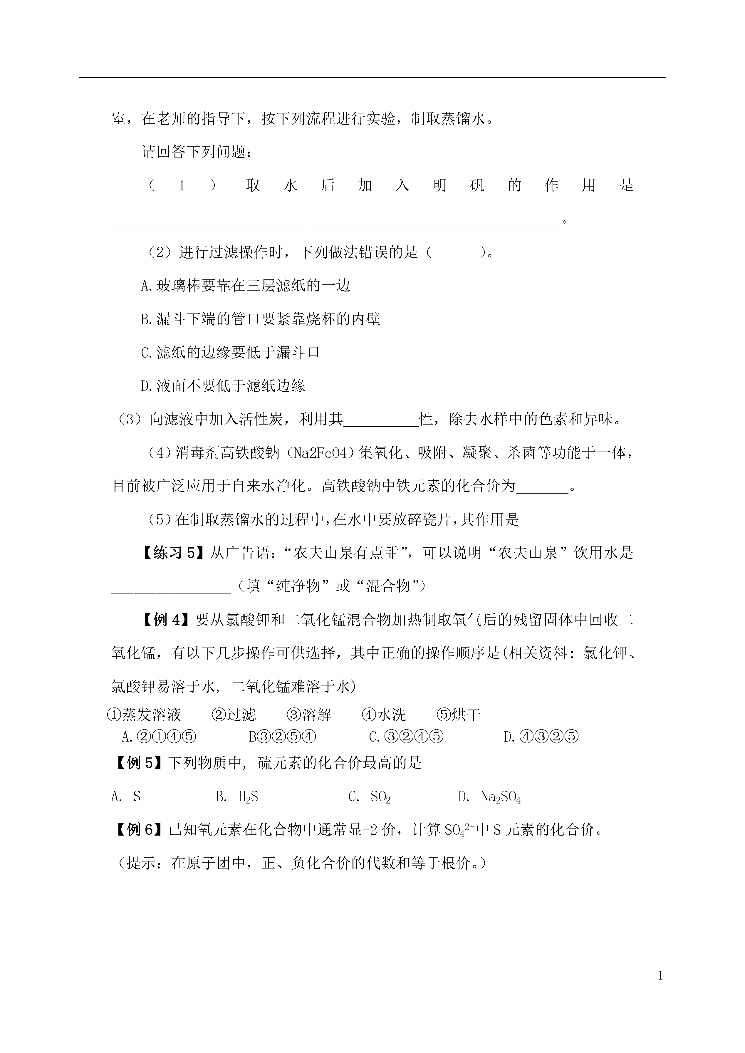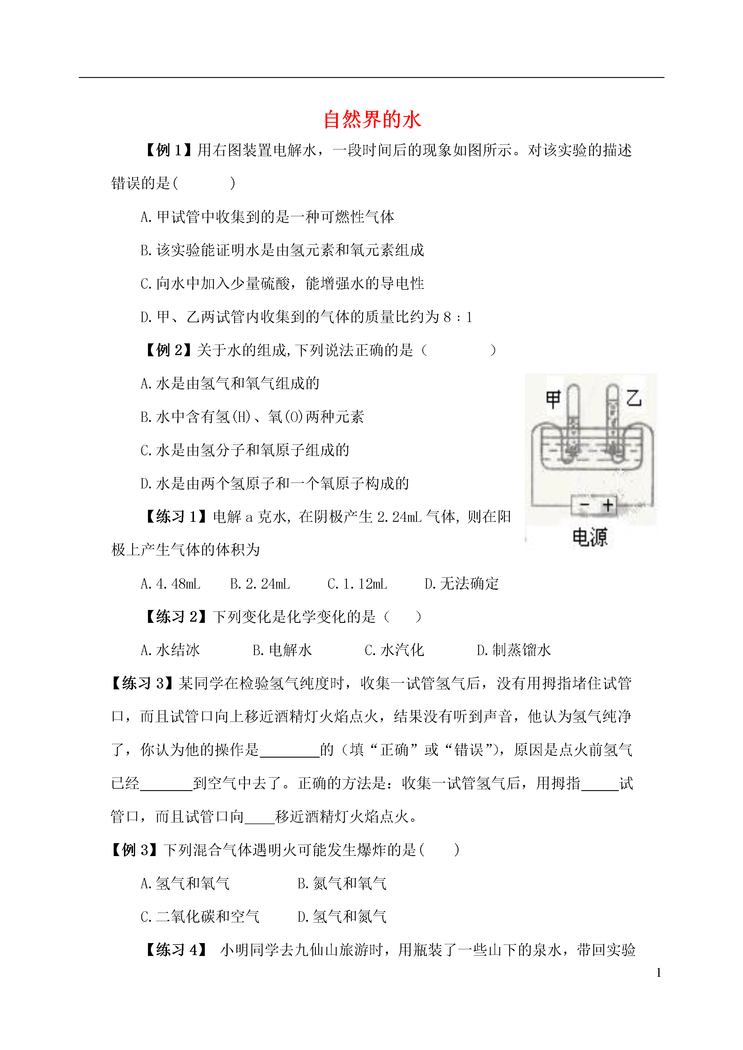 1自然界的水【例1】用右图装置电解水,一段时间后的现象如图所示。对该实验的描述错误的是()A.甲试管中收集到的是一种可燃性气体B.该实验能证明水是由氢元素和氧元素组成C.向水中加入少量硫酸,能增强水的导电性D.甲、乙两试管内收集到的气体的质量比约为8﹕1【例2】关于水的组成,下列说法正确的是()A.水是由氢气和氧气组成的B.水中含有氢(H)、氧(O)两种元素C.水是由氢分子和氧原子组成的D.水是由两个氢原子和一个氧原子构成的【练习1】电解a克水,在阴极产生2.24mL气体,则在阳极上产生气体的体积为A.4.48mLB.2.24mLC.1.12mLD.无法确定【练习2】下列变化是化学变化的是()A.水结冰B.电解水C.水汽化D.制蒸馏水【练习3】某同学在检验氢气纯度时,收集一试管氢气后,没有用拇指堵住试管口,而且试管口向上移近酒精灯火焰点火,结果没有听到声音,他认为氢气纯净了,你认为他的操作是的(填“正确”或“错误”),原因是点火前氢气已经到空气中去了。正确的方法是:收集一试管氢气后,用拇指试管口,而且试管口向移近酒精灯火焰点火。【例3】下列混合气体遇明火可能发生爆炸的是()A.氢气和氧气B.氮气和氧气C.二氧化碳和空气D.氢气和氮气【练习4】小明同学去九仙山旅游时,用瓶装了一些山下的泉水,带回实验室,在老师的指导下,按下列流程进行实验,制取蒸馏水。请回答下列问题:(1)取水后加入明矾的作用是____________________________________________________________。(2)进行过滤操作时,下列做法错误的是()。A.玻璃棒要靠在三层滤纸的一边B.漏斗下端的管口要紧靠烧杯的内壁C.滤纸的边缘要低于漏斗口D.液面不要低于滤纸边缘(3)向滤液中加入活性炭,利用其性,除去水样中的色素和异味。(4)消毒剂高铁酸钠(Na2FeO4)集氧化、吸附、凝聚、杀菌等功能于一体,目前被广泛应用于自来水净化。高铁酸钠中铁元素的化合价为。(5)在制取蒸馏水的过程中,在水中要放碎瓷片,其作用是。【练习5】从广告语:“农夫山泉有点甜”,可以说明“农夫山泉”饮用水是________________(填“纯净物”或“混合物”)【例4】要从氯酸钾和二氧化锰混合物加热制取氧气后的残留固体中回收二氧化锰,有以下几步操作可供选择,其中正确的操作顺序是(相关资料:氯化钾、氯酸钾易溶于水,二氧化锰难溶于水)①蒸发溶液②过滤③溶解④水洗⑤烘干A.②①④⑤B③②⑤④C.③②④⑤D.④③②⑤【例5】下列物质中,硫元素的化合价最高的是A.SB.H2SC.SO2D.Na2SO4【例6】已知氧元素在化合物中通常显-2价,计算SO42-中S元素的化合价。(提示:在原子团中,正、负化合价的代数和等于根价。)【练习6】下列说法中正确的是()A.在MgO中,镁原子显+2价,氧原子显-2价B.原子是化学变化中的最小粒子C.长期饮用纯净水对身体有益无害D.在CO2中含有一个氧分子【例7】某金属元素M的氯化物的化学式为MCl2,其氧化物的化学式为()A、MO2B、M2OC、MOD、M2O3【例8】某元素R的化合价为+3价,其氧化物中氧元素的质量分数为30%,则R的相对原子质量为()A、56B、112C、48D、160【例9】某种电池的正极材料由锂(Li)、钴(Co)和氧元素组成,三种元素的化合价分别是+1、+3、-2,则该物质的化学式为()A.LiCoOB.LiCoO2C.LiCoO3D.LiCoO4【练习7】判断下列化学符号中数值“2”所代表的意义,并将其序号填在相应的横线上。a、Mg2+b、H2Oc、2COd、Oe、2H+f、2N(1)表示分子个数的是(2)表示离子个数的是(3)表示原子个数的是(4)表示离子所带电荷数的是(5)表示元素化合价的是(6)表示一个分子中某原子个数的是【练习8】《中学生守则》中明确规定,中学生不能吸烟。其原因之一是香烟燃烧时会放出多种有毒物质和致癌物质,其中元素间的质量比为3:4的有毒物质是()A.NOB.NO2C.SO2D.CO【例10】下列物质中铁元素的质量分数最高的是()A、Fe3O4B、Fe2O3C、FeO.【例11】在现代生活中,人们越来越注重微量元素的摄取。碘元素对人体健康有至关重要的作用。下表是某地市场销售的一种“加碘食盐”包装袋上的部分说明。配料氯化钠、碘酸钾(KIO3)含碘量20~30mg/kg保质期18个月食用方法勿长时间炖炒贮存方法避光、避热、密封、防潮请回答下列问题:(1)由食用方法和贮藏指南可推测碘酸钾(KIO3)的化学性质之一是:(2)计算碘酸钾(KIO