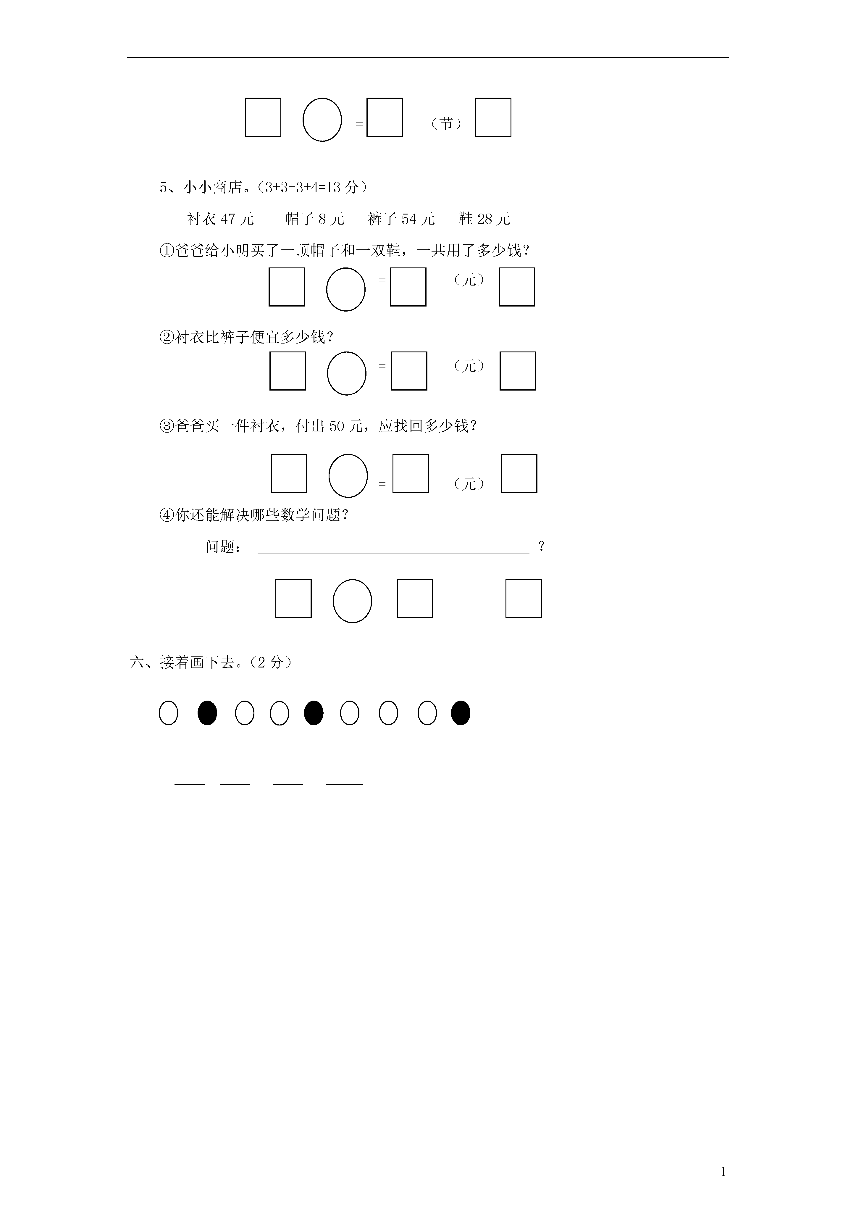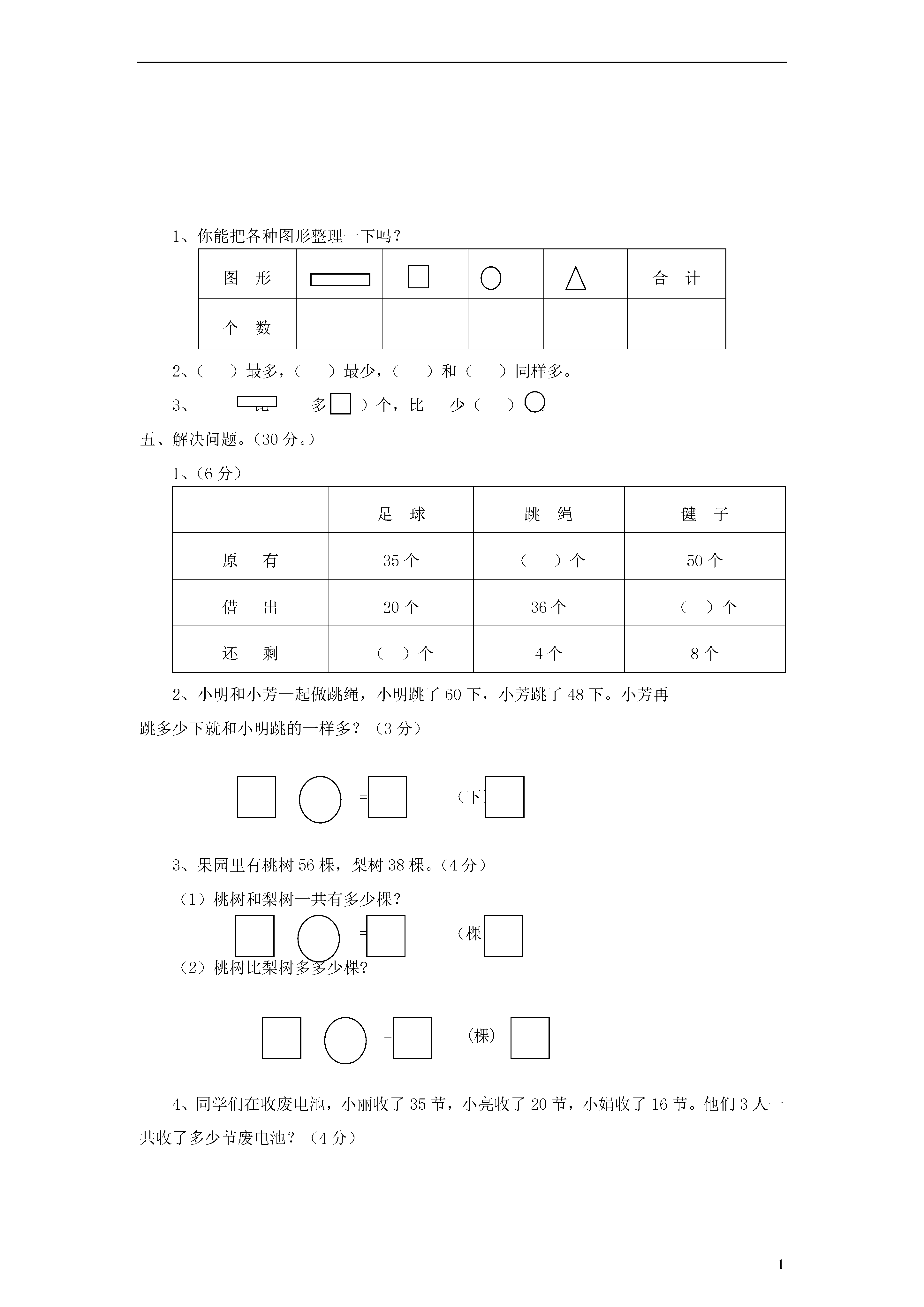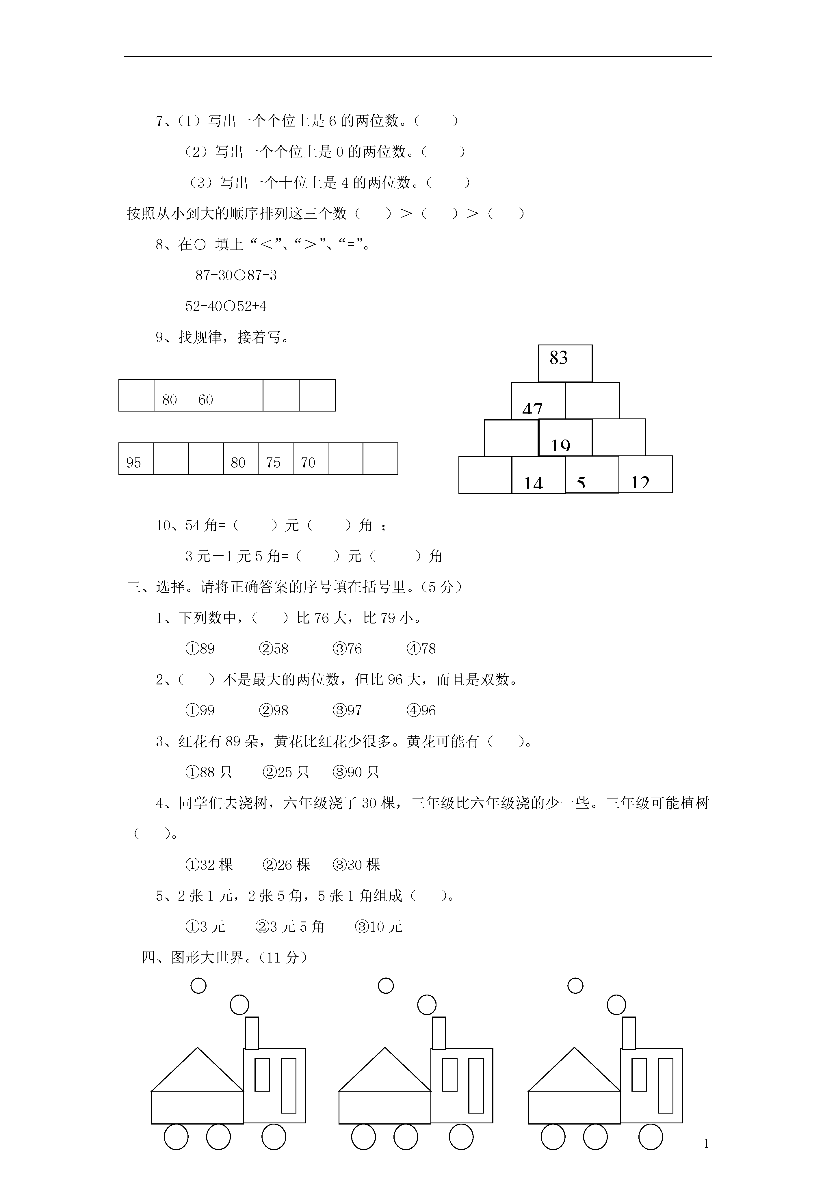 1一年级数学下册期末试卷一、计算。(12+4+8+6=30分)1、口算。12-8=68+7=89+2=53-12=17+9=99-90=71-6=76+23=43+8=87-55=31+45=84-41=47-9=13+60=48-24=78-20=58+10=81+12=38-6=78+8=68-60=53-3=20+8=40+14=2、70+5+10=25-5-18=54+3-5=70-50+42=3、竖式计算36+54=64+17=98-89=70-67=4、病题门诊58056+24-78+37741283()()()二、填空(每空0.5分,共22分)百十个百十个百十个1、写作()写作()写作()读作()读作()读作()2、78里面有()个十和()个一。3、92十位上数是(),表示()个十,个位上数是(),表示()个()。4、比69多21的数是(),比69少21的数是()。5、最大的两位数是(),最大的一位数是(),最大的两位数比最大的一位数多()。6、和79相邻的两个数是()和()。7、(1)写出一个个位上是6的两位数。()(2)写出一个个位上是0的两位数。()(3)写出一个十位上是4的两位数。()按照从小到大的顺序排列这三个数()>()>()8、在○填上“<”、“>”、“=”。87-30○87-352+40○52+4834719121459、找规律,接着写。80609580757010、54角=()元()角;3元-1元5角=()元()角三、选择。请将正确答案的序号填在括号里。(5分)1、下列数中,()比76大,比79小。①89②58③76④782、()不是最大的两位数,但比96大,而且是双数。①99②98③97④963、红花有89朵,黄花比红花少很多。黄花可能有()。①88只②25只③90只4、同学们去浇树,六年级浇了30棵,三年级比六年级浇的少一些。三年级可能植树()。①32棵②26棵③30棵5、2张1元,2张5角,5张1角组成()。①3元②3元5角③10元四、图形大世界。(11分)1、你能把各种图形整理一下吗?图形合计个数2、()最多,()最少,()和()同样多。3、比多()个,比少()个。五、解决问题。(30分。)1、(6分)足球跳绳毽子原有35个()个50个借出20个36个()个还剩()个4个8个2、小明和小芳一起做跳绳,小明跳了60下,小芳跳了48下。小芳再跳多少下就和小明跳的一样多?(3分)=(下)3、果园里有桃树56棵,梨树38棵。(4分)(1)桃树和梨树一共有多少棵?=(棵)(2)桃树比梨树多多少棵?=(棵)4、同学们在收废电池,小丽收了35节,小亮收了20节,小娟收了16节。他们3人一共收了多少节废电池?(4分)=(节)5、小小商店。(3+3+3+4=13分)衬衣47元帽子8元裤子54元鞋28元①爸爸给小明买了一顶帽子和一双鞋,一共用了多少钱?=(元)②衬衣比裤子便宜多少钱?=(元)③爸爸买一件衬衣,付出50元,应找回多少钱?=(元)④你还能解决哪些数学问题?问题:?=六、接着画下去。(2分)