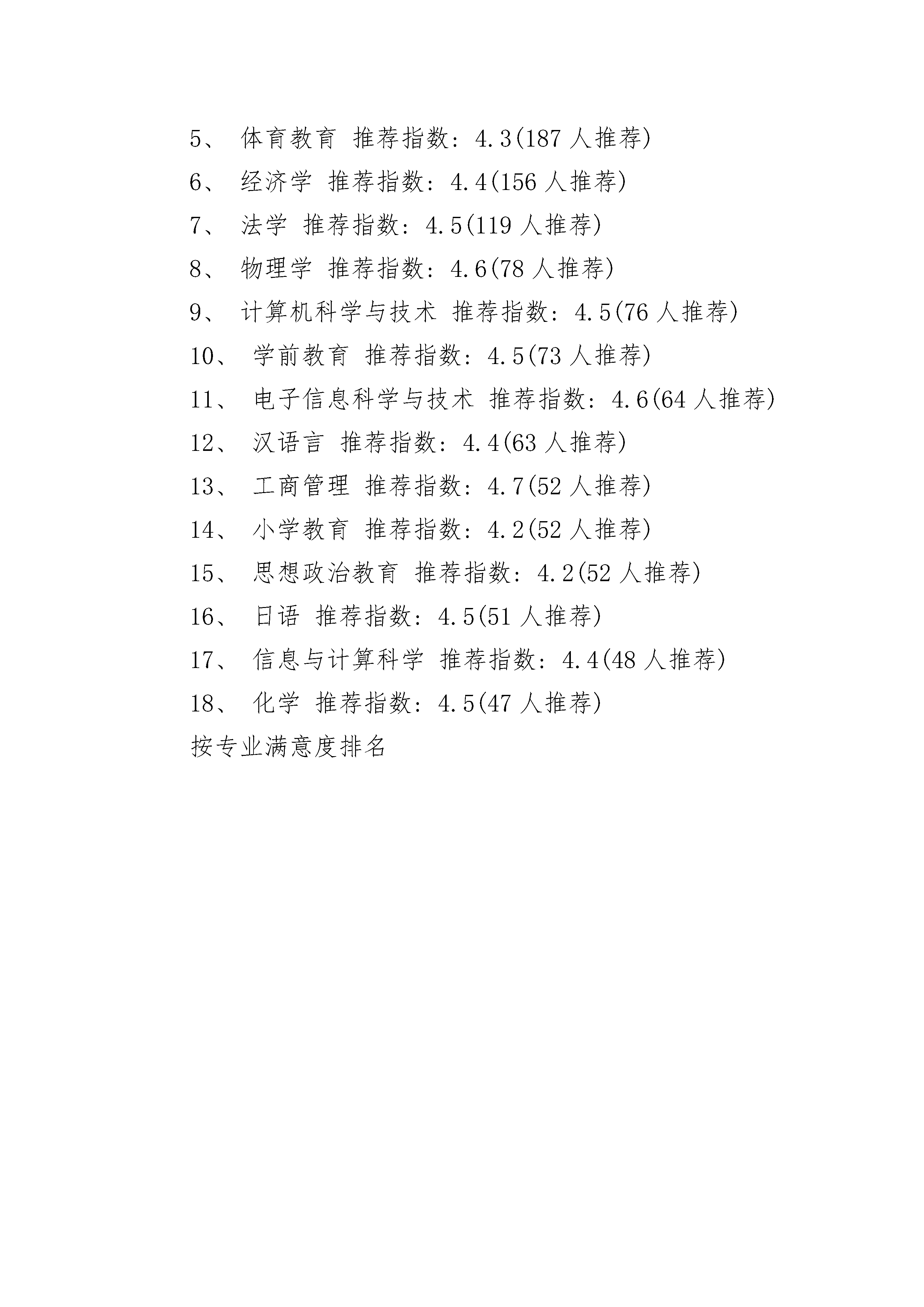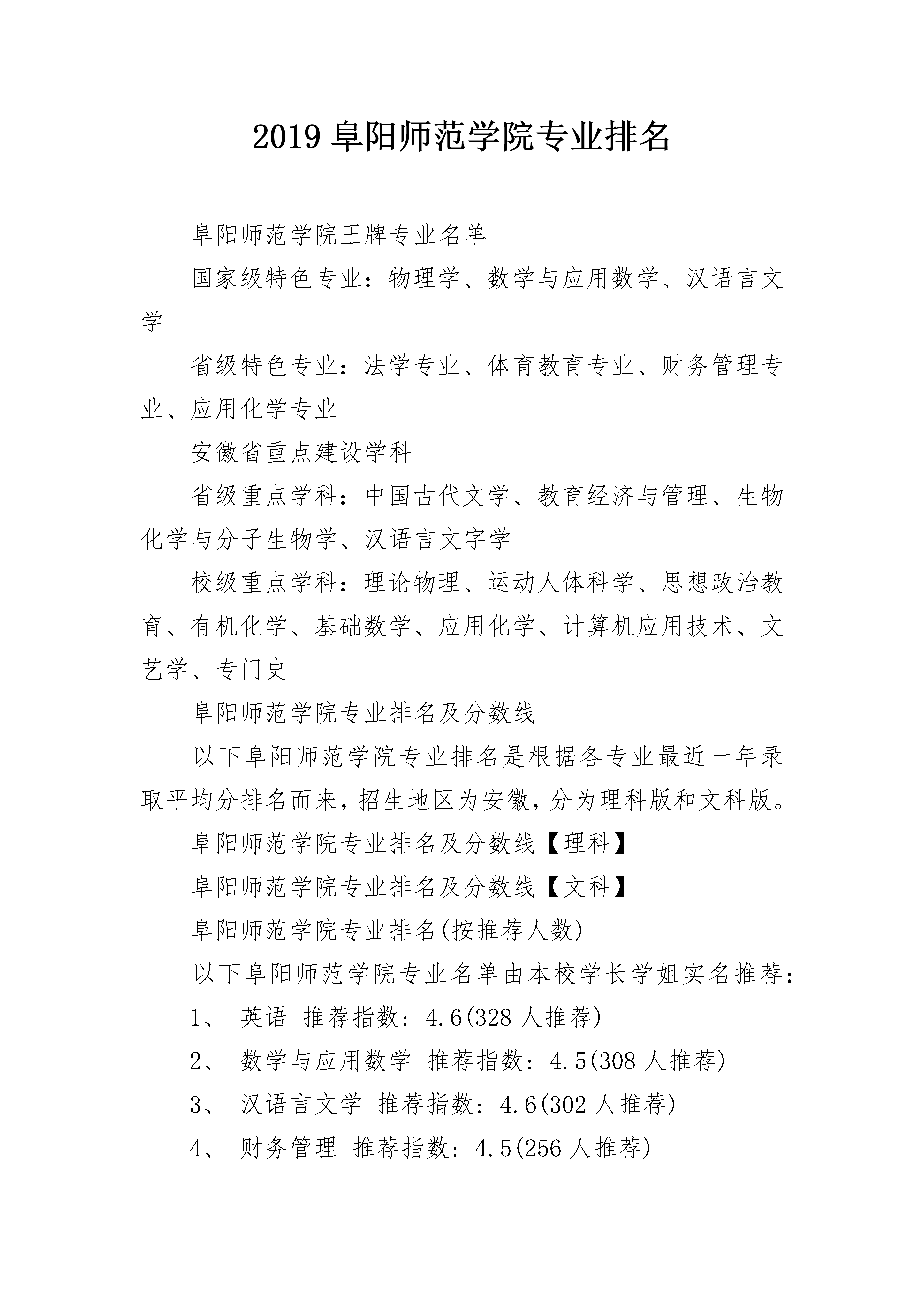 2019阜阳师范学院专业排名阜阳师范学院王牌专业名单国家级特色专业:物理学、数学与应用数学、汉语言文学省级特色专业:法学专业、体育教育专业、财务管理专业、应用化学专业安徽省重点建设学科省级重点学科:中国古代文学、教育经济与管理、生物化学与分子生物学、汉语言文字学校级重点学科:理论物理、运动人体科学、思想政治教育、有机化学、基础数学、应用化学、计算机应用技术、文艺学、专门史阜阳师范学院专业排名及分数线以下阜阳师范学院专业排名是根据各专业最近一年录取平均分排名而来,招生地区为安徽,分为理科版和文科版。阜阳师范学院专业排名及分数线【理科】阜阳师范学院专业排名及分数线【文科】阜阳师范学院专业排名(按推荐人数)以下阜阳师范学院专业名单由本校学长学姐实名推荐:1、英语推荐指数:4.6(328人推荐)2、数学与应用数学推荐指数:4.5(308人推荐)3、汉语言文学推荐指数:4.6(302人推荐)4、财务管理推荐指数:4.5(256人推荐)5、体育教育推荐指数:4.3(187人推荐)6、经济学推荐指数:4.4(156人推荐)7、法学推荐指数:4.5(119人推荐)8、物理学推荐指数:4.6(78人推荐)9、计算机科学与技术推荐指数:4.5(76人推荐)10、学前教育推荐指数:4.5(73人推荐)11、电子信息科学与技术推荐指数:4.6(64人推荐)12、汉语言推荐指数:4.4(63人推荐)13、工商管理推荐指数:4.7(52人推荐)14、小学教育推荐指数:4.2(52人推荐)15、思想政治教育推荐指数:4.2(52人推荐)16、日语推荐指数:4.5(51人推荐)17、信息与计算科学推荐指数:4.4(48人推荐)18、化学推荐指数:4.5(47人推荐)按专业满意度排名