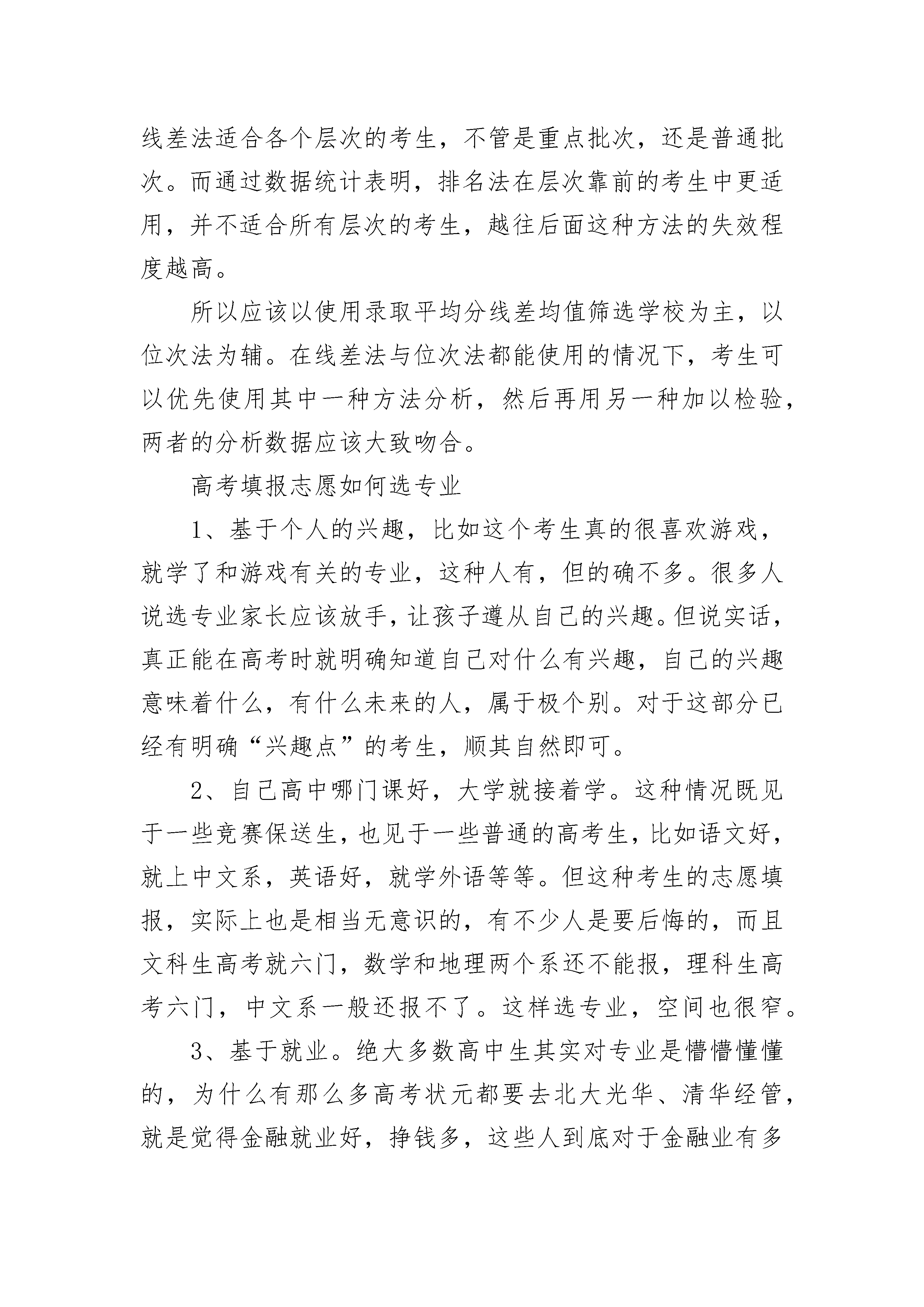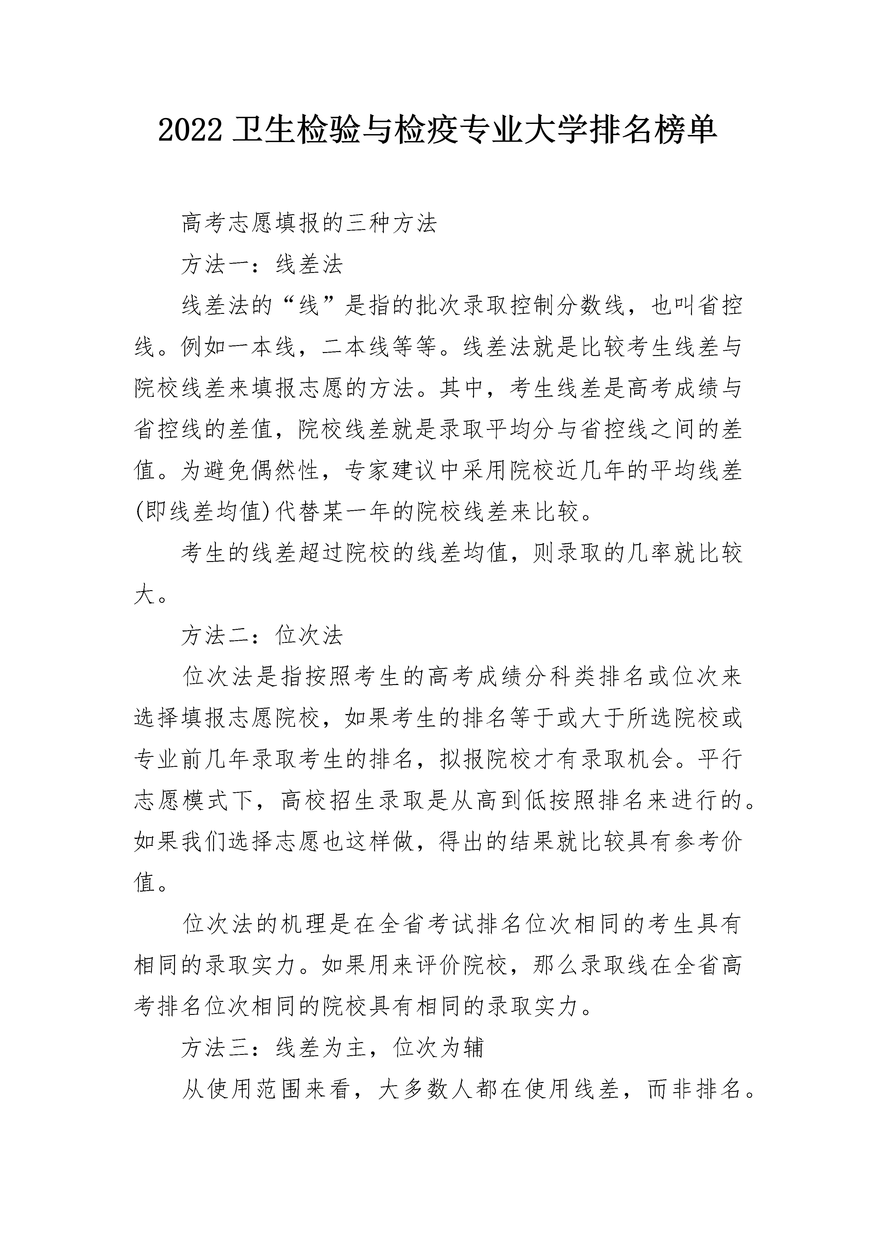 2022卫生检验与检疫专业大学排名榜单高考志愿填报的三种方法方法一:线差法线差法的“线”是指的批次录取控制分数线,也叫省控线。例如一本线,二本线等等。线差法就是比较考生线差与院校线差来填报志愿的方法。其中,考生线差是高考成绩与省控线的差值,院校线差就是录取平均分与省控线之间的差值。为避免偶然性,专家建议中采用院校近几年的平均线差(即线差均值)代替某一年的院校线差来比较。考生的线差超过院校的线差均值,则录取的几率就比较大。方法二:位次法位次法是指按照考生的高考成绩分科类排名或位次来选择填报志愿院校,如果考生的排名等于或大于所选院校或专业前几年录取考生的排名,拟报院校才有录取机会。平行志愿模式下,高校招生录取是从高到低按照排名来进行的。如果我们选择志愿也这样做,得出的结果就比较具有参考价值。位次法的机理是在全省考试排名位次相同的考生具有相同的录取实力。如果用来评价院校,那么录取线在全省高考排名位次相同的院校具有相同的录取实力。方法三:线差为主,位次为辅从使用范围来看,大多数人都在使用线差,而非排名。线差法适合各个层次的考生,不管是重点批次,还是普通批次。而通过数据统计表明,排名法在层次靠前的考生中更适用,并不适合所有层次的考生,越往后面这种方法的失效程度越高。所以应该以使用录取平均分线差均值筛选学校为主,以位次法为辅。在线差法与位次法都能使用的情况下,考生可以优先使用其中一种方法分析,然后再用另一种加以检验,两者的分析数据应该大致吻合。高考填报志愿如何选专业1、基于个人的兴趣,比如这个考生真的很喜欢游戏,就学了和游戏有关的专业,这种人有,但的确不多。很多人说选专业家长应该放手,让孩子遵从自己的兴趣。但说实话,真正能在高考时就明确知道自己对什么有兴趣,自己的兴趣意味着什么,有什么未来的人,属于极个别。对于这部分已经有明确“兴趣点”的考生,顺其自然即可。2、自己高中哪门课好,大学就接着学。这种情况既见于一些竞赛保送生,也见于一些普通的高考生,比如语文好,就上中文系,英语好,就学外语等等。但这种考生的志愿填报,实际上也是相当无意识的,有不少人是要后悔的,而且文科生高考就六门,数学和地理两个系还不能报,理科生高考六门,中文系一般还报不了。这样选专业,空间也很窄。3、基于就业。绝大多数高中生其实对专业是懵懵懂懂的,为什么有那么多高考状元都要去北大光华、清华经管,就是觉得金融就业好,挣钱多,这些人到底对于金融业有多少了解,他们的父母对金融业有多少了解,其实搞不清楚。