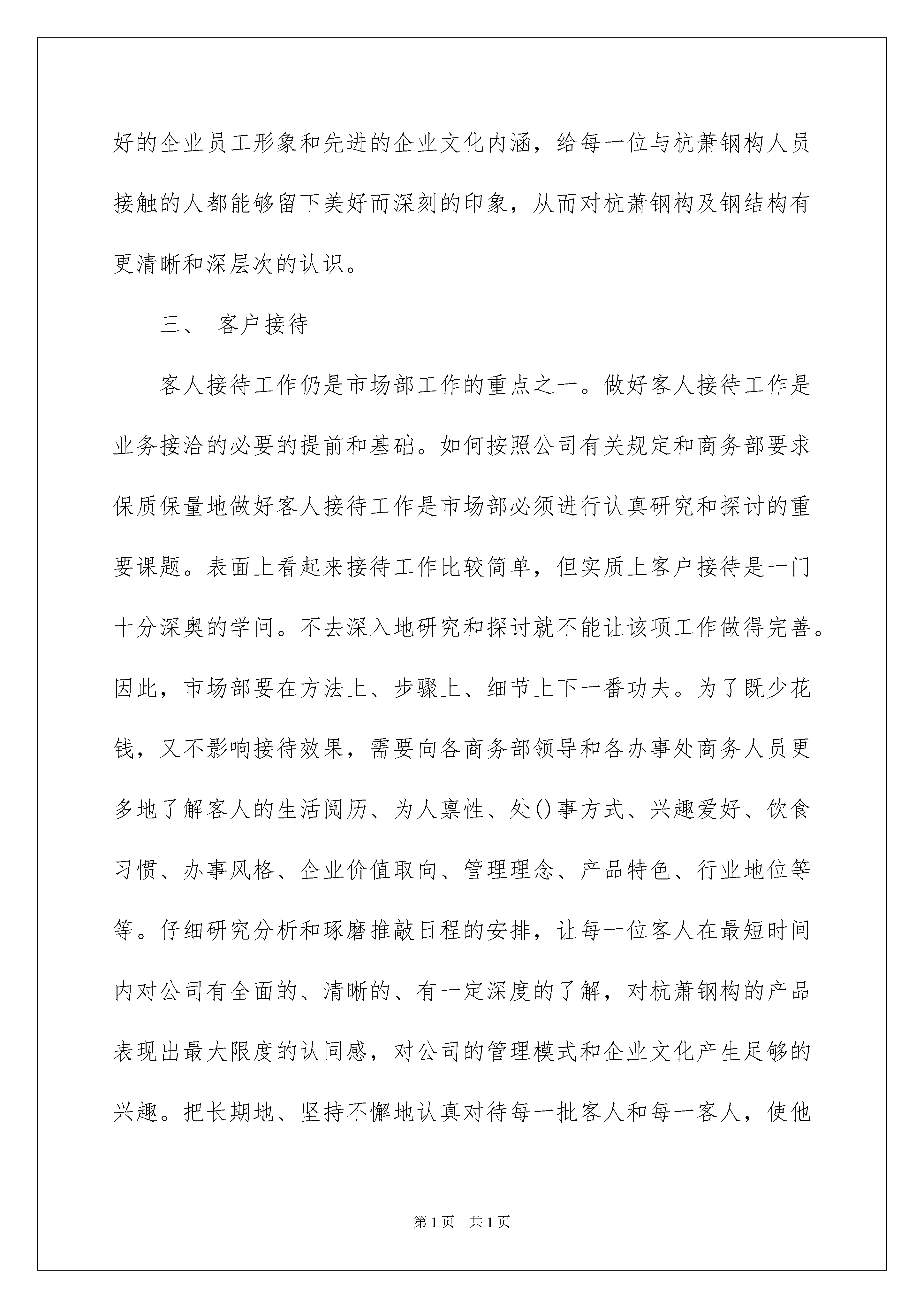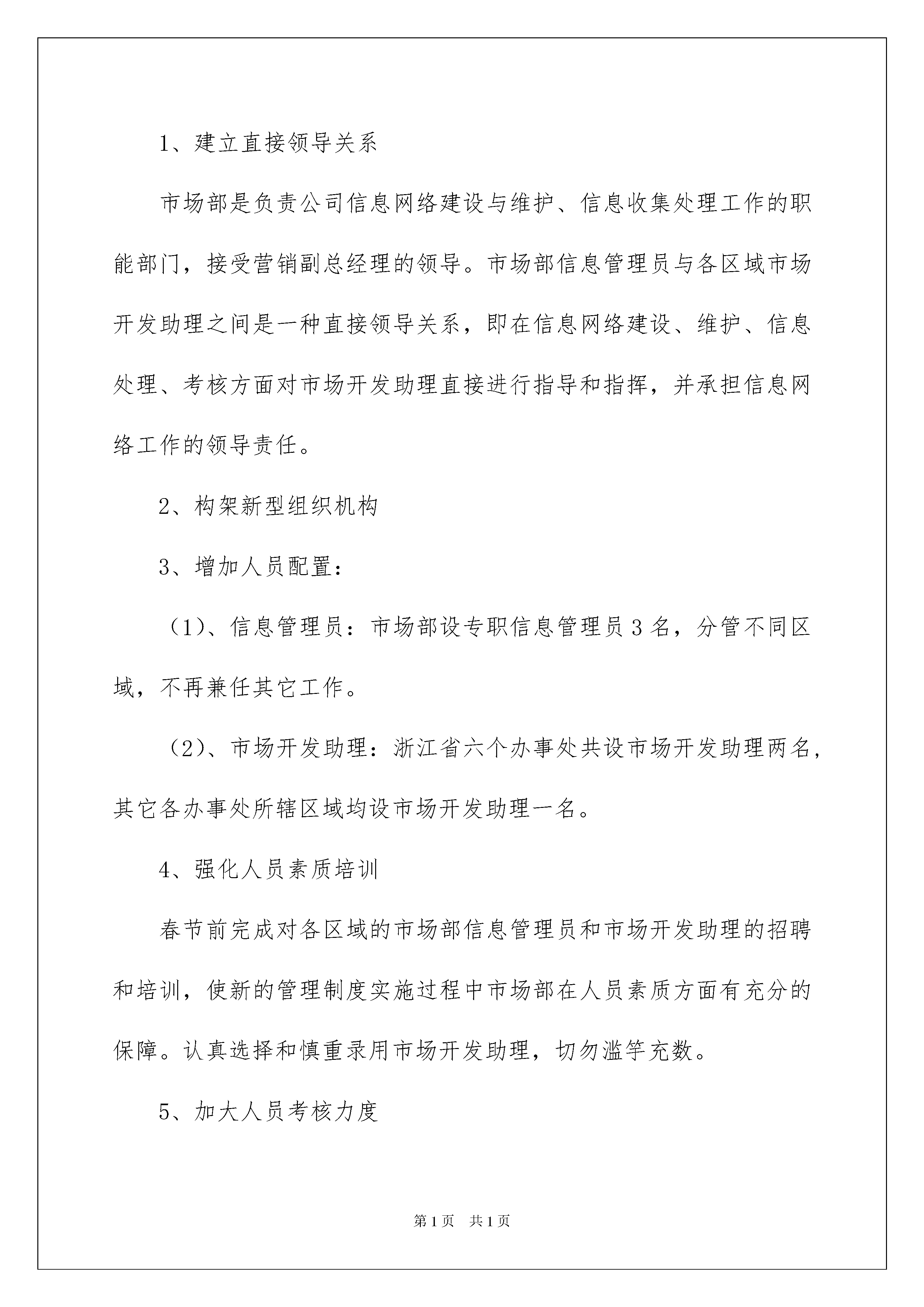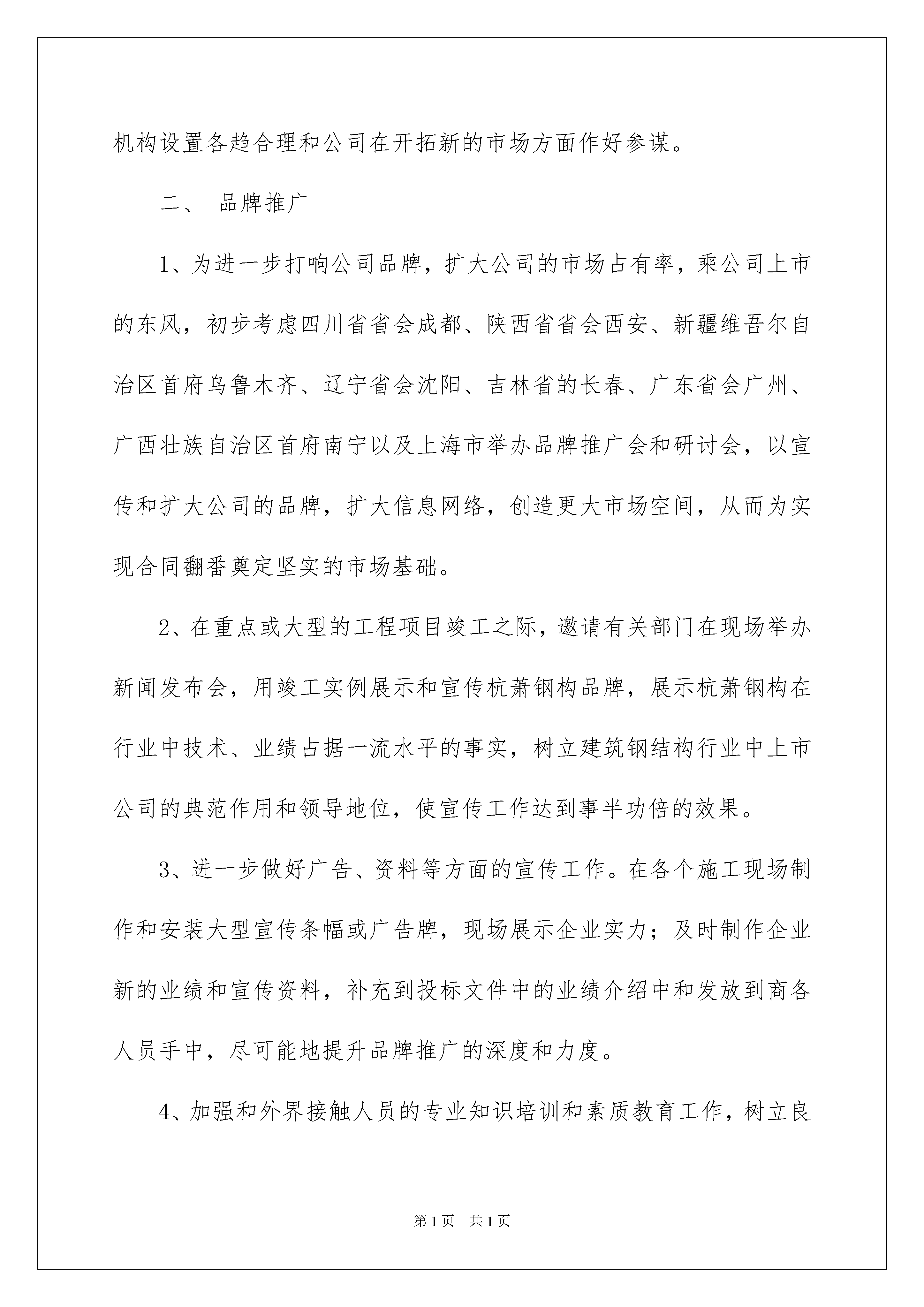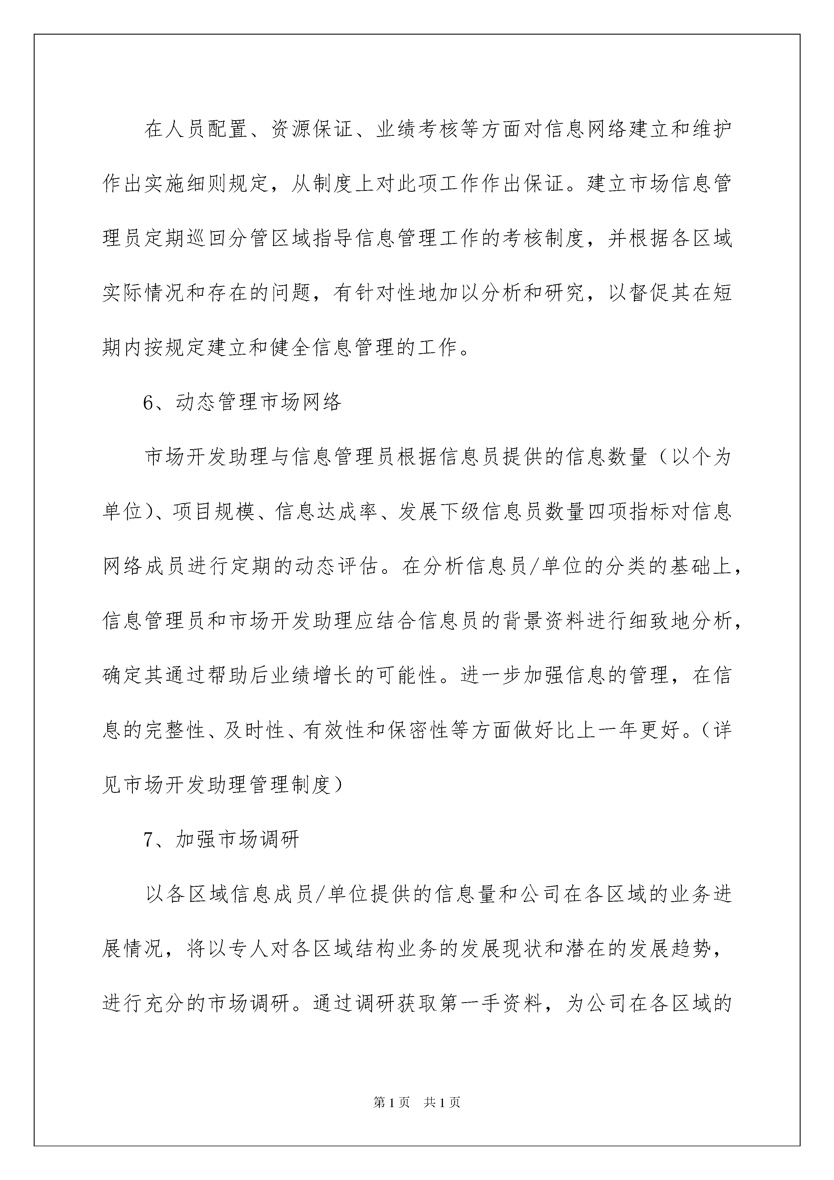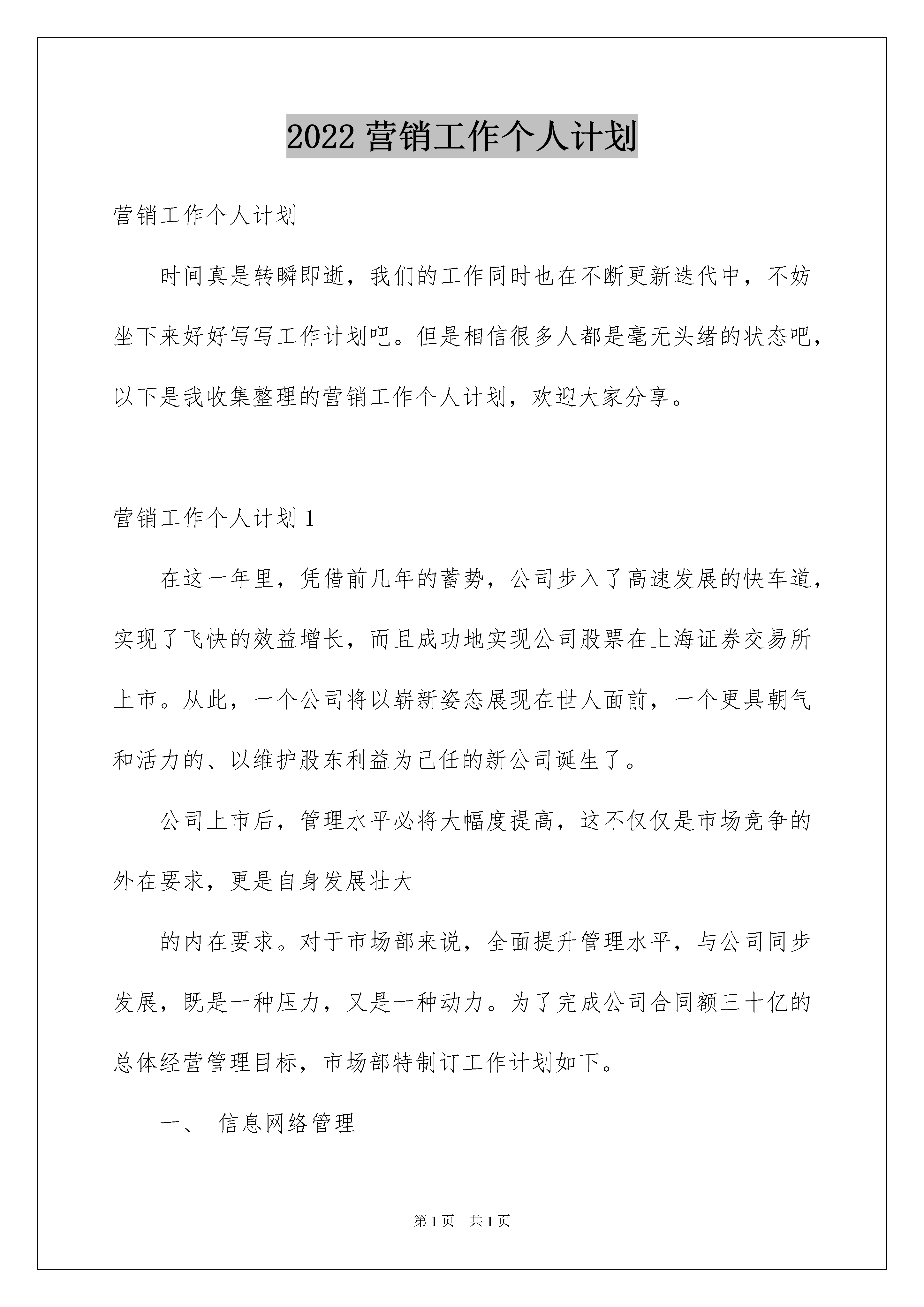 2022营销工作个人计划营销工作个人计划时间真是转瞬即逝,我们的工作同时也在不断更新迭代中,不妨坐下来好好写写工作计划吧。但是相信很多人都是毫无头绪的状态吧,以下是我收集整理的营销工作个人计划,欢迎大家分享。营销工作个人计划1在这一年里,凭借前几年的蓄势,公司步入了高速发展的快车道,实现了飞快的效益增长,而且成功地实现公司股票在上海证券交易所上市。从此,一个公司将以崭新姿态展现在世人面前,一个更具朝气和活力的、以维护股东利益为己任的新公司诞生了。公司上市后,管理水平必将大幅度提高,这不仅仅是市场竞争的外在要求,更是自身发展壮大的内在要求。对于市场部来说,全面提升管理水平,与公司同步发展,既是一种压力,又是一种动力。为了完成公司合同额三十亿的总体经营管理目标,市场部特制订工作计划如下。一、信息网络管理1、建立直接领导关系市场部是负责公司信息网络建设与维护、信息收集处理工作的职能部门,接受营销副总经理的领导。市场部信息管理员与各区域市场开发助理之间是一种直接领导关系,即在信息网络建设、维护、信息处理、考核方面对市场开发助理直接进行指导和指挥,并承担信息网络工作的领导责任。2、构架新型组织机构3、增加人员配置:(1)、信息管理员:市场部设专职信息管理员3名,分管不同区域,不再兼任其它工作。(2)、市场开发助理:浙江省六个办事处共设市场开发助理两名,其它各办事处所辖区域均设市场开发助理一名。4、强化人员素质培训春节前完成对各区域的市场部信息管理员和市场开发助理的招聘和培训,使新的管理制度实施过程中市场部在人员素质方面有充分的保障。认真选择和慎重录用市场开发助理,切勿滥竽充数。5、加大人员考核力度在人员配置、资源保证、业绩考核等方面对信息网络建立和维护作出实施细则规定,从制度上对此项工作作出保证。建立市场信息管理员定期巡回分管区域指导信息管理工作的考核制度,并根据各区域实际情况和存在的问题,有针对性地加以分析和研究,以督促其在短期内按规定建立和健全信息管理的工作。6、动态管理市场网络市场开发助理与信息管理员根据信息员提供的信息数量(以个为单位)、项目规模、信息达成率、发展下级信息员数量四项指标对信息网络成员进行定期的动态评估。在分析信息员/单位的分类的基础上,信息管理员和市场开发助理应结合信息员的背景资料进行细致地分析,确定其通过帮助后业绩增长的可能性。进一步加强信息的管理,在信息的完整性、及时性、有效性和保密性等方面做好比上一年更好。(详见市场开发助理管理制度)7、加强市场调研以各区域信息成员/单位提供的信息量和公司在各区域的业务进展情况,将以专人对各区域结构业务的发展现状和潜在的发展趋势,进行充分的市场调研。通过调研获取第一手资料,为公司在各区域的机构设置各趋合理和公司在开拓新的市场方面作好参谋。二、品牌推广1、为进一步打响公司品牌,扩大公司的市场占有率,乘公司上市的东风,初步考虑四川省省会成都、陕西省省会西安、新疆维吾尔自治区首府乌鲁木齐、辽宁省会沈阳、吉林省的长春、广东省会广州、广西壮族自治区首府南宁以及上海市举办品牌推广会和研讨会,以宣传和扩大公司的品牌,扩大信息网络,创造更大市场空间,从而为实现合同翻番奠定坚实的市场基础。2、在重点或大型的工程项目竣工之际,邀请有关部门在现场举办新闻发布会,用竣工实例展示和宣传杭萧钢构品牌,展示杭萧钢构在行业中技术、业绩占据一流水平的事实,树立建筑钢结构行业中上市公司的典范作用和领导地位,使宣传工作达到事半功倍的效果。3、进一步做好广告、资料等方面的宣传工作。在各个施工现场制作和安装大型宣传条幅或广告牌,现场展示企业实力;及时制作企业新的业绩和宣传资料,补充到投标文件中的业绩介绍中和发放到商各人员手中,尽可能地提升品牌推广的深度和力度。4、加强和外界接触人员的专业知识培训和素质教育工作,树立良好的企业员工形象和先进的企业文化内涵,给每一位与杭萧钢构人员接触的人都能够留下美好而深刻的印象,从而对杭萧钢构及钢结构有更清晰和深层次的认识。三、客户接待客人接待工作仍是市场部工作的重点之一。做好客人接待工作是业务接洽的必要的提前和基础。如何按照公司有关规定和商务部要求保质保量地做好客人接待工作是市场部必须进行认真研究和探讨的重要课题。表面上看起来接待工作比较简单,但实质上客户接待是一门十分深奥的学问。不去深入地研究和探讨就不能让该项工作做得完善。因此,市场部要在方法上、步骤上、细节上下一番功夫。为了既少花钱,又不影响接待效果,需要向各商务部领导和各办事处商务人员更多地了解客人的生活阅历、为人禀性、处()事方式、兴趣爱好、饮食习惯、办事风格、企业价