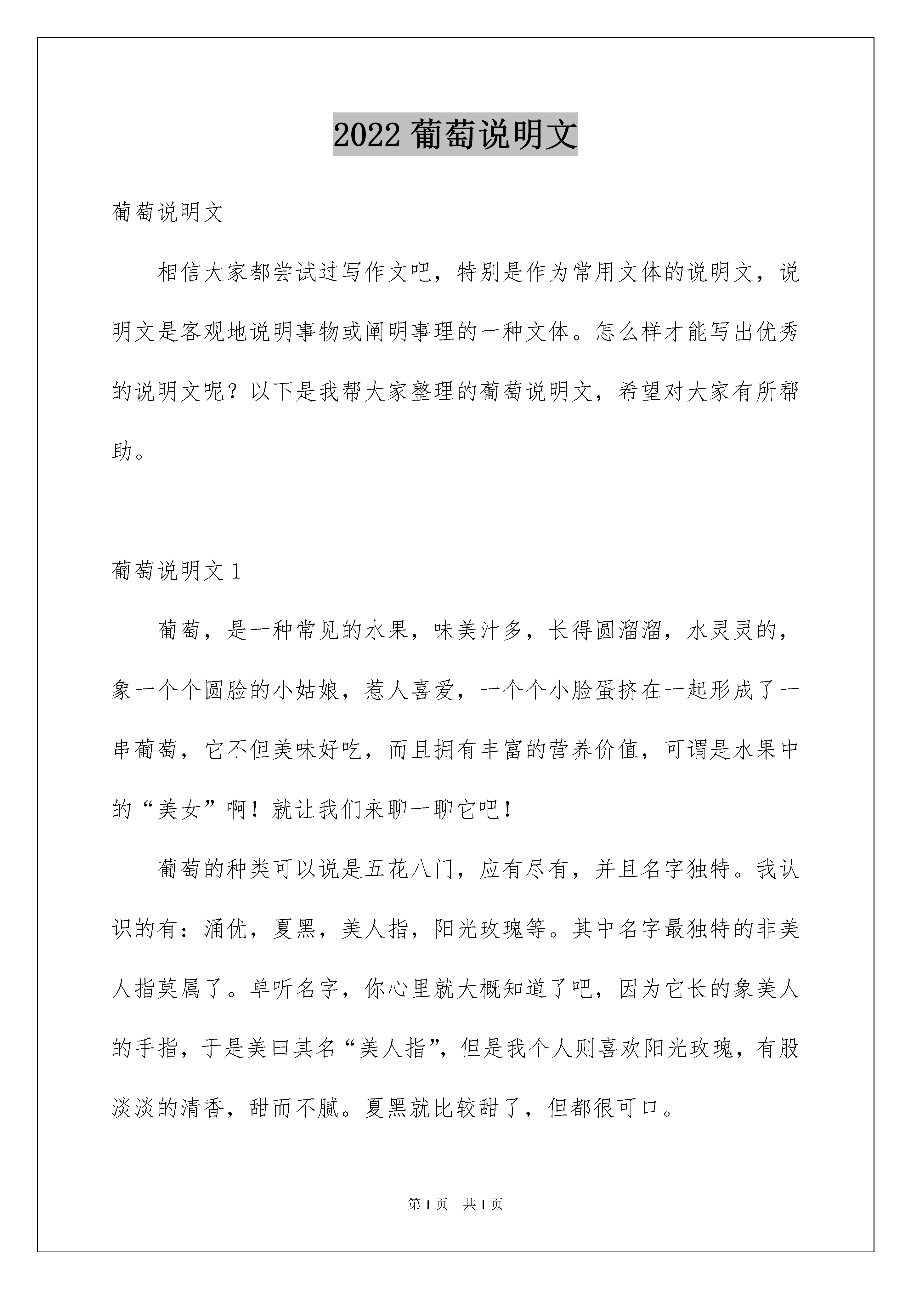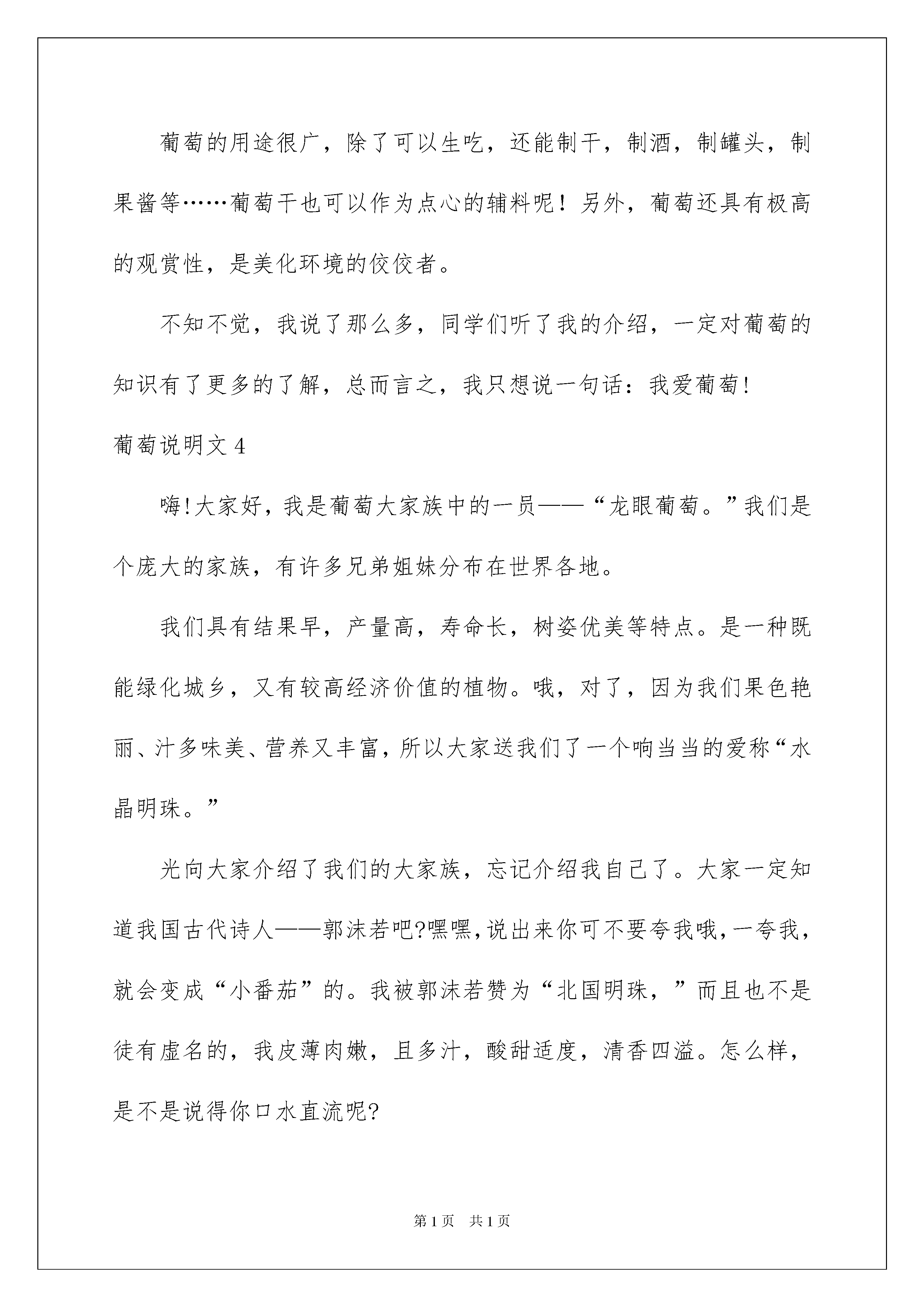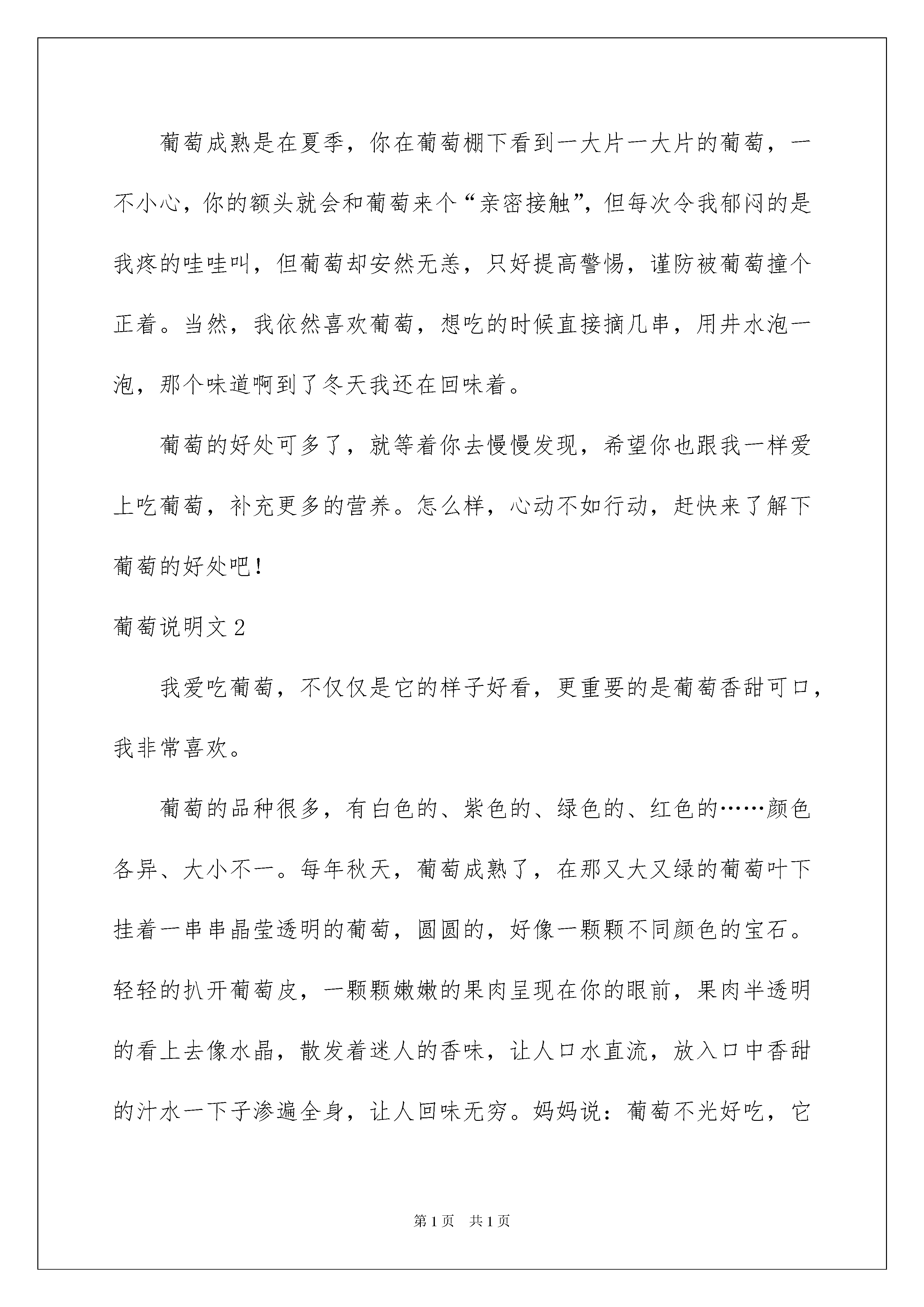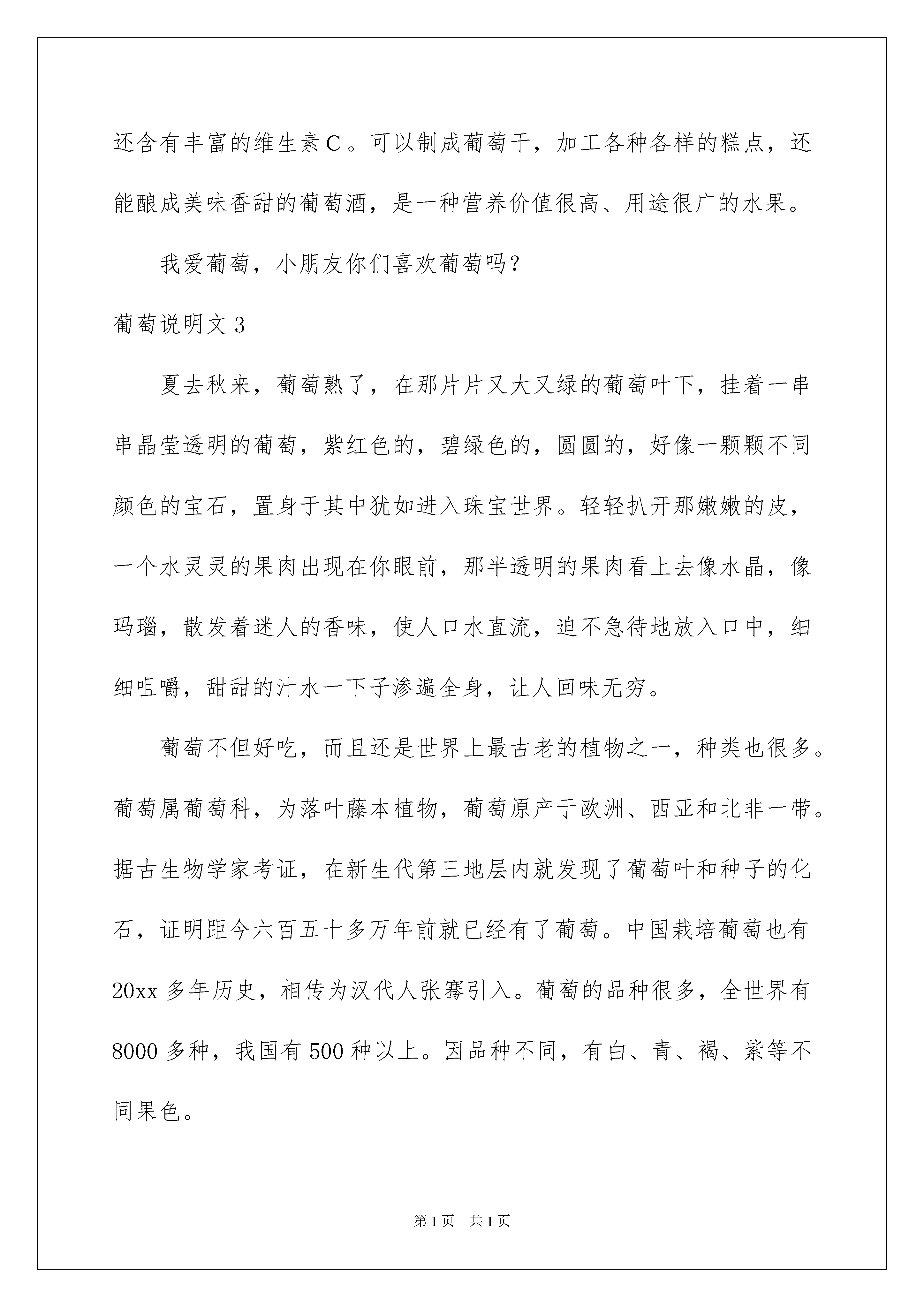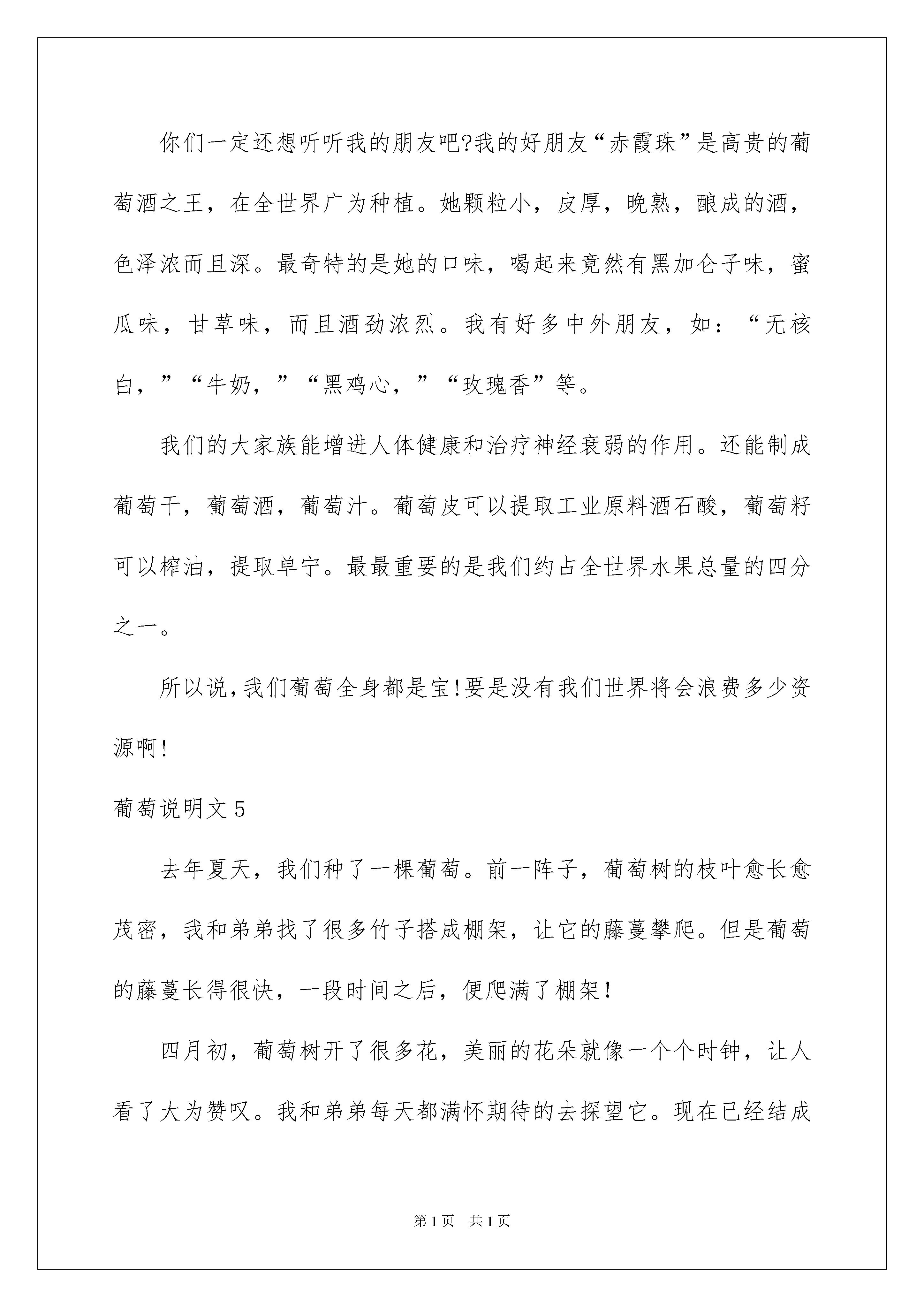 2022葡萄说明文葡萄说明文相信大家都尝试过写作文吧,特别是作为常用文体的说明文,说明文是客观地说明事物或阐明事理的一种文体。怎么样才能写出优秀的说明文呢?以下是我帮大家整理的葡萄说明文,希望对大家有所帮助。葡萄说明文1葡萄,是一种常见的水果,味美汁多,长得圆溜溜,水灵灵的,象一个个圆脸的小姑娘,惹人喜爱,一个个小脸蛋挤在一起形成了一串葡萄,它不但美味好吃,而且拥有丰富的营养价值,可谓是水果中的“美女”啊!就让我们来聊一聊它吧!葡萄的种类可以说是五花八门,应有尽有,并且名字独特。我认识的有:涌优,夏黑,美人指,阳光玫瑰等。其中名字最独特的非美人指莫属了。单听名字,你心里就大概知道了吧,因为它长的象美人的手指,于是美曰其名“美人指”,但是我个人则喜欢阳光玫瑰,有股淡淡的清香,甜而不腻。夏黑就比较甜了,但都很可口。葡萄成熟是在夏季,你在葡萄棚下看到一大片一大片的葡萄,一不小心,你的额头就会和葡萄来个“亲密接触”,但每次令我郁闷的是我疼的哇哇叫,但葡萄却安然无恙,只好提高警惕,谨防被葡萄撞个正着。当然,我依然喜欢葡萄,想吃的时候直接摘几串,用井水泡一泡,那个味道啊到了冬天我还在回味着。葡萄的好处可多了,就等着你去慢慢发现,希望你也跟我一样爱上吃葡萄,补充更多的营养。怎么样,心动不如行动,赶快来了解下葡萄的好处吧!葡萄说明文2我爱吃葡萄,不仅仅是它的样子好看,更重要的是葡萄香甜可口,我非常喜欢。葡萄的品种很多,有白色的、紫色的、绿色的、红色的……颜色各异、大小不一。每年秋天,葡萄成熟了,在那又大又绿的葡萄叶下挂着一串串晶莹透明的葡萄,圆圆的,好像一颗颗不同颜色的宝石。轻轻的扒开葡萄皮,一颗颗嫩嫩的果肉呈现在你的眼前,果肉半透明的看上去像水晶,散发着迷人的香味,让人口水直流,放入口中香甜的汁水一下子渗遍全身,让人回味无穷。妈妈说:葡萄不光好吃,它还含有丰富的维生素C。可以制成葡萄干,加工各种各样的糕点,还能酿成美味香甜的葡萄酒,是一种营养价值很高、用途很广的水果。我爱葡萄,小朋友你们喜欢葡萄吗?葡萄说明文3夏去秋来,葡萄熟了,在那片片又大又绿的葡萄叶下,挂着一串串晶莹透明的葡萄,紫红色的,碧绿色的,圆圆的,好像一颗颗不同颜色的宝石,置身于其中犹如进入珠宝世界。轻轻扒开那嫩嫩的皮,一个水灵灵的果肉出现在你眼前,那半透明的果肉看上去像水晶,像玛瑙,散发着迷人的香味,使人口水直流,迫不急待地放入口中,细细咀嚼,甜甜的汁水一下子渗遍全身,让人回味无穷。葡萄不但好吃,而且还是世界上最古老的植物之一,种类也很多。葡萄属葡萄科,为落叶藤本植物,葡萄原产于欧洲、西亚和北非一带。据古生物学家考证,在新生代第三地层内就发现了葡萄叶和种子的化石,证明距今六百五十多万年前就已经有了葡萄。中国栽培葡萄也有20xx多年历史,相传为汉代人张骞引入。葡萄的品种很多,全世界有8000多种,我国有500种以上。因品种不同,有白、青、褐、紫等不同果色。葡萄的用途很广,除了可以生吃,还能制干,制酒,制罐头,制果酱等……葡萄干也可以作为点心的辅料呢!另外,葡萄还具有极高的观赏性,是美化环境的佼佼者。不知不觉,我说了那么多,同学们听了我的介绍,一定对葡萄的知识有了更多的了解,总而言之,我只想说一句话:我爱葡萄!葡萄说明文4嗨!大家好,我是葡萄大家族中的一员——“龙眼葡萄。”我们是个庞大的家族,有许多兄弟姐妹分布在世界各地。我们具有结果早,产量高,寿命长,树姿优美等特点。是一种既能绿化城乡,又有较高经济价值的植物。哦,对了,因为我们果色艳丽、汁多味美、营养又丰富,所以大家送我们了一个响当当的爱称“水晶明珠。”光向大家介绍了我们的大家族,忘记介绍我自己了。大家一定知道我国古代诗人——郭沫若吧?嘿嘿,说出来你可不要夸我哦,一夸我,就会变成“小番茄”的。我被郭沫若赞为“北国明珠,”而且也不是徒有虚名的,我皮薄肉嫩,且多汁,酸甜适度,清香四溢。怎么样,是不是说得你口水直流呢?你们一定还想听听我的朋友吧?我的好朋友“赤霞珠”是高贵的葡萄酒之王,在全世界广为种植。她颗粒小,皮厚,晚熟,酿成的酒,色泽浓而且深。最奇特的是她的口味,喝起来竟然有黑加仑子味,蜜瓜味,甘草味,而且酒劲浓烈。我有好多中外朋友,如:“无核白,”“牛奶,”“黑鸡心,”“玫瑰香”等。我们的大家族能增进人体健康和治疗神经衰弱的作用。还能制成葡萄干,葡萄酒,葡萄汁。葡萄皮可以提取工业原料酒石酸,葡萄籽可以榨油,提取单宁。最最重要的是我们约占全世界水果总量的四分之一。所以说,我们葡萄全身都是宝!要是没有我们世界将会浪费多少资源啊!葡萄说明文5去年夏天,我们种了一棵葡萄。前一阵子