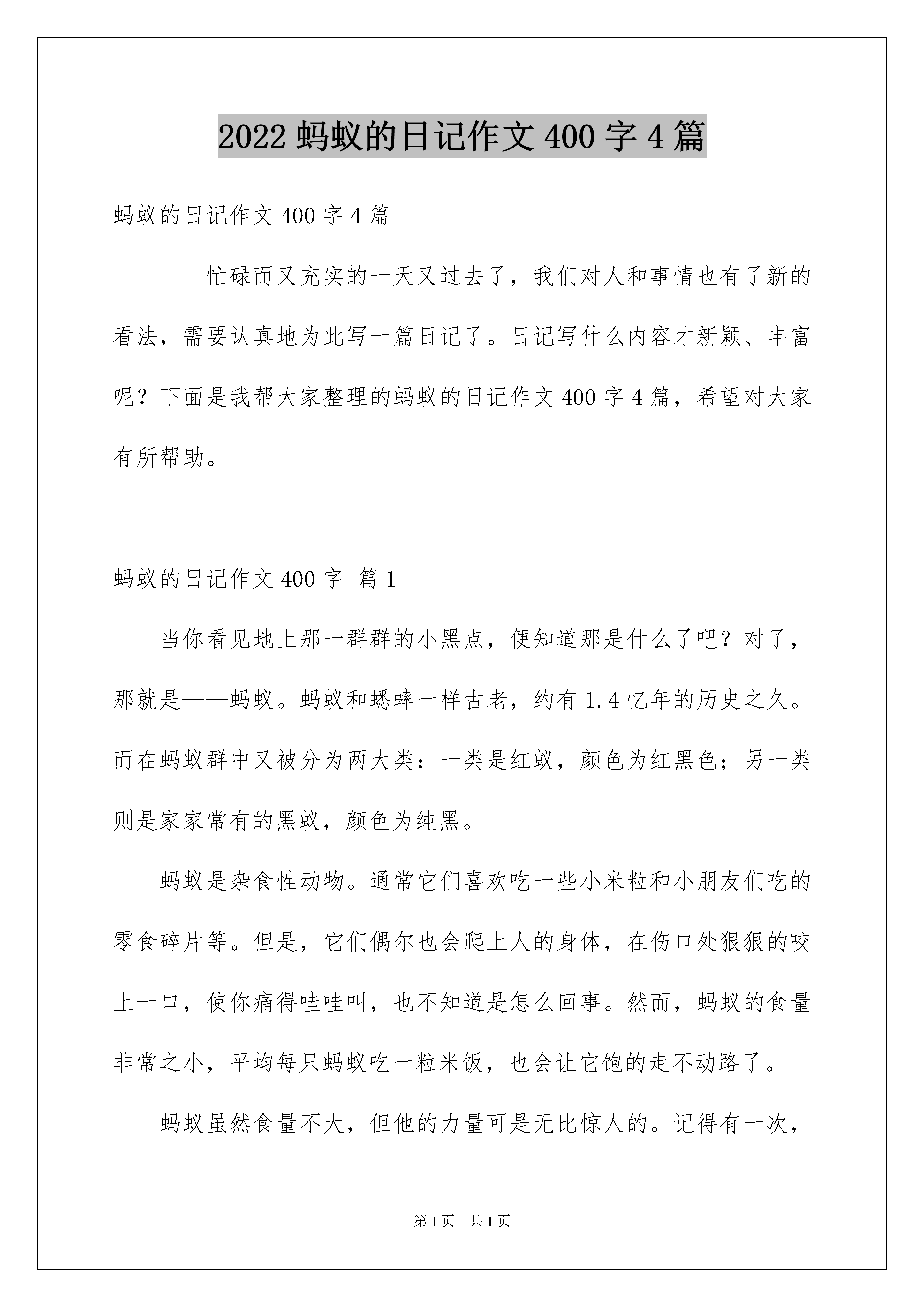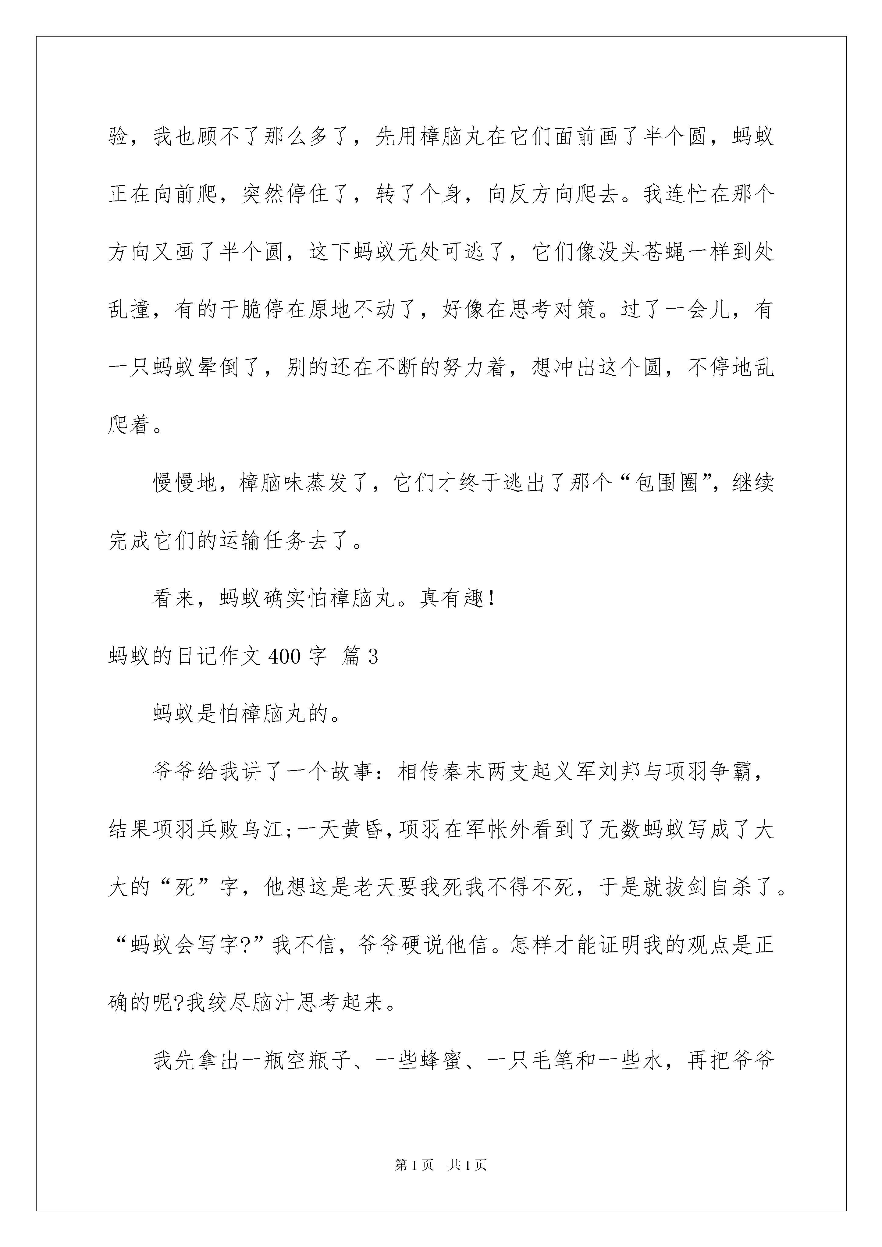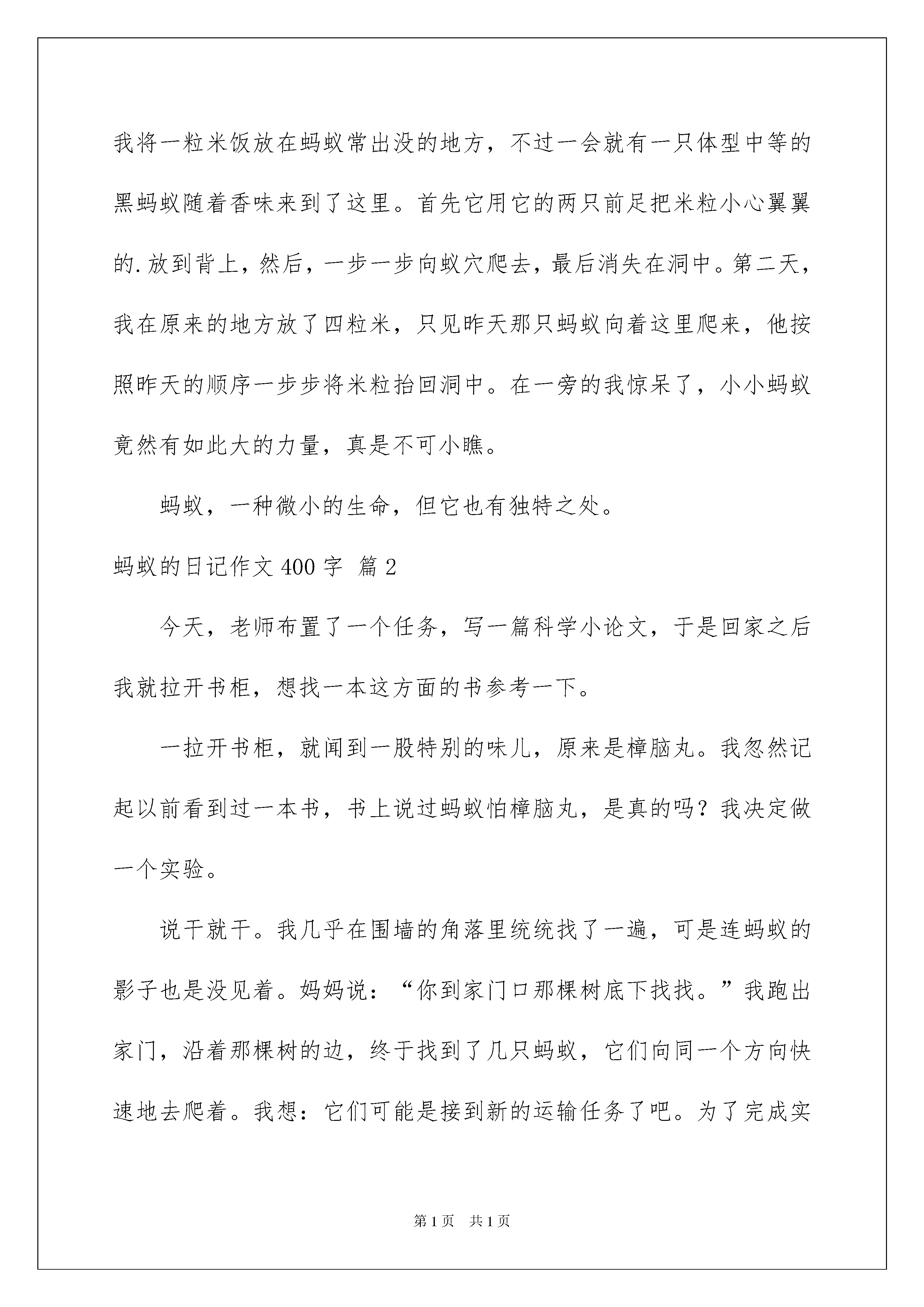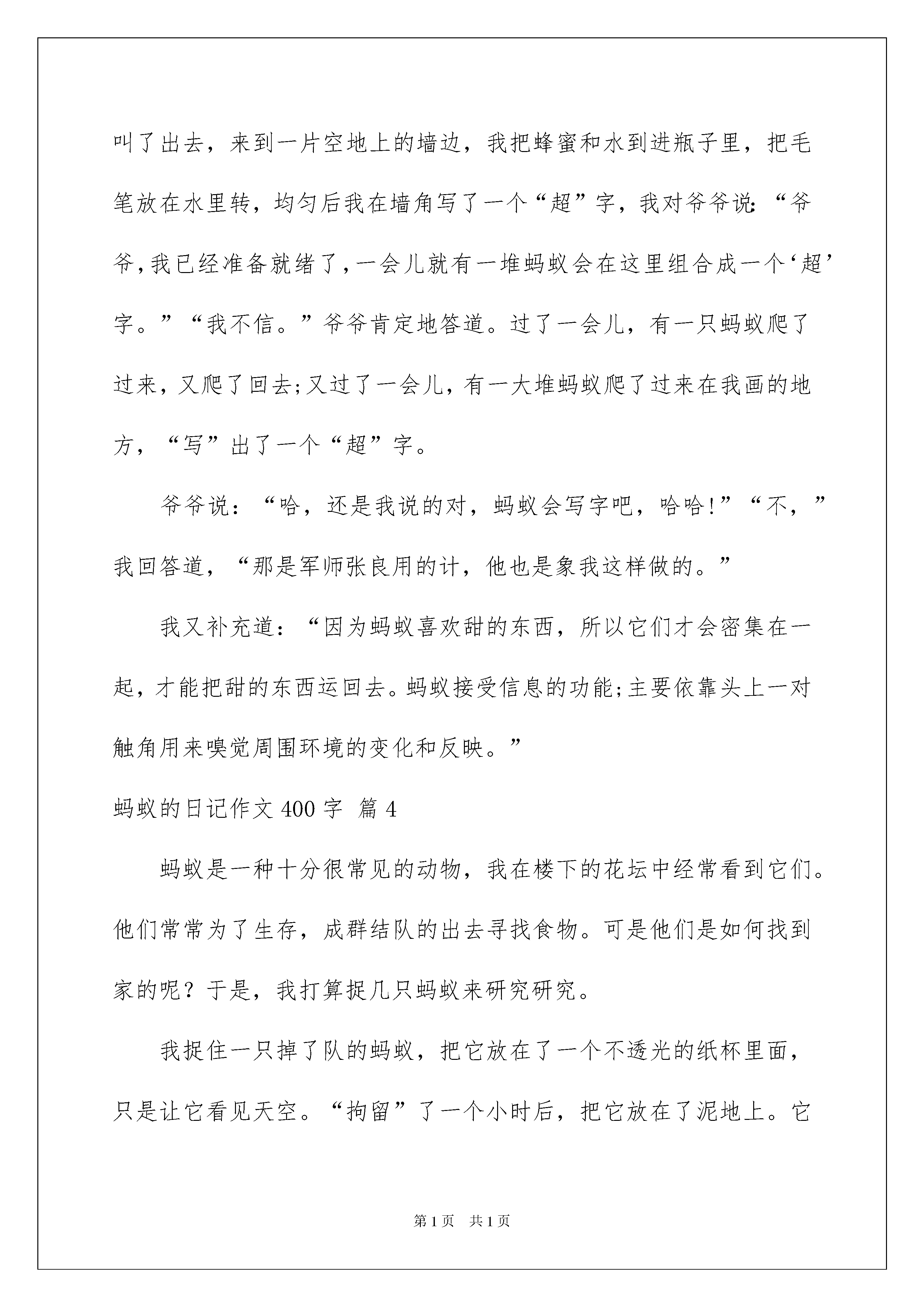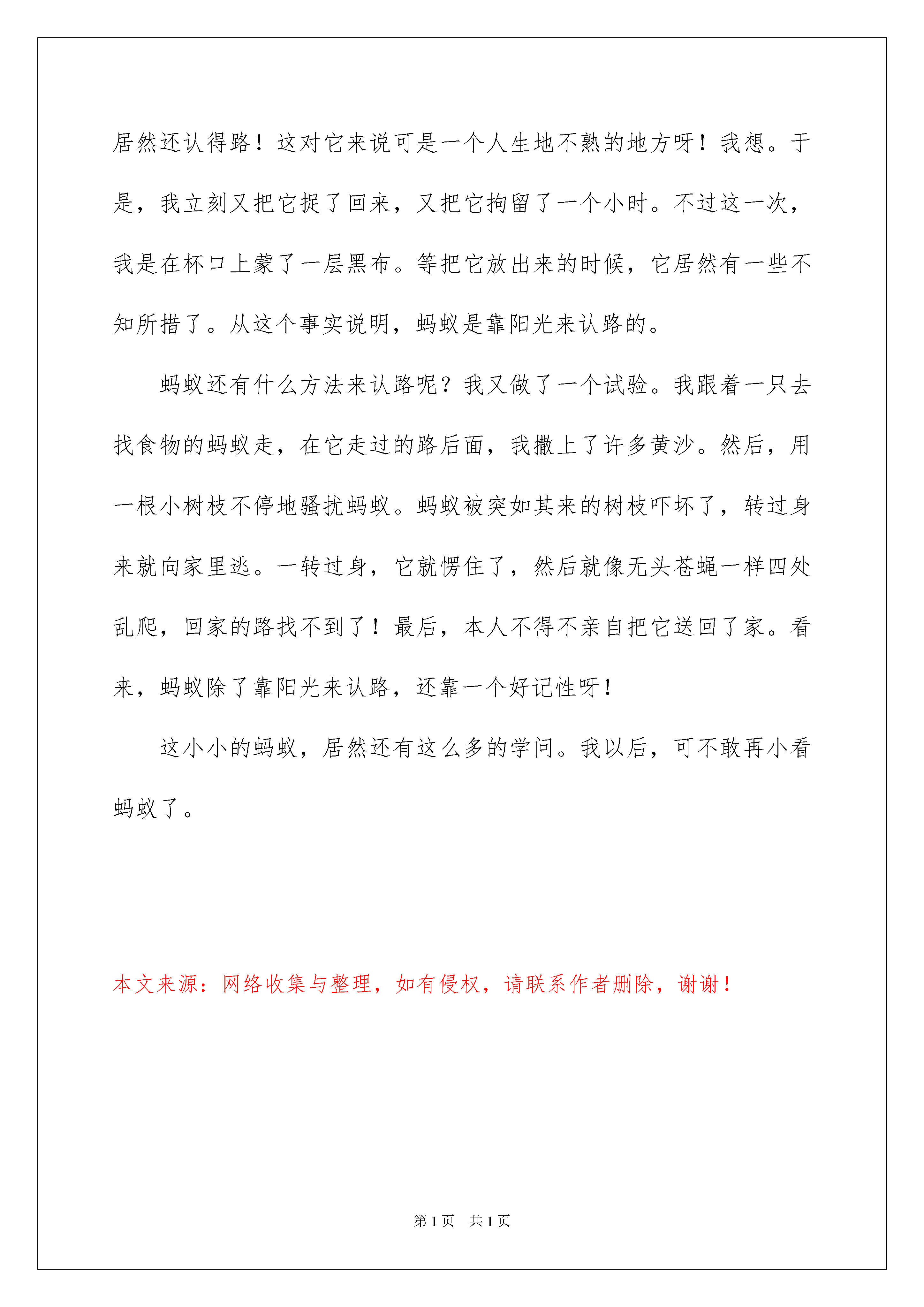 2022蚂蚁的日记作文400字4篇蚂蚁的日记作文400字4篇忙碌而又充实的一天又过去了,我们对人和事情也有了新的看法,需要认真地为此写一篇日记了。日记写什么内容才新颖、丰富呢?下面是我帮大家整理的蚂蚁的日记作文400字4篇,希望对大家有所帮助。蚂蚁的日记作文400字篇1当你看见地上那一群群的小黑点,便知道那是什么了吧?对了,那就是——蚂蚁。蚂蚁和蟋蟀一样古老,约有1.4忆年的历史之久。而在蚂蚁群中又被分为两大类:一类是红蚁,颜色为红黑色;另一类则是家家常有的黑蚁,颜色为纯黑。蚂蚁是杂食性动物。通常它们喜欢吃一些小米粒和小朋友们吃的零食碎片等。但是,它们偶尔也会爬上人的身体,在伤口处狠狠的咬上一口,使你痛得哇哇叫,也不知道是怎么回事。然而,蚂蚁的食量非常之小,平均每只蚂蚁吃一粒米饭,也会让它饱的走不动路了。蚂蚁虽然食量不大,但他的力量可是无比惊人的。记得有一次,我将一粒米饭放在蚂蚁常出没的地方,不过一会就有一只体型中等的黑蚂蚁随着香味来到了这里。首先它用它的两只前足把米粒小心翼翼的.放到背上,然后,一步一步向蚁穴爬去,最后消失在洞中。第二天,我在原来的地方放了四粒米,只见昨天那只蚂蚁向着这里爬来,他按照昨天的顺序一步步将米粒抬回洞中。在一旁的我惊呆了,小小蚂蚁竟然有如此大的力量,真是不可小瞧。蚂蚁,一种微小的生命,但它也有独特之处。蚂蚁的日记作文400字篇2今天,老师布置了一个任务,写一篇科学小论文,于是回家之后我就拉开书柜,想找一本这方面的书参考一下。一拉开书柜,就闻到一股特别的味儿,原来是樟脑丸。我忽然记起以前看到过一本书,书上说过蚂蚁怕樟脑丸,是真的吗?我决定做一个实验。说干就干。我几乎在围墙的角落里统统找了一遍,可是连蚂蚁的影子也是没见着。妈妈说:“你到家门口那棵树底下找找。”我跑出家门,沿着那棵树的边,终于找到了几只蚂蚁,它们向同一个方向快速地去爬着。我想:它们可能是接到新的运输任务了吧。为了完成实验,我也顾不了那么多了,先用樟脑丸在它们面前画了半个圆,蚂蚁正在向前爬,突然停住了,转了个身,向反方向爬去。我连忙在那个方向又画了半个圆,这下蚂蚁无处可逃了,它们像没头苍蝇一样到处乱撞,有的干脆停在原地不动了,好像在思考对策。过了一会儿,有一只蚂蚁晕倒了,别的还在不断的努力着,想冲出这个圆,不停地乱爬着。慢慢地,樟脑味蒸发了,它们才终于逃出了那个“包围圈”,继续完成它们的运输任务去了。看来,蚂蚁确实怕樟脑丸。真有趣!蚂蚁的日记作文400字篇3蚂蚁是怕樟脑丸的。爷爷给我讲了一个故事:相传秦末两支起义军刘邦与项羽争霸,结果项羽兵败乌江;一天黄昏,项羽在军帐外看到了无数蚂蚁写成了大大的“死”字,他想这是老天要我死我不得不死,于是就拔剑自杀了。“蚂蚁会写字?”我不信,爷爷硬说他信。怎样才能证明我的观点是正确的呢?我绞尽脑汁思考起来。我先拿出一瓶空瓶子、一些蜂蜜、一只毛笔和一些水,再把爷爷叫了出去,来到一片空地上的墙边,我把蜂蜜和水到进瓶子里,把毛笔放在水里转,均匀后我在墙角写了一个“超”字,我对爷爷说:“爷爷,我已经准备就绪了,一会儿就有一堆蚂蚁会在这里组合成一个‘超’字。”“我不信。”爷爷肯定地答道。过了一会儿,有一只蚂蚁爬了过来,又爬了回去;又过了一会儿,有一大堆蚂蚁爬了过来在我画的地方,“写”出了一个“超”字。爷爷说:“哈,还是我说的对,蚂蚁会写字吧,哈哈!”“不,”我回答道,“那是军师张良用的计,他也是象我这样做的。”我又补充道:“因为蚂蚁喜欢甜的东西,所以它们才会密集在一起,才能把甜的东西运回去。蚂蚁接受信息的功能;主要依靠头上一对触角用来嗅觉周围环境的变化和反映。”蚂蚁的日记作文400字篇4蚂蚁是一种十分很常见的动物,我在楼下的花坛中经常看到它们。他们常常为了生存,成群结队的出去寻找食物。可是他们是如何找到家的呢?于是,我打算捉几只蚂蚁来研究研究。我捉住一只掉了队的蚂蚁,把它放在了一个不透光的纸杯里面,只是让它看见天空。“拘留”了一个小时后,把它放在了泥地上。它居然还认得路!这对它来说可是一个人生地不熟的地方呀!我想。于是,我立刻又把它捉了回来,又把它拘留了一个小时。不过这一次,我是在杯口上蒙了一层黑布。等把它放出来的时候,它居然有一些不知所措了。从这个事实说明,蚂蚁是靠阳光来认路的。蚂蚁还有什么方法来认路呢?我又做了一个试验。我跟着一只去找食物的蚂蚁走,在它走过的路后面,我撒上了许多黄沙。然后,用一根小树枝不停地骚扰蚂蚁。蚂蚁被突如其来的树枝吓坏了,转过身来就向家里逃。一转过身,它就愣住了,然后就像无头苍蝇一样四处乱爬,回家的路找不到了!最后,本人不得不亲自把它送