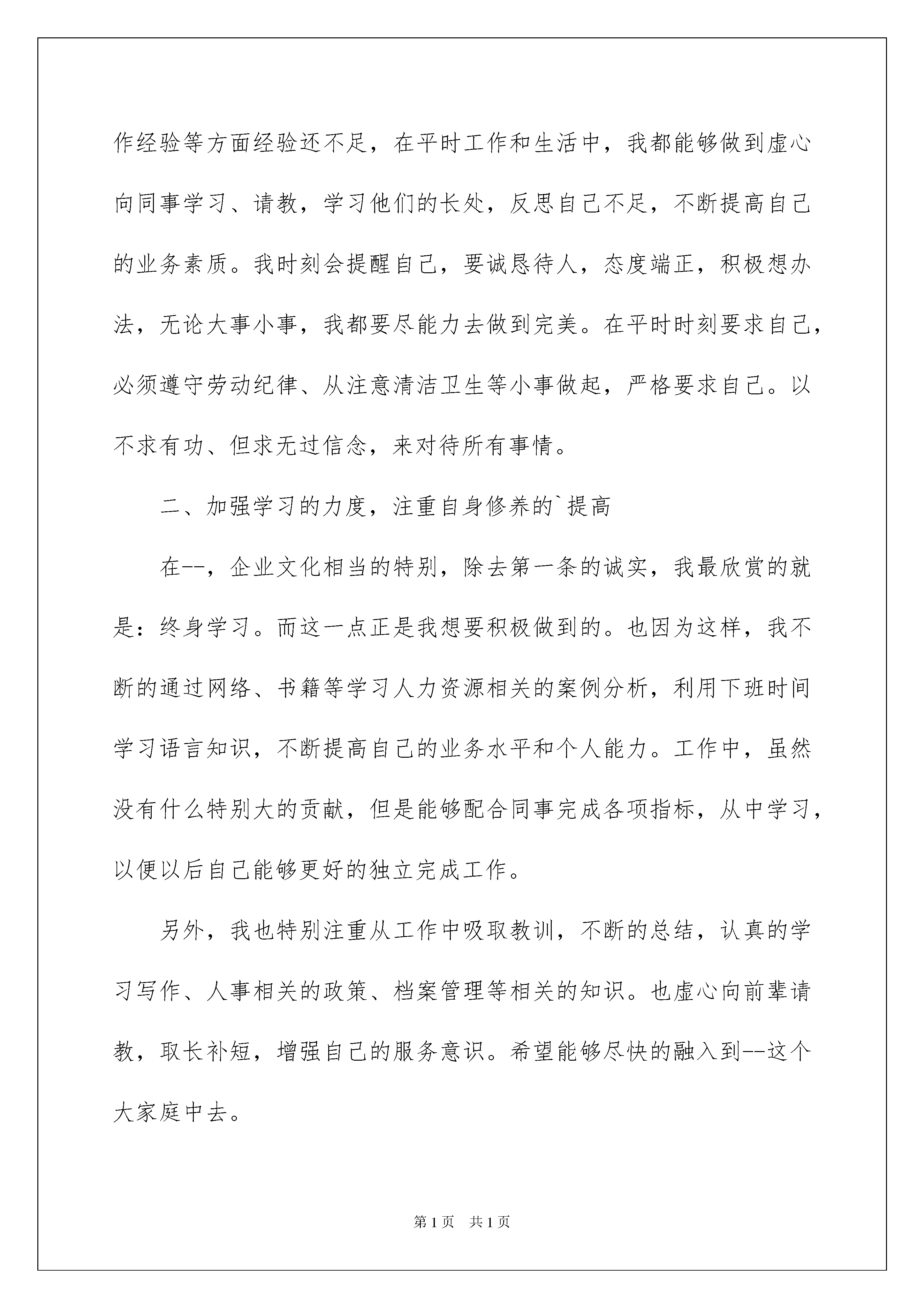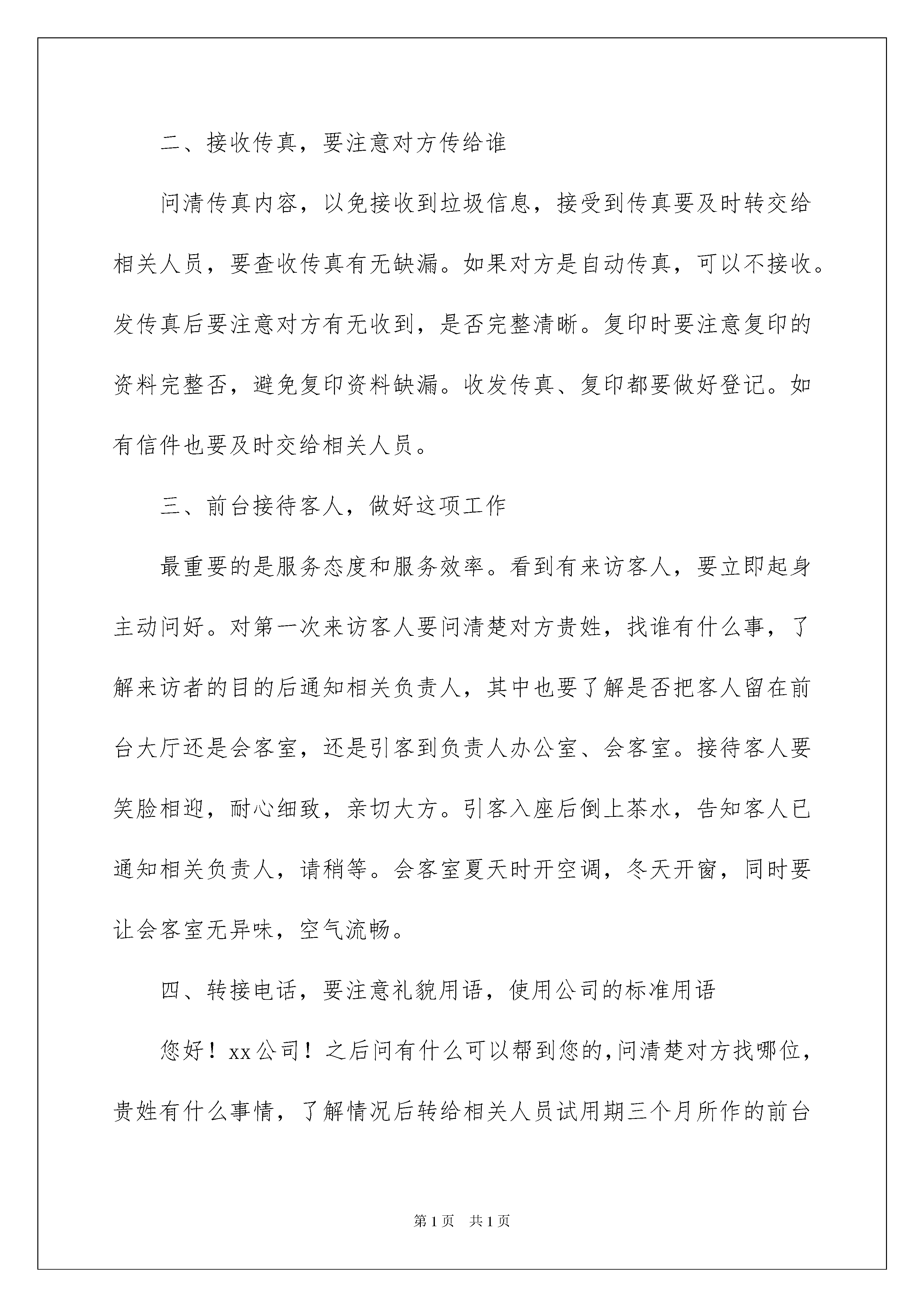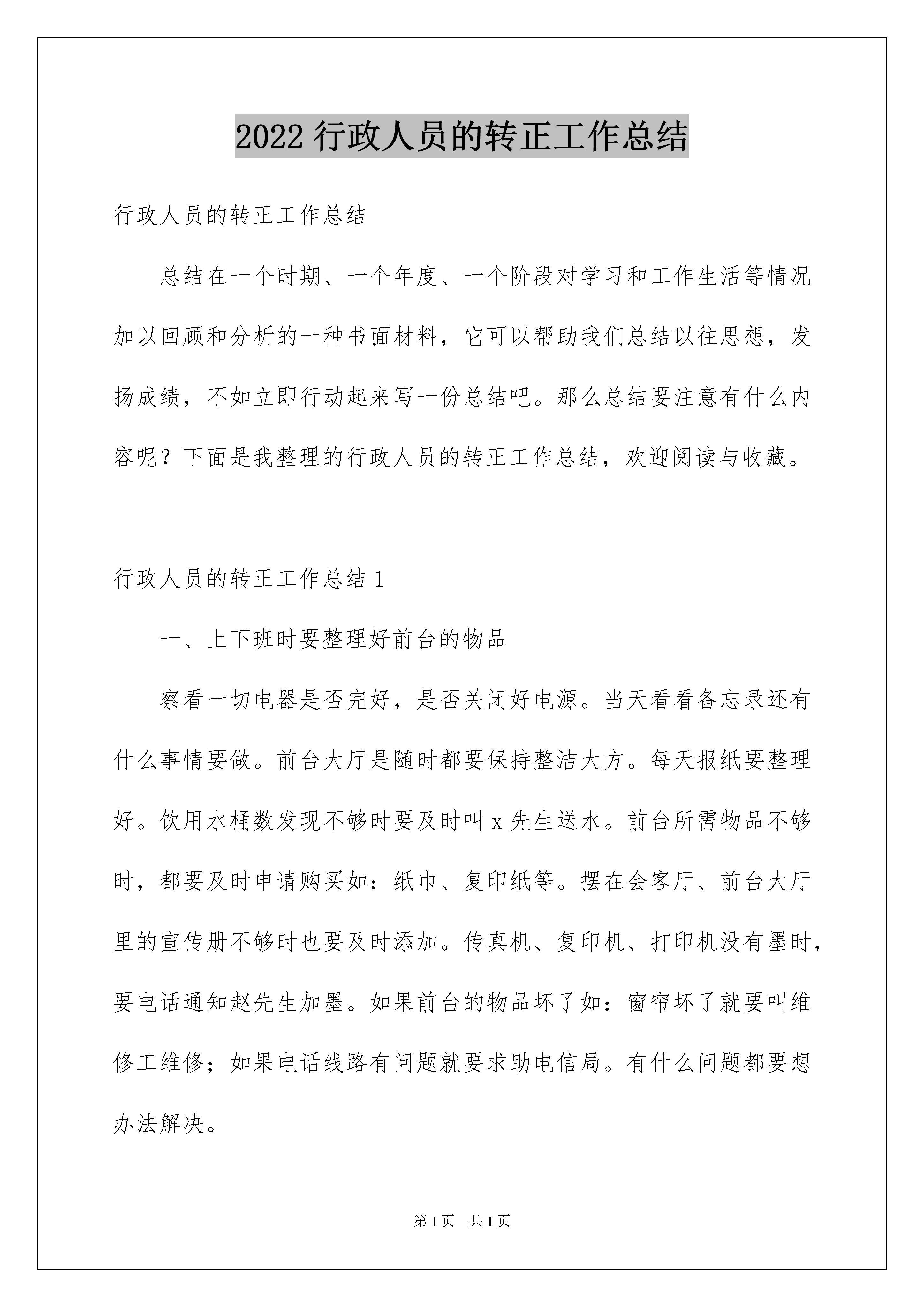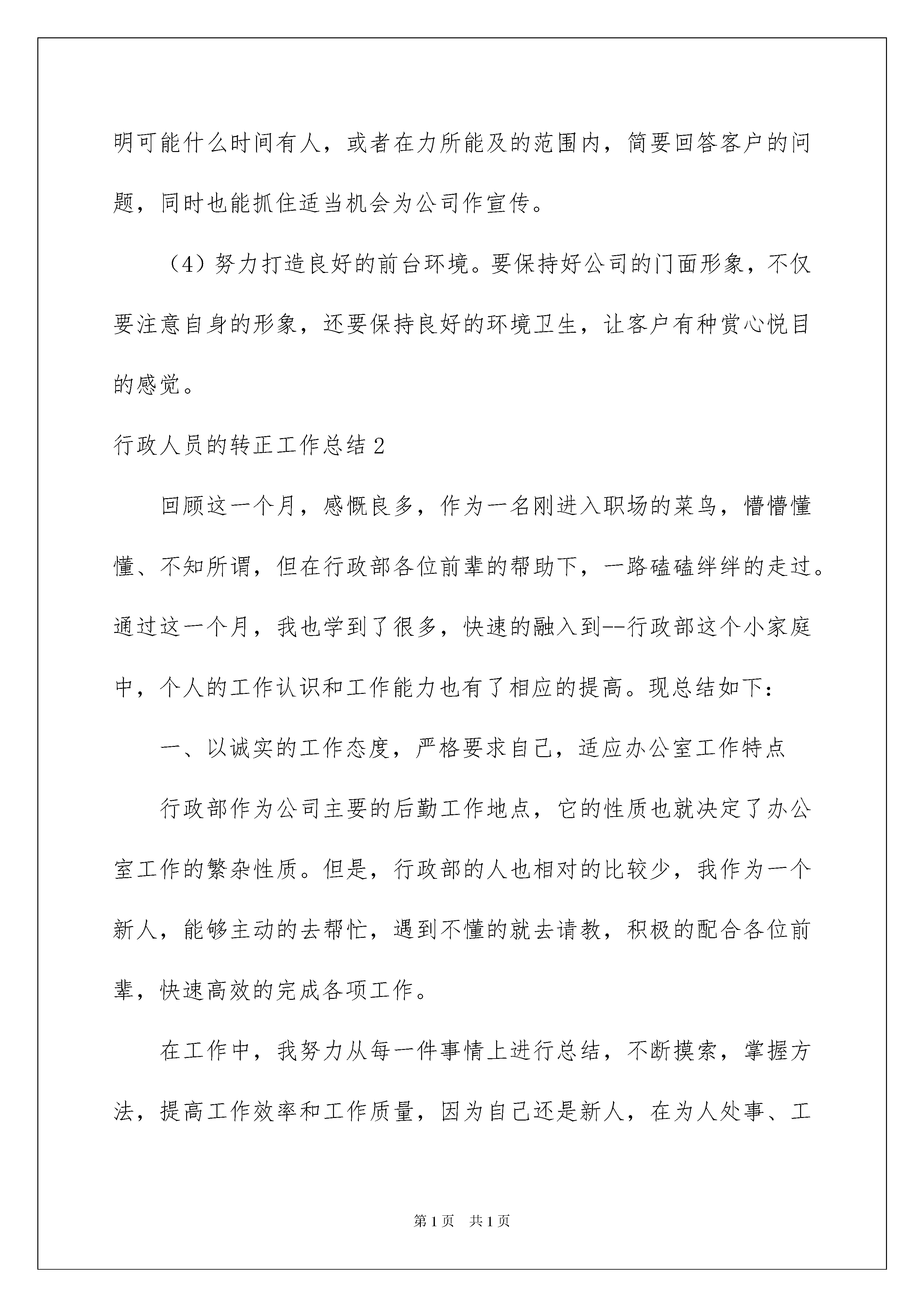 2022行政人员的转正工作总结行政人员的转正工作总结总结在一个时期、一个年度、一个阶段对学习和工作生活等情况加以回顾和分析的一种书面材料,它可以帮助我们总结以往思想,发扬成绩,不如立即行动起来写一份总结吧。那么总结要注意有什么内容呢?下面是我整理的行政人员的转正工作总结,欢迎阅读与收藏。行政人员的转正工作总结1一、上下班时要整理好前台的物品察看一切电器是否完好,是否关闭好电源。当天看看备忘录还有什么事情要做。前台大厅是随时都要保持整洁大方。每天报纸要整理好。饮用水桶数发现不够时要及时叫x先生送水。前台所需物品不够时,都要及时申请购买如:纸巾、复印纸等。摆在会客厅、前台大厅里的宣传册不够时也要及时添加。传真机、复印机、打印机没有墨时,要电话通知赵先生加墨。如果前台的物品坏了如:窗帘坏了就要叫维修工维修;如果电话线路有问题就要求助电信局。有什么问题都要想办法解决。二、接收传真,要注意对方传给谁问清传真内容,以免接收到垃圾信息,接受到传真要及时转交给相关人员,要查收传真有无缺漏。如果对方是自动传真,可以不接收。发传真后要注意对方有无收到,是否完整清晰。复印时要注意复印的资料完整否,避免复印资料缺漏。收发传真、复印都要做好登记。如有信件也要及时交给相关人员。三、前台接待客人,做好这项工作最重要的是服务态度和服务效率。看到有来访客人,要立即起身主动问好。对第一次来访客人要问清楚对方贵姓,找谁有什么事,了解来访者的目的后通知相关负责人,其中也要了解是否把客人留在前台大厅还是会客室,还是引客到负责人办公室、会客室。接待客人要笑脸相迎,耐心细致,亲切大方。引客入座后倒上茶水,告知客人已通知相关负责人,请稍等。会客室夏天时开空调,冬天开窗,同时要让会客室无异味,空气流畅。四、转接电话,要注意礼貌用语,使用公司的标准用语您好!xx公司!之后问有什么可以帮到您的,问清楚对方找哪位,贵姓有什么事情,了解情况后转给相关人员试用期三个月所作的前台工作,可能工作范围较小;工作内容也比较少。但自己也有不足的地方,工作时集中力不够,会犯迷糊;我希望以后能够更认真上班工作,勤力做事。为公司做的多些。五、在今年的工作中,我更要不断提高自身形象,工作质量、效率(1)努力提高服务质量,做事麻利,有效率,不出差错。服务态度要良好,接待客人要不断积累经验,要给客人留下良好印象。接电话时,也要不断提高用语技巧;巧妙的问答客人。尽量让每一个客户满意。(2)加强礼仪知识学习。如业余时间认真学习礼仪知识,公共关系学。了解在待人接物中必须要遵守的礼仪常识,包括坐姿、站姿、说话口气、眼神、化妆、服饰搭配,以及回答客户提问技巧等等。也可以上像美莲凯的课,讲的知识都是很实用的,上了课后会让人更自信,令一个人有气质。(3加强与公司各部门的沟通。了解公司的发展状况和各部门的工作内容,有了这些知识储备,一方面能及时准确地回答客户的问题,准确地转接电话。如果知识某个部门没人,会提醒来电方,并简要说明可能什么时间有人,或者在力所能及的范围内,简要回答客户的问题,同时也能抓住适当机会为公司作宣传。(4)努力打造良好的前台环境。要保持好公司的门面形象,不仅要注意自身的形象,还要保持良好的环境卫生,让客户有种赏心悦目的感觉。行政人员的转正工作总结2回顾这一个月,感慨良多,作为一名刚进入职场的菜鸟,懵懵懂懂、不知所谓,但在行政部各位前辈的帮助下,一路磕磕绊绊的走过。通过这一个月,我也学到了很多,快速的融入到--行政部这个小家庭中,个人的工作认识和工作能力也有了相应的提高。现总结如下:一、以诚实的工作态度,严格要求自己,适应办公室工作特点行政部作为公司主要的后勤工作地点,它的性质也就决定了办公室工作的繁杂性质。但是,行政部的人也相对的比较少,我作为一个新人,能够主动的去帮忙,遇到不懂的就去请教,积极的配合各位前辈,快速高效的完成各项工作。在工作中,我努力从每一件事情上进行总结,不断摸索,掌握方法,提高工作效率和工作质量,因为自己还是新人,在为人处事、工作经验等方面经验还不足,在平时工作和生活中,我都能够做到虚心向同事学习、请教,学习他们的长处,反思自己不足,不断提高自己的业务素质。我时刻会提醒自己,要诚恳待人,态度端正,积极想办法,无论大事小事,我都要尽能力去做到完美。在平时时刻要求自己,必须遵守劳动纪律、从注意清洁卫生等小事做起,严格要求自己。以不求有功、但求无过信念,来对待所有事情。二、加强学习的力度,注重自身修养的`提高在--,企业文化相当的特别,除去第一条的诚实,我最欣赏的就是:终身学习。而这一点正是我想要积极做到的。也因为这样,我不断的通过网