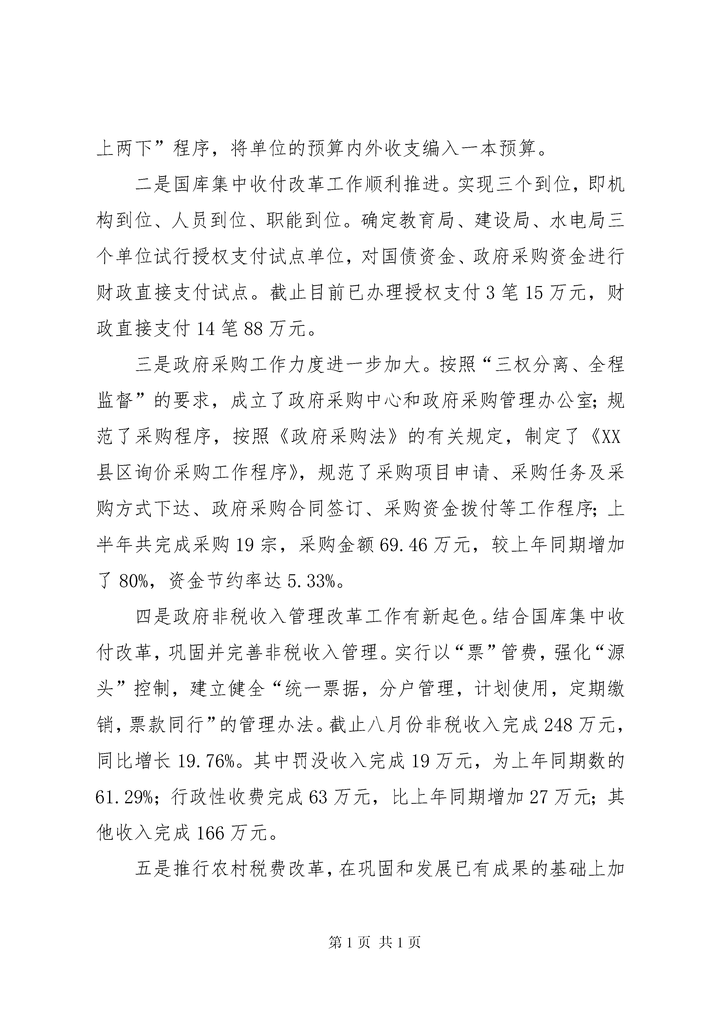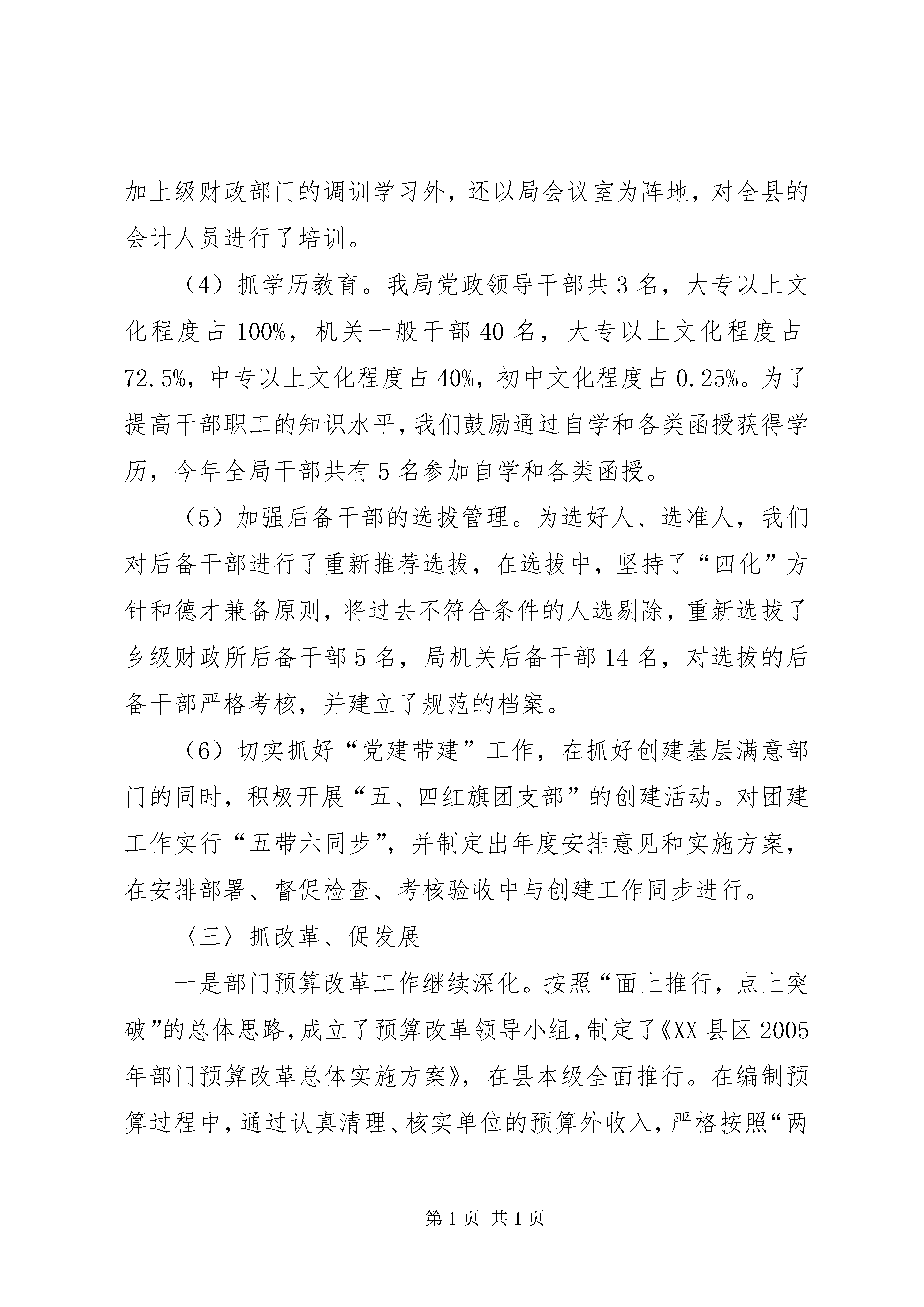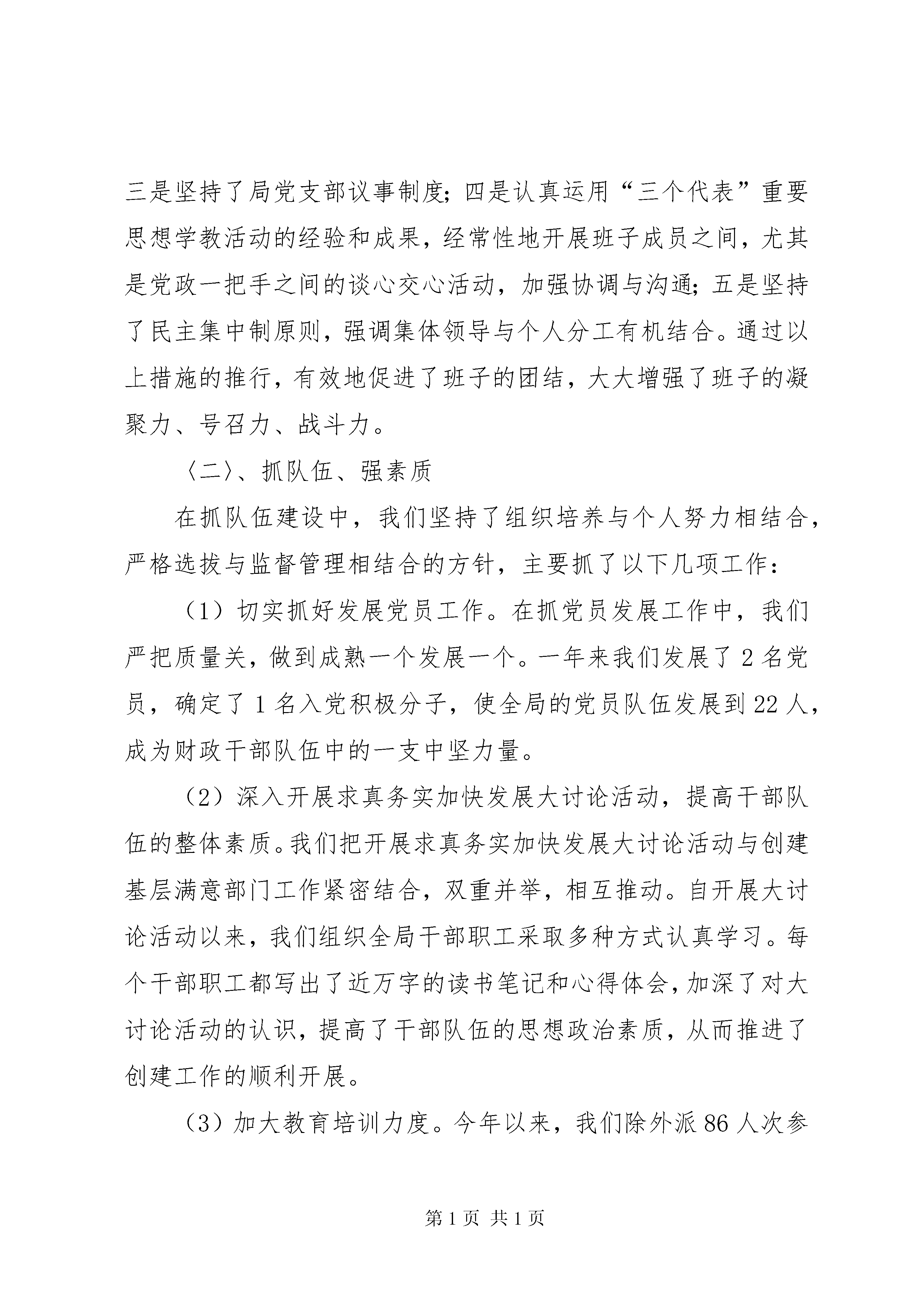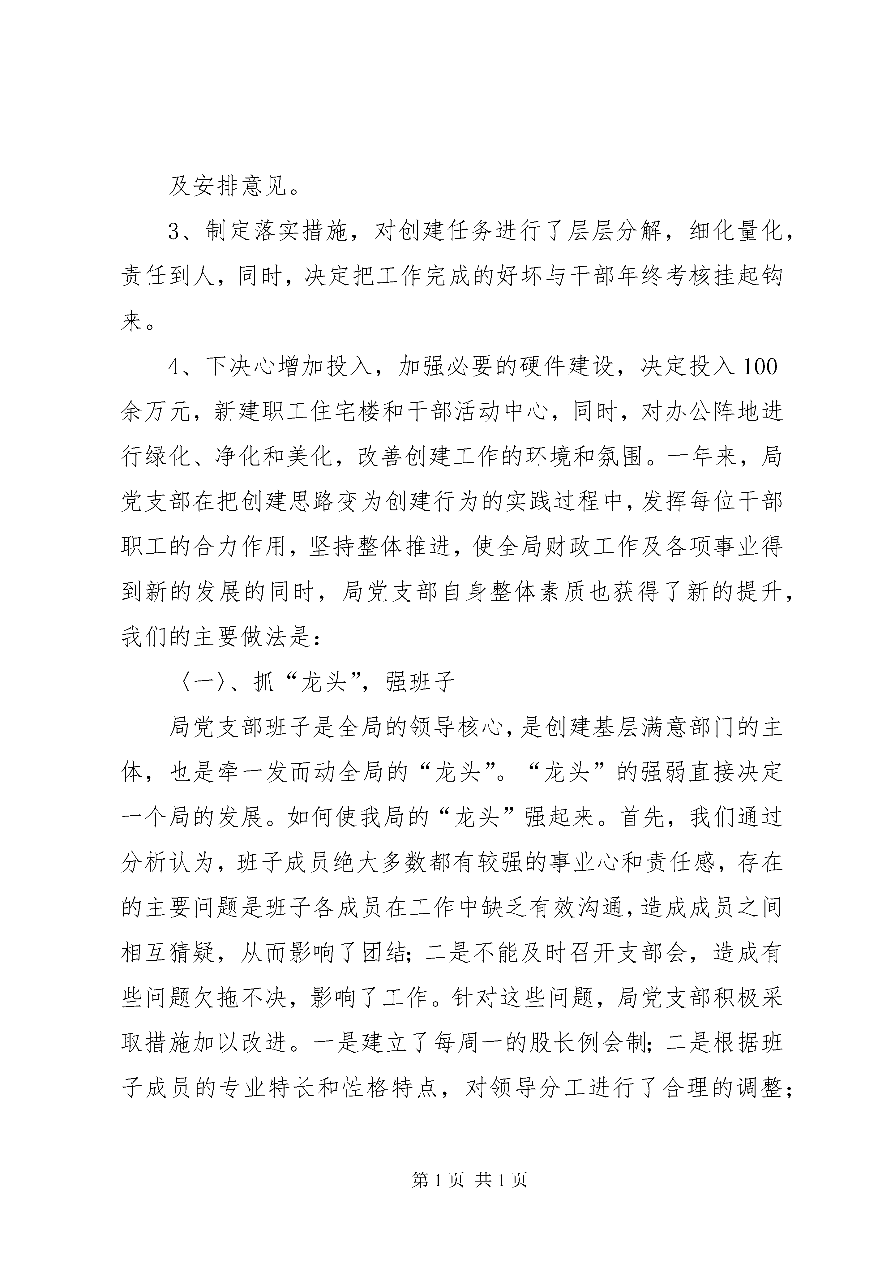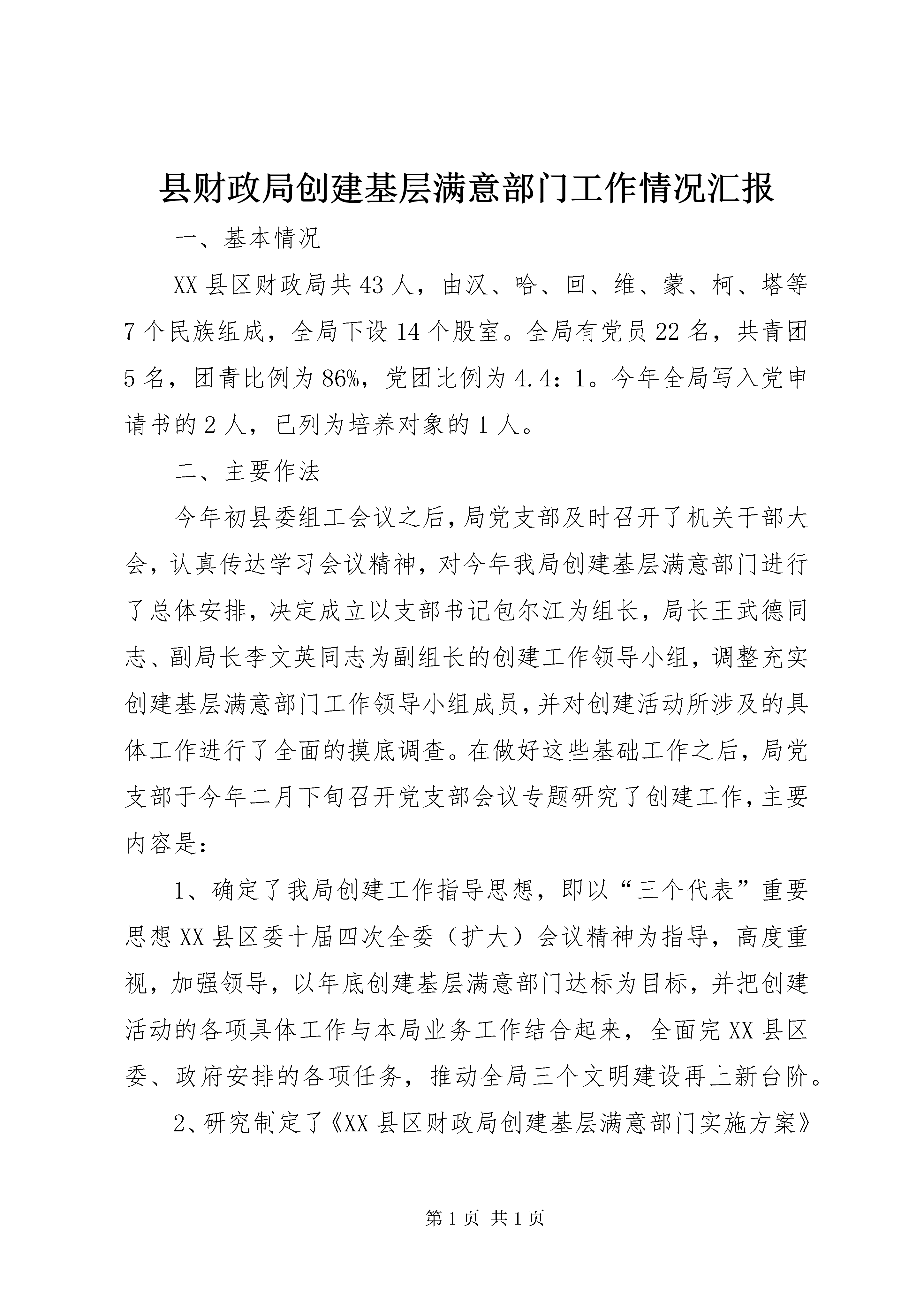 县财政局创建基层满意部门工作情况汇报一、基本情况XX县区财政局共43人,由汉、哈、回、维、蒙、柯、塔等7个民族组成,全局下设14个股室。全局有党员22名,共青团5名,团青比例为86%,党团比例为4.4:1。今年全局写入党申请书的2人,已列为培养对象的1人。二、主要作法今年初县委组工会议之后,局党支部及时召开了机关干部大会,认真传达学习会议精神,对今年我局创建基层满意部门进行了总体安排,决定成立以支部书记包尔江为组长,局长王武德同志、副局长李文英同志为副组长的创建工作领导小组,调整充实创建基层满意部门工作领导小组成员,并对创建活动所涉及的具体工作进行了全面的摸底调查。在做好这些基础工作之后,局党支部于今年二月下旬召开党支部会议专题研究了创建工作,主要内容是:1、确定了我局创建工作指导思想,即以“三个代表”重要思想XX县区委十届四次全委(扩大)会议精神为指导,高度重视,加强领导,以年底创建基层满意部门达标为目标,并把创建活动的各项具体工作与本局业务工作结合起来,全面完XX县区委、政府安排的各项任务,推动全局三个文明建设再上新台阶。2、研究制定了《XX县区财政局创建基层满意部门实施方案》及安排意见。3、制定落实措施,对创建任务进行了层层分解,细化量化,责任到人,同时,决定把工作完成的好坏与干部年终考核挂起钩来。4、下决心增加投入,加强必要的硬件建设,决定投入100余万元,新建职工住宅楼和干部活动中心,同时,对办公阵地进行绿化、净化和美化,改善创建工作的环境和氛围。一年来,局党支部在把创建思路变为创建行为的实践过程中,发挥每位干部职工的合力作用,坚持整体推进,使全局财政工作及各项事业得到新的发展的同时,局党支部自身整体素质也获得了新的提升,我们的主要做法是:〈一〉、抓“龙头”,强班子局党支部班子是全局的领导核心,是创建基层满意部门的主体,也是牵一发而动全局的“龙头”。“龙头”的强弱直接决定一个局的发展。如何使我局的“龙头”强起来。首先,我们通过分析认为,班子成员绝大多数都有较强的事业心和责任感,存在的主要问题是班子各成员在工作中缺乏有效沟通,造成成员之间相互猜疑,从而影响了团结;二是不能及时召开支部会,造成有些问题欠拖不决,影响了工作。针对这些问题,局党支部积极采取措施加以改进。一是建立了每周一的股长例会制;二是根据班子成员的专业特长和性格特点,对领导分工进行了合理的调整;三是坚持了局党支部议事制度;四是认真运用“三个代表”重要思想学教活动的经验和成果,经常性地开展班子成员之间,尤其是党政一把手之间的谈心交心活动,加强协调与沟通;五是坚持了民主集中制原则,强调集体领导与个人分工有机结合。通过以上措施的推行,有效地促进了班子的团结,大大增强了班子的凝聚力、号召力、战斗力。〈二〉、抓队伍、强素质在抓队伍建设中,我们坚持了组织培养与个人努力相结合,严格选拔与监督管理相结合的方针,主要抓了以下几项工作:(1)切实抓好发展党员工作。在抓党员发展工作中,我们严把质量关,做到成熟一个发展一个。一年来我们发展了2名党员,确定了1名入党积极分子,使全局的党员队伍发展到22人,成为财政干部队伍中的一支中坚力量。(2)深入开展求真务实加快发展大讨论活动,提高干部队伍的整体素质。我们把开展求真务实加快发展大讨论活动与创建基层满意部门工作紧密结合,双重并举,相互推动。自开展大讨论活动以来,我们组织全局干部职工采取多种方式认真学习。每个干部职工都写出了近万字的读书笔记和心得体会,加深了对大讨论活动的认识,提高了干部队伍的思想政治素质,从而推进了创建工作的顺利开展。(3)加大教育培训力度。今年以来,我们除外派86人次参加上级财政部门的调训学习外,还以局会议室为阵地,对全县的会计人员进行了培训。(4)抓学历教育。我局党政领导干部共3名,大专以上文化程度占100%,机关一般干部40名,大专以上文化程度占72.5%,中专以上文化程度占40%,初中文化程度占0.25%。为了提高干部职工的知识水平,我们鼓励通过自学和各类函授获得学历,今年全局干部共有5名参加自学和各类函授。(5)加强后备干部的选拔管理。为选好人、选准人,我们对后备干部进行了重新推荐选拔,在选拔中,坚持了“四化”方针和德才兼备原则,将过去不符合条件的人选剔除,重新选拔了乡级财政所后备干部5名,局机关后备干部14名,对选拔的后备干部严格考核,并建立了规范的档案。(6)切实抓好“党建带建”工作,在抓好创建基层满意部门的同时,积极开展“五、四红旗团支部”的创建活动。对团建工作实行“五带六同步”,并制定出年度安排意见和实施方案,在安排部署、督促检查、考核验收中与创建工作同步进行。〈三〉抓改革、促发展一是部门预算改革工作继续深化。按照“面上推行,点上突破”的总体思路,成立了预算改革领导小组,制