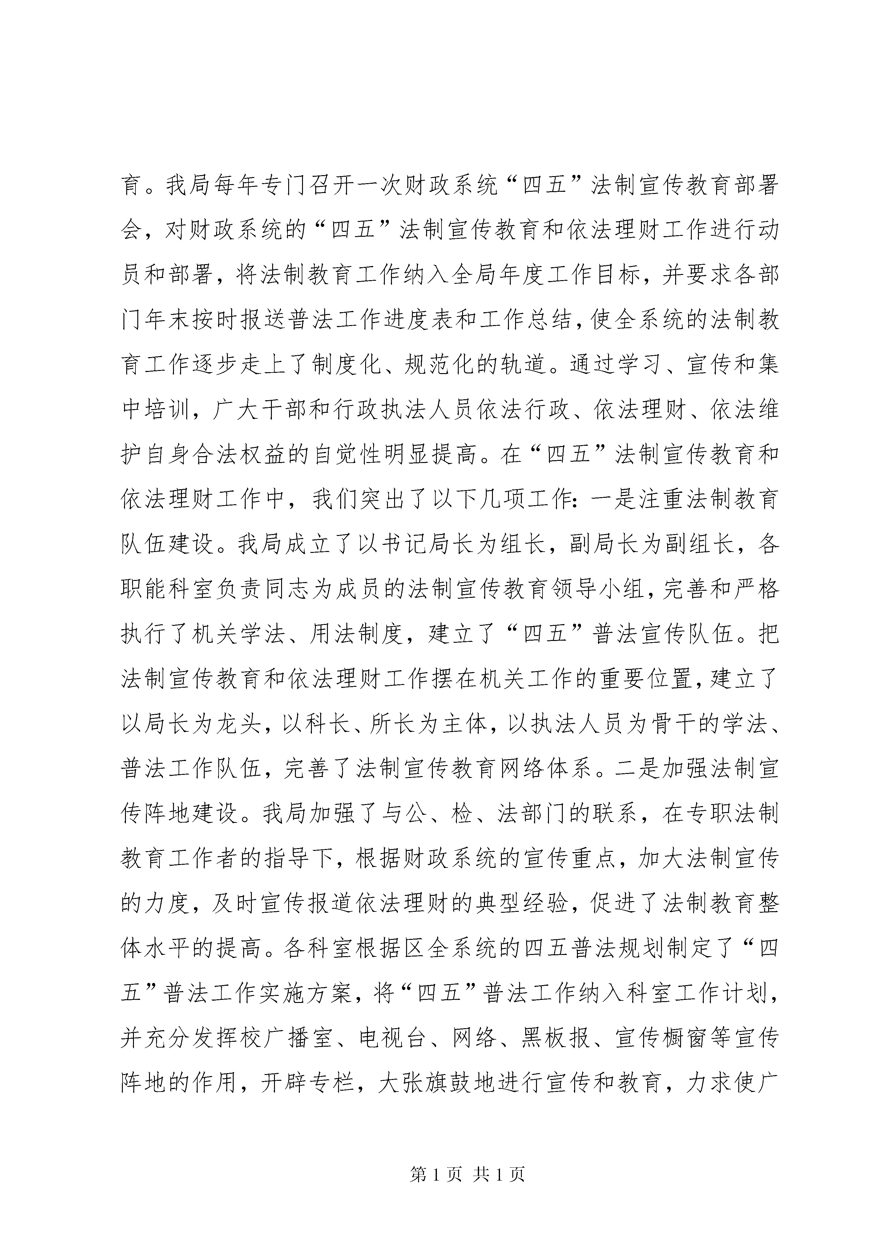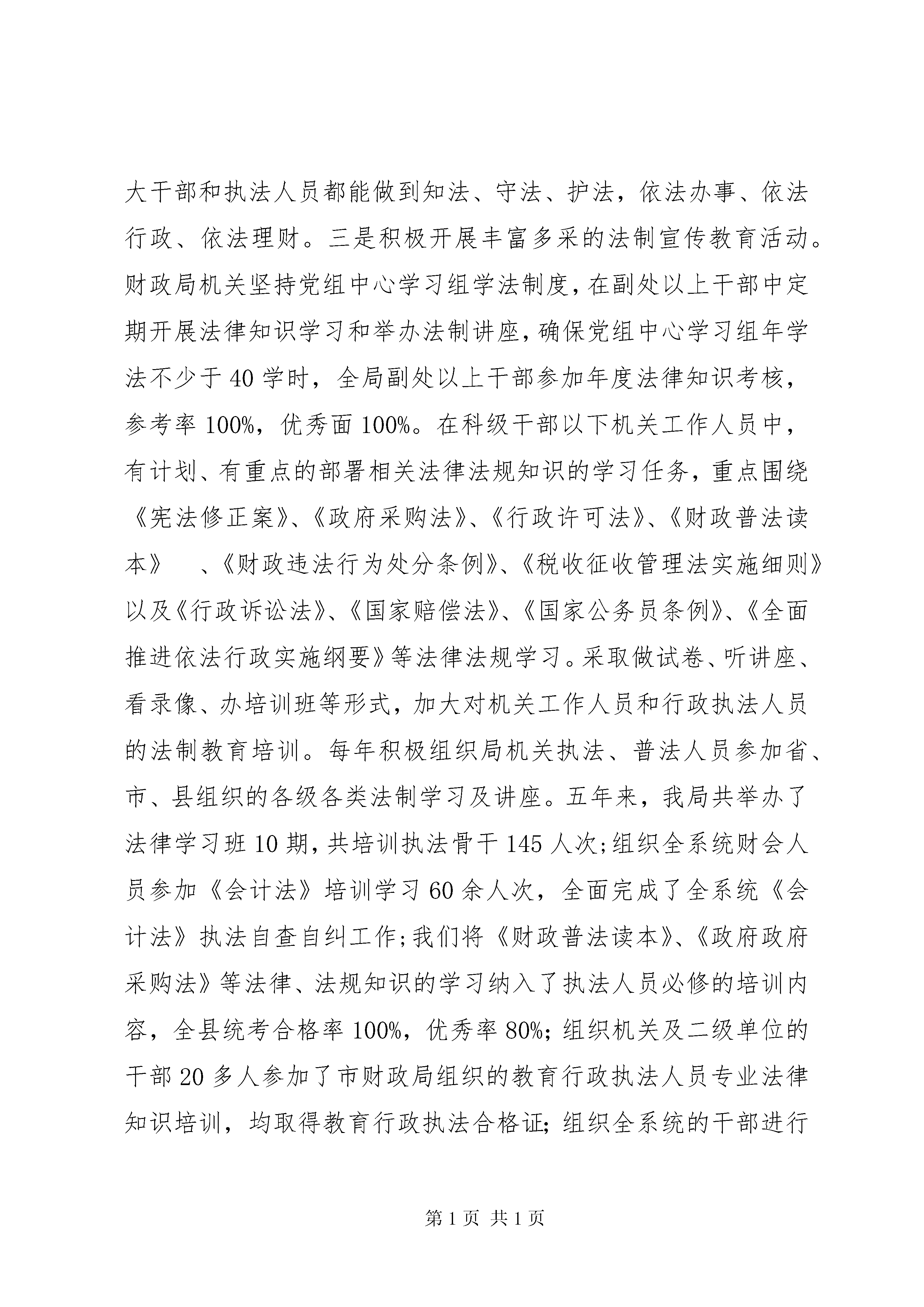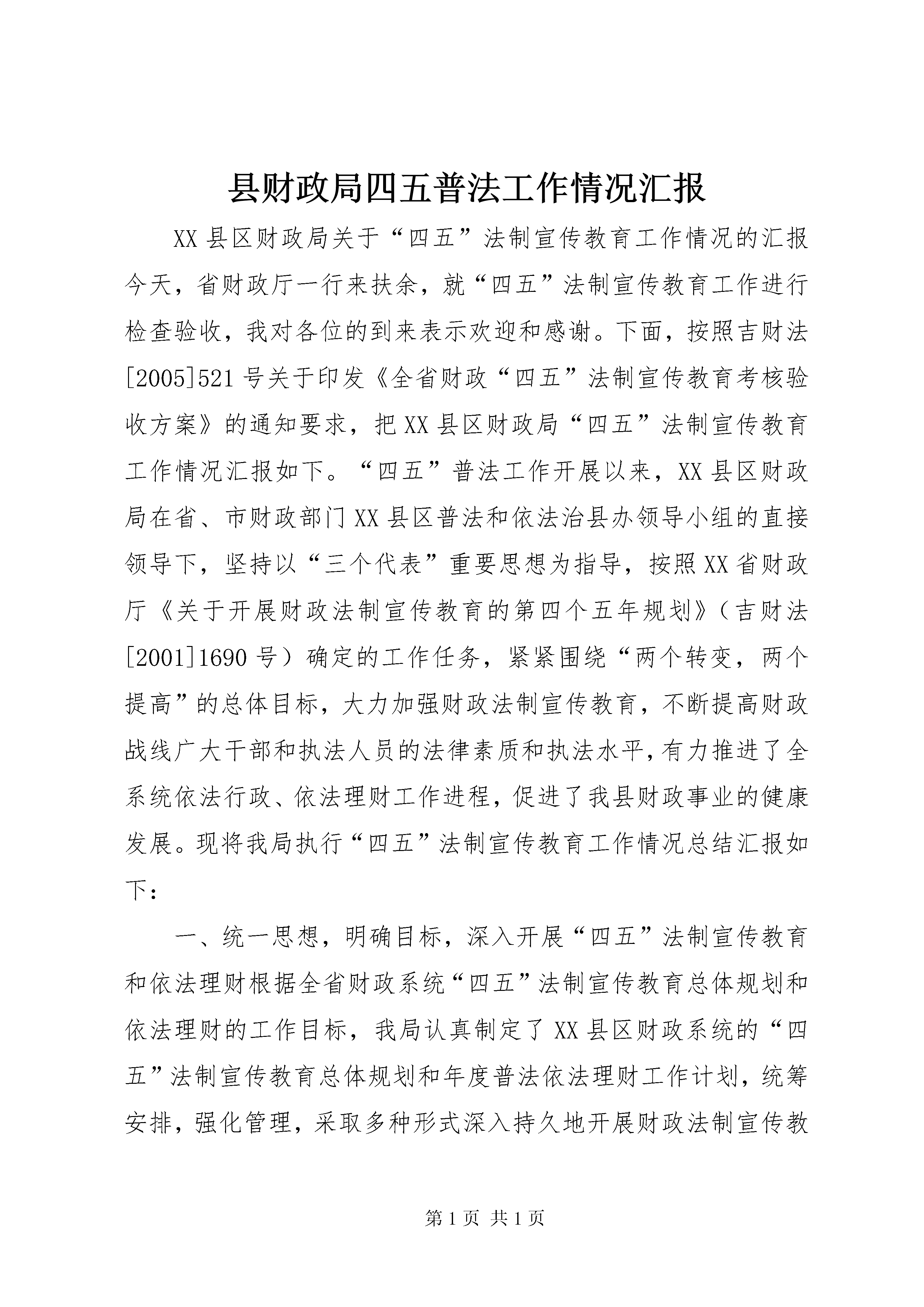县财政局四五普法工作情况汇报XX县区财政局关于“四五”法制宣传教育工作情况的汇报今天,省财政厅一行来扶余,就“四五”法制宣传教育工作进行检查验收,我对各位的到来表示欢迎和感谢。下面,按照吉财法[2005]521号关于印发《全省财政“四五”法制宣传教育考核验收方案》的通知要求,把XX县区财政局“四五”法制宣传教育工作情况汇报如下。“四五”普法工作开展以来,XX县区财政局在省、市财政部门XX县区普法和依法治县办领导小组的直接领导下,坚持以“三个代表”重要思想为指导,按照XX省财政厅《关于开展财政法制宣传教育的第四个五年规划》(吉财法[2001]1690号)确定的工作任务,紧紧围绕“两个转变,两个提高”的总体目标,大力加强财政法制宣传教育,不断提高财政战线广大干部和执法人员的法律素质和执法水平,有力推进了全系统依法行政、依法理财工作进程,促进了我县财政事业的健康发展。现将我局执行“四五”法制宣传教育工作情况总结汇报如下:一、统一思想,明确目标,深入开展“四五”法制宣传教育和依法理财根据全省财政系统“四五”法制宣传教育总体规划和依法理财的工作目标,我局认真制定了XX县区财政系统的“四五”法制宣传教育总体规划和年度普法依法理财工作计划,统筹安排,强化管理,采取多种形式深入持久地开展财政法制宣传教育。我局每年专门召开一次财政系统“四五”法制宣传教育部署会,对财政系统的“四五”法制宣传教育和依法理财工作进行动员和部署,将法制教育工作纳入全局年度工作目标,并要求各部门年末按时报送普法工作进度表和工作总结,使全系统的法制教育工作逐步走上了制度化、规范化的轨道。通过学习、宣传和集中培训,广大干部和行政执法人员依法行政、依法理财、依法维护自身合法权益的自觉性明显提高。在“四五”法制宣传教育和依法理财工作中,我们突出了以下几项工作:一是注重法制教育队伍建设。我局成立了以书记局长为组长,副局长为副组长,各职能科室负责同志为成员的法制宣传教育领导小组,完善和严格执行了机关学法、用法制度,建立了“四五”普法宣传队伍。把法制宣传教育和依法理财工作摆在机关工作的重要位置,建立了以局长为龙头,以科长、所长为主体,以执法人员为骨干的学法、普法工作队伍,完善了法制宣传教育网络体系。二是加强法制宣传阵地建设。我局加强了与公、检、法部门的联系,在专职法制教育工作者的指导下,根据财政系统的宣传重点,加大法制宣传的力度,及时宣传报道依法理财的典型经验,促进了法制教育整体水平的提高。各科室根据区全系统的四五普法规划制定了“四五”普法工作实施方案,将“四五”普法工作纳入科室工作计划,并充分发挥校广播室、电视台、网络、黑板报、宣传橱窗等宣传阵地的作用,开辟专栏,大张旗鼓地进行宣传和教育,力求使广大干部和执法人员都能做到知法、守法、护法,依法办事、依法行政、依法理财。三是积极开展丰富多采的法制宣传教育活动。财政局机关坚持党组中心学习组学法制度,在副处以上干部中定期开展法律知识学习和举办法制讲座,确保党组中心学习组年学法不少于40学时,全局副处以上干部参加年度法律知识考核,参考率100%,优秀面100%。在科级干部以下机关工作人员中,有计划、有重点的部署相关法律法规知识的学习任务,重点围绕《宪法修正案》、《政府采购法》、《行政许可法》、《财政普法读本》、《财政违法行为处分条例》、《税收征收管理法实施细则》以及《行政诉讼法》、《国家赔偿法》、《国家公务员条例》、《全面推进依法行政实施纲要》等法律法规学习。采取做试卷、听讲座、看录像、办培训班等形式,加大对机关工作人员和行政执法人员的法制教育培训。每年积极组织局机关执法、普法人员参加省、市、县组织的各级各类法制学习及讲座。五年来,我局共举办了法律学习班10期,共培训执法骨干145人次;组织全系统财会人员参加《会计法》培训学习60余人次,全面完成了全系统《会计法》执法自查自纠工作;我们将《财政普法读本》、《政府政府采购法》等法律、法规知识的学习纳入了执法人员必修的培训内容,全县统考合格率100%,优秀率80%;组织机关及二级单位的干部20多人参加了市财政局组织的教育行政执法人员专业法律知识培训,均取得教育行政执法合格证;组织全系统的干部进行了“走进wto法律知识”培训,参加人数300余人,考试优秀率75%,合格率100%。财政局还成立了学法工作专班,每年在系统内举办1次由局党政负责人参加的专题法律知识讲座,邀请专家学者讲课,年末进行一次干部法律知识测试,使财政干部的依法理财能力得到了明显增强。为提高法制宣传教育的效果,我局每年在培训经费中列出专项普法教育经费,有计划、有针对性地在所属单位开展