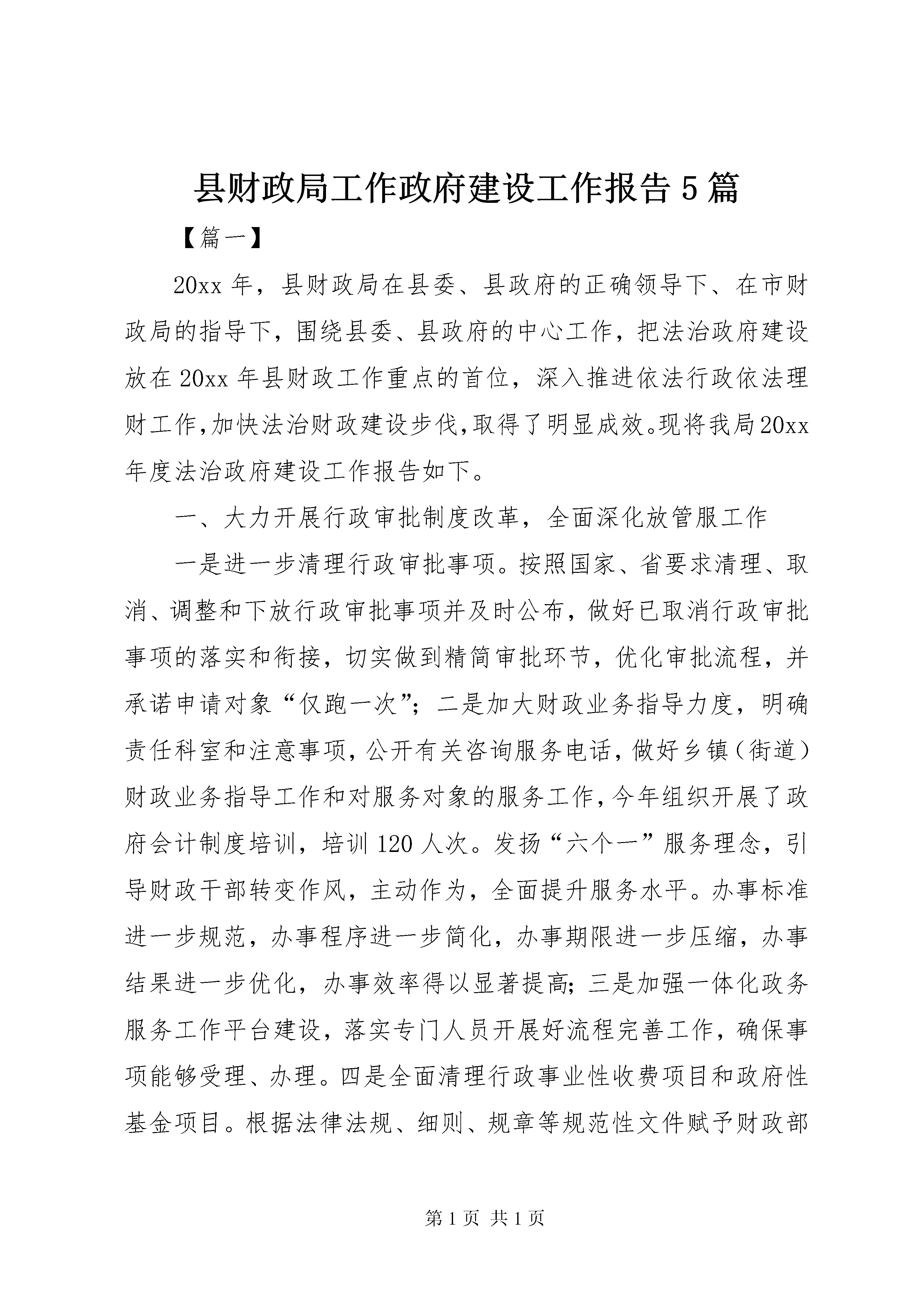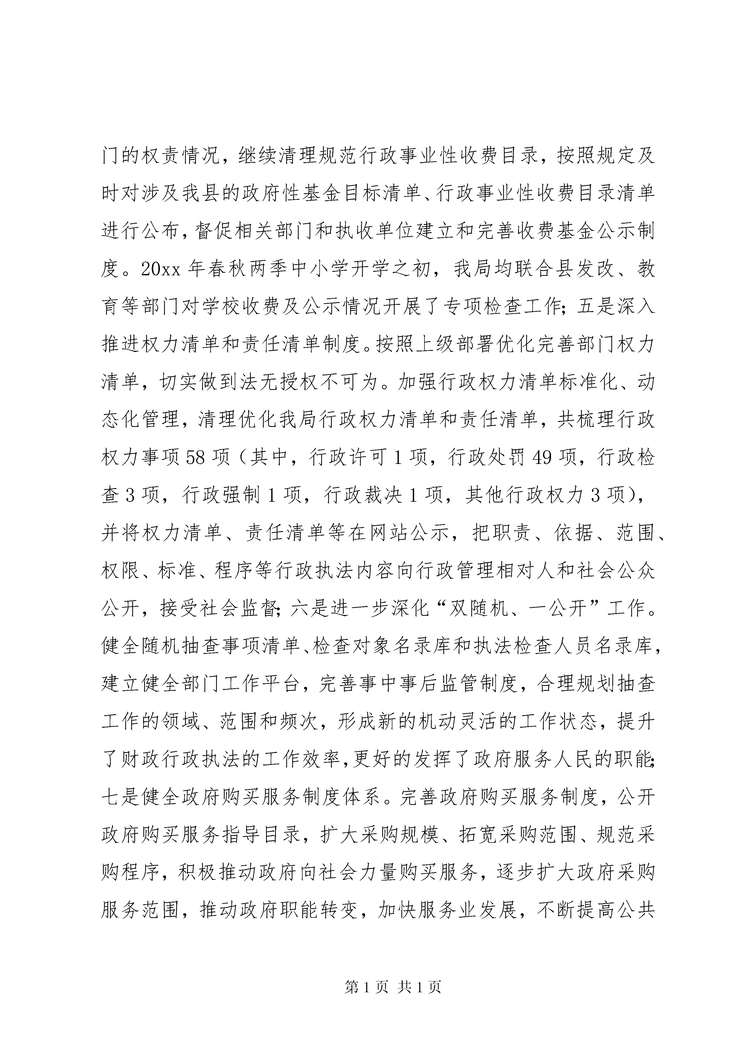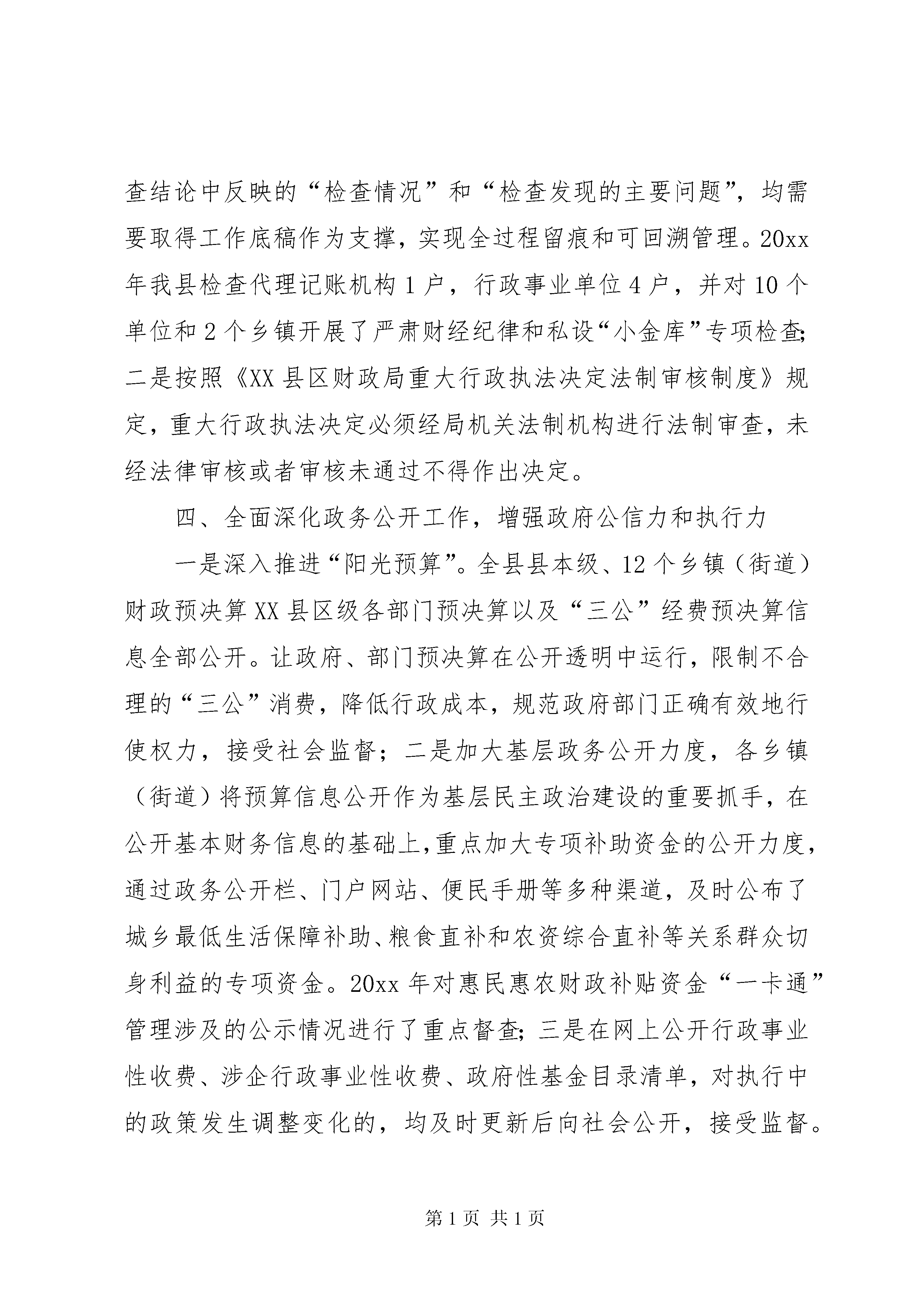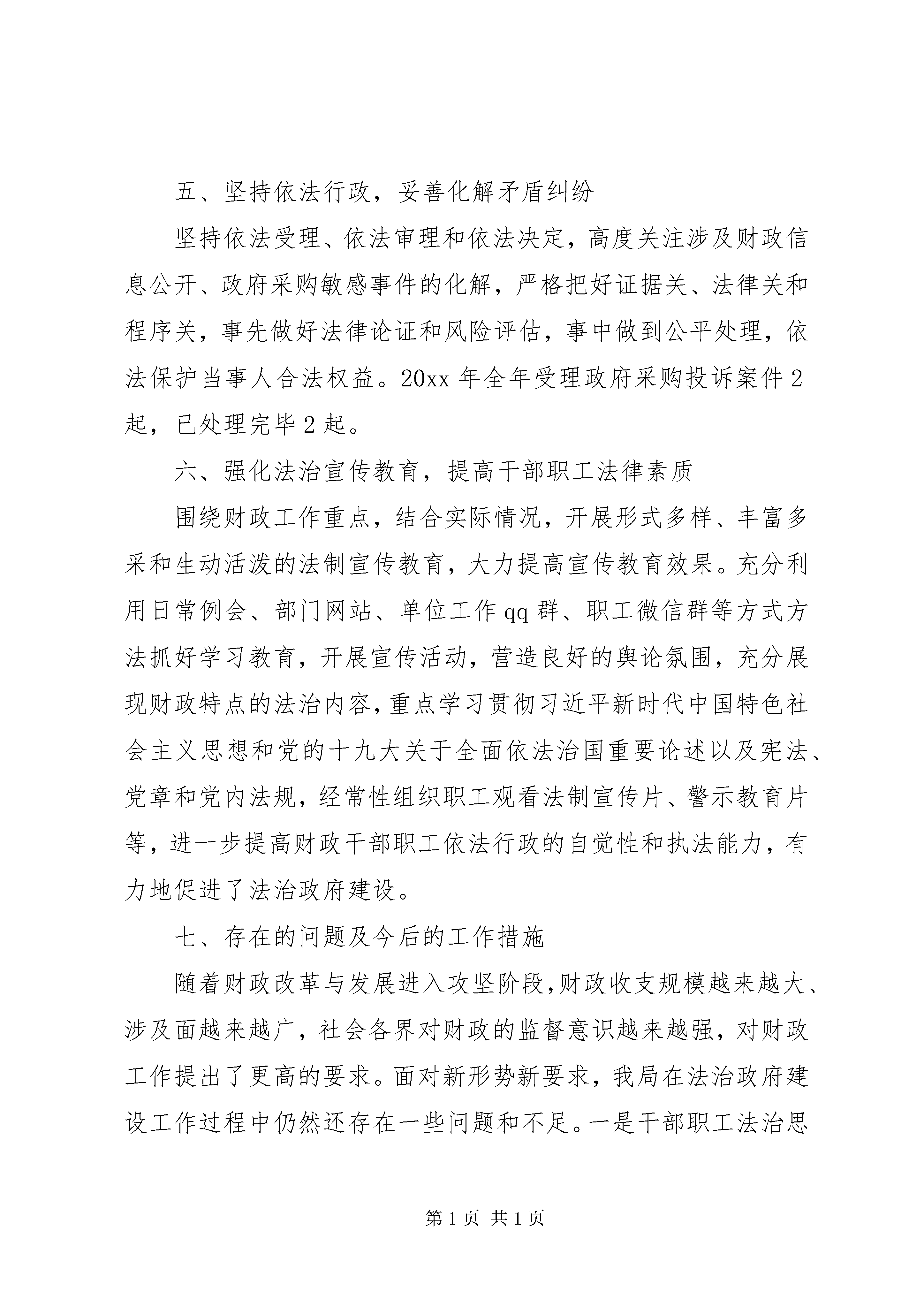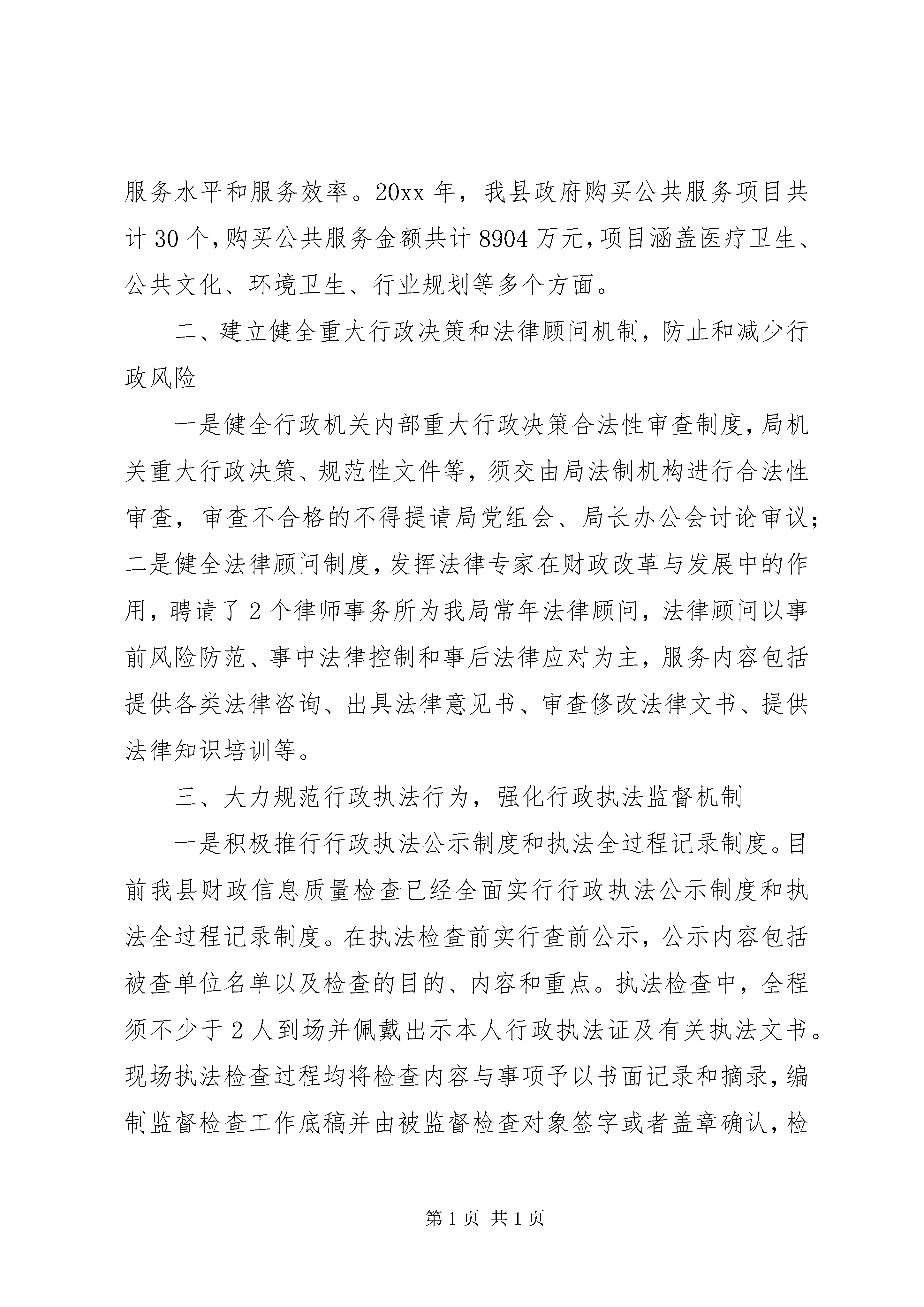县财政局工作政府建设工作报告5篇【篇一】20xx年,县财政局在县委、县政府的正确领导下、在市财政局的指导下,围绕县委、县政府的中心工作,把法治政府建设放在20xx年县财政工作重点的首位,深入推进依法行政依法理财工作,加快法治财政建设步伐,取得了明显成效。现将我局20xx年度法治政府建设工作报告如下。一、大力开展行政审批制度改革,全面深化放管服工作一是进一步清理行政审批事项。按照国家、省要求清理、取消、调整和下放行政审批事项并及时公布,做好已取消行政审批事项的落实和衔接,切实做到精简审批环节,优化审批流程,并承诺申请对象“仅跑一次”;二是加大财政业务指导力度,明确责任科室和注意事项,公开有关咨询服务电话,做好乡镇(街道)财政业务指导工作和对服务对象的服务工作,今年组织开展了政府会计制度培训,培训120人次。发扬“六个一”服务理念,引导财政干部转变作风,主动作为,全面提升服务水平。办事标准进一步规范,办事程序进一步简化,办事期限进一步压缩,办事结果进一步优化,办事效率得以显著提高;三是加强一体化政务服务工作平台建设,落实专门人员开展好流程完善工作,确保事项能够受理、办理。四是全面清理行政事业性收费项目和政府性基金项目。根据法律法规、细则、规章等规范性文件赋予财政部门的权责情况,继续清理规范行政事业性收费目录,按照规定及时对涉及我县的政府性基金目标清单、行政事业性收费目录清单进行公布,督促相关部门和执收单位建立和完善收费基金公示制度。20xx年春秋两季中小学开学之初,我局均联合县发改、教育等部门对学校收费及公示情况开展了专项检查工作;五是深入推进权力清单和责任清单制度。按照上级部署优化完善部门权力清单,切实做到法无授权不可为。加强行政权力清单标准化、动态化管理,清理优化我局行政权力清单和责任清单,共梳理行政权力事项58项(其中,行政许可1项,行政处罚49项,行政检查3项,行政强制1项,行政裁决1项,其他行政权力3项),并将权力清单、责任清单等在网站公示,把职责、依据、范围、权限、标准、程序等行政执法内容向行政管理相对人和社会公众公开,接受社会监督;六是进一步深化“双随机、一公开”工作。健全随机抽查事项清单、检查对象名录库和执法检查人员名录库,建立健全部门工作平台,完善事中事后监管制度,合理规划抽查工作的领域、范围和频次,形成新的机动灵活的工作状态,提升了财政行政执法的工作效率,更好的发挥了政府服务人民的职能;七是健全政府购买服务制度体系。完善政府购买服务制度,公开政府购买服务指导目录,扩大采购规模、拓宽采购范围、规范采购程序,积极推动政府向社会力量购买服务,逐步扩大政府采购服务范围,推动政府职能转变,加快服务业发展,不断提高公共服务水平和服务效率。20xx年,我县政府购买公共服务项目共计30个,购买公共服务金额共计8904万元,项目涵盖医疗卫生、公共文化、环境卫生、行业规划等多个方面。二、建立健全重大行政决策和法律顾问机制,防止和减少行政风险一是健全行政机关内部重大行政决策合法性审查制度,局机关重大行政决策、规范性文件等,须交由局法制机构进行合法性审查,审查不合格的不得提请局党组会、局长办公会讨论审议;二是健全法律顾问制度,发挥法律专家在财政改革与发展中的作用,聘请了2个律师事务所为我局常年法律顾问,法律顾问以事前风险防范、事中法律控制和事后法律应对为主,服务内容包括提供各类法律咨询、出具法律意见书、审查修改法律文书、提供法律知识培训等。三、大力规范行政执法行为,强化行政执法监督机制一是积极推行行政执法公示制度和执法全过程记录制度。目前我县财政信息质量检查已经全面实行行政执法公示制度和执法全过程记录制度。在执法检查前实行查前公示,公示内容包括被查单位名单以及检查的目的、内容和重点。执法检查中,全程须不少于2人到场并佩戴出示本人行政执法证及有关执法文书。现场执法检查过程均将检查内容与事项予以书面记录和摘录,编制监督检查工作底稿并由被监督检查对象签字或者盖章确认,检查结论中反映的“检查情况”和“检查发现的主要问题”,均需要取得工作底稿作为支撑,实现全过程留痕和可回溯管理。20xx年我县检查代理记账机构1户,行政事业单位4户,并对10个单位和2个乡镇开展了严肃财经纪律和私设“小金库”专项检查;二是按照《XX县区财政局重大行政执法决定法制审核制度》规定,重大行政执法决定必须经局机关法制机构进行法制审查,未经法律审核或者审核未通过不得作出决定。四、全面深化政务公开工作,增强政府公信力和执行力一是深入推进“阳光预算”。全县县本级、12个乡镇(街道)财政预决算XX县区级各部门预决算以及“三公”经费预决算信息全部公开。让政府、部门预决算在公开透明中运行,限制不合理的“三公”消费,降低行政成本,规范政府部门正确有效地行使权力