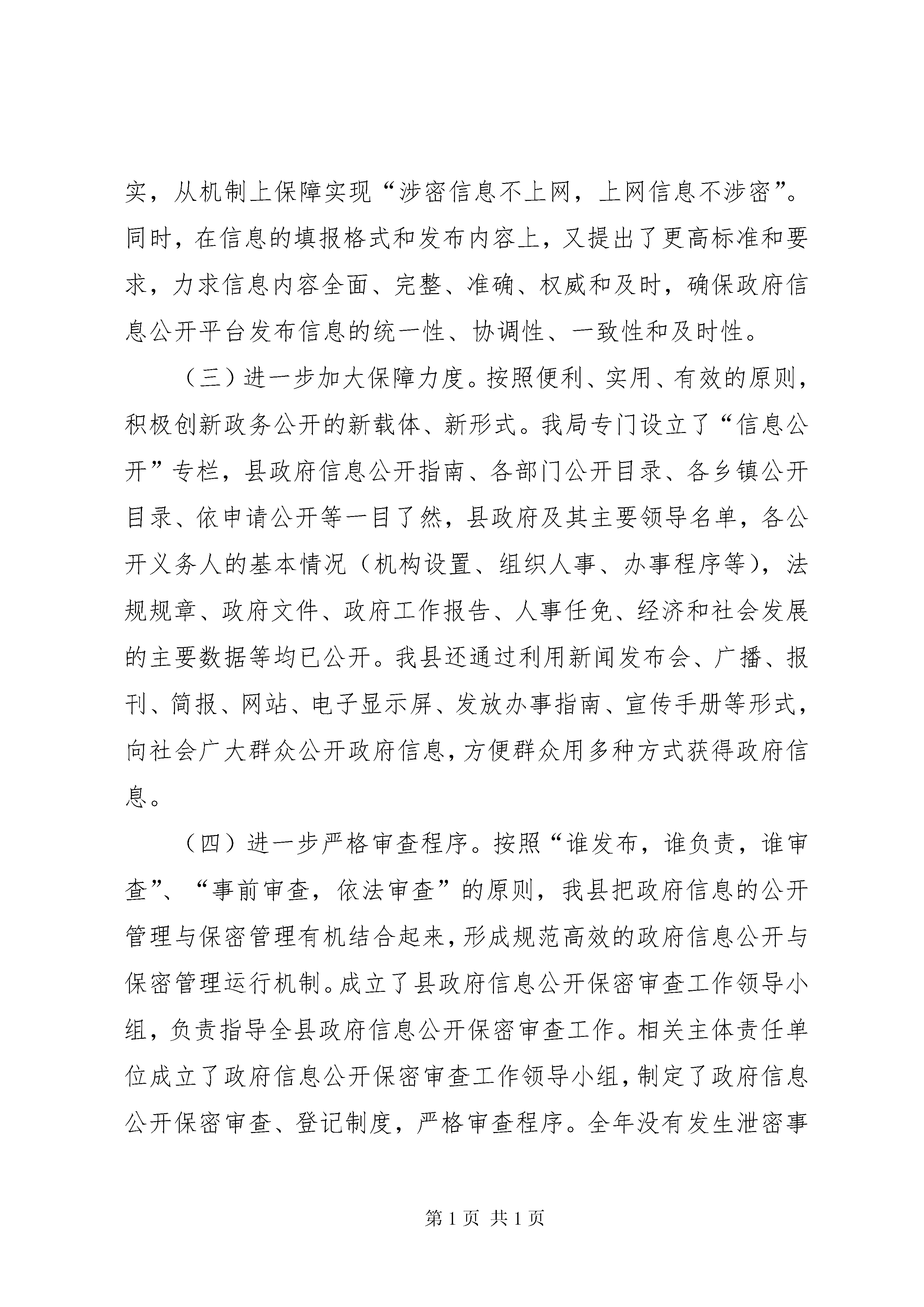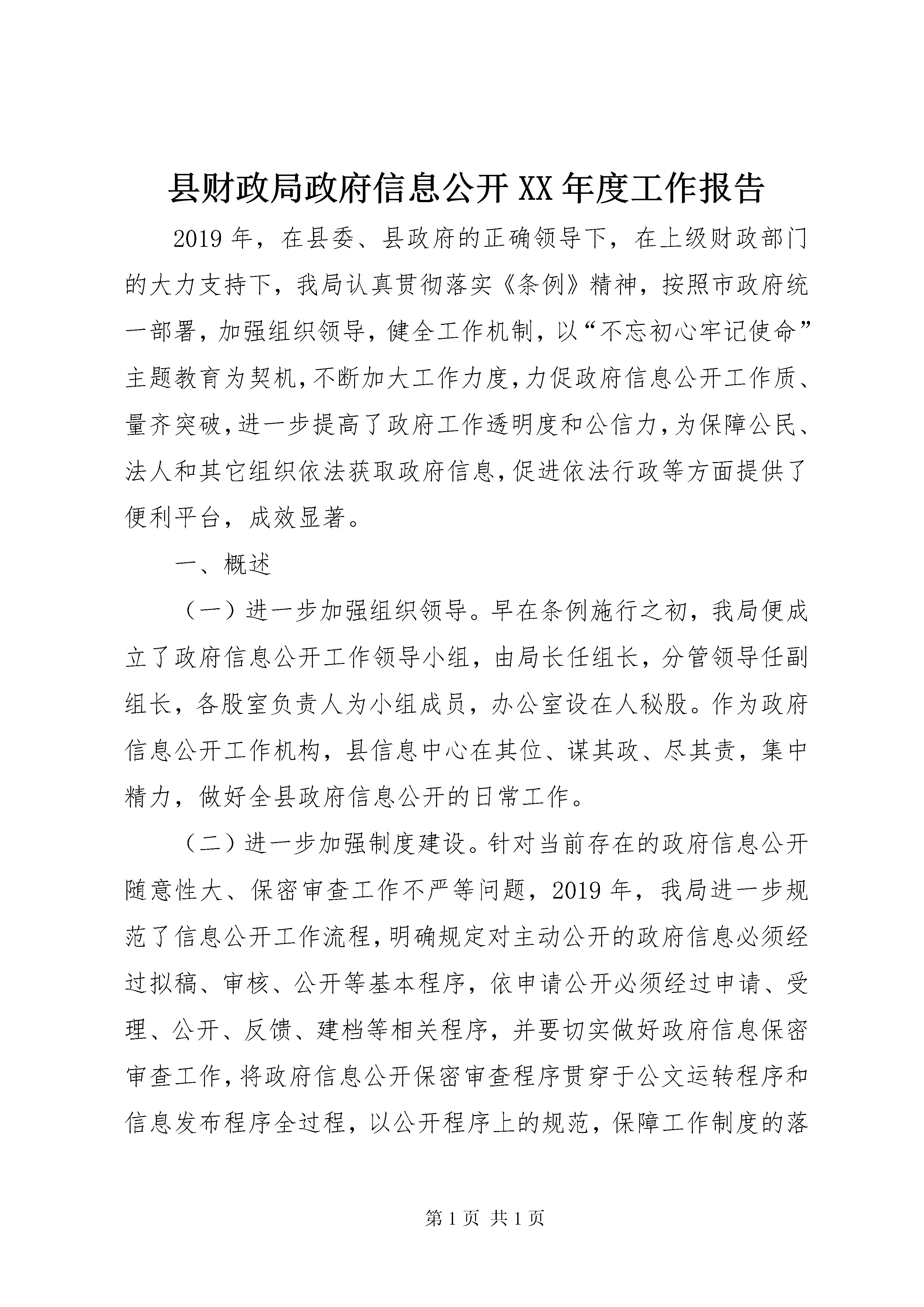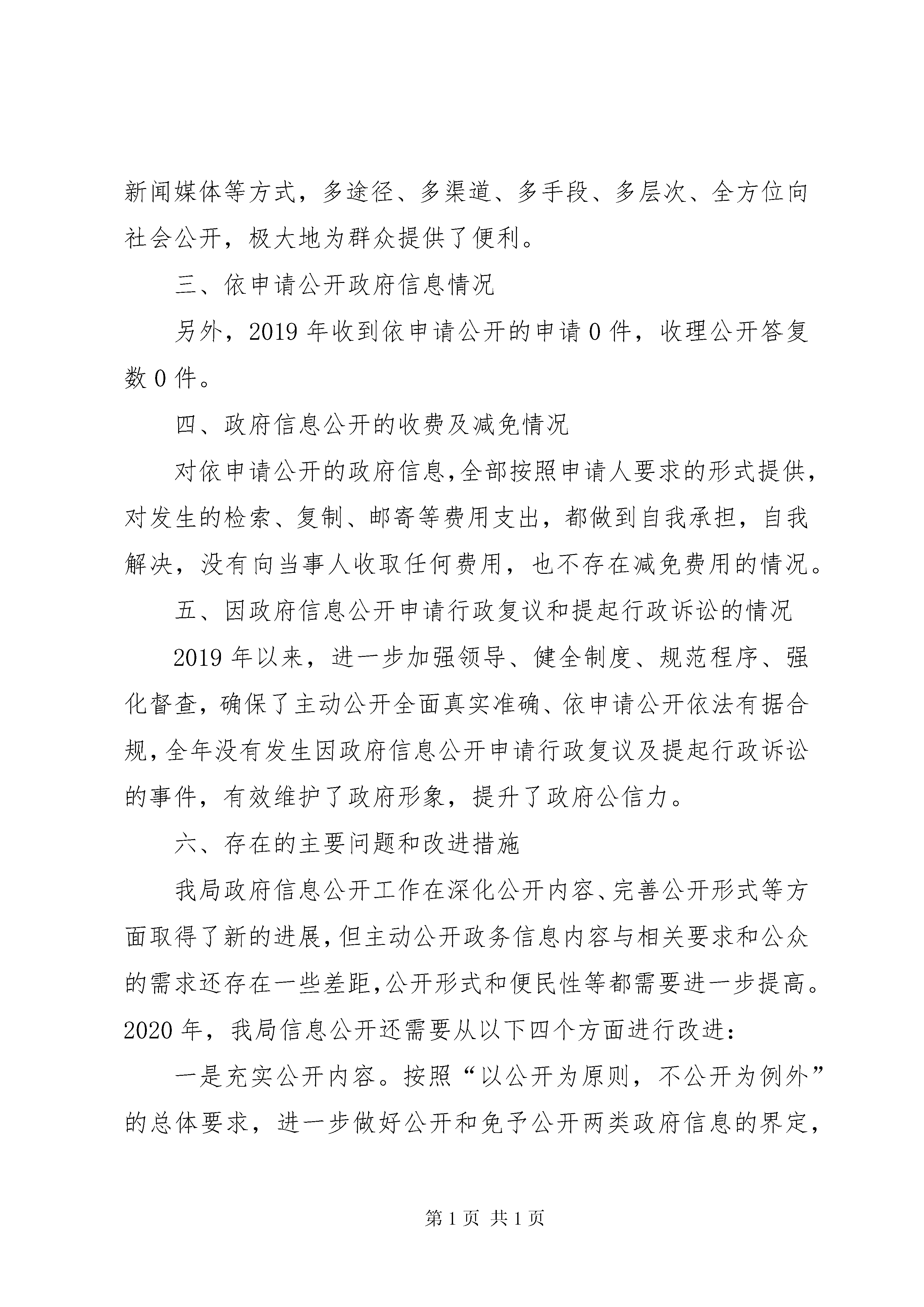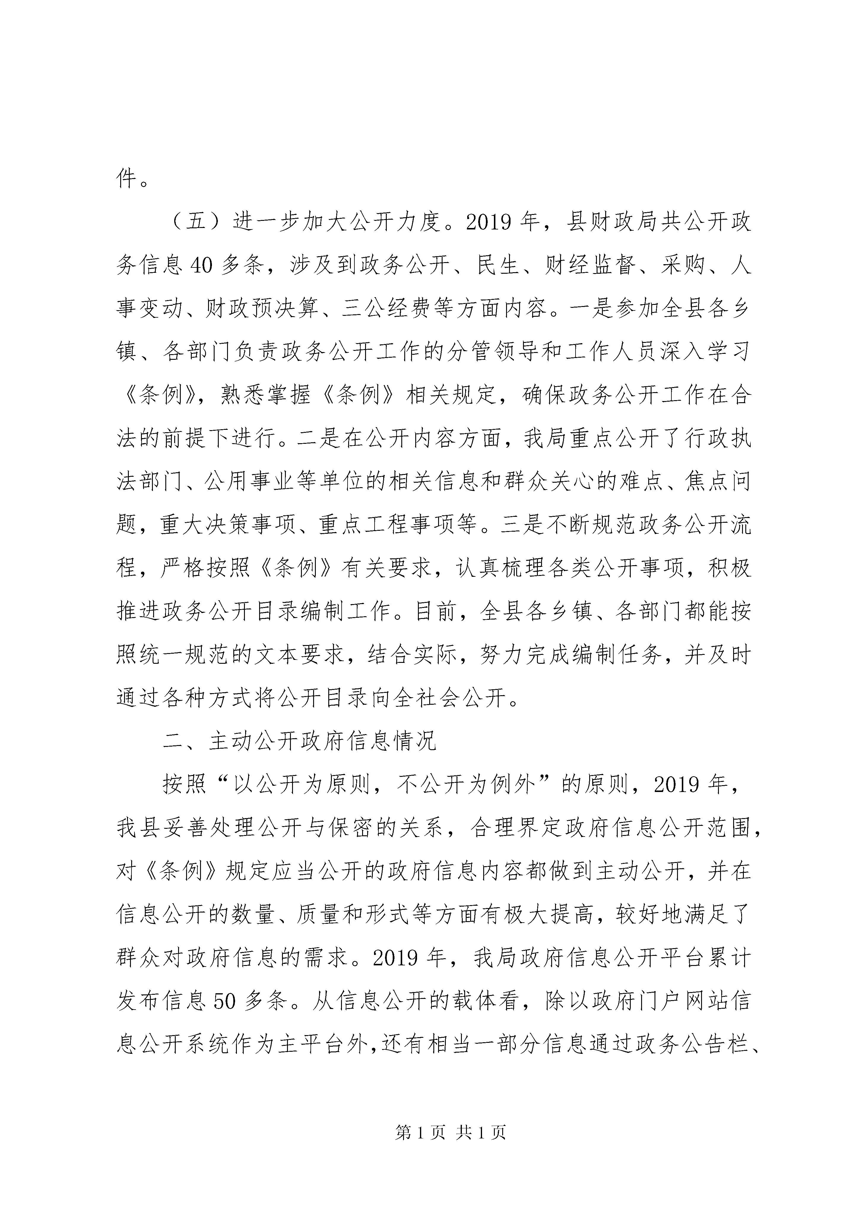 县财政局政府信息公开XX年度工作报告2019年,在县委、县政府的正确领导下,在上级财政部门的大力支持下,我局认真贯彻落实《条例》精神,按照市政府统一部署,加强组织领导,健全工作机制,以“不忘初心牢记使命”主题教育为契机,不断加大工作力度,力促政府信息公开工作质、量齐突破,进一步提高了政府工作透明度和公信力,为保障公民、法人和其它组织依法获取政府信息,促进依法行政等方面提供了便利平台,成效显著。一、概述(一)进一步加强组织领导。早在条例施行之初,我局便成立了政府信息公开工作领导小组,由局长任组长,分管领导任副组长,各股室负责人为小组成员,办公室设在人秘股。作为政府信息公开工作机构,县信息中心在其位、谋其政、尽其责,集中精力,做好全县政府信息公开的日常工作。(二)进一步加强制度建设。针对当前存在的政府信息公开随意性大、保密审查工作不严等问题,2019年,我局进一步规范了信息公开工作流程,明确规定对主动公开的政府信息必须经过拟稿、审核、公开等基本程序,依申请公开必须经过申请、受理、公开、反馈、建档等相关程序,并要切实做好政府信息保密审查工作,将政府信息公开保密审查程序贯穿于公文运转程序和信息发布程序全过程,以公开程序上的规范,保障工作制度的落实,从机制上保障实现“涉密信息不上网,上网信息不涉密”。同时,在信息的填报格式和发布内容上,又提出了更高标准和要求,力求信息内容全面、完整、准确、权威和及时,确保政府信息公开平台发布信息的统一性、协调性、一致性和及时性。(三)进一步加大保障力度。按照便利、实用、有效的原则,积极创新政务公开的新载体、新形式。我局专门设立了“信息公开”专栏,县政府信息公开指南、各部门公开目录、各乡镇公开目录、依申请公开等一目了然,县政府及其主要领导名单,各公开义务人的基本情况(机构设置、组织人事、办事程序等),法规规章、政府文件、政府工作报告、人事任免、经济和社会发展的主要数据等均已公开。我县还通过利用新闻发布会、广播、报刊、简报、网站、电子显示屏、发放办事指南、宣传手册等形式,向社会广大群众公开政府信息,方便群众用多种方式获得政府信息。(四)进一步严格审查程序。按照“谁发布,谁负责,谁审查”、“事前审查,依法审查”的原则,我县把政府信息的公开管理与保密管理有机结合起来,形成规范高效的政府信息公开与保密管理运行机制。成立了县政府信息公开保密审查工作领导小组,负责指导全县政府信息公开保密审查工作。相关主体责任单位成立了政府信息公开保密审查工作领导小组,制定了政府信息公开保密审查、登记制度,严格审查程序。全年没有发生泄密事件。(五)进一步加大公开力度。2019年,县财政局共公开政务信息40多条,涉及到政务公开、民生、财经监督、采购、人事变动、财政预决算、三公经费等方面内容。一是参加全县各乡镇、各部门负责政务公开工作的分管领导和工作人员深入学习《条例》,熟悉掌握《条例》相关规定,确保政务公开工作在合法的前提下进行。二是在公开内容方面,我局重点公开了行政执法部门、公用事业等单位的相关信息和群众关心的难点、焦点问题,重大决策事项、重点工程事项等。三是不断规范政务公开流程,严格按照《条例》有关要求,认真梳理各类公开事项,积极推进政务公开目录编制工作。目前,全县各乡镇、各部门都能按照统一规范的文本要求,结合实际,努力完成编制任务,并及时通过各种方式将公开目录向全社会公开。二、主动公开政府信息情况按照“以公开为原则,不公开为例外”的原则,2019年,我县妥善处理公开与保密的关系,合理界定政府信息公开范围,对《条例》规定应当公开的政府信息内容都做到主动公开,并在信息公开的数量、质量和形式等方面有极大提高,较好地满足了群众对政府信息的需求。2019年,我局政府信息公开平台累计发布信息50多条。从信息公开的载体看,除以政府门户网站信息公开系统作为主平台外,还有相当一部分信息通过政务公告栏、新闻媒体等方式,多途径、多渠道、多手段、多层次、全方位向社会公开,极大地为群众提供了便利。三、依申请公开政府信息情况另外,2019年收到依申请公开的申请0件,收理公开答复数0件。四、政府信息公开的收费及减免情况对依申请公开的政府信息,全部按照申请人要求的形式提供,对发生的检索、复制、邮寄等费用支出,都做到自我承担,自我解决,没有向当事人收取任何费用,也不存在减免费用的情况。五、因政府信息公开申请行政复议和提起行政诉讼的情况2019年以来,进一步加强领导、健全制度、规范程序、强化督查,确保了主动公开全面真实准确、依申请公开依法有据合规,全年没有发生因政府信息公开申请行政复议及提起行政诉讼的事件,有效维护了政府形象,提升了政府公信力。六、存在的主要问题和改进措施我局政府信息公开工作在深化公开内容、完善公开形式等方面取得了新的进展,