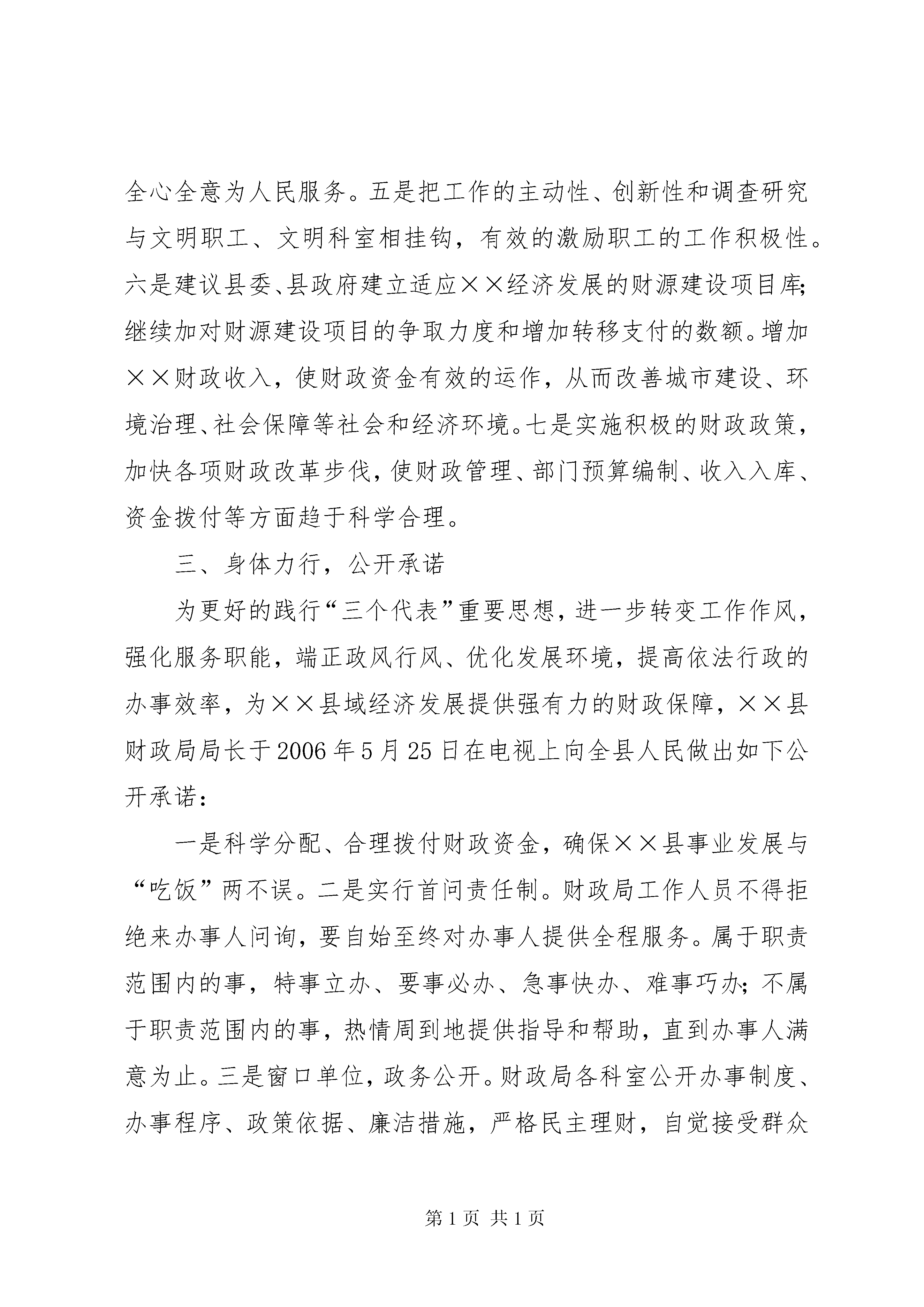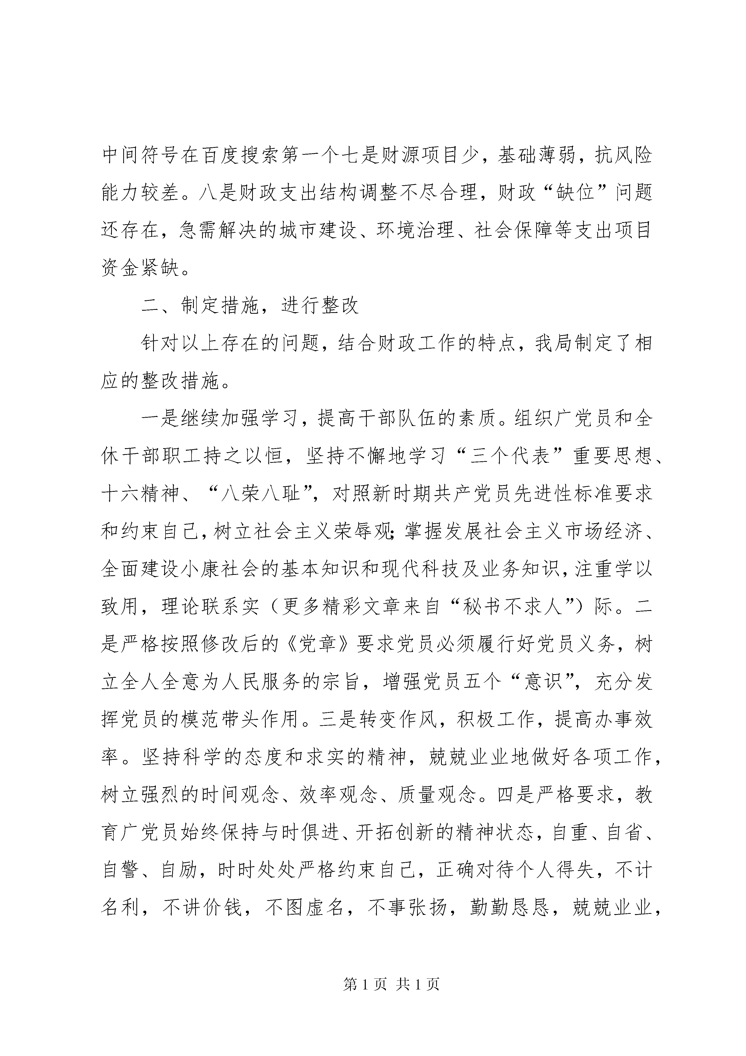 县财政局端正政风行风优化发展环境自查自评情况汇报按照××县纠风办《端正政风行风、优化发展环境”最佳最差单位评议活动实施方案》和相关文件的要求,××县财政局自年初以来认真开展了“端正政风行风、优化发展环境”活动。在上半年,我局始终以邓小平理论和“三个代表”重要思想为指导,以解决损害经济发展和群众利益的政风行风问题为重点、以党员先进性教育为契机,通过扎实开展“端正政风行风、优化发展环境”活动,为实现××的“三年解困、六年发展”做出积极的贡献。经过半年多的时间,在取得成绩的同时也发现了工作中的不足。现将自查自评情况汇报如下:一、采取有效方式,开展自查自开展活动以来,××县财政局采取召开全体职工会,党员讨论会,发放征求意见单等方式就“如何端正政风行风、优化发展环境”进行自查。通过自查,发现还存在着以下有碍发展环境的问题:一是个别党员先锋模范带头作用发挥的不够好。二是局机关的各项制度还有待进一步加强。三是个别科室有过多忙于业务而放松政治学习现象。四是工作上的主观能动性和拓展性不强,有满足于现状的思想。五是工作方法少、办法不多,缺少创新意识,缺少思想、理论、业务学习的主动性。六是忙于日常工作较多,深入基层单位时候少,缺少相关的调研。,××,。注:去掉中间符号在百度搜索第一个七是财源项目少,基础薄弱,抗风险能力较差。八是财政支出结构调整不尽合理,财政“缺位”问题还存在,急需解决的城市建设、环境治理、社会保障等支出项目资金紧缺。二、制定措施,进行整改针对以上存在的问题,结合财政工作的特点,我局制定了相应的整改措施。一是继续加强学习,提高干部队伍的素质。组织广党员和全休干部职工持之以恒,坚持不懈地学习“三个代表”重要思想、十六精神、“八荣八耻”,对照新时期共产党员先进性标准要求和约束自己,树立社会主义荣辱观;掌握发展社会主义市场经济、全面建设小康社会的基本知识和现代科技及业务知识,注重学以致用,理论联系实(更多精彩文章来自“秘书不求人”)际。二是严格按照修改后的《党章》要求党员必须履行好党员义务,树立全人全意为人民服务的宗旨,增强党员五个“意识”,充分发挥党员的模范带头作用。三是转变作风,积极工作,提高办事效率。坚持科学的态度和求实的精神,兢兢业业地做好各项工作,树立强烈的时间观念、效率观念、质量观念。四是严格要求,教育广党员始终保持与时俱进、开拓创新的精神状态,自重、自省、自警、自励,时时处处严格约束自己,正确对待个人得失,不计名利,不讲价钱,不图虚名,不事张扬,勤勤恳恳,兢兢业业,全心全意为人民服务。五是把工作的主动性、创新性和调查研究与文明职工、文明科室相挂钩,有效的激励职工的工作积极性。六是建议县委、县政府建立适应××经济发展的财源建设项目库;继续加对财源建设项目的争取力度和增加转移支付的数额。增加××财政收入,使财政资金有效的运作,从而改善城市建设、环境治理、社会保障等社会和经济环境。七是实施积极的财政政策,加快各项财政改革步伐,使财政管理、部门预算编制、收入入库、资金拨付等方面趋于科学合理。三、身体力行,公开承诺为更好的践行“三个代表”重要思想,进一步转变工作作风,强化服务职能,端正政风行风、优化发展环境,提高依法行政的办事效率,为××县域经济发展提供强有力的财政保障,××县财政局局长于2006年5月25日在电视上向全县人民做出如下公开承诺:一是科学分配、合理拨付财政资金,确保××县事业发展与“吃饭”两不误。二是实行首问责任制。财政局工作人员不得拒绝来办事人问询,要自始至终对办事人提供全程服务。属于职责范围内的事,特事立办、要事必办、急事快办、难事巧办;不属于职责范围内的事,热情周到地提供指导和帮助,直到办事人满意为止。三是窗口单位,政务公开。财政局各科室公开办事制度、办事程序、政策依据、廉洁措施,严格民主理财,自觉接受群众监督。四是政府采购坚持公开、透明,实施阳光工程,确保采购商品达到最佳性能价格比。五是财政局全体干部职工必须挂牌上岗,接受社会监督。六是工作人员严格遵守工作纪律,不以权谋私,索贿受贿,严禁吃、拿、卡、要。