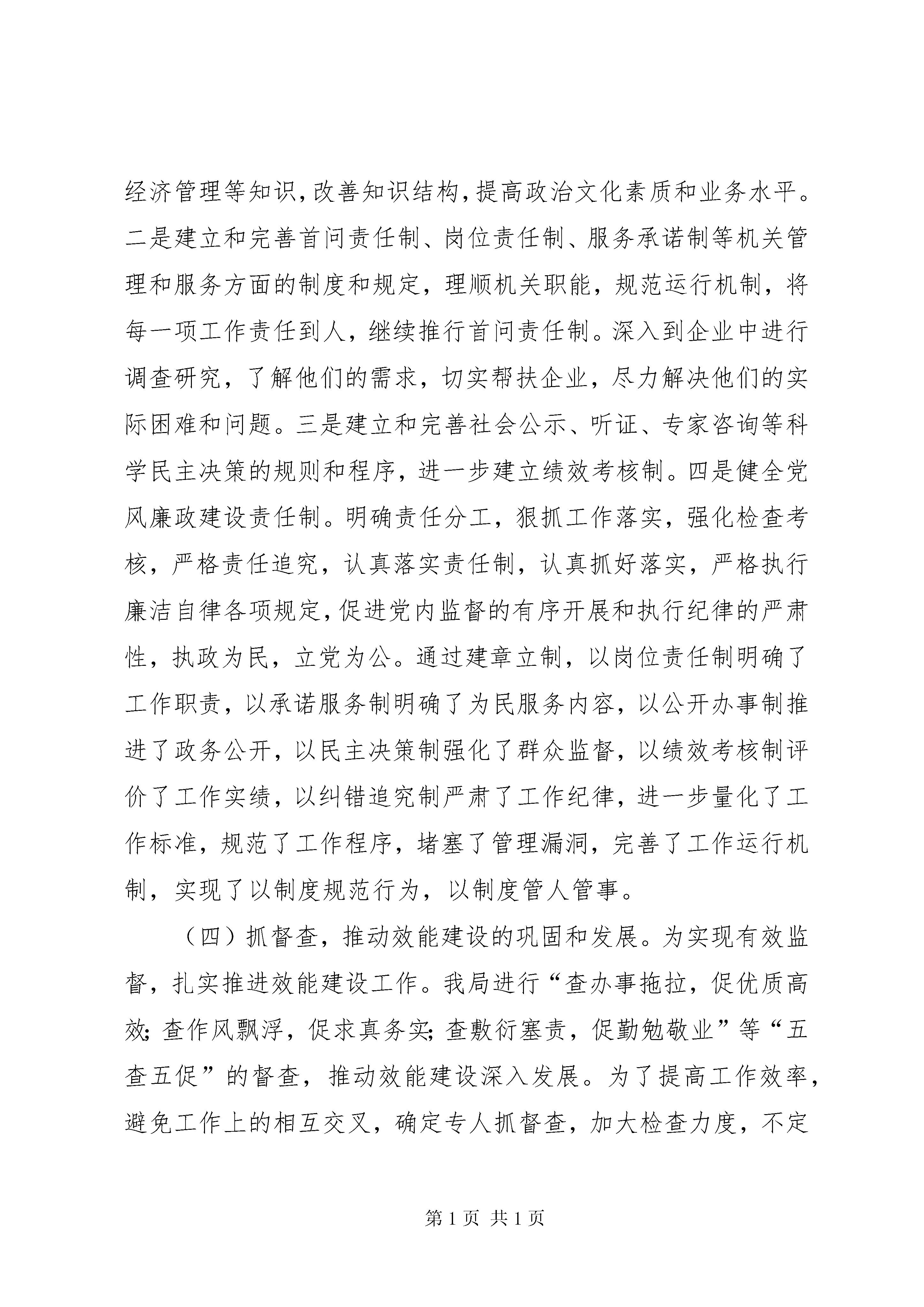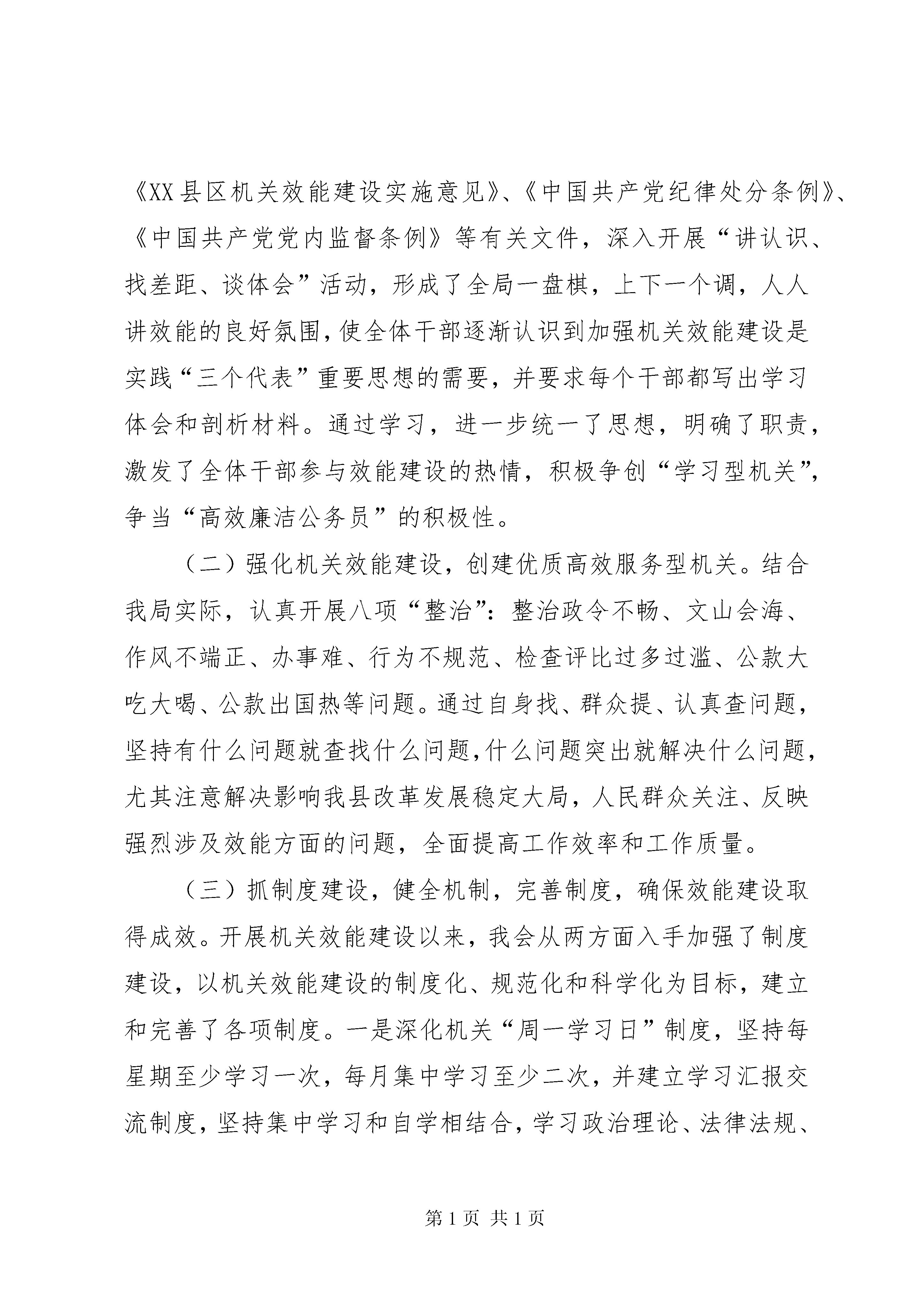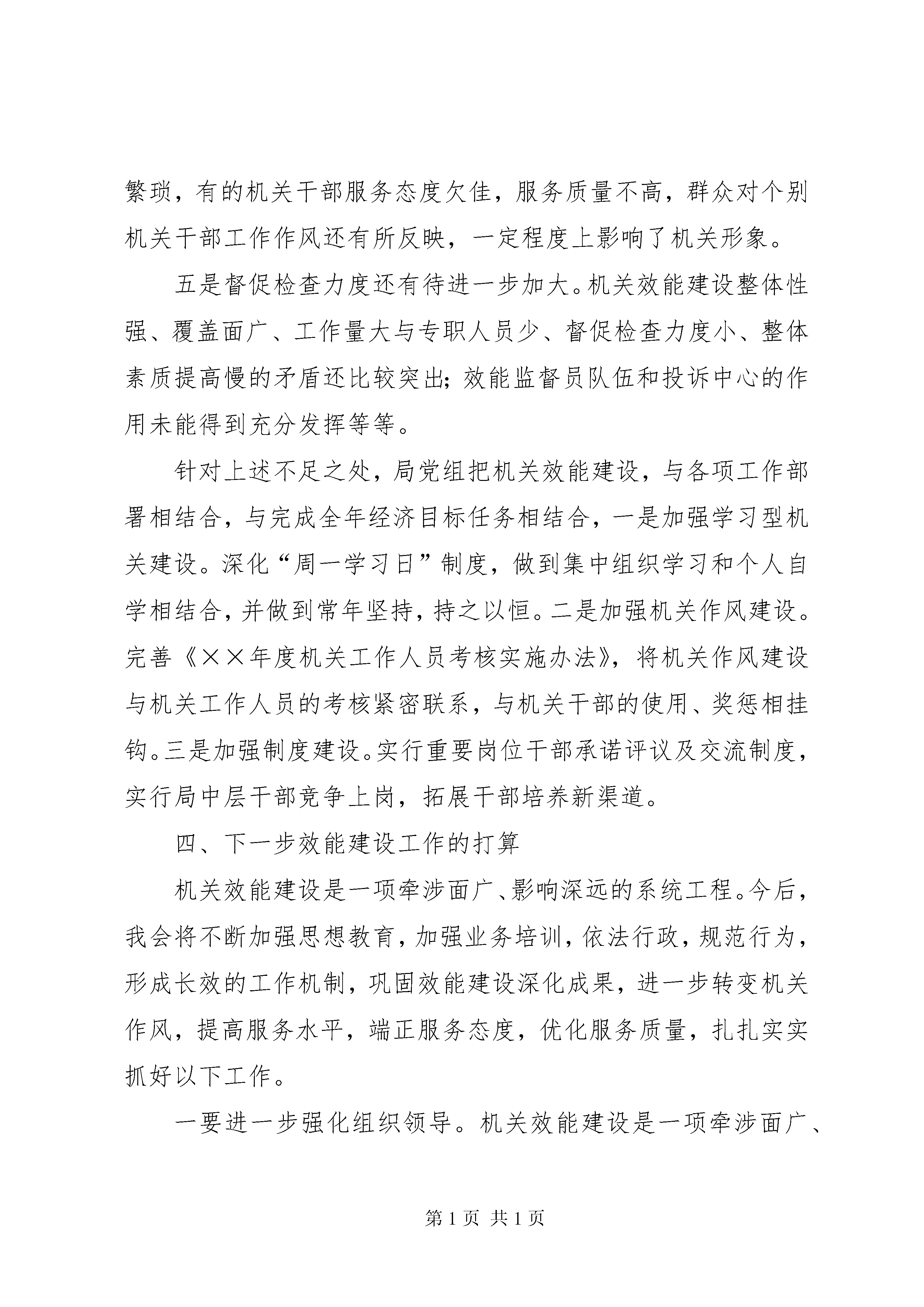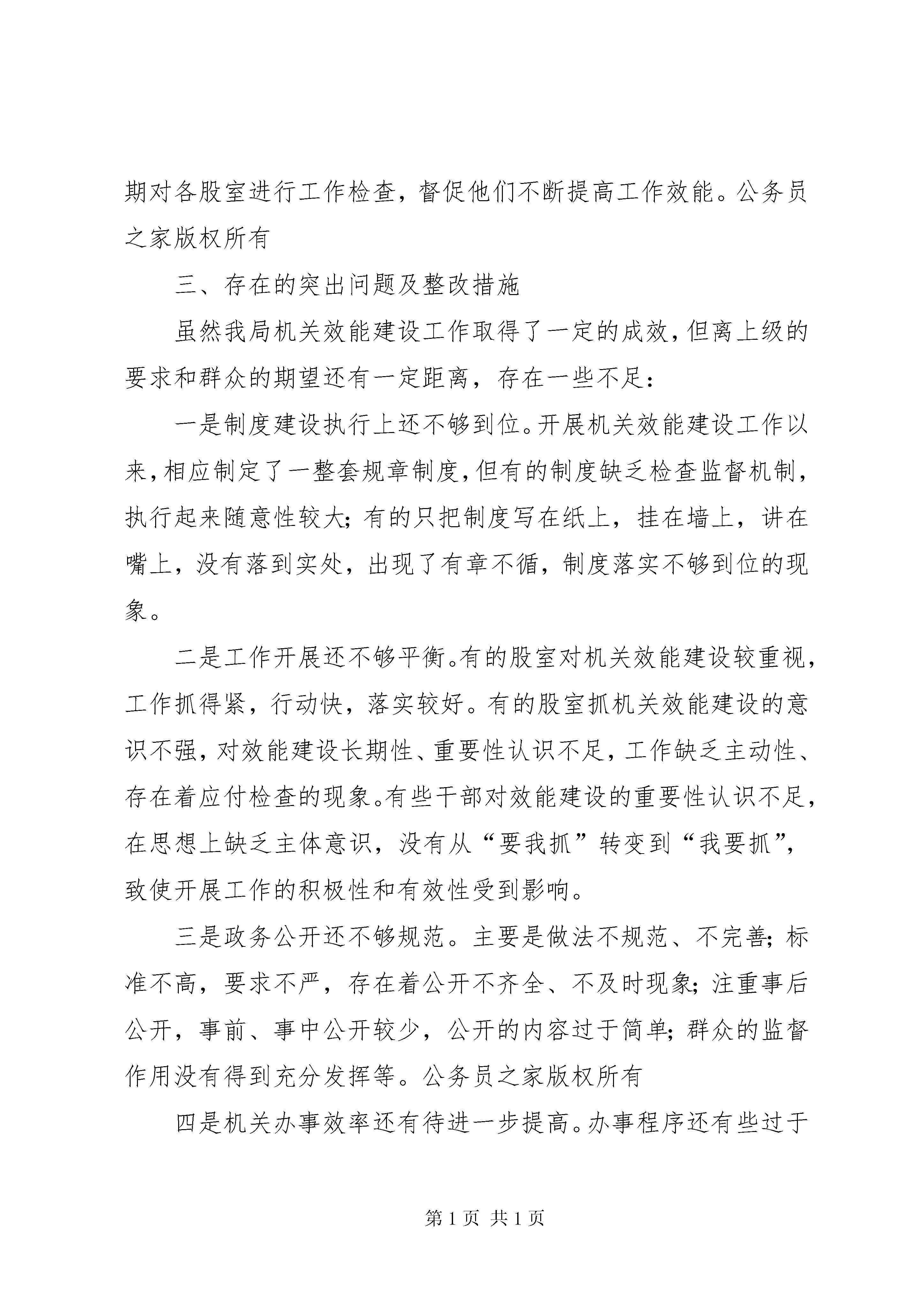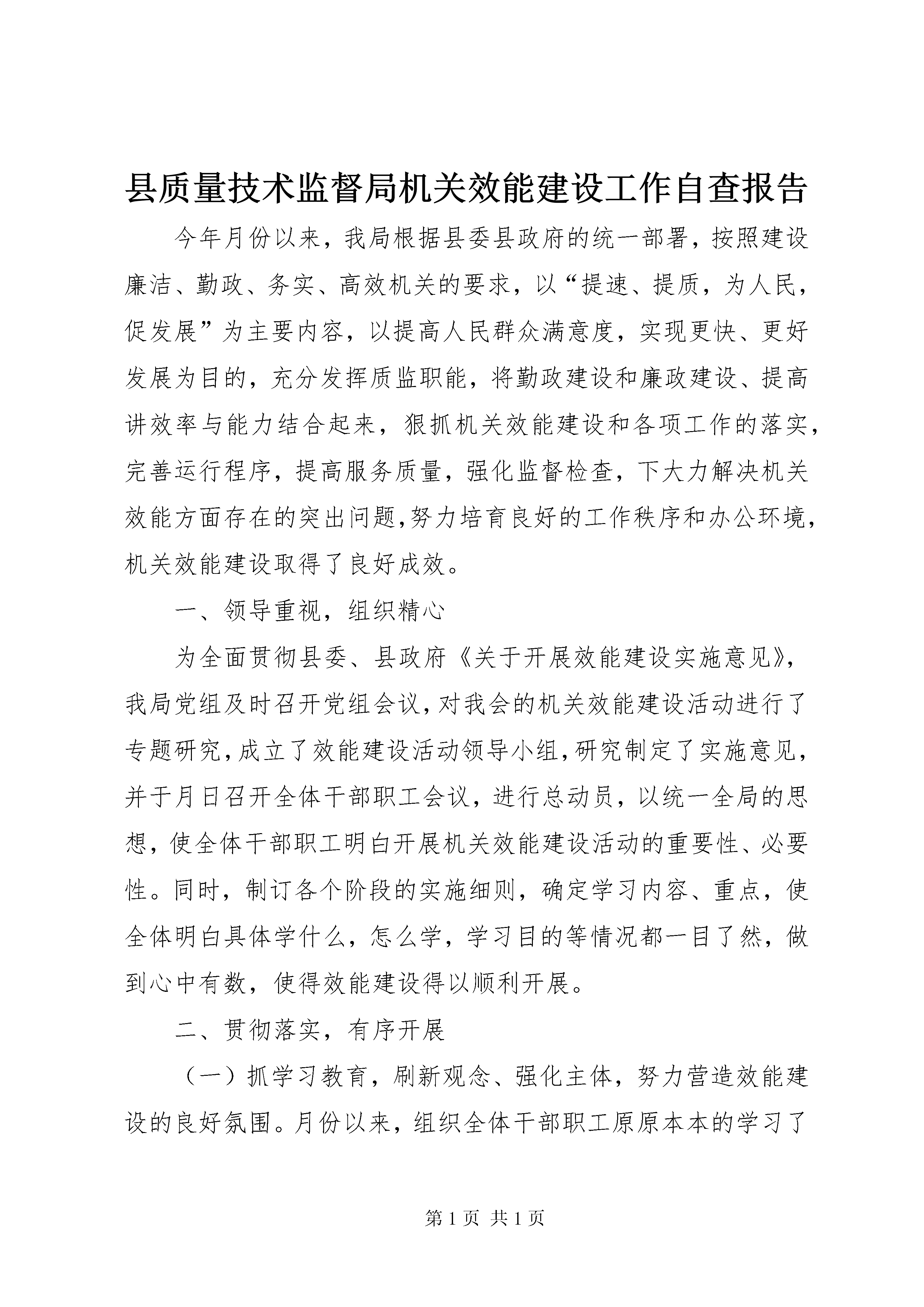 县质量技术监督局机关效能建设工作自查报告今年月份以来,我局根据县委县政府的统一部署,按照建设廉洁、勤政、务实、高效机关的要求,以“提速、提质,为人民,促发展”为主要内容,以提高人民群众满意度,实现更快、更好发展为目的,充分发挥质监职能,将勤政建设和廉政建设、提高讲效率与能力结合起来,狠抓机关效能建设和各项工作的落实,完善运行程序,提高服务质量,强化监督检查,下大力解决机关效能方面存在的突出问题,努力培育良好的工作秩序和办公环境,机关效能建设取得了良好成效。一、领导重视,组织精心为全面贯彻县委、县政府《关于开展效能建设实施意见》,我局党组及时召开党组会议,对我会的机关效能建设活动进行了专题研究,成立了效能建设活动领导小组,研究制定了实施意见,并于月日召开全体干部职工会议,进行总动员,以统一全局的思想,使全体干部职工明白开展机关效能建设活动的重要性、必要性。同时,制订各个阶段的实施细则,确定学习内容、重点,使全体明白具体学什么,怎么学,学习目的等情况都一目了然,做到心中有数,使得效能建设得以顺利开展。二、贯彻落实,有序开展(一)抓学习教育,刷新观念、强化主体,努力营造效能建设的良好氛围。月份以来,组织全体干部职工原原本本的学习了《XX县区机关效能建设实施意见》、《中国共产党纪律处分条例》、《中国共产党党内监督条例》等有关文件,深入开展“讲认识、找差距、谈体会”活动,形成了全局一盘棋,上下一个调,人人讲效能的良好氛围,使全体干部逐渐认识到加强机关效能建设是实践“三个代表”重要思想的需要,并要求每个干部都写出学习体会和剖析材料。通过学习,进一步统一了思想,明确了职责,激发了全体干部参与效能建设的热情,积极争创“学习型机关”,争当“高效廉洁公务员”的积极性。(二)强化机关效能建设,创建优质高效服务型机关。结合我局实际,认真开展八项“整治”:整治政令不畅、文山会海、作风不端正、办事难、行为不规范、检查评比过多过滥、公款大吃大喝、公款出国热等问题。通过自身找、群众提、认真查问题,坚持有什么问题就查找什么问题,什么问题突出就解决什么问题,尤其注意解决影响我县改革发展稳定大局,人民群众关注、反映强烈涉及效能方面的问题,全面提高工作效率和工作质量。(三)抓制度建设,健全机制,完善制度,确保效能建设取得成效。开展机关效能建设以来,我会从两方面入手加强了制度建设,以机关效能建设的制度化、规范化和科学化为目标,建立和完善了各项制度。一是深化机关“周一学习日”制度,坚持每星期至少学习一次,每月集中学习至少二次,并建立学习汇报交流制度,坚持集中学习和自学相结合,学习政治理论、法律法规、经济管理等知识,改善知识结构,提高政治文化素质和业务水平。二是建立和完善首问责任制、岗位责任制、服务承诺制等机关管理和服务方面的制度和规定,理顺机关职能,规范运行机制,将每一项工作责任到人,继续推行首问责任制。深入到企业中进行调查研究,了解他们的需求,切实帮扶企业,尽力解决他们的实际困难和问题。三是建立和完善社会公示、听证、专家咨询等科学民主决策的规则和程序,进一步建立绩效考核制。四是健全党风廉政建设责任制。明确责任分工,狠抓工作落实,强化检查考核,严格责任追究,认真落实责任制,认真抓好落实,严格执行廉洁自律各项规定,促进党内监督的有序开展和执行纪律的严肃性,执政为民,立党为公。通过建章立制,以岗位责任制明确了工作职责,以承诺服务制明确了为民服务内容,以公开办事制推进了政务公开,以民主决策制强化了群众监督,以绩效考核制评价了工作实绩,以纠错追究制严肃了工作纪律,进一步量化了工作标准,规范了工作程序,堵塞了管理漏洞,完善了工作运行机制,实现了以制度规范行为,以制度管人管事。(四)抓督查,推动效能建设的巩固和发展。为实现有效监督,扎实推进效能建设工作。我局进行“查办事拖拉,促优质高效;查作风飘浮,促求真务实;查敷衍塞责,促勤勉敬业”等“五查五促”的督查,推动效能建设深入发展。为了提高工作效率,避免工作上的相互交叉,确定专人抓督查,加大检查力度,不定期对各股室进行工作检查,督促他们不断提高工作效能。公务员之家版权所有三、存在的突出问题及整改措施虽然我局机关效能建设工作取得了一定的成效,但离上级的要求和群众的期望还有一定距离,存在一些不足:一是制度建设执行上还不够到位。开展机关效能建设工作以来,相应制定了一整套规章制度,但有的制度缺乏检查监督机制,执行起来随意性较大;有的只把制度写在纸上,挂在墙上,讲在嘴上,没有落到实处,出现了有章不循,制度落实不够到位的现象。二是工作开展还不够平衡。有的股室对机关效能建设较重视,工作抓得紧,行动快,落实较好。有的股室抓机关效能建设的意识不强,对效能建设长期性、重要性认识不足,工作缺乏主动性、存在着应付检查的现象。有些干部对