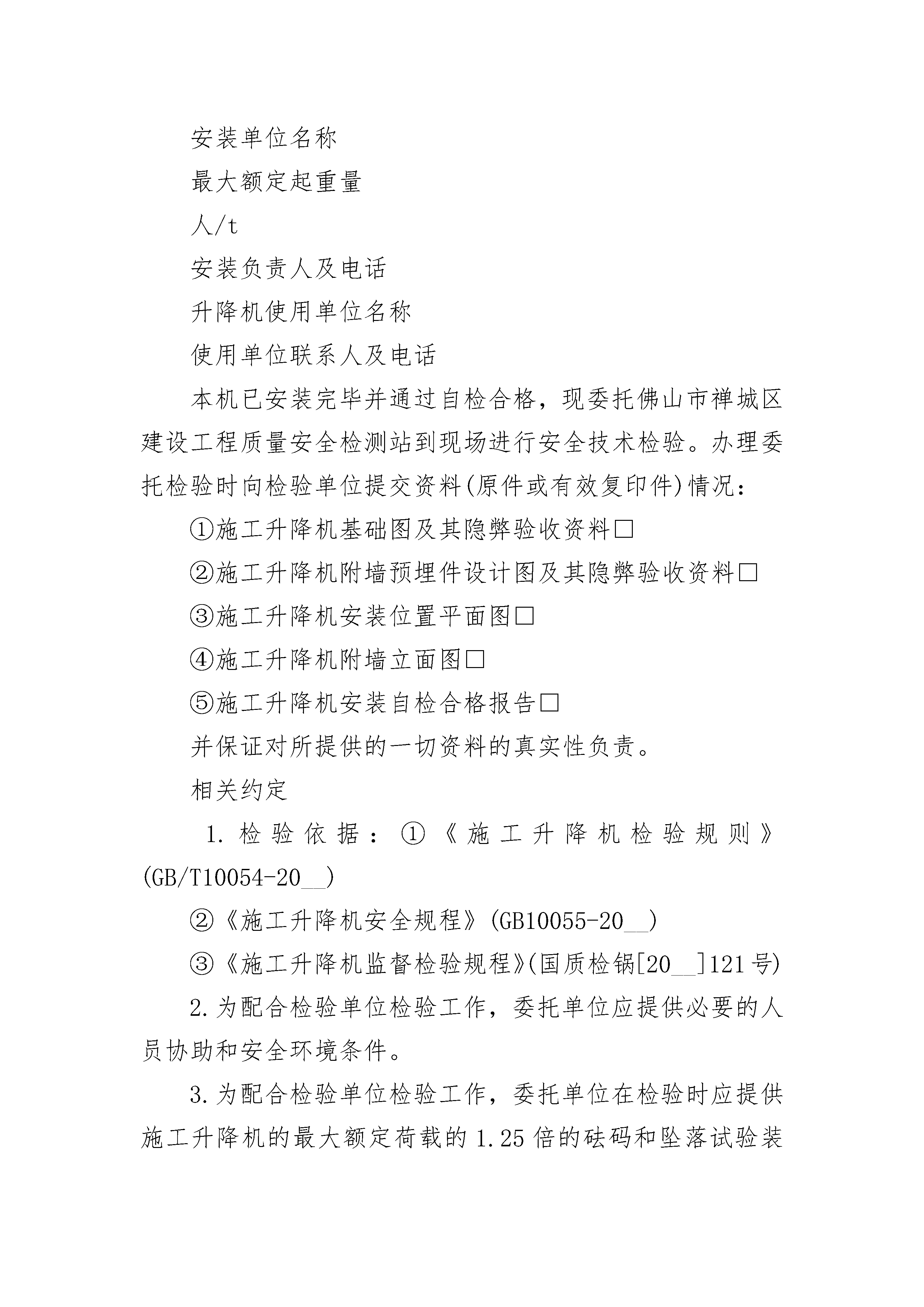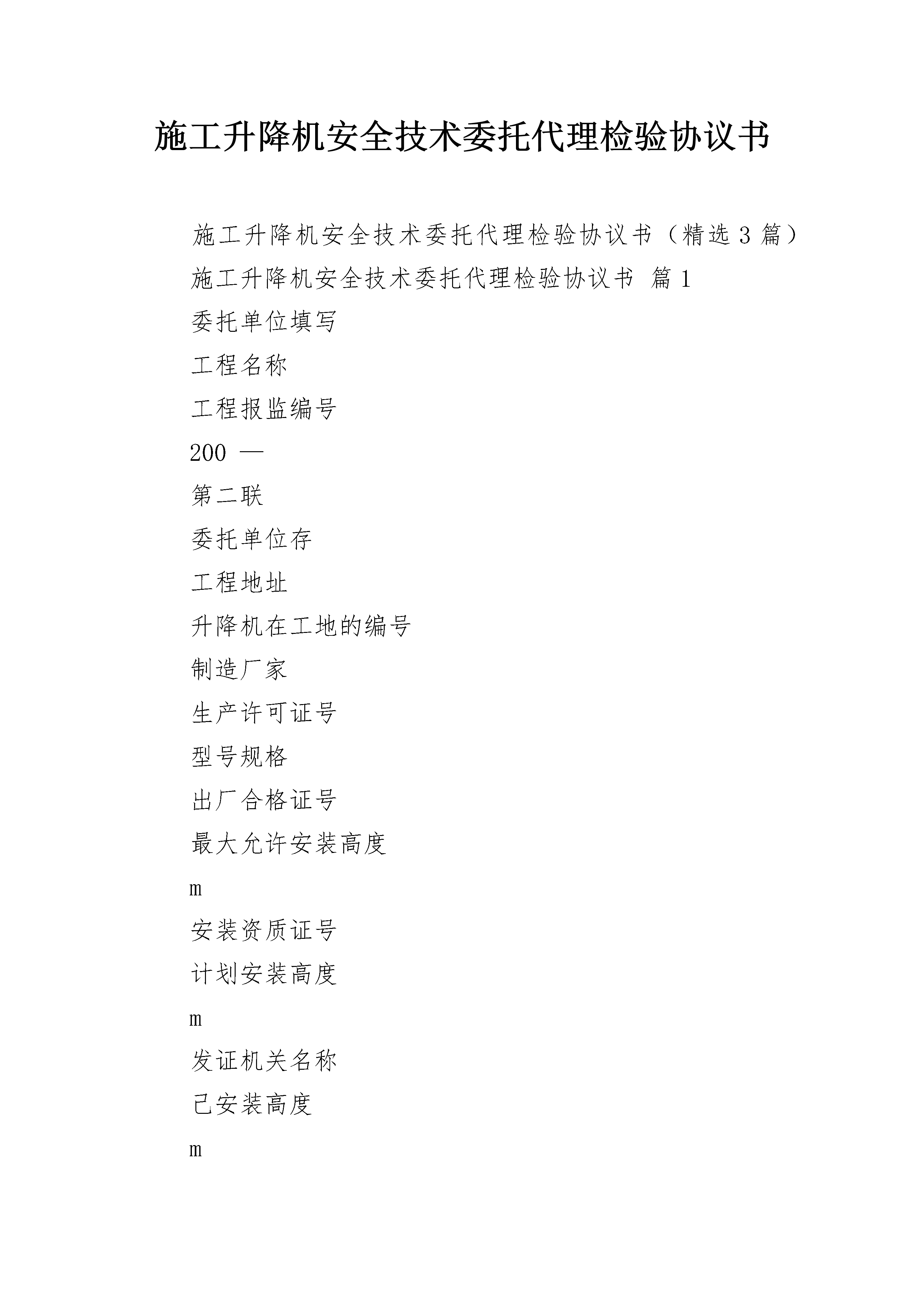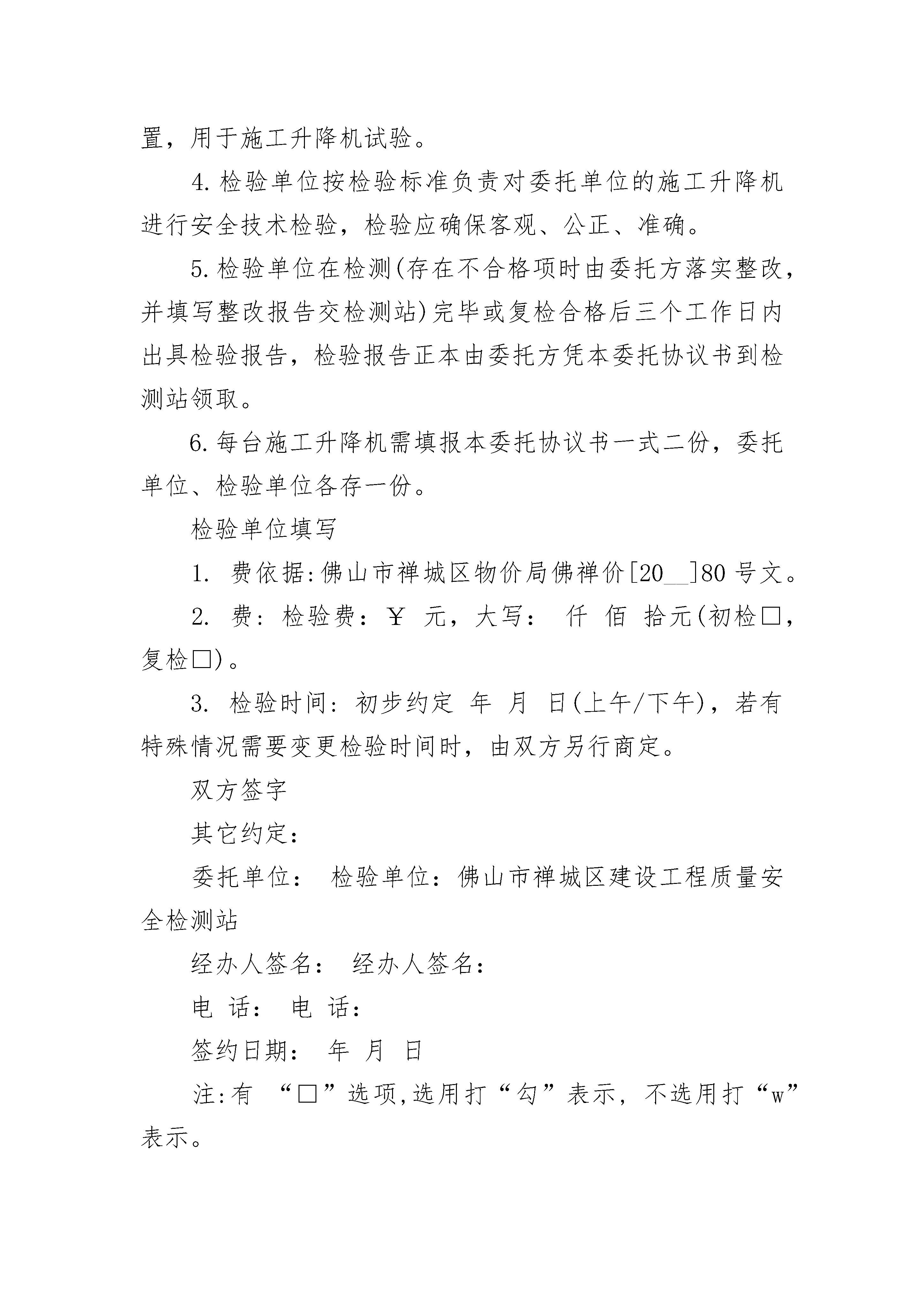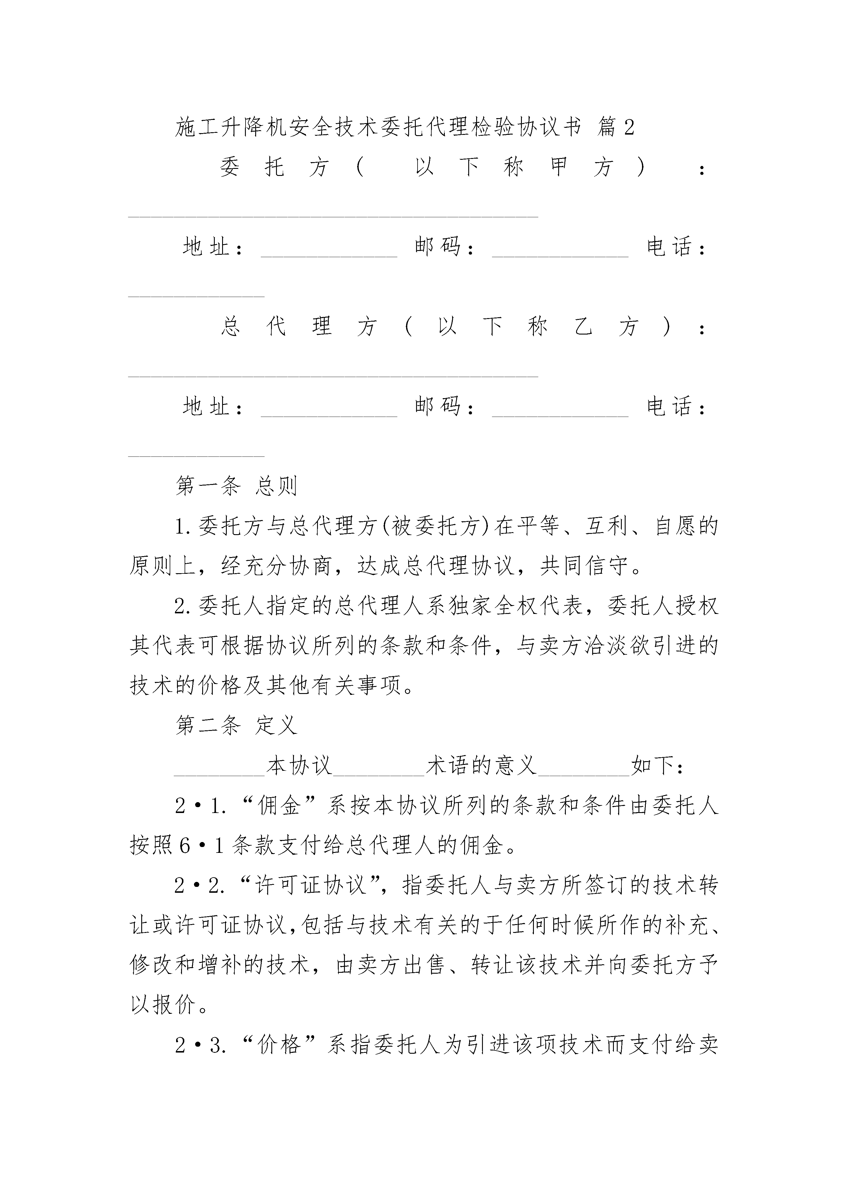 施工升降机安全技术委托代理检验协议书施工升降机安全技术委托代理检验协议书(精选3篇)施工升降机安全技术委托代理检验协议书篇1委托单位填写工程名称工程报监编号200—第二联委托单位存工程地址升降机在工地的编号制造厂家生产许可证号型号规格出厂合格证号最大允许安装高度m安装资质证号计划安装高度m发证机关名称己安装高度m安装单位名称最大额定起重量人/t安装负责人及电话升降机使用单位名称使用单位联系人及电话本机已安装完毕并通过自检合格,现委托佛山市禅城区建设工程质量安全检测站到现场进行安全技术检验。办理委托检验时向检验单位提交资料(原件或有效复印件)情况:①施工升降机基础图及其隐弊验收资料□②施工升降机附墙预埋件设计图及其隐弊验收资料□③施工升降机安装位置平面图□④施工升降机附墙立面图□⑤施工升降机安装自检合格报告□并保证对所提供的一切资料的真实性负责。相关约定1.检验依据:①《施工升降机检验规则》(GB/T10054-20__)②《施工升降机安全规程》(GB10055-20__)③《施工升降机监督检验规程》(国质检锅[20__]121号)2.为配合检验单位检验工作,委托单位应提供必要的人员协助和安全环境条件。3.为配合检验单位检验工作,委托单位在检验时应提供施工升降机的最大额定荷载的1.25倍的砝码和坠落试验装置,用于施工升降机试验。4.检验单位按检验标准负责对委托单位的施工升降机进行安全技术检验,检验应确保客观、公正、准确。5.检验单位在检测(存在不合格项时由委托方落实整改,并填写整改报告交检测站)完毕或复检合格后三个工作日内出具检验报告,检验报告正本由委托方凭本委托协议书到检测站领取。6.每台施工升降机需填报本委托协议书一式二份,委托单位、检验单位各存一份。检验单位填写1.费依据:佛山市禅城区物价局佛禅价[20__]80号文。2.费:检验费:¥元,大写:仟佰拾元(初检□,复检□)。3.检验时间:初步约定年月日(上午/下午),若有特殊情况需要变更检验时间时,由双方另行商定。双方签字其它约定:委托单位:检验单位:佛山市禅城区建设工程质量安全检测站经办人签名:经办人签名:电话:电话:签约日期:年月日注:有“□”选项,选用打“勾”表示,不选用打“w”表示。施工升降机安全技术委托代理检验协议书篇2委托方(以下称甲方):____________________________________地址:____________邮码:____________电话:____________总代理方(以下称乙方):____________________________________地址:____________邮码:____________电话:____________第一条总则1.委托方与总代理方(被委托方)在平等、互利、自愿的原则上,经充分协商,达成总代理协议,共同信守。2.委托人指定的总代理人系独家全权代表,委托人授权其代表可根据协议所列的条款和条件,与卖方洽淡欲引进的技术的价格及其他有关事项。第二条定义________本协议________术语的意义________如下:2·1.“佣金”系按本协议所列的条款和条件由委托人按照6·1条款支付给总代理人的佣金。2·2.“许可证协议”,指委托人与卖方所签订的技术转让或许可证协议,包括与技术有关的于任何时候所作的补充、修改和增补的技术,由卖方出售、转让该技术并向委托方予以报价。2·3.“价格”系指委托人为引进该项技术而支付给卖方的款额。第三条总代理3·1.委托人指定其总代理人,系为独家全权总代理,代表委托人与卖方洽淡引进该项技术应付的价款及有关许可证协议的条款和条件,并代表委托人联系有关事项。总代理人愿意接受此委托。3·2.在协议有效期内,委托人不得指定其他任何人为其代理人洽淡引进该项技术的价格及有关许可证协议的条款和条件,或代表委托人联系有关任何事项。3·3.根据协议,总代理人作为委托的独家全权代理,代表委托人洽淡本许可证的协议为引进该项目,为此,一旦成交,予以承认并生效。委托人与卖方洽淡该项技术的价格及其他条款和条件,经谈妥各方当事人正式签署许可证协议及总代理取得佣金,其总代理终止。3·4.本协议的委托人与总代理人不因委托代理成合股关系,亦不因此获得本协议指定范围外的代理权。第四条总代理人的职责4·1.必须努力与卖方洽淡,向卖方取得最好的价格及最优惠的条款和条件,便于委托人获得该项技术的转让并尽速签订许可证协议。4·2.在洽淡转让及引进该项技术的过程中,总代理人与卖方洽淡中若出现任何争议、分歧或僵局,应立刻向委托人提供有关详情,并就此事与委托人磋商。甲方:乙方:签约地点:施工升降机安全技术委托代理检验协议书篇3委托方(甲方):受托方(乙方):身份证号:身份证号码:地址:地址:电话:电话:传真: