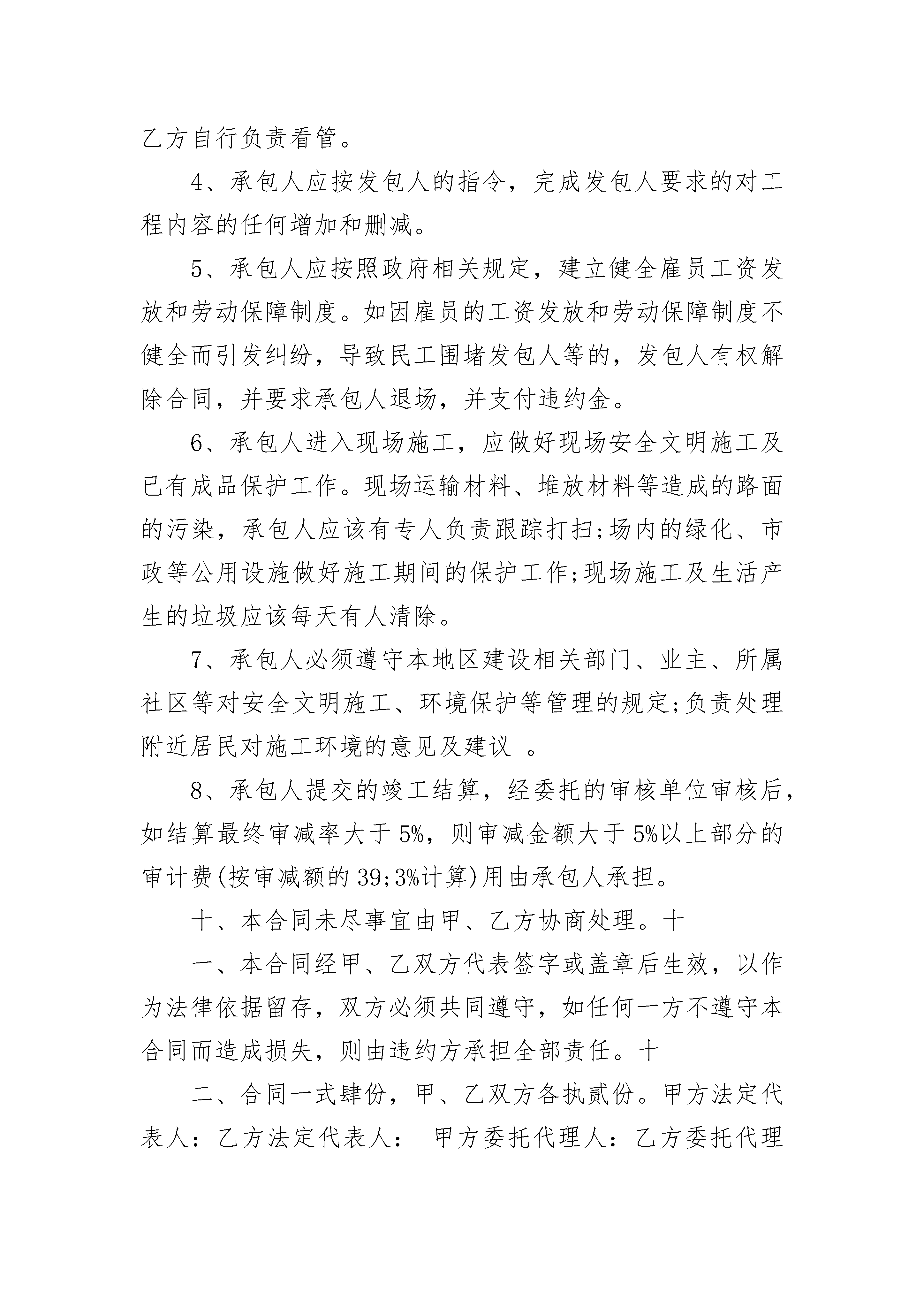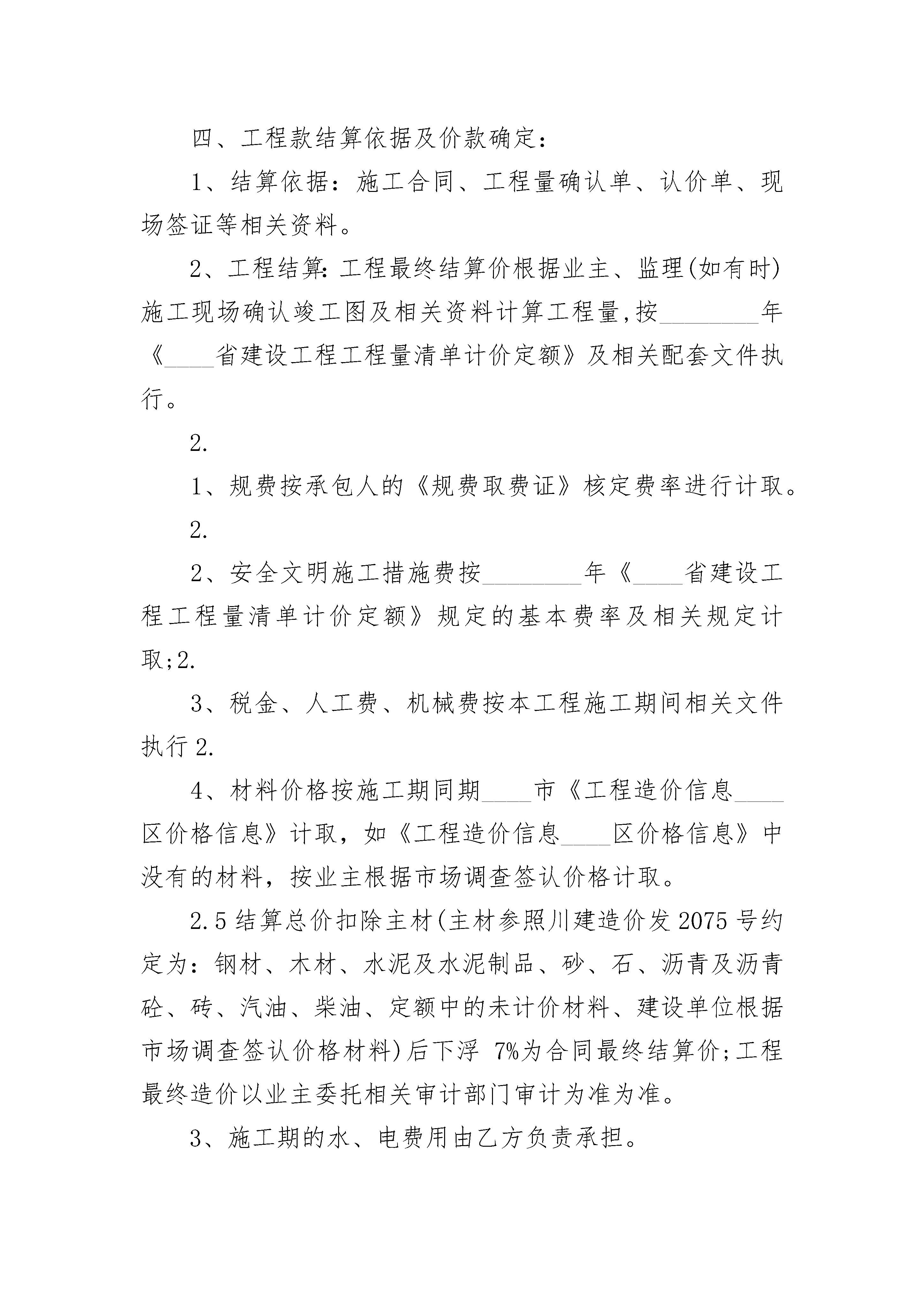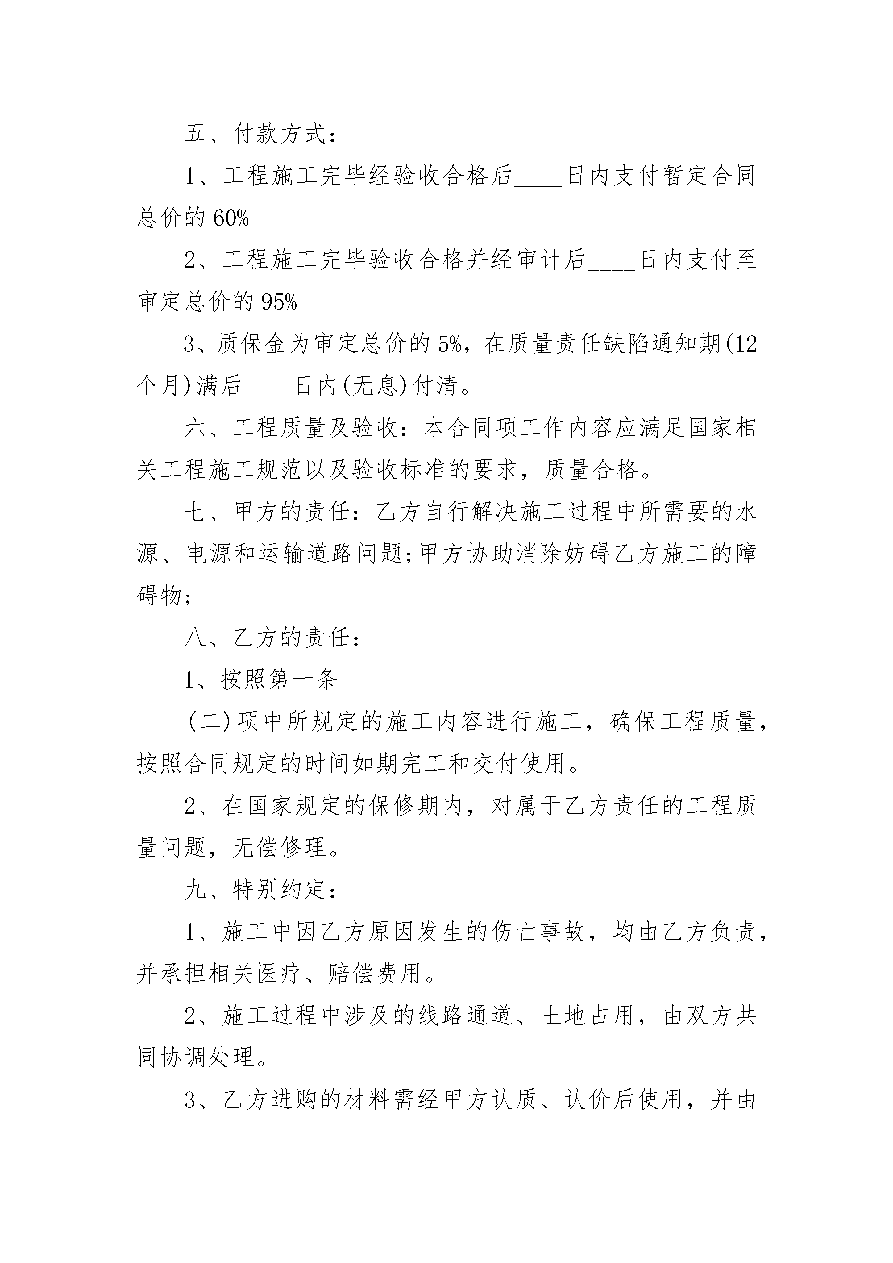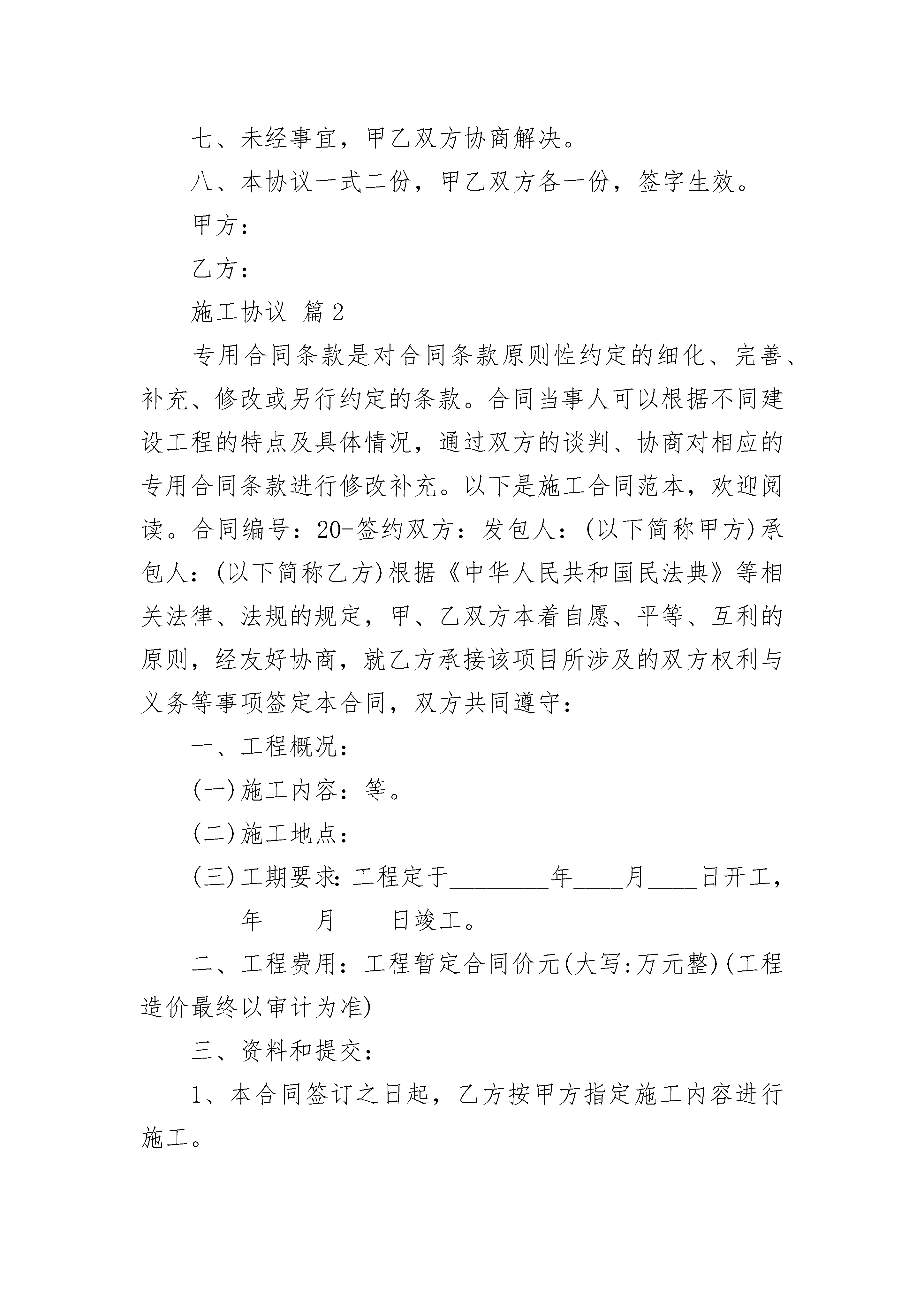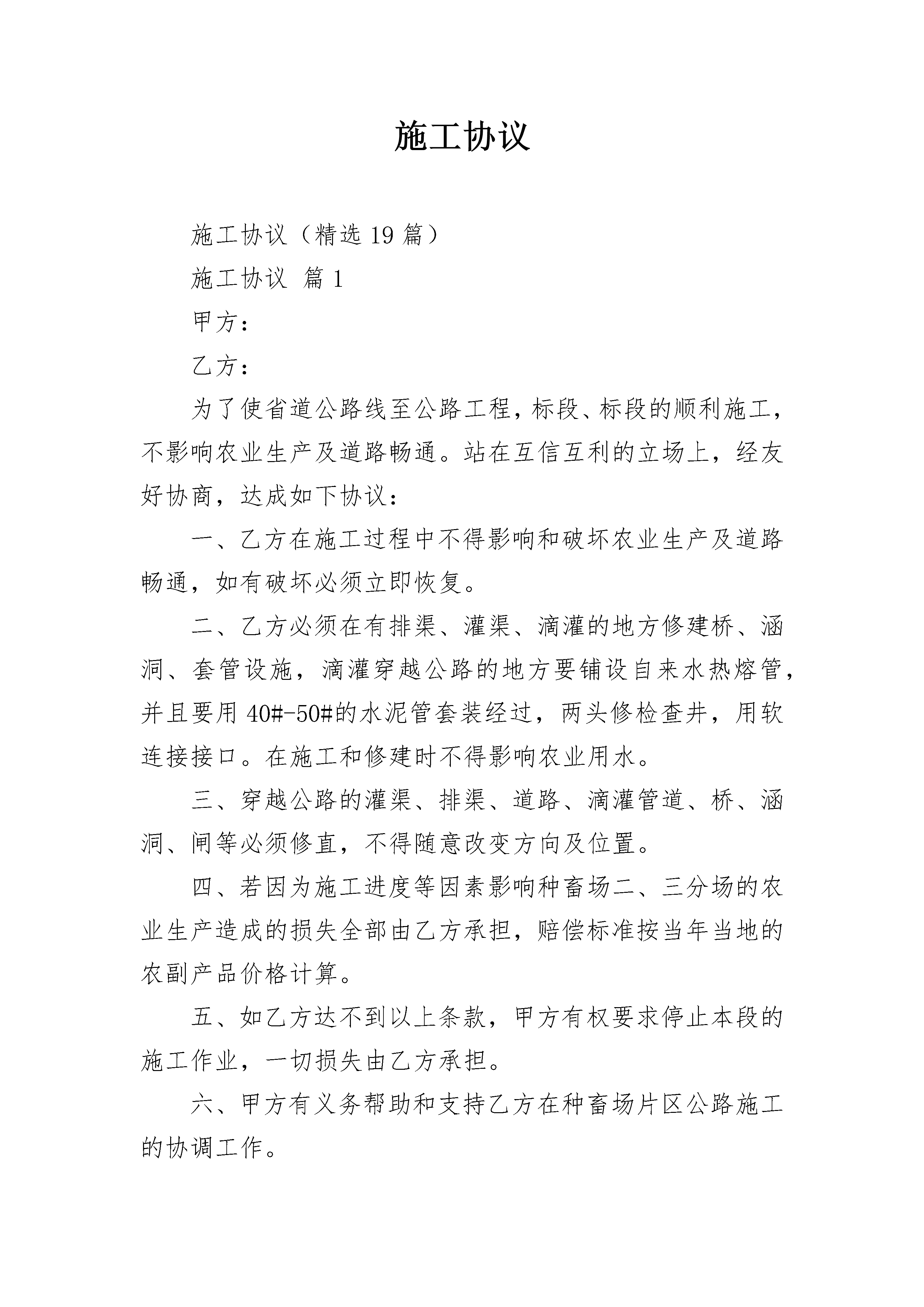 施工协议施工协议(精选19篇)施工协议篇1甲方:乙方:为了使省道公路线至公路工程,标段、标段的顺利施工,不影响农业生产及道路畅通。站在互信互利的立场上,经友好协商,达成如下协议:一、乙方在施工过程中不得影响和破坏农业生产及道路畅通,如有破坏必须立即恢复。二、乙方必须在有排渠、灌渠、滴灌的地方修建桥、涵洞、套管设施,滴灌穿越公路的地方要铺设自来水热熔管,并且要用40#-50#的水泥管套装经过,两头修检查井,用软连接接口。在施工和修建时不得影响农业用水。三、穿越公路的灌渠、排渠、道路、滴灌管道、桥、涵洞、闸等必须修直,不得随意改变方向及位置。四、若因为施工进度等因素影响种畜场二、三分场的农业生产造成的损失全部由乙方承担,赔偿标准按当年当地的农副产品价格计算。五、如乙方达不到以上条款,甲方有权要求停止本段的施工作业,一切损失由乙方承担。六、甲方有义务帮助和支持乙方在种畜场片区公路施工的协调工作。七、未经事宜,甲乙双方协商解决。八、本协议一式二份,甲乙双方各一份,签字生效。甲方:乙方:施工协议篇2专用合同条款是对合同条款原则性约定的细化、完善、补充、修改或另行约定的条款。合同当事人可以根据不同建设工程的特点及具体情况,通过双方的谈判、协商对相应的专用合同条款进行修改补充。以下是施工合同范本,欢迎阅读。合同编号:20-签约双方:发包人:(以下简称甲方)承包人:(以下简称乙方)根据《中华人民共和国民法典》等相关法律、法规的规定,甲、乙双方本着自愿、平等、互利的原则,经友好协商,就乙方承接该项目所涉及的双方权利与义务等事项签定本合同,双方共同遵守:一、工程概况:(一)施工内容:等。(二)施工地点:(三)工期要求:工程定于________年____月____日开工,________年____月____日竣工。二、工程费用:工程暂定合同价元(大写:万元整)(工程造价最终以审计为准)三、资料和提交:1、本合同签订之日起,乙方按甲方指定施工内容进行施工。四、工程款结算依据及价款确定:1、结算依据:施工合同、工程量确认单、认价单、现场签证等相关资料。2、工程结算:工程最终结算价根据业主、监理(如有时)施工现场确认竣工图及相关资料计算工程量,按________年《____省建设工程工程量清单计价定额》及相关配套文件执行。2.1、规费按承包人的《规费取费证》核定费率进行计取。2.2、安全文明施工措施费按________年《____省建设工程工程量清单计价定额》规定的基本费率及相关规定计取;2.3、税金、人工费、机械费按本工程施工期间相关文件执行2.4、材料价格按施工期同期____市《工程造价信息____区价格信息》计取,如《工程造价信息____区价格信息》中没有的材料,按业主根据市场调查签认价格计取。2.5结算总价扣除主材(主材参照川建造价发2075号约定为:钢材、木材、水泥及水泥制品、砂、石、沥青及沥青砼、砖、汽油、柴油、定额中的未计价材料、建设单位根据市场调查签认价格材料)后下浮7%为合同最终结算价;工程最终造价以业主委托相关审计部门审计为准为准。3、施工期的水、电费用由乙方负责承担。五、付款方式:1、工程施工完毕经验收合格后____日内支付暂定合同总价的60%2、工程施工完毕验收合格并经审计后____日内支付至审定总价的95%3、质保金为审定总价的5%,在质量责任缺陷通知期(12个月)满后____日内(无息)付清。六、工程质量及验收:本合同项工作内容应满足国家相关工程施工规范以及验收标准的要求,质量合格。七、甲方的责任:乙方自行解决施工过程中所需要的水源、电源和运输道路问题;甲方协助消除妨碍乙方施工的障碍物;八、乙方的责任:1、按照第一条(二)项中所规定的施工内容进行施工,确保工程质量,按照合同规定的时间如期完工和交付使用。2、在国家规定的保修期内,对属于乙方责任的工程质量问题,无偿修理。九、特别约定:1、施工中因乙方原因发生的伤亡事故,均由乙方负责,并承担相关医疗、赔偿费用。2、施工过程中涉及的线路通道、土地占用,由双方共同协调处理。3、乙方进购的材料需经甲方认质、认价后使用,并由乙方自行负责看管。4、承包人应按发包人的指令,完成发包人要求的对工程内容的任何增加和删减。5、承包人应按照政府相关规定,建立健全雇员工资发放和劳动保障制度。如因雇员的工资发放和劳动保障制度不健全而引发纠纷,导致民工围堵发包人等的,发包人有权解除合同,并要求承包人退场,并支付违约金。6、承包人进入现场施工,应做好现场安全文明施工及已有成品保护工作。现场运输材料、堆放材料等造成的路面的污染,承包人应该有专人负责跟踪打扫;场内的绿化、市政等公用设施做好施工期间的保护工作;现场施工及生活产生的垃圾应该每天有人清除。7、承包人必须遵守本地区建设相关部门、业主、所属社区等对安全