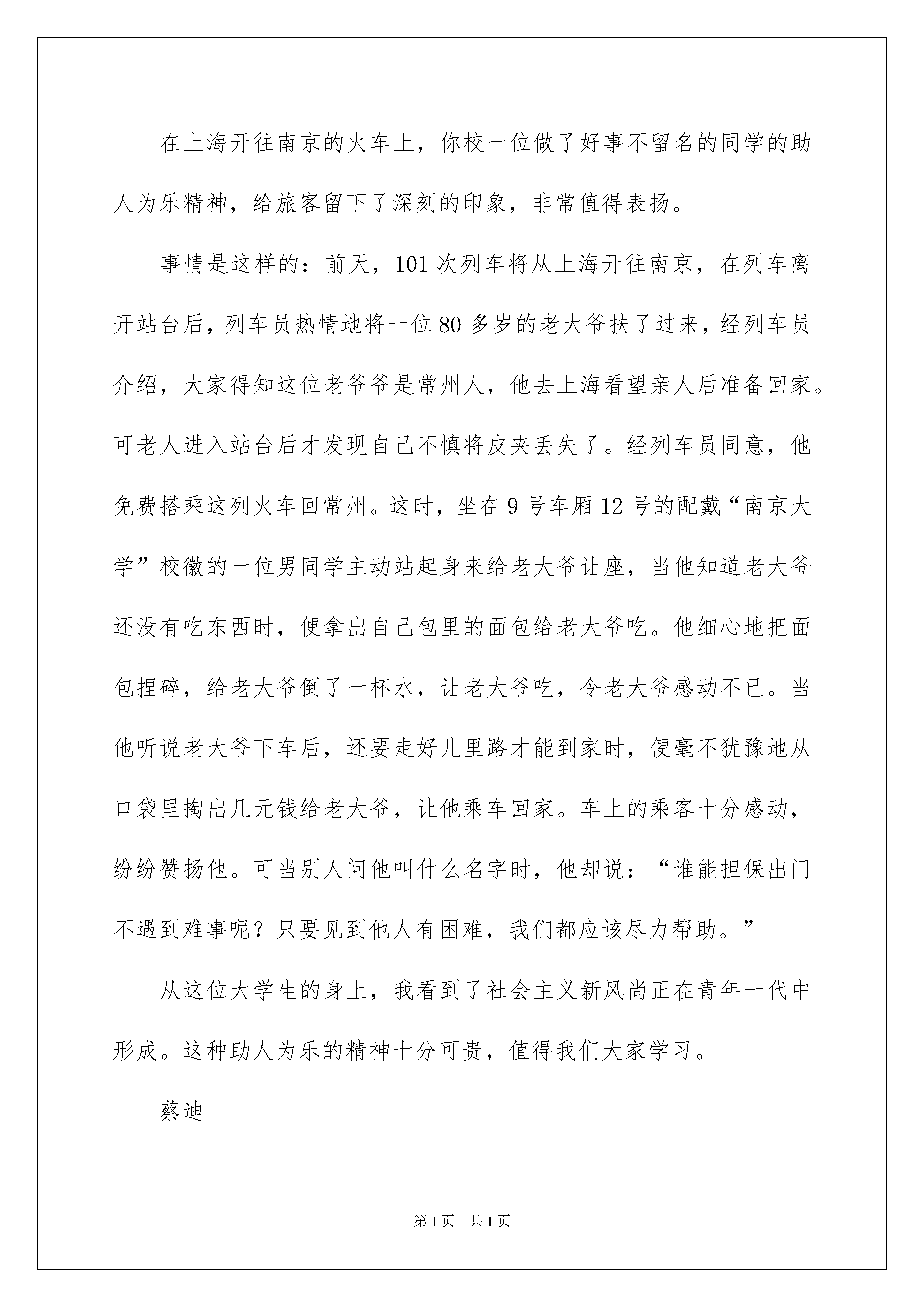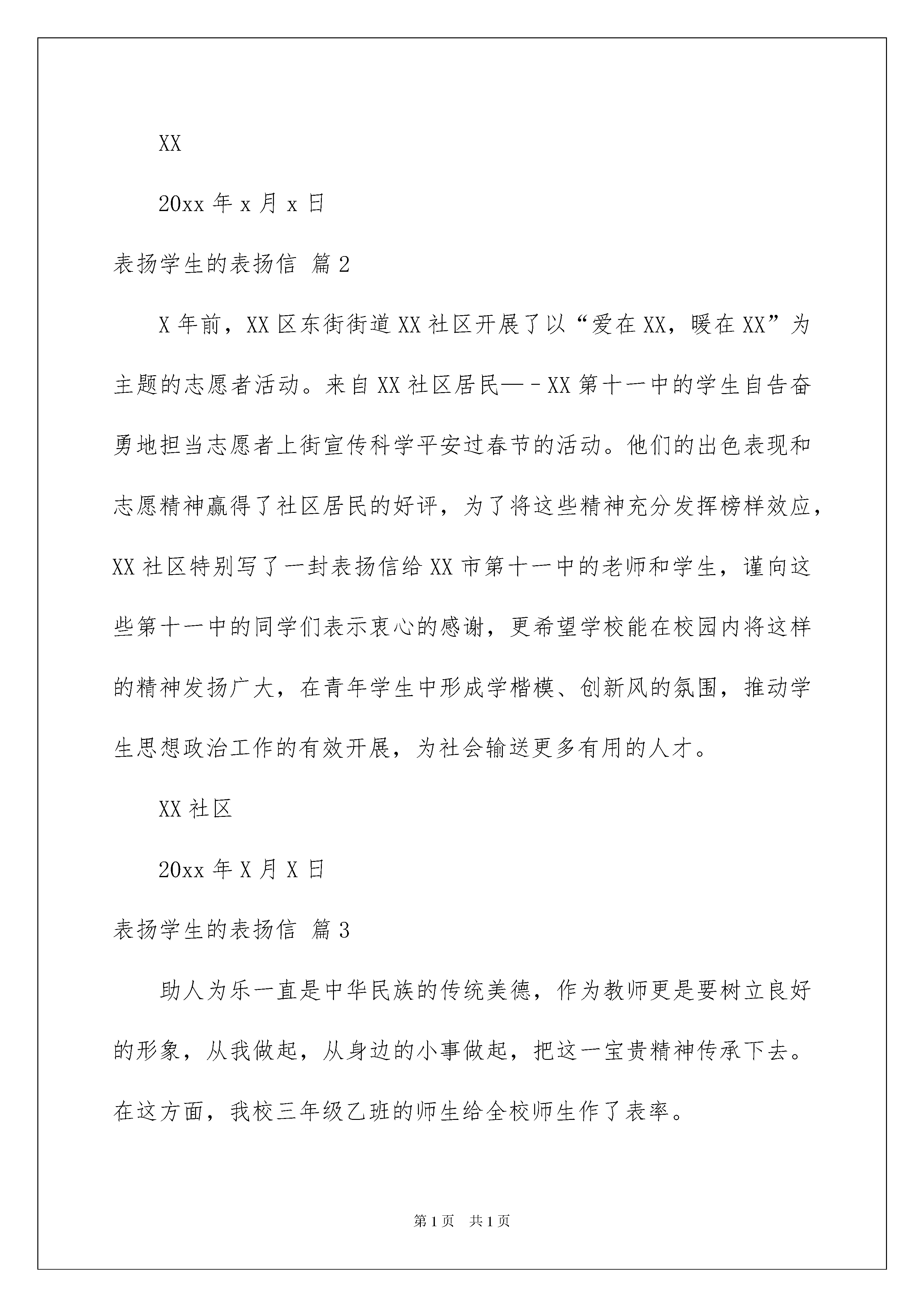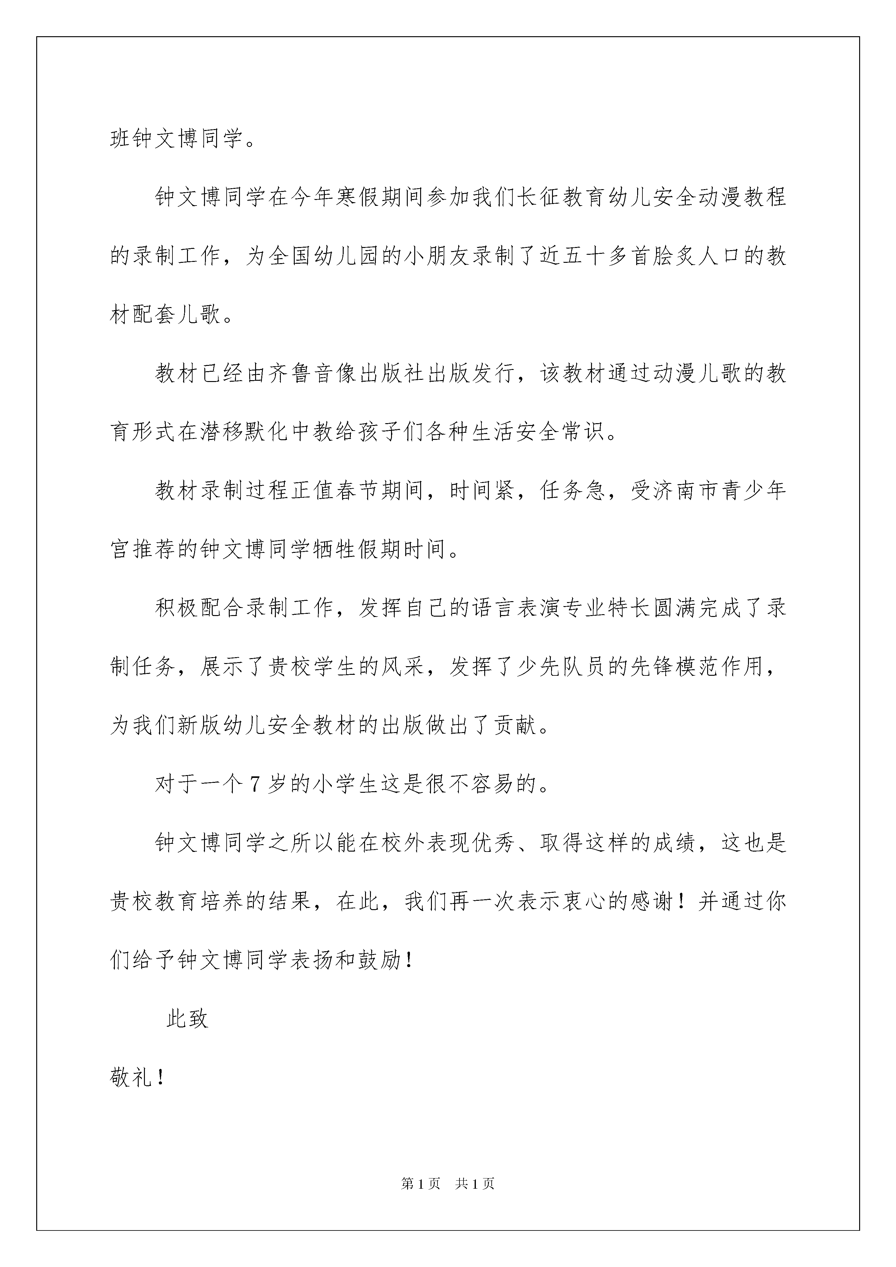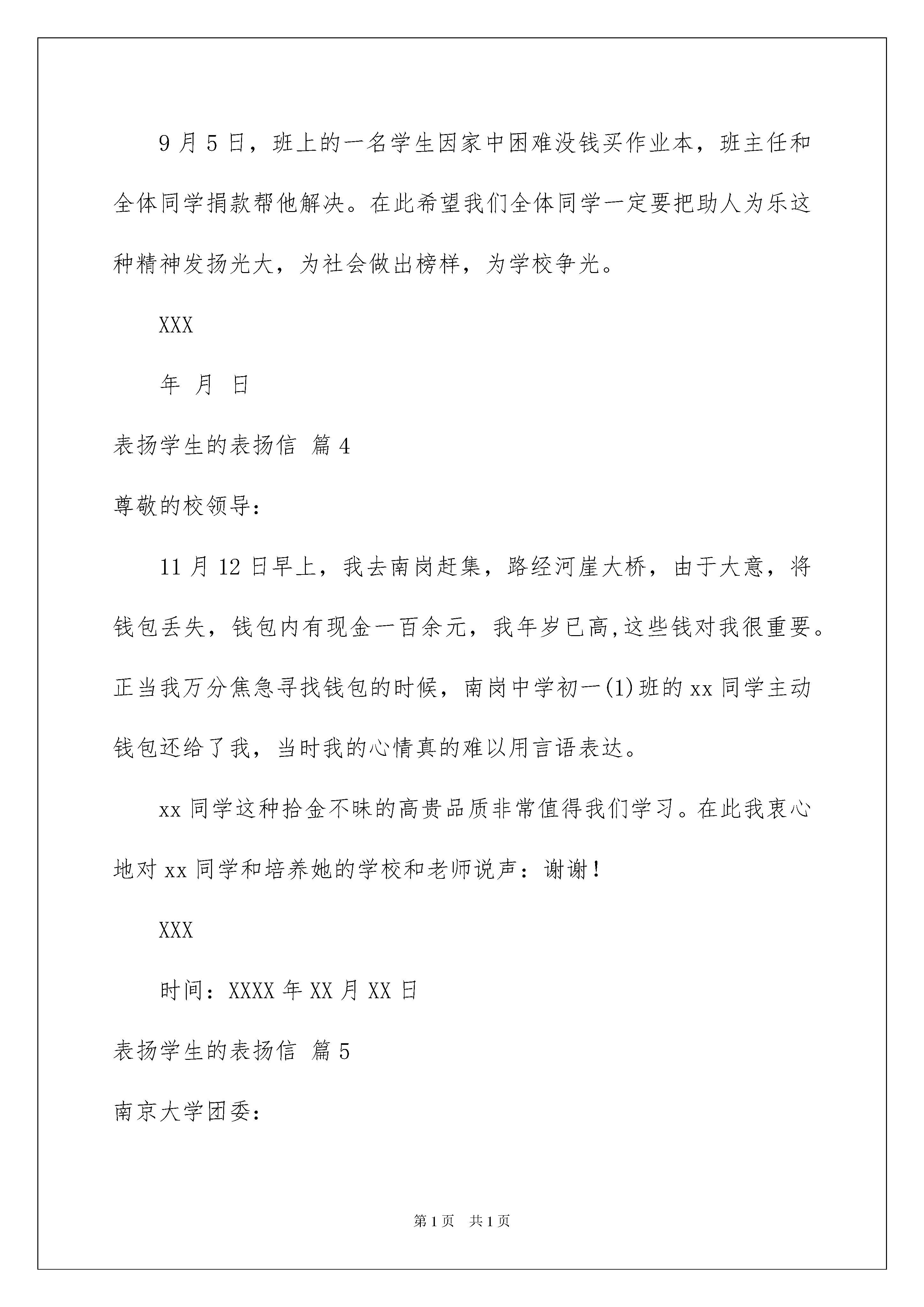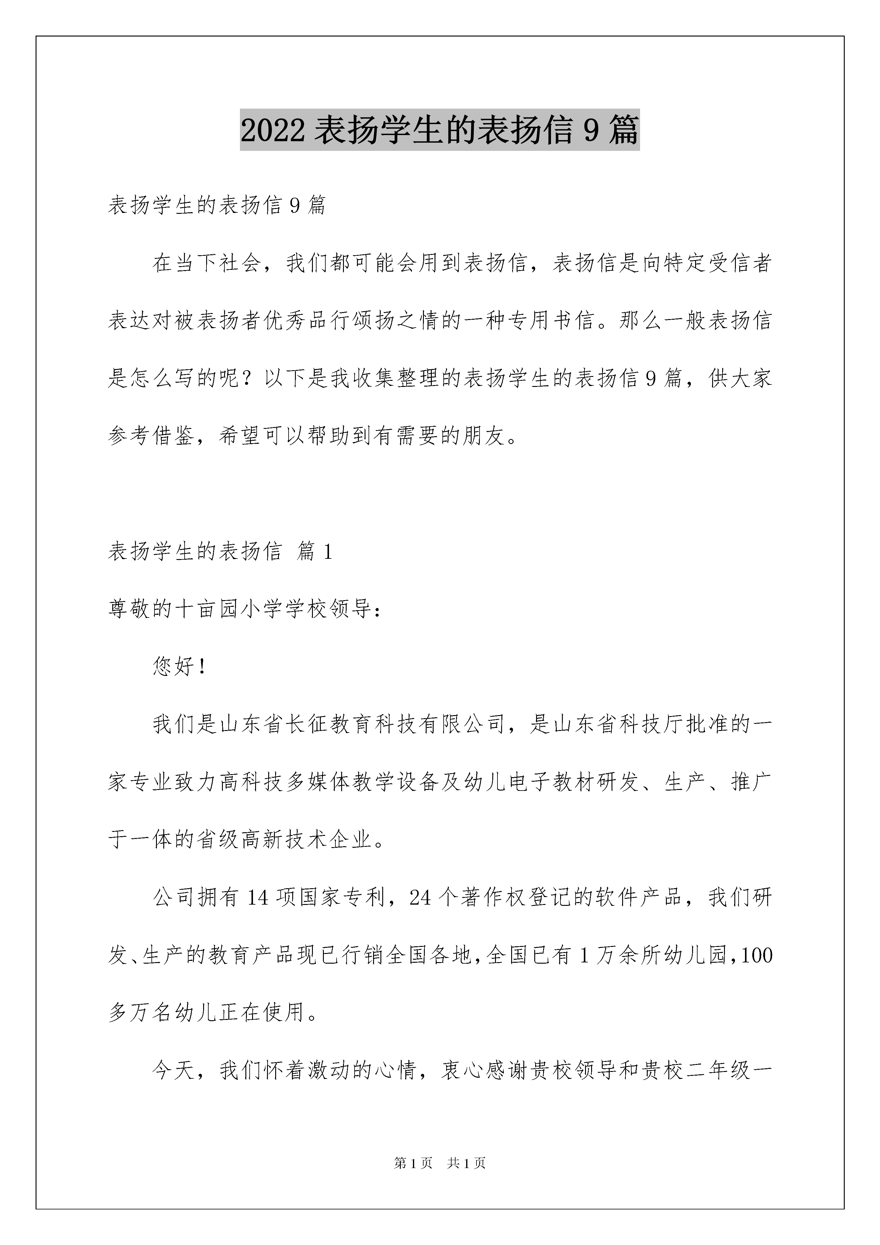 2022表扬学生的表扬信9篇表扬学生的表扬信9篇在当下社会,我们都可能会用到表扬信,表扬信是向特定受信者表达对被表扬者优秀品行颂扬之情的一种专用书信。那么一般表扬信是怎么写的呢?以下是我收集整理的表扬学生的表扬信9篇,供大家参考借鉴,希望可以帮助到有需要的朋友。表扬学生的表扬信篇1尊敬的十亩园小学学校领导:您好!我们是山东省长征教育科技有限公司,是山东省科技厅批准的一家专业致力高科技多媒体教学设备及幼儿电子教材研发、生产、推广于一体的省级高新技术企业。公司拥有14项国家专利,24个著作权登记的软件产品,我们研发、生产的教育产品现已行销全国各地,全国已有1万余所幼儿园,100多万名幼儿正在使用。今天,我们怀着激动的心情,衷心感谢贵校领导和贵校二年级一班钟文博同学。钟文博同学在今年寒假期间参加我们长征教育幼儿安全动漫教程的录制工作,为全国幼儿园的小朋友录制了近五十多首脍炙人口的教材配套儿歌。教材已经由齐鲁音像出版社出版发行,该教材通过动漫儿歌的教育形式在潜移默化中教给孩子们各种生活安全常识。教材录制过程正值春节期间,时间紧,任务急,受济南市青少年宫推荐的钟文博同学牺牲假期时间。积极配合录制工作,发挥自己的语言表演专业特长圆满完成了录制任务,展示了贵校学生的风采,发挥了少先队员的先锋模范作用,为我们新版幼儿安全教材的出版做出了贡献。对于一个7岁的小学生这是很不容易的。钟文博同学之所以能在校外表现优秀、取得这样的成绩,这也是贵校教育培养的结果,在此,我们再一次表示衷心的感谢!并通过你们给予钟文博同学表扬和鼓励!此致敬礼!XX20xx年x月x日表扬学生的表扬信篇2X年前,XX区东街街道XX社区开展了以“爱在XX,暖在XX”为主题的志愿者活动。来自XX社区居民—–XX第十一中的学生自告奋勇地担当志愿者上街宣传科学平安过春节的活动。他们的出色表现和志愿精神赢得了社区居民的好评,为了将这些精神充分发挥榜样效应,XX社区特别写了一封表扬信给XX市第十一中的老师和学生,谨向这些第十一中的同学们表示衷心的感谢,更希望学校能在校园内将这样的精神发扬广大,在青年学生中形成学楷模、创新风的氛围,推动学生思想政治工作的有效开展,为社会输送更多有用的人才。XX社区20xx年X月X日表扬学生的表扬信篇3助人为乐一直是中华民族的传统美德,作为教师更是要树立良好的形象,从我做起,从身边的小事做起,把这一宝贵精神传承下去。在这方面,我校三年级乙班的师生给全校师生作了表率。9月5日,班上的一名学生因家中困难没钱买作业本,班主任和全体同学捐款帮他解决。在此希望我们全体同学一定要把助人为乐这种精神发扬光大,为社会做出榜样,为学校争光。XXX年月日表扬学生的表扬信篇4尊敬的校领导:11月12日早上,我去南岗赶集,路经河崖大桥,由于大意,将钱包丢失,钱包内有现金一百余元,我年岁已高,这些钱对我很重要。正当我万分焦急寻找钱包的时候,南岗中学初一(1)班的xx同学主动钱包还给了我,当时我的心情真的难以用言语表达。xx同学这种拾金不昧的高贵品质非常值得我们学习。在此我衷心地对xx同学和培养她的学校和老师说声:谢谢!XXX时间:XXXX年XX月XX日表扬学生的表扬信篇5南京大学团委:在上海开往南京的火车上,你校一位做了好事不留名的同学的助人为乐精神,给旅客留下了深刻的印象,非常值得表扬。事情是这样的:前天,101次列车将从上海开往南京,在列车离开站台后,列车员热情地将一位80多岁的老大爷扶了过来,经列车员介绍,大家得知这位老爷爷是常州人,他去上海看望亲人后准备回家。可老人进入站台后才发现自己不慎将皮夹丢失了。经列车员同意,他免费搭乘这列火车回常州。这时,坐在9号车厢12号的配戴“南京大学”校徽的一位男同学主动站起身来给老大爷让座,当他知道老大爷还没有吃东西时,便拿出自己包里的面包给老大爷吃。他细心地把面包捏碎,给老大爷倒了一杯水,让老大爷吃,令老大爷感动不已。当他听说老大爷下车后,还要走好儿里路才能到家时,便毫不犹豫地从口袋里掏出几元钱给老大爷,让他乘车回家。车上的乘客十分感动,纷纷赞扬他。可当别人问他叫什么名字时,他却说:“谁能担保出门不遇到难事呢?只要见到他人有困难,我们都应该尽力帮助。”从这位大学生的身上,我看到了社会主义新风尚正在青年一代中形成。这种助人为乐的精神十分可贵,值得我们大家学习。蔡迪20xx年8月14日表扬学生的表扬信篇6年前,XX区东街街道XX社区开展了以“爱在XX,暖在XX”为主题的志愿者活动。来自XX社区居民-----XX第十一中的学生自告奋勇地担当志愿者上街宣传科学平安过春节的活动。他们的出色表现和志