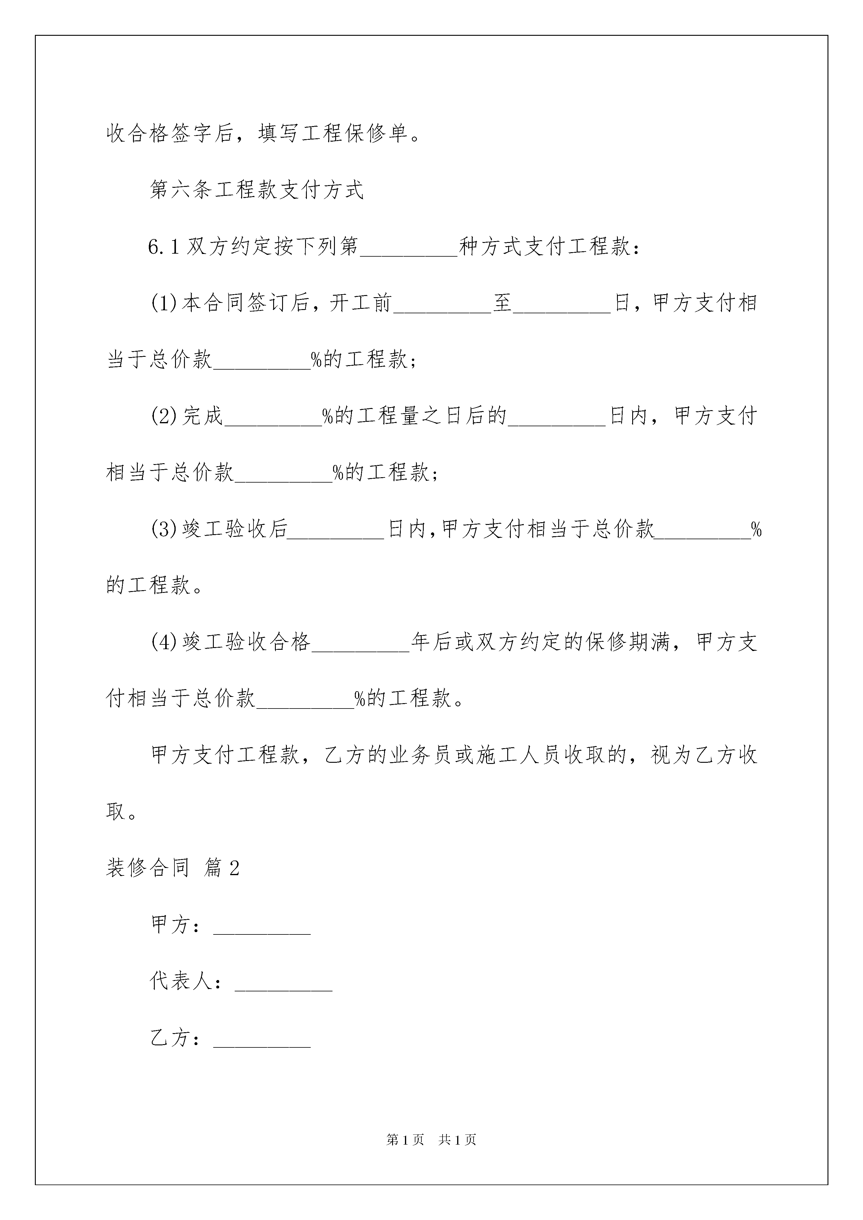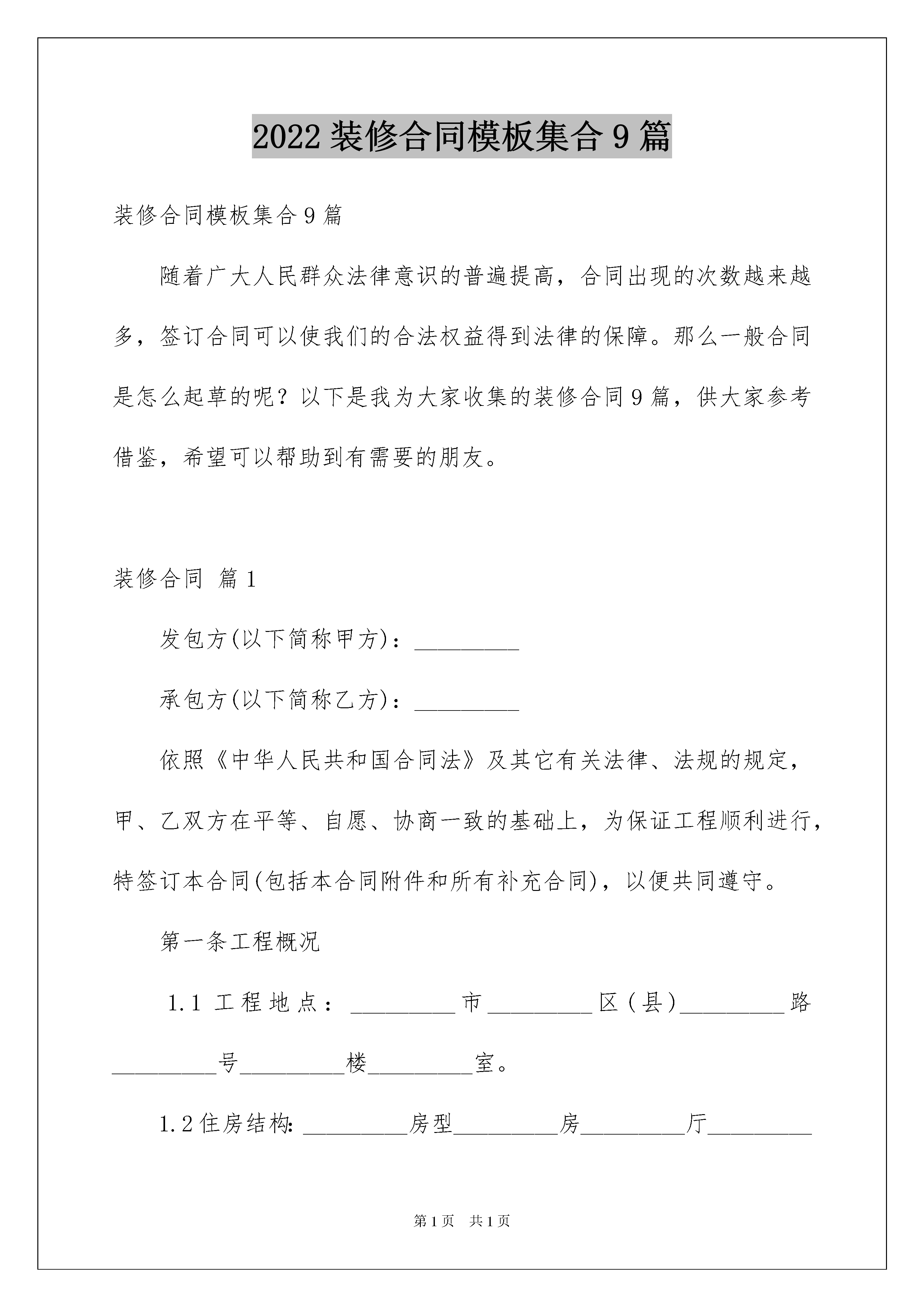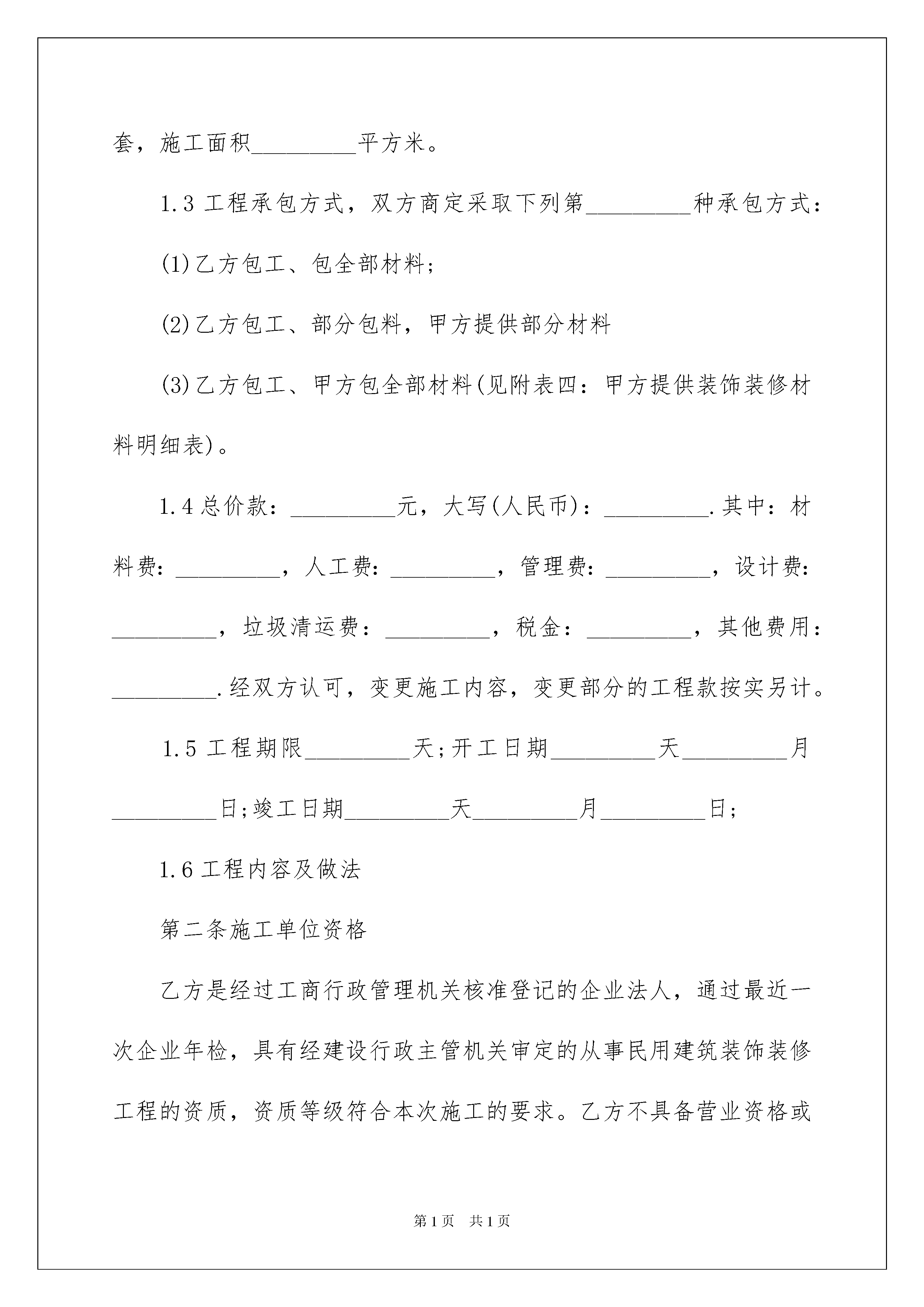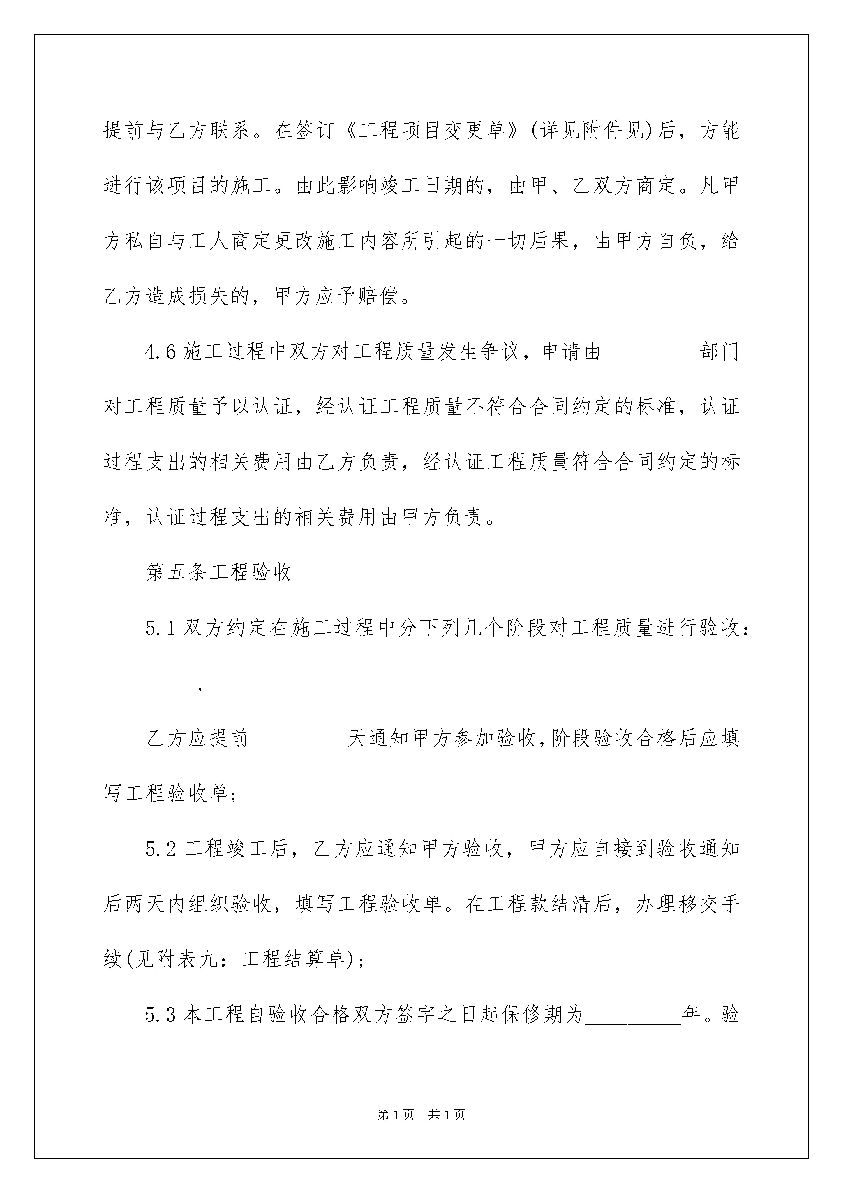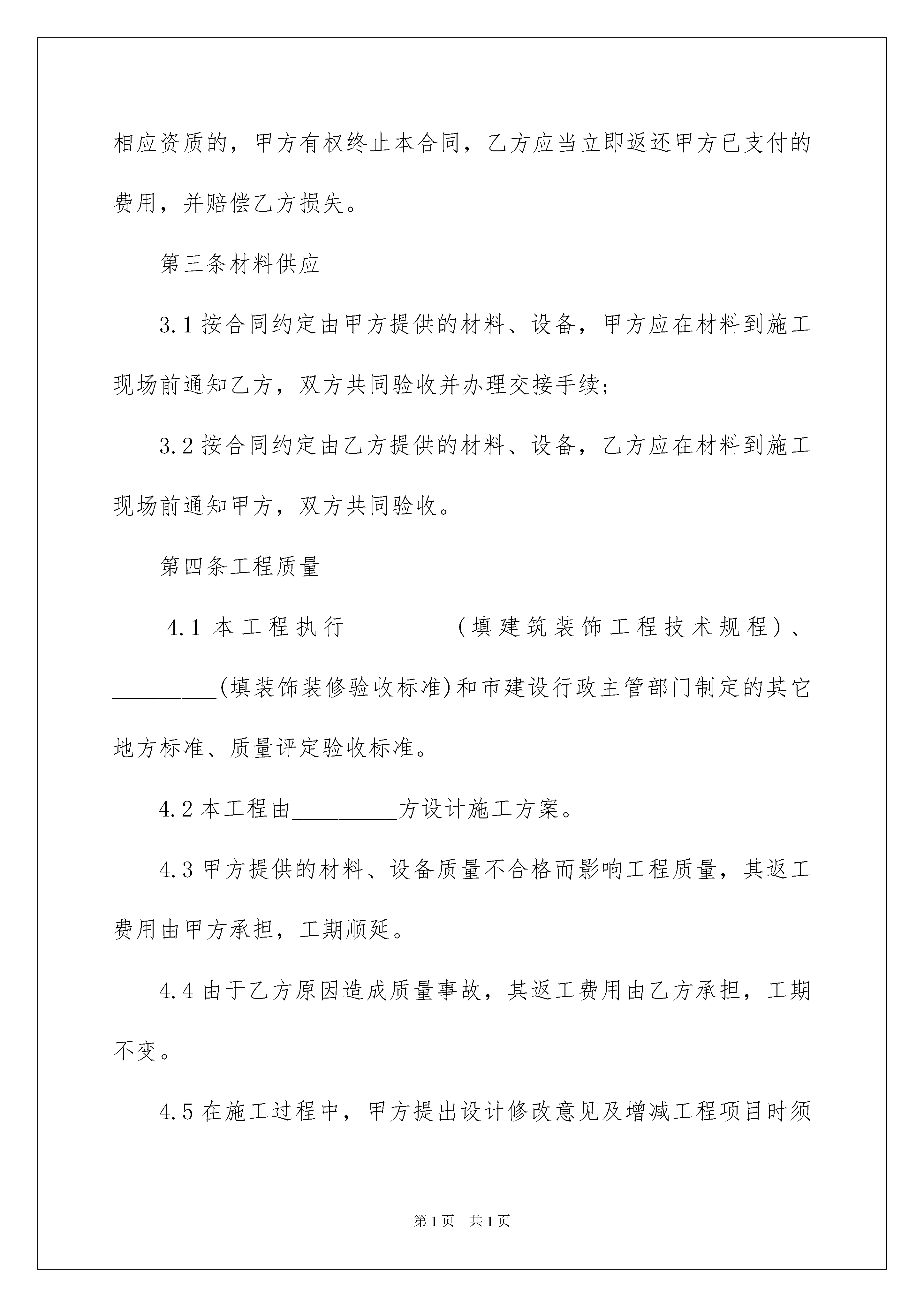 2022装修合同模板集合9篇装修合同模板集合9篇随着广大人民群众法律意识的普遍提高,合同出现的次数越来越多,签订合同可以使我们的合法权益得到法律的保障。那么一般合同是怎么起草的呢?以下是我为大家收集的装修合同9篇,供大家参考借鉴,希望可以帮助到有需要的朋友。装修合同篇1发包方(以下简称甲方):_________承包方(以下简称乙方):_________依照《中华人民共和国合同法》及其它有关法律、法规的规定,甲、乙双方在平等、自愿、协商一致的基础上,为保证工程顺利进行,特签订本合同(包括本合同附件和所有补充合同),以便共同遵守。第一条工程概况1.1工程地点:_________市_________区(县)_________路_________号_________楼_________室。1.2住房结构:_________房型_________房_________厅_________套,施工面积_________平方米。1.3工程承包方式,双方商定采取下列第_________种承包方式:(1)乙方包工、包全部材料;(2)乙方包工、部分包料,甲方提供部分材料(3)乙方包工、甲方包全部材料(见附表四:甲方提供装饰装修材料明细表)。1.4总价款:_________元,大写(人民币):_________.其中:材料费:_________,人工费:_________,管理费:_________,设计费:_________,垃圾清运费:_________,税金:_________,其他费用:_________.经双方认可,变更施工内容,变更部分的工程款按实另计。1.5工程期限_________天;开工日期_________天_________月_________日;竣工日期_________天_________月_________日;1.6工程内容及做法第二条施工单位资格乙方是经过工商行政管理机关核准登记的企业法人,通过最近一次企业年检,具有经建设行政主管机关审定的从事民用建筑装饰装修工程的资质,资质等级符合本次施工的要求。乙方不具备营业资格或相应资质的,甲方有权终止本合同,乙方应当立即返还甲方已支付的费用,并赔偿乙方损失。第三条材料供应3.1按合同约定由甲方提供的材料、设备,甲方应在材料到施工现场前通知乙方,双方共同验收并办理交接手续;3.2按合同约定由乙方提供的材料、设备,乙方应在材料到施工现场前通知甲方,双方共同验收。第四条工程质量4.1本工程执行_________(填建筑装饰工程技术规程)、_________(填装饰装修验收标准)和市建设行政主管部门制定的其它地方标准、质量评定验收标准。4.2本工程由_________方设计施工方案。4.3甲方提供的材料、设备质量不合格而影响工程质量,其返工费用由甲方承担,工期顺延。4.4由于乙方原因造成质量事故,其返工费用由乙方承担,工期不变。4.5在施工过程中,甲方提出设计修改意见及增减工程项目时须提前与乙方联系。在签订《工程项目变更单》(详见附件见)后,方能进行该项目的施工。由此影响竣工日期的,由甲、乙双方商定。凡甲方私自与工人商定更改施工内容所引起的一切后果,由甲方自负,给乙方造成损失的,甲方应予赔偿。4.6施工过程中双方对工程质量发生争议,申请由_________部门对工程质量予以认证,经认证工程质量不符合合同约定的标准,认证过程支出的相关费用由乙方负责,经认证工程质量符合合同约定的标准,认证过程支出的相关费用由甲方负责。第五条工程验收5.1双方约定在施工过程中分下列几个阶段对工程质量进行验收:_________.乙方应提前_________天通知甲方参加验收,阶段验收合格后应填写工程验收单;5.2工程竣工后,乙方应通知甲方验收,甲方应自接到验收通知后两天内组织验收,填写工程验收单。在工程款结清后,办理移交手续(见附表九:工程结算单);5.3本工程自验收合格双方签字之日起保修期为_________年。验收合格签字后,填写工程保修单。第六条工程款支付方式6.1双方约定按下列第_________种方式支付工程款:(1)本合同签订后,开工前_________至_________日,甲方支付相当于总价款_________%的工程款;(2)完成_________%的工程量之日后的_________日内,甲方支付相当于总价款_________%的工程款;(3)竣工验收后_________日内,甲方支付相当于总价款_________%的工程款。(4)竣工验收合格_________年后或双方约定的保修期满,甲方支付相当于总价款_________%的工程款。