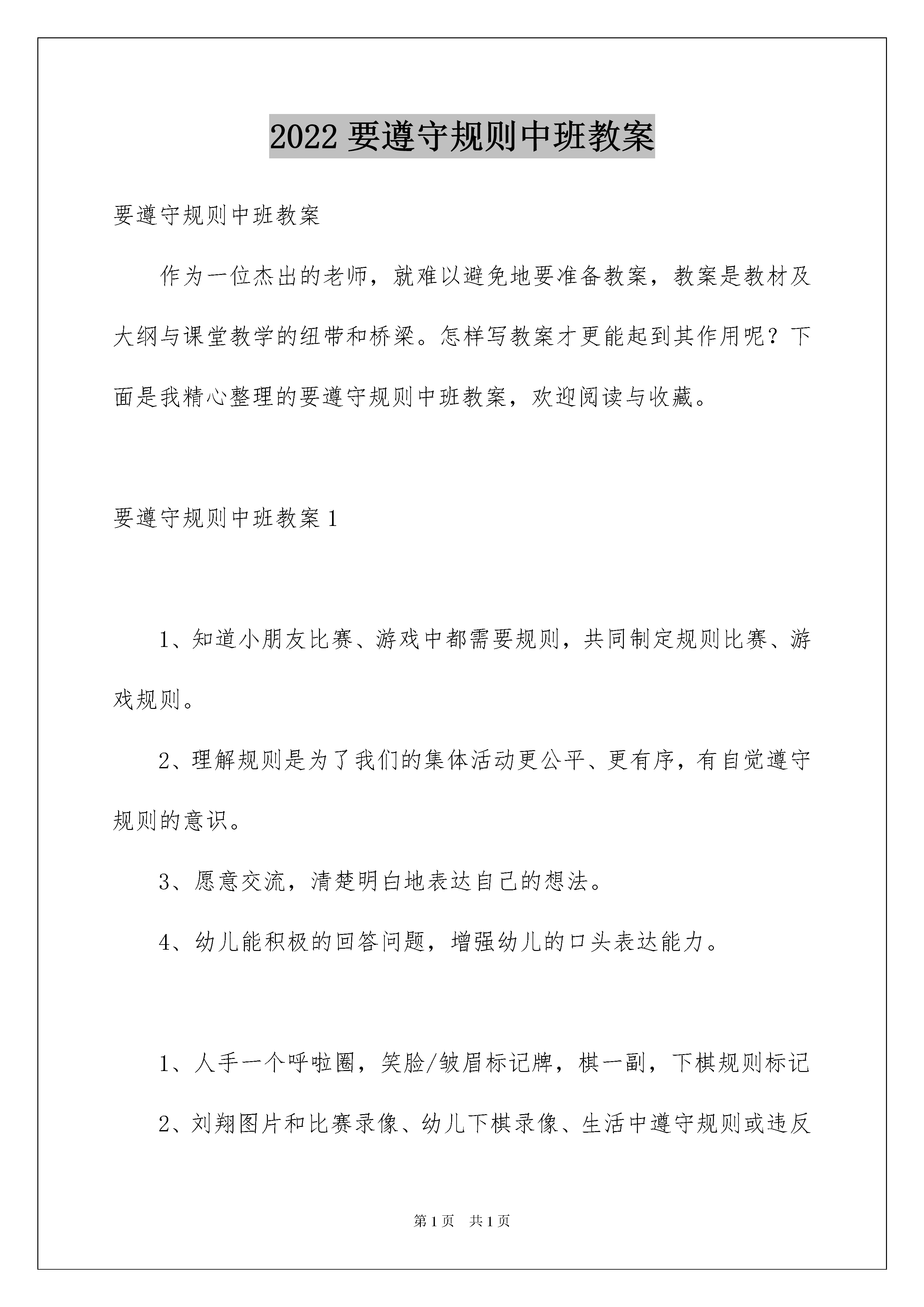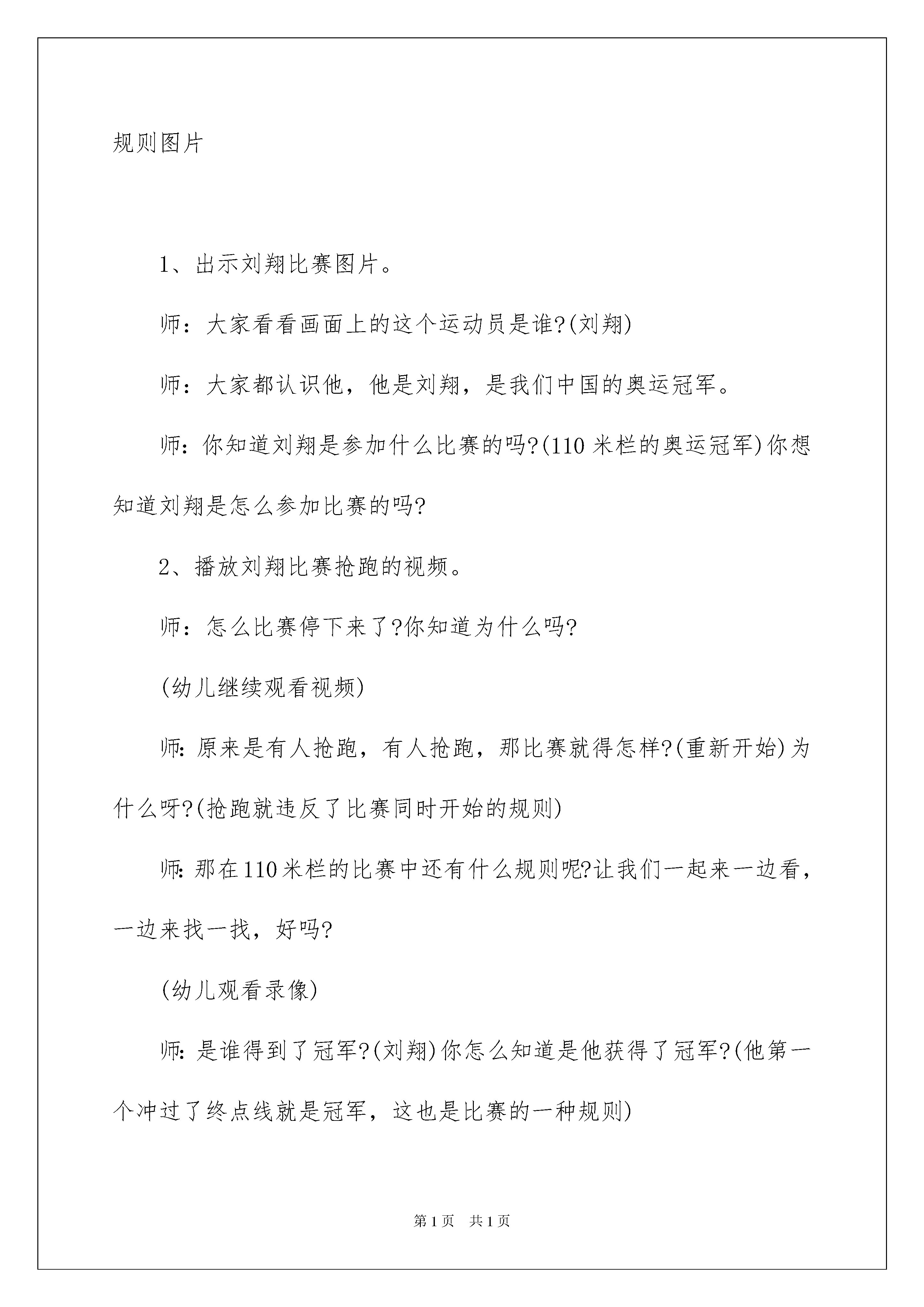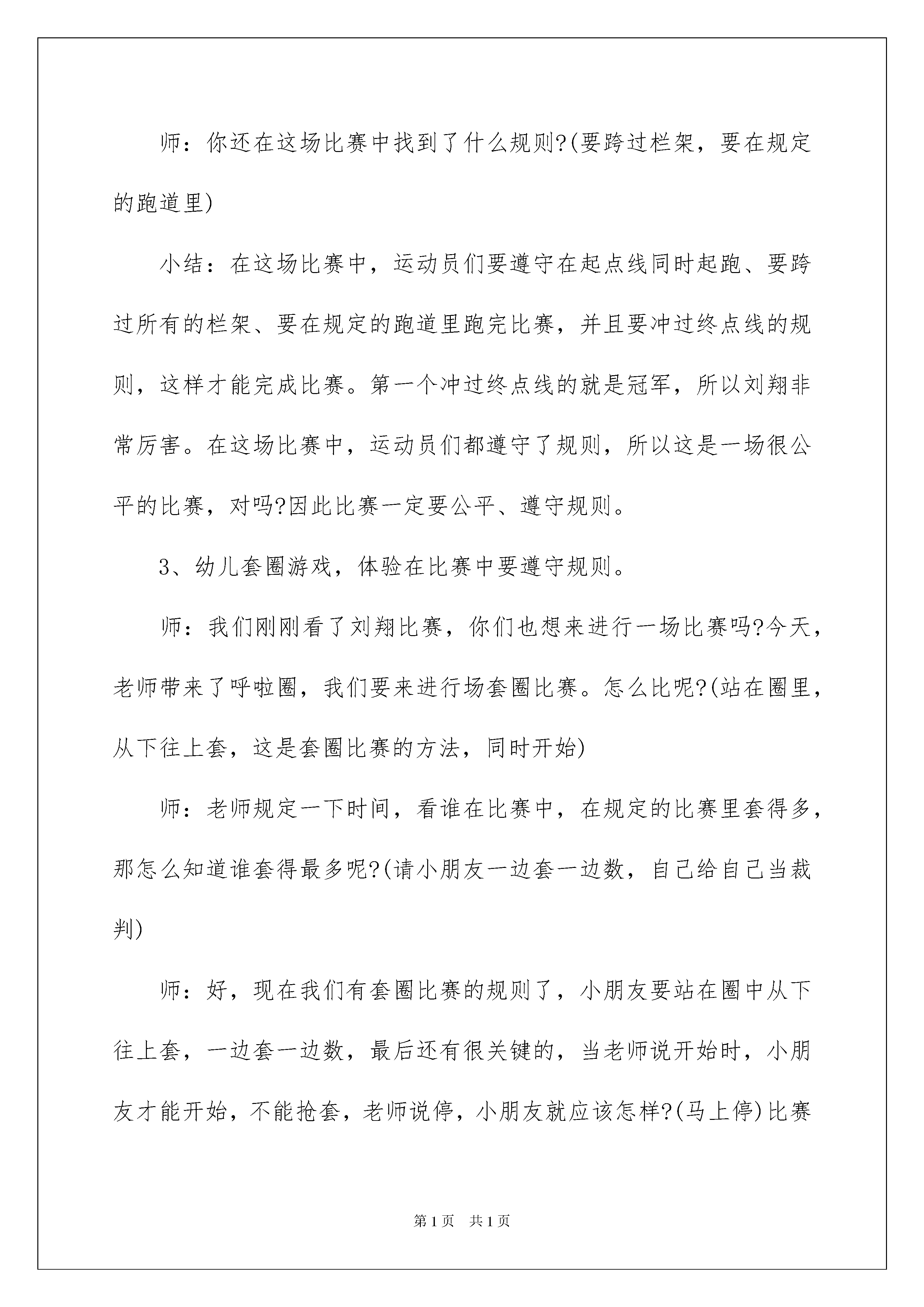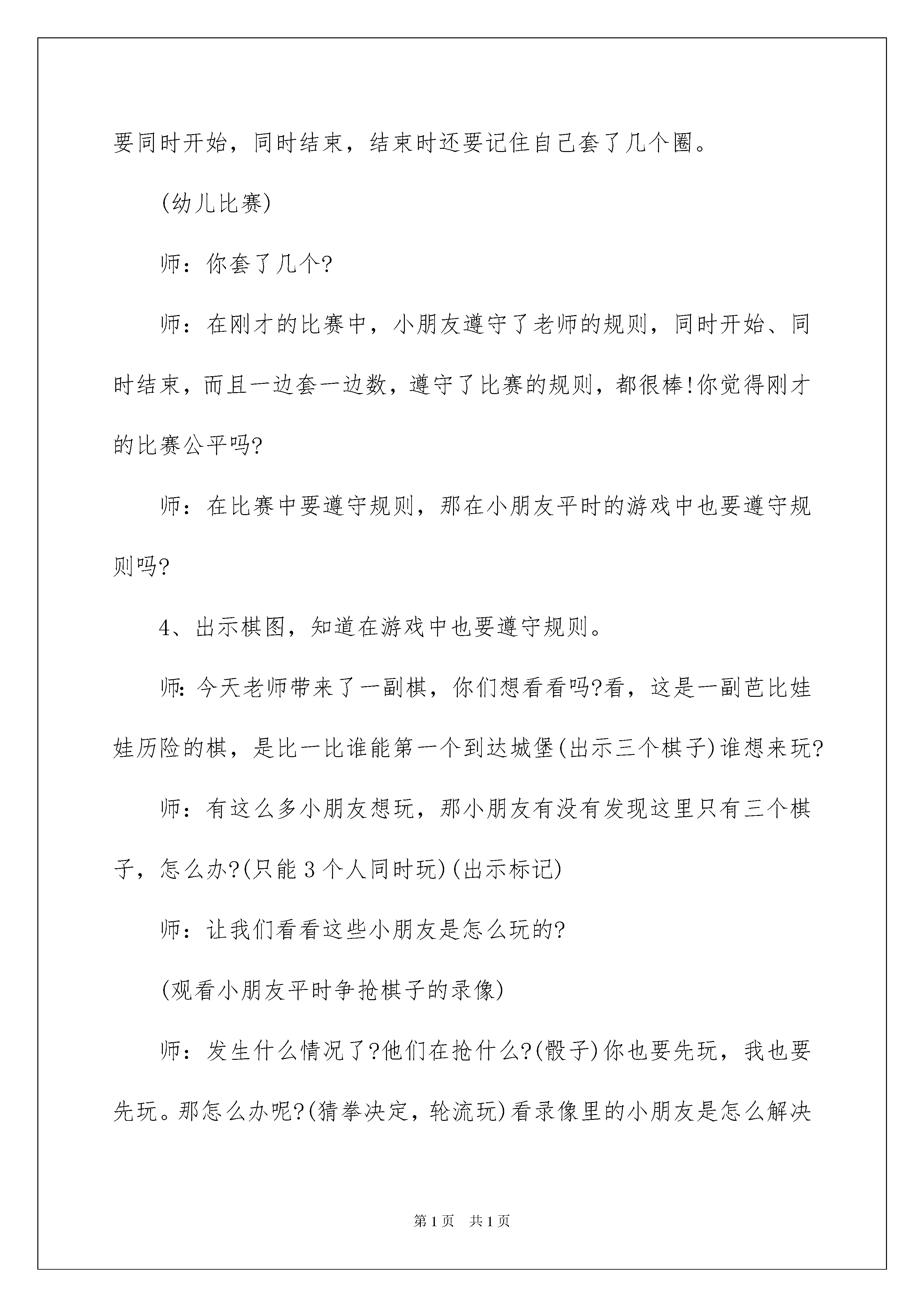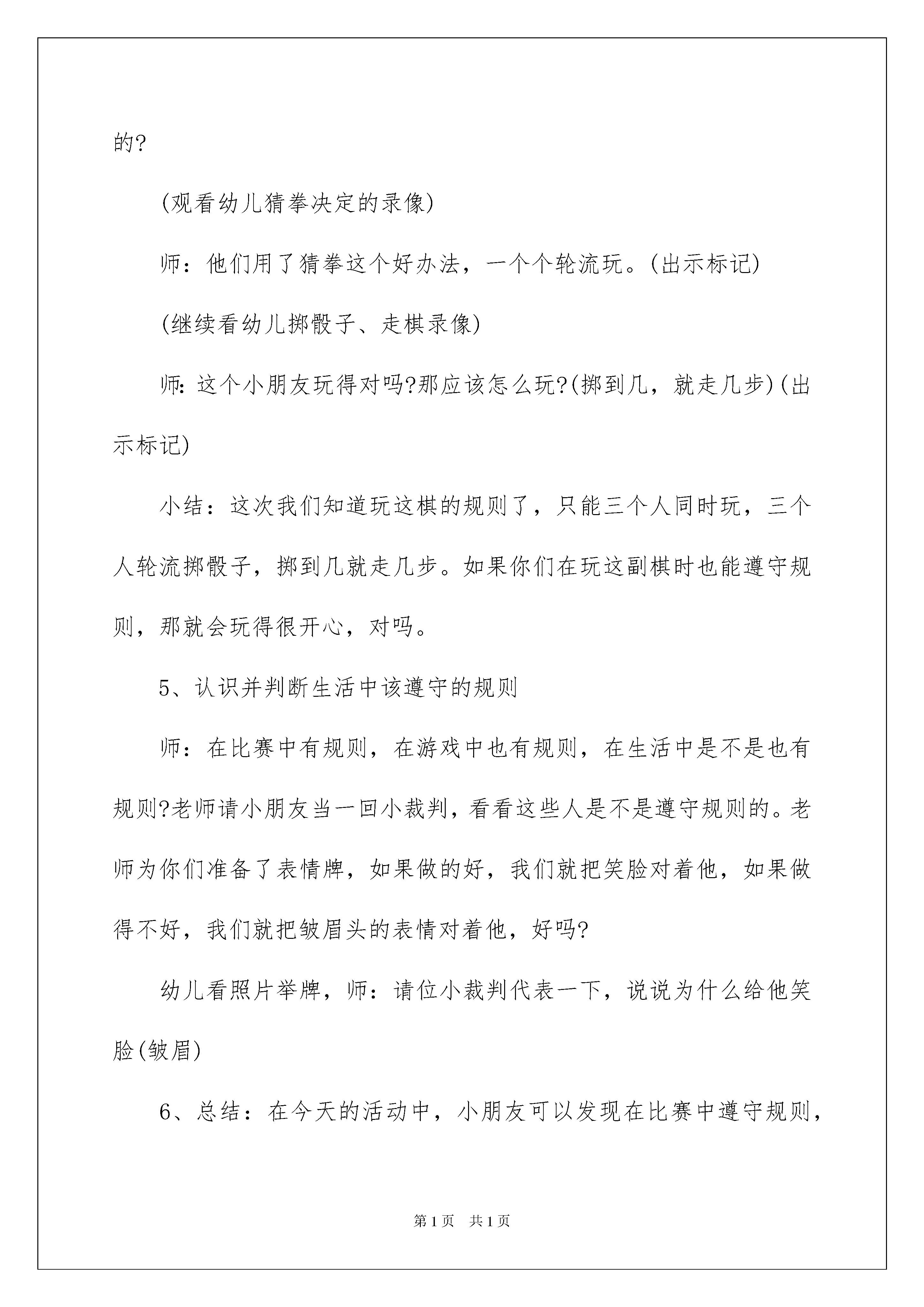 2022要遵守规则中班教案要遵守规则中班教案作为一位杰出的老师,就难以避免地要准备教案,教案是教材及大纲与课堂教学的纽带和桥梁。怎样写教案才更能起到其作用呢?下面是我精心整理的要遵守规则中班教案,欢迎阅读与收藏。要遵守规则中班教案11、知道小朋友比赛、游戏中都需要规则,共同制定规则比赛、游戏规则。2、理解规则是为了我们的集体活动更公平、更有序,有自觉遵守规则的意识。3、愿意交流,清楚明白地表达自己的想法。4、幼儿能积极的回答问题,增强幼儿的口头表达能力。1、人手一个呼啦圈,笑脸/皱眉标记牌,棋一副,下棋规则标记2、刘翔图片和比赛录像、幼儿下棋录像、生活中遵守规则或违反规则图片1、出示刘翔比赛图片。师:大家看看画面上的这个运动员是谁?(刘翔)师:大家都认识他,他是刘翔,是我们中国的奥运冠军。师:你知道刘翔是参加什么比赛的吗?(110米栏的奥运冠军)你想知道刘翔是怎么参加比赛的吗?2、播放刘翔比赛抢跑的视频。师:怎么比赛停下来了?你知道为什么吗?(幼儿继续观看视频)师:原来是有人抢跑,有人抢跑,那比赛就得怎样?(重新开始)为什么呀?(抢跑就违反了比赛同时开始的规则)师:那在110米栏的比赛中还有什么规则呢?让我们一起来一边看,一边来找一找,好吗?(幼儿观看录像)师:是谁得到了冠军?(刘翔)你怎么知道是他获得了冠军?(他第一个冲过了终点线就是冠军,这也是比赛的一种规则)师:你还在这场比赛中找到了什么规则?(要跨过栏架,要在规定的跑道里)小结:在这场比赛中,运动员们要遵守在起点线同时起跑、要跨过所有的栏架、要在规定的跑道里跑完比赛,并且要冲过终点线的规则,这样才能完成比赛。第一个冲过终点线的就是冠军,所以刘翔非常厉害。在这场比赛中,运动员们都遵守了规则,所以这是一场很公平的比赛,对吗?因此比赛一定要公平、遵守规则。3、幼儿套圈游戏,体验在比赛中要遵守规则。师:我们刚刚看了刘翔比赛,你们也想来进行一场比赛吗?今天,老师带来了呼啦圈,我们要来进行场套圈比赛。怎么比呢?(站在圈里,从下往上套,这是套圈比赛的方法,同时开始)师:老师规定一下时间,看谁在比赛中,在规定的比赛里套得多,那怎么知道谁套得最多呢?(请小朋友一边套一边数,自己给自己当裁判)师:好,现在我们有套圈比赛的规则了,小朋友要站在圈中从下往上套,一边套一边数,最后还有很关键的,当老师说开始时,小朋友才能开始,不能抢套,老师说停,小朋友就应该怎样?(马上停)比赛要同时开始,同时结束,结束时还要记住自己套了几个圈。(幼儿比赛)师:你套了几个?师:在刚才的比赛中,小朋友遵守了老师的规则,同时开始、同时结束,而且一边套一边数,遵守了比赛的规则,都很棒!你觉得刚才的比赛公平吗?师:在比赛中要遵守规则,那在小朋友平时的游戏中也要遵守规则吗?4、出示棋图,知道在游戏中也要遵守规则。师:今天老师带来了一副棋,你们想看看吗?看,这是一副芭比娃娃历险的棋,是比一比谁能第一个到达城堡(出示三个棋子)谁想来玩?师:有这么多小朋友想玩,那小朋友有没有发现这里只有三个棋子,怎么办?(只能3个人同时玩)(出示标记)师:让我们看看这些小朋友是怎么玩的?(观看小朋友平时争抢棋子的录像)师:发生什么情况了?他们在抢什么?(骰子)你也要先玩,我也要先玩。那怎么办呢?(猜拳决定,轮流玩)看录像里的小朋友是怎么解决的?(观看幼儿猜拳决定的录像)师:他们用了猜拳这个好办法,一个个轮流玩。(出示标记)(继续看幼儿掷骰子、走棋录像)师:这个小朋友玩得对吗?那应该怎么玩?(掷到几,就走几步)(出示标记)小结:这次我们知道玩这棋的规则了,只能三个人同时玩,三个人轮流掷骰子,掷到几就走几步。如果你们在玩这副棋时也能遵守规则,那就会玩得很开心,对吗。5、认识并判断生活中该遵守的规则师:在比赛中有规则,在游戏中也有规则,在生活中是不是也有规则?老师请小朋友当一回小裁判,看看这些人是不是遵守规则的。老师为你们准备了表情牌,如果做的好,我们就把笑脸对着他,如果做得不好,我们就把皱眉头的表情对着他,好吗?幼儿看照片举牌,师:请位小裁判代表一下,说说为什么给他笑脸(皱眉)6、总结:在今天的活动中,小朋友可以发现在比赛中遵守规则,比赛就会公平;在游戏中遵守规则,游戏才会公平,我们玩得才开心。在平时有很多活动有规则,小朋友要当一个遵守规则的好孩子,好吗?教学反思:孩子的成长离不开家庭,规则意识首先是在家庭中萌芽发展的。让家长懂得培养幼儿规则意识的重要性,掌握方法,家园一致,从而达到事半功倍的教育效果。规则意识的形成,不是一朝一夕的,它需要长期、反复的引导,只要我们能持之以恒,一定能使幼儿将各种
