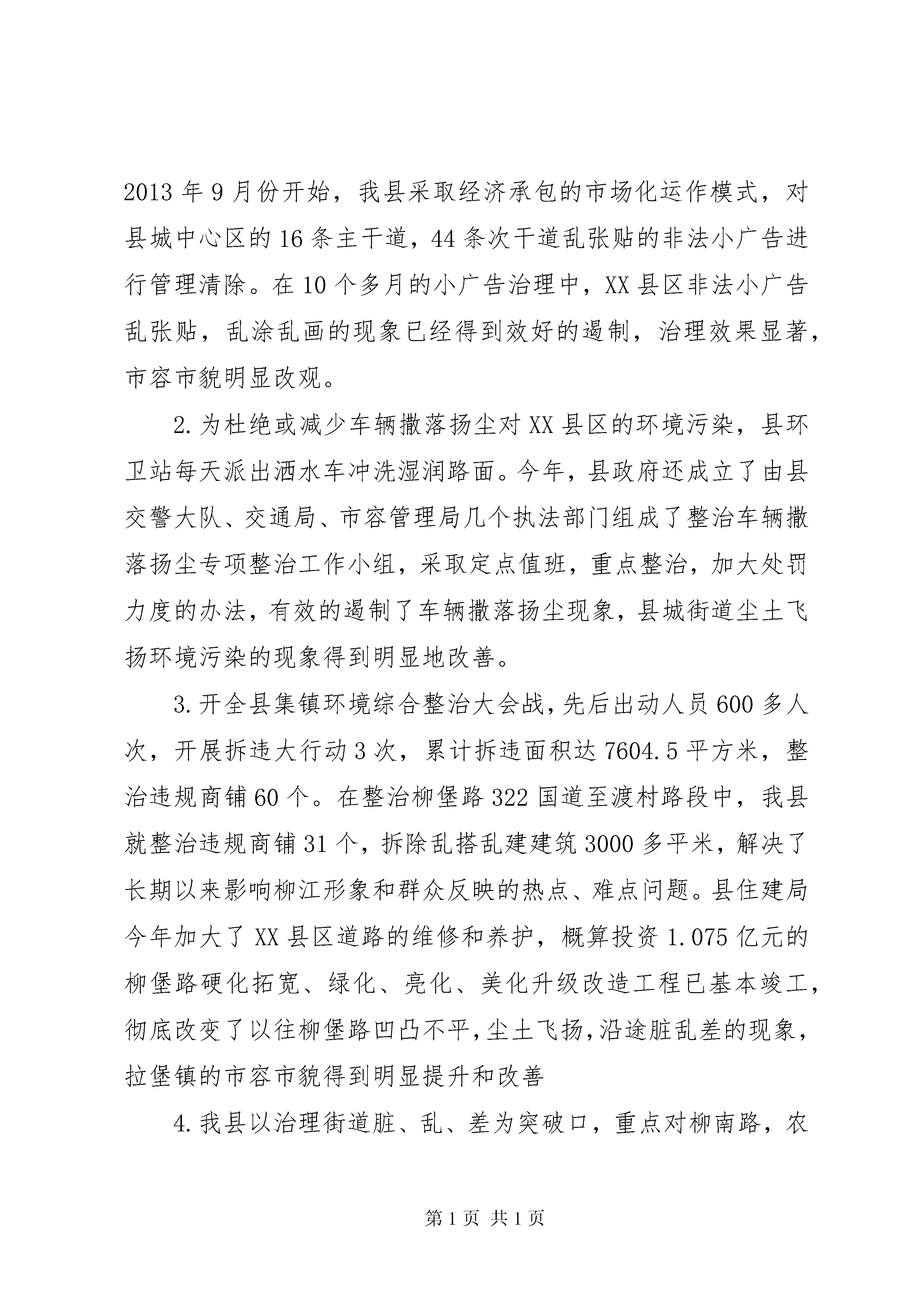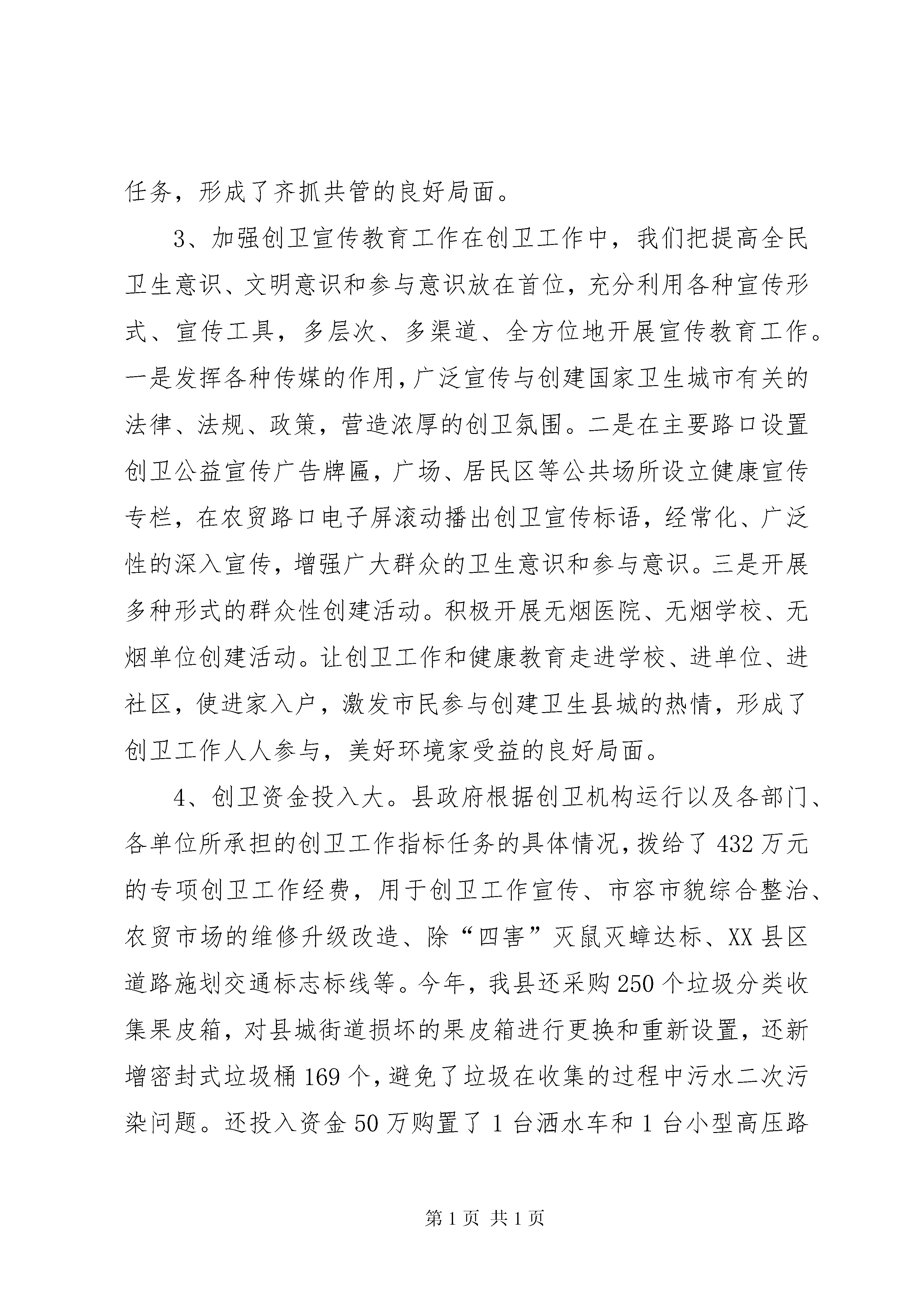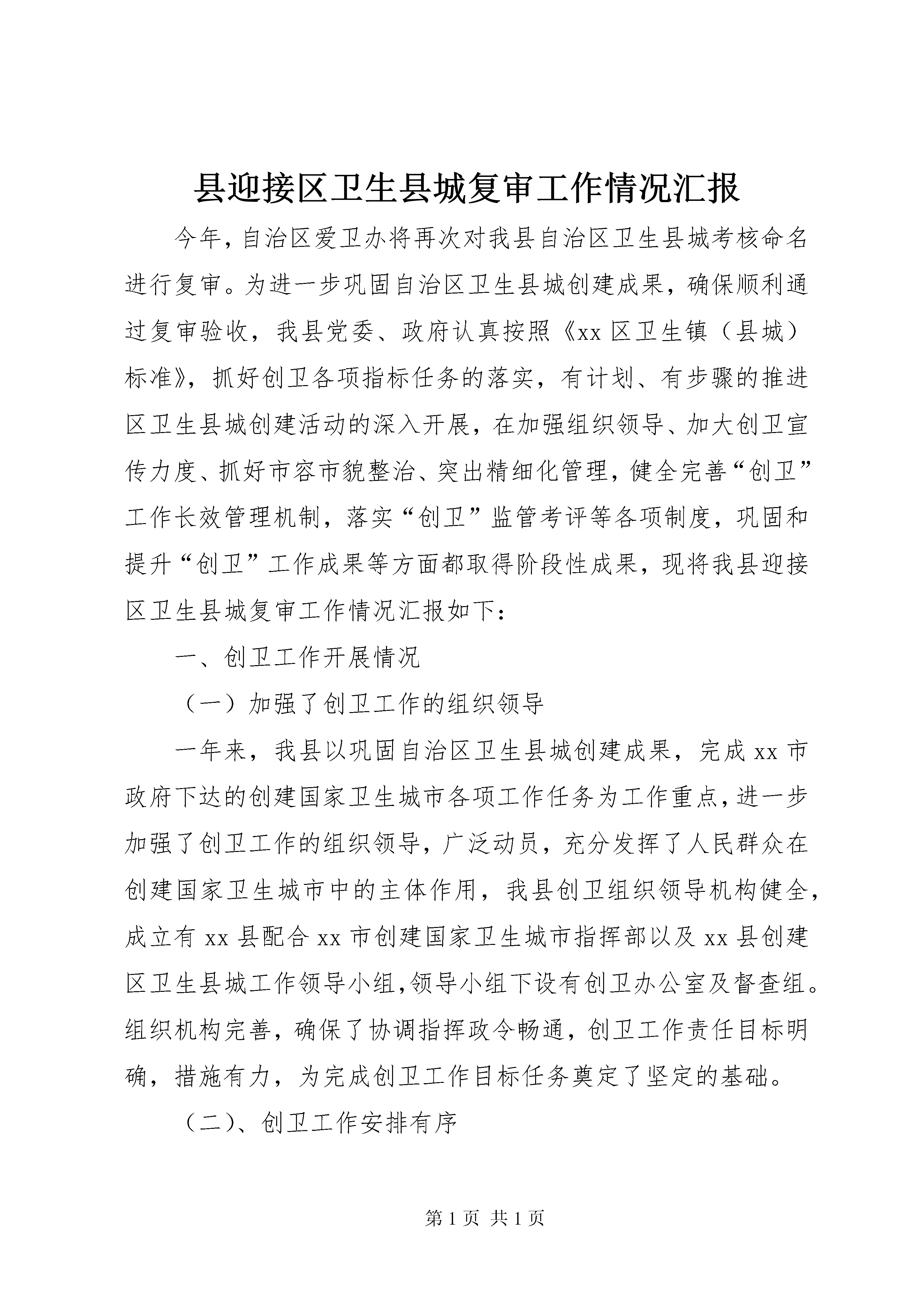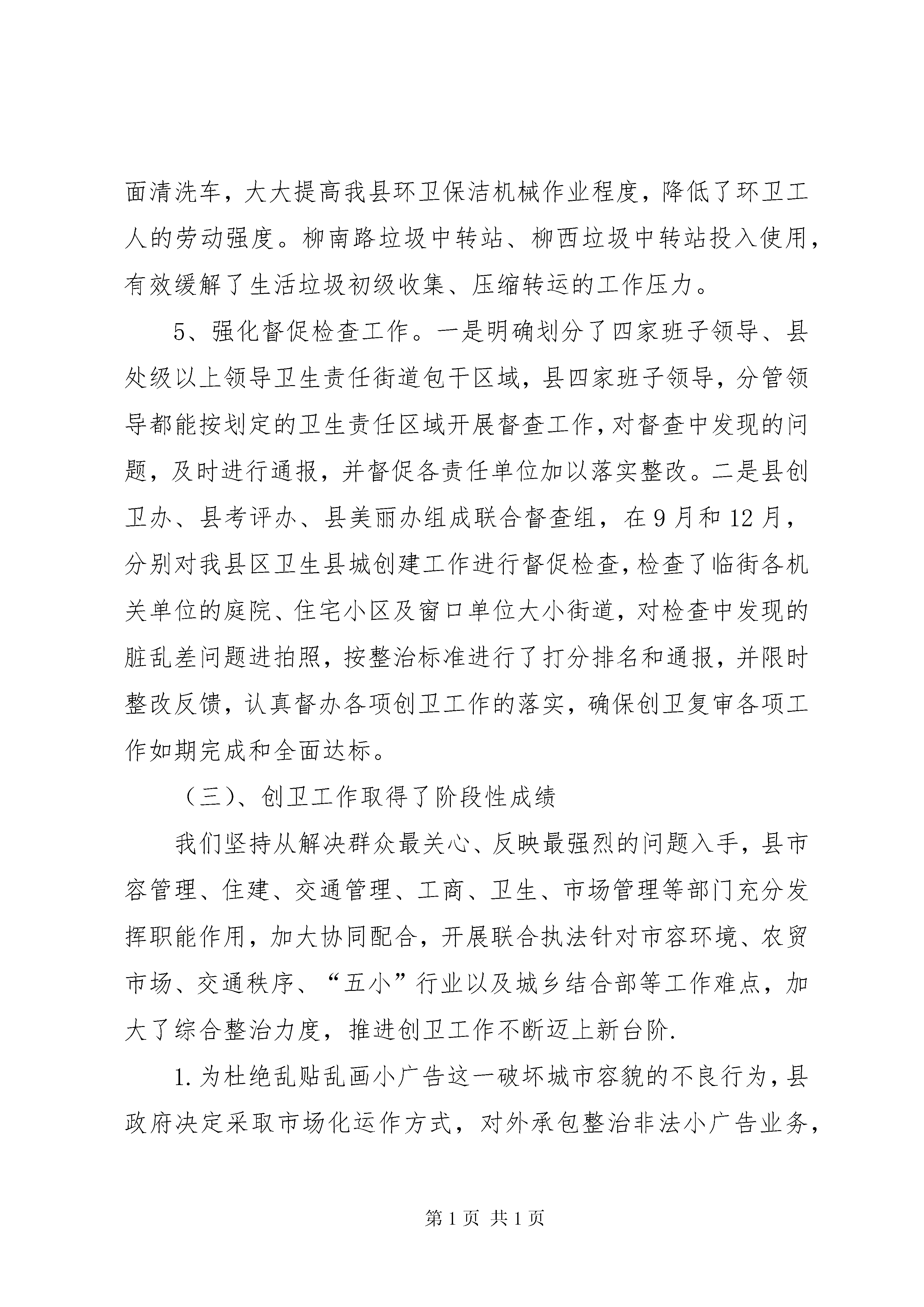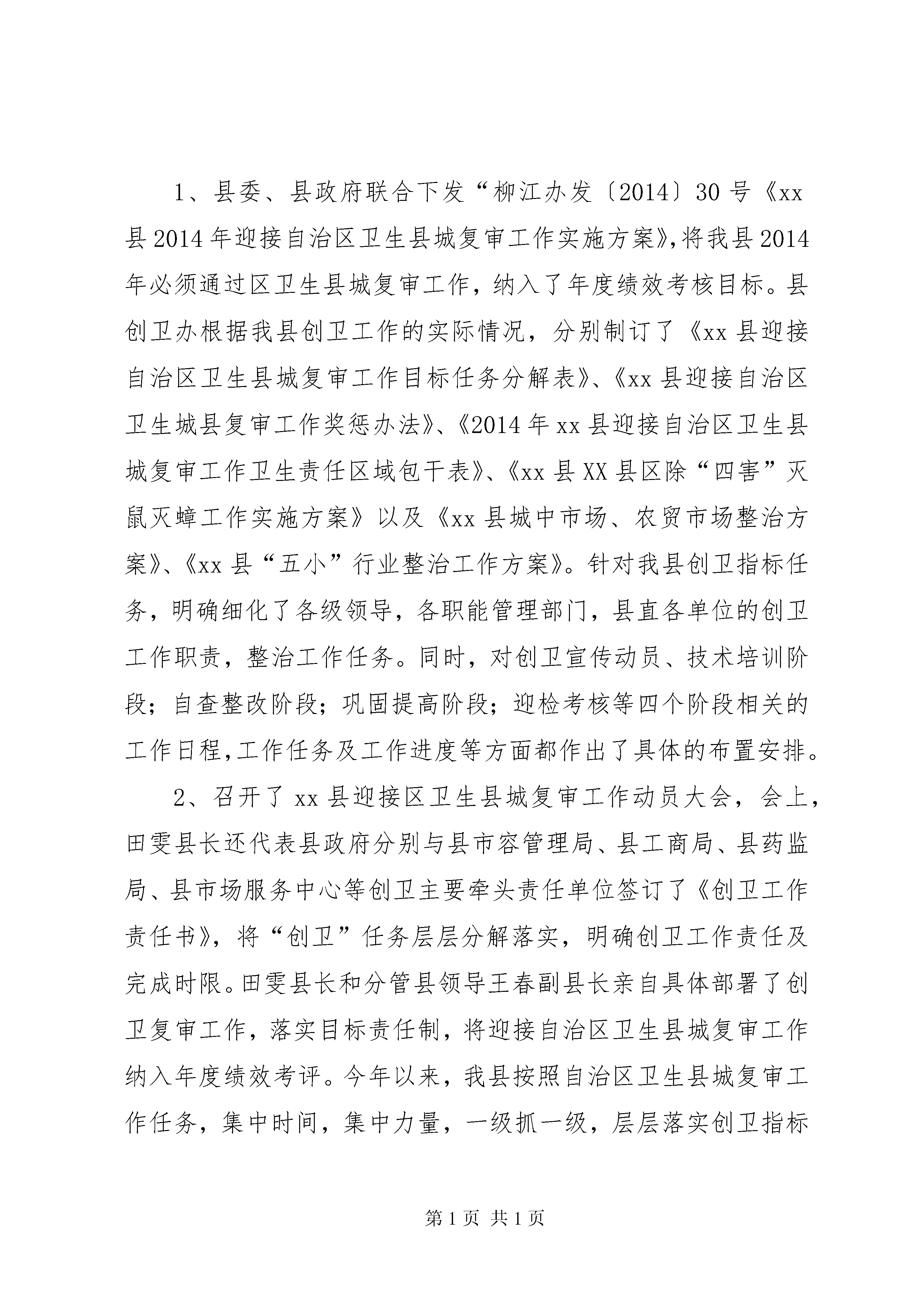 县迎接区卫生县城复审工作情况汇报今年,自治区爱卫办将再次对我县自治区卫生县城考核命名进行复审。为进一步巩固自治区卫生县城创建成果,确保顺利通过复审验收,我县党委、政府认真按照《xx区卫生镇(县城)标准》,抓好创卫各项指标任务的落实,有计划、有步骤的推进区卫生县城创建活动的深入开展,在加强组织领导、加大创卫宣传力度、抓好市容市貌整治、突出精细化管理,健全完善“创卫”工作长效管理机制,落实“创卫”监管考评等各项制度,巩固和提升“创卫”工作成果等方面都取得阶段性成果,现将我县迎接区卫生县城复审工作情况汇报如下:一、创卫工作开展情况(一)加强了创卫工作的组织领导一年来,我县以巩固自治区卫生县城创建成果,完成xx市政府下达的创建国家卫生城市各项工作任务为工作重点,进一步加强了创卫工作的组织领导,广泛动员,充分发挥了人民群众在创建国家卫生城市中的主体作用,我县创卫组织领导机构健全,成立有xx县配合xx市创建国家卫生城市指挥部以及xx县创建区卫生县城工作领导小组,领导小组下设有创卫办公室及督查组。组织机构完善,确保了协调指挥政令畅通,创卫工作责任目标明确,措施有力,为完成创卫工作目标任务奠定了坚定的基础。(二)、创卫工作安排有序1、县委、县政府联合下发“柳江办发〔2014〕30号《xx县2014年迎接自治区卫生县城复审工作实施方案》,将我县2014年必须通过区卫生县城复审工作,纳入了年度绩效考核目标。县创卫办根据我县创卫工作的实际情况,分别制订了《xx县迎接自治区卫生县城复审工作目标任务分解表》、《xx县迎接自治区卫生城县复审工作奖惩办法》、《2014年xx县迎接自治区卫生县城复审工作卫生责任区域包干表》、《xx县XX县区除“四害”灭鼠灭蟑工作实施方案》以及《xx县城中市场、农贸市场整治方案》、《xx县“五小”行业整治工作方案》。针对我县创卫指标任务,明确细化了各级领导,各职能管理部门,县直各单位的创卫工作职责,整治工作任务。同时,对创卫宣传动员、技术培训阶段;自查整改阶段;巩固提高阶段;迎检考核等四个阶段相关的工作日程,工作任务及工作进度等方面都作出了具体的布置安排。2、召开了xx县迎接区卫生县城复审工作动员大会,会上,田雯县长还代表县政府分别与县市容管理局、县工商局、县药监局、县市场服务中心等创卫主要牵头责任单位签订了《创卫工作责任书》,将“创卫”任务层层分解落实,明确创卫工作责任及完成时限。田雯县长和分管县领导王春副县长亲自具体部署了创卫复审工作,落实目标责任制,将迎接自治区卫生县城复审工作纳入年度绩效考评。今年以来,我县按照自治区卫生县城复审工作任务,集中时间,集中力量,一级抓一级,层层落实创卫指标任务,形成了齐抓共管的良好局面。3、加强创卫宣传教育工作在创卫工作中,我们把提高全民卫生意识、文明意识和参与意识放在首位,充分利用各种宣传形式、宣传工具,多层次、多渠道、全方位地开展宣传教育工作。一是发挥各种传媒的作用,广泛宣传与创建国家卫生城市有关的法律、法规、政策,营造浓厚的创卫氛围。二是在主要路口设置创卫公益宣传广告牌匾,广场、居民区等公共场所设立健康宣传专栏,在农贸路口电子屏滚动播出创卫宣传标语,经常化、广泛性的深入宣传,增强广大群众的卫生意识和参与意识。三是开展多种形式的群众性创建活动。积极开展无烟医院、无烟学校、无烟单位创建活动。让创卫工作和健康教育走进学校、进单位、进社区,使进家入户,激发市民参与创建卫生县城的热情,形成了创卫工作人人参与,美好环境家受益的良好局面。4、创卫资金投入大。县政府根据创卫机构运行以及各部门、各单位所承担的创卫工作指标任务的具体情况,拨给了432万元的专项创卫工作经费,用于创卫工作宣传、市容市貌综合整治、农贸市场的维修升级改造、除“四害”灭鼠灭蟑达标、XX县区道路施划交通标志标线等。今年,我县还采购250个垃圾分类收集果皮箱,对县城街道损坏的果皮箱进行更换和重新设置,还新增密封式垃圾桶169个,避免了垃圾在收集的过程中污水二次污染问题。还投入资金50万购置了1台洒水车和1台小型高压路面清洗车,大大提高我县环卫保洁机械作业程度,降低了环卫工人的劳动强度。柳南路垃圾中转站、柳西垃圾中转站投入使用,有效缓解了生活垃圾初级收集、压缩转运的工作压力。5、强化督促检查工作。一是明确划分了四家班子领导、县处级以上领导卫生责任街道包干区域,县四家班子领导,分管领导都能按划定的卫生责任区域开展督查工作,对督查中发现的问题,及时进行通报,并督促各责任单位加以落实整改。二是县创卫办、县考评办、县美丽办组成联合督查组,在9月和12月,分别对我县区卫生县城创建工作进行督促检查,检查了临街各机关单位的庭院、住宅小区及窗口单位大小街道,对检查中发现的脏乱差问题进拍照,按整治标准进行了打分排名和通报,并限
