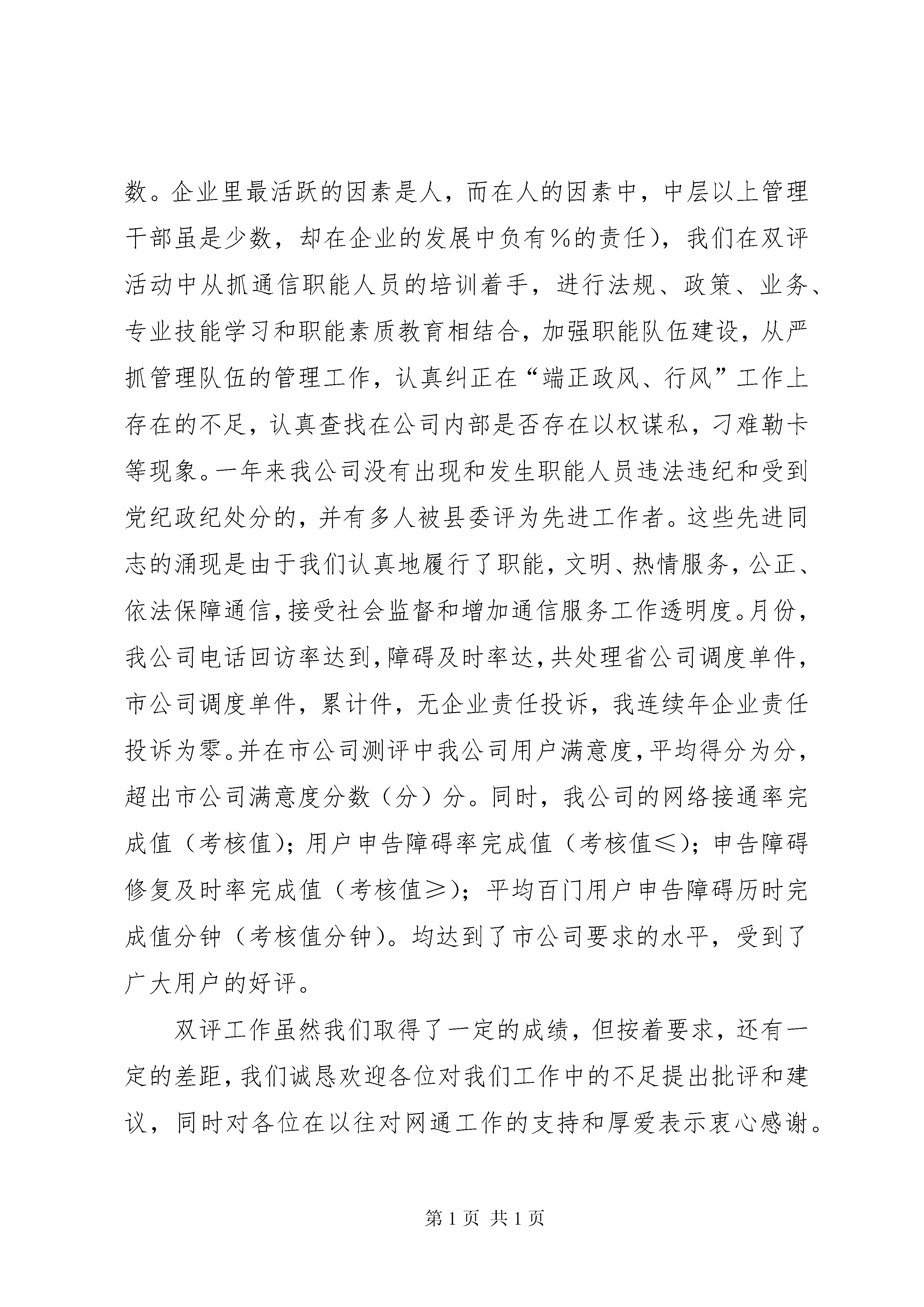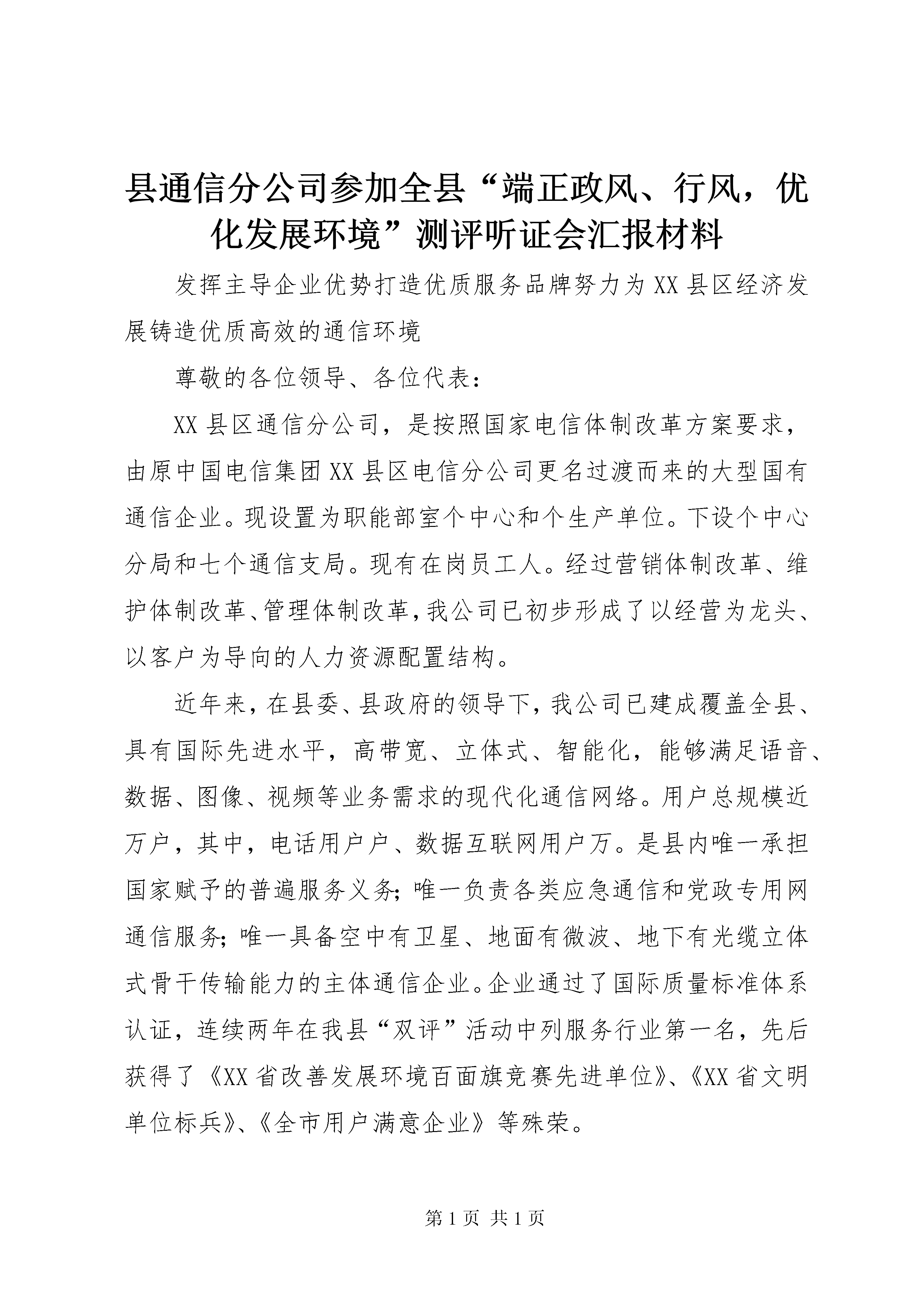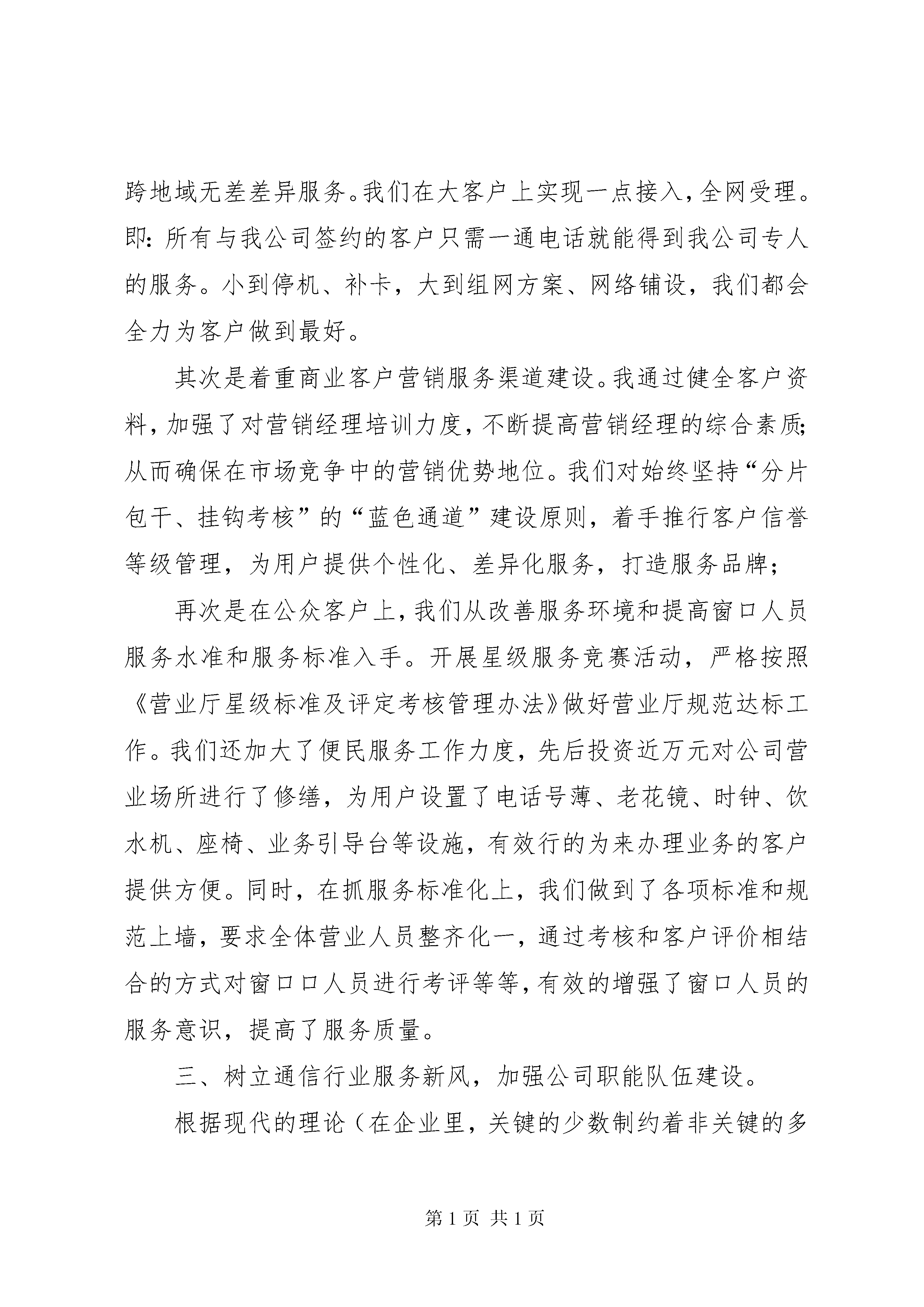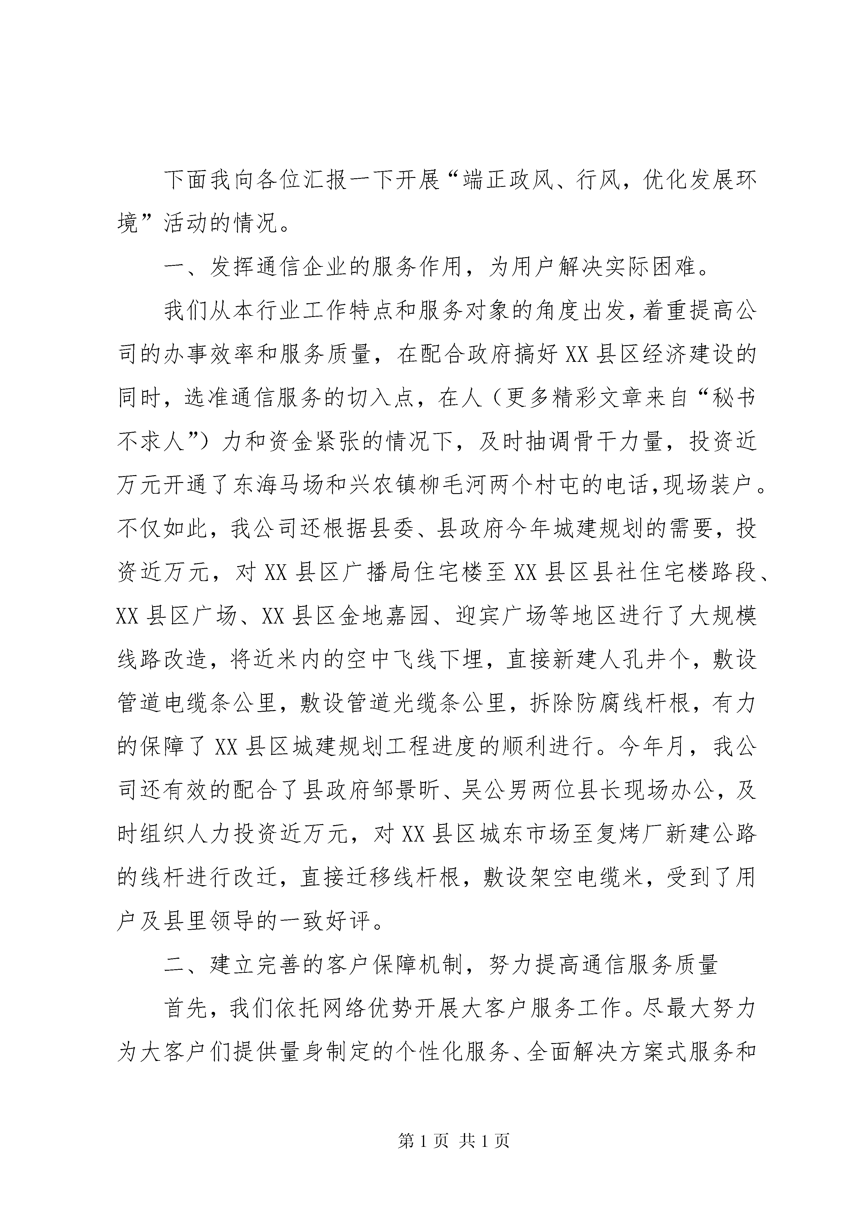 县通信分公司参加全县“端正政风、行风,优化发展环境”测评听证会汇报材料发挥主导企业优势打造优质服务品牌努力为XX县区经济发展铸造优质高效的通信环境尊敬的各位领导、各位代表:XX县区通信分公司,是按照国家电信体制改革方案要求,由原中国电信集团XX县区电信分公司更名过渡而来的大型国有通信企业。现设置为职能部室个中心和个生产单位。下设个中心分局和七个通信支局。现有在岗员工人。经过营销体制改革、维护体制改革、管理体制改革,我公司已初步形成了以经营为龙头、以客户为导向的人力资源配置结构。近年来,在县委、县政府的领导下,我公司已建成覆盖全县、具有国际先进水平,高带宽、立体式、智能化,能够满足语音、数据、图像、视频等业务需求的现代化通信网络。用户总规模近万户,其中,电话用户户、数据互联网用户万。是县内唯一承担国家赋予的普遍服务义务;唯一负责各类应急通信和党政专用网通信服务;唯一具备空中有卫星、地面有微波、地下有光缆立体式骨干传输能力的主体通信企业。企业通过了国际质量标准体系认证,连续两年在我县“双评”活动中列服务行业第一名,先后获得了《XX省改善发展环境百面旗竞赛先进单位》、《XX省文明单位标兵》、《全市用户满意企业》等殊荣。下面我向各位汇报一下开展“端正政风、行风,优化发展环境”活动的情况。一、发挥通信企业的服务作用,为用户解决实际困难。我们从本行业工作特点和服务对象的角度出发,着重提高公司的办事效率和服务质量,在配合政府搞好XX县区经济建设的同时,选准通信服务的切入点,在人(更多精彩文章来自“秘书不求人”)力和资金紧张的情况下,及时抽调骨干力量,投资近万元开通了东海马场和兴农镇柳毛河两个村屯的电话,现场装户。不仅如此,我公司还根据县委、县政府今年城建规划的需要,投资近万元,对XX县区广播局住宅楼至XX县区县社住宅楼路段、XX县区广场、XX县区金地嘉园、迎宾广场等地区进行了大规模线路改造,将近米内的空中飞线下埋,直接新建人孔井个,敷设管道电缆条公里,敷设管道光缆条公里,拆除防腐线杆根,有力的保障了XX县区城建规划工程进度的顺利进行。今年月,我公司还有效的配合了县政府邹景昕、吴公男两位县长现场办公,及时组织人力投资近万元,对XX县区城东市场至复烤厂新建公路的线杆进行改迁,直接迁移线杆根,敷设架空电缆米,受到了用户及县里领导的一致好评。二、建立完善的客户保障机制,努力提高通信服务质量首先,我们依托网络优势开展大客户服务工作。尽最大努力为大客户们提供量身制定的个性化服务、全面解决方案式服务和跨地域无差差异服务。我们在大客户上实现一点接入,全网受理。即:所有与我公司签约的客户只需一通电话就能得到我公司专人的服务。小到停机、补卡,大到组网方案、网络铺设,我们都会全力为客户做到最好。其次是着重商业客户营销服务渠道建设。我通过健全客户资料,加强了对营销经理培训力度,不断提高营销经理的综合素质;从而确保在市场竞争中的营销优势地位。我们对始终坚持“分片包干、挂钩考核”的“蓝色通道”建设原则,着手推行客户信誉等级管理,为用户提供个性化、差异化服务,打造服务品牌;再次是在公众客户上,我们从改善服务环境和提高窗口人员服务水准和服务标准入手。开展星级服务竞赛活动,严格按照《营业厅星级标准及评定考核管理办法》做好营业厅规范达标工作。我们还加大了便民服务工作力度,先后投资近万元对公司营业场所进行了修缮,为用户设置了电话号薄、老花镜、时钟、饮水机、座椅、业务引导台等设施,有效行的为来办理业务的客户提供方便。同时,在抓服务标准化上,我们做到了各项标准和规范上墙,要求全体营业人员整齐化一,通过考核和客户评价相结合的方式对窗口口人员进行考评等等,有效的增强了窗口人员的服务意识,提高了服务质量。三、树立通信行业服务新风,加强公司职能队伍建设。根据现代的理论(在企业里,关键的少数制约着非关键的多数。企业里最活跃的因素是人,而在人的因素中,中层以上管理干部虽是少数,却在企业的发展中负有%的责任),我们在双评活动中从抓通信职能人员的培训着手,进行法规、政策、业务、专业技能学习和职能素质教育相结合,加强职能队伍建设,从严抓管理队伍的管理工作,认真纠正在“端正政风、行风”工作上存在的不足,认真查找在公司内部是否存在以权谋私,刁难勒卡等现象。一年来我公司没有出现和发生职能人员违法违纪和受到党纪政纪处分的,并有多人被县委评为先进工作者。这些先进同志的涌现是由于我们认真地履行了职能,文明、热情服务,公正、依法保障通信,接受社会监督和增加通信服务工作透明度。月份,我公司电话回访率达到,障碍及时率达,共处理省公司调度单件,市公司调度单件,累计件,无企业责任投诉,我连续年企业责任投诉为零。并在市公司测评中我公司用户满意度,平均得分为分,超出市公司满意度分数(分)分。同时,我
