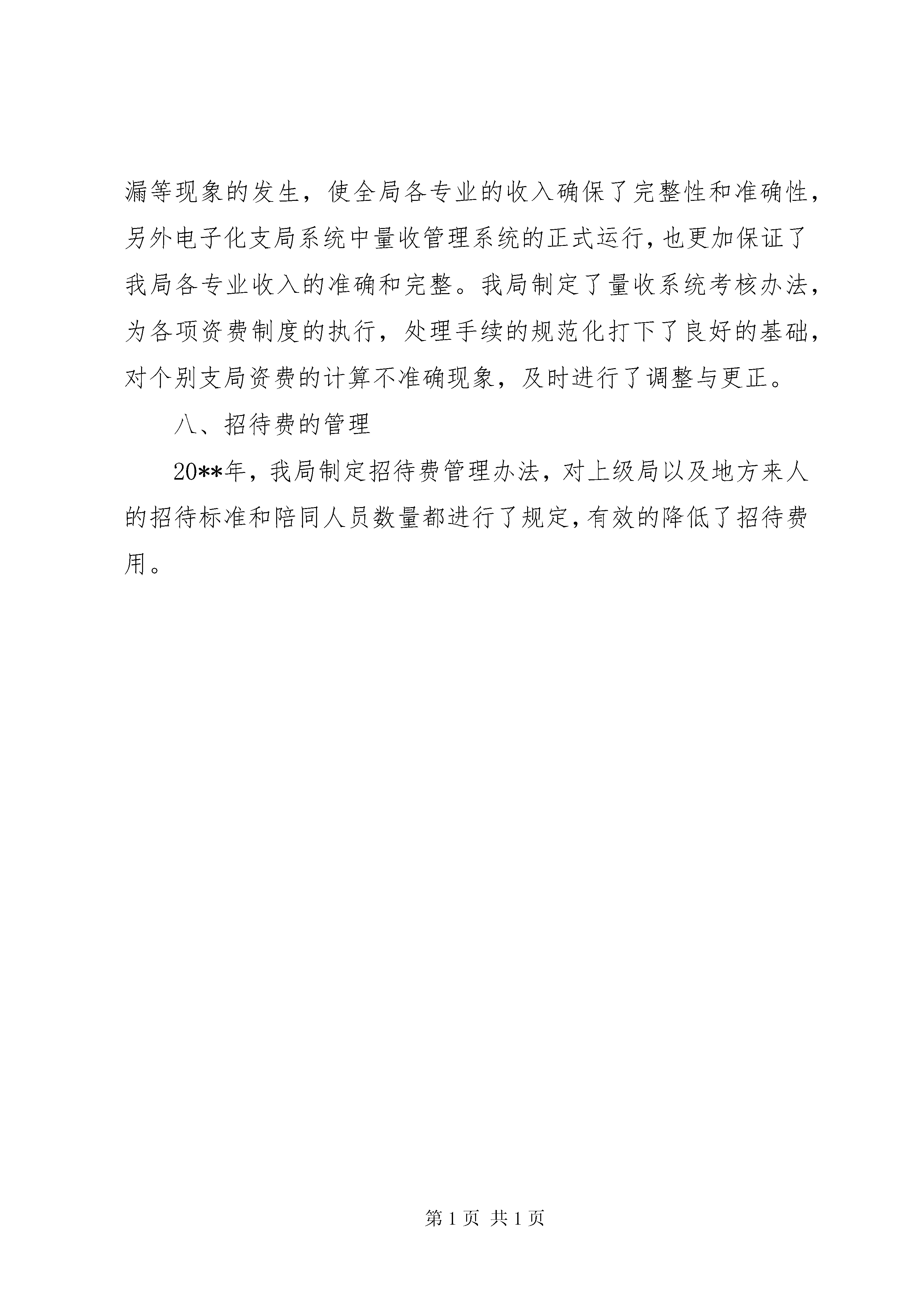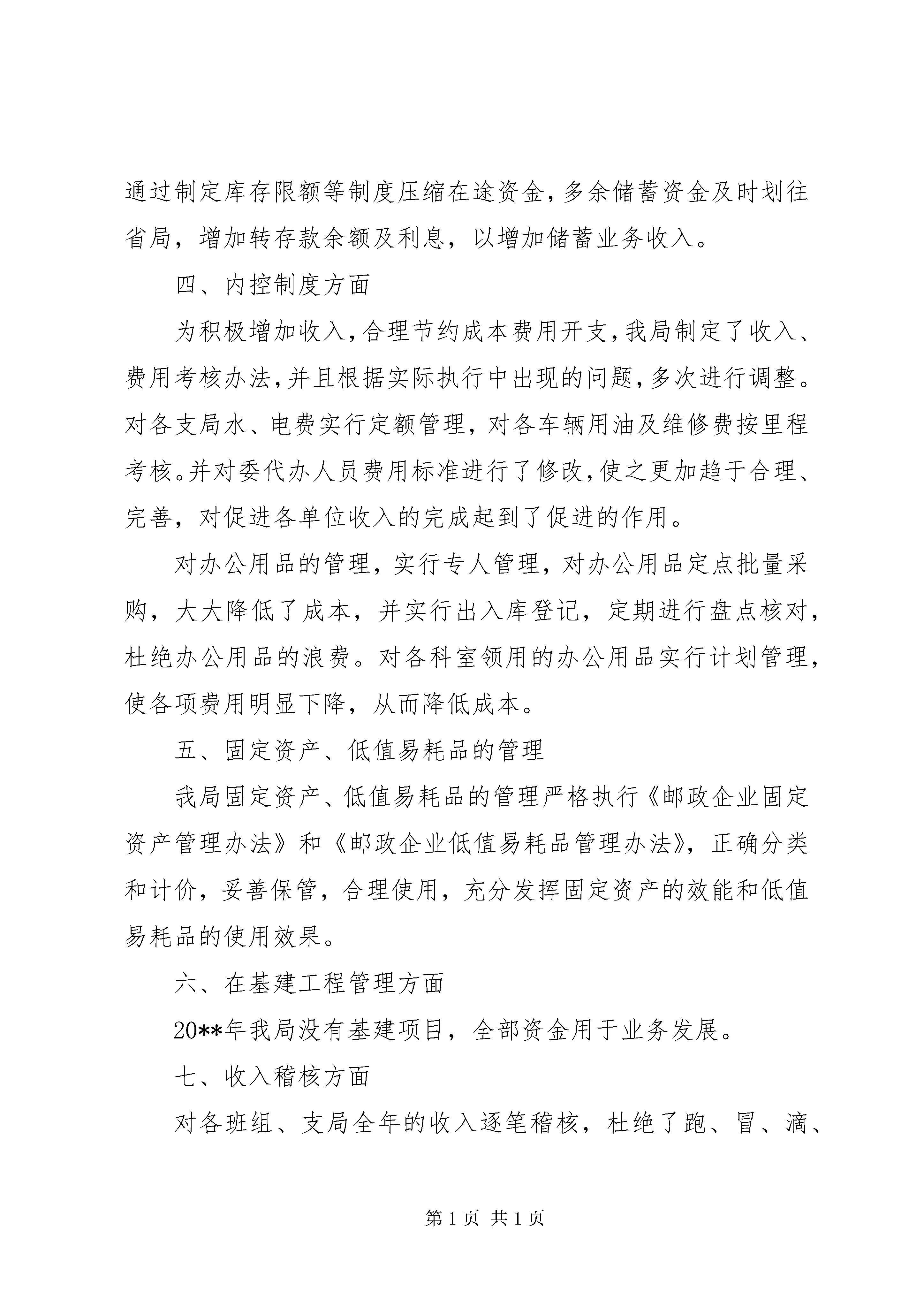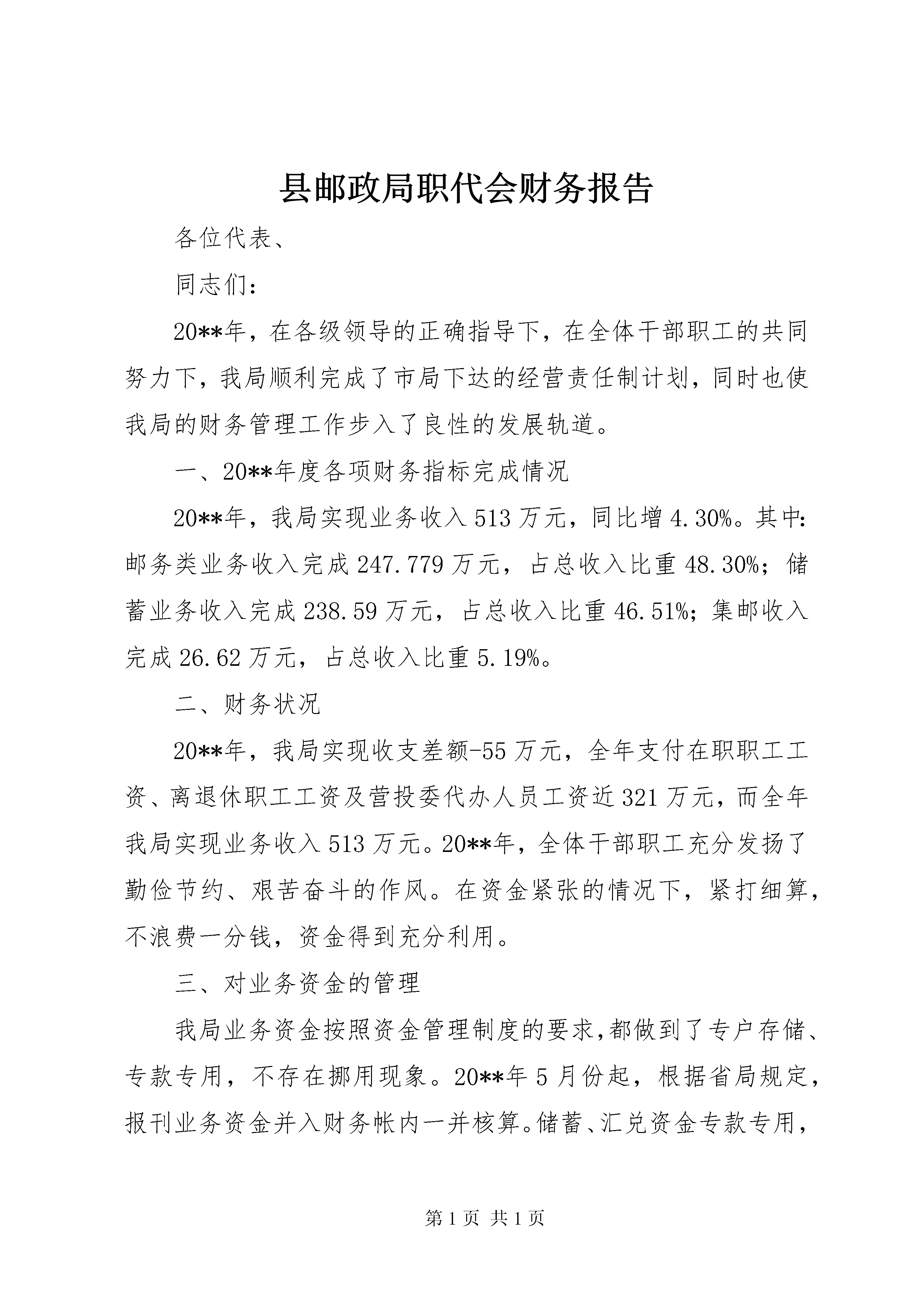 县邮政局职代会财务报告各位代表、同志们:20**年,在各级领导的正确指导下,在全体干部职工的共同努力下,我局顺利完成了市局下达的经营责任制计划,同时也使我局的财务管理工作步入了良性的发展轨道。一、20**年度各项财务指标完成情况20**年,我局实现业务收入513万元,同比增4.30%。其中:邮务类业务收入完成247.779万元,占总收入比重48.30%;储蓄业务收入完成238.59万元,占总收入比重46.51%;集邮收入完成26.62万元,占总收入比重5.19%。二、财务状况20**年,我局实现收支差额-55万元,全年支付在职职工工资、离退休职工工资及营投委代办人员工资近321万元,而全年我局实现业务收入513万元。20**年,全体干部职工充分发扬了勤俭节约、艰苦奋斗的作风。在资金紧张的情况下,紧打细算,不浪费一分钱,资金得到充分利用。三、对业务资金的管理我局业务资金按照资金管理制度的要求,都做到了专户存储、专款专用,不存在挪用现象。20**年5月份起,根据省局规定,报刊业务资金并入财务帐内一并核算。储蓄、汇兑资金专款专用,通过制定库存限额等制度压缩在途资金,多余储蓄资金及时划往省局,增加转存款余额及利息,以增加储蓄业务收入。四、内控制度方面为积极增加收入,合理节约成本费用开支,我局制定了收入、费用考核办法,并且根据实际执行中出现的问题,多次进行调整。对各支局水、电费实行定额管理,对各车辆用油及维修费按里程考核。并对委代办人员费用标准进行了修改,使之更加趋于合理、完善,对促进各单位收入的完成起到了促进的作用。对办公用品的管理,实行专人管理,对办公用品定点批量采购,大大降低了成本,并实行出入库登记,定期进行盘点核对,杜绝办公用品的浪费。对各科室领用的办公用品实行计划管理,使各项费用明显下降,从而降低成本。五、固定资产、低值易耗品的管理我局固定资产、低值易耗品的管理严格执行《邮政企业固定资产管理办法》和《邮政企业低值易耗品管理办法》,正确分类和计价,妥善保管,合理使用,充分发挥固定资产的效能和低值易耗品的使用效果。六、在基建工程管理方面20**年我局没有基建项目,全部资金用于业务发展。七、收入稽核方面对各班组、支局全年的收入逐笔稽核,杜绝了跑、冒、滴、漏等现象的发生,使全局各专业的收入确保了完整性和准确性,另外电子化支局系统中量收管理系统的正式运行,也更加保证了我局各专业收入的准确和完整。我局制定了量收系统考核办法,为各项资费制度的执行,处理手续的规范化打下了良好的基础,对个别支局资费的计算不准确现象,及时进行了调整与更正。八、招待费的管理20**年,我局制定招待费管理办法,对上级局以及地方来人的招待标准和陪同人员数量都进行了规定,有效的降低了招待费用。