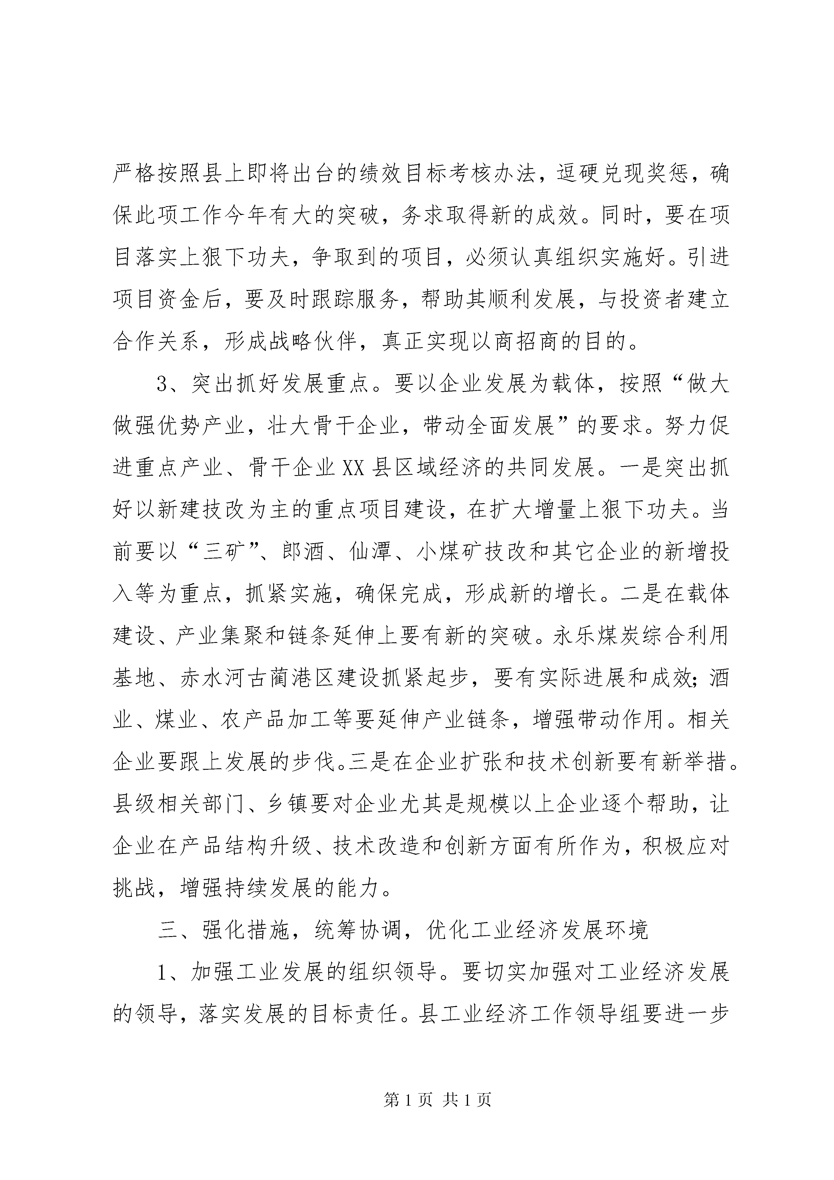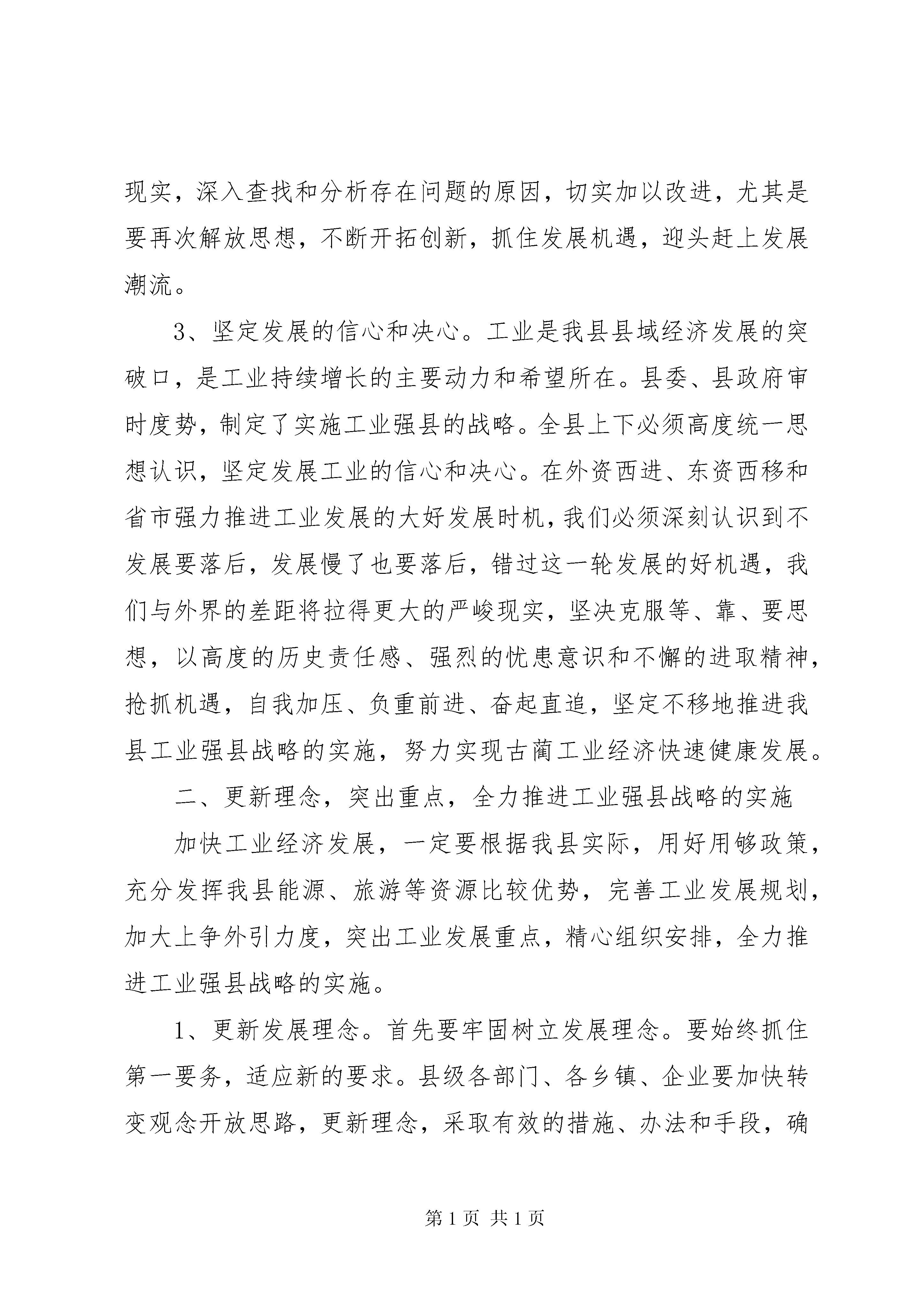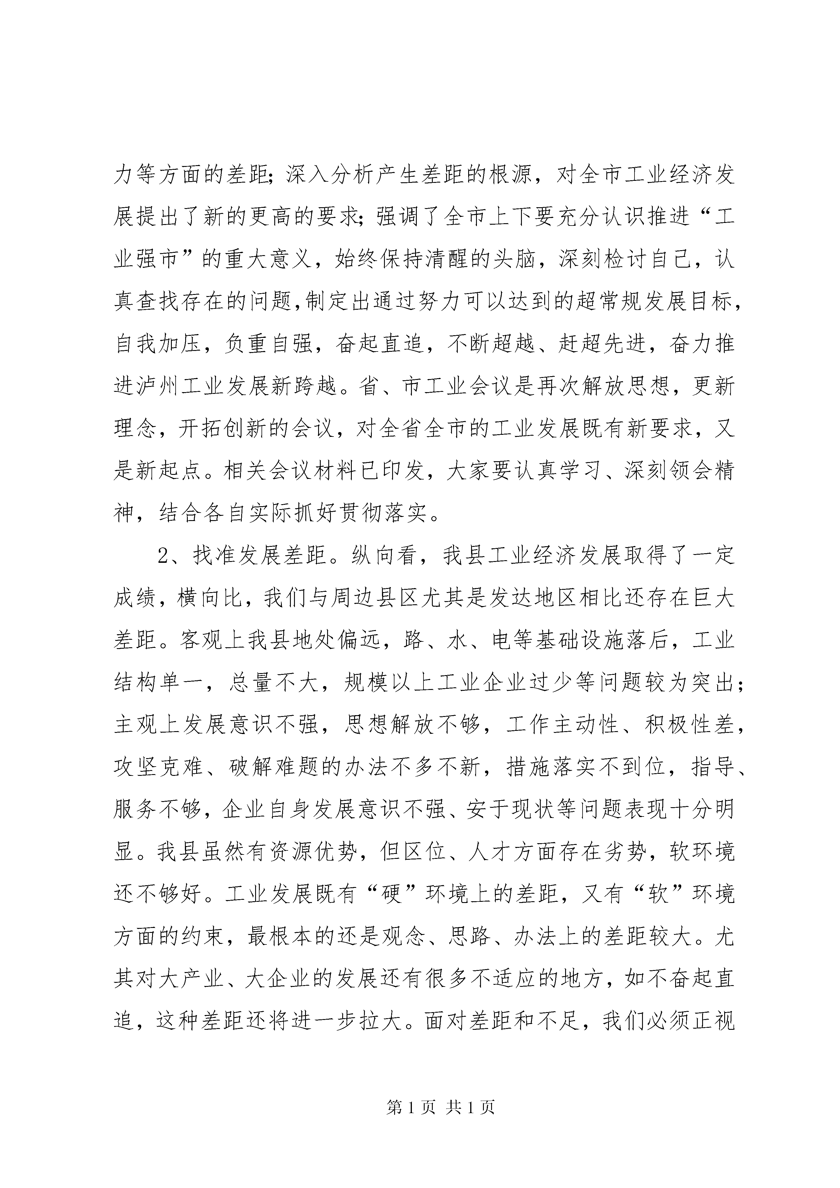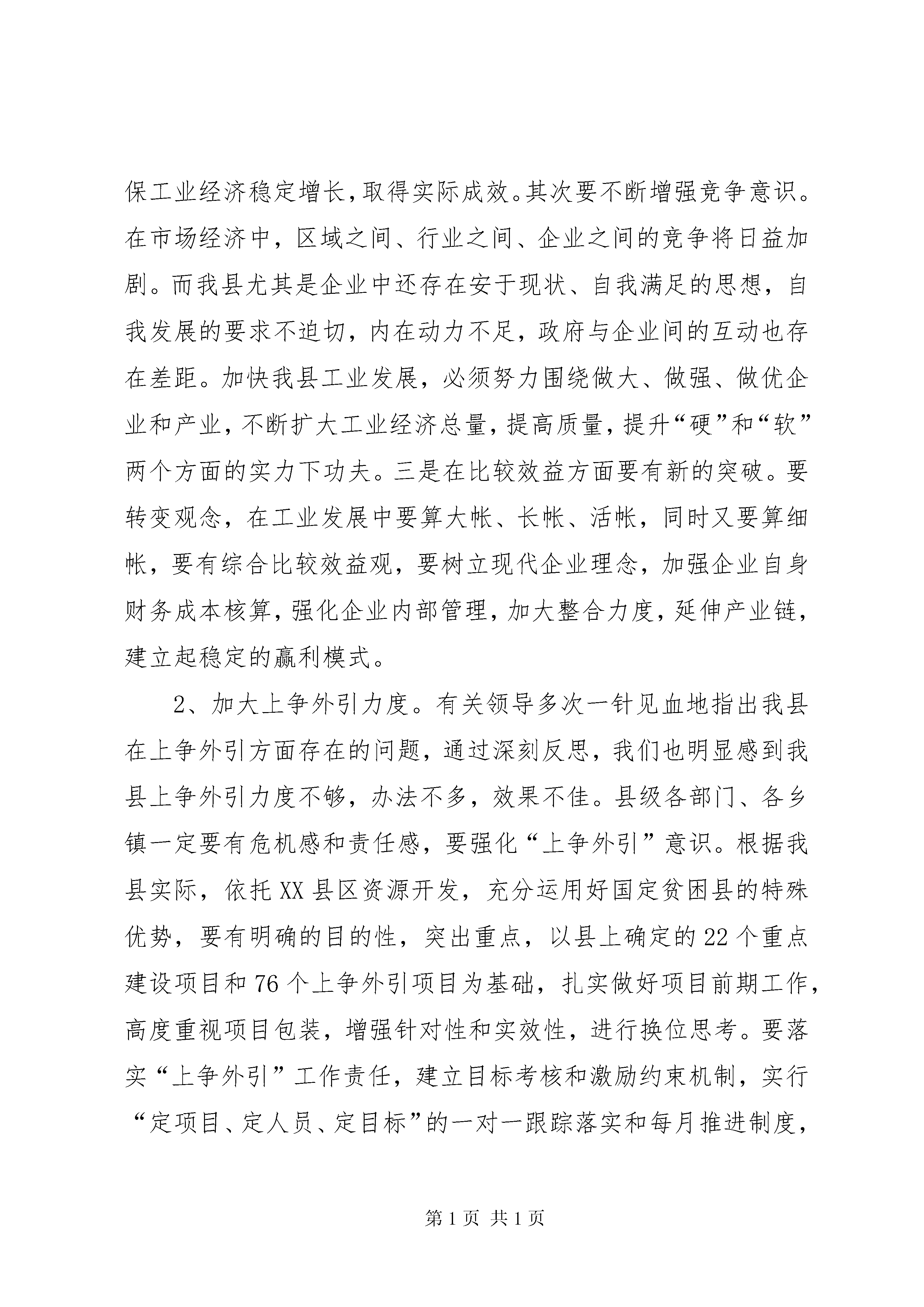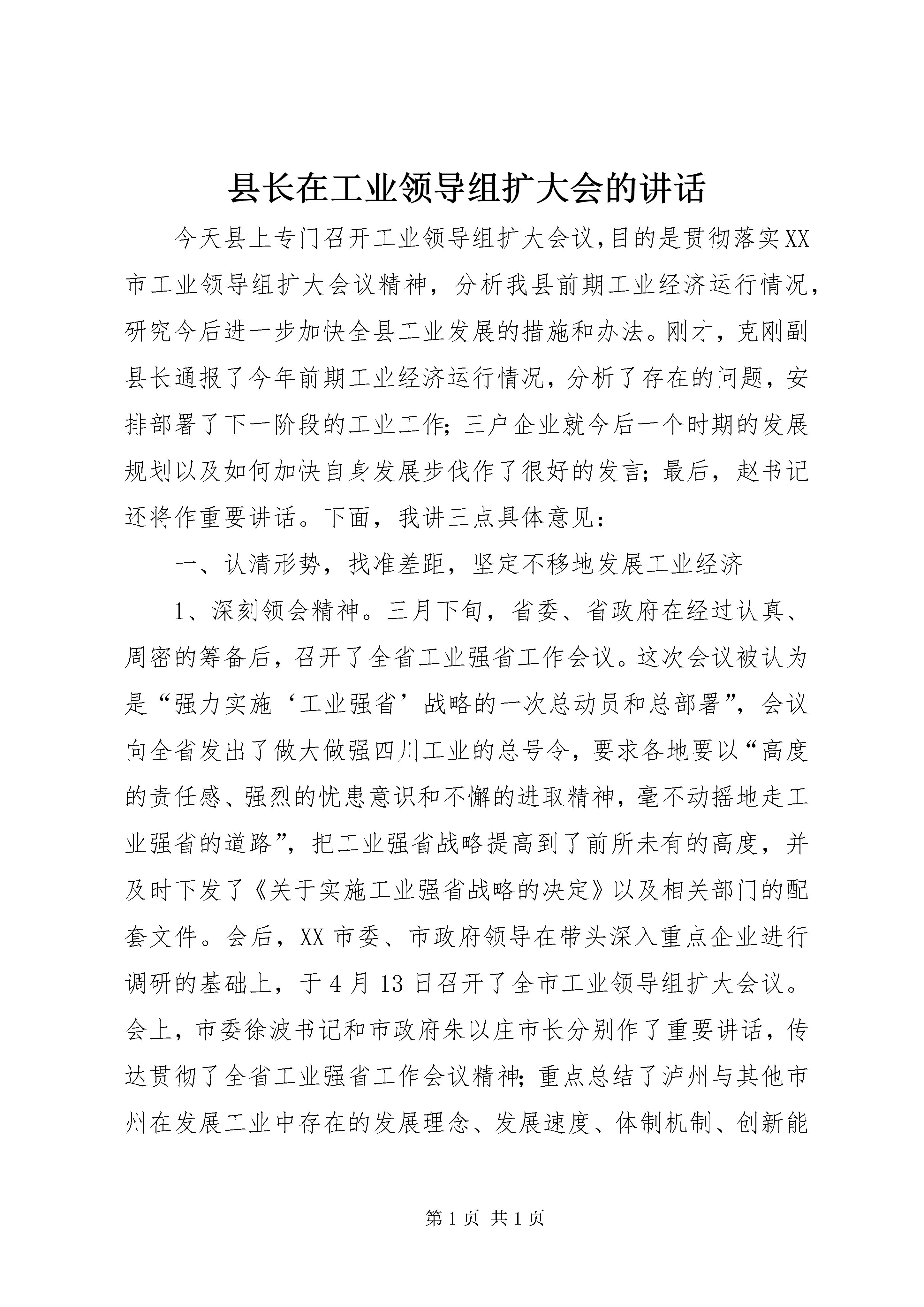 县长在工业领导组扩大会的讲话今天县上专门召开工业领导组扩大会议,目的是贯彻落实XX市工业领导组扩大会议精神,分析我县前期工业经济运行情况,研究今后进一步加快全县工业发展的措施和办法。刚才,克刚副县长通报了今年前期工业经济运行情况,分析了存在的问题,安排部署了下一阶段的工业工作;三户企业就今后一个时期的发展规划以及如何加快自身发展步伐作了很好的发言;最后,赵书记还将作重要讲话。下面,我讲三点具体意见:一、认清形势,找准差距,坚定不移地发展工业经济1、深刻领会精神。三月下旬,省委、省政府在经过认真、周密的筹备后,召开了全省工业强省工作会议。这次会议被认为是“强力实施‘工业强省’战略的一次总动员和总部署”,会议向全省发出了做大做强四川工业的总号令,要求各地要以“高度的责任感、强烈的忧患意识和不懈的进取精神,毫不动摇地走工业强省的道路”,把工业强省战略提高到了前所未有的高度,并及时下发了《关于实施工业强省战略的决定》以及相关部门的配套文件。会后,XX市委、市政府领导在带头深入重点企业进行调研的基础上,于4月13日召开了全市工业领导组扩大会议。会上,市委徐波书记和市政府朱以庄市长分别作了重要讲话,传达贯彻了全省工业强省工作会议精神;重点总结了泸州与其他市州在发展工业中存在的发展理念、发展速度、体制机制、创新能力等方面的差距;深入分析产生差距的根源,对全市工业经济发展提出了新的更高的要求;强调了全市上下要充分认识推进“工业强市”的重大意义,始终保持清醒的头脑,深刻检讨自己,认真查找存在的问题,制定出通过努力可以达到的超常规发展目标,自我加压,负重自强,奋起直追,不断超越、赶超先进,奋力推进泸州工业发展新跨越。省、市工业会议是再次解放思想,更新理念,开拓创新的会议,对全省全市的工业发展既有新要求,又是新起点。相关会议材料已印发,大家要认真学习、深刻领会精神,结合各自实际抓好贯彻落实。2、找准发展差距。纵向看,我县工业经济发展取得了一定成绩,横向比,我们与周边县区尤其是发达地区相比还存在巨大差距。客观上我县地处偏远,路、水、电等基础设施落后,工业结构单一,总量不大,规模以上工业企业过少等问题较为突出;主观上发展意识不强,思想解放不够,工作主动性、积极性差,攻坚克难、破解难题的办法不多不新,措施落实不到位,指导、服务不够,企业自身发展意识不强、安于现状等问题表现十分明显。我县虽然有资源优势,但区位、人才方面存在劣势,软环境还不够好。工业发展既有“硬”环境上的差距,又有“软”环境方面的约束,最根本的还是观念、思路、办法上的差距较大。尤其对大产业、大企业的发展还有很多不适应的地方,如不奋起直追,这种差距还将进一步拉大。面对差距和不足,我们必须正视现实,深入查找和分析存在问题的原因,切实加以改进,尤其是要再次解放思想,不断开拓创新,抓住发展机遇,迎头赶上发展潮流。3、坚定发展的信心和决心。工业是我县县域经济发展的突破口,是工业持续增长的主要动力和希望所在。县委、县政府审时度势,制定了实施工业强县的战略。全县上下必须高度统一思想认识,坚定发展工业的信心和决心。在外资西进、东资西移和省市强力推进工业发展的大好发展时机,我们必须深刻认识到不发展要落后,发展慢了也要落后,错过这一轮发展的好机遇,我们与外界的差距将拉得更大的严峻现实,坚决克服等、靠、要思想,以高度的历史责任感、强烈的忧患意识和不懈的进取精神,抢抓机遇,自我加压、负重前进、奋起直追,坚定不移地推进我县工业强县战略的实施,努力实现古蔺工业经济快速健康发展。二、更新理念,突出重点,全力推进工业强县战略的实施加快工业经济发展,一定要根据我县实际,用好用够政策,充分发挥我县能源、旅游等资源比较优势,完善工业发展规划,加大上争外引力度,突出工业发展重点,精心组织安排,全力推进工业强县战略的实施。1、更新发展理念。首先要牢固树立发展理念。要始终抓住第一要务,适应新的要求。县级各部门、各乡镇、企业要加快转变观念开放思路,更新理念,采取有效的措施、办法和手段,确保工业经济稳定增长,取得实际成效。其次要不断增强竞争意识。在市场经济中,区域之间、行业之间、企业之间的竞争将日益加剧。而我县尤其是企业中还存在安于现状、自我满足的思想,自我发展的要求不迫切,内在动力不足,政府与企业间的互动也存在差距。加快我县工业发展,必须努力围绕做大、做强、做优企业和产业,不断扩大工业经济总量,提高质量,提升“硬”和“软”两个方面的实力下功夫。三是在比较效益方面要有新的突破。要转变观念,在工业发展中要算大帐、长帐、活帐,同时又要算细帐,要有综合比较效益观,要树立现代企业理念,加强企业自身财务成本核算,强化企业内部管理,加大整合力度,延伸产业链,建立起稳定的赢利模式。2、加大上争外引力度。有关领导多次一针见血地指