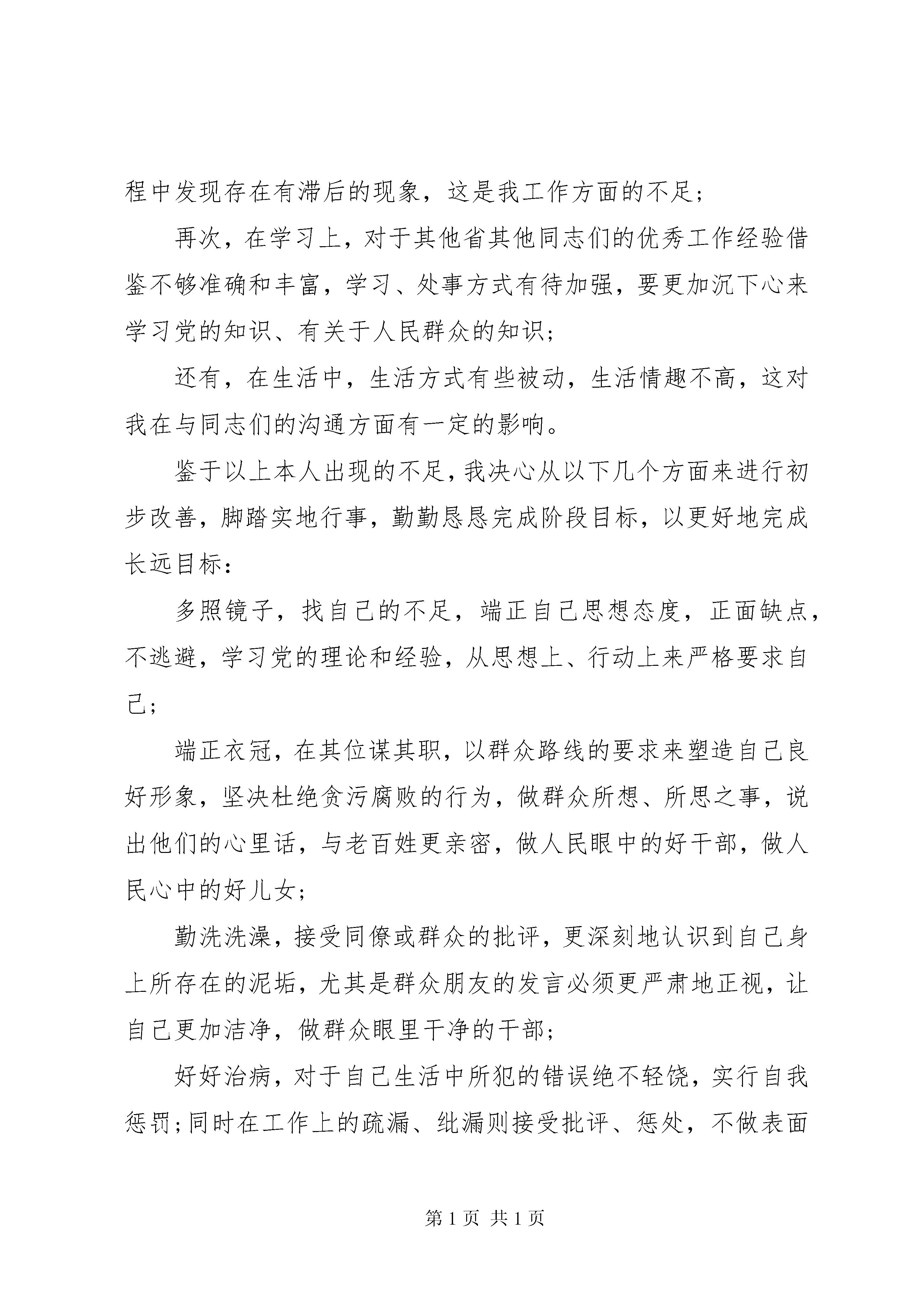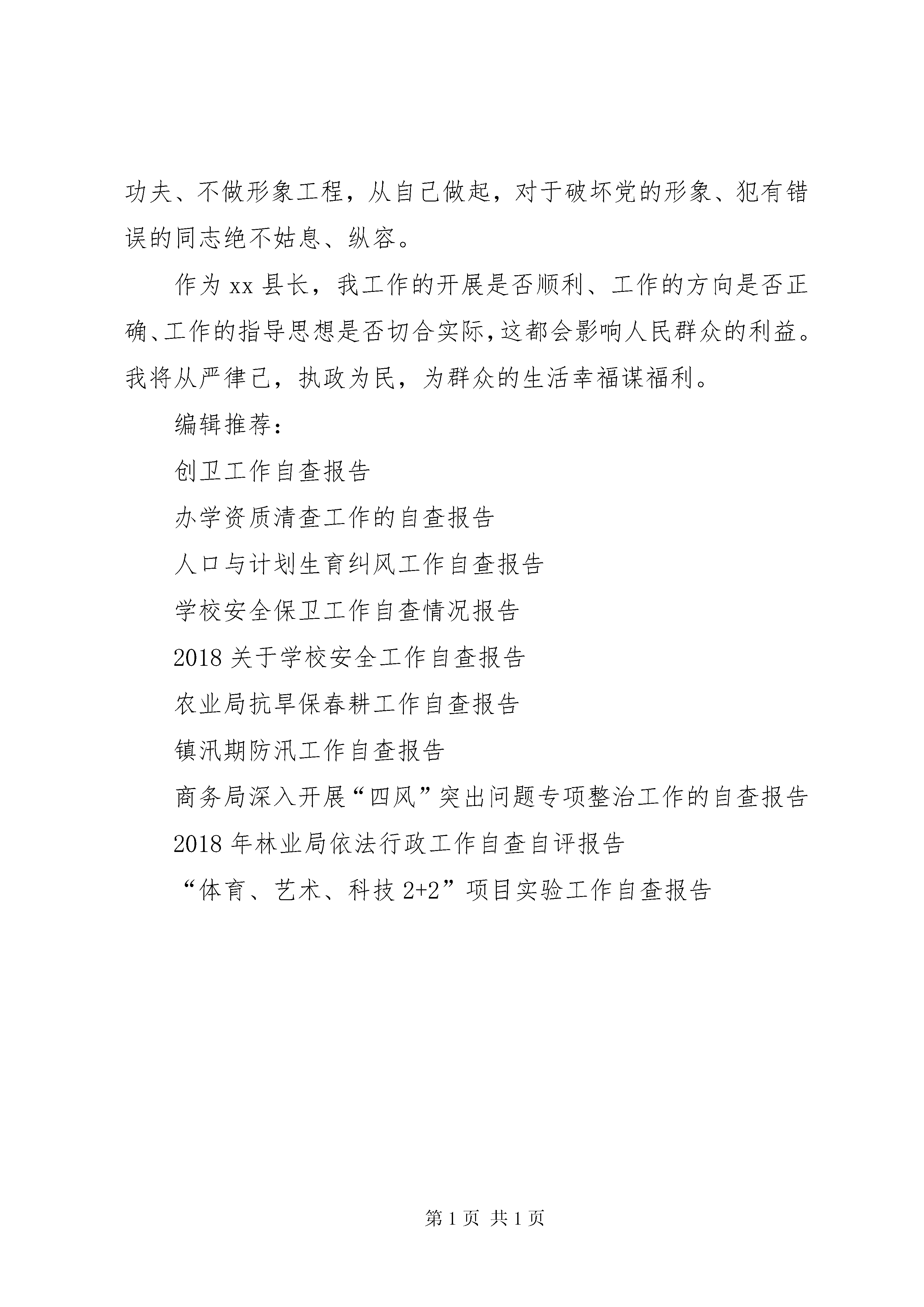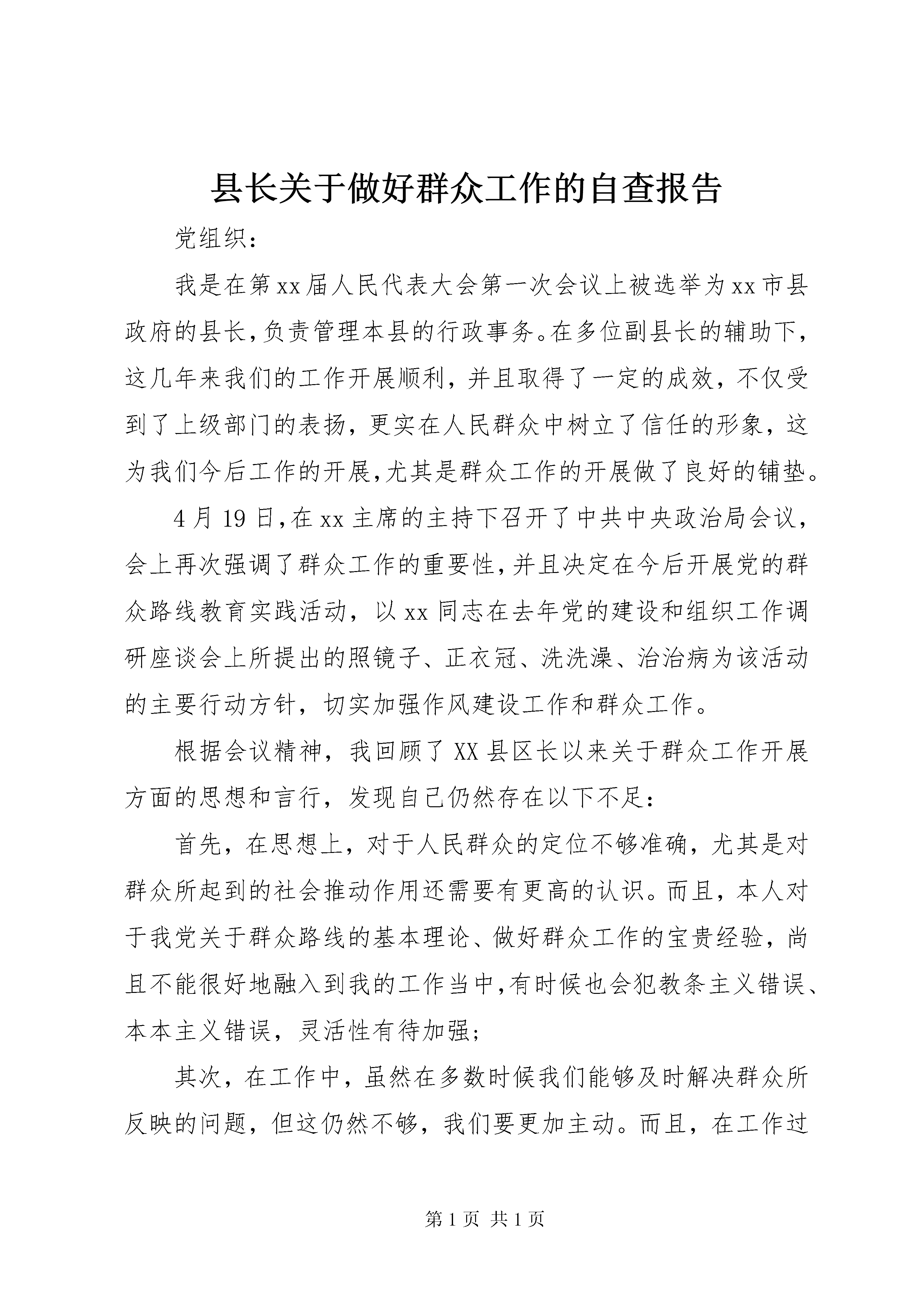 县长关于做好群众工作的自查报告党组织:我是在第xx届人民代表大会第一次会议上被选举为xx市县政府的县长,负责管理本县的行政事务。在多位副县长的辅助下,这几年来我们的工作开展顺利,并且取得了一定的成效,不仅受到了上级部门的表扬,更实在人民群众中树立了信任的形象,这为我们今后工作的开展,尤其是群众工作的开展做了良好的铺垫。4月19日,在xx主席的主持下召开了中共中央政治局会议,会上再次强调了群众工作的重要性,并且决定在今后开展党的群众路线教育实践活动,以xx同志在去年党的建设和组织工作调研座谈会上所提出的照镜子、正衣冠、洗洗澡、治治病为该活动的主要行动方针,切实加强作风建设工作和群众工作。根据会议精神,我回顾了XX县区长以来关于群众工作开展方面的思想和言行,发现自己仍然存在以下不足:首先,在思想上,对于人民群众的定位不够准确,尤其是对群众所起到的社会推动作用还需要有更高的认识。而且,本人对于我党关于群众路线的基本理论、做好群众工作的宝贵经验,尚且不能很好地融入到我的工作当中,有时候也会犯教条主义错误、本本主义错误,灵活性有待加强;其次,在工作中,虽然在多数时候我们能够及时解决群众所反映的问题,但这仍然不够,我们要更加主动。而且,在工作过程中发现存在有滞后的现象,这是我工作方面的不足;再次,在学习上,对于其他省其他同志们的优秀工作经验借鉴不够准确和丰富,学习、处事方式有待加强,要更加沉下心来学习党的知识、有关于人民群众的知识;还有,在生活中,生活方式有些被动,生活情趣不高,这对我在与同志们的沟通方面有一定的影响。鉴于以上本人出现的不足,我决心从以下几个方面来进行初步改善,脚踏实地行事,勤勤恳恳完成阶段目标,以更好地完成长远目标:多照镜子,找自己的不足,端正自己思想态度,正面缺点,不逃避,学习党的理论和经验,从思想上、行动上来严格要求自己;端正衣冠,在其位谋其职,以群众路线的要求来塑造自己良好形象,坚决杜绝贪污腐败的行为,做群众所想、所思之事,说出他们的心里话,与老百姓更亲密,做人民眼中的好干部,做人民心中的好儿女;勤洗洗澡,接受同僚或群众的批评,更深刻地认识到自己身上所存在的泥垢,尤其是群众朋友的发言必须更严肃地正视,让自己更加洁净,做群众眼里干净的干部;好好治病,对于自己生活中所犯的错误绝不轻饶,实行自我惩罚;同时在工作上的疏漏、纰漏则接受批评、惩处,不做表面功夫、不做形象工程,从自己做起,对于破坏党的形象、犯有错误的同志绝不姑息、纵容。作为xx县长,我工作的开展是否顺利、工作的方向是否正确、工作的指导思想是否切合实际,这都会影响人民群众的利益。我将从严律己,执政为民,为群众的生活幸福谋福利。编辑推荐:创卫工作自查报告办学资质清查工作的自查报告人口与计划生育纠风工作自查报告学校安全保卫工作自查情况报告2018关于学校安全工作自查报告农业局抗旱保春耕工作自查报告镇汛期防汛工作自查报告商务局深入开展“四风”突出问题专项整治工作的自查报告2018年林业局依法行政工作自查自评报告“体育、艺术、科技2+2”项目实验工作自查报告