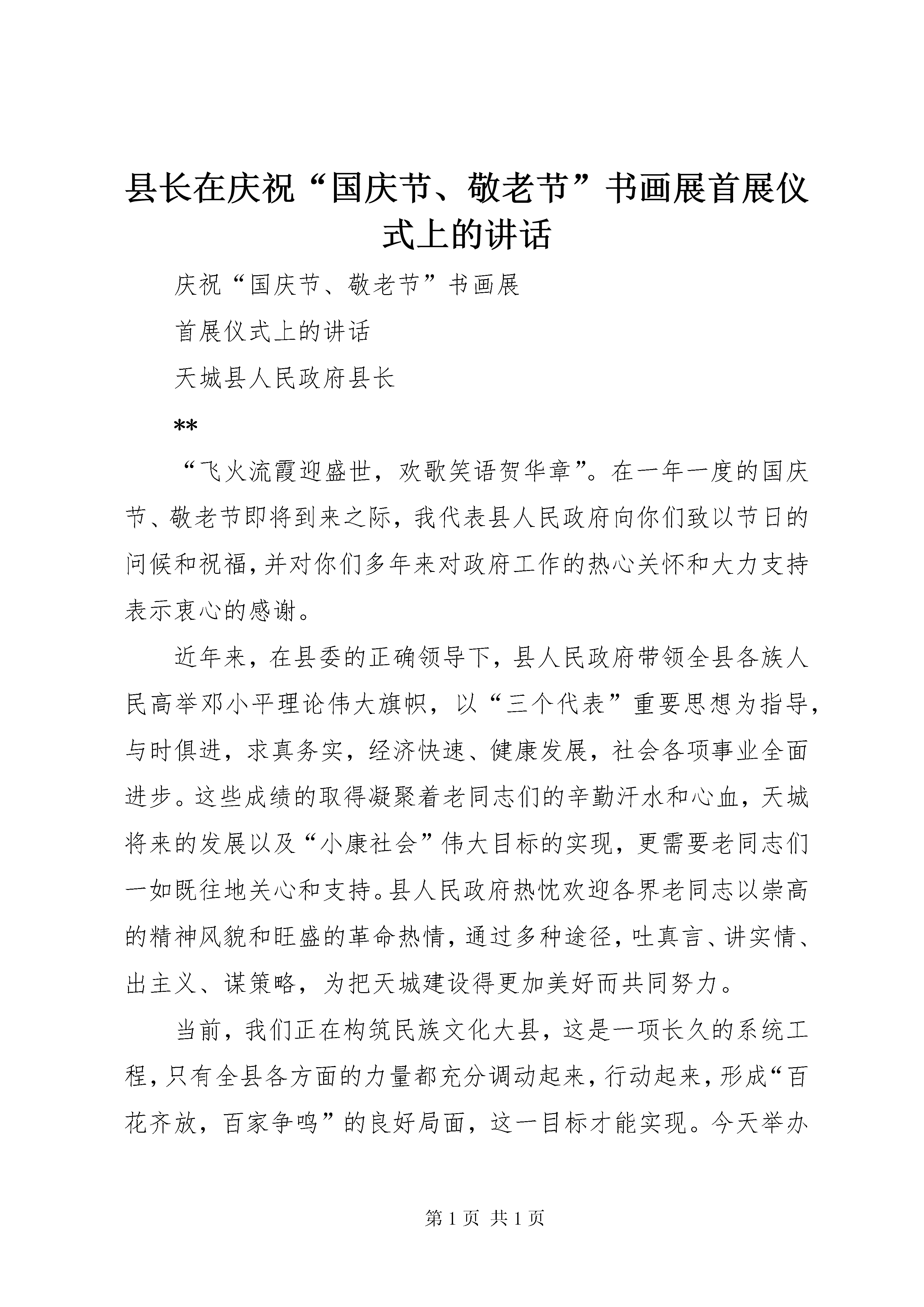 县长在庆祝“国庆节、敬老节”书画展首展仪式上的讲话庆祝“国庆节、敬老节”书画展首展仪式上的讲话天城县人民政府县长**“飞火流霞迎盛世,欢歌笑语贺华章”。在一年一度的国庆节、敬老节即将到来之际,我代表县人民政府向你们致以节日的问候和祝福,并对你们多年来对政府工作的热心关怀和大力支持表示衷心的感谢。近年来,在县委的正确领导下,县人民政府带领全县各族人民高举邓小平理论伟大旗帜,以“三个代表”重要思想为指导,与时俱进,求真务实,经济快速、健康发展,社会各项事业全面进步。这些成绩的取得凝聚着老同志们的辛勤汗水和心血,天城将来的发展以及“小康社会”伟大目标的实现,更需要老同志们一如既往地关心和支持。县人民政府热忱欢迎各界老同志以崇高的精神风貌和旺盛的革命热情,通过多种途径,吐真言、讲实情、出主义、谋策略,为把天城建设得更加美好而共同努力。当前,我们正在构筑民族文化大县,这是一项长久的系统工程,只有全县各方面的力量都充分调动起来,行动起来,形成“百花齐放,百家争鸣”的良好局面,这一目标才能实现。今天举办的“国庆节、敬老节”书画展就是我县各界老同志展现特色、展示风采,积极投身到社会主义精神文明建设,为构筑民族文化大县做贡献的最好体现。我希望这样的活动以后要年年开展,以丰富老年人精神文化生活,使我们的老年人老有所乐、老有所为。最后,祝各位老同志节日快乐,健康长寿。预祝书画展取得圆满成功。谢谢大家。
