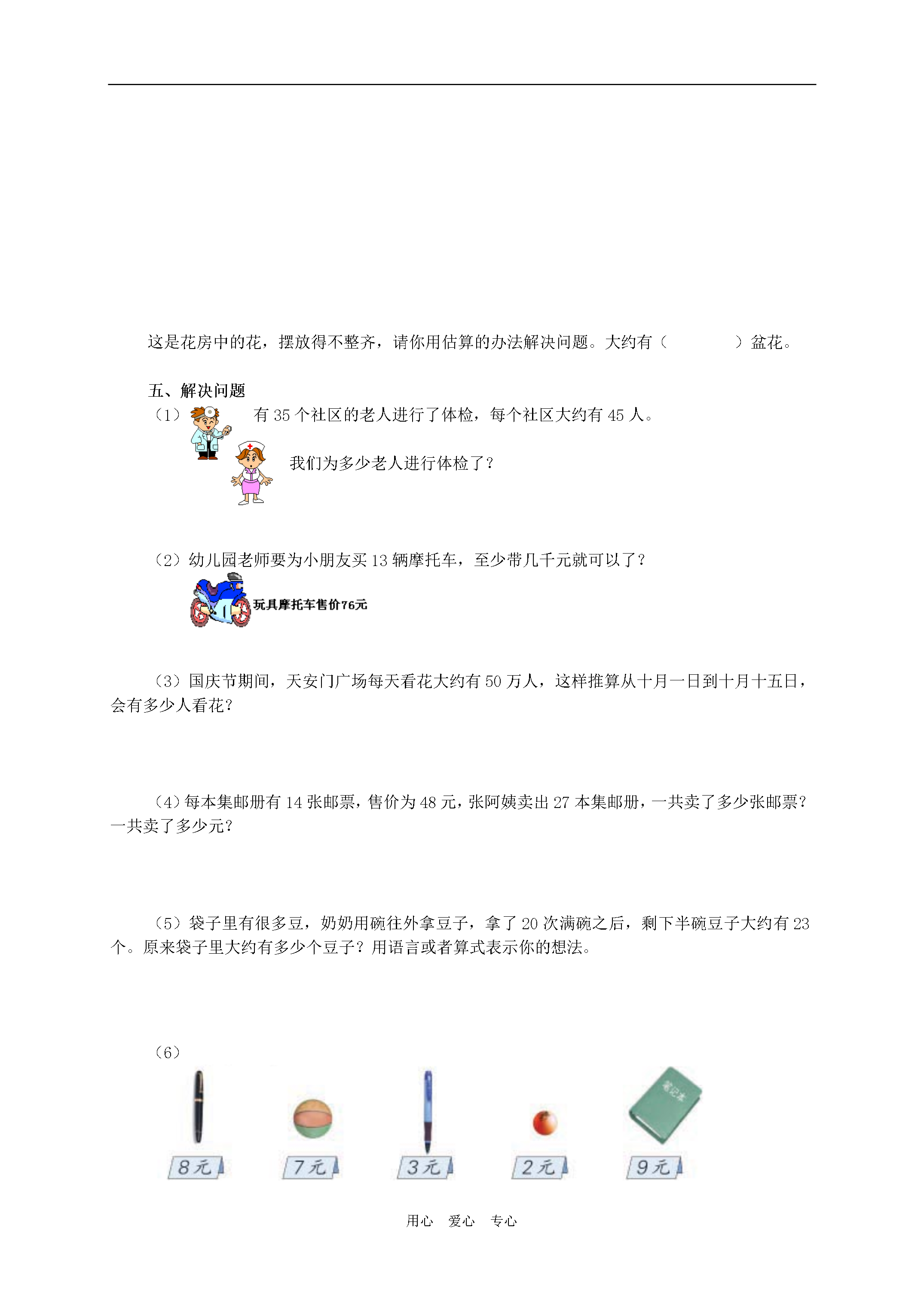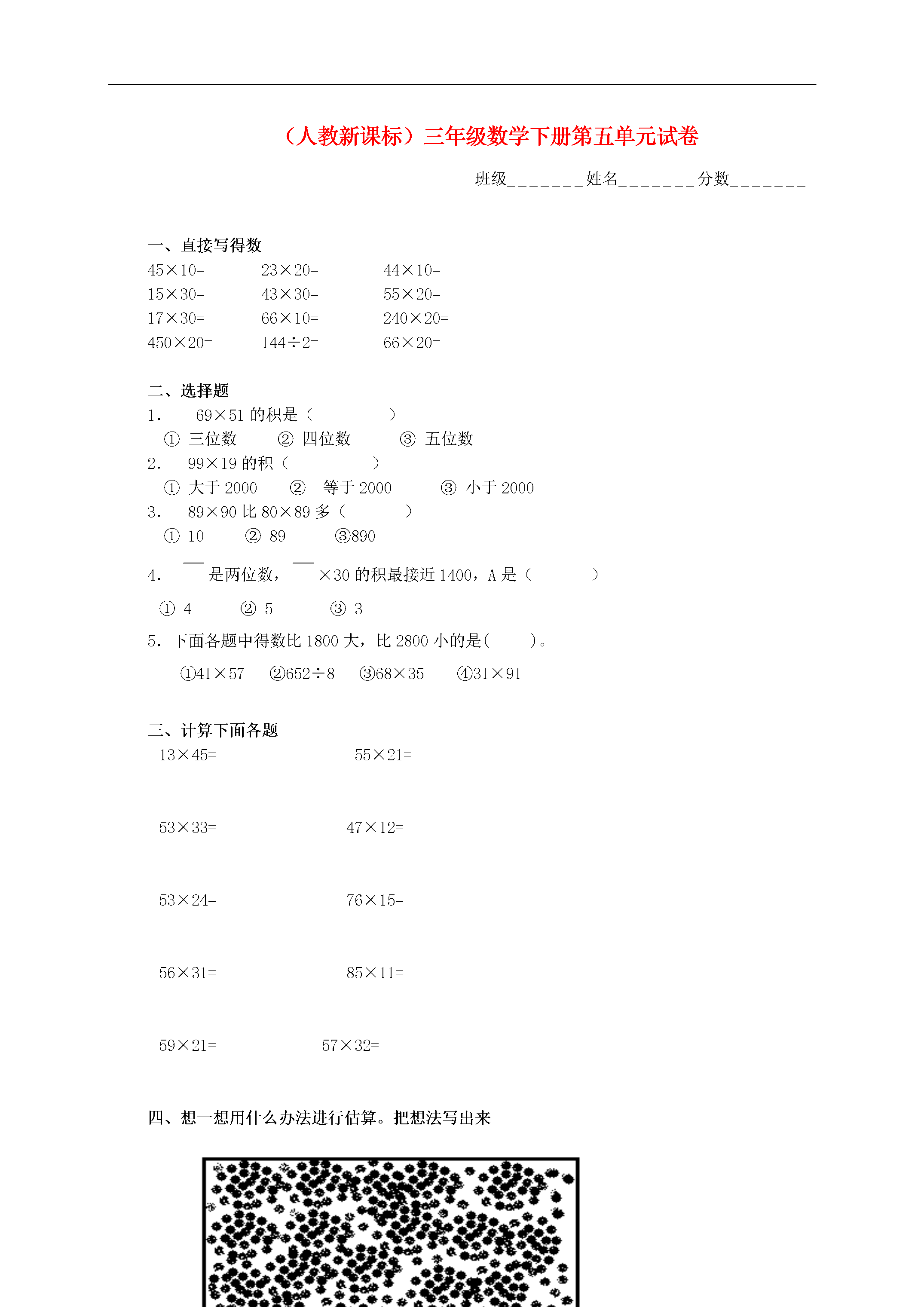 用心爱心专心(人教新课标)三年级数学下册第五单元试卷班级_______姓名_______分数_______一、直接写得数45×10=23×20=44×10=15×30=43×30=55×20=17×30=66×10=240×20=450×20=144÷2=66×20=二、选择题1.69×51的积是()①三位数②四位数③五位数2.99×19的积()①大于2000②等于2000③小于20003.89×90比80×89多()①10②89③8904.是两位数,×30的积最接近1400,A是()①4②5③35.下面各题中得数比1800大,比2800小的是()。①41×57②652÷8③68×35④31×91三、计算下面各题13×45=55×21=53×33=47×12=53×24=76×15=56×31=85×11=59×21=57×32=四、想一想用什么办法进行估算。把想法写出来这是花房中的花,摆放得不整齐,请你用估算的办法解决问题。大约有()盆花。五、解决问题(1)有35个社区的老人进行了体检,每个社区大约有45人。我们为多少老人进行体检了?(2)幼儿园老师要为小朋友买13辆摩托车,至少带几千元就可以了?(3)国庆节期间,天安门广场每天看花大约有50万人,这样推算从十月一日到十月十五日,会有多少人看花?(4)每本集邮册有14张邮票,售价为48元,张阿姨卖出27本集邮册,一共卖了多少张邮票?一共卖了多少元?(5)袋子里有很多豆,奶奶用碗往外拿豆子,拿了20次满碗之后,剩下半碗豆子大约有23个。原来袋子里大约有多少个豆子?用语言或者算式表示你的想法。(6)1.王老师买笔用去114元,买球用去62元。王老师买的是()球,买了()个;买的是()笔,买了()枝。2.如果把买笔和买球的钱都买笔记本,最多能买多少本?3.李老师、刘老师和吴老师一起去买皮球,各买了12个,他们一共花了多少钱?